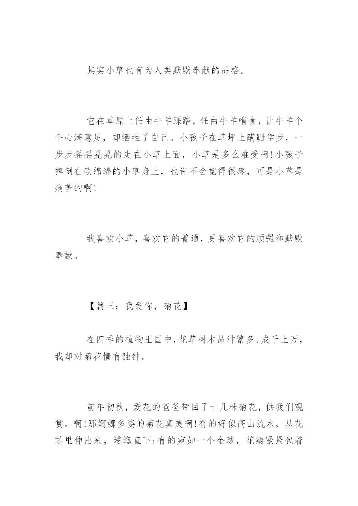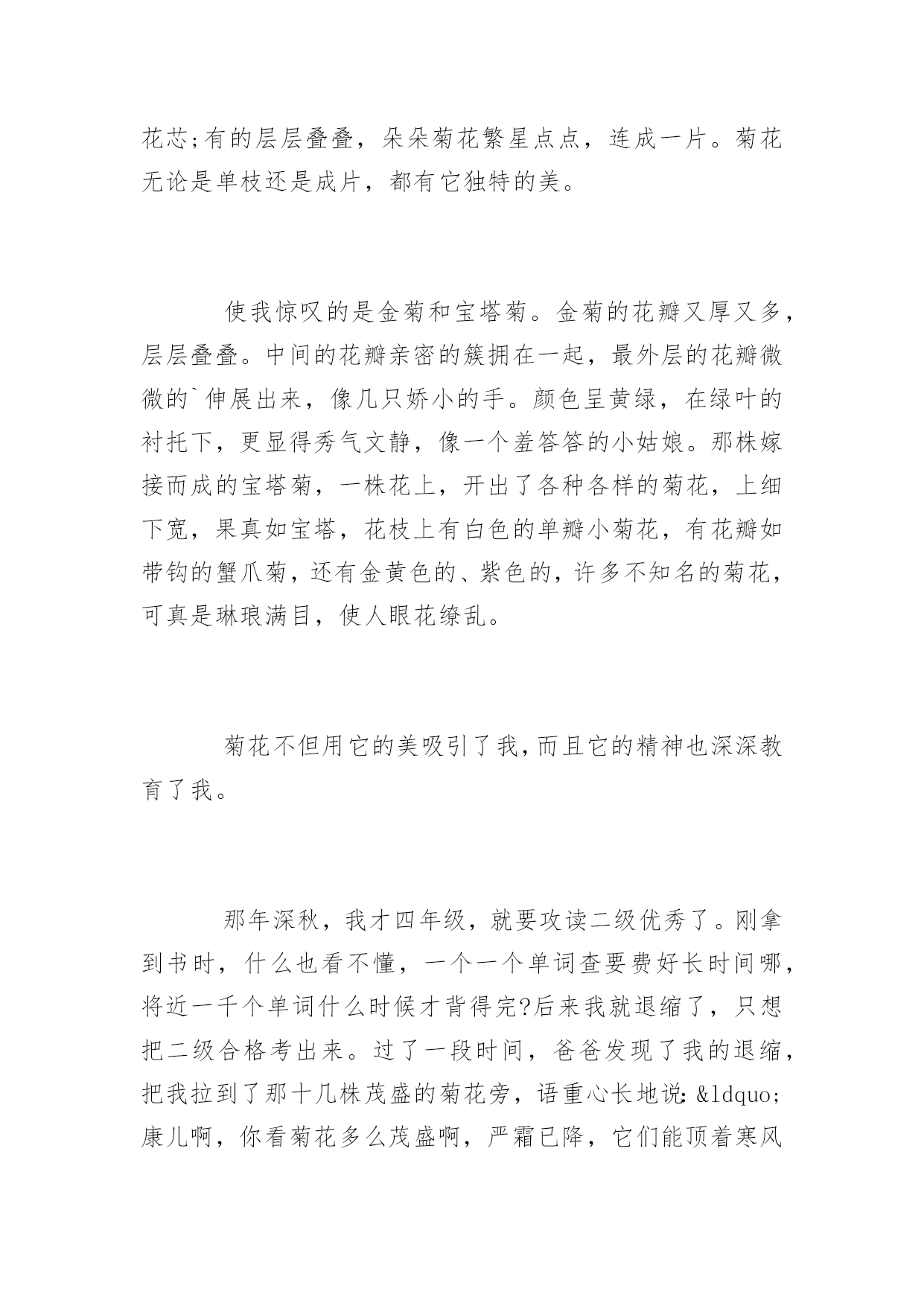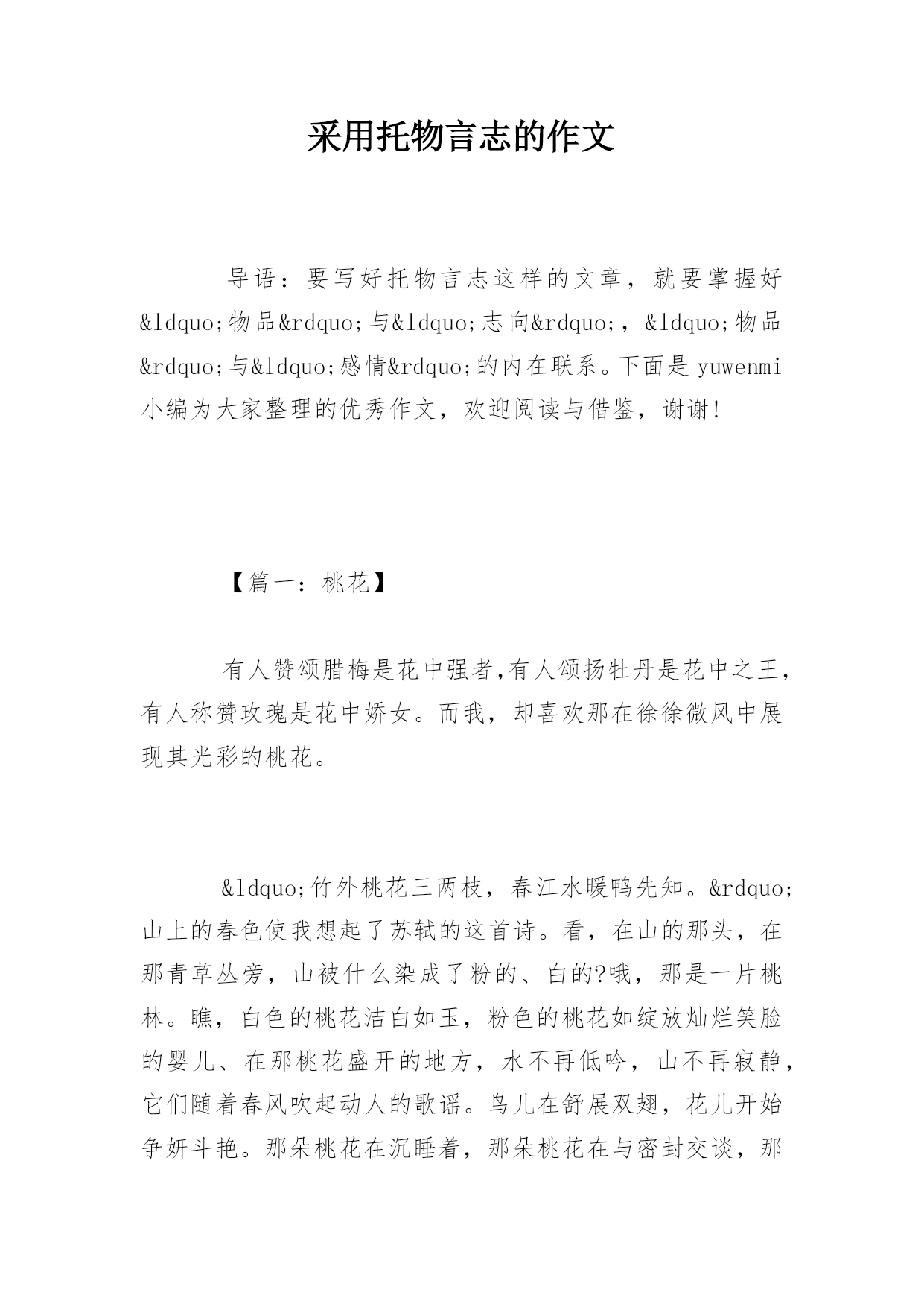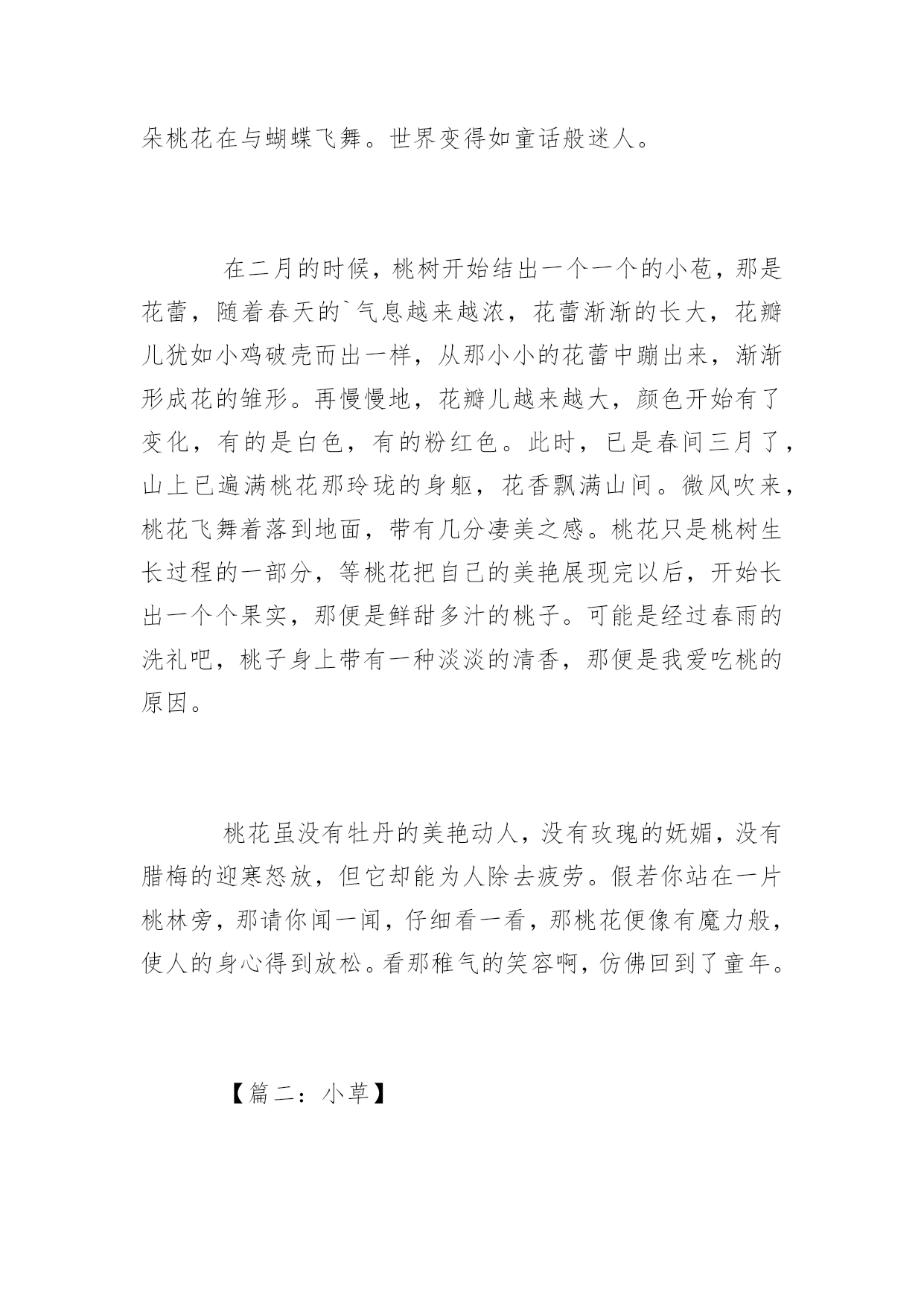 采用托物言志的作文 导语:要写好托物言志这样的文章,就要掌握好“物品”与“志向”,“物品”与“感情”的内在联系。下面是yuwenmi小编为大家整理的优秀作文,欢迎阅读与借鉴,谢谢! 【篇一:桃花】 有人赞颂腊梅是花中强者,有人颂扬牡丹是花中之王,有人称赞玫瑰是花中娇女。而我,却喜欢那在徐徐微风中展现其光彩的桃花。 “竹外桃花三两枝,春江水暖鸭先知。”山上的春色使我想起了苏轼的这首诗。看,在山的那头,在那青草丛旁,山被什么染成了粉的、白的?哦,那是一片桃林。瞧,白色的桃花洁白如玉,粉色的桃花如绽放灿烂笑脸的婴儿、在那桃花盛开的地方,水不再低吟,山不再寂静,它们随着春风吹起动人的歌谣。鸟儿在舒展双翅,花儿开始争妍斗艳。那朵桃花在沉睡着,那朵桃花在与密封交谈,那朵桃花在与蝴蝶飞舞。世界变得如童话般迷人。 在二月的时候,桃树开始结出一个一个的小苞,那是花蕾,随着春天的`气息越来越浓,花蕾渐渐的长大,花瓣儿犹如小鸡破壳而出一样,从那小小的花蕾中蹦出来,渐渐形成花的雏形。再慢慢地,花瓣儿越来越大,颜色开始有了变化,有的是白色,有的粉红色。此时,已是春间三月了,山上已遍满桃花那玲珑的身躯,花香飘满山间。微风吹来,桃花飞舞着落到地面,带有几分凄美之感。桃花只是桃树生长过程的一部分,等桃花把自己的美艳展现完以后,开始长出一个个果实,那便是鲜甜多汁的桃子。可能是经过春雨的洗礼吧,桃子身上带有一种淡淡的清香,那便是我爱吃桃的原因。 桃花虽没有牡丹的美艳动人,没有玫瑰的妩媚,没有腊梅的迎寒怒放,但它却能为人除去疲劳。假若你站在一片桃林旁,那请你闻一闻,仔细看一看,那桃花便像有魔力般,使人的身心得到放松。看那稚气的笑容啊,仿佛回到了童年。 【篇二:小草】 “离离原上草,一岁一枯荣。野火烧不尽,春风吹又生。”这首诗是唐代诗人白居易来描写小草的诗。小草的生命力是那么顽强。它不像那些名贵的花,如果没有人照顾就会枝折花落。 热气炙人的夏天,大地像个蒸笼,要把一切都蒸熟似的。树木和花儿都懒得一动,只有小草咬紧牙关抗争着,绝不低头。呀!暴风雨来临,这对绿树红花来说是个莫大的灾难,树干被刮断,枝折花落。暴风雨过去了,树儿和花儿都垂头丧气。唯独小草更加苍翠,更加充满生机。真想不到,那小小的草儿竟有如此顽强的抗争力!寒气袭人的隆冬,小草也渐渐入睡了。我真替它们担心,担心它会被冻死。一阵春风把小草从梦乡唤醒,小草又一次回到人间了。这使我感到惊喜,小草竟有如此顽强的`生命力。此时,我对白居易的“离离原上草,一岁一枯荣。野火烧不尽,春风吹又生”这首诗有了更深刻的理解。 小草生长在石头缝里,生长在悬崖峭壁上,生长在荒原滩涂,它的生命是那么顽强。有人做过实验,把一块石头压在草籽上面,想着这株小草会死掉,没想到小草竟然倔强的站了起来。 其实小草也有为人类默默奉献的品格。 它在草原上任由牛羊踩踏,任由牛羊啃食,让牛羊个个心满意足,却牺牲了自己。小孩子在草坪上蹒跚学步,一步步摇摇晃晃的走在小草上面,小草是多么难受啊!小孩子摔倒在软绵绵的小草身上,也许不会觉得很疼,可是小草是痛苦的啊! 我喜欢小草,喜欢它的普通,更喜欢它的顽强和默默奉献。 【篇三:我爱你,菊花】 在四季的植物王国中,花草树木品种繁多、成千上万,我却对菊花情有独钟。 前年初秋,爱花的爸爸带回了十几株菊花,供我们观赏。啊!那婀娜多姿的菊花真美啊!有的好似高山流水,从花芯里伸出来,逶迤直下;有的宛如一个金球,花瓣紧紧包着花芯;有的层层叠叠,朵朵菊花繁星点点,连成一片。菊花无论是单枝还是成片,都有它独特的美。 使我惊叹的是金菊和宝塔菊。金菊的花瓣又厚又多,层层叠叠。中间的花瓣亲密的簇拥在一起,最外层的花瓣微微的`伸展出来,像几只娇小的手。颜色呈黄绿,在绿叶的衬托下,更显得秀气文静,像一个羞答答的小姑娘。那株嫁接而成的宝塔菊,一株花上,开出了各种各样的菊花,上细下宽,果真如宝塔,花枝上有白色的单瓣小菊花,有花瓣如带钩的蟹爪菊,还有金黄色的、紫色的,许多不知名的菊花,可真是琳琅满目,使人眼花缭乱。 菊花不但用它的美吸引了我,而且它的精神也深深教育了我。 那年深秋,我才四年级,就要攻读二级优秀了。刚拿到书时,什么也看不懂,一个一个单词查要费好长时间哪,将近一千个单词什么时候才背得完?后来我就退缩了,只想把二级合格考出来。过了一段时间,爸爸发现了我的退缩,把我拉到了那十几株茂盛的菊花旁,语重心长地说:“康儿啊,你看菊花多么茂盛啊,严霜已降,它们能顶着寒风盛开,多么值得赞颂啊!”爸爸又看看菊花,又看看我,聪明的我已经明白了爸爸的用意。我下决心学习