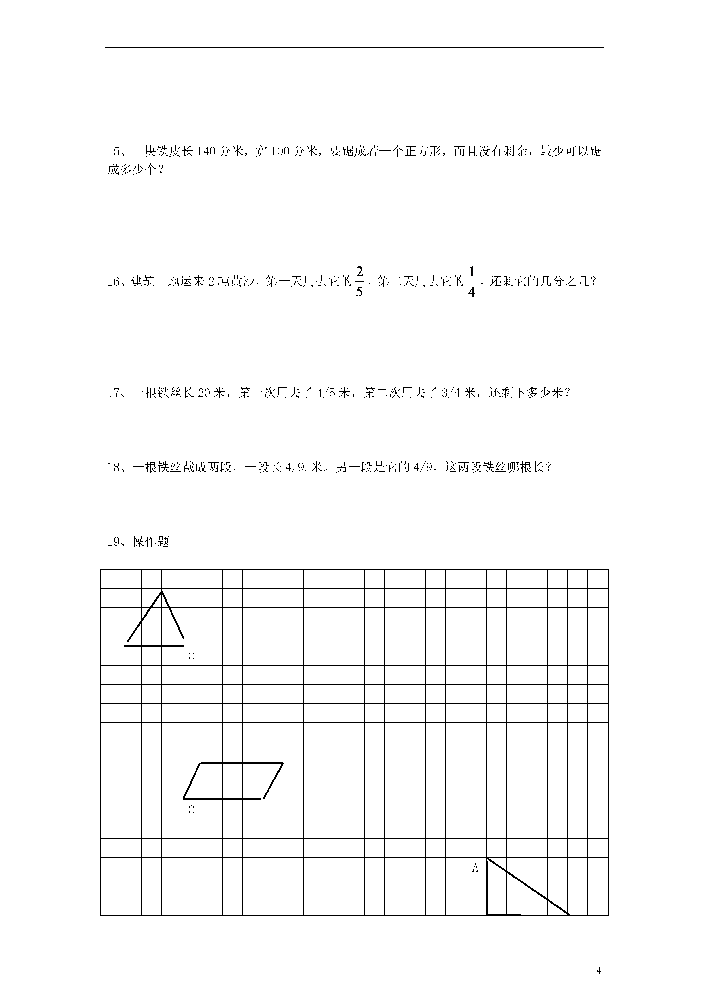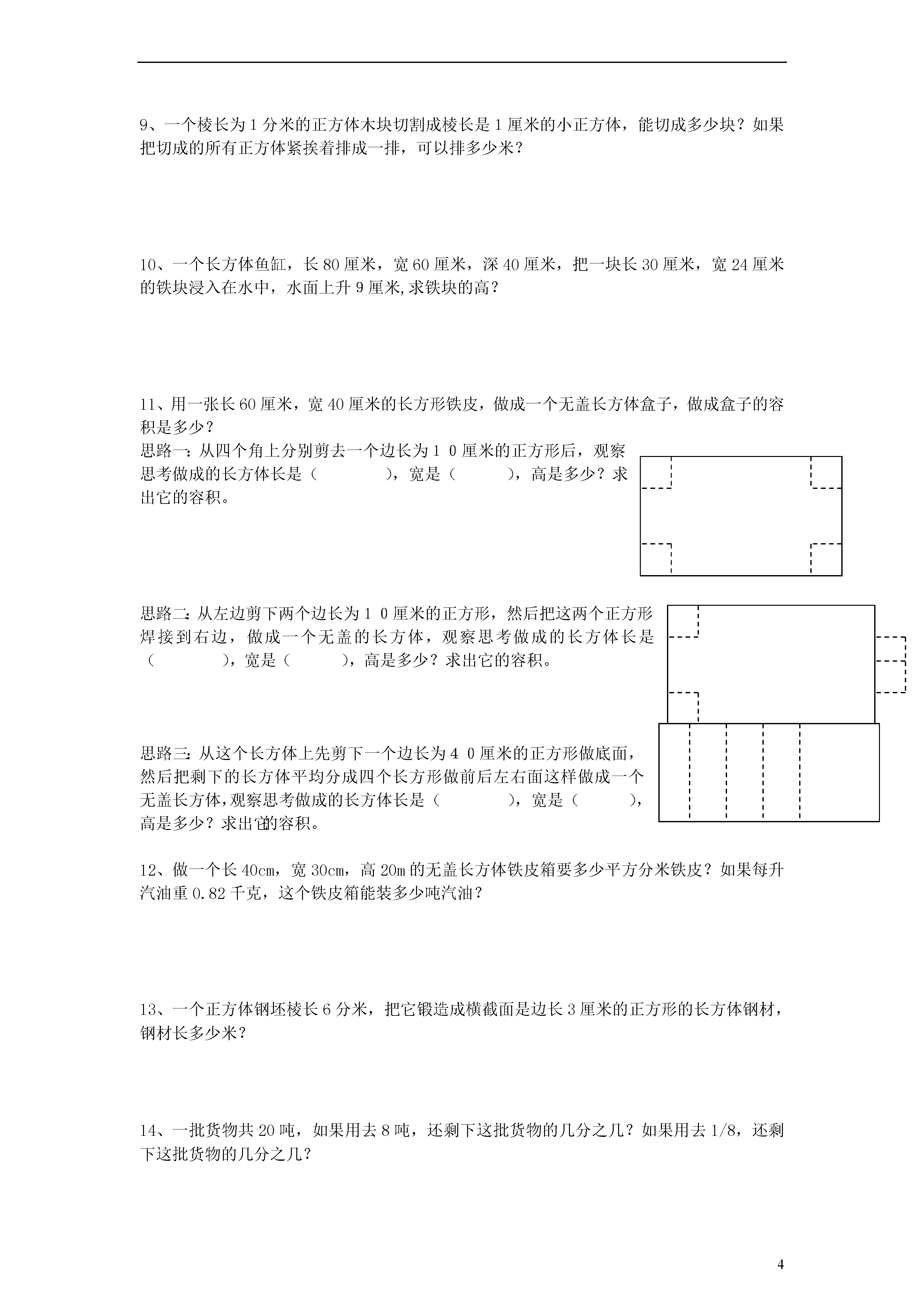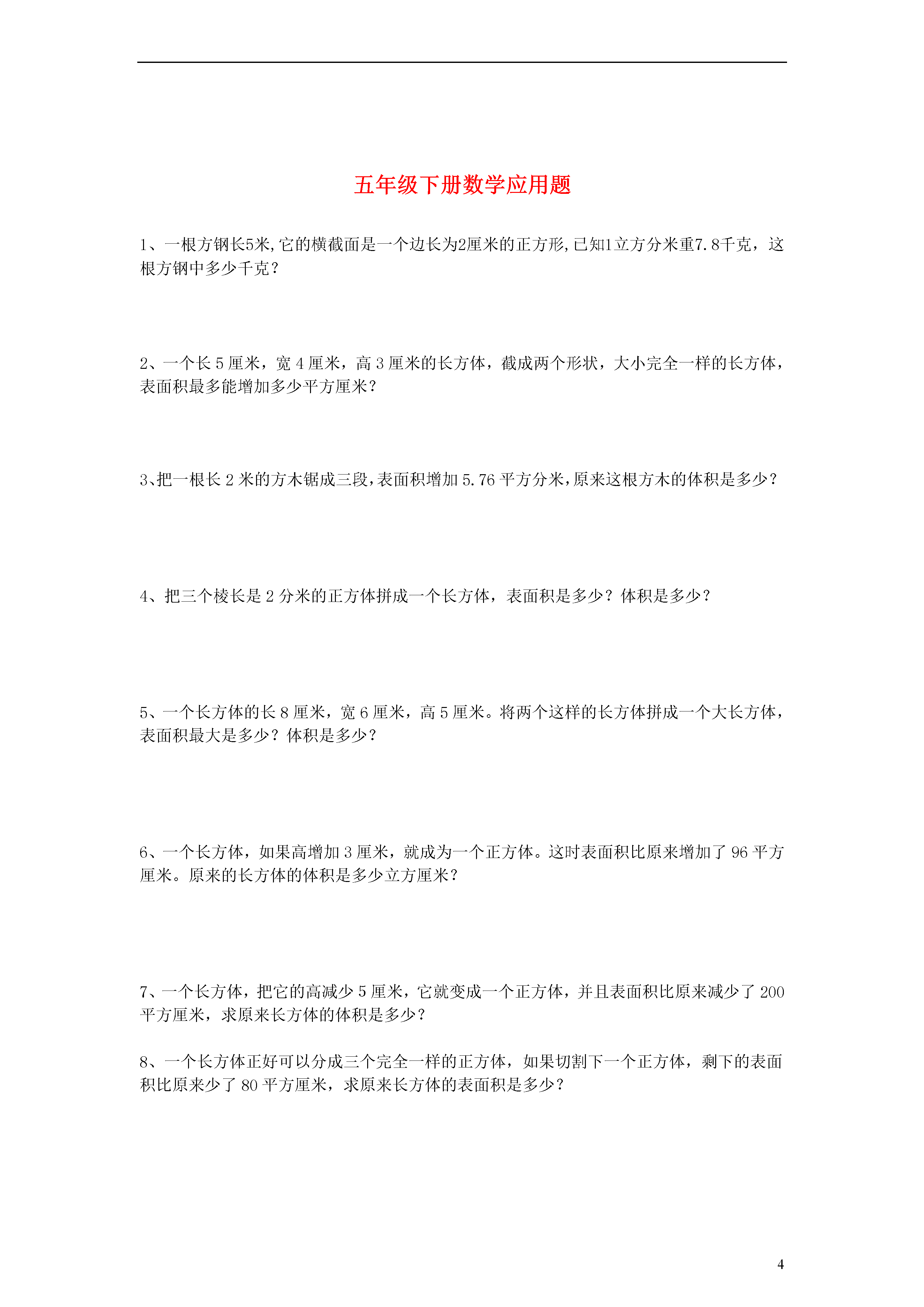 4五年级下册数学应用题1、一根方钢长5米,它的横截面是一个边长为2厘米的正方形,已知1立方分米重7.8千克,这根方钢中多少千克?2、一个长5厘米,宽4厘米,高3厘米的长方体,截成两个形状,大小完全一样的长方体,表面积最多能增加多少平方厘米?3、把一根长2米的方木锯成三段,表面积增加5.76平方分米,原来这根方木的体积是多少?把三个棱长是2分米的正方体拼成一个长方体,表面积是多少?体积是多少?5、一个长方体的长8厘米,宽6厘米,高5厘米。将两个这样的长方体拼成一个大长方体,表面积最大是多少?体积是多少?6、一个长方体,如果高增加3厘米,就成为一个正方体。这时表面积比原来增加了96平方厘米。原来的长方体的体积是多少立方厘米?7、一个长方体,把它的高减少5厘米,它就变成一个正方体,并且表面积比原来减少了200平方厘米,求原来长方体的体积是多少?8、一个长方体正好可以分成三个完全一样的正方体,如果切割下一个正方体,剩下的表面积比原来少了80平方厘米,求原来长方体的表面积是多少?一个棱长为1分米的正方体木块切割成棱长是1厘米的小正方体,能切成多少块?如果把切成的所有正方体紧挨着排成一排,可以排多少米?一个长方体鱼缸,长80厘米,宽60厘米,深40厘米,把一块长30厘米,宽24厘米的铁块浸入在水中,水面上升9厘米,求铁块的高?11、用一张长60厘米,宽40厘米的长方形铁皮,做成一个无盖长方体盒子,做成盒子的容积是多少?思路一:从四个角上分别剪去一个边长为10厘米的正方形后,观察思考做成的长方体长是(),宽是(),高是多少?求出它的容积。思路二:从左边剪下两个边长为10厘米的正方形,然后把这两个正方形焊接到右边,做成一个无盖的长方体,观察思考做成的长方体长是(),宽是(),高是多少?求出它的容积。思路三:从这个长方体上先剪下一个边长为40厘米的正方形做底面,然后把剩下的长方体平均分成四个长方形做前后左右面这样做成一个无盖长方体,观察思考做成的长方体长是(),宽是(),高是多少?求出它的容积。做一个长40cm,宽30cm,高20m的无盖长方体铁皮箱要多少平方分米铁皮?如果每升汽油重0.82千克,这个铁皮箱能装多少吨汽油?一个正方体钢坯棱长6分米,把它锻造成横截面是边长3厘米的正方形的长方体钢材,钢材长多少米?一批货物共20吨,如果用去8吨,还剩下这批货物的几分之几?如果用去1/8,还剩下这批货物的几分之几?一块铁皮长140分米,宽100分米,要锯成若干个正方形,而且没有剩余,最少可以锯成多少个?16、建筑工地运来2吨黄沙,第一天用去它的,第二天用去它的,还剩它的几分之几?17、一根铁丝长20米,第一次用去了4/5米,第二次用去了3/4米,还剩下多少米?一根铁丝截成两段,一段长4/9,米。另一段是它的4/9,这两段铁丝哪根长?19、操作题OOAOB将上面的锐角三角形绕O点顺时针旋转90度,再向右平移8格,最后向下平移3格,画出最后的图形。分别画出平行四边形向右平移5格和绕O顺时针旋转90度后的图形。把三角形AOB向左平移5格,再绕O点逆时针旋转180度。20、一个自然数,去除22少2,去除34也少2,这个自然数最大是几?