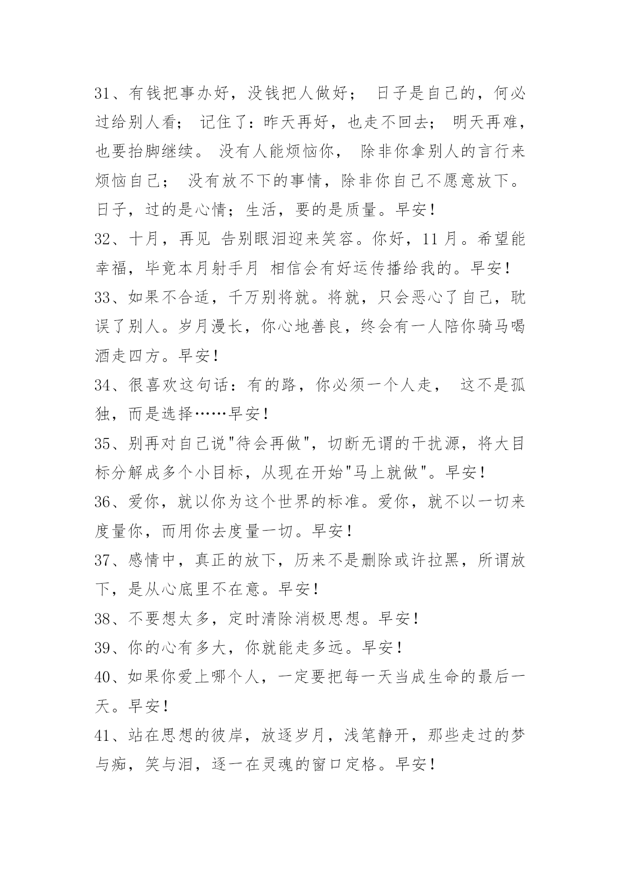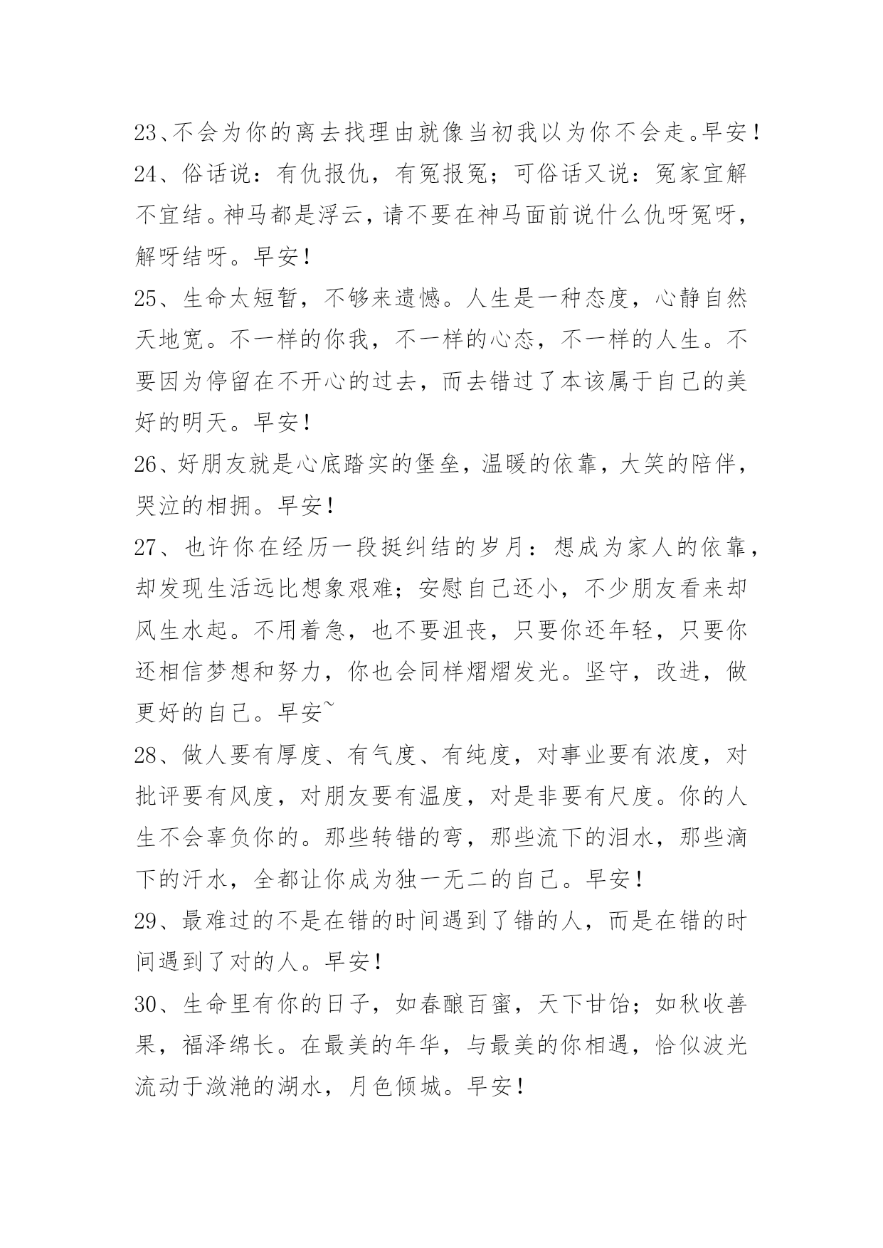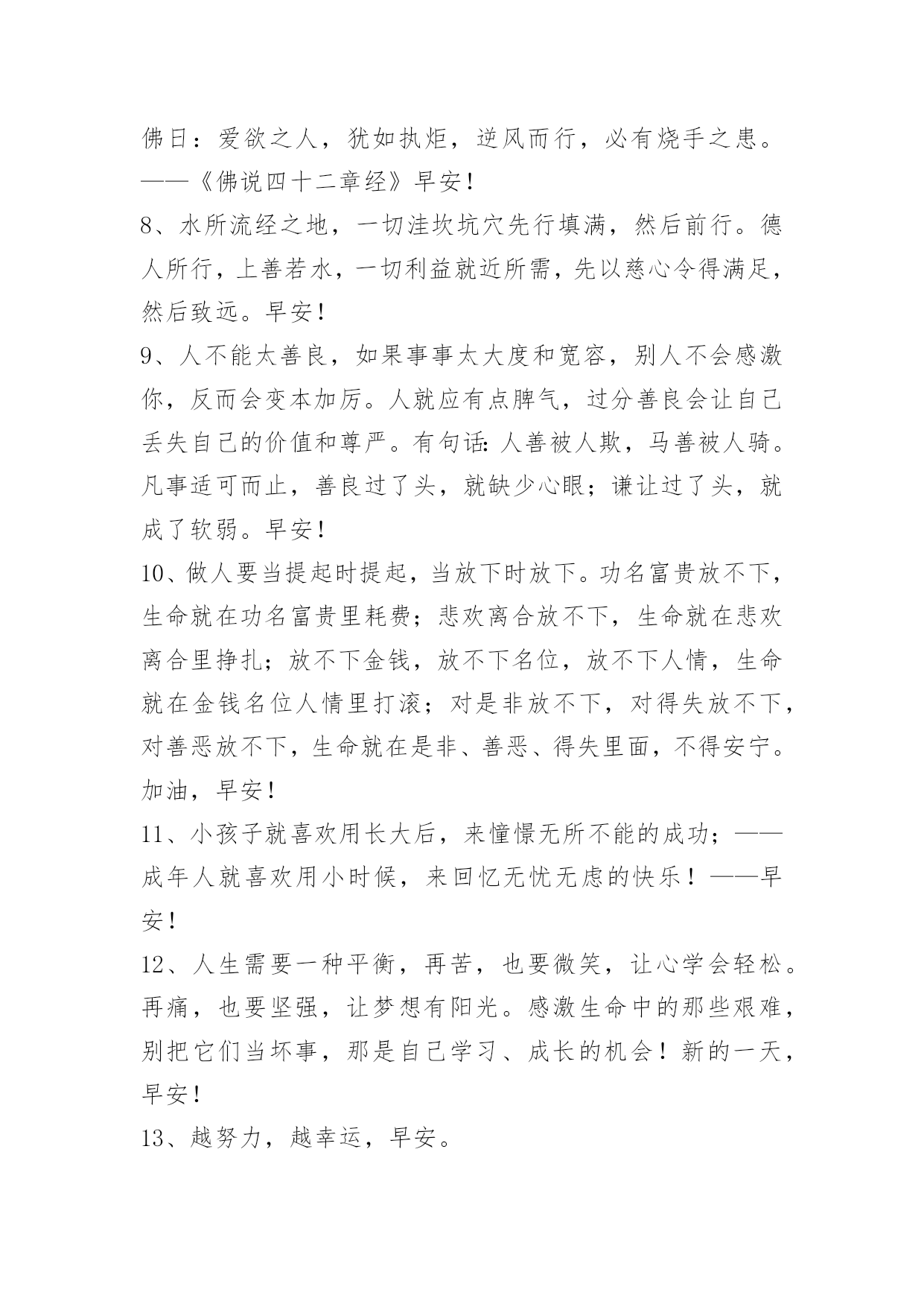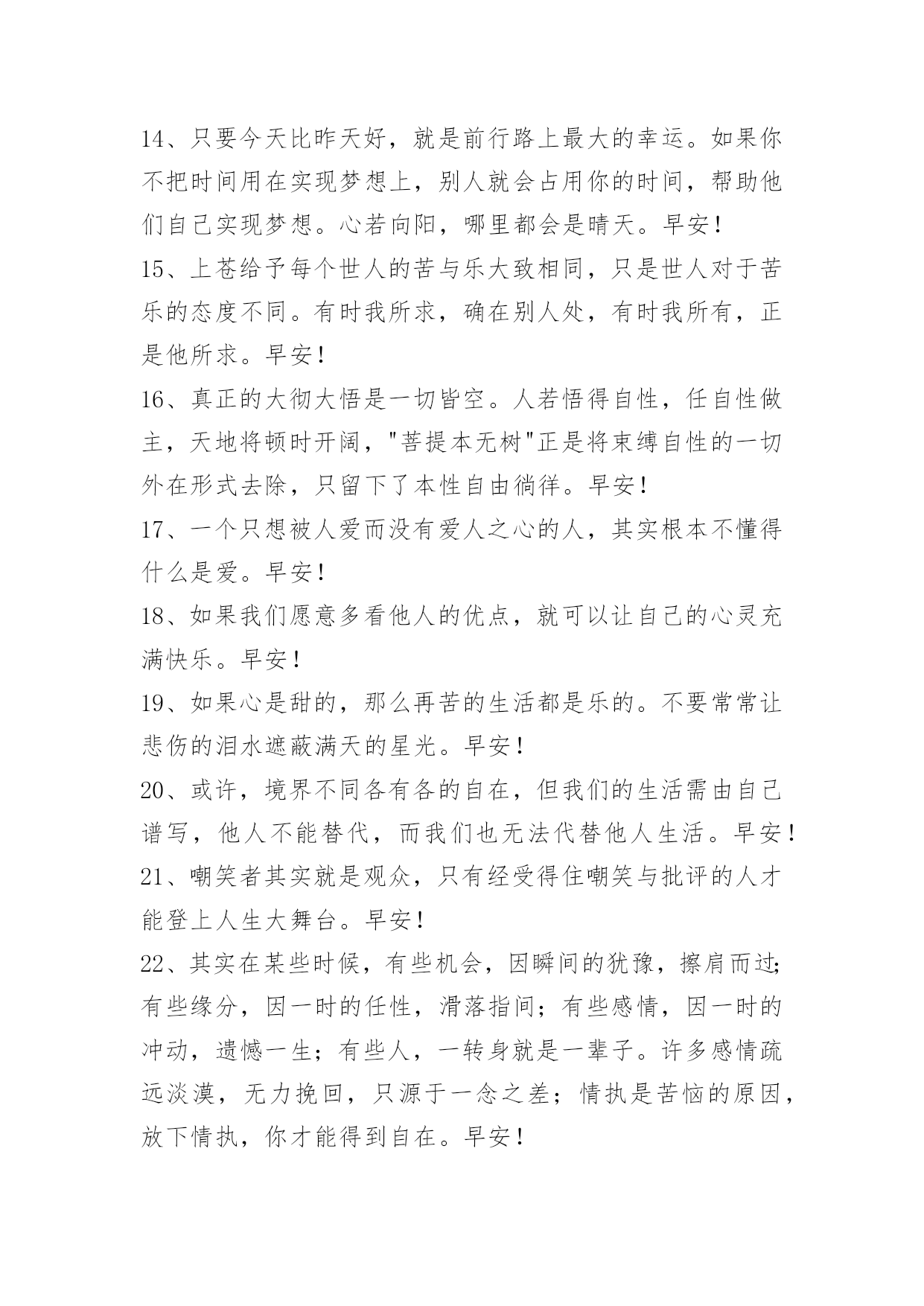 简单的新版早安问候语 简单的新版早安问候语汇编52句人生没有如果,你现在走的路,就是最好的路。早安!下面是小编为大家准备的新版早安问候语52句,欢迎大家前来欣赏。1、默默的放弃,悄悄的离开,寻找属于自己的天空。早安!2、我们珍惜一个人,一定是感动过;我们放弃一个人,一定是失望过。人在落魄时才能看清,谁泼的是盆盆冷水,谁捧的是颗颗担心。陪你的人,因暖心而情义交换,才离不开;懂你的人因疼惜而无可取代,才不离开。其实幸福的人不是拿到了世上最好的东西,而是珍惜了手上已经拥有的人。早安!3、命运掌握在自己手中,比如快乐,你不快乐谁会同情你的悲伤;比如坚强,你不坚强谁会怜悯你的懦弱……只有把命运掌握在自己手中,才能找到生命的闪光。早安!4、祖国是母亲。辱骂祖国就是辱骂母亲,背叛祖国就是背叛母亲。早安!5、佛不是只供人谈论的哲学和理论,佛是艺术的生活,佛是超越的本心,佛是一种广博的爱心善念。早安!6、要称准自己的重量,认清自己能力的底线。过分自信就是自负轻狂,我们要对自己有清醒的认识。早安!7、不理性的爱情,带来的只是灾难怎样经营幸福的爱情?佛日:爱欲之人,犹如执炬,逆风而行,必有烧手之患。——《佛说四十二章经》早安!8、水所流经之地,一切洼坎坑穴先行填满,然后前行。德人所行,上善若水,一切利益就近所需,先以慈心令得满足,然后致远。早安!9、人不能太善良,如果事事太大度和宽容,别人不会感激你,反而会变本加厉。人就应有点脾气,过分善良会让自己丢失自己的价值和尊严。有句话:人善被人欺,马善被人骑。凡事适可而止,善良过了头,就缺少心眼;谦让过了头,就成了软弱。早安!10、做人要当提起时提起,当放下时放下。功名富贵放不下,生命就在功名富贵里耗费;悲欢离合放不下,生命就在悲欢离合里挣扎;放不下金钱,放不下名位,放不下人情,生命就在金钱名位人情里打滚;对是非放不下,对得失放不下,对善恶放不下,生命就在是非、善恶、得失里面,不得安宁。加油,早安!11、小孩子就喜欢用长大后,来憧憬无所不能的成功;——成年人就喜欢用小时候,来回忆无忧无虑的快乐!——早安!12、人生需要一种平衡,再苦,也要微笑,让心学会轻松。再痛,也要坚强,让梦想有阳光。感激生命中的那些艰难,别把它们当坏事,那是自己学习、成长的机会!新的一天,早安!13、越努力,越幸运,早安。14、只要今天比昨天好,就是前行路上最大的幸运。如果你不把时间用在实现梦想上,别人就会占用你的时间,帮助他们自己实现梦想。心若向阳,哪里都会是晴天。早安!15、上苍给予每个世人的苦与乐大致相同,只是世人对于苦乐的态度不同。有时我所求,确在别人处,有时我所有,正是他所求。早安!16、真正的大彻大悟是一切皆空。人若悟得自性,任自性做主,天地将顿时开阔,"菩提本无树"正是将束缚自性的一切外在形式去除,只留下了本性自由徜徉。早安!17、一个只想被人爱而没有爱人之心的人,其实根本不懂得什么是爱。早安!18、如果我们愿意多看他人的优点,就可以让自己的心灵充满快乐。早安!19、如果心是甜的,那么再苦的生活都是乐的。不要常常让悲伤的泪水遮蔽满天的星光。早安!20、或许,境界不同各有各的自在,但我们的生活需由自己谱写,他人不能替代,而我们也无法代替他人生活。早安!21、嘲笑者其实就是观众,只有经受得住嘲笑与批评的人才能登上人生大舞台。早安!22、其实在某些时候,有些机会,因瞬间的犹豫,擦肩而过;有些缘分,因一时的任性,滑落指间;有些感情,因一时的冲动,遗憾一生;有些人,一转身就是一辈子。许多感情疏远淡漠,无力挽回,只源于一念之差;情执是苦恼的原因,放下情执,你才能得到自在。早安!23、不会为你的离去找理由就像当初我以为你不会走。早安!24、俗话说:有仇报仇,有冤报冤;可俗话又说:冤家宜解不宜结。神马都是浮云,请不要在神马面前说什么仇呀冤呀,解呀结呀。早安!25、生命太短暂,不够来遗憾。人生是一种态度,心静自然天地宽。不一样的你我,不一样的心态,不一样的人生。不要因为停留在不开心的过去,而去错过了本该属于自己的美好的明天。早安!26、好朋友就是心底踏实的堡垒,温暖的依靠,大笑的陪伴,哭泣的相拥。早安!27、也许你在经历一段挺纠结的岁月:想成为家人的依靠,却发现生活远比想象艰难;安慰自己还小,不少朋友看来却风生水起。不用着急,也不要沮丧,只要你还年轻,只要你还相信梦想和努力,你也会同样熠熠发光。坚守,改进,做更好的自己。早安~28、做人要有厚度、有气度、有纯度,对事业要有浓度,对批评要有风度,对朋友要有温度,对是非要有尺度。你的人生不会辜负你的。那些转错的弯,那些流下的泪水,那些滴下的汗水,全都让你成为独一无二的自己。早安!29、最难过的不是在错的时间遇到了错的人,而是在错的时间遇到了对的人。早安!30、生命里有你的日子,如春酿百蜜,天下