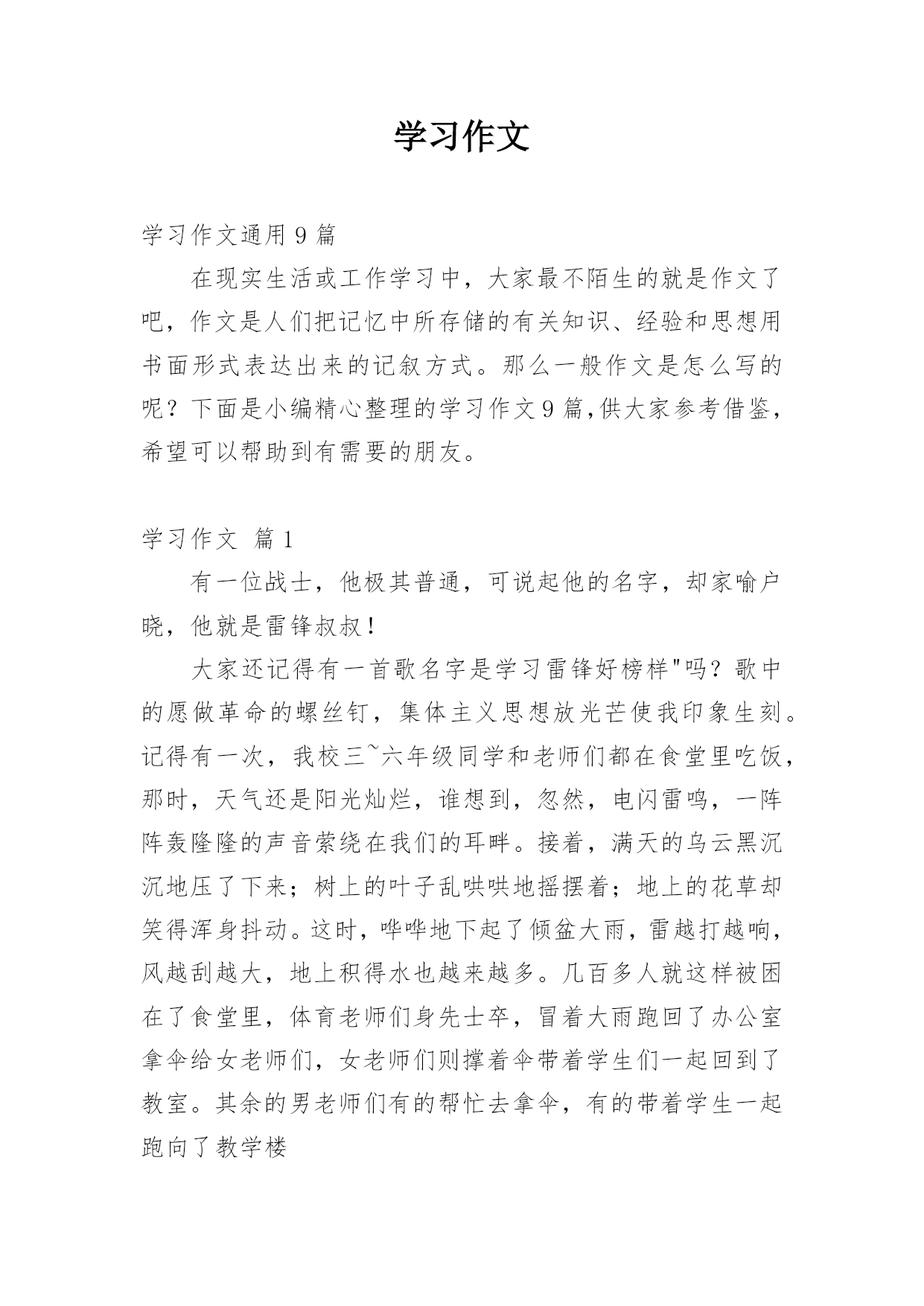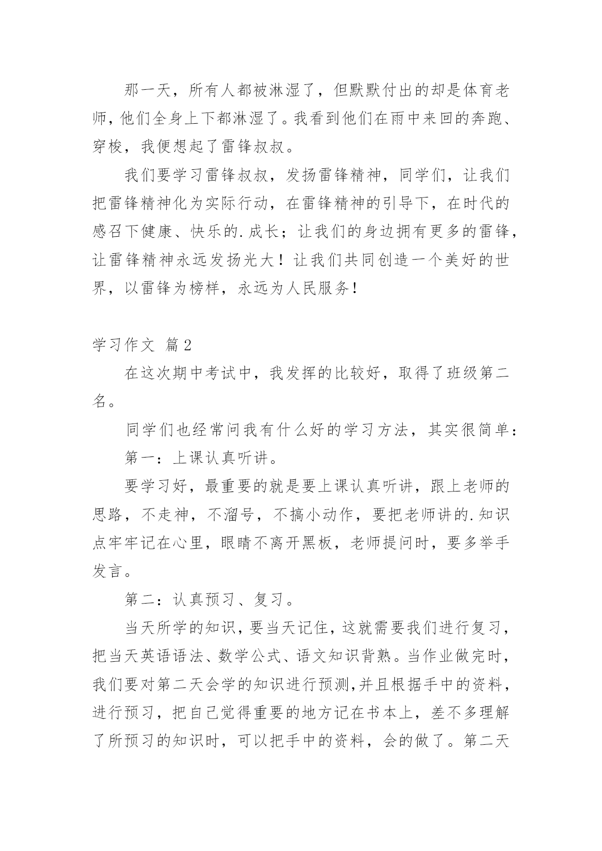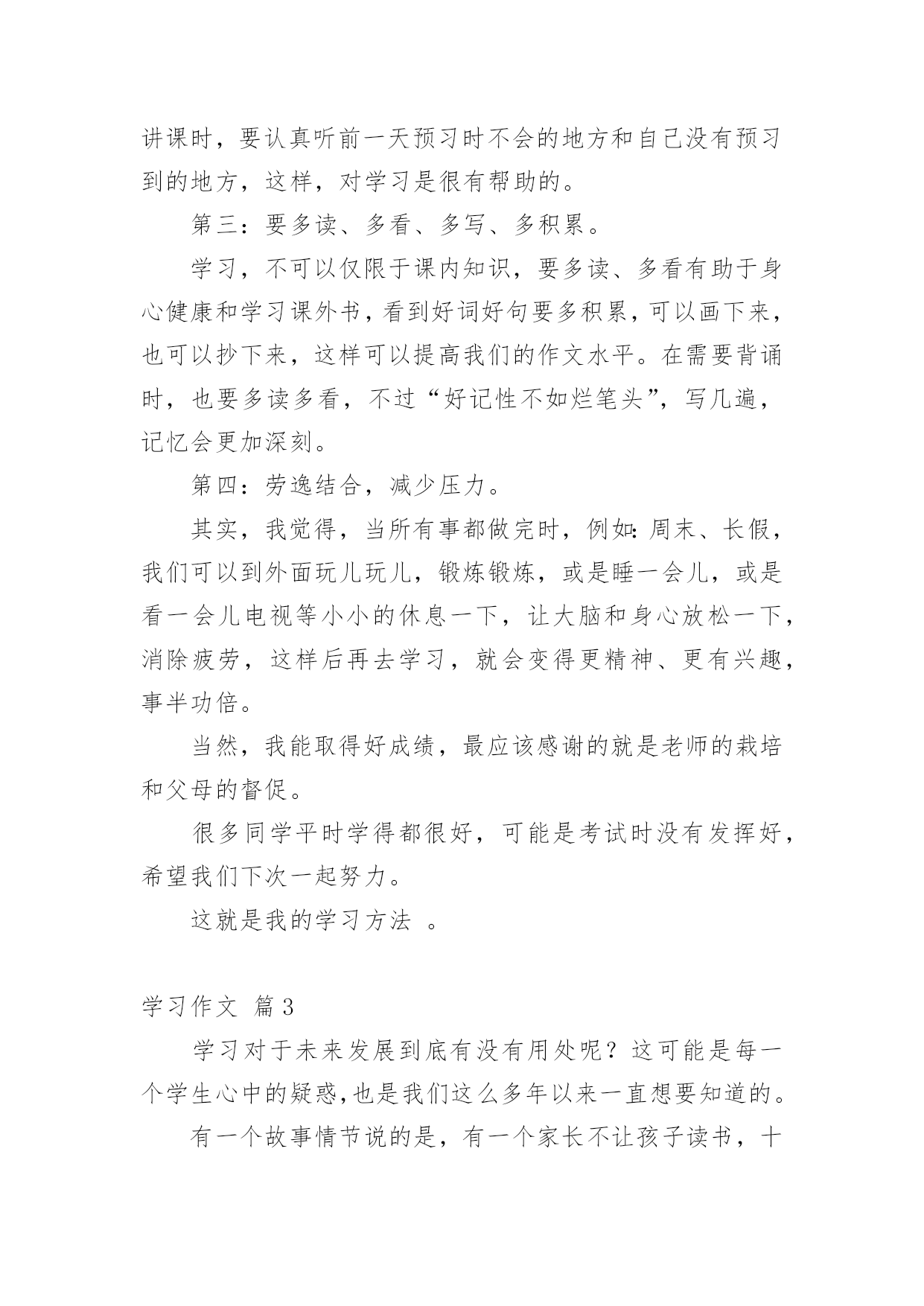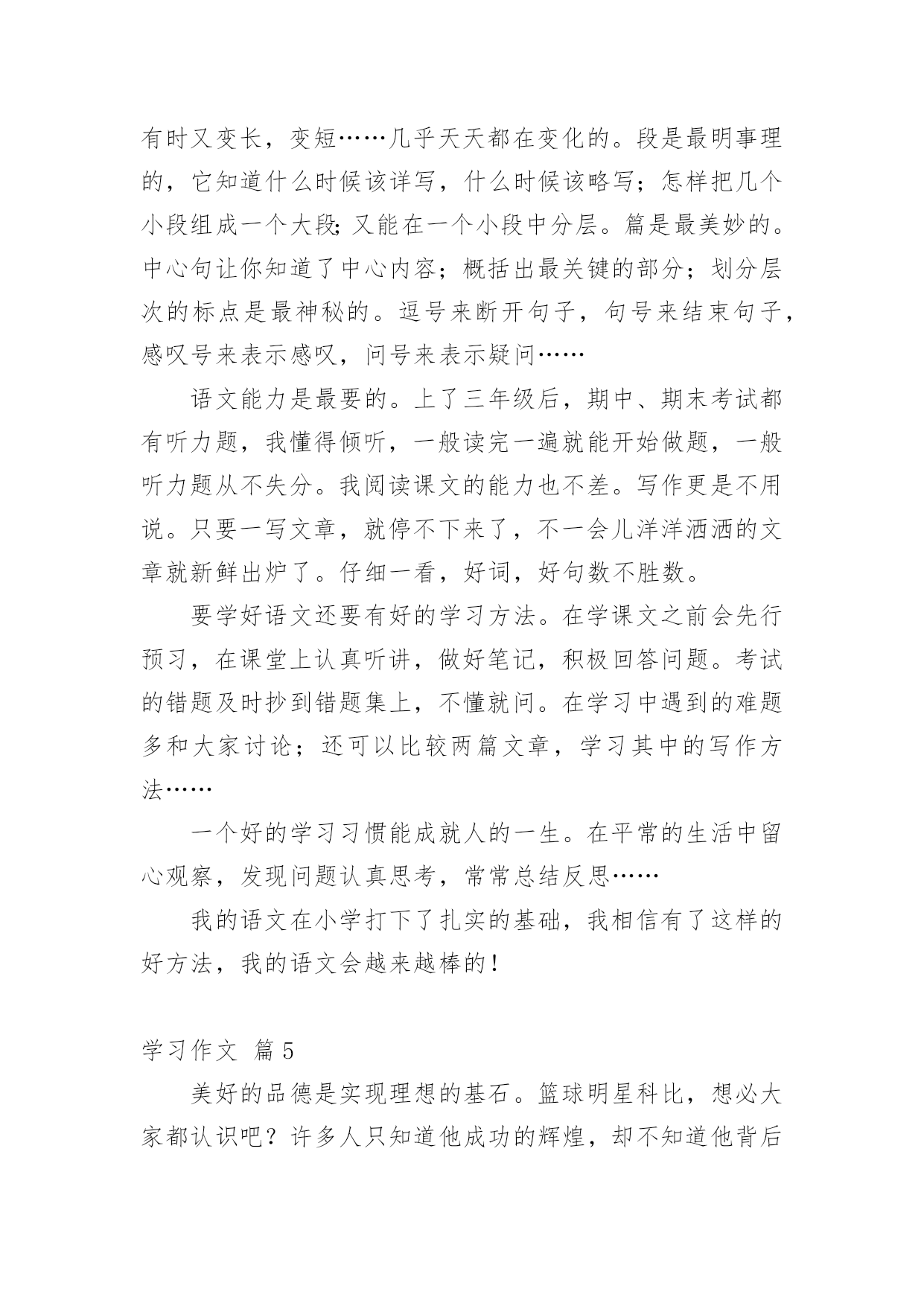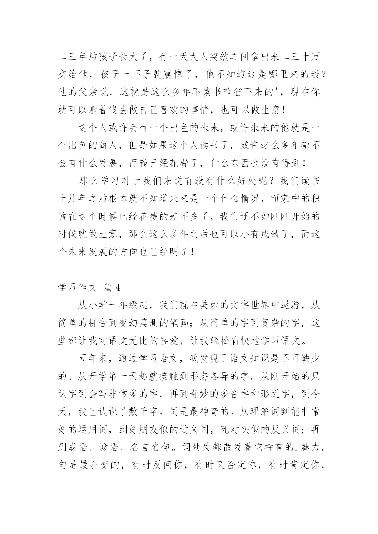 学习作文 学习作文通用9篇在现实生活或工作学习中,大家最不陌生的就是作文了吧,作文是人们把记忆中所存储的有关知识、经验和思想用书面形式表达出来的记叙方式。那么一般作文是怎么写的呢?下面是小编精心整理的学习作文9篇,供大家参考借鉴,希望可以帮助到有需要的朋友。学习作文篇1有一位战士,他极其普通,可说起他的名字,却家喻户晓,他就是雷锋叔叔!大家还记得有一首歌名字是学习雷锋好榜样"吗?歌中的愿做革命的螺丝钉,集体主义思想放光芒使我印象生刻。记得有一次,我校三~六年级同学和老师们都在食堂里吃饭,那时,天气还是阳光灿烂,谁想到,忽然,电闪雷鸣,一阵阵轰隆隆的声音萦绕在我们的耳畔。接着,满天的乌云黑沉沉地压了下来;树上的叶子乱哄哄地摇摆着;地上的花草却笑得浑身抖动。这时,哗哗地下起了倾盆大雨,雷越打越响,风越刮越大,地上积得水也越来越多。几百多人就这样被困在了食堂里,体育老师们身先士卒,冒着大雨跑回了办公室拿伞给女老师们,女老师们则撑着伞带着学生们一起回到了教室。其余的男老师们有的帮忙去拿伞,有的带着学生一起跑向了教学楼那一天,所有人都被淋湿了,但默默付出的却是体育老师,他们全身上下都淋湿了。我看到他们在雨中来回的奔跑、穿梭,我便想起了雷锋叔叔。我们要学习雷锋叔叔,发扬雷锋精神,同学们,让我们把雷锋精神化为实际行动,在雷锋精神的引导下,在时代的感召下健康、快乐的.成长;让我们的身边拥有更多的雷锋,让雷锋精神永远发扬光大!让我们共同创造一个美好的世界,以雷锋为榜样,永远为人民服务!学习作文篇2在这次期中考试中,我发挥的比较好,取得了班级第二名。同学们也经常问我有什么好的学习方法,其实很简单:第一:上课认真听讲。要学习好,最重要的就是要上课认真听讲,跟上老师的思路,不走神,不溜号,不搞小动作,要把老师讲的.知识点牢牢记在心里,眼睛不离开黑板,老师提问时,要多举手发言。第二:认真预习、复习。当天所学的知识,要当天记住,这就需要我们进行复习,把当天英语语法、数学公式、语文知识背熟。当作业做完时,我们要对第二天会学的知识进行预测,并且根据手中的资料,进行预习,把自己觉得重要的地方记在书本上,差不多理解了所预习的知识时,可以把手中的资料,会的做了。第二天讲课时,要认真听前一天预习时不会的地方和自己没有预习到的地方,这样,对学习是很有帮助的。第三:要多读、多看、多写、多积累。学习,不可以仅限于课内知识,要多读、多看有助于身心健康和学习课外书,看到好词好句要多积累,可以画下来,也可以抄下来,这样可以提高我们的作文水平。在需要背诵时,也要多读多看,不过“好记性不如烂笔头”,写几遍,记忆会更加深刻。第四:劳逸结合,减少压力。其实,我觉得,当所有事都做完时,例如:周末、长假,我们可以到外面玩儿玩儿,锻炼锻炼,或是睡一会儿,或是看一会儿电视等小小的休息一下,让大脑和身心放松一下,消除疲劳,这样后再去学习,就会变得更精神、更有兴趣,事半功倍。当然,我能取得好成绩,最应该感谢的就是老师的栽培和父母的督促。很多同学平时学得都很好,可能是考试时没有发挥好,希望我们下次一起努力。这就是我的学习方法。学习作文篇3学习对于未来发展到底有没有用处呢?这可能是每一个学生心中的疑惑,也是我们这么多年以来一直想要知道的。有一个故事情节说的是,有一个家长不让孩子读书,十二三年后孩子长大了,有一天大人突然之间拿出来二三十万交给他,孩子一下子就震惊了,他不知道这是哪里来的钱?他的父亲说,这就是这么多年不读书节省下来的',现在你就可以拿着钱去做自己喜欢的事情,也可以做生意!这个人或许会有一个出色的未来,或许未来的他就是一个出色的商人,但是如果这个人读书了,或许这么多年都不会有什么发展,而钱已经花费了,什么东西也没有得到!那么学习对于我们来说有没有什么好处呢?我们读书十几年之后根本就不知道未来是一个什么情况,而家中的积蓄在这个时候已经花费的差不多了,我们还不如刚刚开始的时候就做生意,那么这么多年之后也可以小有成绩了,而这个未来发展的方向也已经明了!学习作文篇4从小学一年级起,我们就在美妙的文字世界中遨游,从简单的拼音到变幻莫测的笔画;从简单的字到复杂的字,这些都让我对语文无比的喜爱,让我轻松愉快地学习语文。五年来,通过学习语文,我发现了语文知识是不可缺少的。从开学第一天起就接触到形态各异的字。从刚开始的只认字到会写非常多的字,再到奇妙的多音字和形近字,到今天,我已认识了数千字。词是最神奇的。从理解词到能非常好的运用词,到好朋友似的近义词,死对头似的反义词;再到成语、谚语、名言名句。词处处都散发着它特有的.魅力。句是最多变的,有时反问你,有时又否定你,有时肯定你,有时又变长,变短……几乎天天都在变化的。段是最明事理的,它知道什么时候该详写,什么时候该略写;怎样把几个小段组成一个大段;又能在一个