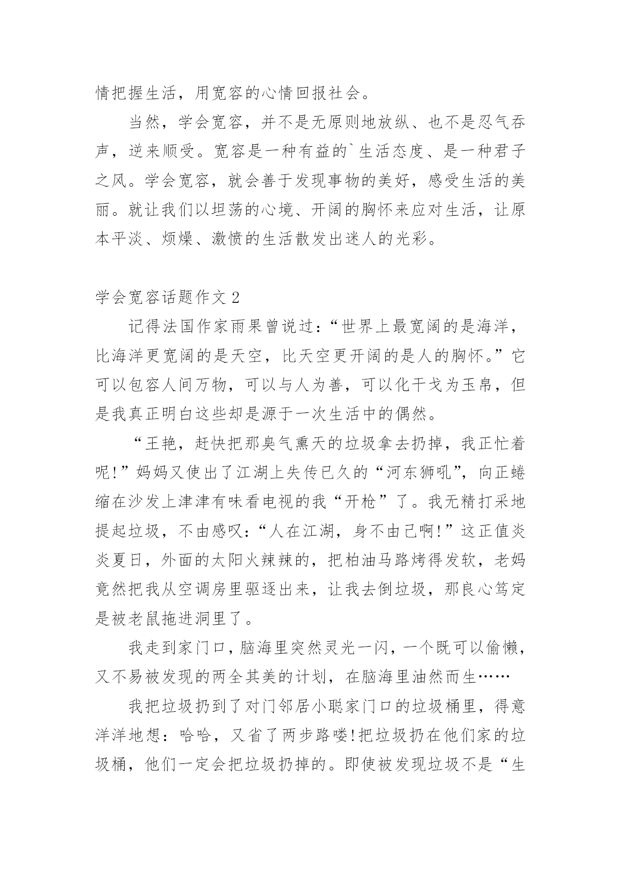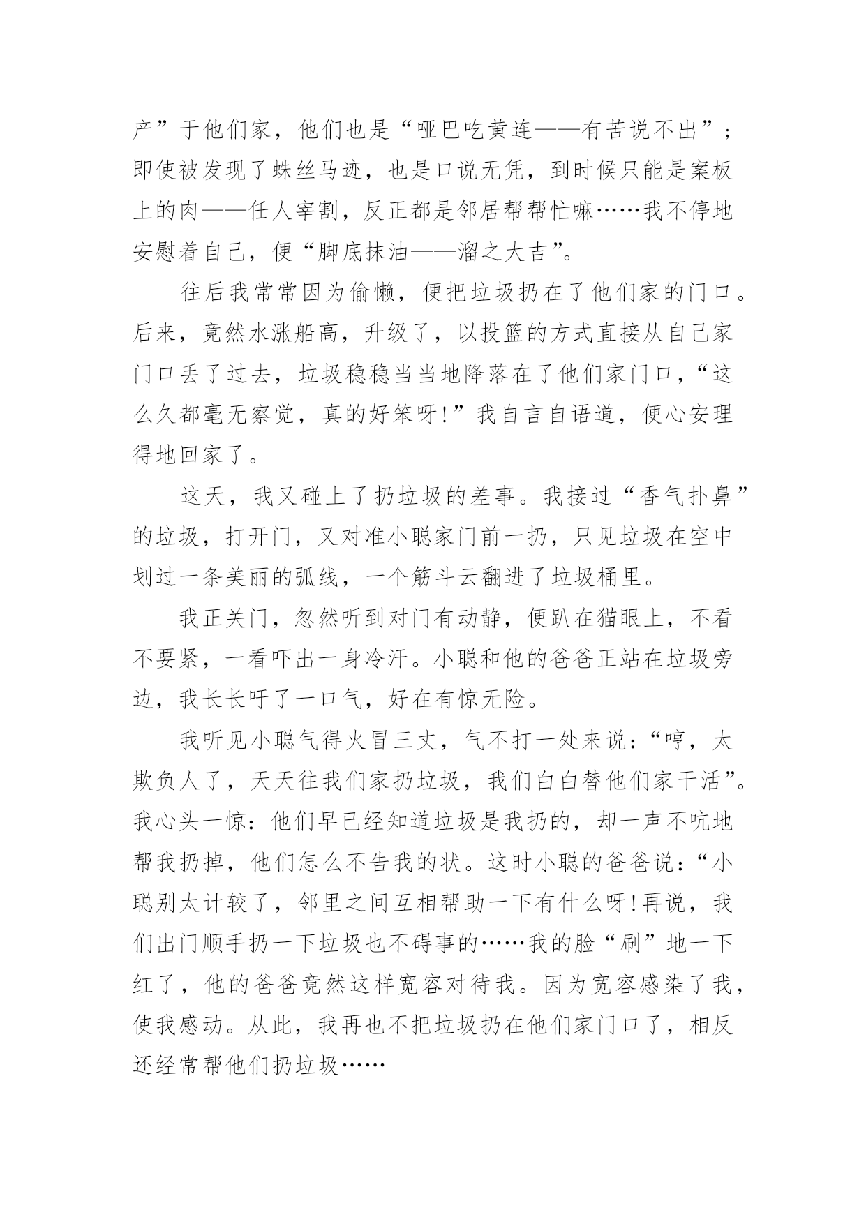 学会宽容话题作文 学会宽容话题作文2篇在日常学习、工作或生活中,大家总少不了接触作文吧,根据写作命题的特点,作文可以分为命题作文和非命题作文。相信写作文是一个让许多人都头痛的问题,以下是小编为大家收集的学会宽容话题作文,欢迎阅读与收藏。学会宽容话题作文1宽容,是一种豁达、也是一种理解、一种尊重、一种激励,更是大智慧的象征、强者显示自信的表现。宽容是一种坦荡,可以无私无畏、无拘无束、无尘无染。战国时,楚王宴请臣下。灯忽灭,一醉酒的将军拉扯楚王妃子的衣服,妃子扯下了将军的帽缨,要求楚王追查。楚王为保住将军的面子,下令所有的人一律在黑暗中扯掉自己的帽缨,然后才重新点灯,继续宴会。后来,这位被宽容了的将军以超常的勇武为楚国征战沙场。可见,学会宽容,就要学会原谅一个人小的过失,给人以悔改的机会。宽容是一种大度、是高尚情操的表现。宽容之中蕴含着一份做人的谦虚和真诚,蕴含着一种对他人的容纳与尊重。学会宽容,心灵上就会获得宁静和安详。学会宽容,就能心胸开阔的生活。很多时候,宽容会给人带来一种良好的人生感觉,使我们感到愉悦和温暖,生活中就会少些怨气和烦恼,就能感觉到生活中快乐的丰富,而不是缺少。宽容,是一种高尚的美德。相逢一笑泯恩仇是宽容的最高境界。事实上这一美德做得到的人并不多,即使如此,我们也不应放弃这种追求,因为忘却别人的过失,以宽容的心态对人、以宽阔胸怀回报社会,是一种利人利已、有益社会的良循环。屠格涅夫曾说:生活过,而不会宽容别人的人,是不配受到别人的宽容的。所以,当你宽容了别人,在自己有过失或错误的时候也往往能得到他人的宽容。学会宽容,就学会一种有益的做人责任、就学会一种良好的做人方法。生活中宽容的力量巨大。因为批评会让人不服,谩骂会让人厌恶,羞辱会让人恼火,威胁会让人愤怒。唯有宽容让人无法躲避,无法退却,无法阻挡,无法反抗。蔺相如对廉颇傲慢无礼的宽容忍让,最终感化廉颇负荆请罪,留下千古美谈将相和,使赵国虽小而无人敢犯;周总理以其容纳天地的博大胸怀,在外交上奉行求同存异、和平共处方针,造就了他伟大人格,树立了中华民族的大国风范。同样,邻里间团结和睦需要宽容,夫妻间白头偕老离不开宽容,一个健康文明进步的社会处处离不开宽容。假如没有了宽容,则国与国之间会兵戎相见,人与人之间会拳脚相加,社会将因此变得黯然。有些人自诩为洞明世事、人情达练,却在名誉、地位面前斤斤计较,狭隘自私;有些人对别人的习惯、见解不能容纳,这并不意味着维护真理,只能叫心胸狭窄;有些人对他人的行为口头上激愤汹汹,行为上却不做出任何努力,这只能叫虚伪。然而,我们每个人都应该重审自己,以宽容的心情把握生活,用宽容的心情回报社会。当然,学会宽容,并不是无原则地放纵、也不是忍气吞声,逆来顺受。宽容是一种有益的`生活态度、是一种君子之风。学会宽容,就会善于发现事物的美好,感受生活的美丽。就让我们以坦荡的心境、开阔的胸怀来应对生活,让原本平淡、烦燥、激愤的生活散发出迷人的光彩。学会宽容话题作文2记得法国作家雨果曾说过:“世界上最宽阔的是海洋,比海洋更宽阔的是天空,比天空更开阔的是人的胸怀。”它可以包容人间万物,可以与人为善,可以化干戈为玉帛,但是我真正明白这些却是源于一次生活中的偶然。“王艳,赶快把那臭气熏天的垃圾拿去扔掉,我正忙着呢!”妈妈又使出了江湖上失传已久的“河东狮吼”,向正蜷缩在沙发上津津有味看电视的我“开枪”了。我无精打采地提起垃圾,不由感叹:“人在江湖,身不由己啊!”这正值炎炎夏日,外面的太阳火辣辣的,把柏油马路烤得发软,老妈竟然把我从空调房里驱逐出来,让我去倒垃圾,那良心笃定是被老鼠拖进洞里了。我走到家门口,脑海里突然灵光一闪,一个既可以偷懒,又不易被发现的两全其美的计划,在脑海里油然而生……我把垃圾扔到了对门邻居小聪家门口的垃圾桶里,得意洋洋地想:哈哈,又省了两步路喽!把垃圾扔在他们家的垃圾桶,他们一定会把垃圾扔掉的。即使被发现垃圾不是“生产”于他们家,他们也是“哑巴吃黄连——有苦说不出”;即使被发现了蛛丝马迹,也是口说无凭,到时候只能是案板上的肉——任人宰割,反正都是邻居帮帮忙嘛……我不停地安慰着自己,便“脚底抹油——溜之大吉”。往后我常常因为偷懒,便把垃圾扔在了他们家的门口。后来,竟然水涨船高,升级了,以投篮的方式直接从自己家门口丢了过去,垃圾稳稳当当地降落在了他们家门口,“这么久都毫无察觉,真的好笨呀!”我自言自语道,便心安理得地回家了。这天,我又碰上了扔垃圾的差事。我接过“香气扑鼻”的垃圾,打开门,又对准小聪家门前一扔,只见垃圾在空中划过一条美丽的弧线,一个筋斗云翻进了垃圾桶里。我正关门,忽然听到对门有动静,便趴在猫眼上,不看不要紧,一看吓出一身冷汗。小聪和他的爸爸正站在垃圾旁边,我长长吁了一口气,好在有惊无险。我听见小聪气得火冒三丈,气不打一处来说:“哼