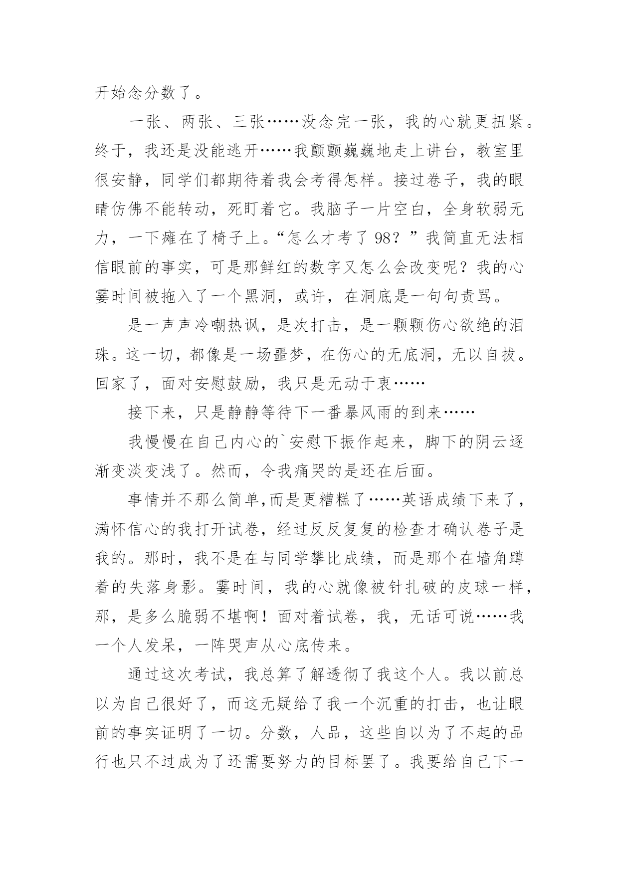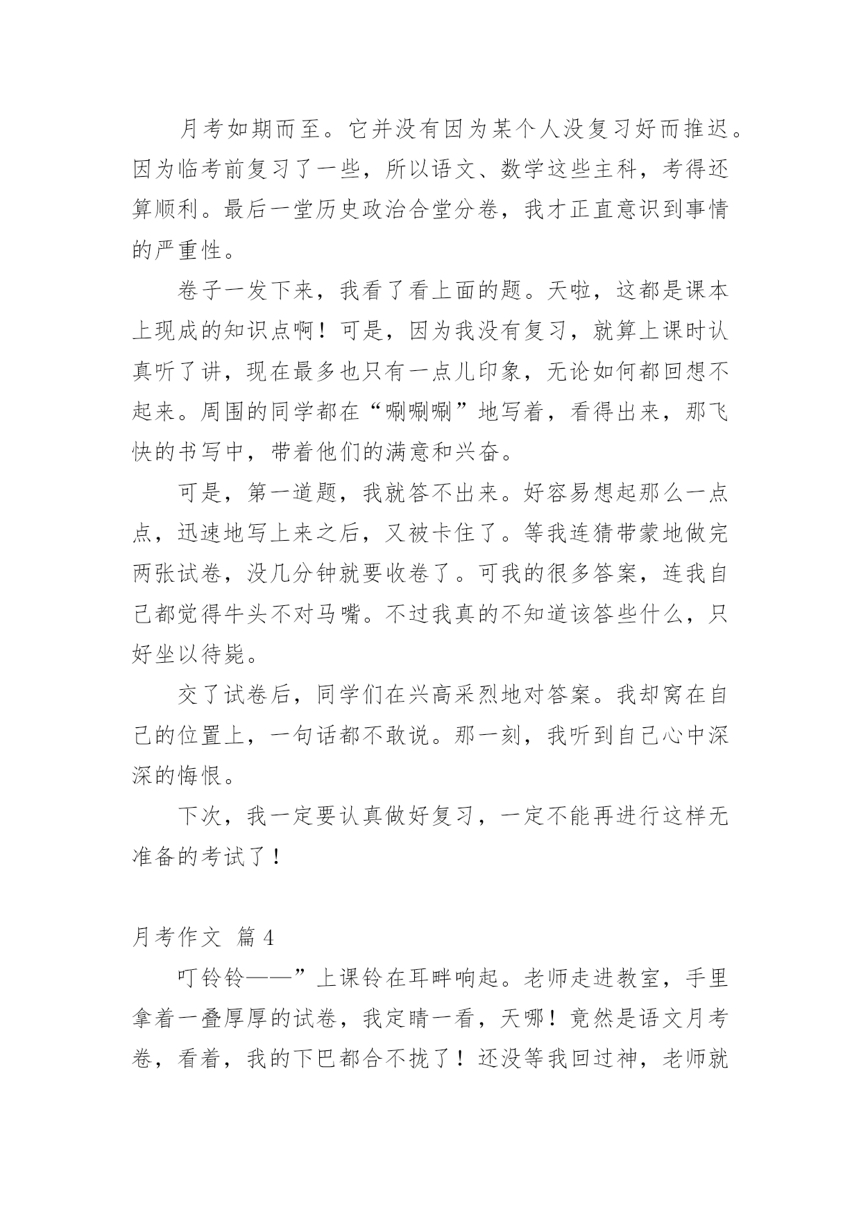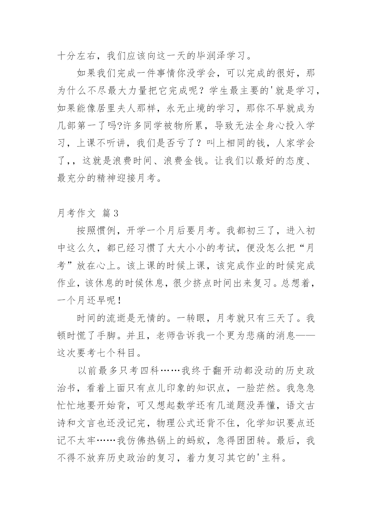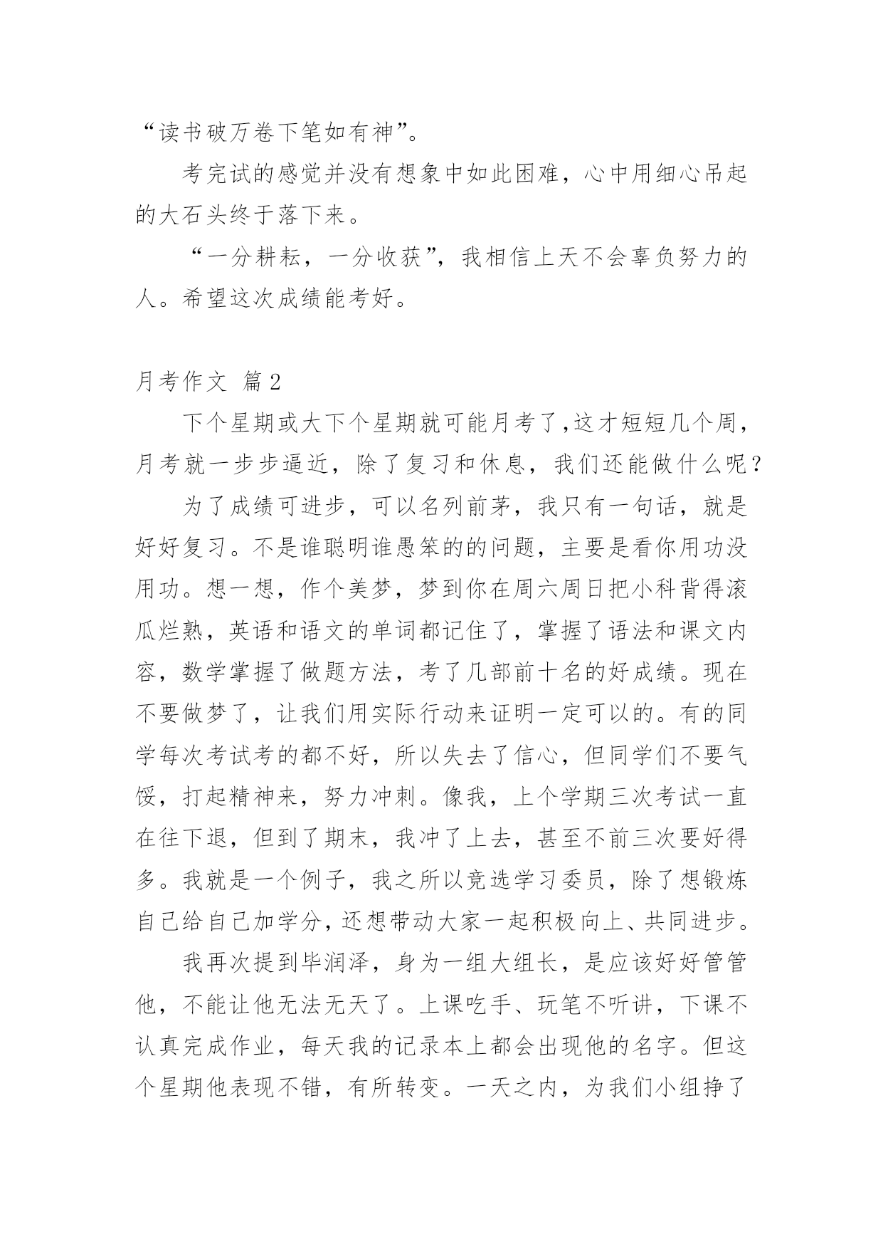 月考作文 月考作文【精】无论是身处学校还是步入社会,大家总少不了接触作文吧,作文是一种言语活动,具有高度的综合性和创造性。一篇什么样的作文才能称之为优秀作文呢?以下是小编收集整理的月考作文9篇,欢迎大家分享。月考作文篇1热着热着,终于熬过了第一天的月考,想想今天第二场考政治,心中甚是发慌,睡梦中的都是政治。到底是政治给我施了魔咒,还是我给自己贴了太多“护身符”?本来想早起复习一下,后来思索着:“临时抱佛脚没啥好处,何况考前还有四五十分钟,不如就再好好享受享受甜美的梦乡。”虽说心中还是忐忑不安,但充足地时间还是让我美美的睡了一觉。该来的终究还是来了。我盯着手表,心中的.鼓随着秒针一起敲打,“五、四、三、二、一”开始发卷!惨白的试卷飞速来到眼前,我迅速翻看了试卷,一边快速做好了打算:十分钟做选择题,剩余时间分别做材料题和检查。手头的笔在试卷上刷刷的写,头顶的空调呼呼的吹,但雨点般大小的汗珠仍划过脸颊,背后也湿了一片。平常我要花一个自习写政治,这会儿只用了二十五分钟!果然还是“读书破万卷下笔如有神”。考完试的感觉并没有想象中如此困难,心中用细心吊起的大石头终于落下来。“一分耕耘,一分收获”,我相信上天不会辜负努力的人。希望这次成绩能考好。月考作文篇2下个星期或大下个星期就可能月考了,这才短短几个周,月考就一步步逼近,除了复习和休息,我们还能做什么呢?为了成绩可进步,可以名列前茅,我只有一句话,就是好好复习。不是谁聪明谁愚笨的的问题,主要是看你用功没用功。想一想,作个美梦,梦到你在周六周日把小科背得滚瓜烂熟,英语和语文的单词都记住了,掌握了语法和课文内容,数学掌握了做题方法,考了几部前十名的好成绩。现在不要做梦了,让我们用实际行动来证明一定可以的。有的同学每次考试考的都不好,所以失去了信心,但同学们不要气馁,打起精神来,努力冲刺。像我,上个学期三次考试一直在往下退,但到了期末,我冲了上去,甚至不前三次要好得多。我就是一个例子,我之所以竞选学习委员,除了想锻炼自己给自己加学分,还想带动大家一起积极向上、共同进步。我再次提到毕润泽,身为一组大组长,是应该好好管管他,不能让他无法无天了。上课吃手、玩笔不听讲,下课不认真完成作业,每天我的记录本上都会出现他的名字。但这个星期他表现不错,有所转变。一天之内,为我们小组挣了十分左右,我们应该向这一天的毕润泽学习。如果我们完成一件事情你没学会,可以完成的很好,那为什么不尽最大力量把它完成呢?学生最主要的'就是学习,如果能像居里夫人那样,永无止境的学习,那你不早就成为几部第一了吗?许多同学被物所累,导致无法全身心投入学习,上课不听讲,我们是否亏了?叫上相同的钱,人家学会了,,这就是浪费时间、浪费金钱。让我们以最好的态度、最充分的精神迎接月考。月考作文篇3按照惯例,开学一个月后要月考。我都初三了,进入初中这么久,都已经习惯了大大小小的考试,便没怎么把“月考”放在心上。该上课的时候上课,该完成作业的时候完成作业,该休息的时候休息,很少挤点时间出来复习。总想着,一个月还早呢!时间的流逝是无情的。一转眼,月考就只有三天了。我顿时慌了手脚。并且,老师告诉我一个更为悲痛的消息——这次要考七个科目。以前最多只考四科……我终于翻开动都没动的历史政治书,看着上面只有点儿印象的知识点,一脸茫然。我急急忙忙地要开始背,可又想起数学还有几道题没弄懂,语文古诗和文言也还没记完,物理公式还背不住,化学知识要点还记不太牢……我仿佛热锅上的蚂蚁,急得团团转。最后,我不得不放弃历史政治的复习,着力复习其它的'主科。月考如期而至。它并没有因为某个人没复习好而推迟。因为临考前复习了一些,所以语文、数学这些主科,考得还算顺利。最后一堂历史政治合堂分卷,我才正直意识到事情的严重性。卷子一发下来,我看了看上面的题。天啦,这都是课本上现成的知识点啊!可是,因为我没有复习,就算上课时认真听了讲,现在最多也只有一点儿印象,无论如何都回想不起来。周围的同学都在“唰唰唰”地写着,看得出来,那飞快的书写中,带着他们的满意和兴奋。可是,第一道题,我就答不出来。好容易想起那么一点点,迅速地写上来之后,又被卡住了。等我连猜带蒙地做完两张试卷,没几分钟就要收卷了。可我的很多答案,连我自己都觉得牛头不对马嘴。不过我真的不知道该答些什么,只好坐以待毙。交了试卷后,同学们在兴高采烈地对答案。我却窝在自己的位置上,一句话都不敢说。那一刻,我听到自己心中深深的悔恨。下次,我一定要认真做好复习,一定不能再进行这样无准备的考试了!月考作文篇4叮铃铃——”上课铃在耳畔响起。老师走进教室,手里拿着一叠厚厚的试卷,我定睛一看,天哪!竟然是语文月考卷,看着,我的下巴都合不拢了!还没等我回过神,老师就开始念分数了。一张、两张、三张……没念完一张,我的心就更扭紧。终于,我还是没能逃开……