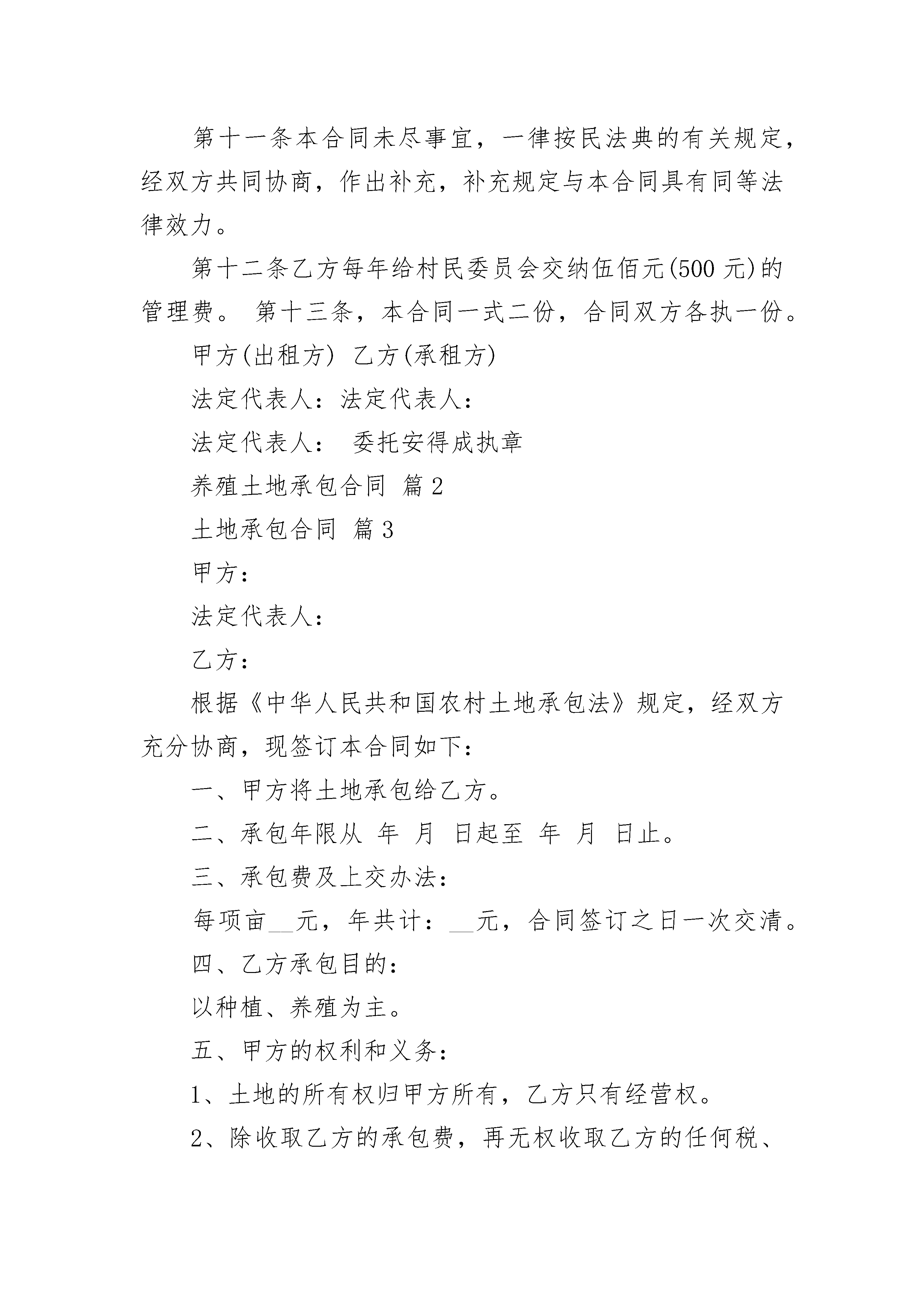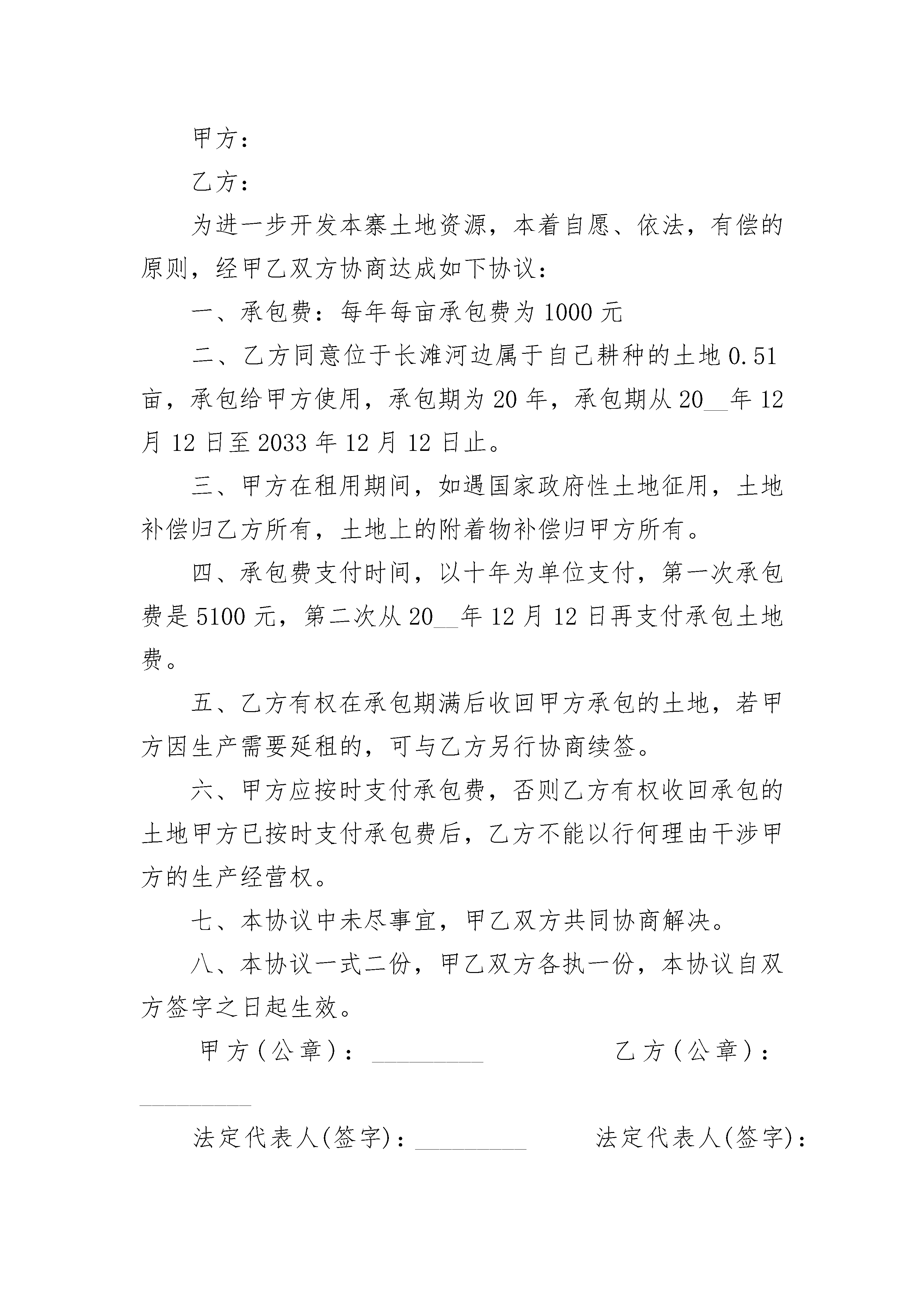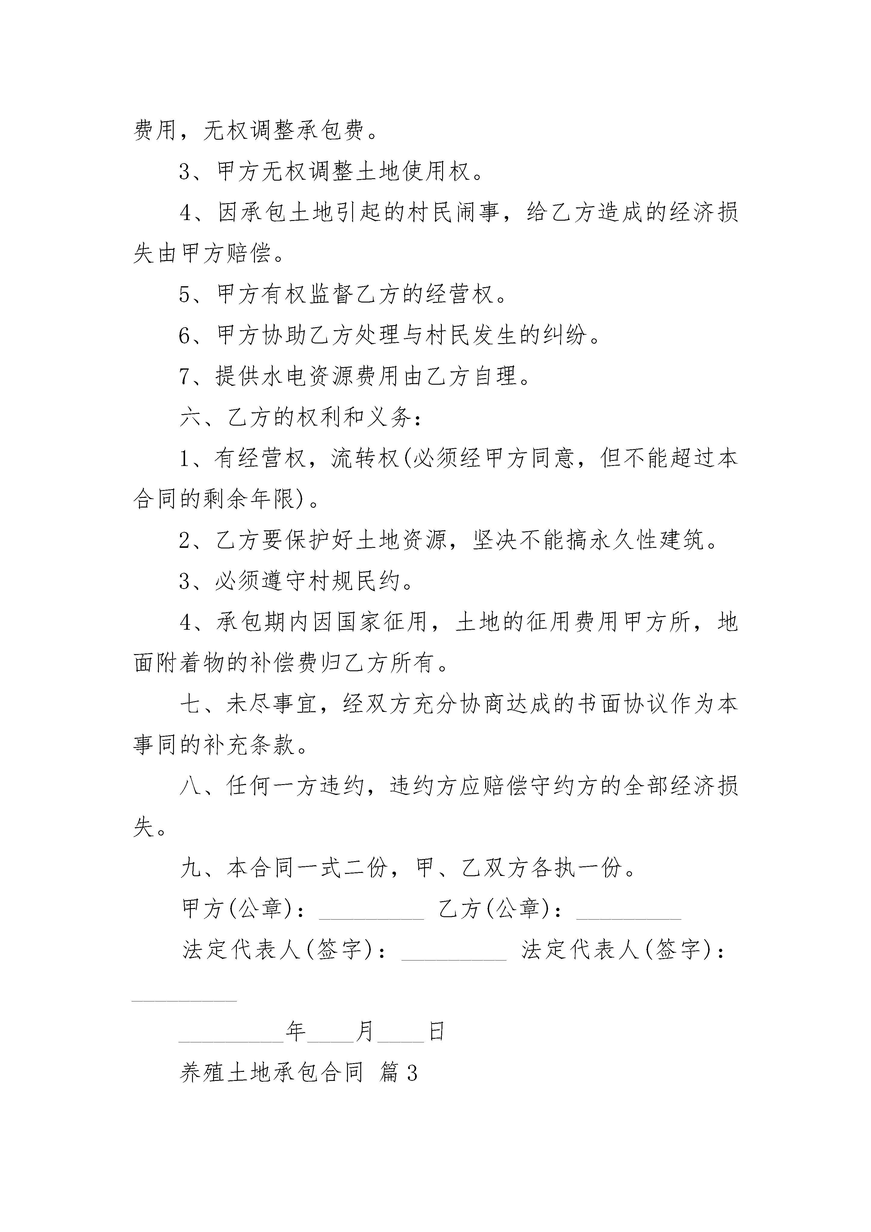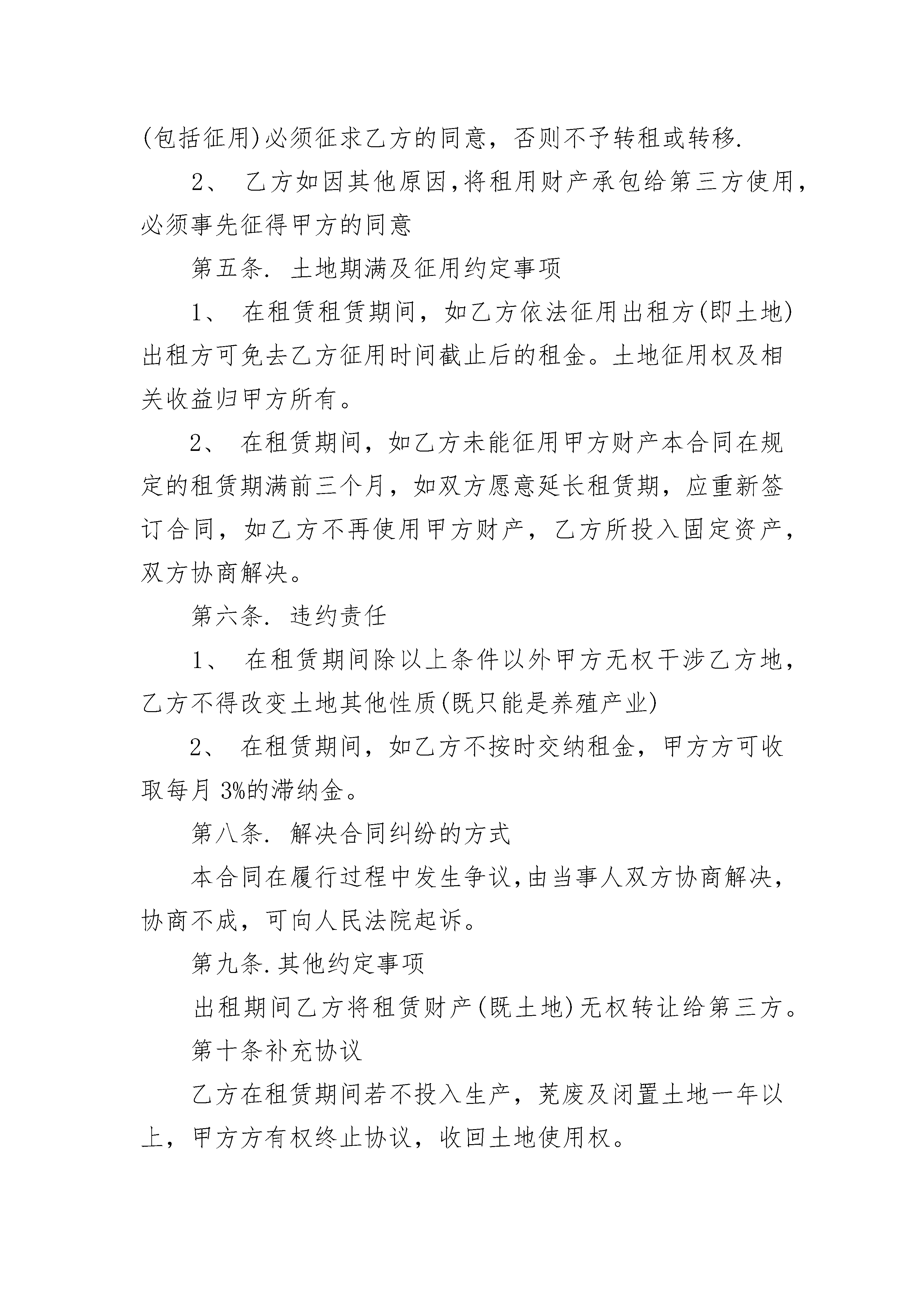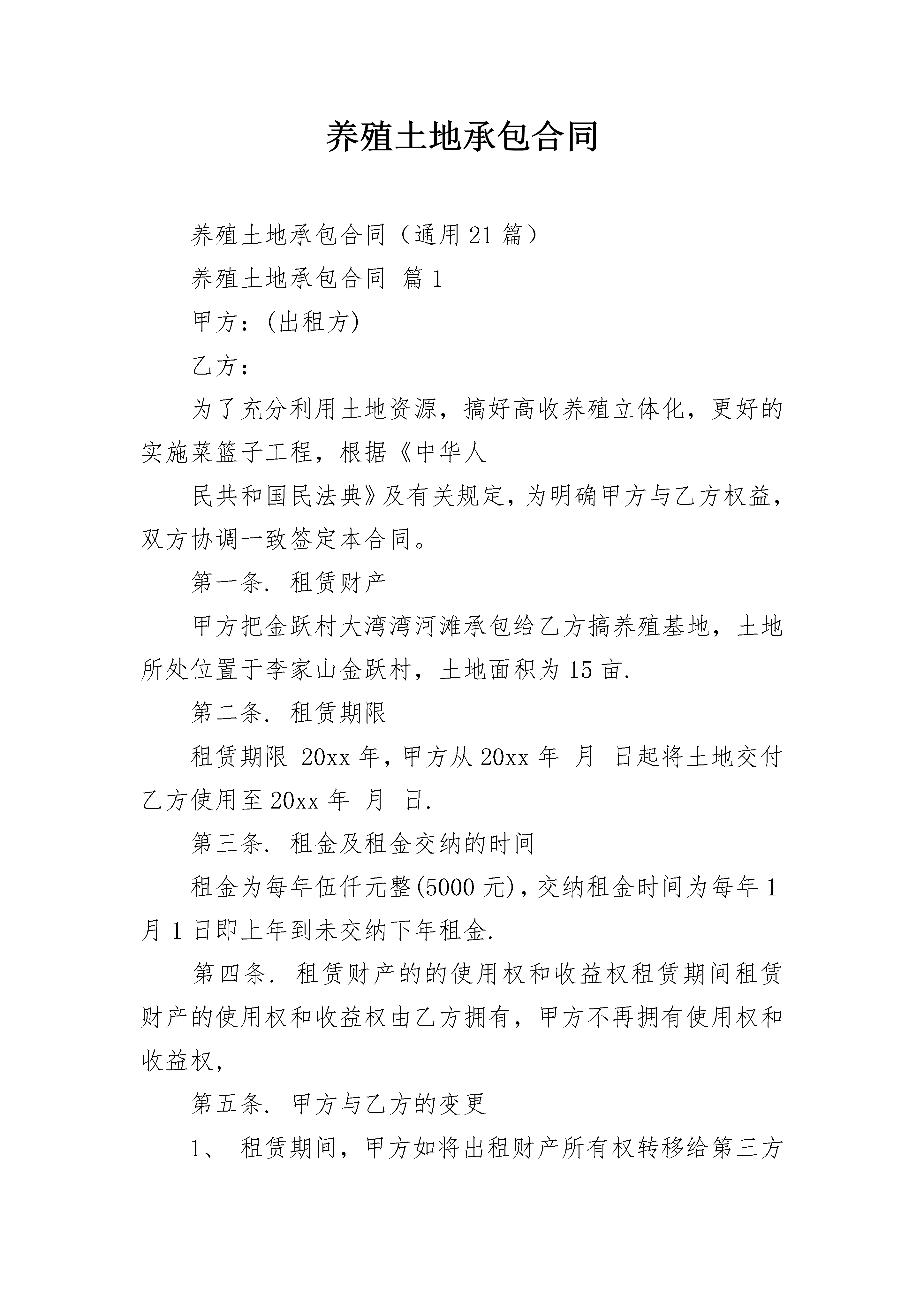 养殖土地承包合同养殖土地承包合同(通用21篇)养殖土地承包合同篇1甲方:(出租方)乙方:为了充分利用土地资源,搞好高收养殖立体化,更好的实施菜篮子工程,根据《中华人民共和国民法典》及有关规定,为明确甲方与乙方权益,双方协调一致签定本合同。第一条.租赁财产甲方把金跃村大湾湾河滩承包给乙方搞养殖基地,土地所处位置于李家山金跃村,土地面积为15亩.第二条.租赁期限租赁期限20xx年,甲方从20xx年月日起将土地交付乙方使用至20xx年月日.第三条.租金及租金交纳的时间租金为每年伍仟元整(5000元),交纳租金时间为每年1月1日即上年到未交纳下年租金.第四条.租赁财产的的使用权和收益权租赁期间租赁财产的使用权和收益权由乙方拥有,甲方不再拥有使用权和收益权,第五条.甲方与乙方的变更1、租赁期间,甲方如将出租财产所有权转移给第三方(包括征用)必须征求乙方的同意,否则不予转租或转移.2、乙方如因其他原因,将租用财产承包给第三方使用,必须事先征得甲方的同意第五条.土地期满及征用约定事项1、在租赁租赁期间,如乙方依法征用出租方(即土地)出租方可免去乙方征用时间截止后的租金。土地征用权及相关收益归甲方所有。2、在租赁期间,如乙方未能征用甲方财产本合同在规定的租赁期满前三个月,如双方愿意延长租赁期,应重新签订合同,如乙方不再使用甲方财产,乙方所投入固定资产,双方协商解决。第六条.违约责任1、在租赁期间除以上条件以外甲方无权干涉乙方地,乙方不得改变土地其他性质(既只能是养殖产业)2、在租赁期间,如乙方不按时交纳租金,甲方方可收取每月3%的滞纳金。第八条.解决合同纠纷的方式本合同在履行过程中发生争议,由当事人双方协商解决,协商不成,可向人民法院起诉。第九条.其他约定事项出租期间乙方将租赁财产(既土地)无权转让给第三方。第十条补充协议乙方在租赁期间若不投入生产,茺废及闭置土地一年以上,甲方方有权终止协议,收回土地使用权。第十一条本合同未尽事宜,一律按民法典的有关规定,经双方共同协商,作出补充,补充规定与本合同具有同等法律效力。第十二条乙方每年给村民委员会交纳伍佰元(500元)的管理费。第十三条,本合同一式二份,合同双方各执一份。甲方(出租方)乙方(承租方)法定代表人:法定代表人:法定代表人:委托安得成执章养殖土地承包合同篇2土地承包合同篇3甲方:法定代表人:乙方:根据《中华人民共和国农村土地承包法》规定,经双方充分协商,现签订本合同如下:一、甲方将土地承包给乙方。二、承包年限从年月日起至年月日止。三、承包费及上交办法:每项亩__元,年共计:__元,合同签订之日一次交清。四、乙方承包目的:以种植、养殖为主。五、甲方的权利和义务:1、土地的所有权归甲方所有,乙方只有经营权。2、除收取乙方的承包费,再无权收取乙方的任何税、费用,无权调整承包费。3、甲方无权调整土地使用权。4、因承包土地引起的村民闹事,给乙方造成的经济损失由甲方赔偿。5、甲方有权监督乙方的经营权。6、甲方协助乙方处理与村民发生的纠纷。7、提供水电资源费用由乙方自理。六、乙方的权利和义务:1、有经营权,流转权(必须经甲方同意,但不能超过本合同的剩余年限)。2、乙方要保护好土地资源,坚决不能搞永久性建筑。3、必须遵守村规民约。4、承包期内因国家征用,土地的征用费用甲方所,地面附着物的补偿费归乙方所有。七、未尽事宜,经双方充分协商达成的书面协议作为本事同的补充条款。八、任何一方违约,违约方应赔偿守约方的全部经济损失。九、本合同一式二份,甲、乙双方各执一份。甲方(公章):_________乙方(公章):_________法定代表人(签字):_________法定代表人(签字):__________________年____月____日养殖土地承包合同篇3甲方:乙方:为进一步开发本寨土地资源,本着自愿、依法,有偿的原则,经甲乙双方协商达成如下协议:一、承包费:每年每亩承包费为1000元二、乙方同意位于长滩河边属于自己耕种的土地0.51亩,承包给甲方使用,承包期为20年,承包期从20__年12月12日至2033年12月12日止。三、甲方在租用期间,如遇国家政府性土地征用,土地补偿归乙方所有,土地上的附着物补偿归甲方所有。四、承包费支付时间,以十年为单位支付,第一次承包费是5100元,第二次从20__年12月12日再支付承包土地费。五、乙方有权在承包期满后收回甲方承包的土地,若甲方因生产需要延租的,可与乙方另行协商续签。六、甲方应按时支付承包费,否则乙方有权收回承包的土地甲方已按时支付承包费后,乙方不能以行何理由干涉甲方的生产经营权。七、本协议中未尽事宜,甲乙双方共同协商解决。八、本协议一式二份,甲乙双方各执一份,本协议自双方签字之日起生效。甲方(公章):_________乙方(公章):_________