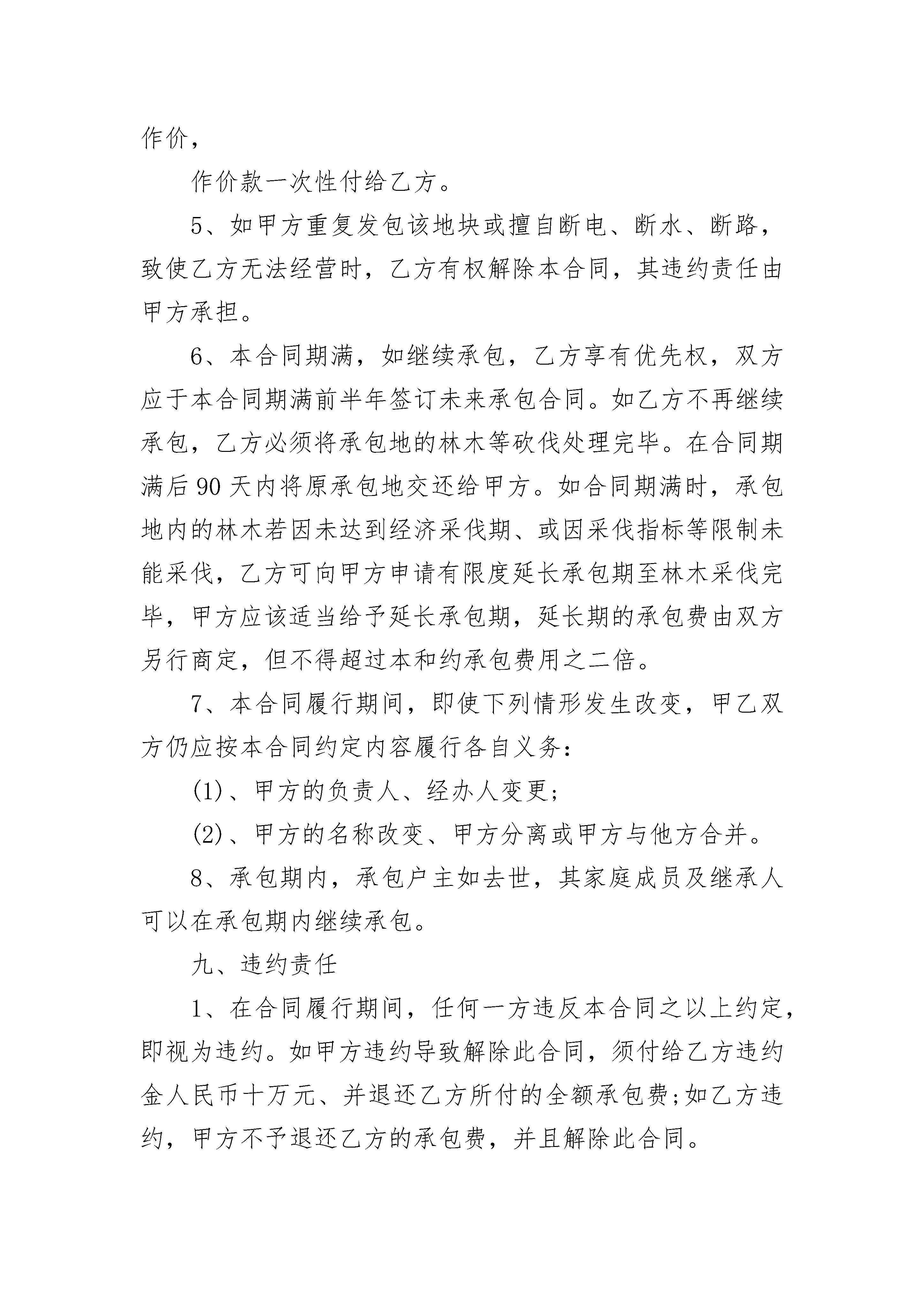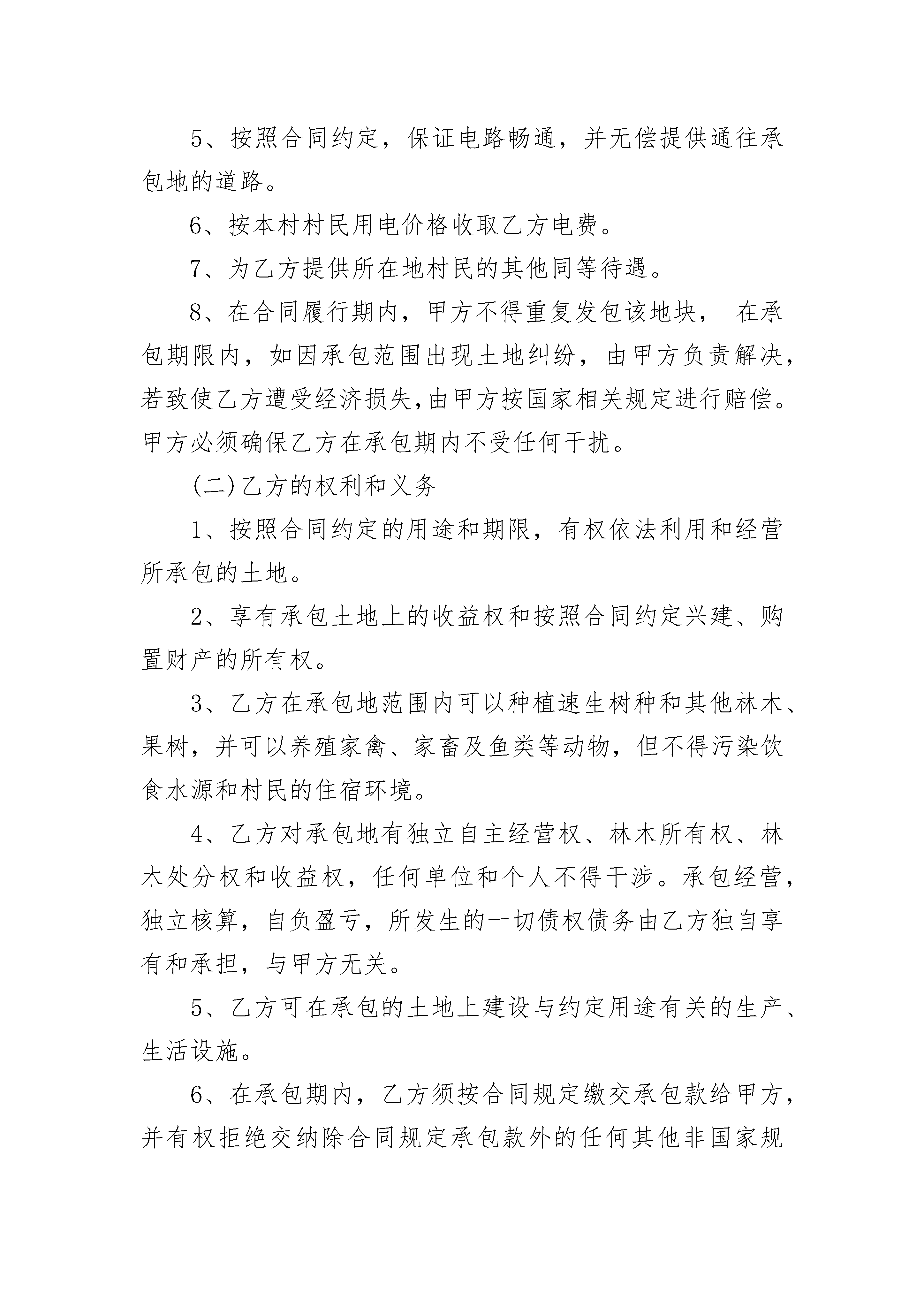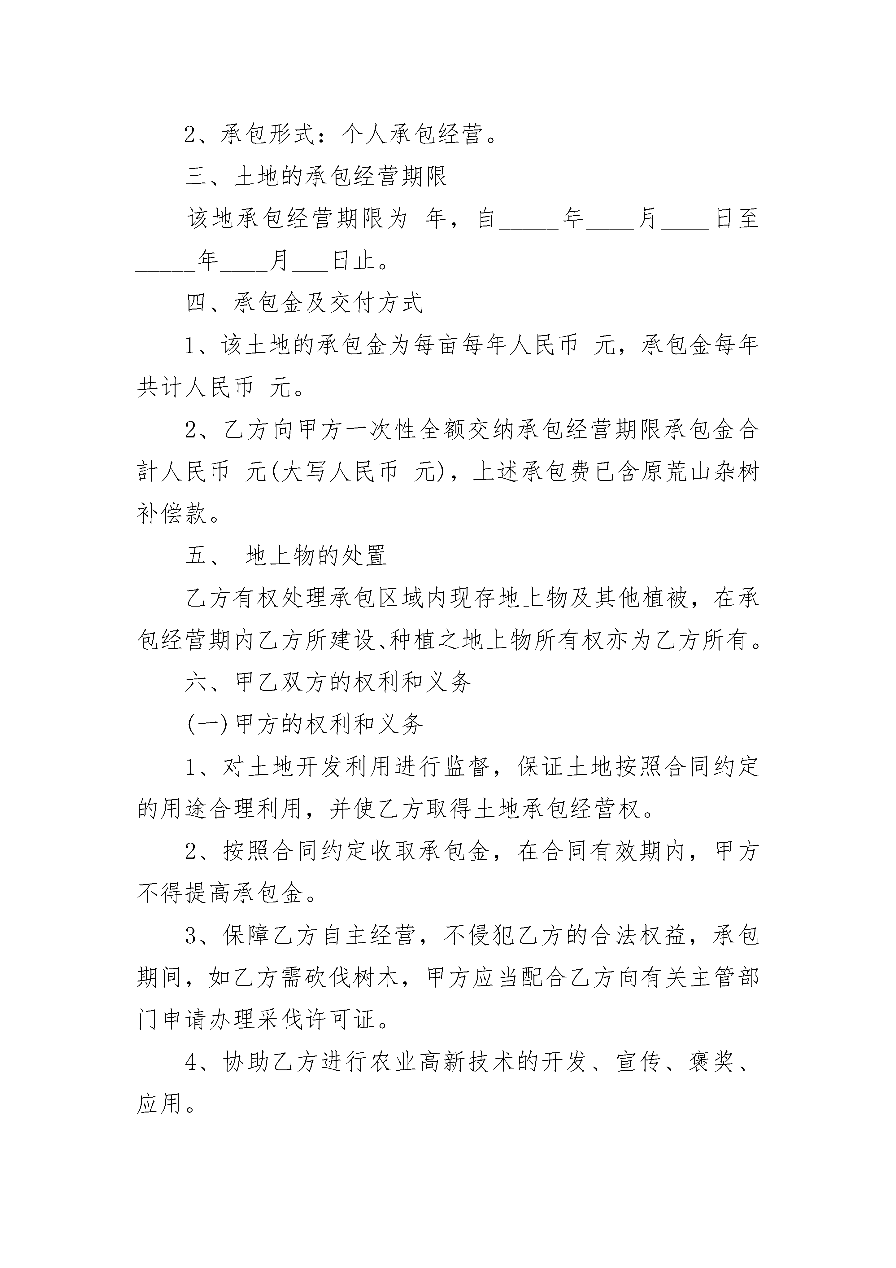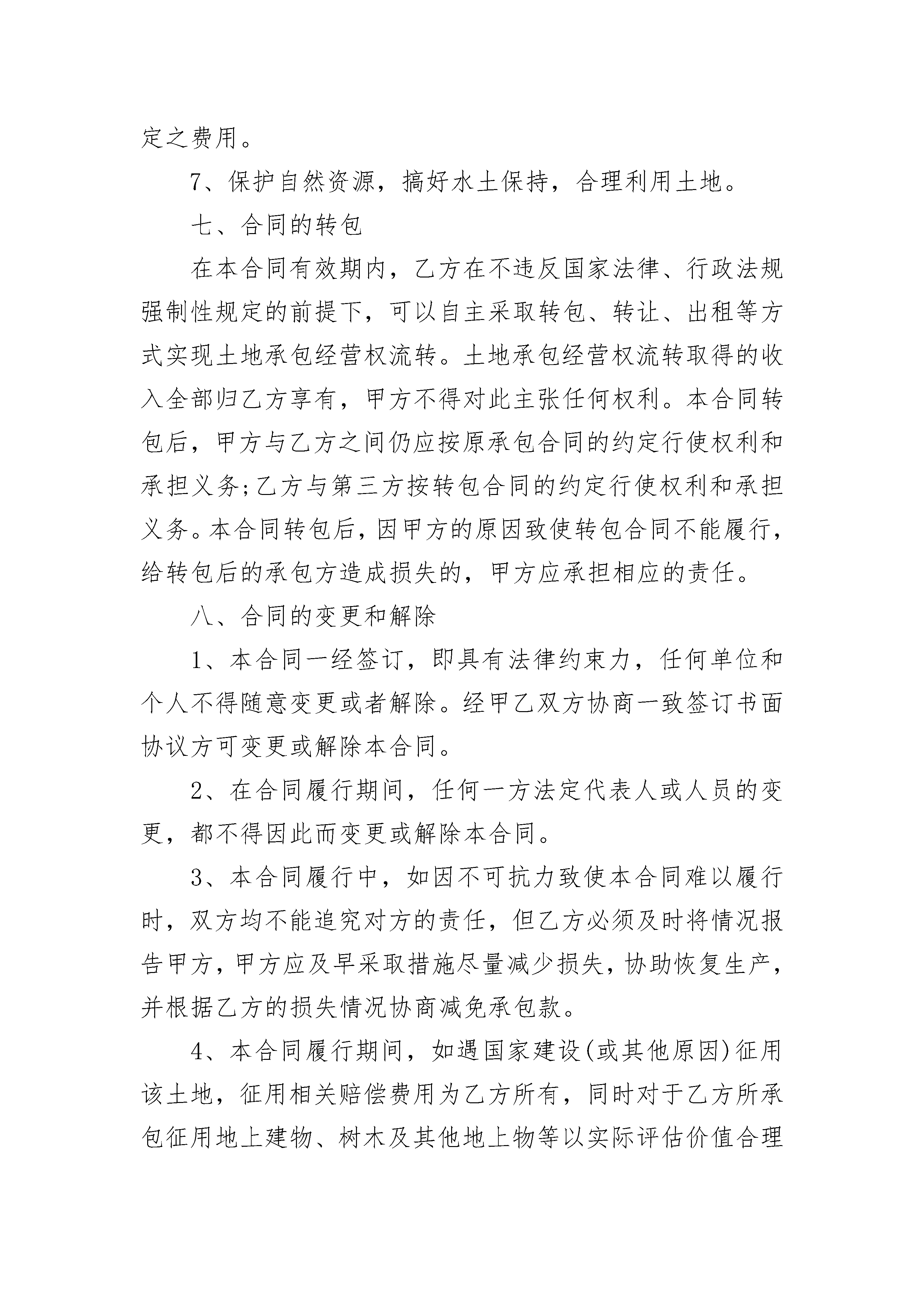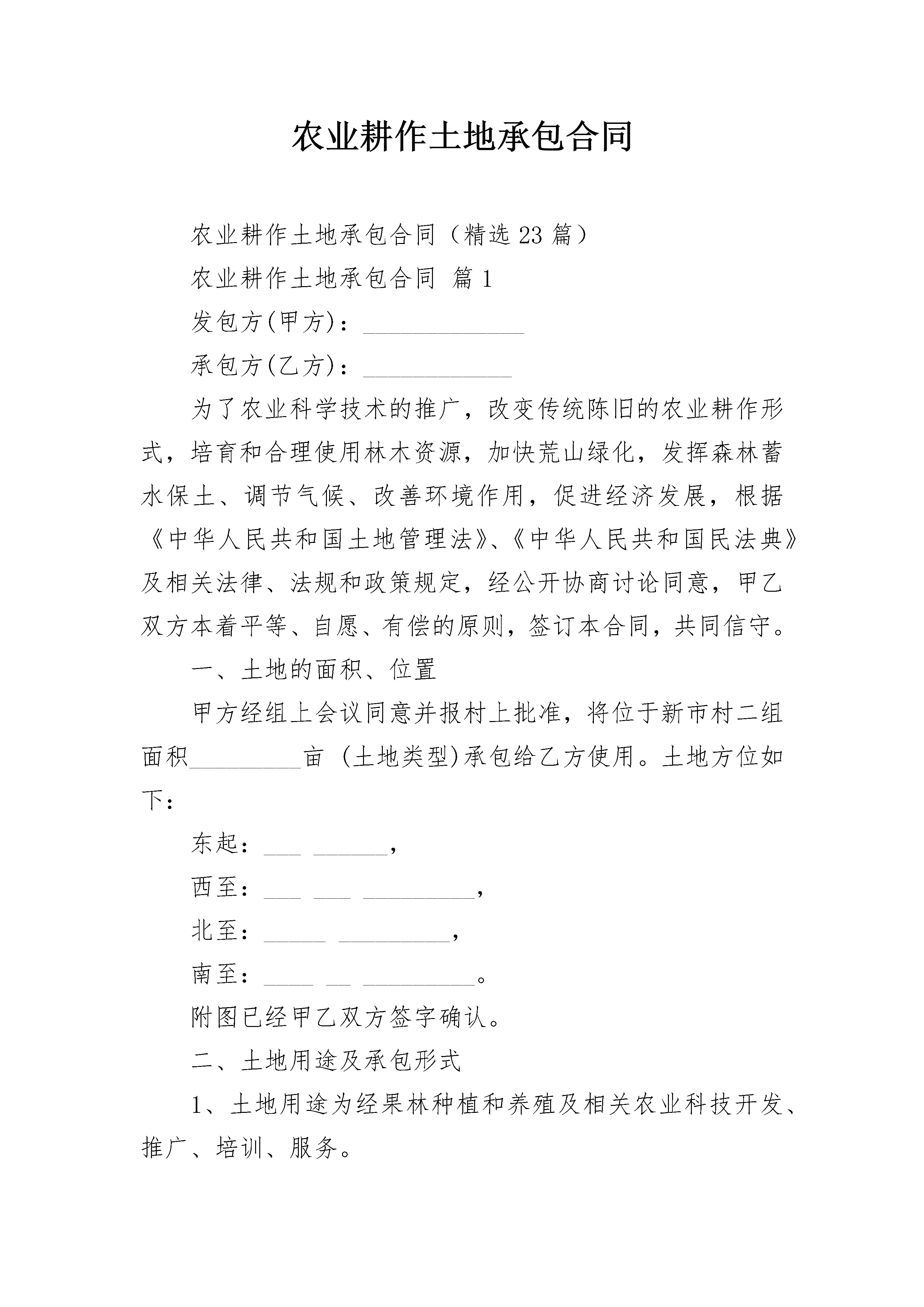农业耕作土地承包合同农业耕作土地承包合同(精选23篇)农业耕作土地承包合同篇1发包方(甲方):_____________承包方(乙方):____________为了农业科学技术的推广,改变传统陈旧的农业耕作形式,培育和合理使用林木资源,加快荒山绿化,发挥森林蓄水保土、调节气候、改善环境作用,促进经济发展,根据《中华人民共和国土地管理法》、《中华人民共和国民法典》及相关法律、法规和政策规定,经公开协商讨论同意,甲乙双方本着平等、自愿、有偿的原则,签订本合同,共同信守。一、土地的面积、位置甲方经组上会议同意并报村上批准,将位于新市村二组面积_________亩(土地类型)承包给乙方使用。土地方位如下:东起:_________,西至:_______________,北至:______________,南至:_______________。附图已经甲乙双方签字确认。二、土地用途及承包形式1、土地用途为经果林种植和养殖及相关农业科技开发、推广、培训、服务。2、承包形式:个人承包经营。三、土地的承包经营期限该地承包经营期限为年,自_____年____月____日至_____年____月___日止。四、承包金及交付方式1、该土地的承包金为每亩每年人民币元,承包金每年共计人民币元。2、乙方向甲方一次性全额交纳承包经营期限承包金合計人民币元(大写人民币元),上述承包费已含原荒山杂树补偿款。五、地上物的处置乙方有权处理承包区域内现存地上物及其他植被,在承包经营期内乙方所建设、种植之地上物所有权亦为乙方所有。六、甲乙双方的权利和义务(一)甲方的权利和义务1、对土地开发利用进行监督,保证土地按照合同约定的用途合理利用,并使乙方取得土地承包经营权。2、按照合同约定收取承包金,在合同有效期内,甲方不得提高承包金。3、保障乙方自主经营,不侵犯乙方的合法权益,承包期间,如乙方需砍伐树木,甲方应当配合乙方向有关主管部门申请办理采伐许可证。4、协助乙方进行农业高新技术的开发、宣传、褒奖、应用。5、按照合同约定,保证电路畅通,并无偿提供通往承包地的道路。6、按本村村民用电价格收取乙方电费。7、为乙方提供所在地村民的其他同等待遇。8、在合同履行期内,甲方不得重复发包该地块,在承包期限内,如因承包范围出现土地纠纷,由甲方负责解决,若致使乙方遭受经济损失,由甲方按国家相关规定进行赔偿。甲方必须确保乙方在承包期内不受任何干扰。(二)乙方的权利和义务1、按照合同约定的用途和期限,有权依法利用和经营所承包的土地。2、享有承包土地上的收益权和按照合同约定兴建、购置财产的所有权。3、乙方在承包地范围内可以种植速生树种和其他林木、果树,并可以养殖家禽、家畜及鱼类等动物,但不得污染饮食水源和村民的住宿环境。4、乙方对承包地有独立自主经营权、林木所有权、林木处分权和收益权,任何单位和个人不得干涉。承包经营,独立核算,自负盈亏,所发生的一切债权债务由乙方独自享有和承担,与甲方无关。5、乙方可在承包的土地上建设与约定用途有关的生产、生活设施。6、在承包期内,乙方须按合同规定缴交承包款给甲方,并有权拒绝交纳除合同规定承包款外的任何其他非国家规定之费用。7、保护自然资源,搞好水土保持,合理利用土地。七、合同的转包在本合同有效期内,乙方在不违反国家法律、行政法规强制性规定的前提下,可以自主采取转包、转让、出租等方式实现土地承包经营权流转。土地承包经营权流转取得的收入全部归乙方享有,甲方不得对此主张任何权利。本合同转包后,甲方与乙方之间仍应按原承包合同的约定行使权利和承担义务;乙方与第三方按转包合同的约定行使权利和承担义务。本合同转包后,因甲方的原因致使转包合同不能履行,给转包后的承包方造成损失的,甲方应承担相应的责任。八、合同的变更和解除1、本合同一经签订,即具有法律约束力,任何单位和个人不得随意变更或者解除。经甲乙双方协商一致签订书面协议方可变更或解除本合同。2、在合同履行期间,任何一方法定代表人或人员的变更,都不得因此而变更或解除本合同。3、本合同履行中,如因不可抗力致使本合同难以履行时,双方均不能追究对方的责任,但乙方必须及时将情况报告甲方,甲方应及早采取措施尽量减少损失,协助恢复生产,并根据乙方的损失情况协商减免承包款。4、本合同履行期间,如遇国家建设(或其他原因)征用该土地,征用相关赔偿费用为乙方所有,同时对于乙方所承包征用地上建物、树木及其他地上物等以实际评估价值合理作价,作价款一次性付给乙方。5、如甲方重复发包该地块或擅自断电、断水、断路,致使乙方无法经营时,乙方有权解除本合同,其违约责任由甲方承担。6、本合同期满,如继续承包,乙方享有优先权,双方应于本合同期满前半年签订未来承包合同。如乙方不再继续承包,乙方必须将承包地的林木等砍伐处理完毕。在合同期满后90天内将原承包地交还给