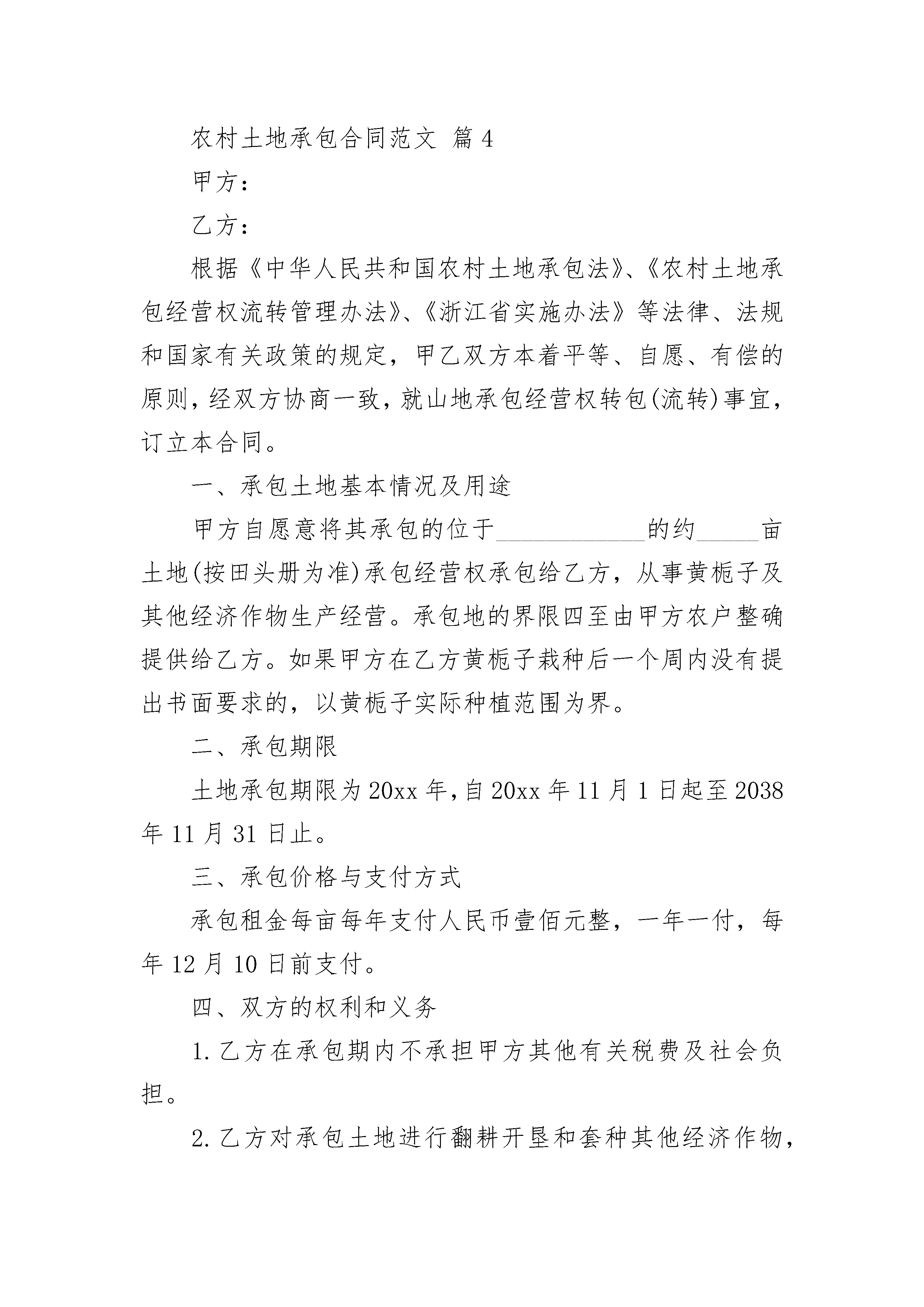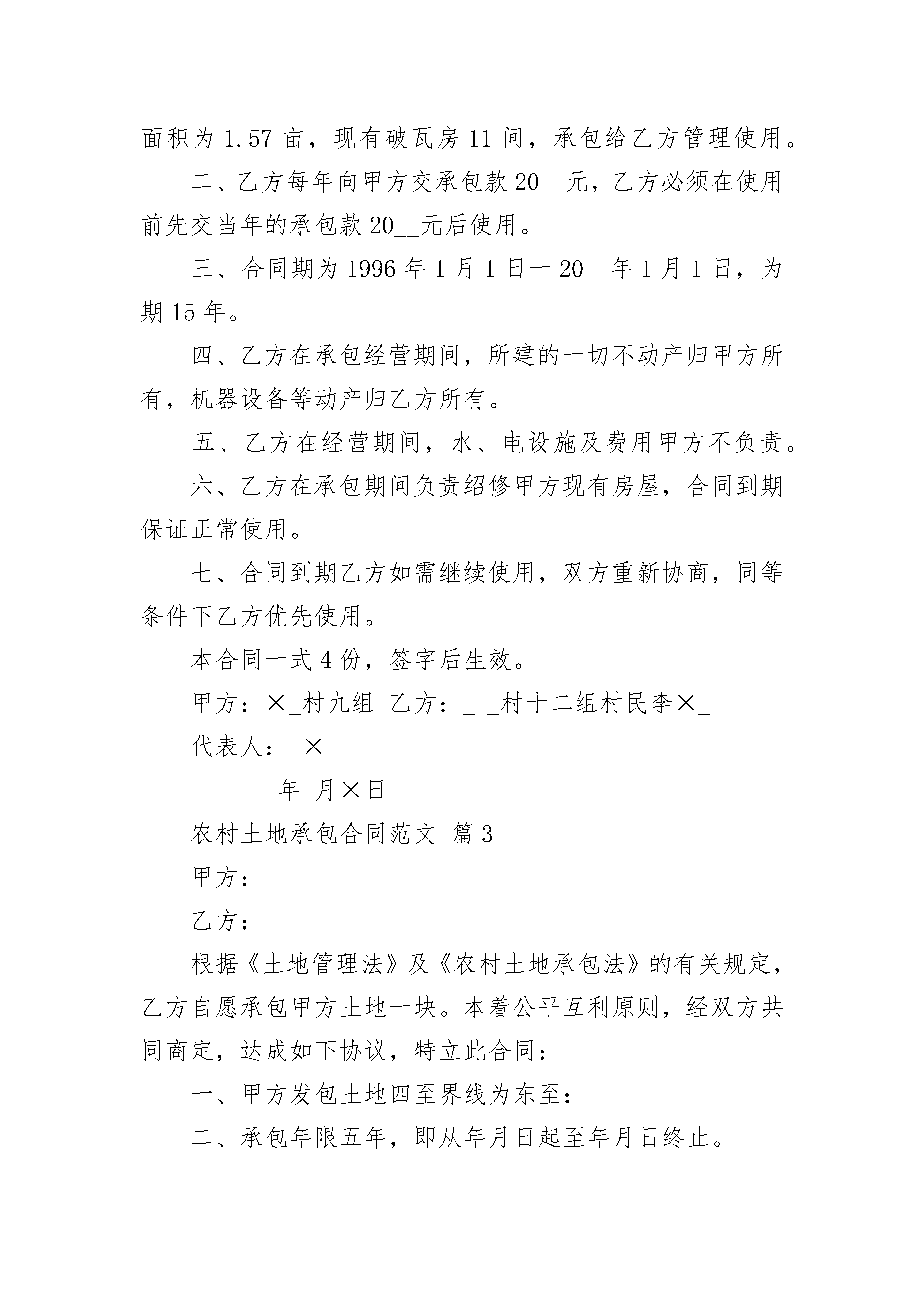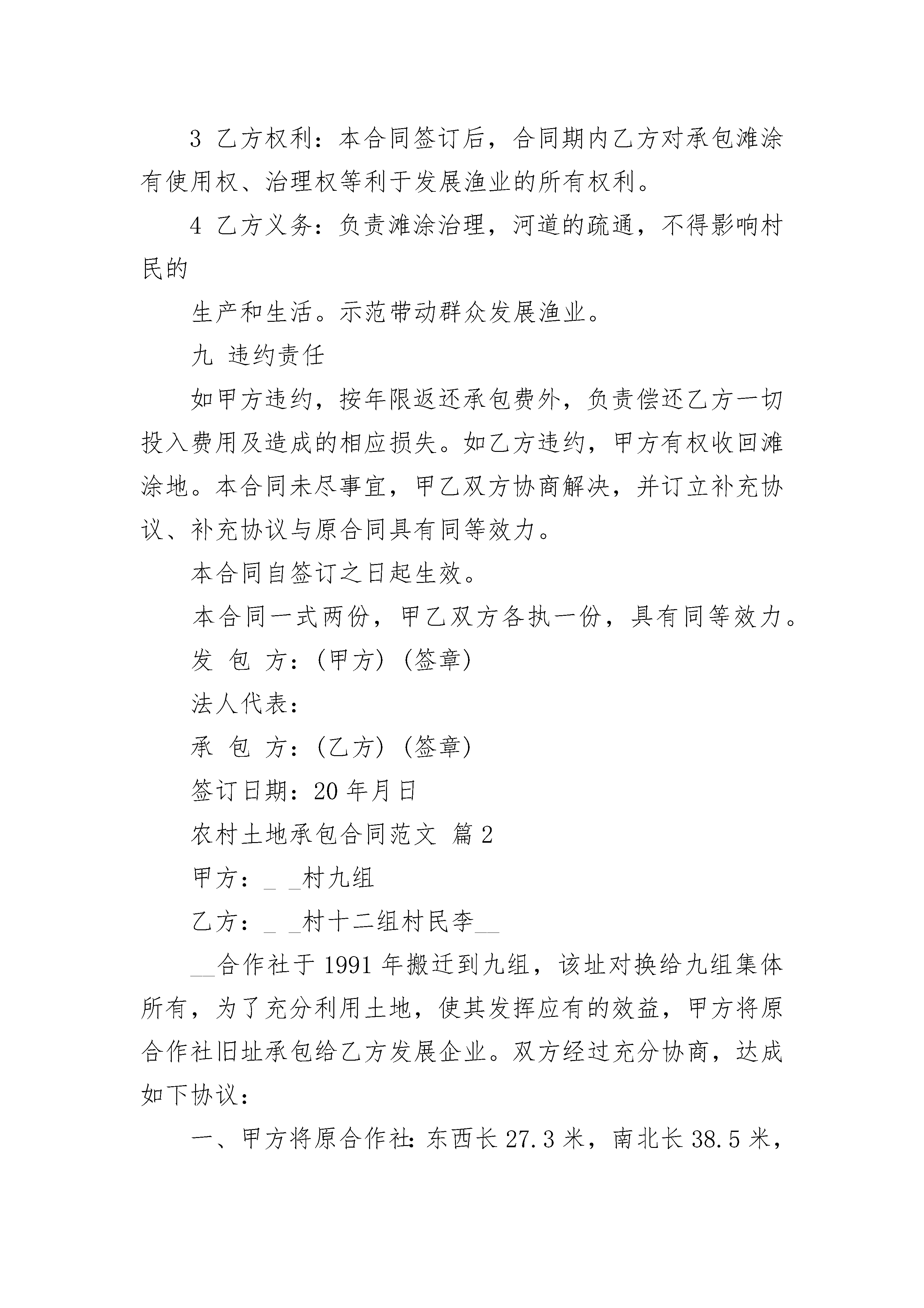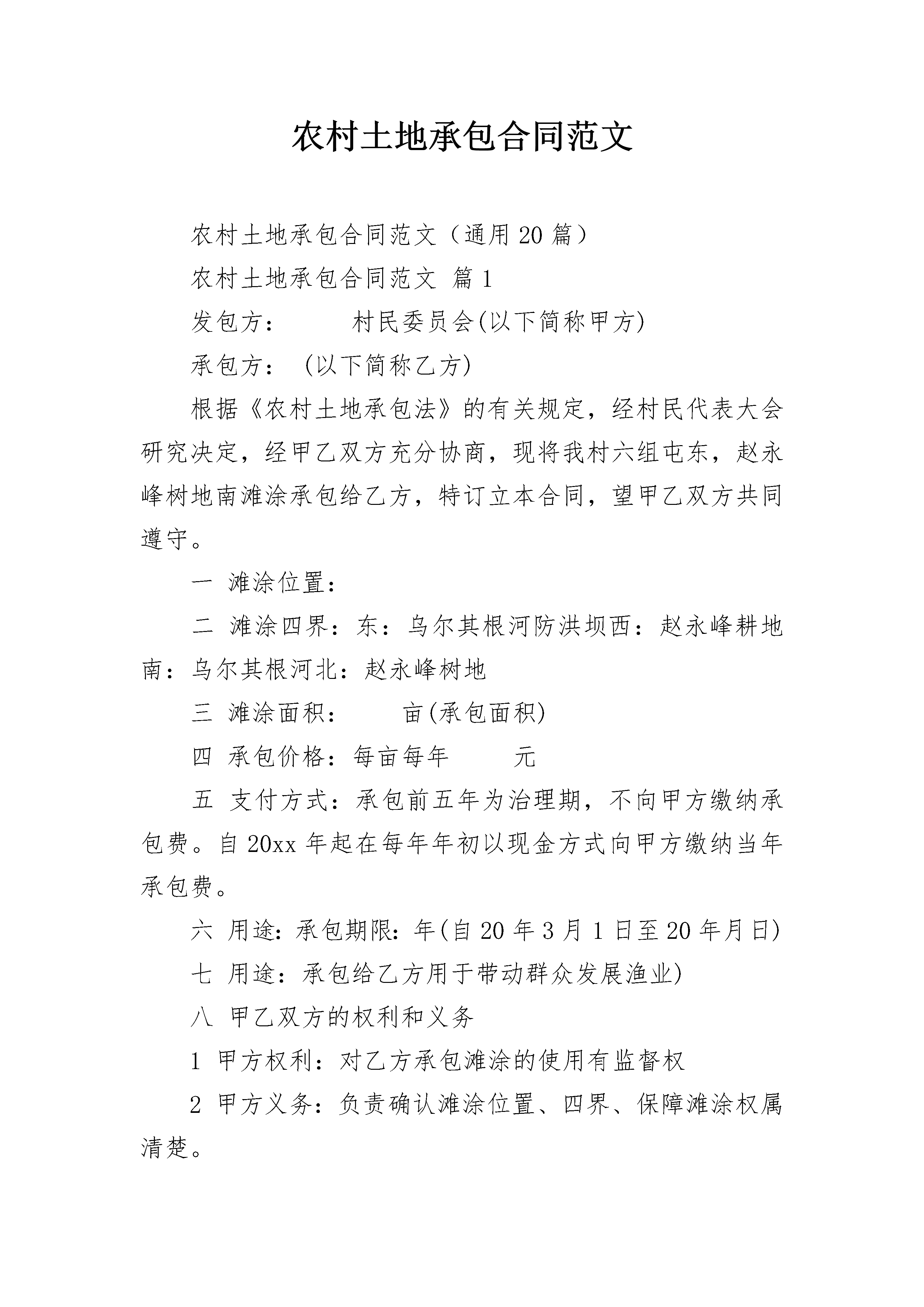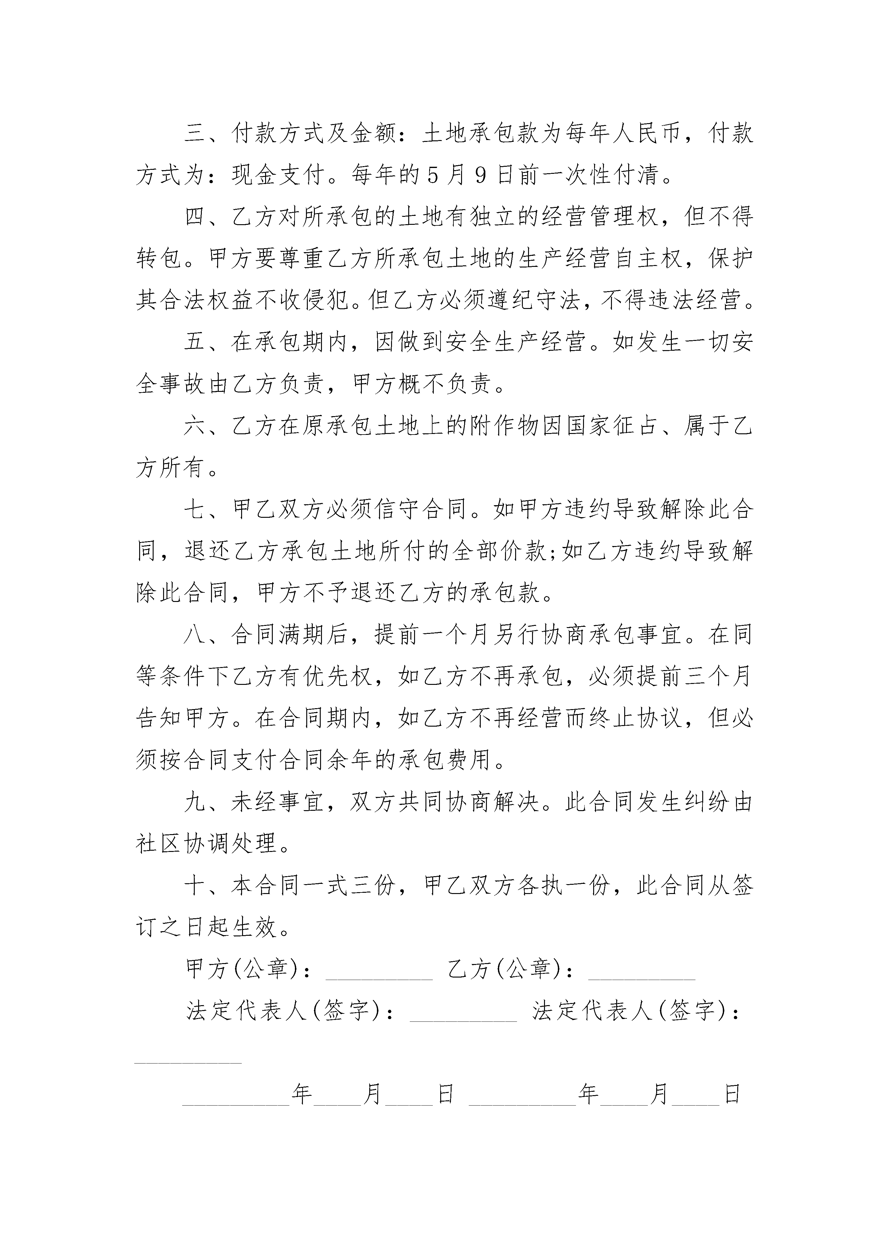 农村土地承包合同范文农村土地承包合同范文(通用20篇)农村土地承包合同范文篇1发包方:村民委员会(以下简称甲方)承包方:(以下简称乙方)根据《农村土地承包法》的有关规定,经村民代表大会研究决定,经甲乙双方充分协商,现将我村六组屯东,赵永峰树地南滩涂承包给乙方,特订立本合同,望甲乙双方共同遵守。一滩涂位置:二滩涂四界:东:乌尔其根河防洪坝西:赵永峰耕地南:乌尔其根河北:赵永峰树地三滩涂面积:亩(承包面积)四承包价格:每亩每年元五支付方式:承包前五年为治理期,不向甲方缴纳承包费。自20xx年起在每年年初以现金方式向甲方缴纳当年承包费。六用途:承包期限:年(自20年3月1日至20年月日)七用途:承包给乙方用于带动群众发展渔业)八甲乙双方的权利和义务1甲方权利:对乙方承包滩涂的使用有监督权2甲方义务:负责确认滩涂位置、四界、保障滩涂权属清楚。3乙方权利:本合同签订后,合同期内乙方对承包滩涂有使用权、治理权等利于发展渔业的所有权利。4乙方义务:负责滩涂治理,河道的疏通,不得影响村民的生产和生活。示范带动群众发展渔业。九违约责任如甲方违约,按年限返还承包费外,负责偿还乙方一切投入费用及造成的相应损失。如乙方违约,甲方有权收回滩涂地。本合同未尽事宜,甲乙双方协商解决,并订立补充协议、补充协议与原合同具有同等效力。本合同自签订之日起生效。本合同一式两份,甲乙双方各执一份,具有同等效力。发包方:(甲方)(签章)法人代表:承包方:(乙方)(签章)签订日期:20年月日农村土地承包合同范文篇2甲方:__村九组乙方:__村十二组村民李____合作社于1991年搬迁到九组,该址对换给九组集体所有,为了充分利用土地,使其发挥应有的效益,甲方将原合作社旧址承包给乙方发展企业。双方经过充分协商,达成如下协议:一、甲方将原合作社:东西长27.3米,南北长38.5米,面积为1.57亩,现有破瓦房11间,承包给乙方管理使用。二、乙方每年向甲方交承包款20__元,乙方必须在使用前先交当年的承包款20__元后使用。三、合同期为1996年1月1日一20__年1月1日,为期15年。四、乙方在承包经营期间,所建的一切不动产归甲方所有,机器设备等动产归乙方所有。五、乙方在经营期间,水、电设施及费用甲方不负责。六、乙方在承包期间负责绍修甲方现有房屋,合同到期保证正常使用。七、合同到期乙方如需继续使用,双方重新协商,同等条件下乙方优先使用。本合同一式4份,签字后生效。甲方:×_村九组乙方:__村十二组村民李×_代表人:_×_____年_月×日农村土地承包合同范文篇3甲方:乙方:根据《土地管理法》及《农村土地承包法》的有关规定,乙方自愿承包甲方土地一块。本着公平互利原则,经双方共同商定,达成如下协议,特立此合同:一、甲方发包土地四至界线为东至:二、承包年限五年,即从年月日起至年月日终止。三、付款方式及金额:土地承包款为每年人民币,付款方式为:现金支付。每年的5月9日前一次性付清。四、乙方对所承包的土地有独立的经营管理权,但不得转包。甲方要尊重乙方所承包土地的生产经营自主权,保护其合法权益不收侵犯。但乙方必须遵纪守法,不得违法经营。五、在承包期内,因做到安全生产经营。如发生一切安全事故由乙方负责,甲方概不负责。六、乙方在原承包土地上的附作物因国家征占、属于乙方所有。七、甲乙双方必须信守合同。如甲方违约导致解除此合同,退还乙方承包土地所付的全部价款;如乙方违约导致解除此合同,甲方不予退还乙方的承包款。八、合同满期后,提前一个月另行协商承包事宜。在同等条件下乙方有优先权,如乙方不再承包,必须提前三个月告知甲方。在合同期内,如乙方不再经营而终止协议,但必须按合同支付合同余年的承包费用。九、未经事宜,双方共同协商解决。此合同发生纠纷由社区协调处理。十、本合同一式三份,甲乙双方各执一份,此合同从签订之日起生效。甲方(公章):_________乙方(公章):_________法定代表人(签字):_________法定代表人(签字):__________________年____月____日_________年____月____日农村土地承包合同范文篇4甲方:乙方:根据《中华人民共和国农村土地承包法》、《农村土地承包经营权流转管理办法》、《浙江省实施办法》等法律、法规和国家有关政策的规定,甲乙双方本着平等、自愿、有偿的原则,经双方协商一致,就山地承包经营权转包(流转)事宜,订立本合同。一、承包土地基本情况及用途甲方自愿意将其承包的位于____________的约_____亩土地(按田头册为准)承包经营权承包给乙方,从事黄栀子及其他经济作物生产经营。承包地的界限四至由甲方农户整确提供给乙方。如果甲方在乙方黄栀子栽种后一个周内没有提出书面要求的,以黄栀子实际种植范围为界。二、承包期