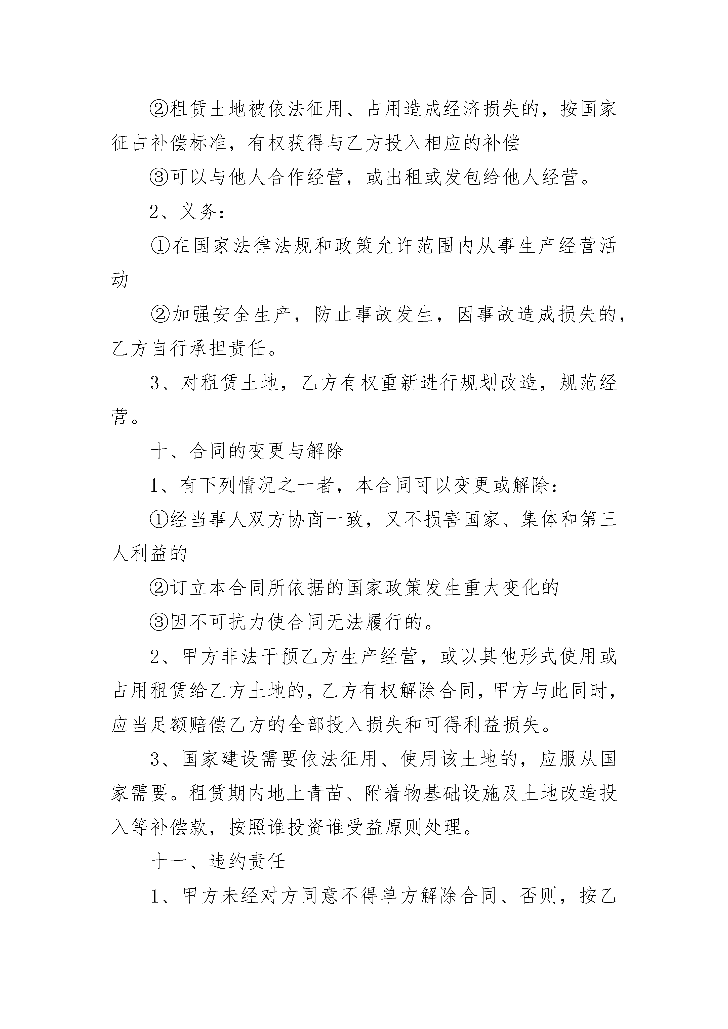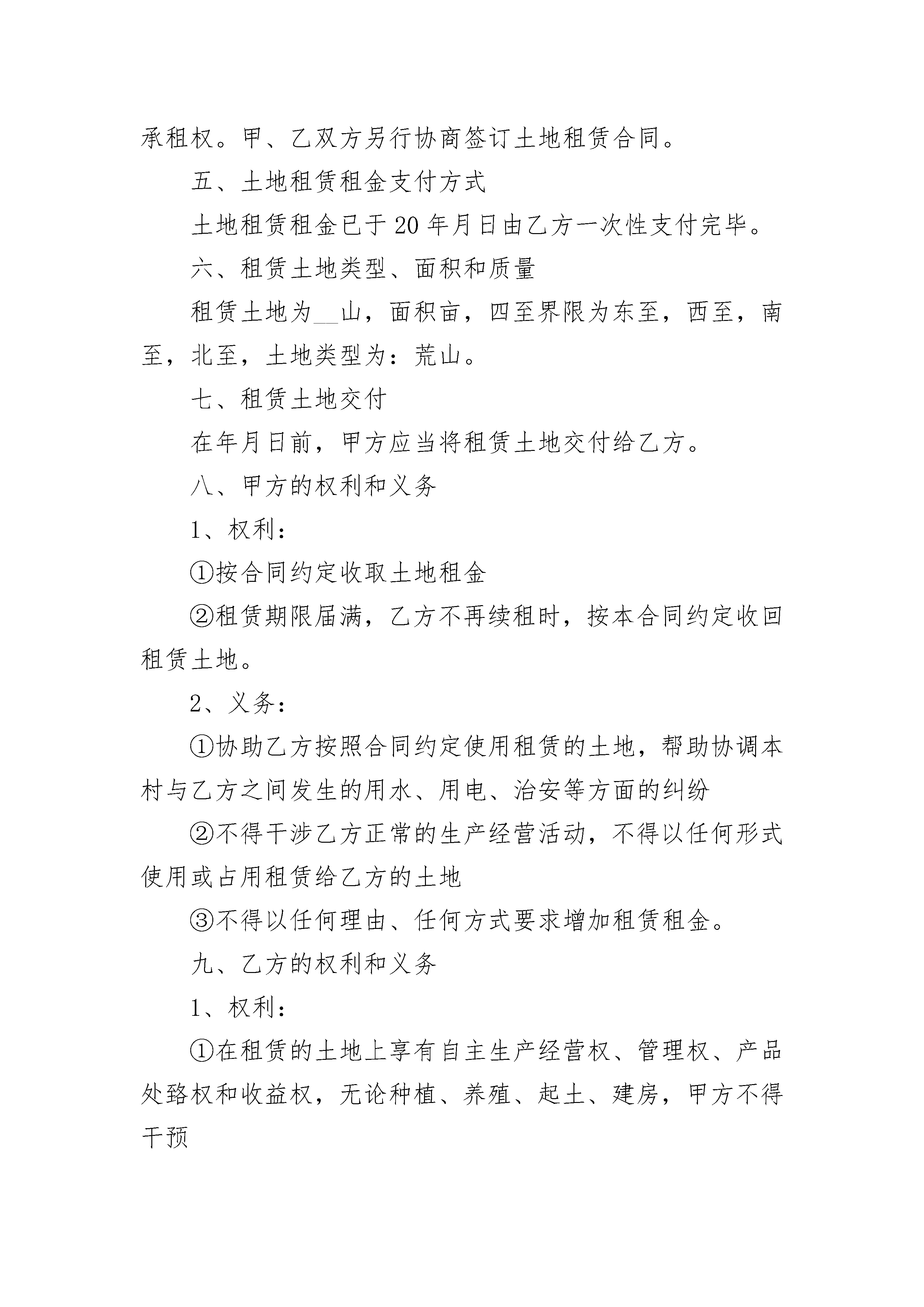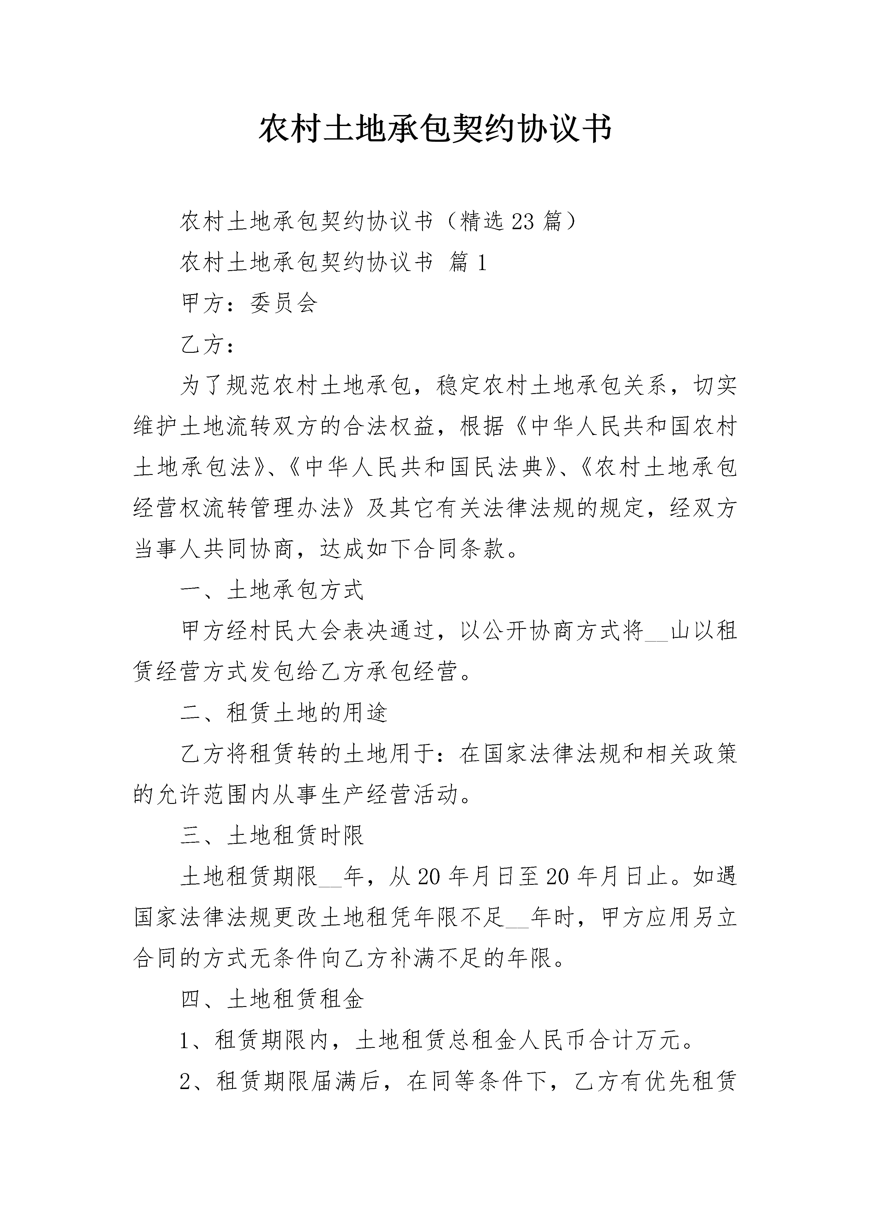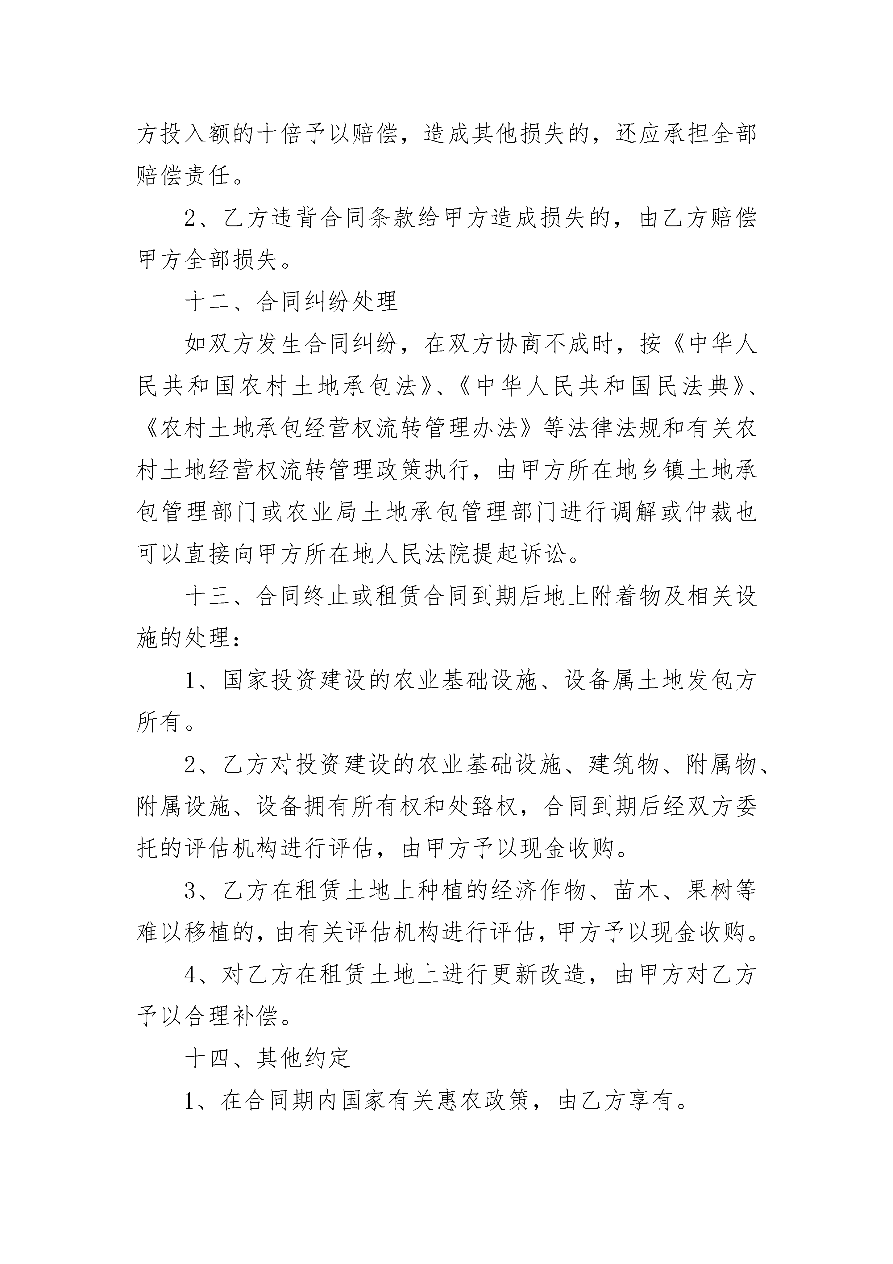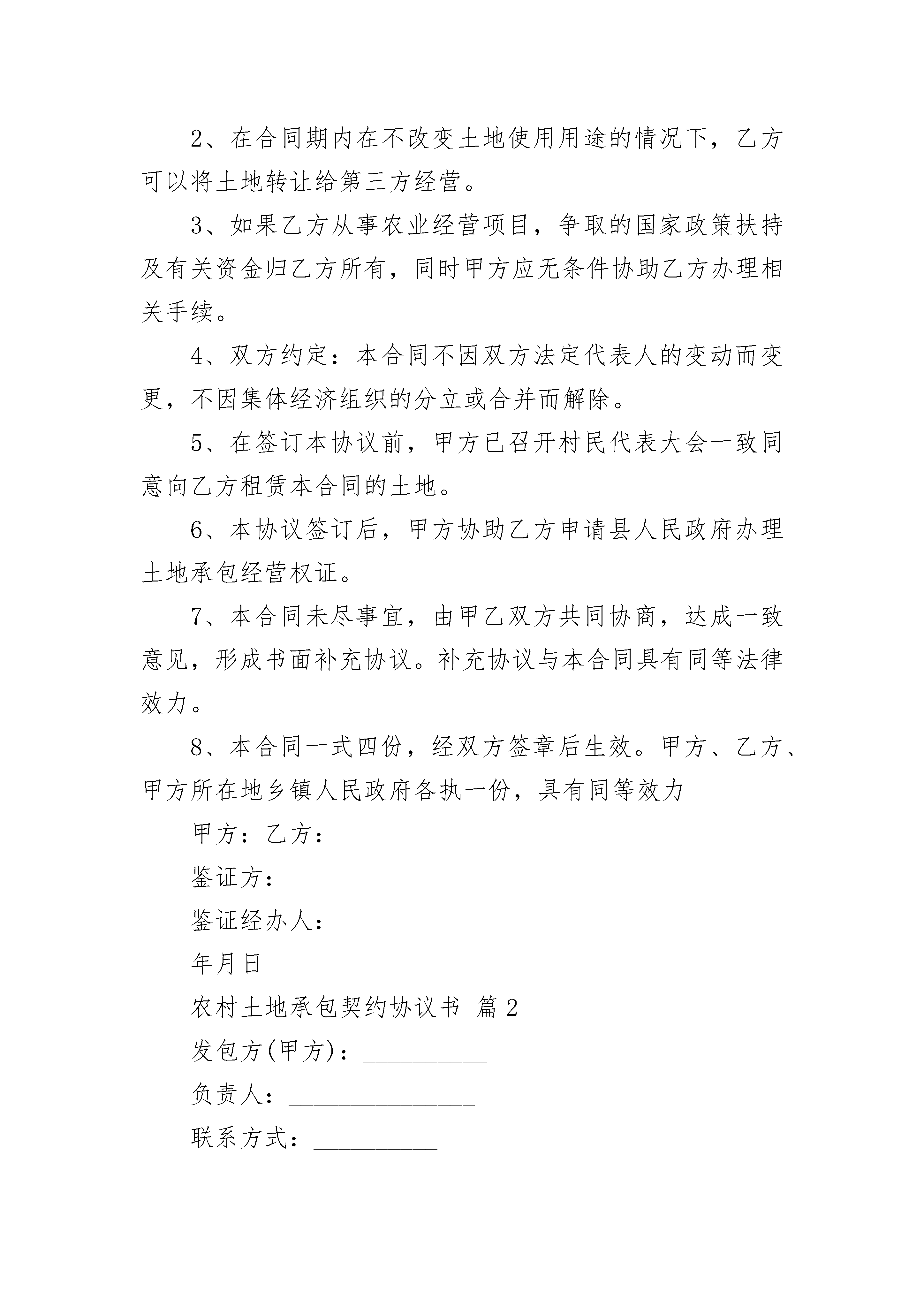 农村土地承包契约协议书农村土地承包契约协议书(精选23篇)农村土地承包契约协议书篇1甲方:委员会乙方:为了规范农村土地承包,稳定农村土地承包关系,切实维护土地流转双方的合法权益,根据《中华人民共和国农村土地承包法》、《中华人民共和国民法典》、《农村土地承包经营权流转管理办法》及其它有关法律法规的规定,经双方当事人共同协商,达成如下合同条款。一、土地承包方式甲方经村民大会表决通过,以公开协商方式将__山以租赁经营方式发包给乙方承包经营。二、租赁土地的用途乙方将租赁转的土地用于:在国家法律法规和相关政策的允许范围内从事生产经营活动。三、土地租赁时限土地租赁期限__年,从20年月日至20年月日止。如遇国家法律法规更改土地租凭年限不足__年时,甲方应用另立合同的方式无条件向乙方补满不足的年限。四、土地租赁租金1、租赁期限内,土地租赁总租金人民币合计万元。2、租赁期限届满后,在同等条件下,乙方有优先租赁承租权。甲、乙双方另行协商签订土地租赁合同。五、土地租赁租金支付方式土地租赁租金已于20年月日由乙方一次性支付完毕。六、租赁土地类型、面积和质量租赁土地为__山,面积亩,四至界限为东至,西至,南至,北至,土地类型为:荒山。七、租赁土地交付在年月日前,甲方应当将租赁土地交付给乙方。八、甲方的权利和义务1、权利:①按合同约定收取土地租金②租赁期限届满,乙方不再续租时,按本合同约定收回租赁土地。2、义务:①协助乙方按照合同约定使用租赁的土地,帮助协调本村与乙方之间发生的用水、用电、治安等方面的纠纷②不得干涉乙方正常的生产经营活动,不得以任何形式使用或占用租赁给乙方的土地③不得以任何理由、任何方式要求增加租赁租金。九、乙方的权利和义务1、权利:①在租赁的土地上享有自主生产经营权、管理权、产品处臵权和收益权,无论种植、养殖、起土、建房,甲方不得干预②租赁土地被依法征用、占用造成经济损失的,按国家征占补偿标准,有权获得与乙方投入相应的补偿③可以与他人合作经营,或出租或发包给他人经营。2、义务:①在国家法律法规和政策允许范围内从事生产经营活动②加强安全生产,防止事故发生,因事故造成损失的,乙方自行承担责任。3、对租赁土地,乙方有权重新进行规划改造,规范经营。十、合同的变更与解除1、有下列情况之一者,本合同可以变更或解除:①经当事人双方协商一致,又不损害国家、集体和第三人利益的②订立本合同所依据的国家政策发生重大变化的③因不可抗力使合同无法履行的。2、甲方非法干预乙方生产经营,或以其他形式使用或占用租赁给乙方土地的,乙方有权解除合同,甲方与此同时,应当足额赔偿乙方的全部投入损失和可得利益损失。3、国家建设需要依法征用、使用该土地的,应服从国家需要。租赁期内地上青苗、附着物基础设施及土地改造投入等补偿款,按照谁投资谁受益原则处理。十一、违约责任1、甲方未经对方同意不得单方解除合同、否则,按乙方投入额的十倍予以赔偿,造成其他损失的,还应承担全部赔偿责任。2、乙方违背合同条款给甲方造成损失的,由乙方赔偿甲方全部损失。十二、合同纠纷处理如双方发生合同纠纷,在双方协商不成时,按《中华人民共和国农村土地承包法》、《中华人民共和国民法典》、《农村土地承包经营权流转管理办法》等法律法规和有关农村土地经营权流转管理政策执行,由甲方所在地乡镇土地承包管理部门或农业局土地承包管理部门进行调解或仲裁也可以直接向甲方所在地人民法院提起诉讼。十三、合同终止或租赁合同到期后地上附着物及相关设施的处理:1、国家投资建设的农业基础设施、设备属土地发包方所有。2、乙方对投资建设的农业基础设施、建筑物、附属物、附属设施、设备拥有所有权和处臵权,合同到期后经双方委托的评估机构进行评估,由甲方予以现金收购。3、乙方在租赁土地上种植的经济作物、苗木、果树等难以移植的,由有关评估机构进行评估,甲方予以现金收购。4、对乙方在租赁土地上进行更新改造,由甲方对乙方予以合理补偿。十四、其他约定1、在合同期内国家有关惠农政策,由乙方享有。2、在合同期内在不改变土地使用用途的情况下,乙方可以将土地转让给第三方经营。3、如果乙方从事农业经营项目,争取的国家政策扶持及有关资金归乙方所有,同时甲方应无条件协助乙方办理相关手续。4、双方约定:本合同不因双方法定代表人的变动而变更,不因集体经济组织的分立或合并而解除。5、在签订本协议前,甲方已召开村民代表大会一致同意向乙方租赁本合同的土地。6、本协议签订后,甲方协助乙方申请县人民政府办理土地承包经营权证。7、本合同未尽事宜,由甲乙双方共同协商,达成一致意见,形成书面补充协议。补充协议与本合同具有同等法律效力。8、本合同一式四份,经双方签章后生效。甲方、乙方、甲方所在地乡镇人民政府各执一份,具有同等效力甲方:乙方:鉴证方:鉴证经办人:年月日农村土地承包契约协议书篇2发包