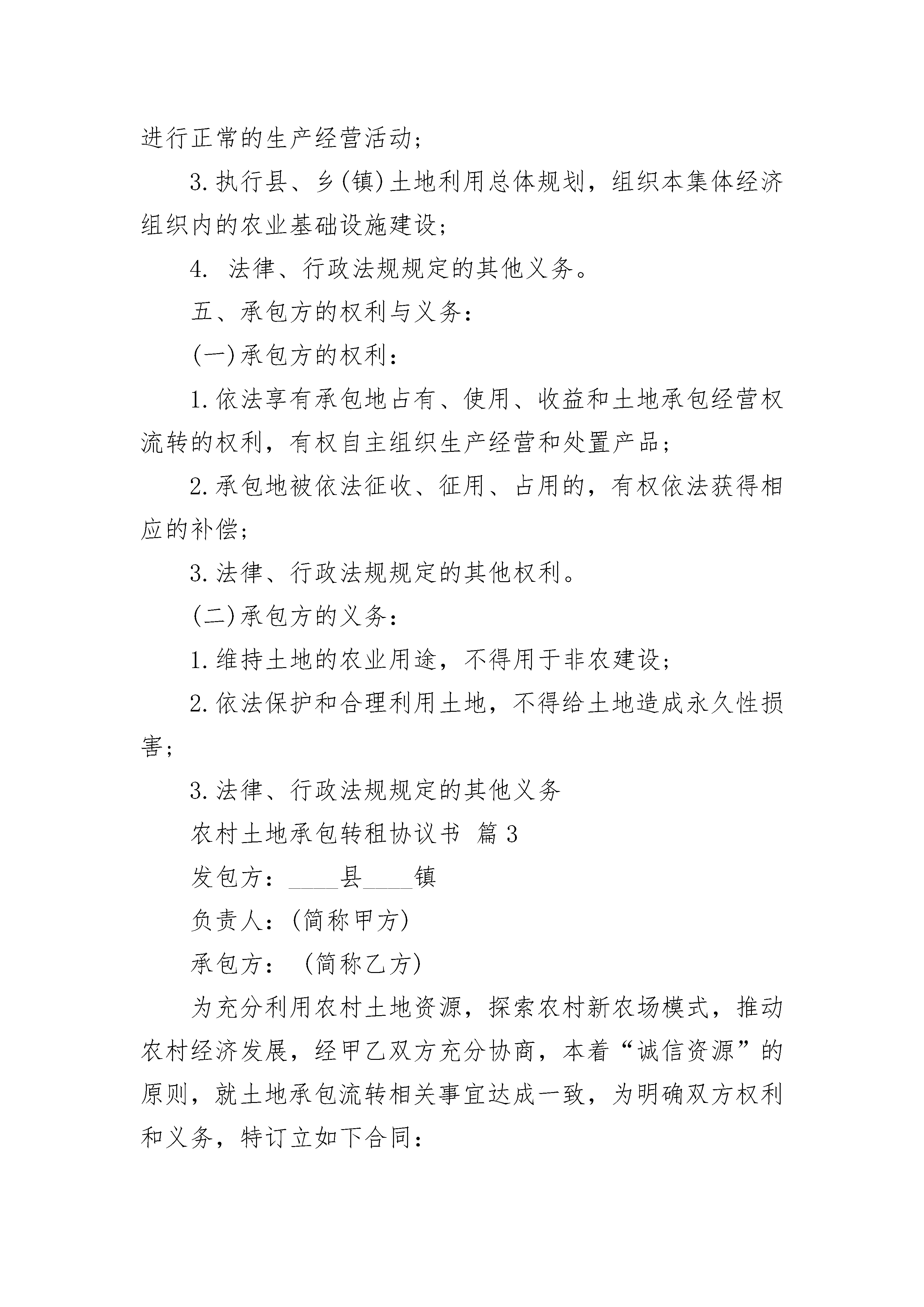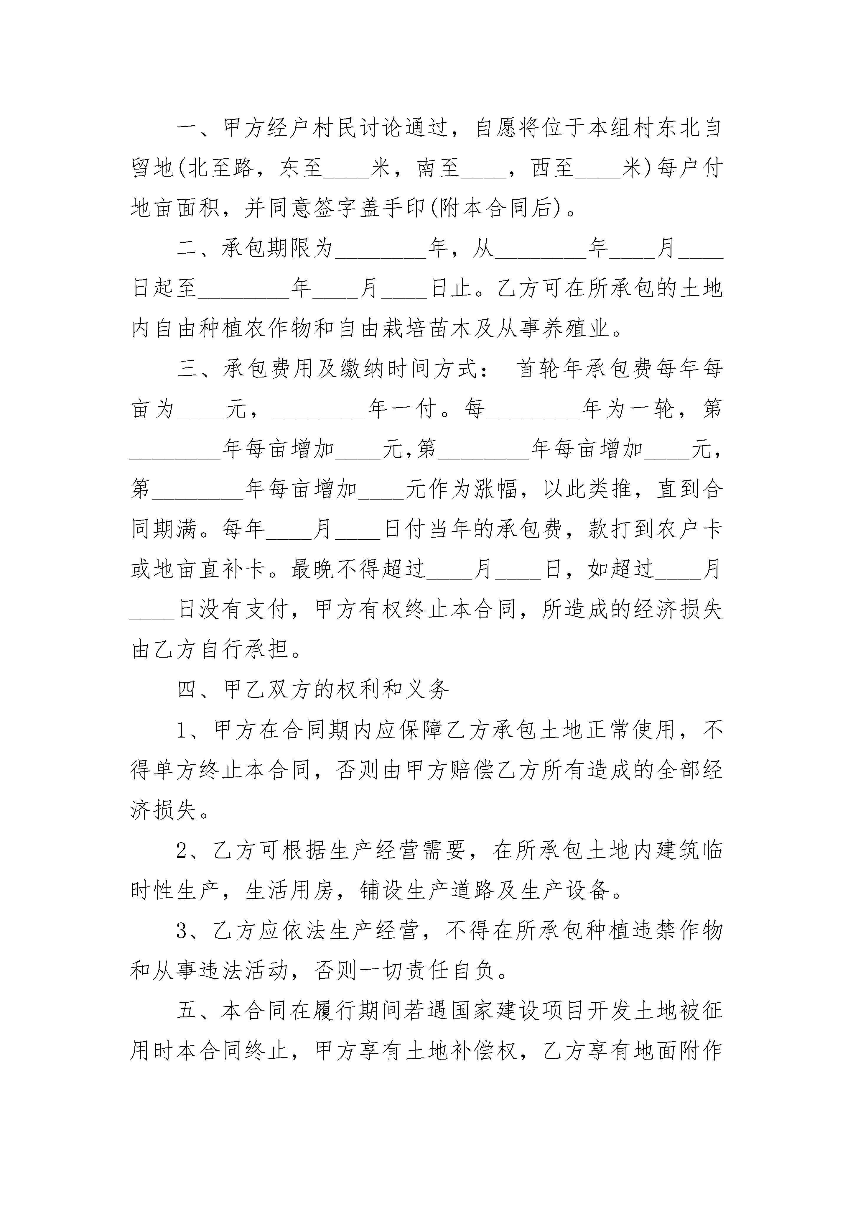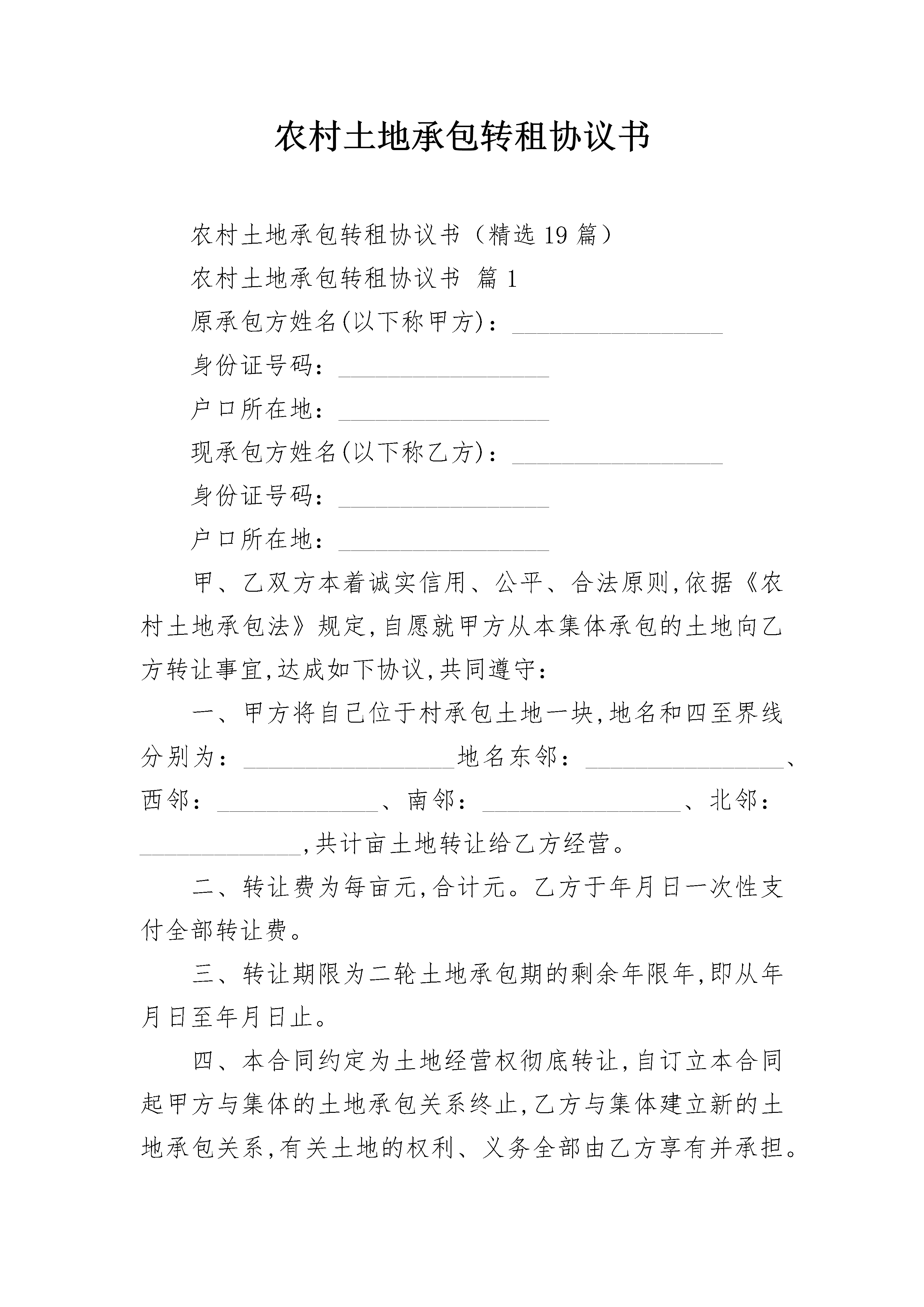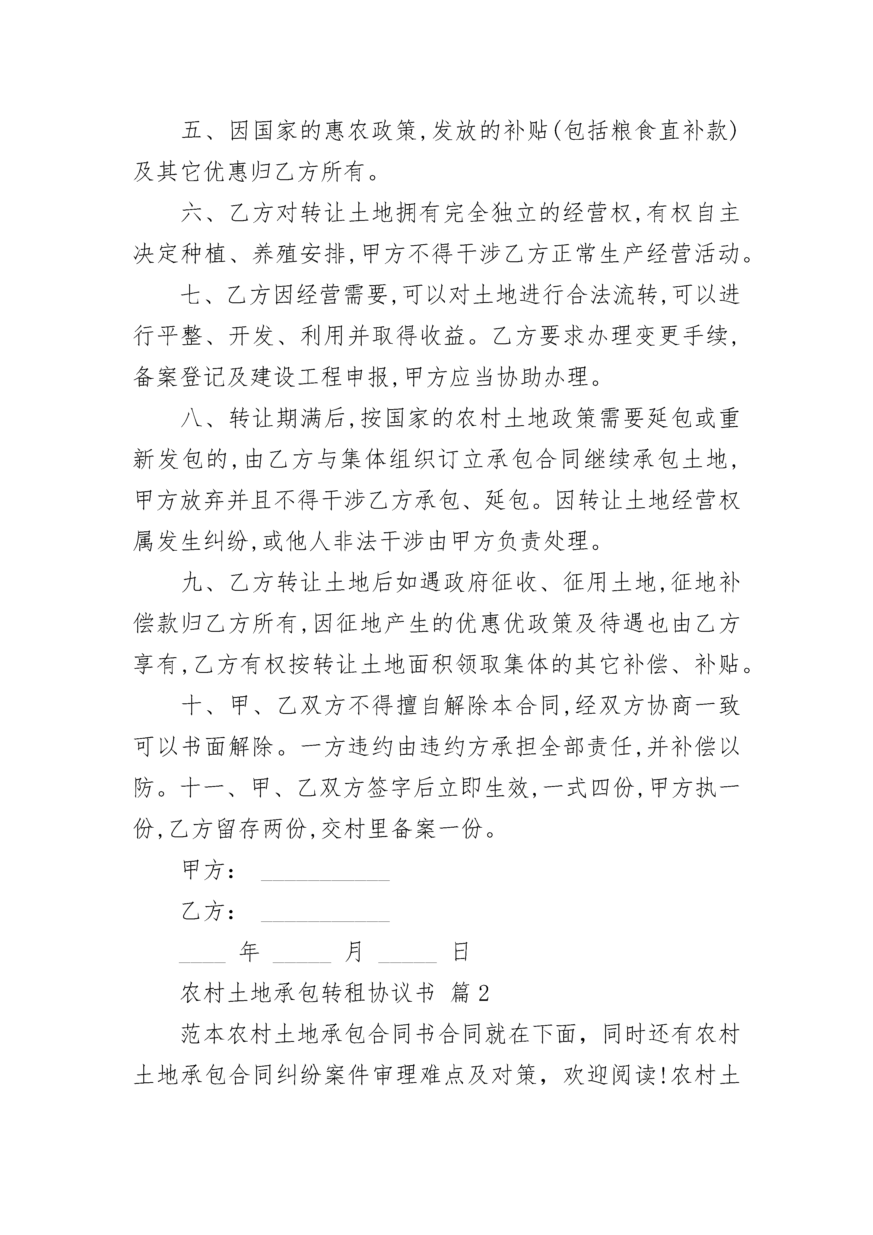 农村土地承包转租协议书农村土地承包转租协议书(精选19篇)农村土地承包转租协议书篇1原承包方姓名(以下称甲方):_________________身份证号码:_________________户口所在地:_________________现承包方姓名(以下称乙方):_________________身份证号码:_________________户口所在地:_________________甲、乙双方本着诚实信用、公平、合法原则,依据《农村土地承包法》规定,自愿就甲方从本集体承包的土地向乙方转让事宜,达成如下协议,共同遵守:一、甲方将自己位于村承包土地一块,地名和四至界线分别为:_________________地名东邻:________________、西邻:_____________、南邻:________________、北邻:_____________,共计亩土地转让给乙方经营。二、转让费为每亩元,合计元。乙方于年月日一次性支付全部转让费。三、转让期限为二轮土地承包期的剩余年限年,即从年月日至年月日止。四、本合同约定为土地经营权彻底转让,自订立本合同起甲方与集体的土地承包关系终止,乙方与集体建立新的土地承包关系,有关土地的权利、义务全部由乙方享有并承担。五、因国家的惠农政策,发放的补贴(包括粮食直补款)及其它优惠归乙方所有。六、乙方对转让土地拥有完全独立的经营权,有权自主决定种植、养殖安排,甲方不得干涉乙方正常生产经营活动。七、乙方因经营需要,可以对土地进行合法流转,可以进行平整、开发、利用并取得收益。乙方要求办理变更手续,备案登记及建设工程申报,甲方应当协助办理。八、转让期满后,按国家的农村土地政策需要延包或重新发包的,由乙方与集体组织订立承包合同继续承包土地,甲方放弃并且不得干涉乙方承包、延包。因转让土地经营权属发生纠纷,或他人非法干涉由甲方负责处理。九、乙方转让土地后如遇政府征收、征用土地,征地补偿款归乙方所有,因征地产生的优惠优政策及待遇也由乙方享有,乙方有权按转让土地面积领取集体的其它补偿、补贴。十、甲、乙双方不得擅自解除本合同,经双方协商一致可以书面解除。一方违约由违约方承担全部责任,并补偿以防。十一、甲、乙双方签字后立即生效,一式四份,甲方执一份,乙方留存两份,交村里备案一份。甲方:___________乙方:_______________年_____月_____日农村土地承包转租协议书篇2范本农村土地承包合同书合同就在下面,同时还有农村土地承包合同纠纷案件审理难点及对策,欢迎阅读!农村土地承包合同书合同范本【1】编码:农村土地(耕地)承包合同(家庭承包方式)发包方:﹍﹍县(市、区、旗)﹍﹍乡(镇、街道)﹍﹍村﹍组发包方负责人:﹍﹍承包方代表:﹍﹍承包方地址:﹍﹍县(市、区、旗)﹍﹍乡(镇、街道)﹍﹍村﹍组为稳定和完善以家庭承包经营为基础、统分结合的双层经营体制,赋予农民长期而有保障的土地承包经营权,维护承包双方当事人的合法权益,根据《中华人民共和国农村土地承包法》《民法典》等相关法律和本集体经济组织依法通过的农村土地承包方案,订立本合同。一、承包土地情况:地块名称地块编码坐落面积(亩)质量等级备注东至西至南至北至面积总计二、承包期限:________年:________年____月____日至________年____月____日。三、承包土地的用途:农业生产四、发包方的权利与义务:(一)发包方的权利:1.监督承包方依照承包合同约定的用途合理利用和保护土地;2.制止承包方损害承包地和农业资源的行为;3.法律、行政法规规定的其他权利。(二)发包方的义务:1.维护承包方的土地承包经营权,不得非法变更、解除承包合同;2.尊重承包方的生产经营自主权,不得干涉承包方依法进行正常的生产经营活动;3.执行县、乡(镇)土地利用总体规划,组织本集体经济组织内的农业基础设施建设;4.法律、行政法规规定的其他义务。五、承包方的权利与义务:(一)承包方的权利:1.依法享有承包地占有、使用、收益和土地承包经营权流转的权利,有权自主组织生产经营和处置产品;2.承包地被依法征收、征用、占用的,有权依法获得相应的补偿;3.法律、行政法规规定的其他权利。(二)承包方的义务:1.维持土地的农业用途,不得用于非农建设;2.依法保护和合理利用土地,不得给土地造成永久性损害;3.法律、行政法规规定的其他义务农村土地承包转租协议书篇3发包方:____县____镇负责人:(简称甲方)承包方:(简称乙方)为充分利用农村土地资源,探索农村新农场模式,推动农村经济发展,经甲乙双方充分协商,本着“诚信资源”的原则,就土地承包流转相关事宜达成一致,为明确双方权利和义务,特订立如下合同:一、甲方经户村民讨论通过,自愿将位于本组村东北自留地(北至路,东至___