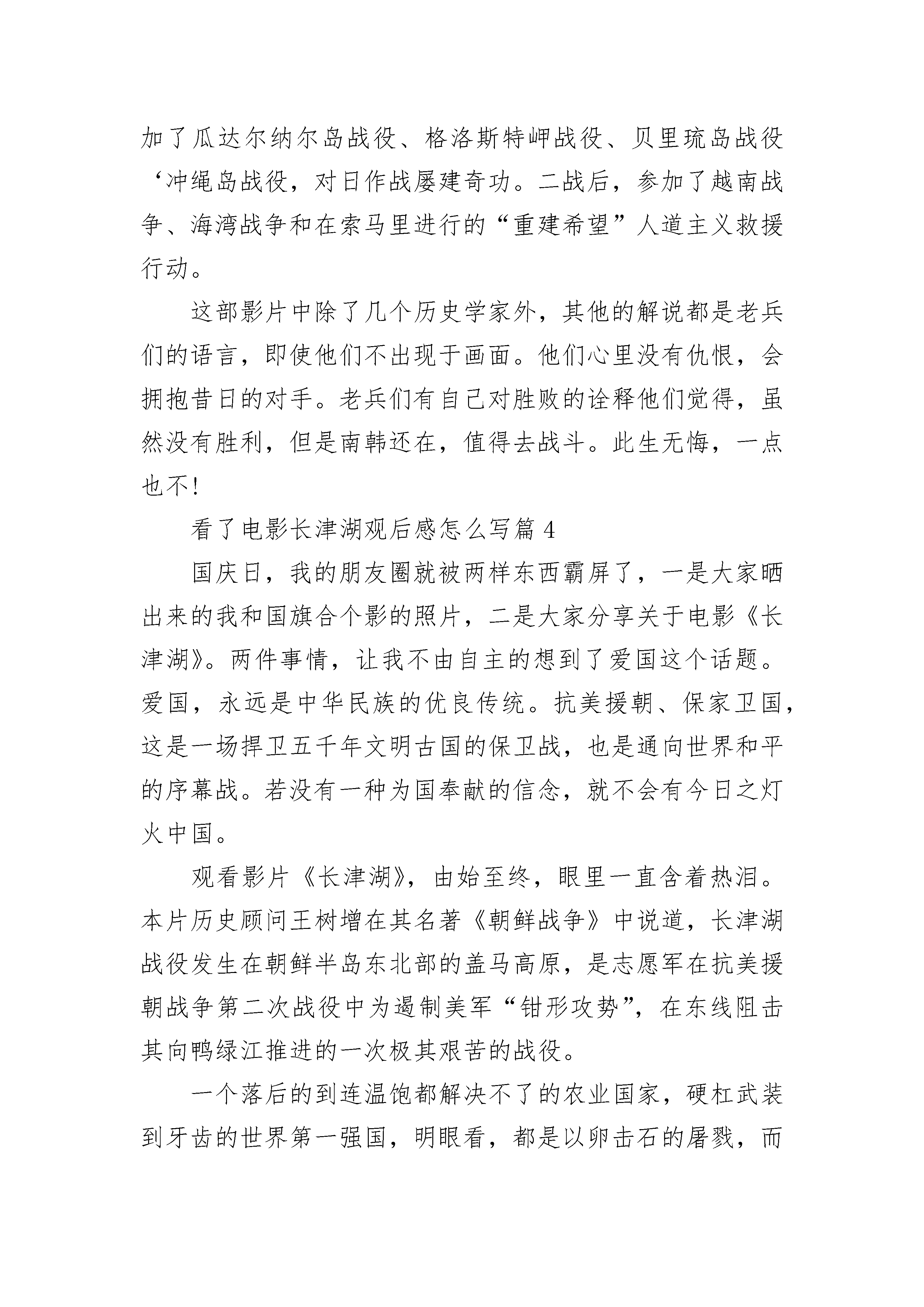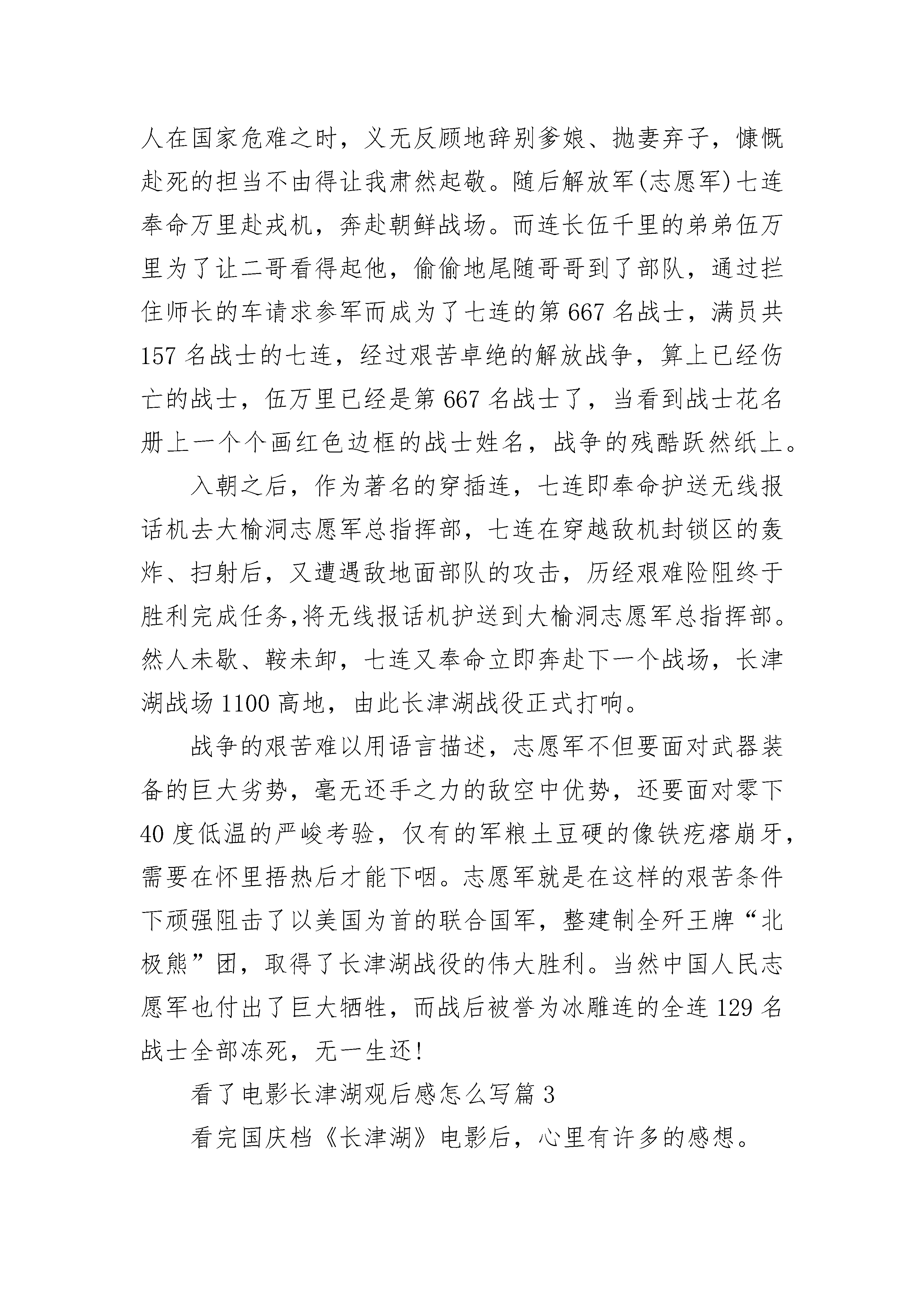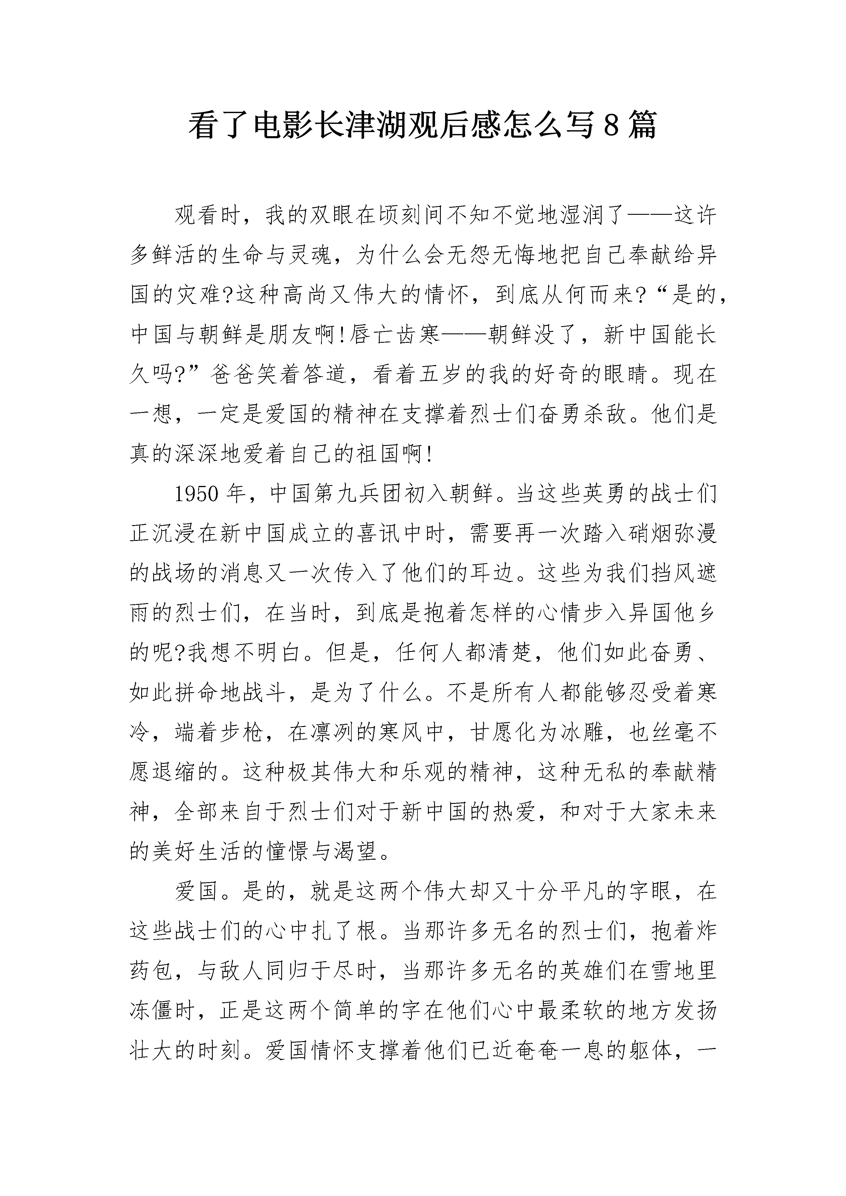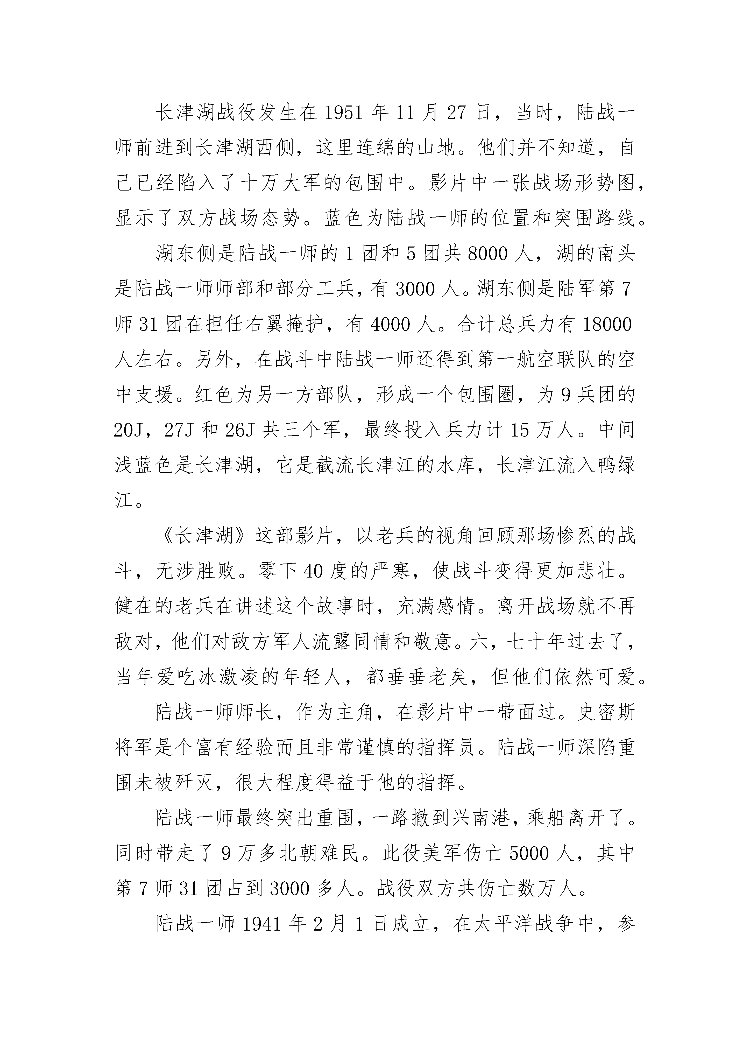 看了电影长津湖观后感怎么写8篇观看时,我的双眼在顷刻间不知不觉地湿润了——这许多鲜活的生命与灵魂,为什么会无怨无悔地把自己奉献给异国的灾难?这种高尚又伟大的情怀,到底从何而来?“是的,中国与朝鲜是朋友啊!唇亡齿寒——朝鲜没了,新中国能长久吗?”爸爸笑着答道,看着五岁的我的好奇的眼睛。现在一想,一定是爱国的精神在支撑着烈士们奋勇杀敌。他们是真的深深地爱着自己的祖国啊!1950年,中国第九兵团初入朝鲜。当这些英勇的战士们正沉浸在新中国成立的喜讯中时,需要再一次踏入硝烟弥漫的战场的消息又一次传入了他们的耳边。这些为我们挡风遮雨的烈士们,在当时,到底是抱着怎样的心情步入异国他乡的呢?我想不明白。但是,任何人都清楚,他们如此奋勇、如此拼命地战斗,是为了什么。不是所有人都能够忍受着寒冷,端着步枪,在凛冽的寒风中,甘愿化为冰雕,也丝毫不愿退缩的。这种极其伟大和乐观的精神,这种无私的奉献精神,全部来自于烈士们对于新中国的热爱,和对于大家未来的美好生活的憧憬与渴望。爱国。是的,就是这两个伟大却又十分平凡的字眼,在这些战士们的心中扎了根。当那许多无名的烈士们,抱着炸药包,与敌人同归于尽时,当那许多无名的英雄们在雪地里冻僵时,正是这两个简单的字在他们心中最柔软的地方发扬壮大的时刻。爱国情怀支撑着他们已近奄奄一息的躯体,一次又一次地击败美国的王牌军团,一次又一次取得近乎无人可及的胜利。我们,作为新一代的接班人,同样应当好好学习,奋勇拼搏,才能够对得起七十年前逝去的烈士们的生命和鲜血。中华民族的崛起,已经成为了我们的任务。少年智,则国智;少年强,则国强。是的,我们一定要如饥似渴地学,吃苦耐劳地做,才会使自己强大,才会使我们祖国的未来强大。身为学生的我们,其实也可以做到“精忠报国”。只要做好自己分内的事,就算是在为祖国分担。未来的中国,就一定会强大!中华民族伟大复兴的中国梦,已经寄托在了我们的身上。你,准备好为它而奋斗了吗?看了电影长津湖观后感怎么写篇2长时间不间断的宣发推广,好评如潮的观后影评,电影《长津湖》可谓吊足了我的胃口,让我迫不及待地提前一天预定好一张9月30日21:30分的电影票,只为致敬英雄。说实话以前我对抗美援朝战争中的长津湖战役知之甚少,甚至于对抗美援朝战争的了解也更多地源于电影《上甘岭》、《奇袭白虎团》、《英雄儿女》等等。对于电影《长津湖》到底有没有宣发推广说的那么好、那么燃亦心存疑虑,但想到鬼才徐克能够把老电影《智取威虎山》拍的那么惊世骇俗,对电影《长津湖》的精彩我还是有信心。电影从“若有战,召必回”开始,以中国人民解放军第九兵团所属某七连连长伍千里和连指导员梅生为代表的军人在国家危难之时,义无反顾地辞别爹娘、抛妻弃子,慷慨赴死的担当不由得让我肃然起敬。随后解放军(志愿军)七连奉命万里赴戎机,奔赴朝鲜战场。而连长伍千里的弟弟伍万里为了让二哥看得起他,偷偷地尾随哥哥到了部队,通过拦住师长的车请求参军而成为了七连的第667名战士,满员共157名战士的七连,经过艰苦卓绝的解放战争,算上已经伤亡的战士,伍万里已经是第667名战士了,当看到战士花名册上一个个画红色边框的战士姓名,战争的残酷跃然纸上。入朝之后,作为著名的穿插连,七连即奉命护送无线报话机去大榆洞志愿军总指挥部,七连在穿越敌机封锁区的轰炸、扫射后,又遭遇敌地面部队的攻击,历经艰难险阻终于胜利完成任务,将无线报话机护送到大榆洞志愿军总指挥部。然人未歇、鞍未卸,七连又奉命立即奔赴下一个战场,长津湖战场1100高地,由此长津湖战役正式打响。战争的艰苦难以用语言描述,志愿军不但要面对武器装备的巨大劣势,毫无还手之力的敌空中优势,还要面对零下40度低温的严峻考验,仅有的军粮土豆硬的像铁疙瘩崩牙,需要在怀里捂热后才能下咽。志愿军就是在这样的艰苦条件下顽强阻击了以美国为首的联合国军,整建制全歼王牌“北极熊”团,取得了长津湖战役的伟大胜利。当然中国人民志愿军也付出了巨大牺牲,而战后被誉为冰雕连的全连129名战士全部冻死,无一生还!看了电影长津湖观后感怎么写篇3看完国庆档《长津湖》电影后,心里有许多的感想。长津湖战役发生在1951年11月27日,当时,陆战一师前进到长津湖西侧,这里连绵的山地。他们并不知道,自己已经陷入了十万大军的包围中。影片中一张战场形势图,显示了双方战场态势。蓝色为陆战一师的位置和突围路线。湖东侧是陆战一师的1团和5团共8000人,湖的南头是陆战一师师部和部分工兵,有3000人。湖东侧是陆军第7师31团在担任右翼掩护,有4000人。合计总兵力有18000人左右。另外,在战斗中陆战一师还得到第一航空联队的空中支援。红色为另一方部队,形成一个包围圏,为9兵团的20J,27J和26J共三个军,最终投入兵力计15万人。中间浅蓝色是长津湖,它是截流长津江的水库,长津江流入鸭绿江。《长津