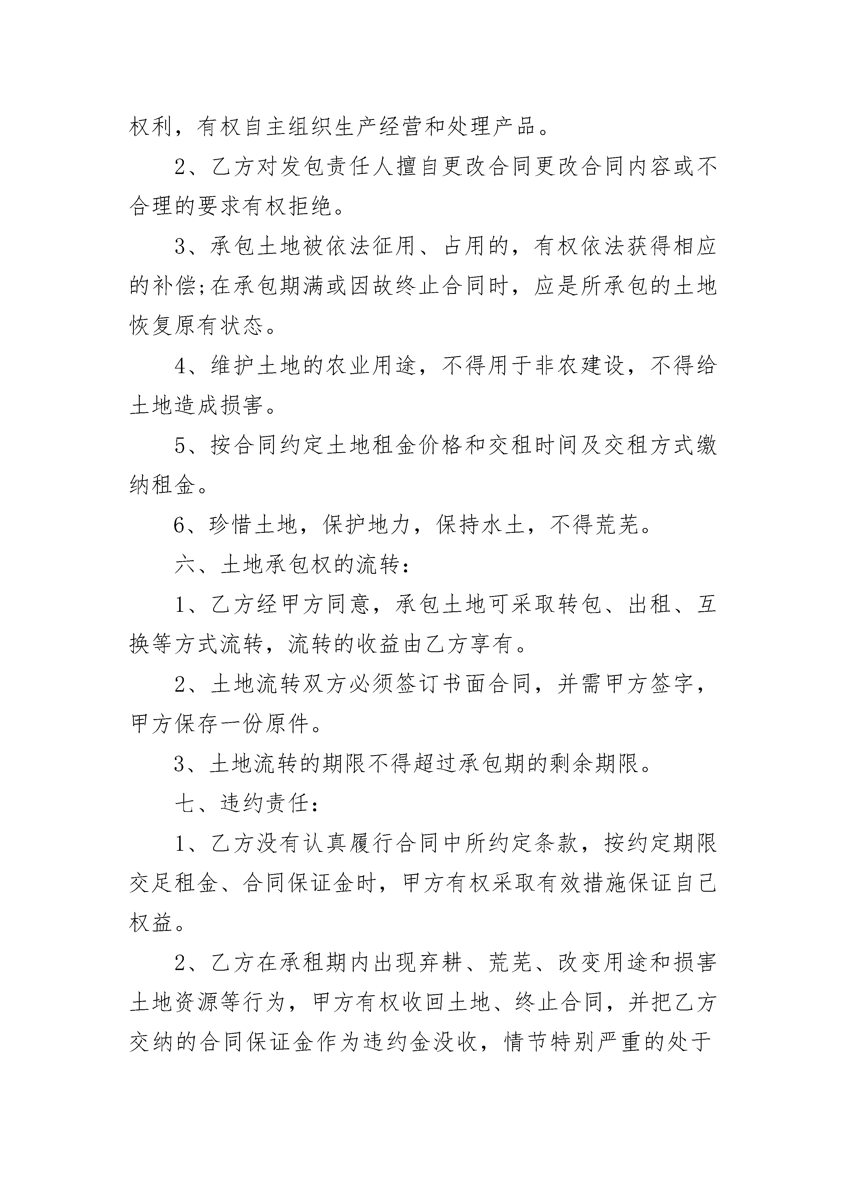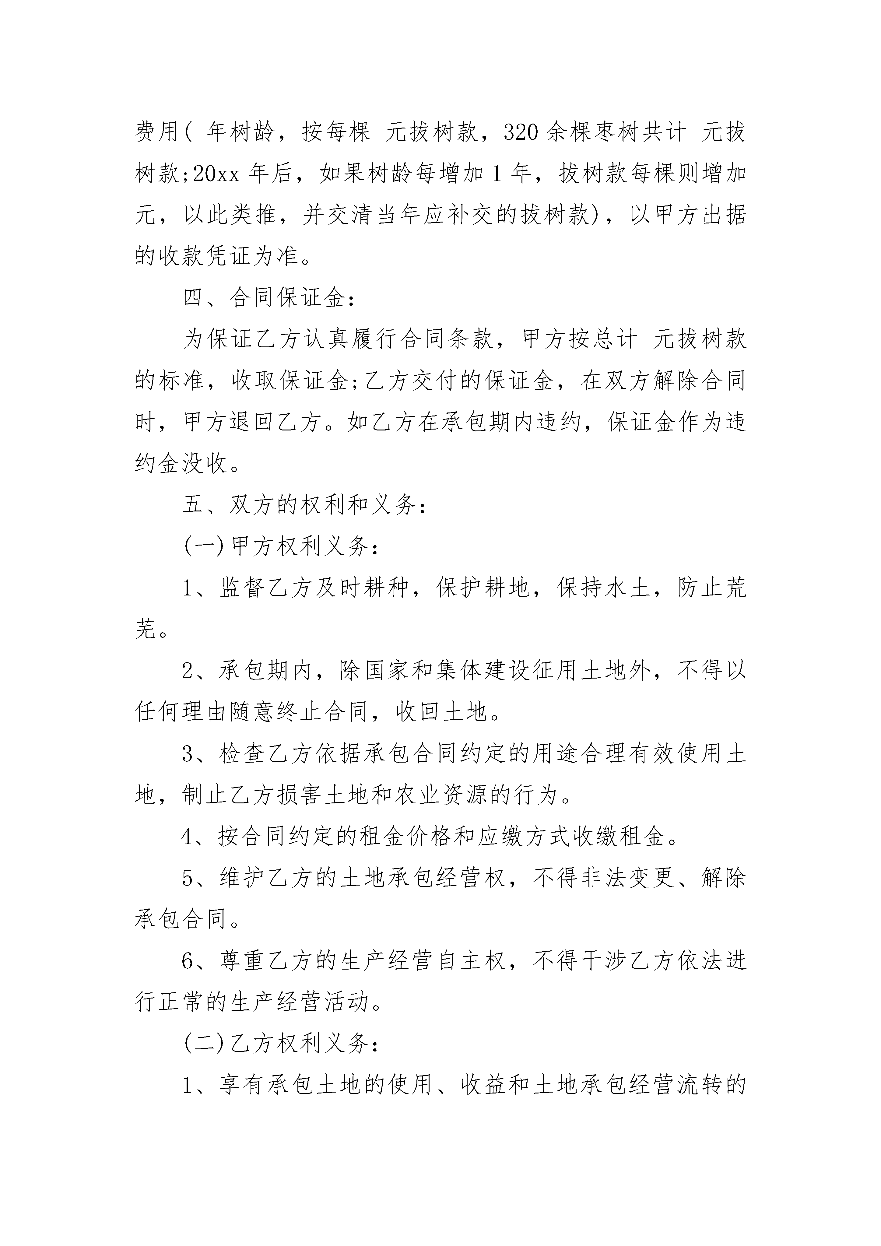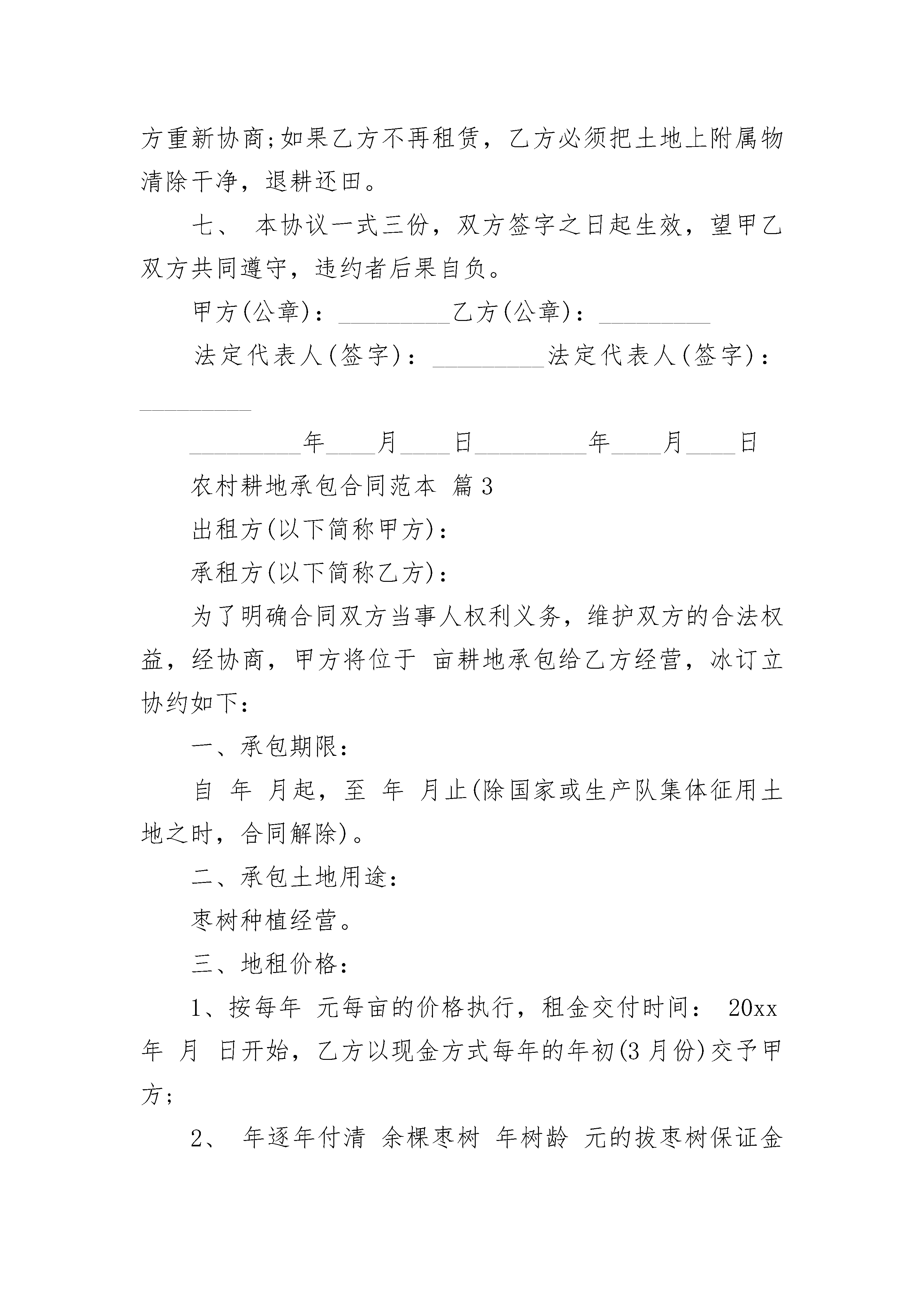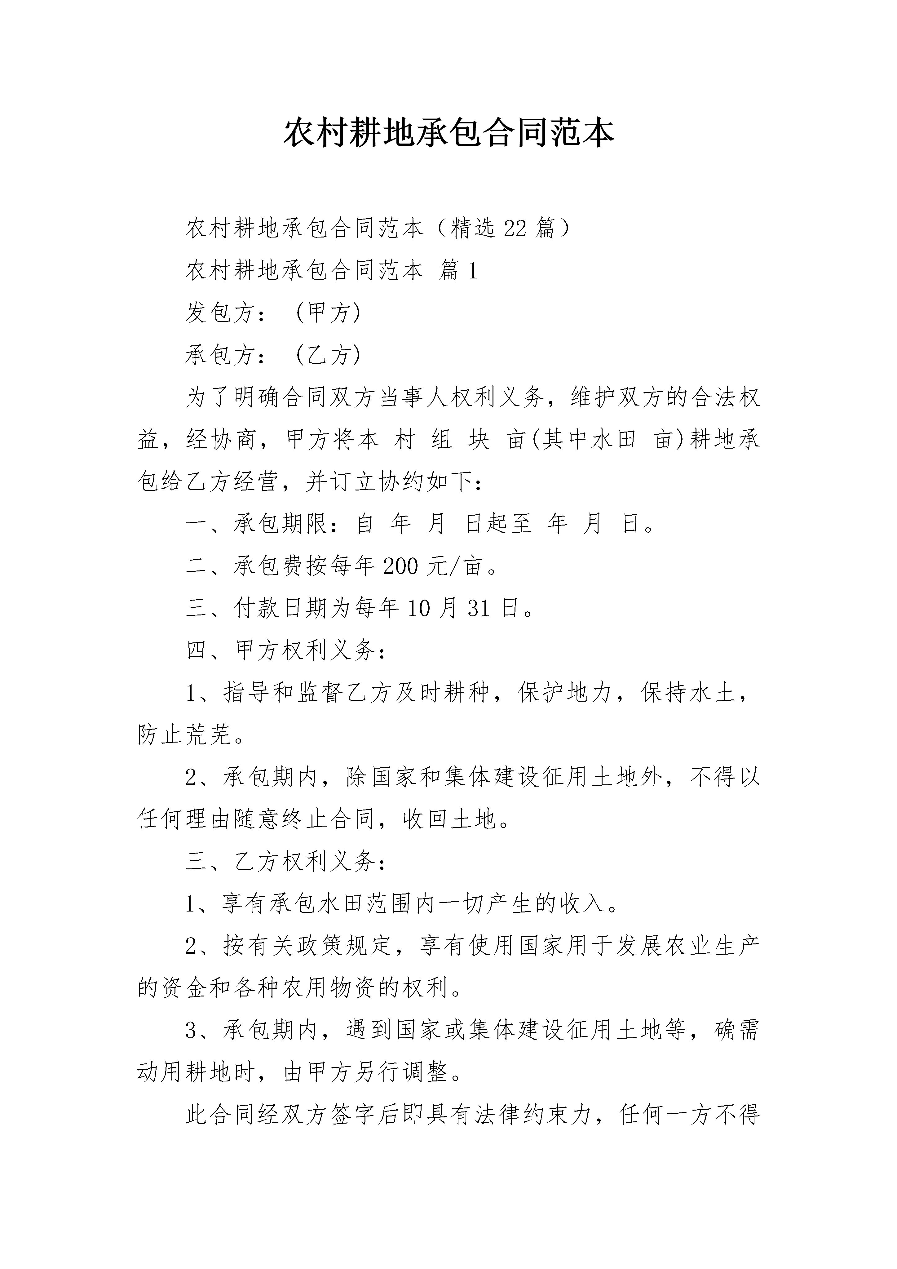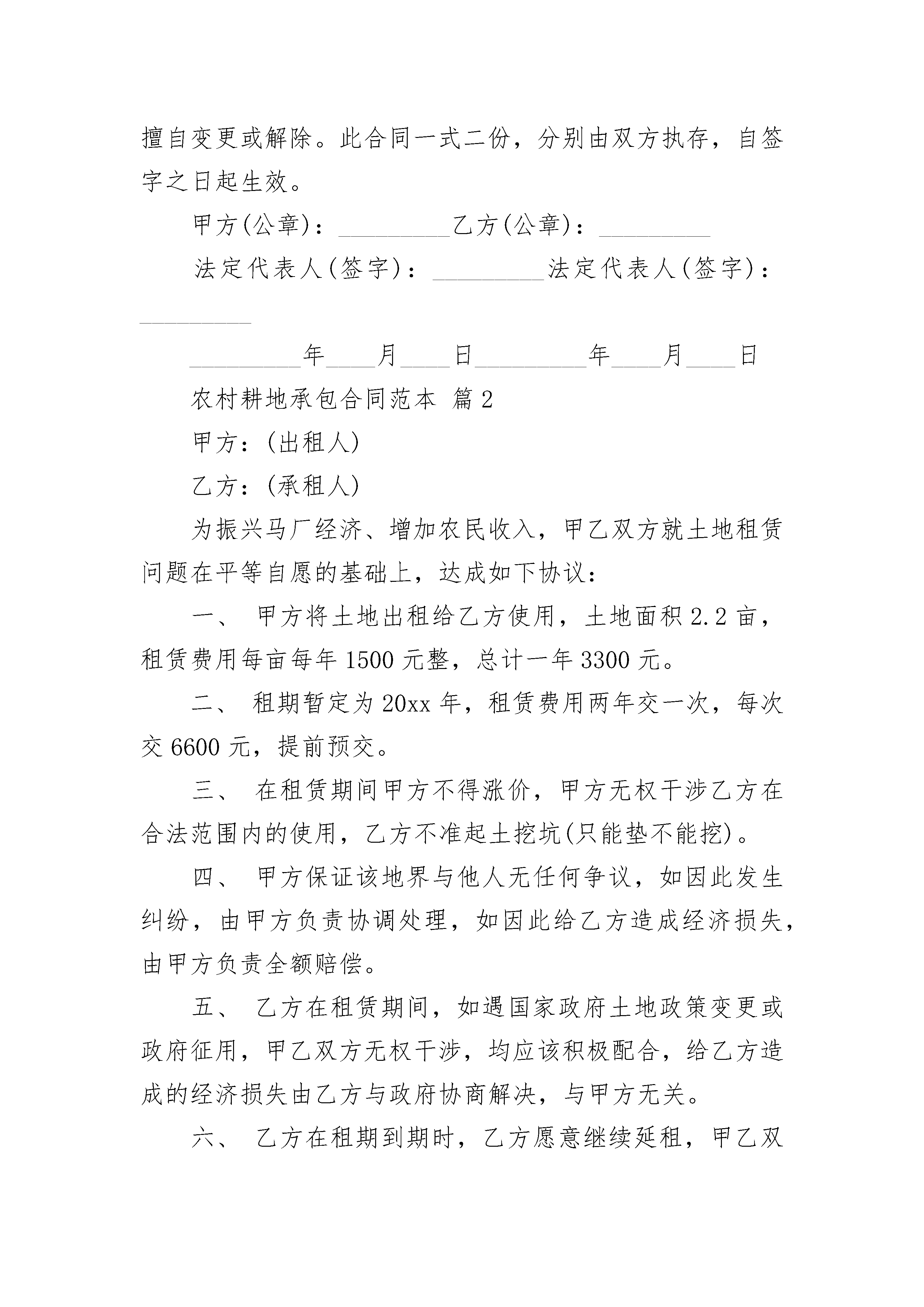 农村耕地承包合同范本农村耕地承包合同范本(精选22篇)农村耕地承包合同范本篇1发包方:(甲方)承包方:(乙方)为了明确合同双方当事人权利义务,维护双方的合法权益,经协商,甲方将本村组块亩(其中水田亩)耕地承包给乙方经营,并订立协约如下:一、承包期限:自年月日起至年月日。二、承包费按每年200元/亩。三、付款日期为每年10月31日。四、甲方权利义务:1、指导和监督乙方及时耕种,保护地力,保持水土,防止荒芜。2、承包期内,除国家和集体建设征用土地外,不得以任何理由随意终止合同,收回土地。三、乙方权利义务:1、享有承包水田范围内一切产生的收入。2、按有关政策规定,享有使用国家用于发展农业生产的资金和各种农用物资的权利。3、承包期内,遇到国家或集体建设征用土地等,确需动用耕地时,由甲方另行调整。此合同经双方签字后即具有法律约束力,任何一方不得擅自变更或解除。此合同一式二份,分别由双方执存,自签字之日起生效。甲方(公章):_________乙方(公章):_________法定代表人(签字):_________法定代表人(签字):__________________年____月____日_________年____月____日农村耕地承包合同范本篇2甲方:(出租人)乙方:(承租人)为振兴马厂经济、增加农民收入,甲乙双方就土地租赁问题在平等自愿的基础上,达成如下协议:一、甲方将土地出租给乙方使用,土地面积2.2亩,租赁费用每亩每年1500元整,总计一年3300元。二、租期暂定为20xx年,租赁费用两年交一次,每次交6600元,提前预交。三、在租赁期间甲方不得涨价,甲方无权干涉乙方在合法范围内的使用,乙方不准起土挖坑(只能垫不能挖)。四、甲方保证该地界与他人无任何争议,如因此发生纠纷,由甲方负责协调处理,如因此给乙方造成经济损失,由甲方负责全额赔偿。五、乙方在租赁期间,如遇国家政府土地政策变更或政府征用,甲乙双方无权干涉,均应该积极配合,给乙方造成的经济损失由乙方与政府协商解决,与甲方无关。六、乙方在租期到期时,乙方愿意继续延租,甲乙双方重新协商;如果乙方不再租赁,乙方必须把土地上附属物清除干净,退耕还田。七、本协议一式三份,双方签字之日起生效,望甲乙双方共同遵守,违约者后果自负。甲方(公章):_________乙方(公章):_________法定代表人(签字):_________法定代表人(签字):__________________年____月____日_________年____月____日农村耕地承包合同范本篇3出租方(以下简称甲方):承租方(以下简称乙方):为了明确合同双方当事人权利义务,维护双方的合法权益,经协商,甲方将位于亩耕地承包给乙方经营,冰订立协约如下:一、承包期限:自年月起,至年月止(除国家或生产队集体征用土地之时,合同解除)。二、承包土地用途:枣树种植经营。三、地租价格:1、按每年元每亩的价格执行,租金交付时间:20xx年月日开始,乙方以现金方式每年的年初(3月份)交予甲方;2、年逐年付清余棵枣树年树龄元的拔枣树保证金费用(年树龄,按每棵元拔树款,320余棵枣树共计元拔树款;20xx年后,如果树龄每增加1年,拔树款每棵则增加元,以此类推,并交清当年应补交的拔树款),以甲方出据的收款凭证为准。四、合同保证金:为保证乙方认真履行合同条款,甲方按总计元拔树款的标准,收取保证金;乙方交付的保证金,在双方解除合同时,甲方退回乙方。如乙方在承包期内违约,保证金作为违约金没收。五、双方的权利和义务:(一)甲方权利义务:1、监督乙方及时耕种,保护耕地,保持水土,防止荒芜。2、承包期内,除国家和集体建设征用土地外,不得以任何理由随意终止合同,收回土地。3、检查乙方依据承包合同约定的用途合理有效使用土地,制止乙方损害土地和农业资源的行为。4、按合同约定的租金价格和应缴方式收缴租金。5、维护乙方的土地承包经营权,不得非法变更、解除承包合同。6、尊重乙方的生产经营自主权,不得干涉乙方依法进行正常的生产经营活动。(二)乙方权利义务:1、享有承包土地的使用、收益和土地承包经营流转的权利,有权自主组织生产经营和处理产品。2、乙方对发包责任人擅自更改合同更改合同内容或不合理的要求有权拒绝。3、承包土地被依法征用、占用的,有权依法获得相应的补偿;在承包期满或因故终止合同时,应是所承包的土地恢复原有状态。4、维护土地的农业用途,不得用于非农建设,不得给土地造成损害。5、按合同约定土地租金价格和交租时间及交租方式缴纳租金。6、珍惜土地,保护地力,保持水土,不得荒芜。六、土地承包权的流转:1、乙方经甲方同意,承包土地可采取转包、出租、互换等方式流转,流转的收益由乙方享有。2、土地流转双方必须签订书面合同,并需甲方签字,甲方保存一份原件。3、土地流转的期限