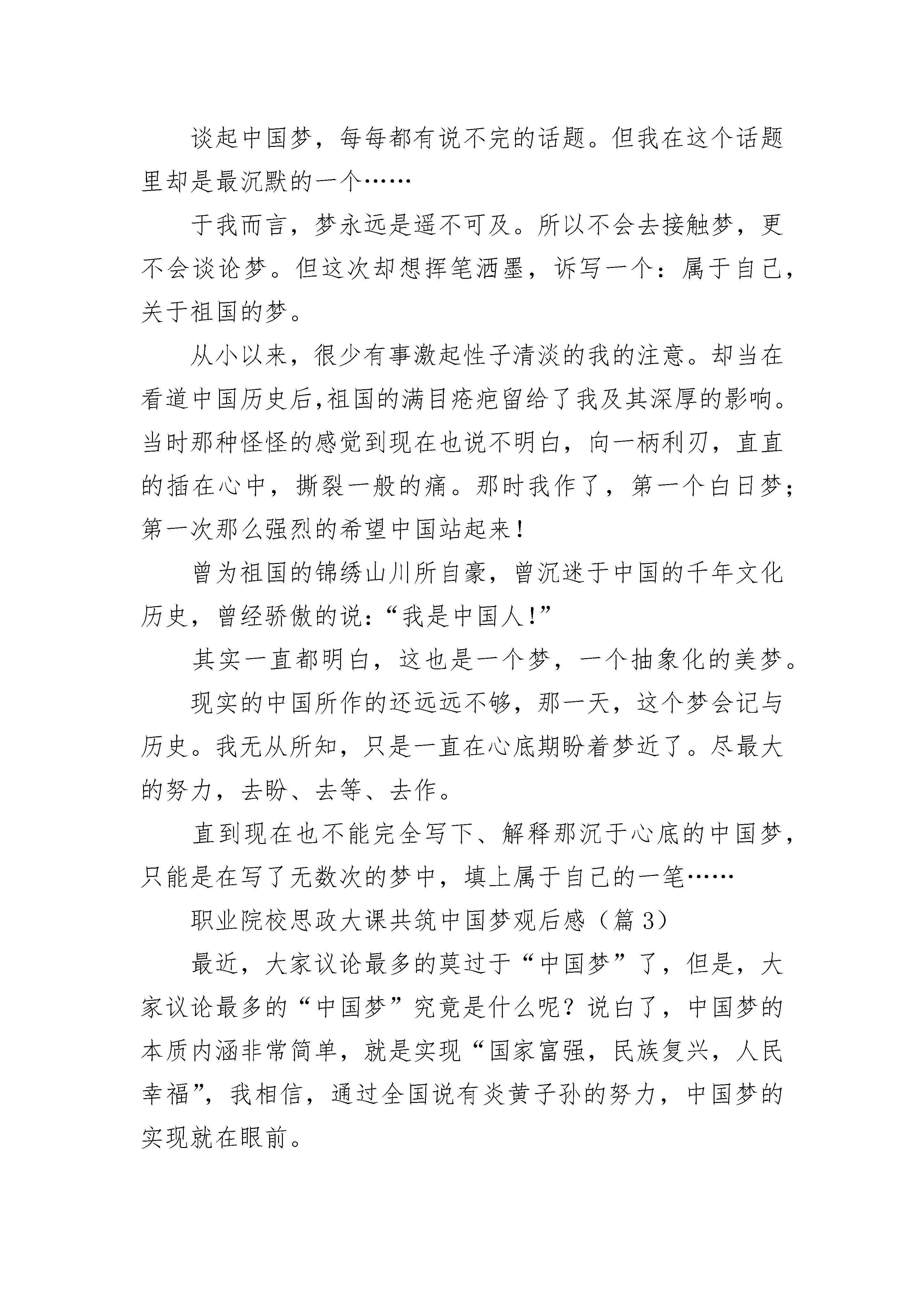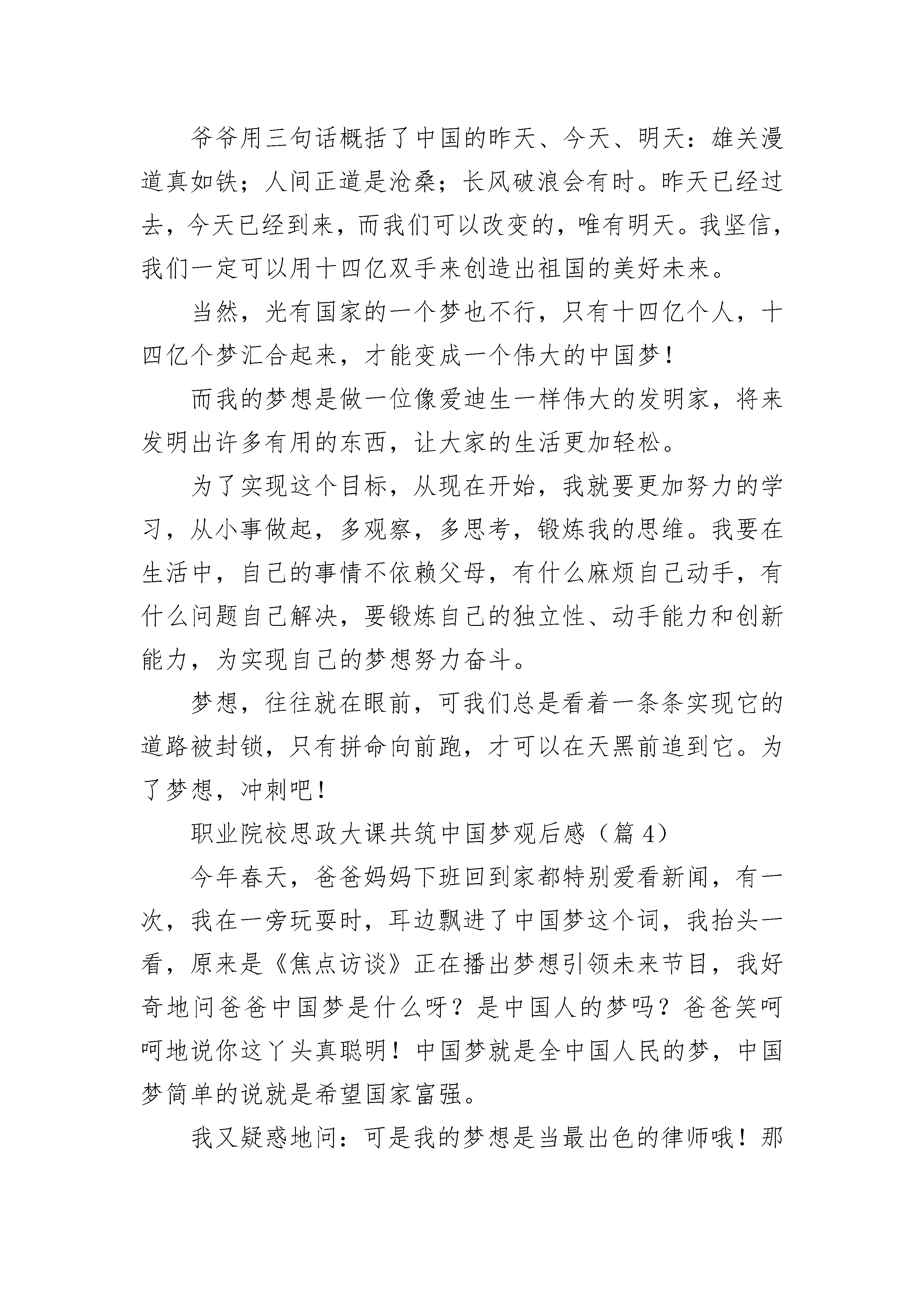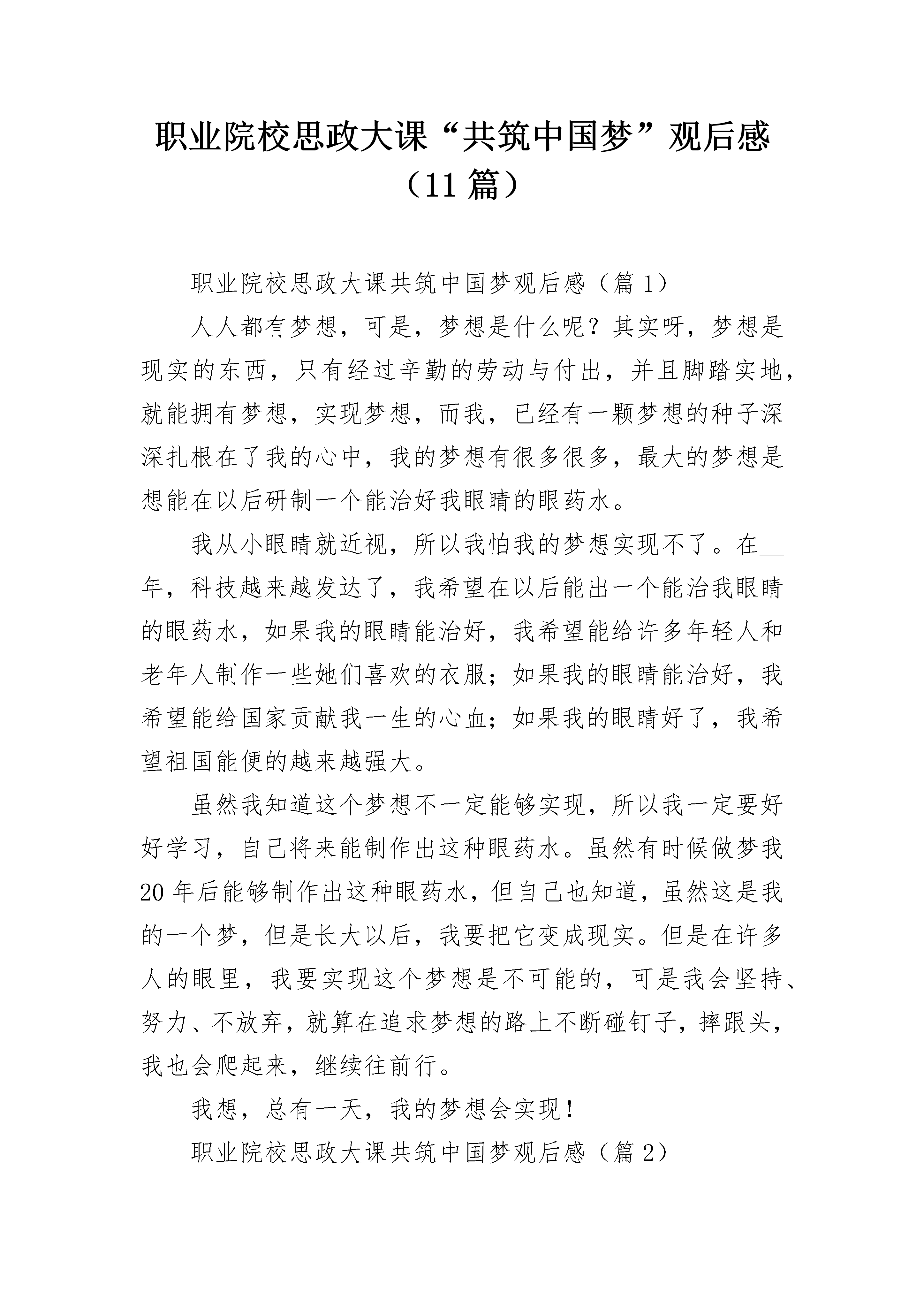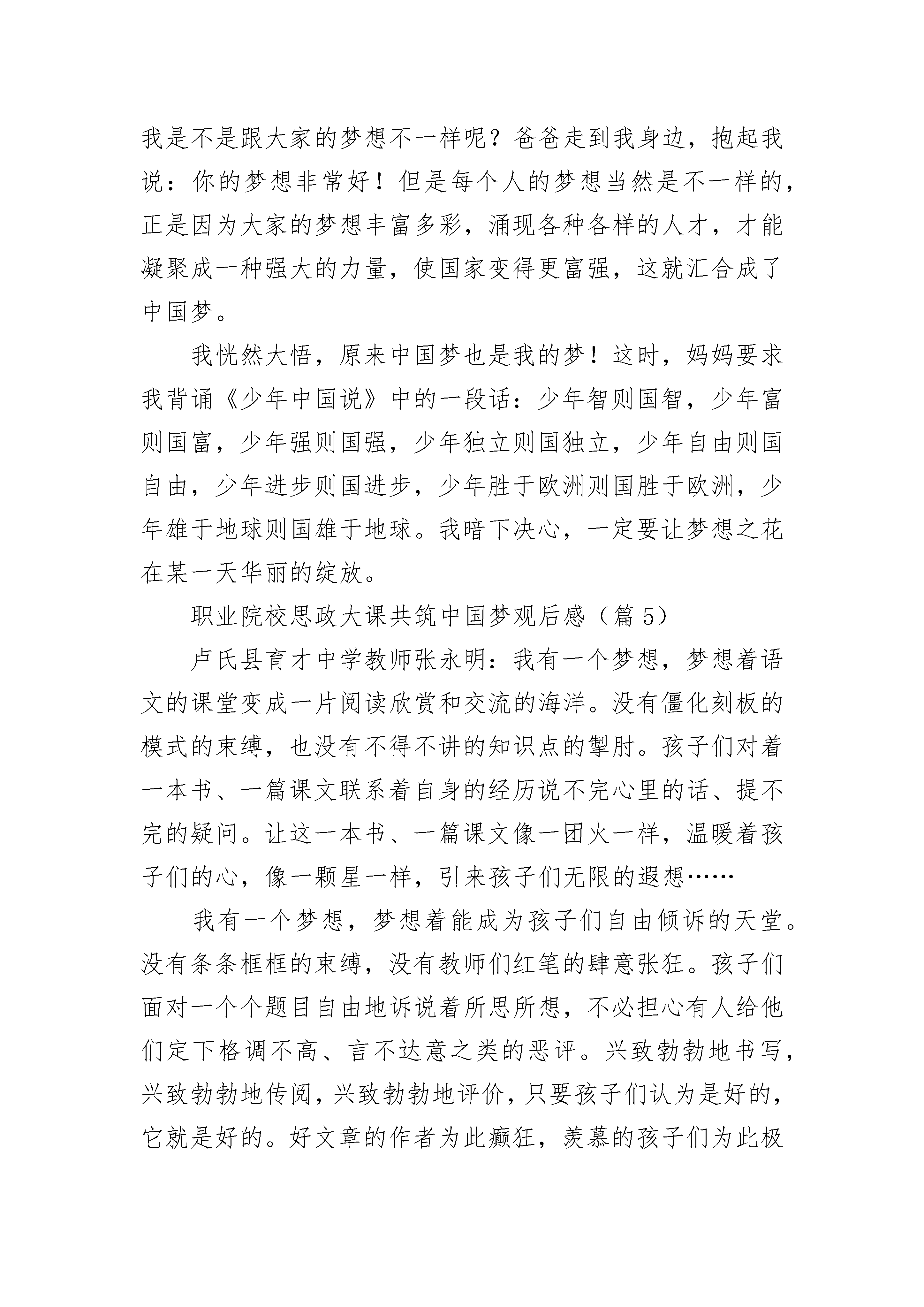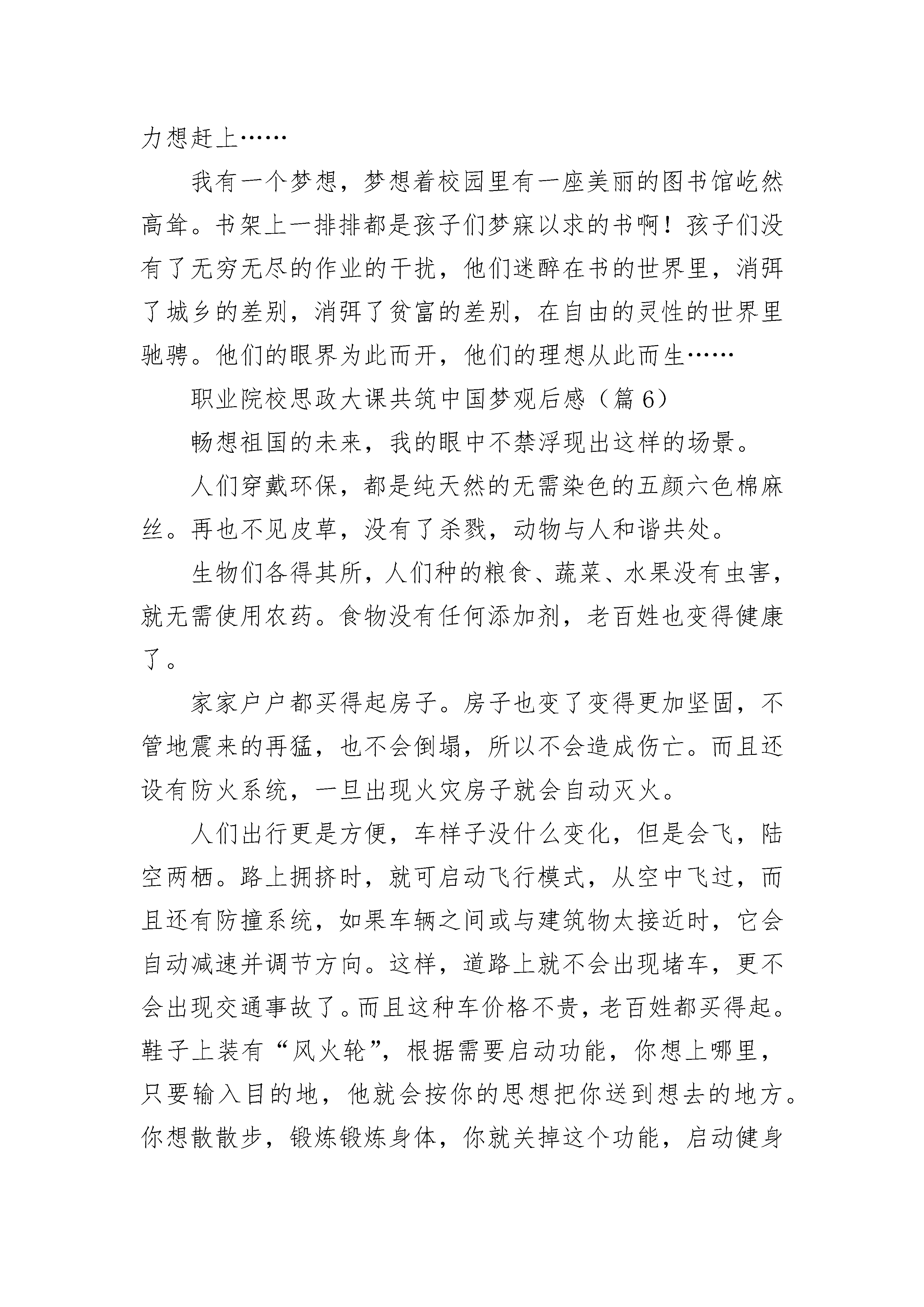 职业院校思政大课“共筑中国梦”观后感(11篇)职业院校思政大课共筑中国梦观后感(篇1)人人都有梦想,可是,梦想是什么呢?其实呀,梦想是现实的东西,只有经过辛勤的劳动与付出,并且脚踏实地,就能拥有梦想,实现梦想,而我,已经有一颗梦想的种子深深扎根在了我的心中,我的梦想有很多很多,最大的梦想是想能在以后研制一个能治好我眼睛的眼药水。我从小眼睛就近视,所以我怕我的梦想实现不了。在__年,科技越来越发达了,我希望在以后能出一个能治我眼睛的眼药水,如果我的眼睛能治好,我希望能给许多年轻人和老年人制作一些她们喜欢的衣服;如果我的眼睛能治好,我希望能给国家贡献我一生的心血;如果我的眼睛好了,我希望祖国能便的越来越强大。虽然我知道这个梦想不一定能够实现,所以我一定要好好学习,自己将来能制作出这种眼药水。虽然有时候做梦我20年后能够制作出这种眼药水,但自己也知道,虽然这是我的一个梦,但是长大以后,我要把它变成现实。但是在许多人的眼里,我要实现这个梦想是不可能的,可是我会坚持、努力、不放弃,就算在追求梦想的路上不断碰钉子,摔跟头,我也会爬起来,继续往前行。我想,总有一天,我的梦想会实现!职业院校思政大课共筑中国梦观后感(篇2)谈起中国梦,每每都有说不完的话题。但我在这个话题里却是最沉默的一个……于我而言,梦永远是遥不可及。所以不会去接触梦,更不会谈论梦。但这次却想挥笔洒墨,诉写一个:属于自己,关于祖国的梦。从小以来,很少有事激起性子清淡的我的注意。却当在看道中国历史后,祖国的满目疮疤留给了我及其深厚的影响。当时那种怪怪的感觉到现在也说不明白,向一柄利刃,直直的插在心中,撕裂一般的痛。那时我作了,第一个白日梦;第一次那么强烈的希望中国站起来!曾为祖国的锦绣山川所自豪,曾沉迷于中国的千年文化历史,曾经骄傲的说:“我是中国人!”其实一直都明白,这也是一个梦,一个抽象化的美梦。现实的中国所作的还远远不够,那一天,这个梦会记与历史。我无从所知,只是一直在心底期盼着梦近了。尽最大的努力,去盼、去等、去作。直到现在也不能完全写下、解释那沉于心底的中国梦,只能是在写了无数次的梦中,填上属于自己的一笔……职业院校思政大课共筑中国梦观后感(篇3)最近,大家议论最多的莫过于“中国梦”了,但是,大家议论最多的“中国梦”究竟是什么呢?说白了,中国梦的本质内涵非常简单,就是实现“国家富强,民族复兴,人民幸福”,我相信,通过全国说有炎黄子孙的努力,中国梦的实现就在眼前。爷爷用三句话概括了中国的昨天、今天、明天:雄关漫道真如铁;人间正道是沧桑;长风破浪会有时。昨天已经过去,今天已经到来,而我们可以改变的,唯有明天。我坚信,我们一定可以用十四亿双手来创造出祖国的美好未来。当然,光有国家的一个梦也不行,只有十四亿个人,十四亿个梦汇合起来,才能变成一个伟大的中国梦!而我的梦想是做一位像爱迪生一样伟大的发明家,将来发明出许多有用的东西,让大家的生活更加轻松。为了实现这个目标,从现在开始,我就要更加努力的学习,从小事做起,多观察,多思考,锻炼我的思维。我要在生活中,自己的事情不依赖父母,有什么麻烦自己动手,有什么问题自己解决,要锻炼自己的独立性、动手能力和创新能力,为实现自己的梦想努力奋斗。梦想,往往就在眼前,可我们总是看着一条条实现它的道路被封锁,只有拼命向前跑,才可以在天黑前追到它。为了梦想,冲刺吧!职业院校思政大课共筑中国梦观后感(篇4)今年春天,爸爸妈妈下班回到家都特别爱看新闻,有一次,我在一旁玩耍时,耳边飘进了中国梦这个词,我抬头一看,原来是《焦点访谈》正在播出梦想引领未来节目,我好奇地问爸爸中国梦是什么呀?是中国人的梦吗?爸爸笑呵呵地说你这丫头真聪明!中国梦就是全中国人民的梦,中国梦简单的说就是希望国家富强。我又疑惑地问:可是我的梦想是当最出色的律师哦!那我是不是跟大家的梦想不一样呢?爸爸走到我身边,抱起我说:你的梦想非常好!但是每个人的梦想当然是不一样的,正是因为大家的梦想丰富多彩,涌现各种各样的人才,才能凝聚成一种强大的力量,使国家变得更富强,这就汇合成了中国梦。我恍然大悟,原来中国梦也是我的梦!这时,妈妈要求我背诵《少年中国说》中的一段话:少年智则国智,少年富则国富,少年强则国强,少年独立则国独立,少年自由则国自由,少年进步则国进步,少年胜于欧洲则国胜于欧洲,少年雄于地球则国雄于地球。我暗下决心,一定要让梦想之花在某一天华丽的绽放。职业院校思政大课共筑中国梦观后感(篇5)卢氏县育才中学教师张永明:我有一个梦想,梦想着语文的课堂变成一片阅读欣赏和交流的海洋。没有僵化刻板的模式的束缚,也没有不得不讲的知识点的掣肘。孩子们对着一本书、一篇课文联系着自身的经历说不完心里的话、提不完的疑问。让这一本书、一篇课文像一团火一样,温暖着孩子们的心,像一颗星一样,引来孩子们无限的遐想