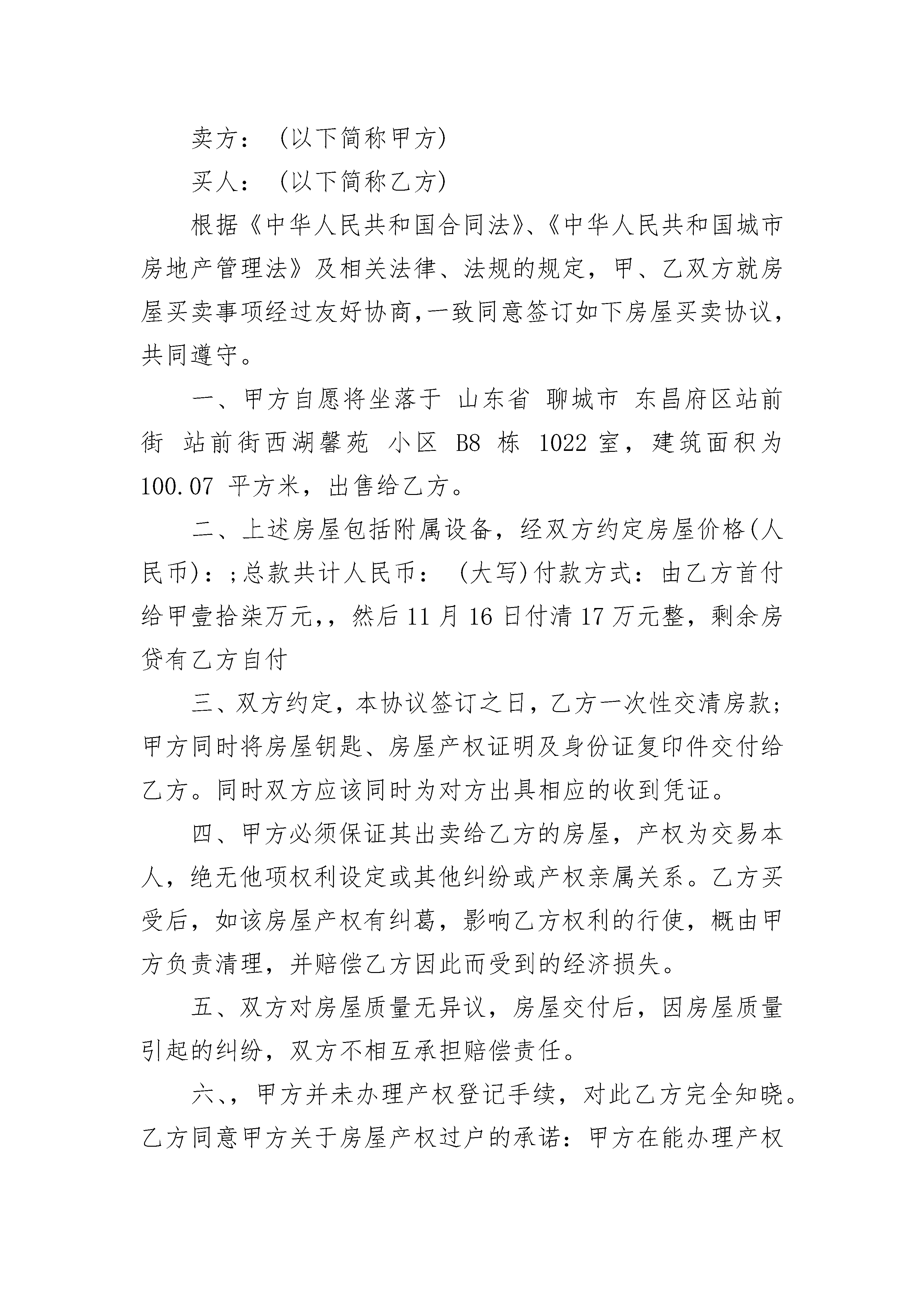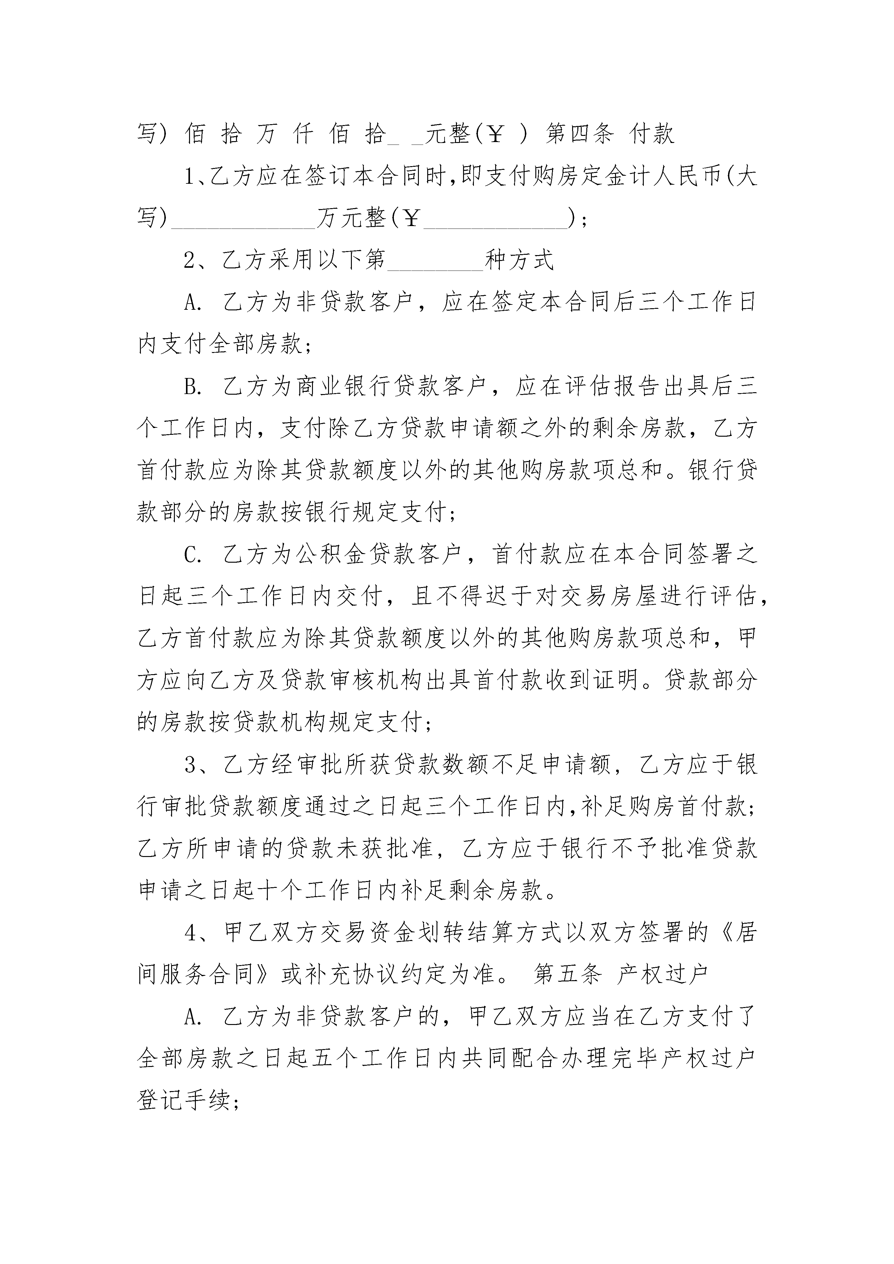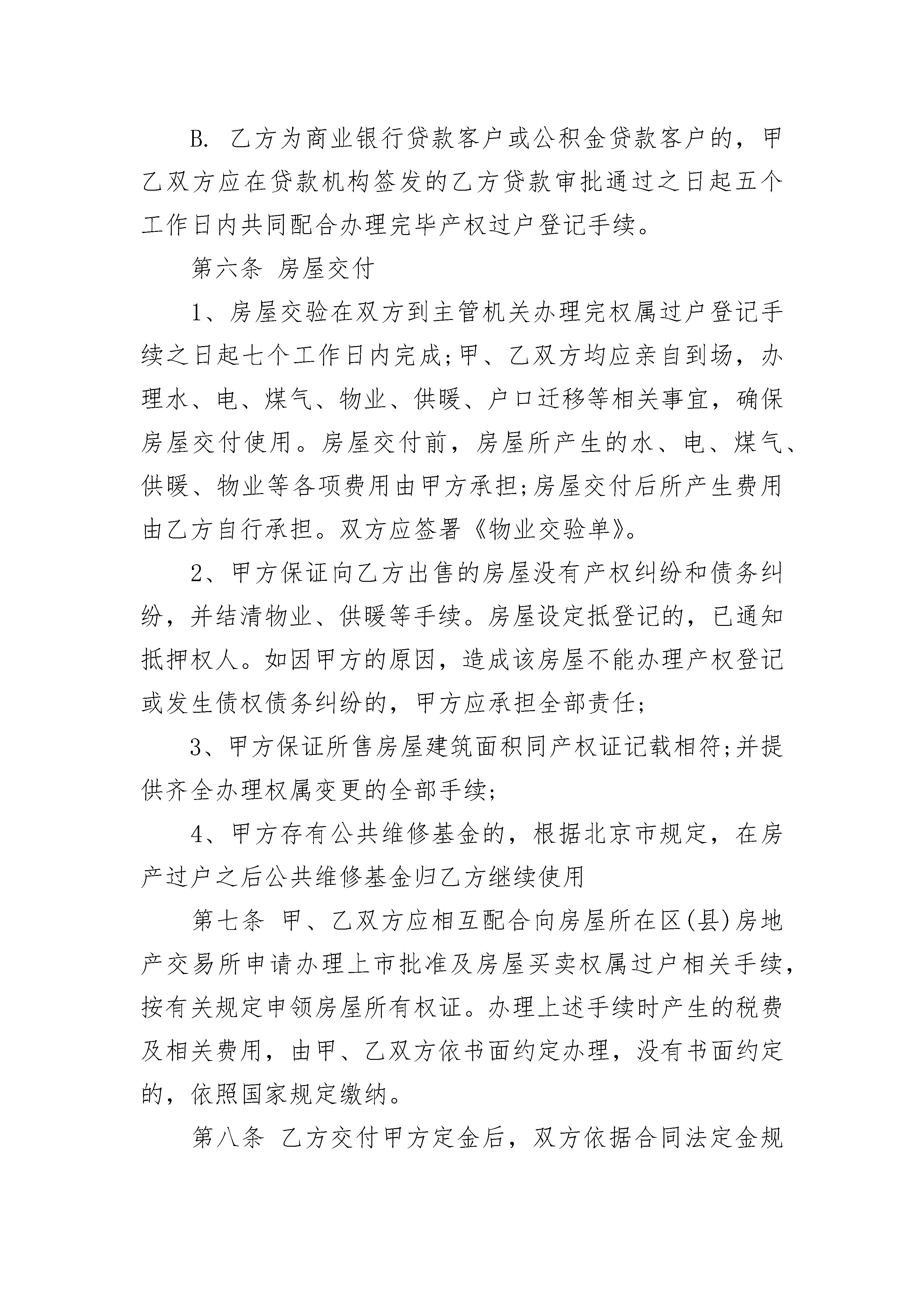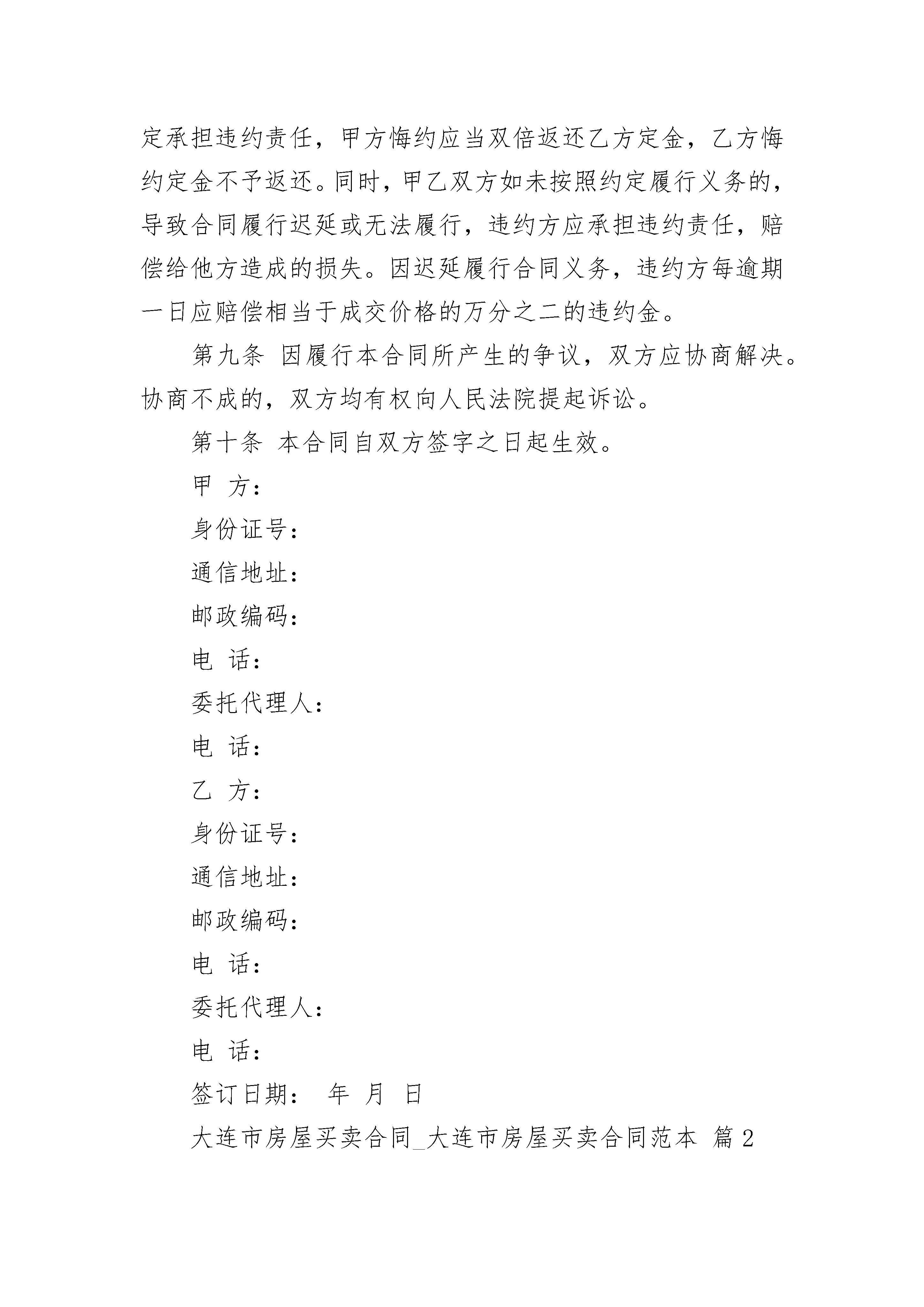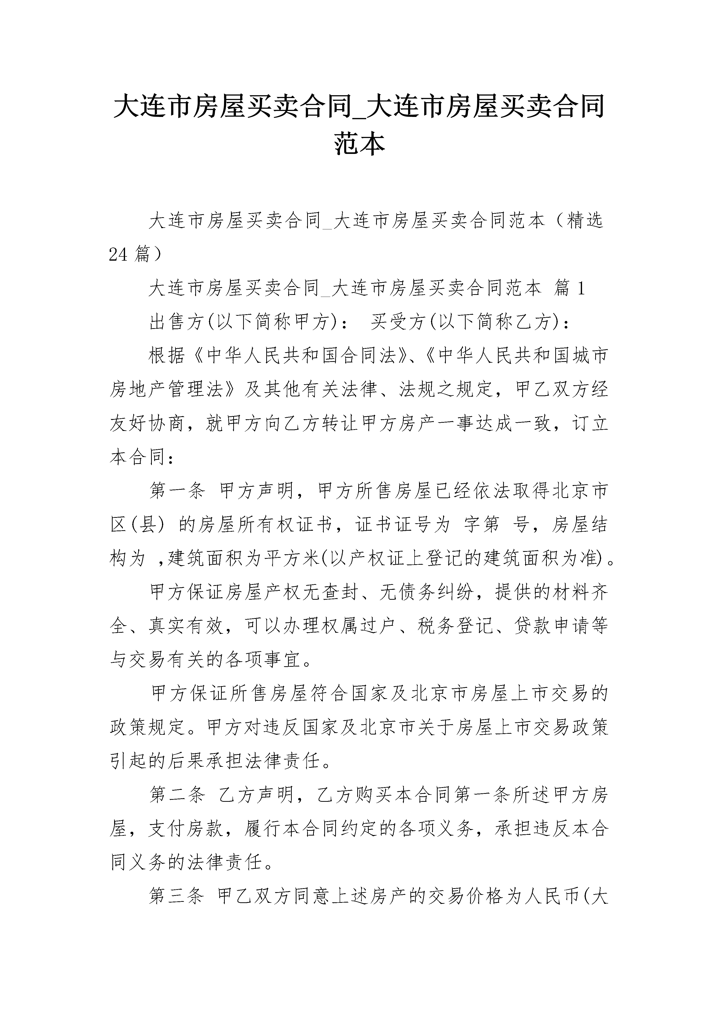 大连市房屋买卖合同_大连市房屋买卖合同范本大连市房屋买卖合同_大连市房屋买卖合同范本(精选24篇)大连市房屋买卖合同_大连市房屋买卖合同范本篇1出售方(以下简称甲方):买受方(以下简称乙方):根据《中华人民共和国合同法》、《中华人民共和国城市房地产管理法》及其他有关法律、法规之规定,甲乙双方经友好协商,就甲方向乙方转让甲方房产一事达成一致,订立本合同:第一条甲方声明,甲方所售房屋已经依法取得北京市区(县)的房屋所有权证书,证书证号为字第号,房屋结构为,建筑面积为平方米(以产权证上登记的建筑面积为准)。甲方保证房屋产权无查封、无债务纠纷,提供的材料齐全、真实有效,可以办理权属过户、税务登记、贷款申请等与交易有关的各项事宜。甲方保证所售房屋符合国家及北京市房屋上市交易的政策规定。甲方对违反国家及北京市关于房屋上市交易政策引起的后果承担法律责任。第二条乙方声明,乙方购买本合同第一条所述甲方房屋,支付房款,履行本合同约定的各项义务,承担违反本合同义务的法律责任。第三条甲乙双方同意上述房产的交易价格为人民币(大写)佰拾万仟佰拾__元整(¥)第四条付款1、乙方应在签订本合同时,即支付购房定金计人民币(大写)____________万元整(¥____________);2、乙方采用以下第________种方式A.乙方为非贷款客户,应在签定本合同后三个工作日内支付全部房款;B.乙方为商业银行贷款客户,应在评估报告出具后三个工作日内,支付除乙方贷款申请额之外的剩余房款,乙方首付款应为除其贷款额度以外的其他购房款项总和。银行贷款部分的房款按银行规定支付;C.乙方为公积金贷款客户,首付款应在本合同签署之日起三个工作日内交付,且不得迟于对交易房屋进行评估,乙方首付款应为除其贷款额度以外的其他购房款项总和,甲方应向乙方及贷款审核机构出具首付款收到证明。贷款部分的房款按贷款机构规定支付;3、乙方经审批所获贷款数额不足申请额,乙方应于银行审批贷款额度通过之日起三个工作日内,补足购房首付款;乙方所申请的贷款未获批准,乙方应于银行不予批准贷款申请之日起十个工作日内补足剩余房款。4、甲乙双方交易资金划转结算方式以双方签署的《居间服务合同》或补充协议约定为准。第五条产权过户A.乙方为非贷款客户的,甲乙双方应当在乙方支付了全部房款之日起五个工作日内共同配合办理完毕产权过户登记手续;B.乙方为商业银行贷款客户或公积金贷款客户的,甲乙双方应在贷款机构签发的乙方贷款审批通过之日起五个工作日内共同配合办理完毕产权过户登记手续。第六条房屋交付1、房屋交验在双方到主管机关办理完权属过户登记手续之日起七个工作日内完成;甲、乙双方均应亲自到场,办理水、电、煤气、物业、供暖、户口迁移等相关事宜,确保房屋交付使用。房屋交付前,房屋所产生的水、电、煤气、供暖、物业等各项费用由甲方承担;房屋交付后所产生费用由乙方自行承担。双方应签署《物业交验单》。2、甲方保证向乙方出售的房屋没有产权纠纷和债务纠纷,并结清物业、供暖等手续。房屋设定抵登记的,已通知抵押权人。如因甲方的原因,造成该房屋不能办理产权登记或发生债权债务纠纷的,甲方应承担全部责任;3、甲方保证所售房屋建筑面积同产权证记载相符;并提供齐全办理权属变更的全部手续;4、甲方存有公共维修基金的,根据北京市规定,在房产过户之后公共维修基金归乙方继续使用第七条甲、乙双方应相互配合向房屋所在区(县)房地产交易所申请办理上市批准及房屋买卖权属过户相关手续,按有关规定申领房屋所有权证。办理上述手续时产生的税费及相关费用,由甲、乙双方依书面约定办理,没有书面约定的,依照国家规定缴纳。第八条乙方交付甲方定金后,双方依据合同法定金规定承担违约责任,甲方悔约应当双倍返还乙方定金,乙方悔约定金不予返还。同时,甲乙双方如未按照约定履行义务的,导致合同履行迟延或无法履行,违约方应承担违约责任,赔偿给他方造成的损失。因迟延履行合同义务,违约方每逾期一日应赔偿相当于成交价格的万分之二的违约金。第九条因履行本合同所产生的争议,双方应协商解决。协商不成的,双方均有权向人民法院提起诉讼。第十条本合同自双方签字之日起生效。甲方:身份证号:通信地址:邮政编码:电话:委托代理人:电话:乙方:身份证号:通信地址:邮政编码:电话:委托代理人:电话:签订日期:年月日大连市房屋买卖合同_大连市房屋买卖合同范本篇2卖方:(以下简称甲方)买人:(以下简称乙方)根据《中华人民共和国合同法》、《中华人民共和国城市房地产管理法》及相关法律、法规的规定,甲、乙双方就房屋买卖事项经过友好协商,一致同意签订如下房屋买卖协议,共同遵守。一、甲方自愿将坐落于山东省聊城市东昌府区站前街站前街西湖馨苑小区B8栋1022室,建筑面积为100.07平方米,出售给乙方。二、上述房屋包括附属设备,经双方约定房屋价格