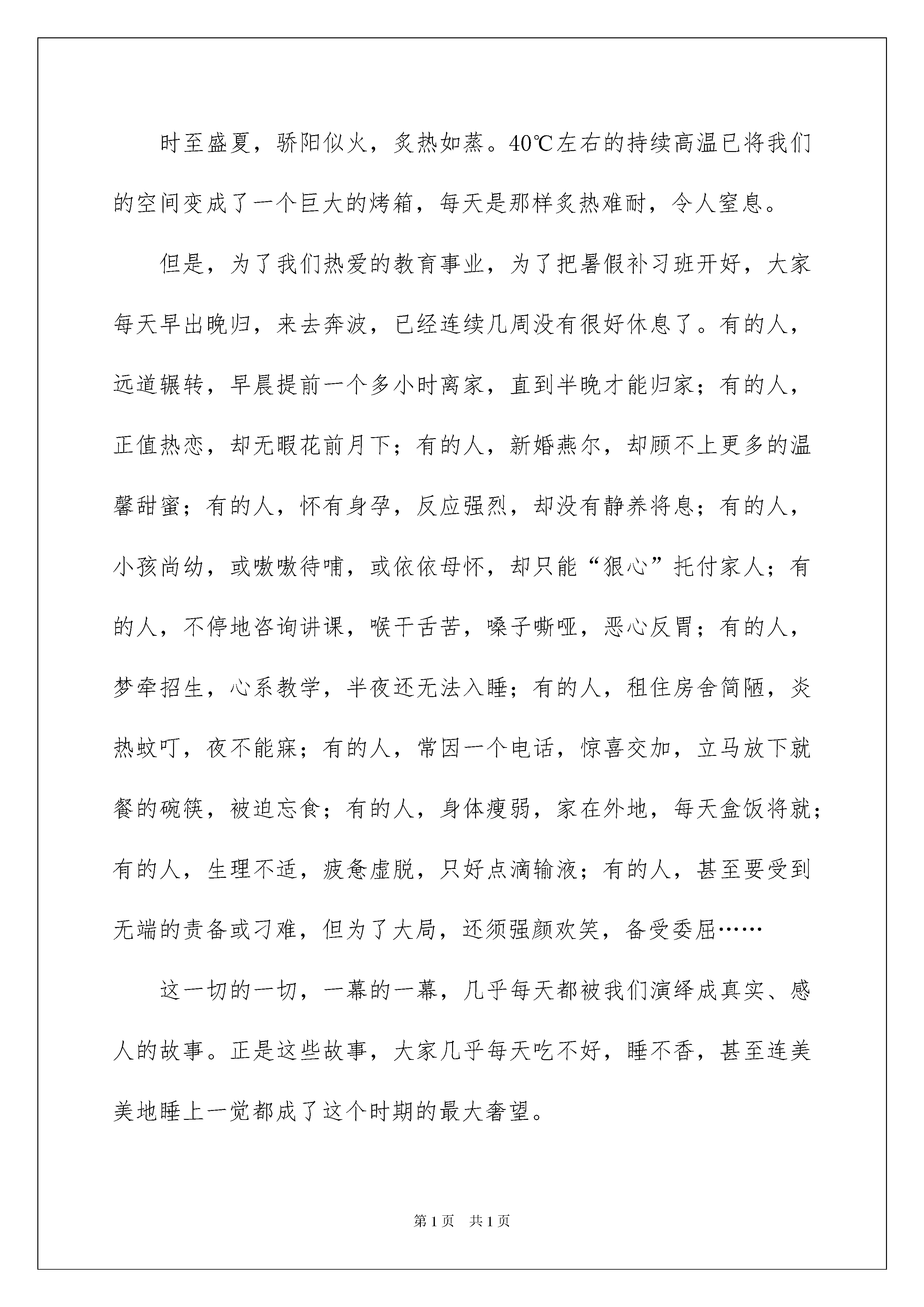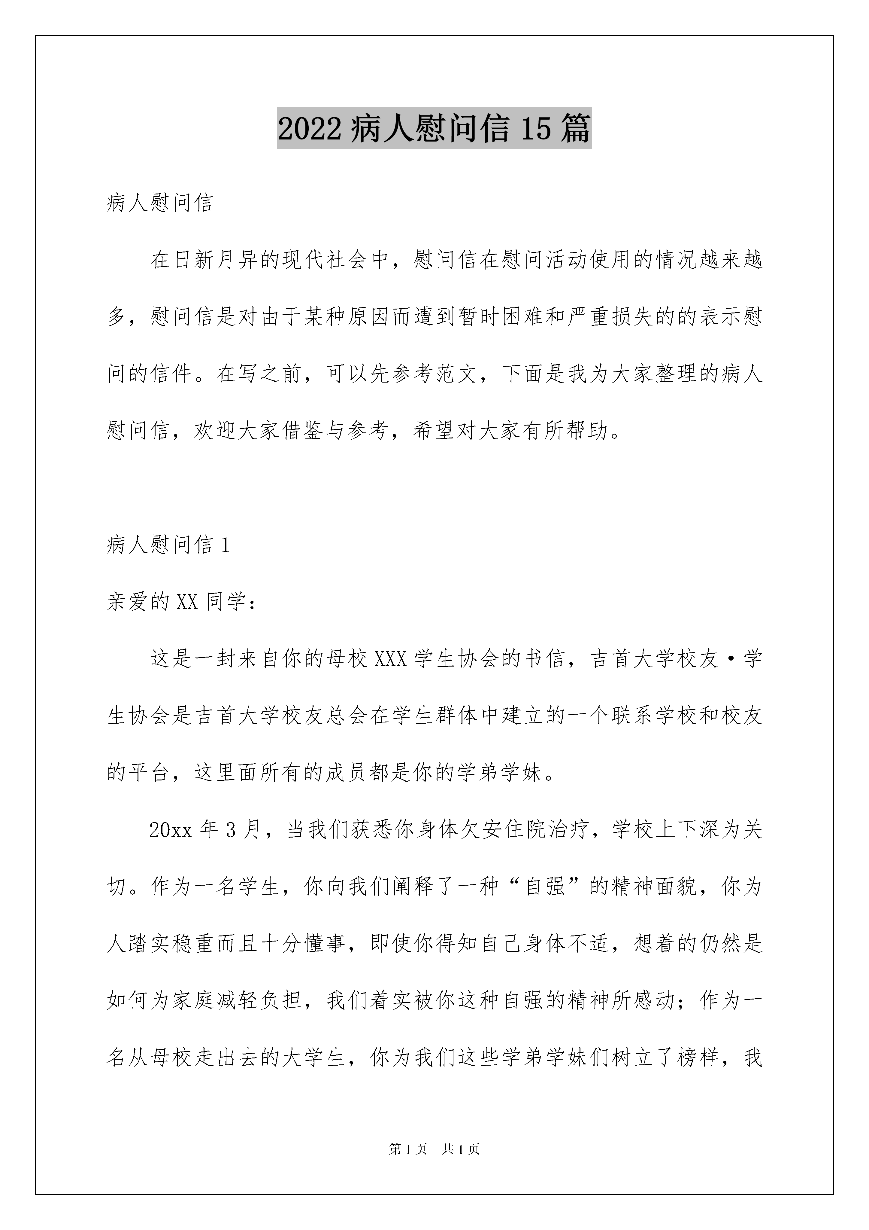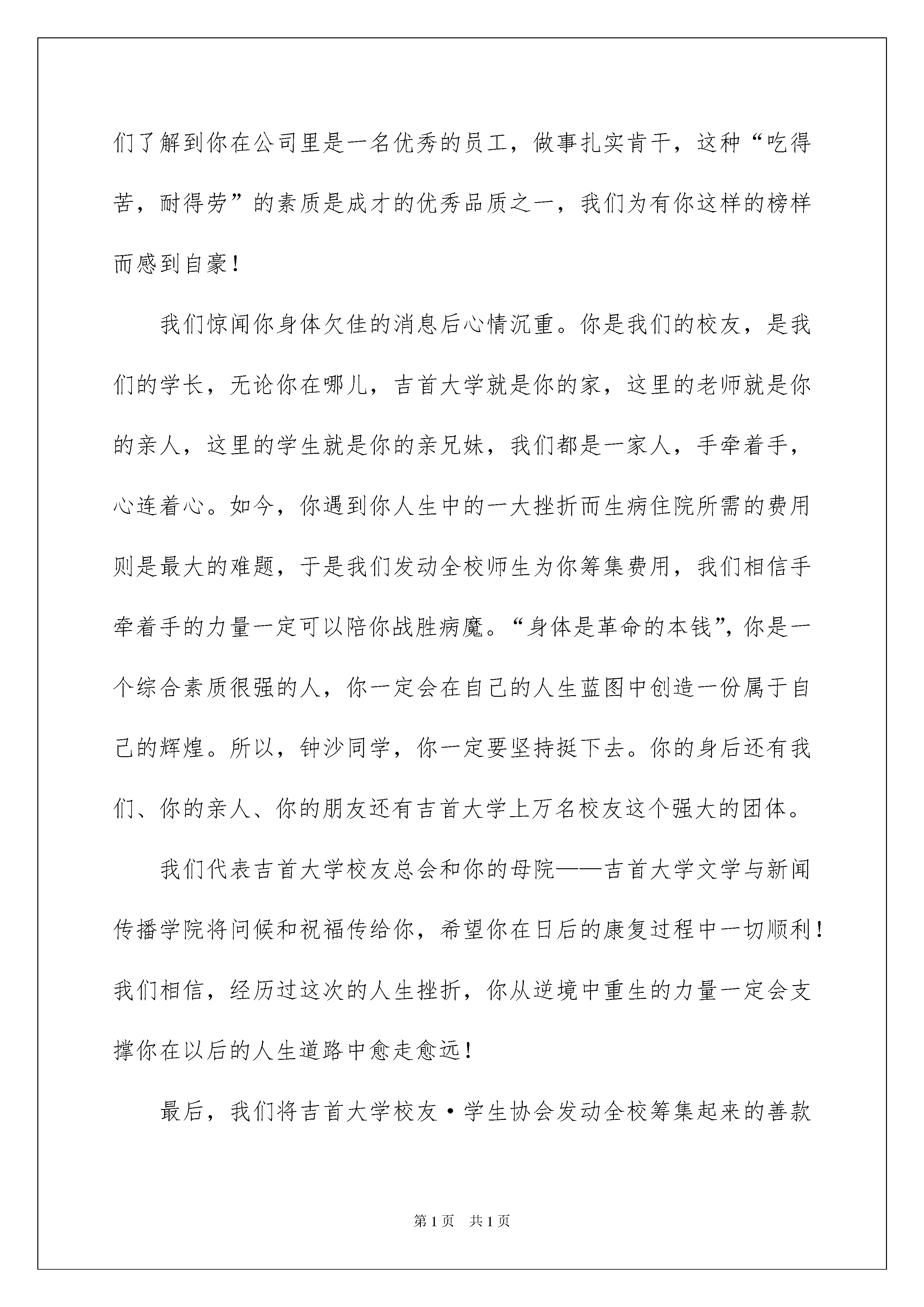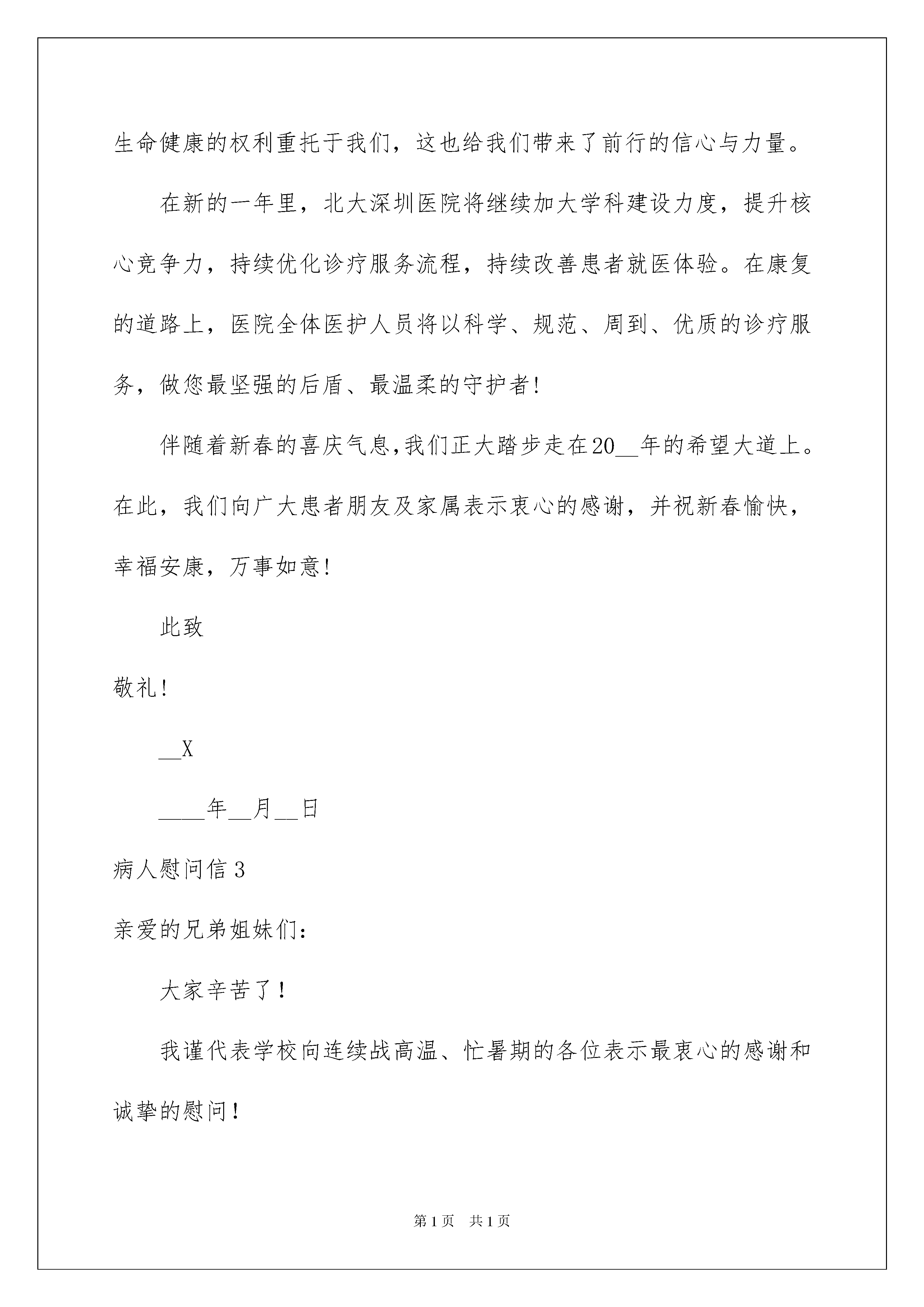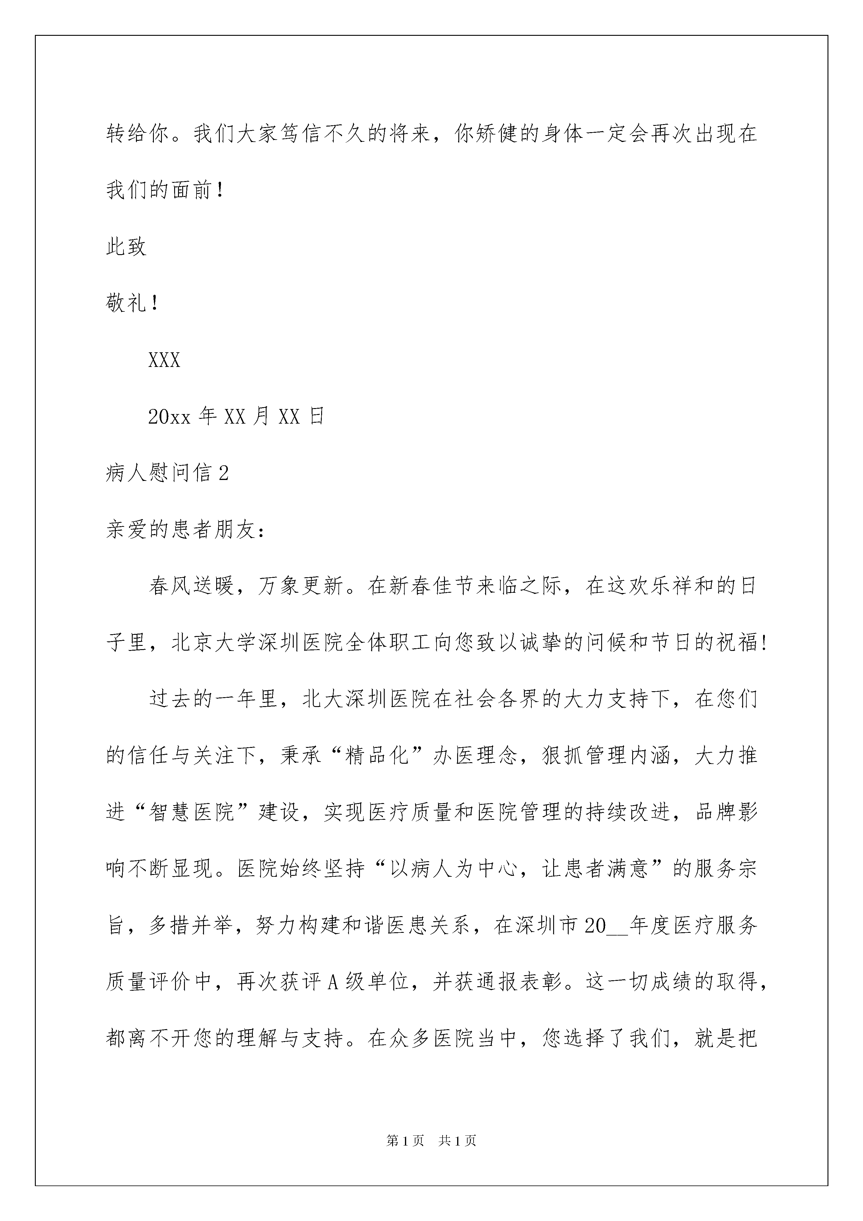 2022病人慰问信15篇病人慰问信在日新月异的现代社会中,慰问信在慰问活动使用的情况越来越多,慰问信是对由于某种原因而遭到暂时困难和严重损失的的表示慰问的信件。在写之前,可以先参考范文,下面是我为大家整理的病人慰问信,欢迎大家借鉴与参考,希望对大家有所帮助。病人慰问信1亲爱的XX同学:这是一封来自你的母校XXX学生协会的书信,吉首大学校友·学生协会是吉首大学校友总会在学生群体中建立的一个联系学校和校友的平台,这里面所有的成员都是你的学弟学妹。20xx年3月,当我们获悉你身体欠安住院治疗,学校上下深为关切。作为一名学生,你向我们阐释了一种“自强”的精神面貌,你为人踏实稳重而且十分懂事,即使你得知自己身体不适,想着的仍然是如何为家庭减轻负担,我们着实被你这种自强的精神所感动;作为一名从母校走出去的大学生,你为我们这些学弟学妹们树立了榜样,我们了解到你在公司里是一名优秀的员工,做事扎实肯干,这种“吃得苦,耐得劳”的素质是成才的优秀品质之一,我们为有你这样的榜样而感到自豪!我们惊闻你身体欠佳的消息后心情沉重。你是我们的校友,是我们的学长,无论你在哪儿,吉首大学就是你的家,这里的老师就是你的亲人,这里的学生就是你的亲兄妹,我们都是一家人,手牵着手,心连着心。如今,你遇到你人生中的一大挫折而生病住院所需的费用则是最大的难题,于是我们发动全校师生为你筹集费用,我们相信手牵着手的力量一定可以陪你战胜病魔。“身体是革命的本钱”,你是一个综合素质很强的人,你一定会在自己的人生蓝图中创造一份属于自己的辉煌。所以,钟沙同学,你一定要坚持挺下去。你的身后还有我们、你的亲人、你的朋友还有吉首大学上万名校友这个强大的团体。我们代表吉首大学校友总会和你的母院——吉首大学文学与新闻传播学院将问候和祝福传给你,希望你在日后的康复过程中一切顺利!我们相信,经历过这次的人生挫折,你从逆境中重生的力量一定会支撑你在以后的人生道路中愈走愈远!最后,我们将吉首大学校友·学生协会发动全校筹集起来的善款转给你。我们大家笃信不久的将来,你矫健的身体一定会再次出现在我们的面前!此致敬礼!XXX20xx年XX月XX日病人慰问信2亲爱的患者朋友:春风送暖,万象更新。在新春佳节来临之际,在这欢乐祥和的日子里,北京大学深圳医院全体职工向您致以诚挚的问候和节日的祝福!过去的一年里,北大深圳医院在社会各界的大力支持下,在您们的信任与关注下,秉承“精品化”办医理念,狠抓管理内涵,大力推进“智慧医院”建设,实现医疗质量和医院管理的持续改进,品牌影响不断显现。医院始终坚持“以病人为中心,让患者满意”的服务宗旨,多措并举,努力构建和谐医患关系,在深圳市20__年度医疗服务质量评价中,再次获评A级单位,并获通报表彰。这一切成绩的取得,都离不开您的理解与支持。在众多医院当中,您选择了我们,就是把生命健康的权利重托于我们,这也给我们带来了前行的信心与力量。在新的一年里,北大深圳医院将继续加大学科建设力度,提升核心竞争力,持续优化诊疗服务流程,持续改善患者就医体验。在康复的道路上,医院全体医护人员将以科学、规范、周到、优质的诊疗服务,做您最坚强的后盾、最温柔的守护者!伴随着新春的喜庆气息,我们正大踏步走在20__年的希望大道上。在此,我们向广大患者朋友及家属表示衷心的感谢,并祝新春愉快,幸福安康,万事如意!此致敬礼!__X____年__月__日病人慰问信3亲爱的兄弟姐妹们:大家辛苦了!我谨代表学校向连续战高温、忙暑期的各位表示最衷心的感谢和诚挚的慰问!时至盛夏,骄阳似火,炙热如蒸。40℃左右的持续高温已将我们的空间变成了一个巨大的烤箱,每天是那样炙热难耐,令人窒息。但是,为了我们热爱的教育事业,为了把暑假补习班开好,大家每天早出晚归,来去奔波,已经连续几周没有很好休息了。有的人,远道辗转,早晨提前一个多小时离家,直到半晚才能归家;有的人,正值热恋,却无暇花前月下;有的人,新婚燕尔,却顾不上更多的温馨甜蜜;有的人,怀有身孕,反应强烈,却没有静养将息;有的人,小孩尚幼,或嗷嗷待哺,或依依母怀,却只能“狠心”托付家人;有的人,不停地咨询讲课,喉干舌苦,嗓子嘶哑,恶心反胃;有的人,梦牵招生,心系教学,半夜还无法入睡;有的人,租住房舍简陋,炎热蚊叮,夜不能寐;有的人,常因一个电话,惊喜交加,立马放下就餐的碗筷,被迫忘食;有的人,身体瘦弱,家在外地,每天盒饭将就;有的人,生理不适,疲惫虚脱,只好点滴输液;有的人,甚至要受到无端的责备或刁难,但为了大局,还须强颜欢笑,备受委屈……这一切的一切,一幕的一幕,几乎每天都被我们演绎成真实、感人的故事。正是这些故事,大家几乎