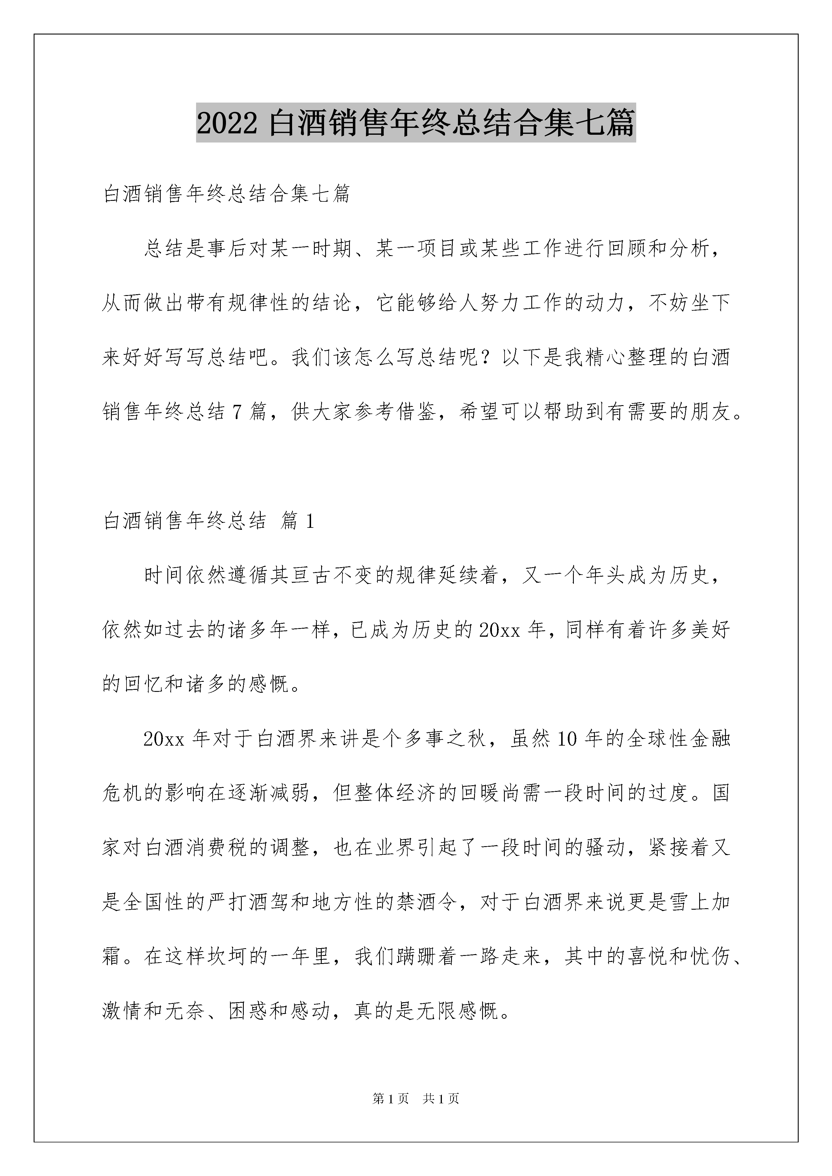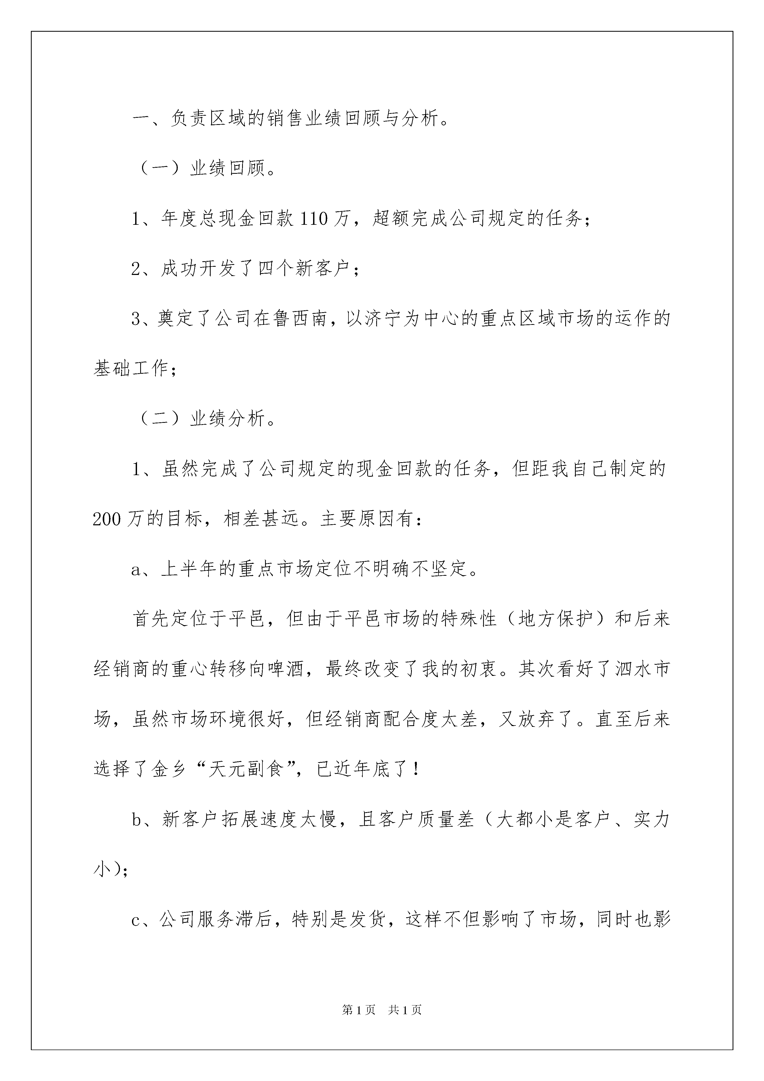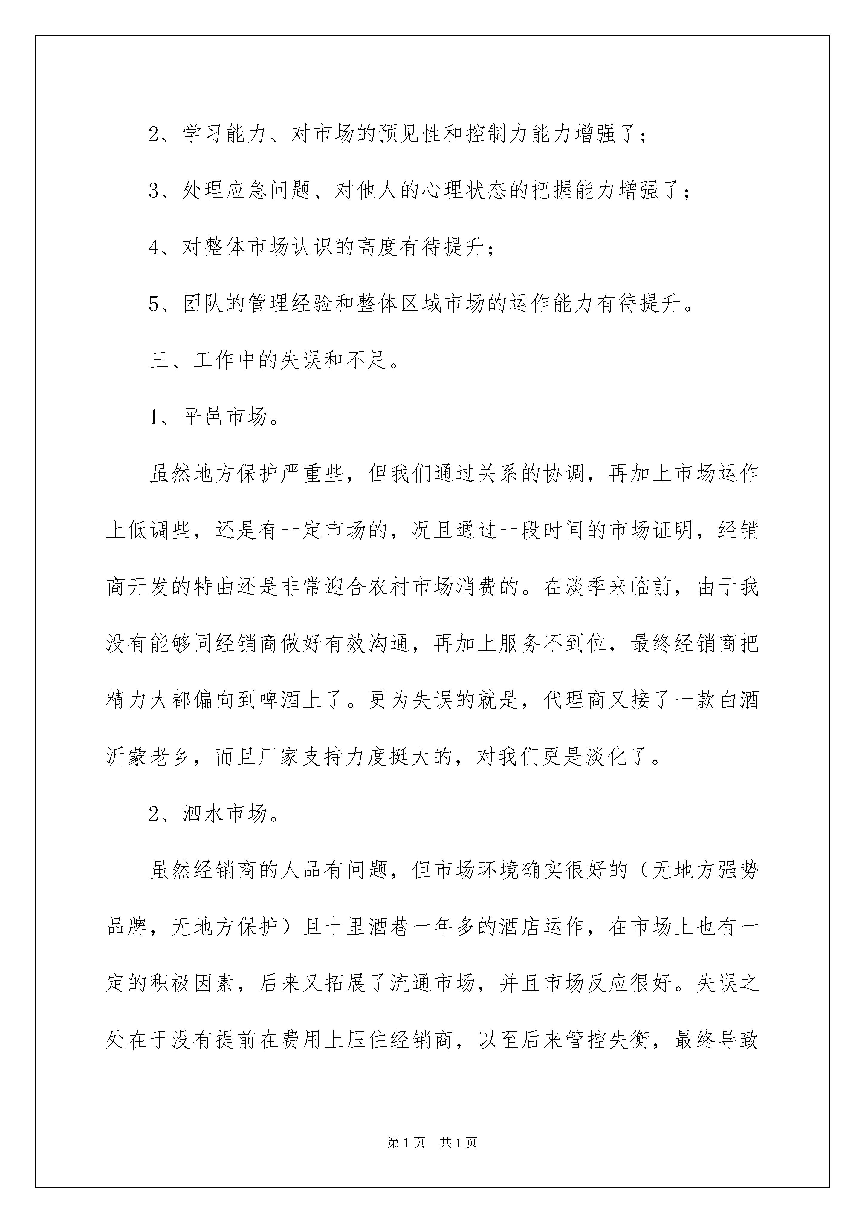 2022白酒销售年终总结合集七篇白酒销售年终总结合集七篇总结是事后对某一时期、某一项目或某些工作进行回顾和分析,从而做出带有规律性的结论,它能够给人努力工作的动力,不妨坐下来好好写写总结吧。我们该怎么写总结呢?以下是我精心整理的白酒销售年终总结7篇,供大家参考借鉴,希望可以帮助到有需要的朋友。白酒销售年终总结篇1时间依然遵循其亘古不变的规律延续着,又一个年头成为历史,依然如过去的诸多年一样,已成为历史的20xx年,同样有着许多美好的回忆和诸多的感慨。20xx年对于白酒界来讲是个多事之秋,虽然10年的全球性金融危机的影响在逐渐减弱,但整体经济的回暖尚需一段时间的过度。国家对白酒消费税的调整,也在业界引起了一段时间的骚动,紧接着又是全国性的严打酒驾和地方性的禁酒令,对于白酒界来说更是雪上加霜。在这样坎坷的一年里,我们蹒跚着一路走来,其中的喜悦和忧伤、激情和无奈、困惑和感动,真的是无限感慨。一、负责区域的销售业绩回顾与分析。(一)业绩回顾。1、年度总现金回款110万,超额完成公司规定的任务;2、成功开发了四个新客户;3、奠定了公司在鲁西南,以济宁为中心的重点区域市场的运作的基础工作;(二)业绩分析。1、虽然完成了公司规定的现金回款的任务,但距我自己制定的200万的目标,相差甚远。主要原因有:a、上半年的重点市场定位不明确不坚定。首先定位于平邑,但由于平邑市场的特殊性(地方保护)和后来经销商的重心转移向啤酒,最终改变了我的初衷。其次看好了泗水市场,虽然市场环境很好,但经销商配合度太差,又放弃了。直至后来选择了金乡“天元副食”,已近年底了!b、新客户拓展速度太慢,且客户质量差(大都小是客户、实力小);c、公司服务滞后,特别是发货,这样不但影响了市场,同时也影响了经销商的销售信心;2、新客户开放面。虽然落实了4个新客户,但离我本人制定的6个的目标还差两个,且这4个客户中有3个是小客户,销量也很一般。这主要在于我本人主观上造成的,为了回款而不太注重客户质量。俗话说“选择比努力重要”,经销商的“实力、网络、配送能力、配合度、投入意识”等,直接决定了市场运作的质量。3、我公司在山东已运作了整整三年,这三年来的失误就在于没有做到“重点抓、抓重点”,所以吸取前几年的经验教训,今年我个人也把寻找重点市场纳入了我的常规工作之中,最终于09年11月份决定以金乡为核心运作济宁市场,通过两个月的市场运作也摸索了一部分经验,为明年的运作奠定了基础。二、个人的成长和不足。在公司领导和各位同事关心和支持下,xx年我个人无论是在业务拓展、组织协调、管理等各方面都有了很大的提升,同时也存在着许多不足之处。1、心态的自我调整能力增强了;2、学习能力、对市场的预见性和控制力能力增强了;3、处理应急问题、对他人的心理状态的把握能力增强了;4、对整体市场认识的高度有待提升;5、团队的管理经验和整体区域市场的运作能力有待提升。三、工作中的失误和不足。1、平邑市场。虽然地方保护严重些,但我们通过关系的协调,再加上市场运作上低调些,还是有一定市场的,况且通过一段时间的市场证明,经销商开发的特曲还是非常迎合农村市场消费的。在淡季来临前,由于我没有能够同经销商做好有效沟通,再加上服务不到位,最终经销商把精力大都偏向到啤酒上了。更为失误的就是,代理商又接了一款白酒沂蒙老乡,而且厂家支持力度挺大的,对我们更是淡化了。2、泗水市场。虽然经销商的人品有问题,但市场环境确实很好的(无地方强势品牌,无地方保护)且十里酒巷一年多的酒店运作,在市场上也有一定的积极因素,后来又拓展了流通市场,并且市场反应很好。失误之处在于没有提前在费用上压住经销商,以至后来管控失衡,最终导致合作失败,功亏一篑。关键在于我个人的手腕不够硬,对事情的预见性不足,反映不够快。3、滕州市场。滕州的市场基础还是很好的,只是经销商投入意识和公司管理太差,以致我们人撤走后,市场严重下滑。这个市场我的失误有几点:(1)没有能够引导经销商按照我们的思路自己运作市场,对厂家过于依赖;(2)没有在适当的时候寻找合适的其他潜在优质客户作补充;4、整个xx年我走访的新客户中,有10多个意向都很强烈,且有大部分都来公司考察了。但最终落实很少,其原因在于后期跟踪不到位,自己信心也不足,浪费了大好的资源!四、xx年以前的部分。老市场的工作开展和问题处理由于以前我们对市场的把握和费用的管控不力,导致10年以前的市场都遗留有费用矛盾的问题。经同公司领导协商,以“和谐发展”为原则,采取“一地一策”的方针,针对不同市场各个解决。1、滕州:虽然公司有费用但必须再回款,以多发部分比例的货的形式解决的,双方都