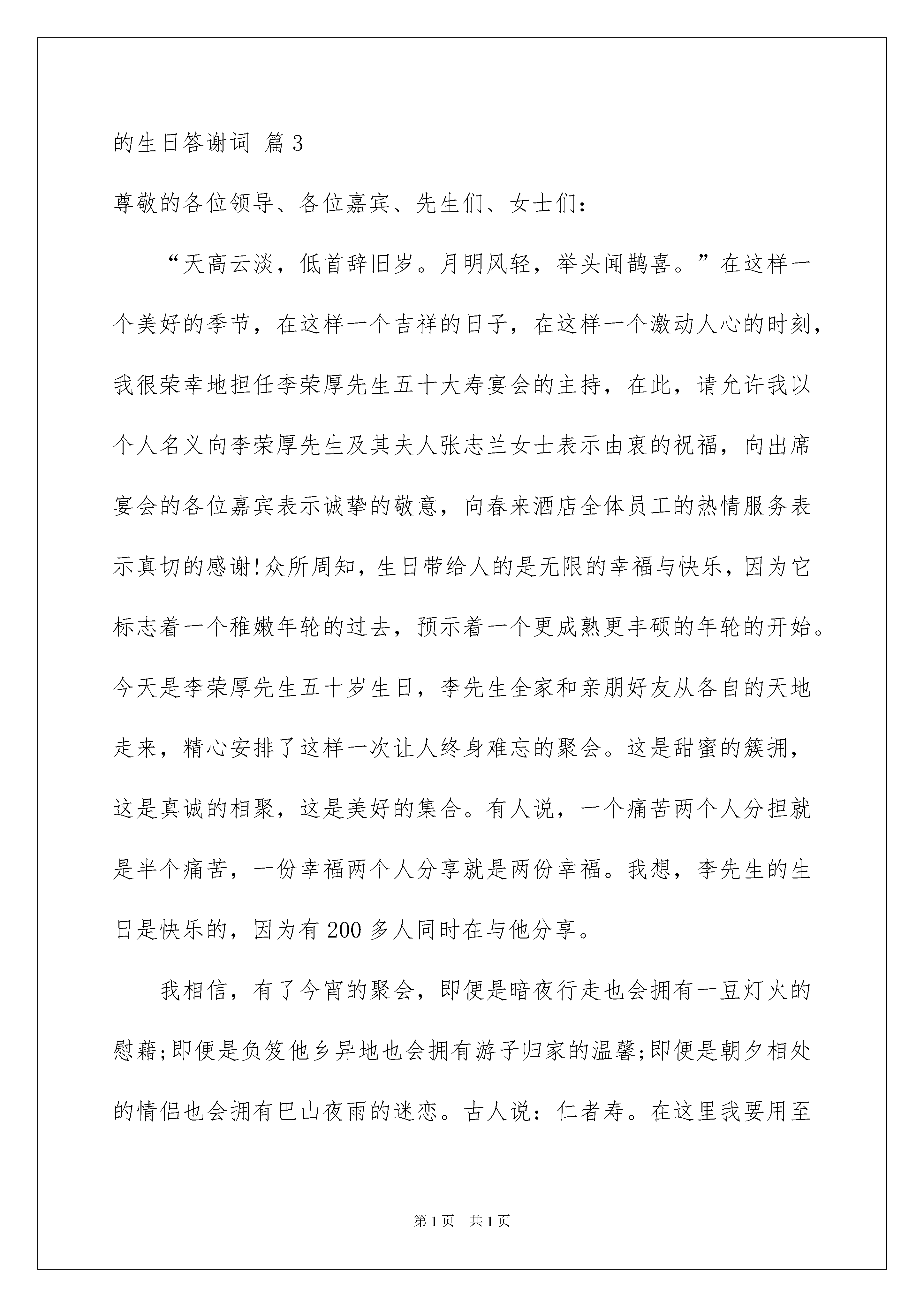 2022的生日答谢词范文集锦10篇的生日答谢词范文集锦10篇随着感恩思想的积极提倡,我们越来越经常使用答谢词,答谢词因不同的场合,写法可以不同。有些可以写得活泼些,有些则要庄重些。写答谢词可马虎不得哦,以下是我收集整理的的生日答谢词10篇,仅供参考,欢迎大家阅读。的生日答谢词篇1大家好!这是一个万物争荣的初春,也是一个风和日丽的日子,这么多的好友亲朋欢聚在这里来庆贺我父亲的九十大寿。首先我代表今天的寿星老人和我的全家对各位佳宾的光临表示热烈的欢迎和衷心的感谢。家父早年不远千里离......,也见证了世间的人生百态。九十个春秋风雨,九十载生活苍桑,无论在什么情况下老人家始终坚守淡泊名利,克己礼让,宽厚待人,勤劳俭朴的做人原则,从容而乐观地面对人生。她经常教育我们要“老老实实做人,诚诚恳恳做事”,简单的话语,严律的家训,我们始终铭刻在心。记得杜甫有句诗说:“酒债寻常行处有,人生七十古来稀”,古人称九十“花甲”、七十“古稀”、八十“耄耋”,就是示意我们岁月如流人生易老,每逢老人家大寿本就应该好好地庆贺一番。可因为家母一惯坚持低调,不张扬的原则。所以过去的几十年来我们家还从未给老人家做过寿庆,今天适逢老人家的九十华诞,承蒙这么多的好友亲朋前来庆贺。我们非常感激,也简简单单地备配了这一杯薄酒,愧对大家了!不管怎样,只要老人高兴、快乐,我们也就皆大欢喜了。如今我们家已是四世同堂,一家人也都把“老老实实做人,诚诚恳恳做事”的教诲视为我们家的家训。也正是因为;有了老人家勤劳朴实,宽宏厚道的家风,言传身……的生日答谢词篇2敬爱的爷爷奶奶、叔叔阿姨们、亲爱的小朋友们、同学们:大家中午好!非常感谢大家的光临!阳春三月、春暖花开,在这美好的日子里,我们共同迎来了我的十岁生日,我非常高兴和激动,今天我特别开心,首先我代表全家感谢大家百忙之中来参加我的生日party,为我祝贺生日,特别是那些远道而来的亲朋好友,温馨的亲情、真挚的友情都让我无比感动!此时此刻,有许多感激的话要向大家说:今天,我十岁了,在成长的这十年里,感谢我的爷爷奶奶,因为有着爷爷奶奶对我无微不至的关怀,是你们给了我无限的慈爱和宽容,使我在幸福中茁壮成长。感谢我的父母,因为有着爸爸妈妈含辛茹苦的培育,是你们给了我生命,哺育我成长、教育我做人、给了我一个温暖的家。谢谢我的同学,是你们真挚的友情,陪伴我走过了快乐的童年时光。我更要感谢在座的亲朋好友,因为有着亲朋好友的鼓励和支持,才有我快乐而美好的童年!感谢所在的来宾是你们在我成长的过程中,给予我无限关心和呵护!我十岁了!十岁,是我人生中最重要的时刻,我将告别天真无邪的童年,走向阳光灿烂的少年,请你们相信我不会辜负你们的希望,快乐成长、努力学习知识本领,我要做一个奋发向上的少年!做一个对社会有用的人。请各位长辈、小朋友和同学们一如既往的给予我关怀、帮助与鼓励!最后,再次感谢在座的所有人,感谢你们在我记忆的画屏上增添了许多美好的回忆!祝在座的爷爷奶奶身体健康!祝叔叔阿姨工作顺利!祝所有的小朋友们、同学们像我一样幸福快乐!的生日答谢词篇3尊敬的各位领导、各位嘉宾、先生们、女士们:“天高云淡,低首辞旧岁。月明风轻,举头闻鹊喜。”在这样一个美好的季节,在这样一个吉祥的日子,在这样一个激动人心的时刻,我很荣幸地担任李荣厚先生五十大寿宴会的主持,在此,请允许我以个人名义向李荣厚先生及其夫人张志兰女士表示由衷的祝福,向出席宴会的各位嘉宾表示诚挚的敬意,向春来酒店全体员工的热情服务表示真切的感谢!众所周知,生日带给人的是无限的幸福与快乐,因为它标志着一个稚嫩年轮的过去,预示着一个更成熟更丰硕的年轮的开始。今天是李荣厚先生五十岁生日,李先生全家和亲朋好友从各自的天地走来,精心安排了这样一次让人终身难忘的聚会。这是甜蜜的簇拥,这是真诚的相聚,这是美好的集合。有人说,一个痛苦两个人分担就是半个痛苦,一份幸福两个人分享就是两份幸福。我想,李先生的生日是快乐的,因为有200多人同时在与他分享。我相信,有了今宵的聚会,即便是暗夜行走也会拥有一豆灯火的慰藉;即便是负笈他乡异地也会拥有游子归家的温馨;即便是朝夕相处的情侣也会拥有巴山夜雨的迷恋。古人说:仁者寿。在这里我要用至真至诚的心祝福我们的李荣厚先生和夫人张志兰女士。同时也祝福在座的仁智之人事业有成、青春常在!的生日答谢词篇4各位长辈,各位亲朋好友,各位弟兄姊妹:承蒙大家的厚爱,在百忙之中前来参加我的四十岁生日庆典。此时此刻,我的心情异常激动,千言万语汇集成两个字:感谢!首先,我要感谢我的父母,是他们给了我的生命,是他们含辛茹苦的把我抚育成人。没有他们辛勤的付出,不可