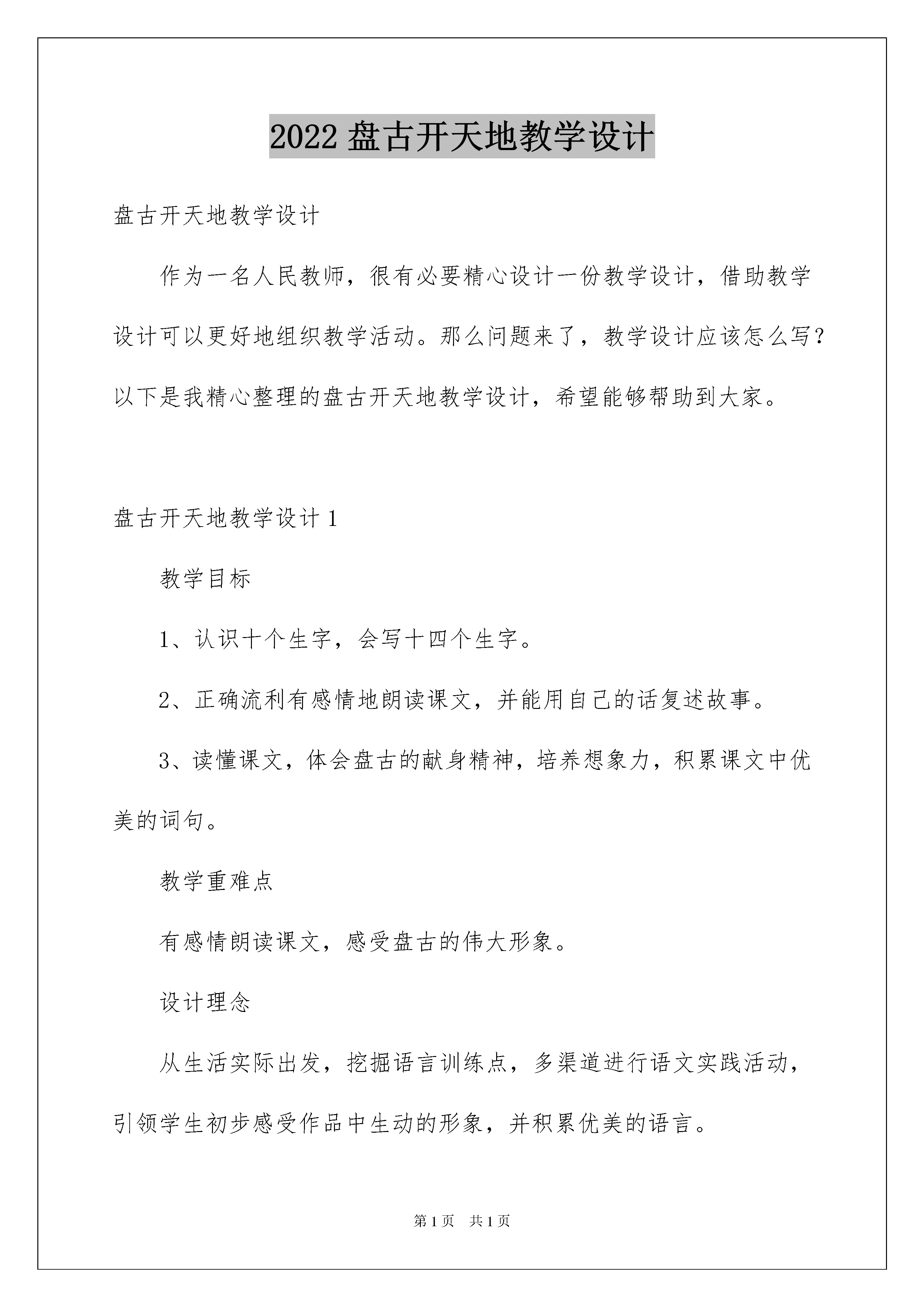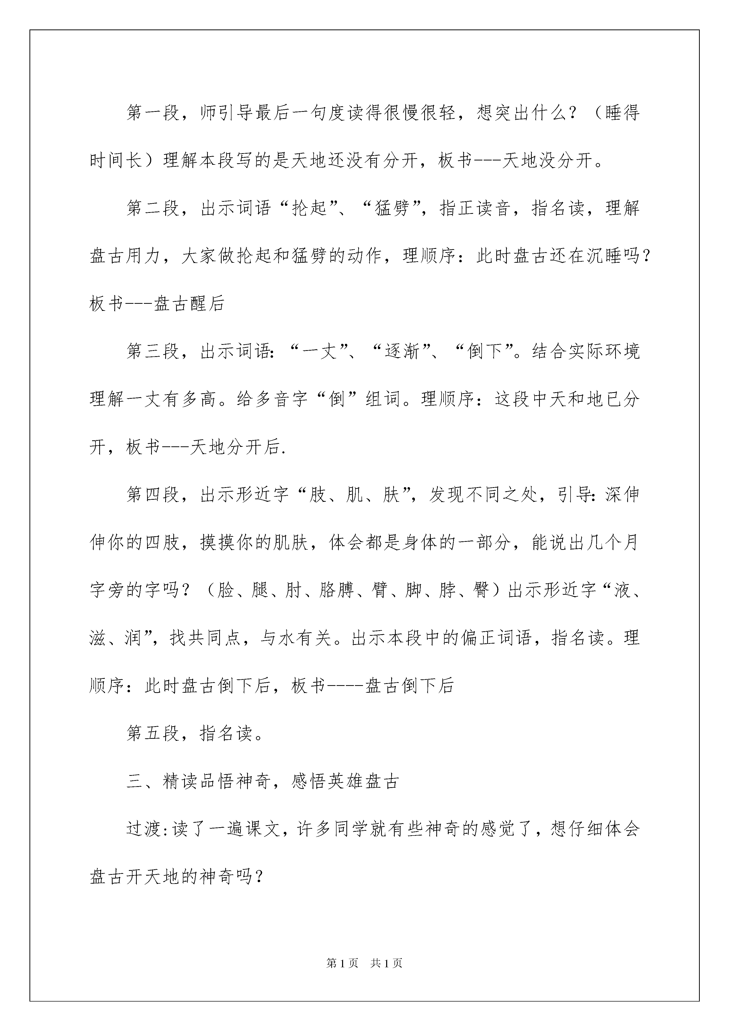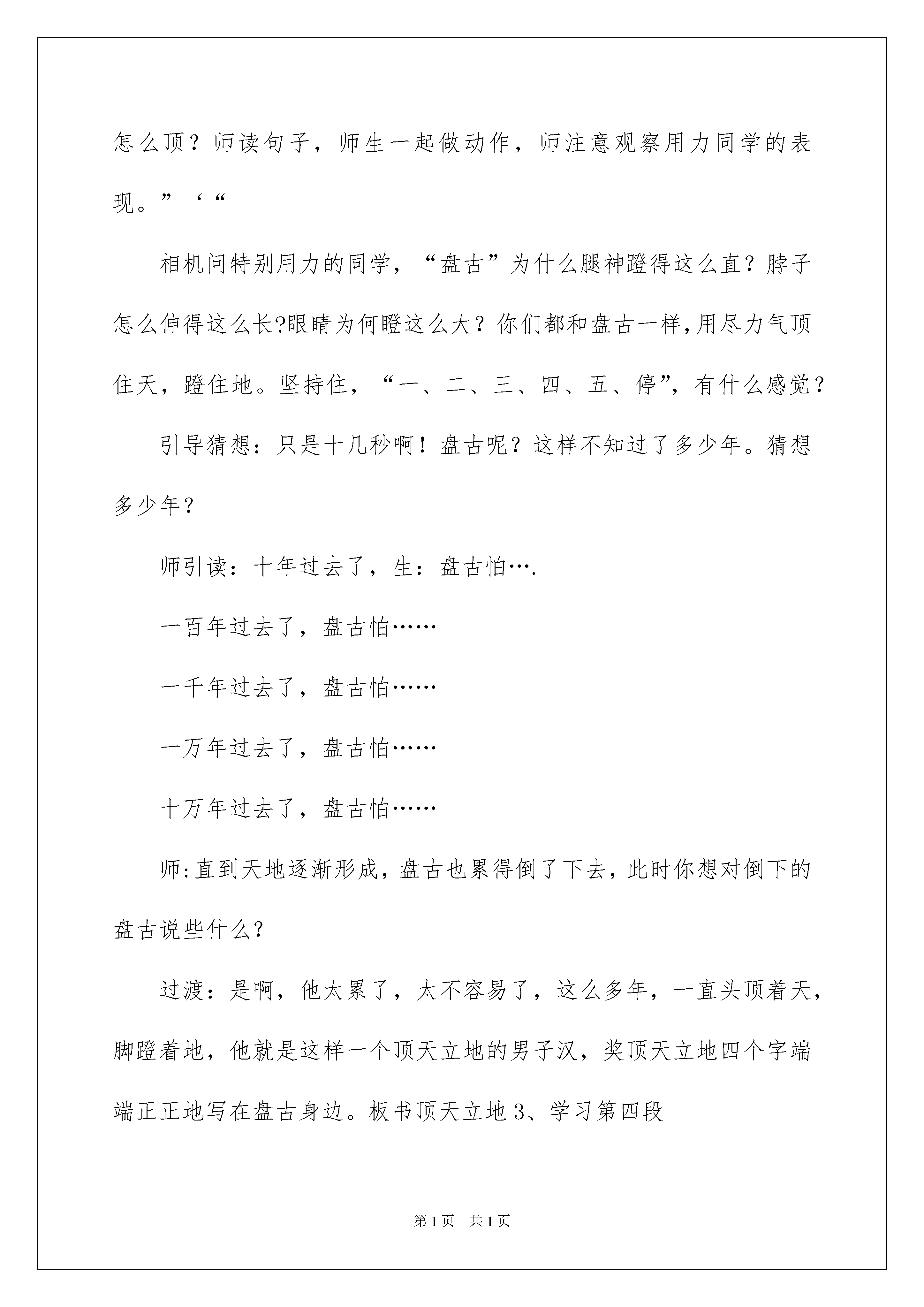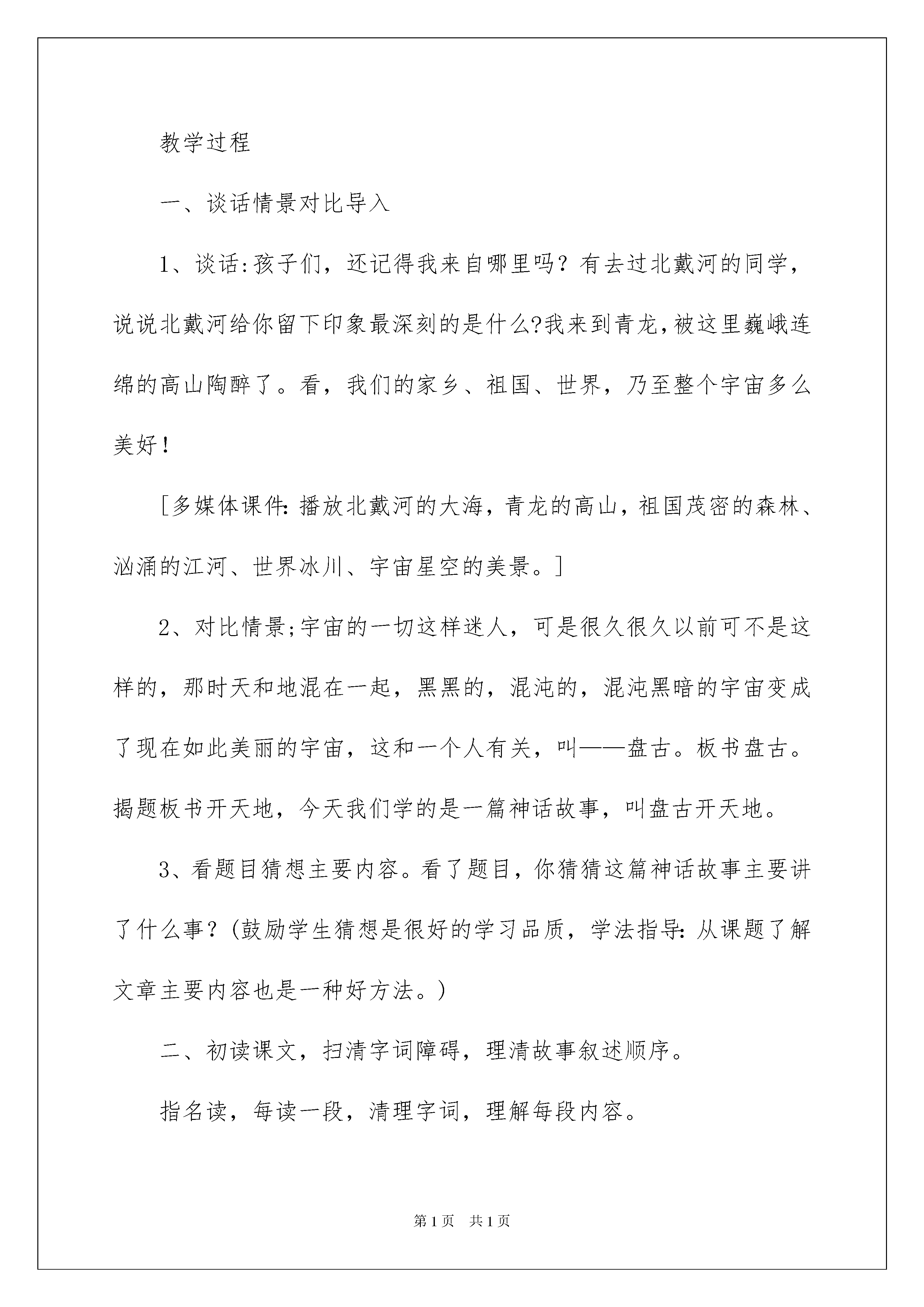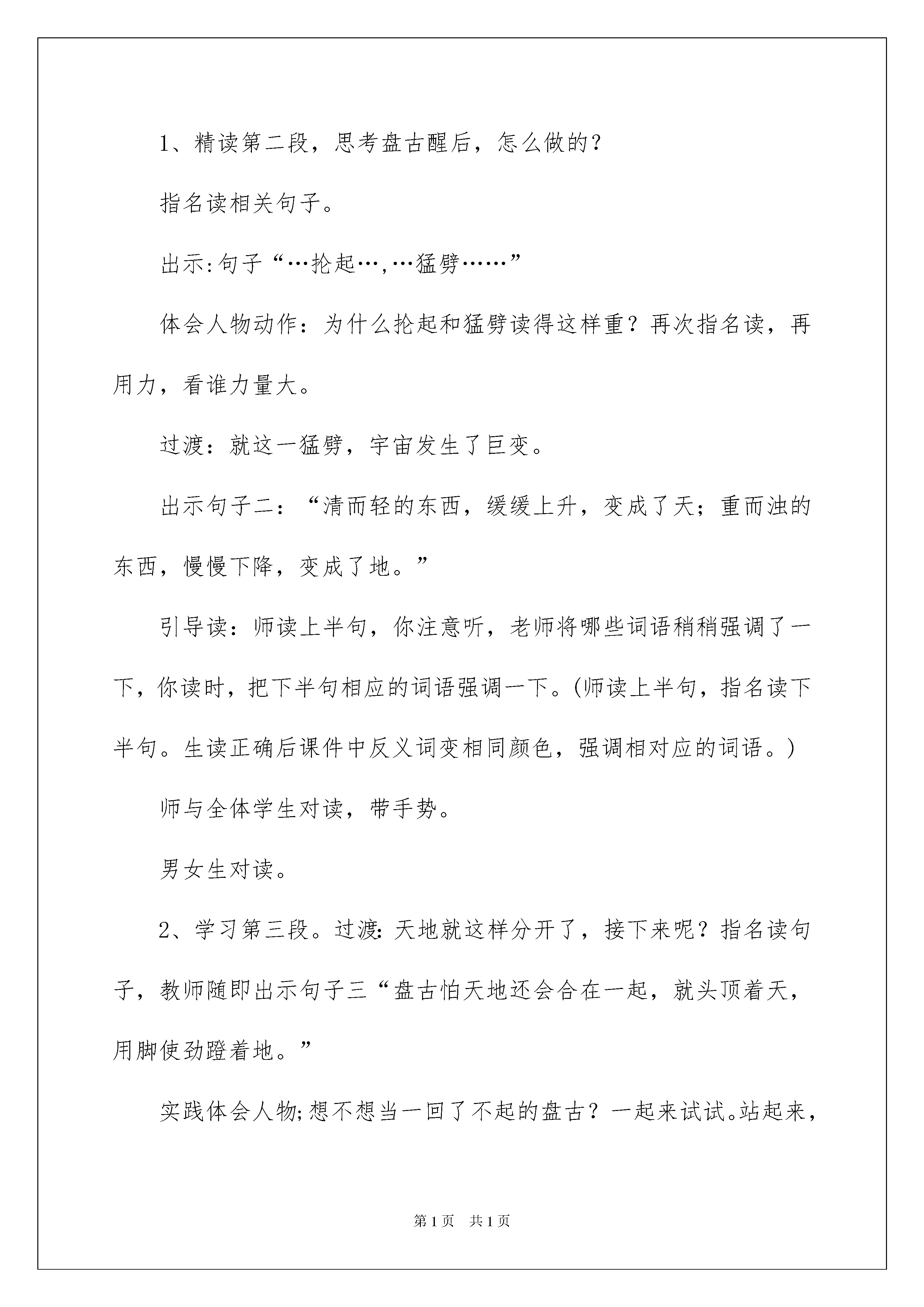 2022盘古开天地教学设计盘古开天地教学设计作为一名人民教师,很有必要精心设计一份教学设计,借助教学设计可以更好地组织教学活动。那么问题来了,教学设计应该怎么写?以下是我精心整理的盘古开天地教学设计,希望能够帮助到大家。盘古开天地教学设计1教学目标1、认识十个生字,会写十四个生字。2、正确流利有感情地朗读课文,并能用自己的话复述故事。3、读懂课文,体会盘古的献身精神,培养想象力,积累课文中优美的词句。教学重难点有感情朗读课文,感受盘古的伟大形象。设计理念从生活实际出发,挖掘语言训练点,多渠道进行语文实践活动,引领学生初步感受作品中生动的形象,并积累优美的语言。教学过程一、谈话情景对比导入1、谈话:孩子们,还记得我来自哪里吗?有去过北戴河的同学,说说北戴河给你留下印象最深刻的是什么?我来到青龙,被这里巍峨连绵的高山陶醉了。看,我们的家乡、祖国、世界,乃至整个宇宙多么美好![多媒体课件:播放北戴河的大海,青龙的高山,祖国茂密的森林、汹涌的江河、世界冰川、宇宙星空的美景。]2、对比情景;宇宙的一切这样迷人,可是很久很久以前可不是这样的,那时天和地混在一起,黑黑的,混沌的,混沌黑暗的宇宙变成了现在如此美丽的宇宙,这和一个人有关,叫——盘古。板书盘古。揭题板书开天地,今天我们学的是一篇神话故事,叫盘古开天地。3、看题目猜想主要内容。看了题目,你猜猜这篇神话故事主要讲了什么事?(鼓励学生猜想是很好的学习品质,学法指导:从课题了解文章主要内容也是一种好方法。)二、初读课文,扫清字词障碍,理清故事叙述顺序。指名读,每读一段,清理字词,理解每段内容。第一段,师引导最后一句度读得很慢很轻,想突出什么?(睡得时间长)理解本段写的是天地还没有分开,板书---天地没分开。第二段,出示词语“抡起”、“猛劈”,指正读音,指名读,理解盘古用力,大家做抡起和猛劈的动作,理顺序:此时盘古还在沉睡吗?板书---盘古醒后第三段,出示词语:“一丈”、“逐渐”、“倒下”。结合实际环境理解一丈有多高。给多音字“倒”组词。理顺序:这段中天和地已分开,板书---天地分开后.第四段,出示形近字“肢、肌、肤”,发现不同之处,引导:深伸伸你的四肢,摸摸你的肌肤,体会都是身体的一部分,能说出几个月字旁的字吗?(脸、腿、肘、胳膊、臂、脚、脖、臀)出示形近字“液、滋、润”,找共同点,与水有关。出示本段中的偏正词语,指名读。理顺序:此时盘古倒下后,板书----盘古倒下后第五段,指名读。三、精读品悟神奇,感悟英雄盘古过渡:读了一遍课文,许多同学就有些神奇的感觉了,想仔细体会盘古开天地的神奇吗?1、精读第二段,思考盘古醒后,怎么做的?指名读相关句子。出示:句子“…抡起…,…猛劈……”体会人物动作:为什么抡起和猛劈读得这样重?再次指名读,再用力,看谁力量大。过渡:就这一猛劈,宇宙发生了巨变。出示句子二:“清而轻的东西,缓缓上升,变成了天;重而浊的东西,慢慢下降,变成了地。”引导读:师读上半句,你注意听,老师将哪些词语稍稍强调了一下,你读时,把下半句相应的词语强调一下。(师读上半句,指名读下半句。生读正确后课件中反义词变相同颜色,强调相对应的词语。)师与全体学生对读,带手势。男女生对读。2、学习第三段。过渡:天地就这样分开了,接下来呢?指名读句子,教师随即出示句子三“盘古怕天地还会合在一起,就头顶着天,用脚使劲蹬着地。”实践体会人物;想不想当一回了不起的盘古?一起来试试。站起来,怎么顶?师读句子,师生一起做动作,师注意观察用力同学的表现。”‘“相机问特别用力的同学,“盘古”为什么腿神蹬得这么直?脖子怎么伸得这么长?眼睛为何瞪这么大?你们都和盘古一样,用尽力气顶住天,蹬住地。坚持住,“一、二、三、四、五、停”,有什么感觉?引导猜想:只是十几秒啊!盘古呢?这样不知过了多少年。猜想多少年?师引读:十年过去了,生:盘古怕….一百年过去了,盘古怕……一千年过去了,盘古怕……一万年过去了,盘古怕……十万年过去了,盘古怕……师:直到天地逐渐形成,盘古也累得倒了下去,此时你想对倒下的盘古说些什么?过渡:是啊,他太累了,太不容易了,这么多年,一直头顶着天,脚蹬着地,他就是这样一个顶天立地的男子汉,奖顶天立地四个字端端正正地写在盘古身边。板书顶天立地3、学习第四段读文:英雄盘古倒下去了,更神奇的事情发生了。请认认真真度第四段,一定会发现更精彩、神奇的画面,将你看到的神奇画面画下来。生自由读。指名读,把看到的巨大变化,神奇的画面读出来。集中指导背诵;(逐句出示本段的排比句)师引读:他呼出的气息,变成了四季的风和飘动的云;同步操作:师读前半句——点击“变成了”——出