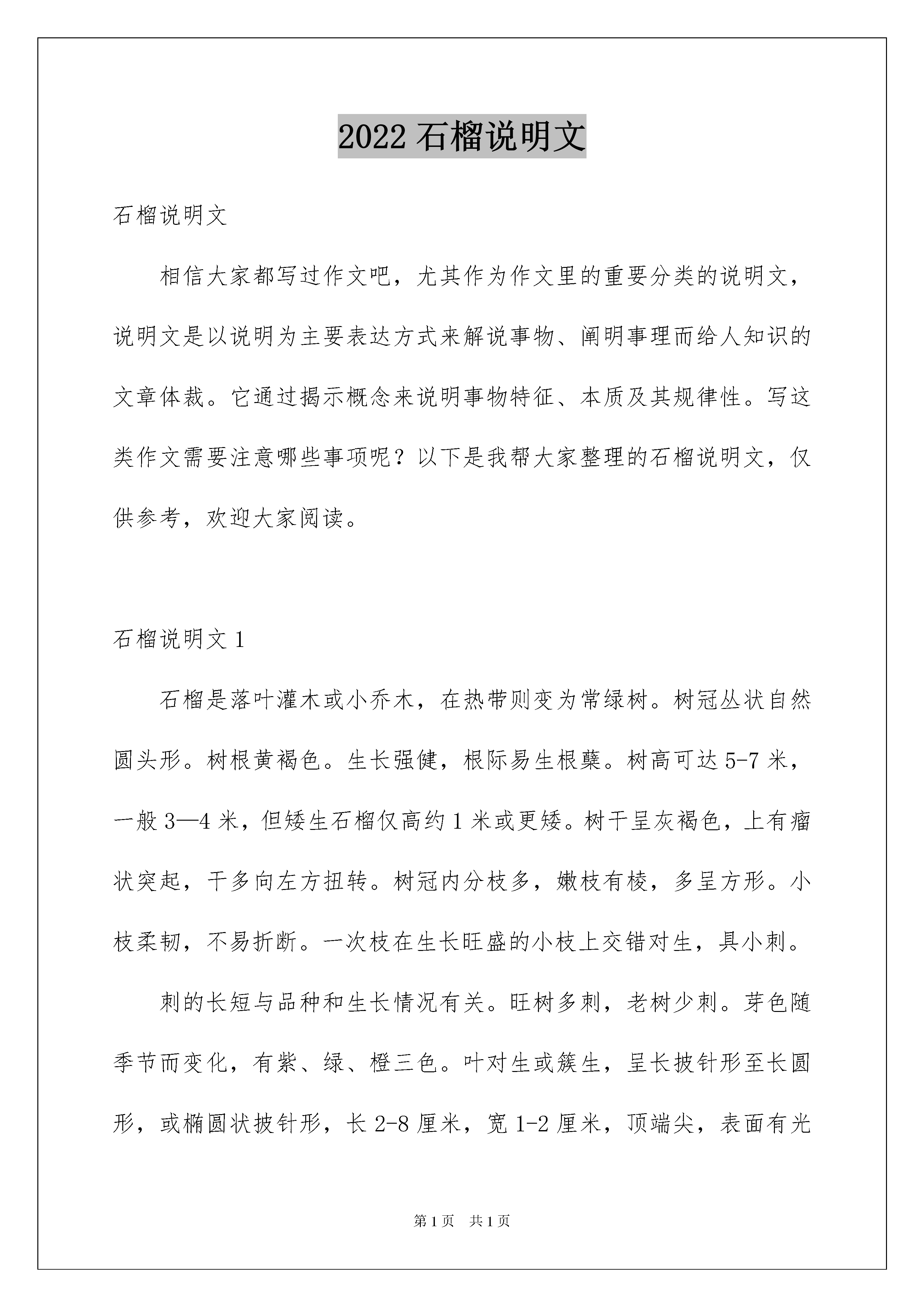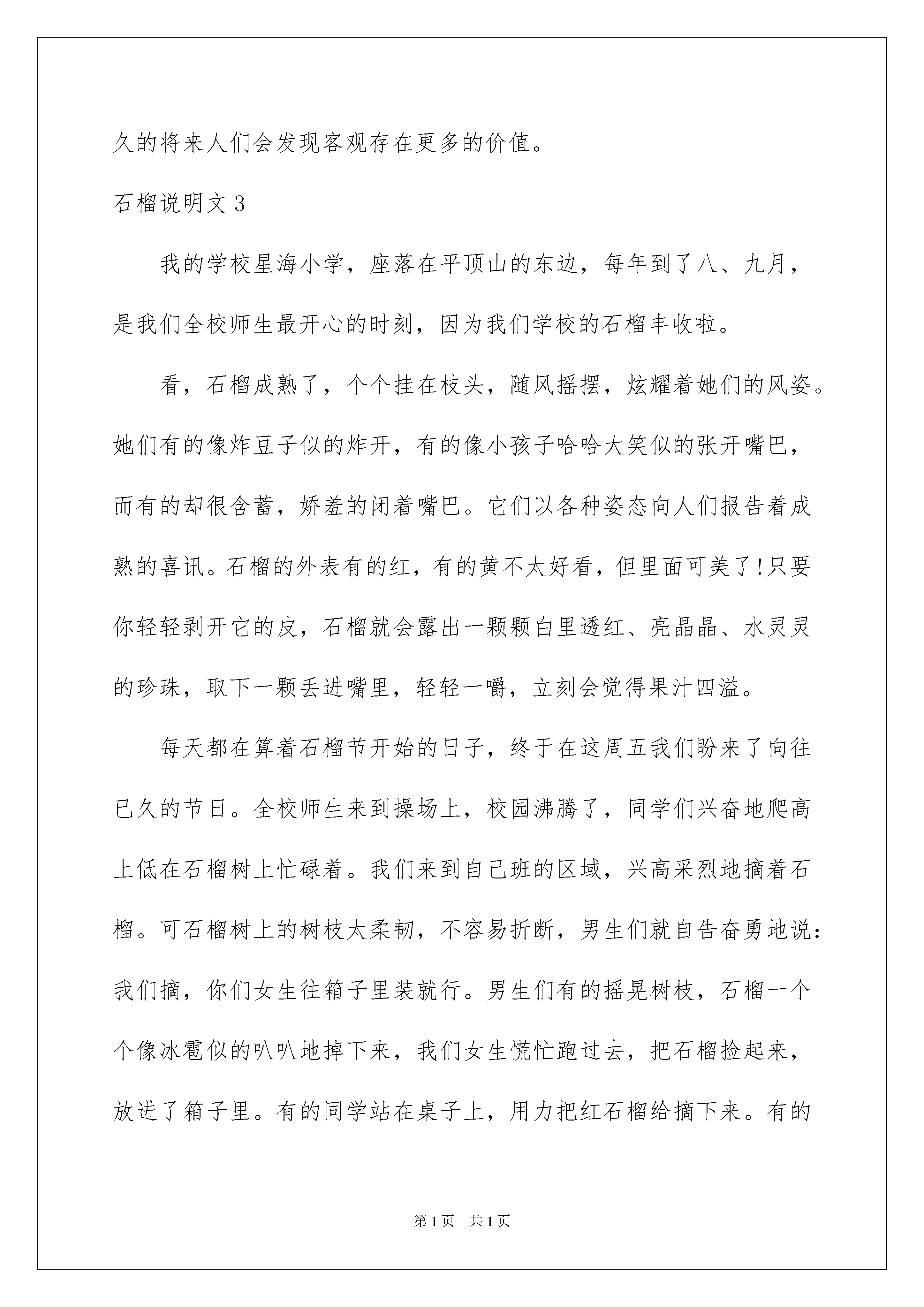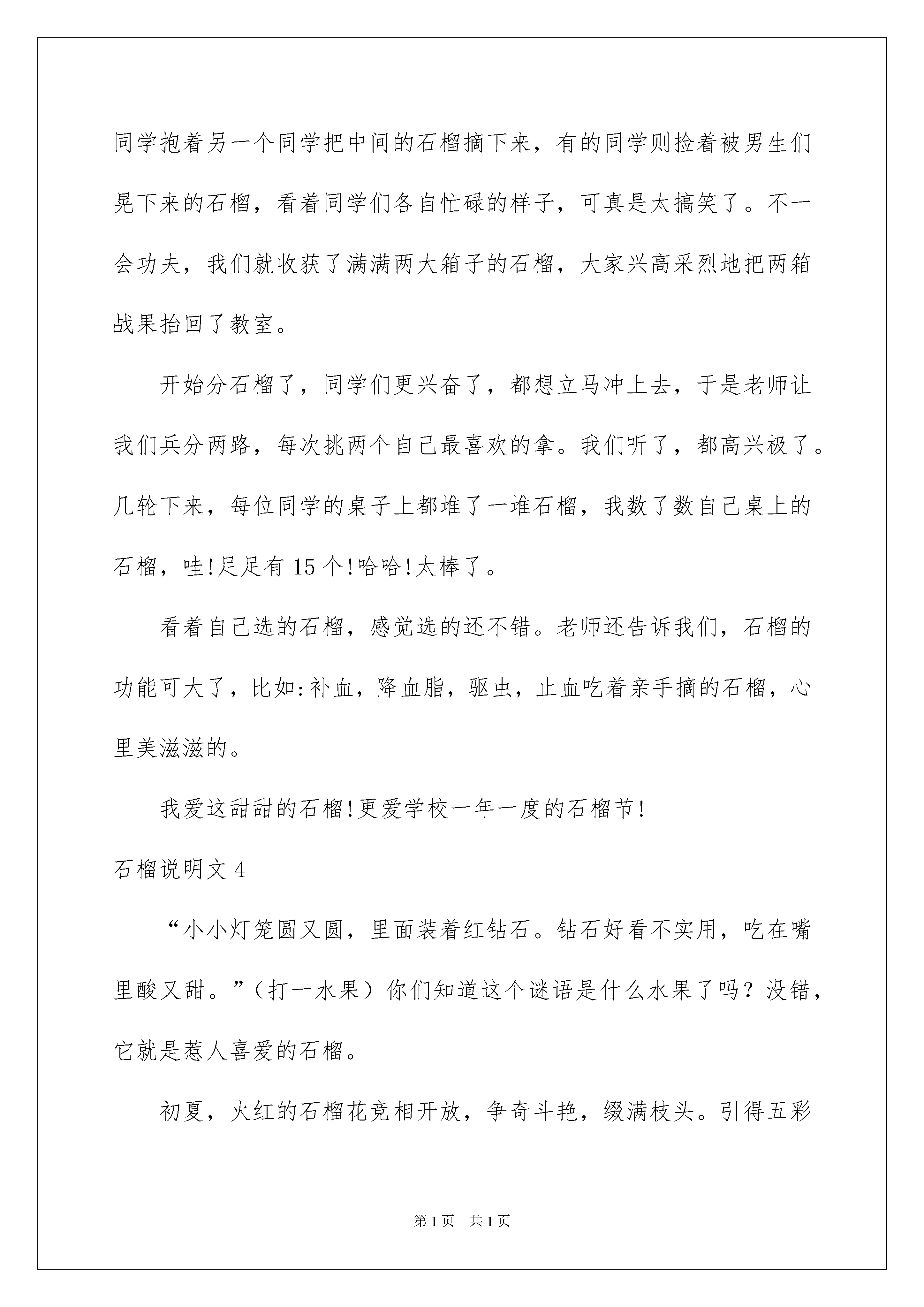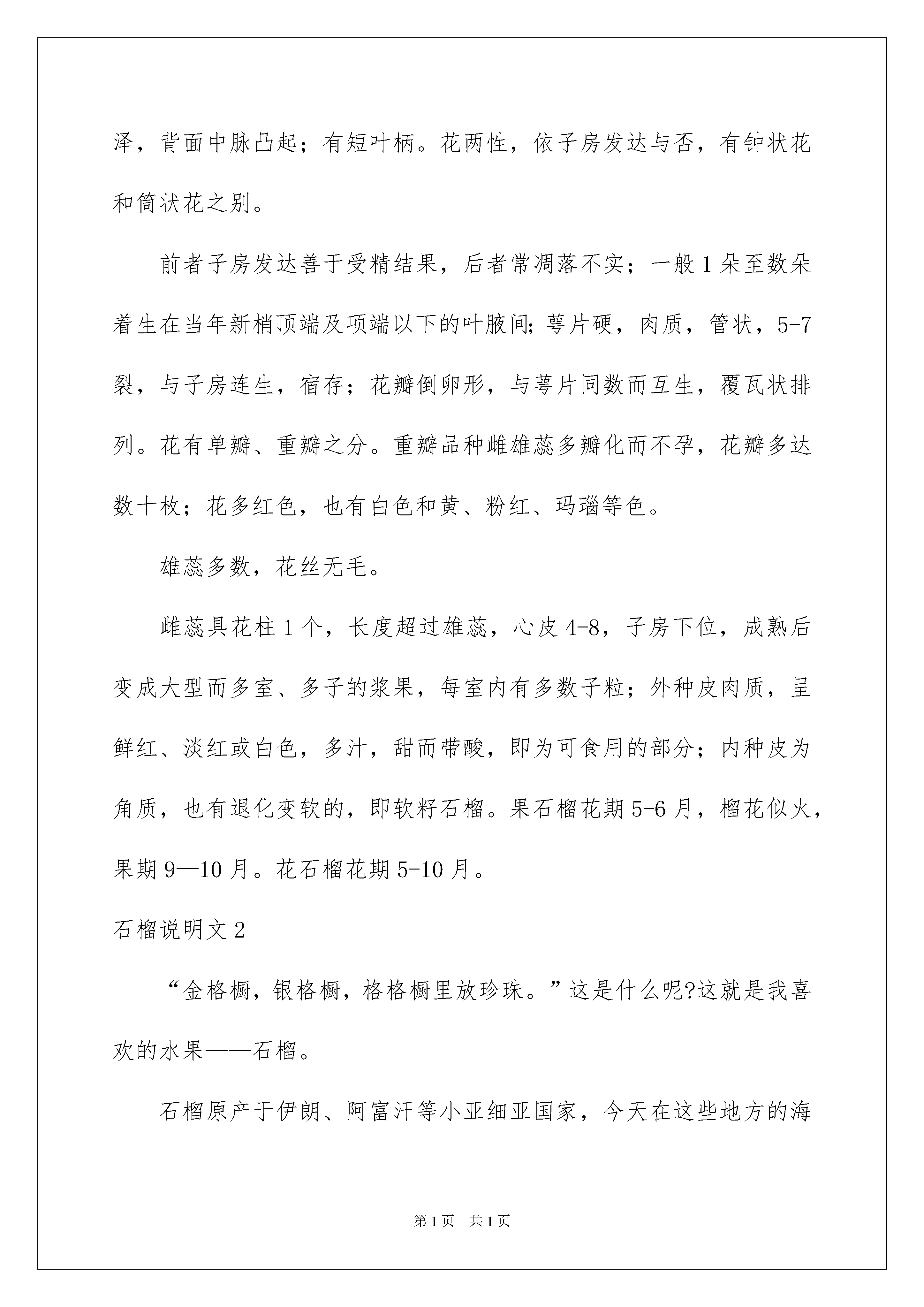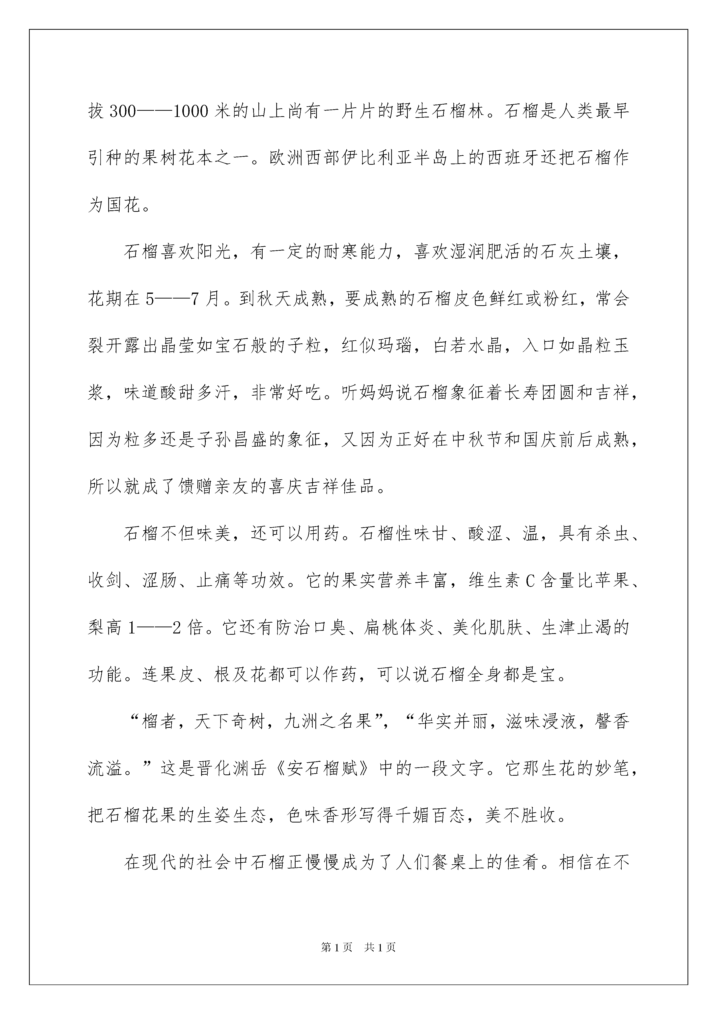 2022石榴说明文石榴说明文相信大家都写过作文吧,尤其作为作文里的重要分类的说明文,说明文是以说明为主要表达方式来解说事物、阐明事理而给人知识的文章体裁。它通过揭示概念来说明事物特征、本质及其规律性。写这类作文需要注意哪些事项呢?以下是我帮大家整理的石榴说明文,仅供参考,欢迎大家阅读。石榴说明文1石榴是落叶灌木或小乔木,在热带则变为常绿树。树冠丛状自然圆头形。树根黄褐色。生长强健,根际易生根蘖。树高可达5-7米,一般3—4米,但矮生石榴仅高约1米或更矮。树干呈灰褐色,上有瘤状突起,干多向左方扭转。树冠内分枝多,嫩枝有棱,多呈方形。小枝柔韧,不易折断。一次枝在生长旺盛的小枝上交错对生,具小刺。刺的长短与品种和生长情况有关。旺树多刺,老树少刺。芽色随季节而变化,有紫、绿、橙三色。叶对生或簇生,呈长披针形至长圆形,或椭圆状披针形,长2-8厘米,宽1-2厘米,顶端尖,表面有光泽,背面中脉凸起;有短叶柄。花两性,依子房发达与否,有钟状花和筒状花之别。前者子房发达善于受精结果,后者常凋落不实;一般1朵至数朵着生在当年新梢顶端及项端以下的叶腋间;萼片硬,肉质,管状,5-7裂,与子房连生,宿存;花瓣倒卵形,与萼片同数而互生,覆瓦状排列。花有单瓣、重瓣之分。重瓣品种雌雄蕊多瓣化而不孕,花瓣多达数十枚;花多红色,也有白色和黄、粉红、玛瑙等色。雄蕊多数,花丝无毛。雌蕊具花柱1个,长度超过雄蕊,心皮4-8,子房下位,成熟后变成大型而多室、多子的浆果,每室内有多数子粒;外种皮肉质,呈鲜红、淡红或白色,多汁,甜而带酸,即为可食用的部分;内种皮为角质,也有退化变软的,即软籽石榴。果石榴花期5-6月,榴花似火,果期9—10月。花石榴花期5-10月。石榴说明文2“金格橱,银格橱,格格橱里放珍珠。”这是什么呢?这就是我喜欢的水果——石榴。石榴原产于伊朗、阿富汗等小亚细亚国家,今天在这些地方的海拔300——1000米的山上尚有一片片的野生石榴林。石榴是人类最早引种的果树花本之一。欧洲西部伊比利亚半岛上的西班牙还把石榴作为国花。石榴喜欢阳光,有一定的耐寒能力,喜欢湿润肥活的石灰土壤,花期在5——7月。到秋天成熟,要成熟的石榴皮色鲜红或粉红,常会裂开露出晶莹如宝石般的子粒,红似玛瑙,白若水晶,入口如晶粒玉浆,味道酸甜多汗,非常好吃。听妈妈说石榴象征着长寿团圆和吉祥,因为粒多还是子孙昌盛的象征,又因为正好在中秋节和国庆前后成熟,所以就成了馈赠亲友的喜庆吉祥佳品。石榴不但味美,还可以用药。石榴性味甘、酸涩、温,具有杀虫、收剑、涩肠、止痛等功效。它的果实营养丰富,维生素C含量比苹果、梨高1——2倍。它还有防治口臭、扁桃体炎、美化肌肤、生津止渴的功能。连果皮、根及花都可以作药,可以说石榴全身都是宝。“榴者,天下奇树,九洲之名果”,“华实并丽,滋味浸液,謦香流溢。”这是晋化渊岳《安石榴赋》中的一段文字。它那生花的妙笔,把石榴花果的生姿生态,色味香形写得千媚百态,美不胜收。在现代的社会中石榴正慢慢成为了人们餐桌上的佳肴。相信在不久的将来人们会发现客观存在更多的价值。石榴说明文3我的学校星海小学,座落在平顶山的东边,每年到了八、九月,是我们全校师生最开心的时刻,因为我们学校的石榴丰收啦。看,石榴成熟了,个个挂在枝头,随风摇摆,炫耀着她们的风姿。她们有的像炸豆子似的炸开,有的像小孩子哈哈大笑似的张开嘴巴,而有的却很含蓄,娇羞的闭着嘴巴。它们以各种姿态向人们报告着成熟的喜讯。石榴的外表有的红,有的黄不太好看,但里面可美了!只要你轻轻剥开它的皮,石榴就会露出一颗颗白里透红、亮晶晶、水灵灵的珍珠,取下一颗丢进嘴里,轻轻一嚼,立刻会觉得果汁四溢。每天都在算着石榴节开始的日子,终于在这周五我们盼来了向往已久的节日。全校师生来到操场上,校园沸腾了,同学们兴奋地爬高上低在石榴树上忙碌着。我们来到自己班的区域,兴高采烈地摘着石榴。可石榴树上的树枝太柔韧,不容易折断,男生们就自告奋勇地说:我们摘,你们女生往箱子里装就行。男生们有的摇晃树枝,石榴一个个像冰雹似的叭叭地掉下来,我们女生慌忙跑过去,把石榴捡起来,放进了箱子里。有的同学站在桌子上,用力把红石榴给摘下来。有的同学抱着另一个同学把中间的石榴摘下来,有的同学则捡着被男生们晃下来的石榴,看着同学们各自忙碌的样子,可真是太搞笑了。不一会功夫,我们就收获了满满两大箱子的石榴,大家兴高采烈地把两箱战果抬回了教室。开始分石榴了,同学们更兴奋了,都想立马冲上去,于是老师让我们兵分两路,每次挑两个自己最喜欢的拿。我们听了,都高兴极了。几轮下来,每位同学的桌子上都堆了一堆石榴,我数了数自己桌上的石榴,哇!足足