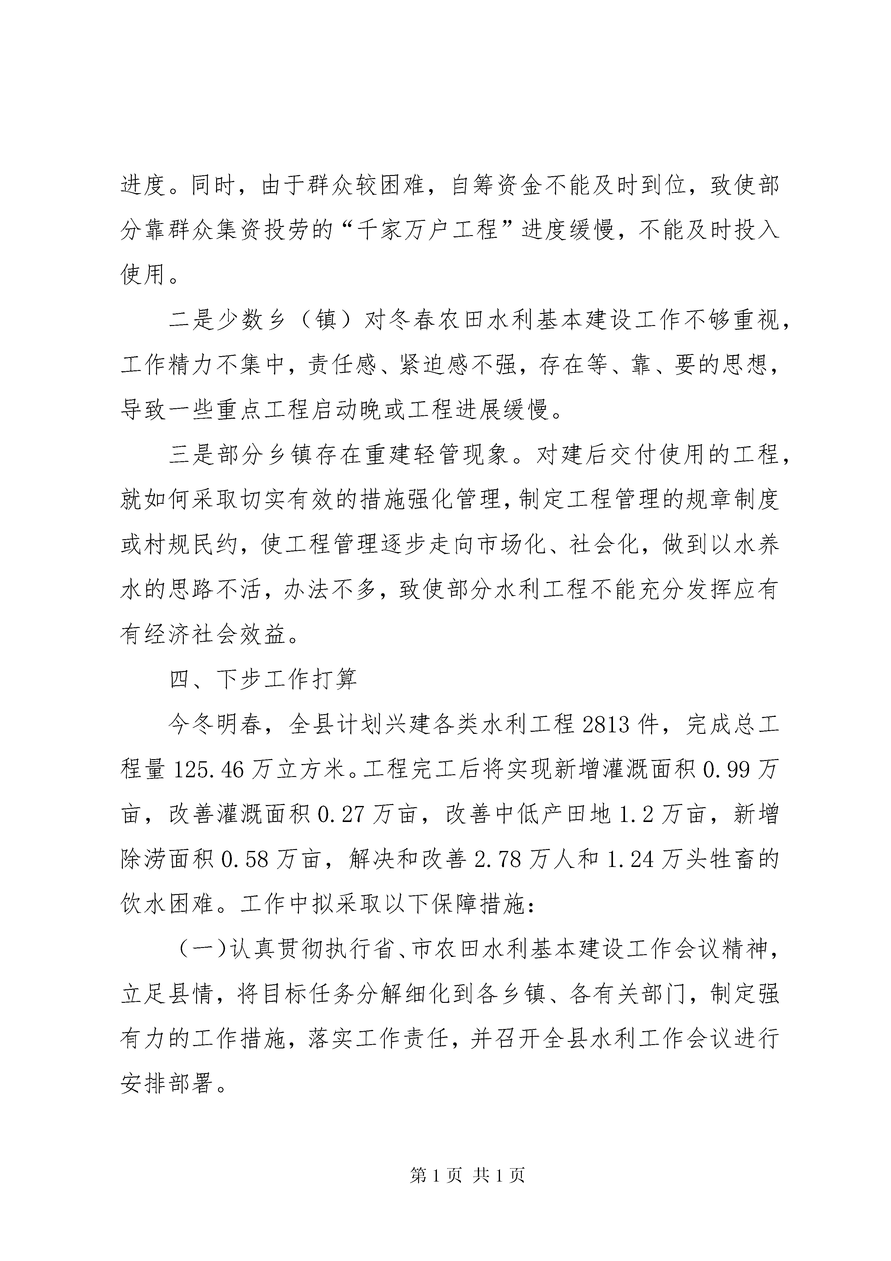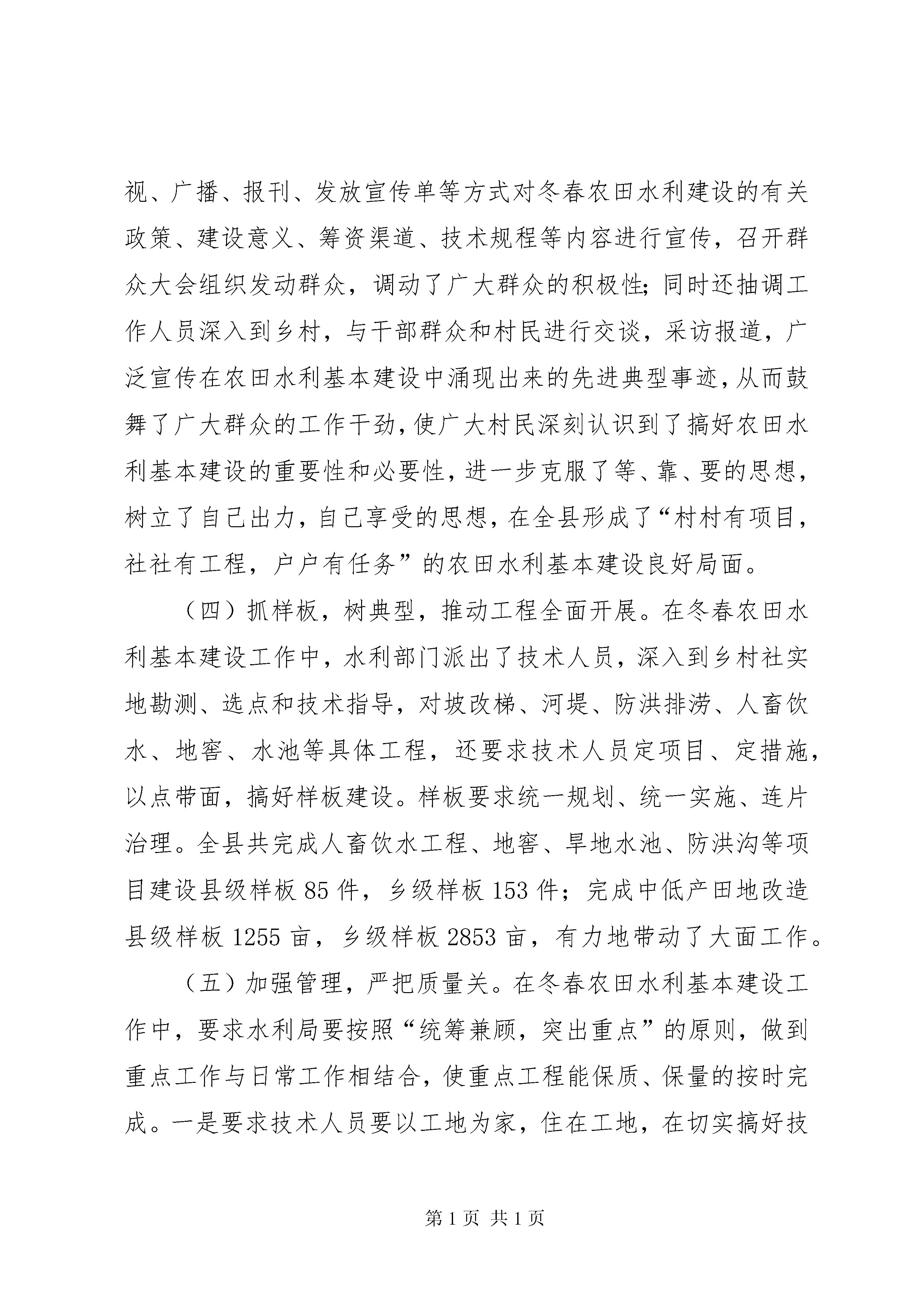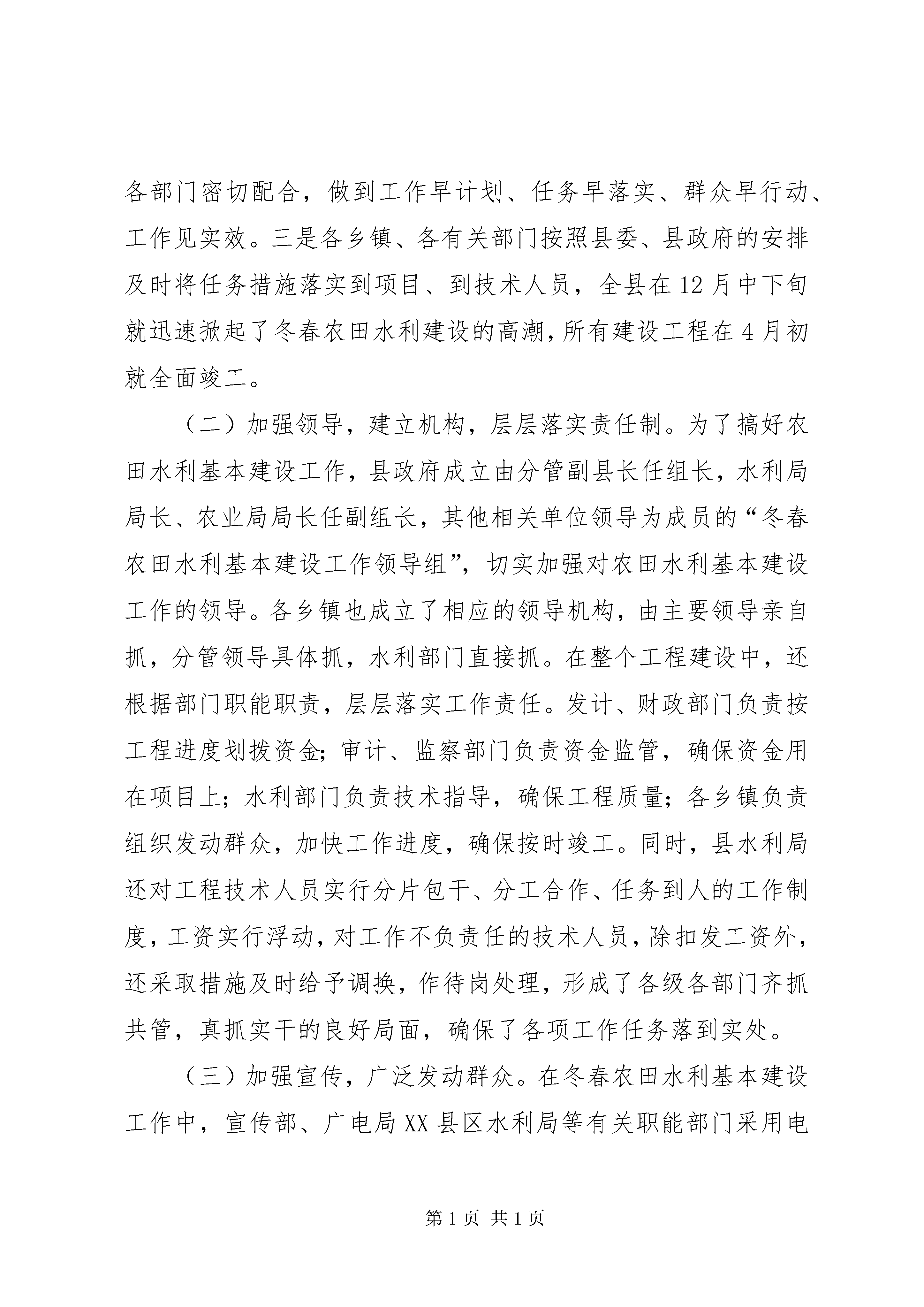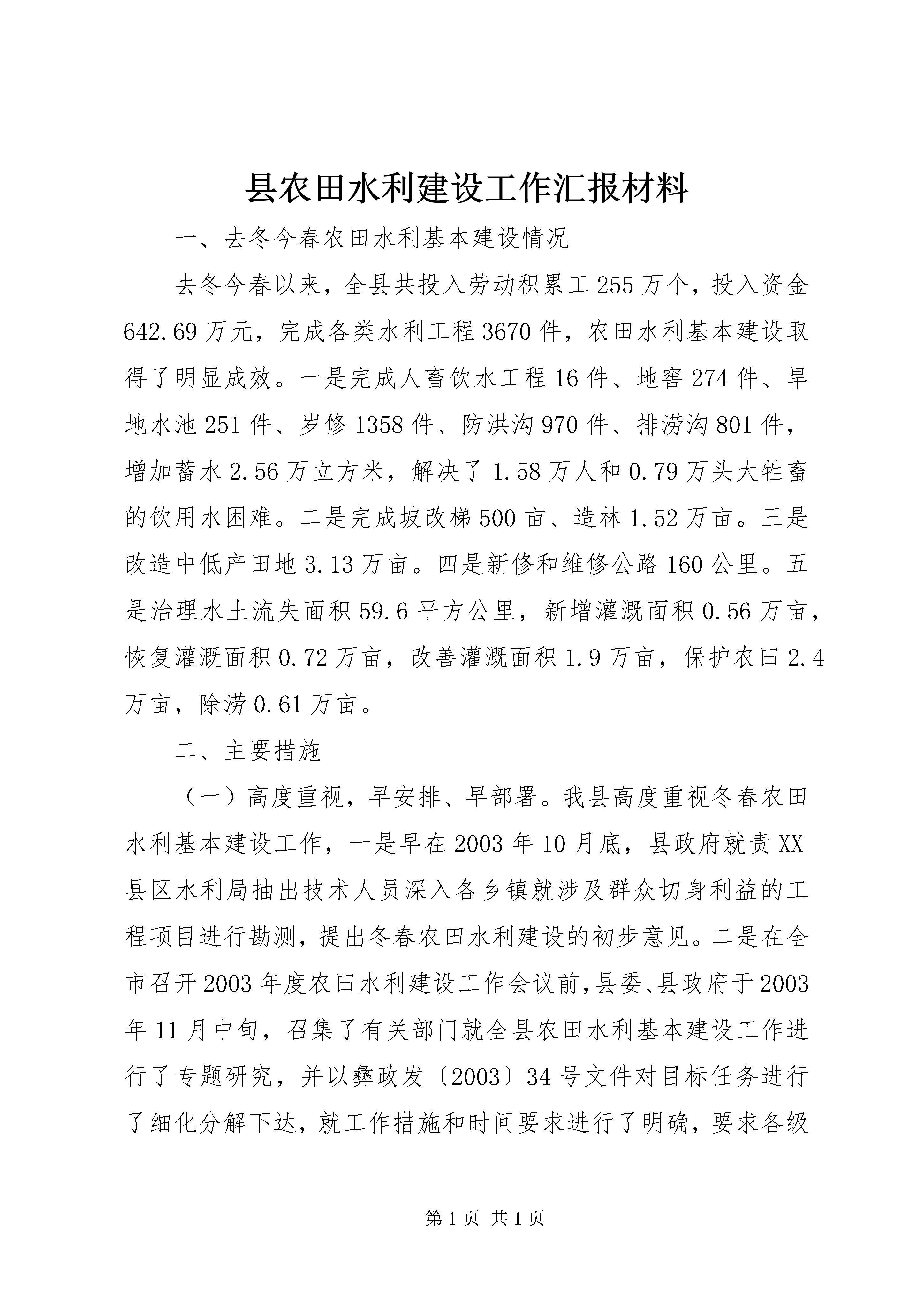 县农田水利建设工作汇报材料一、去冬今春农田水利基本建设情况去冬今春以来,全县共投入劳动积累工255万个,投入资金642.69万元,完成各类水利工程3670件,农田水利基本建设取得了明显成效。一是完成人畜饮水工程16件、地窖274件、旱地水池251件、岁修1358件、防洪沟970件、排涝沟801件,增加蓄水2.56万立方米,解决了1.58万人和0.79万头大牲畜的饮用水困难。二是完成坡改梯500亩、造林1.52万亩。三是改造中低产田地3.13万亩。四是新修和维修公路160公里。五是治理水土流失面积59.6平方公里,新增灌溉面积0.56万亩,恢复灌溉面积0.72万亩,改善灌溉面积1.9万亩,保护农田2.4万亩,除涝0.61万亩。二、主要措施(一)高度重视,早安排、早部署。我县高度重视冬春农田水利基本建设工作,一是早在2003年10月底,县政府就责XX县区水利局抽出技术人员深入各乡镇就涉及群众切身利益的工程项目进行勘测,提出冬春农田水利建设的初步意见。二是在全市召开2003年度农田水利建设工作会议前,县委、县政府于2003年11月中旬,召集了有关部门就全县农田水利基本建设工作进行了专题研究,并以彝政发〔2003〕34号文件对目标任务进行了细化分解下达,就工作措施和时间要求进行了明确,要求各级各部门密切配合,做到工作早计划、任务早落实、群众早行动、工作见实效。三是各乡镇、各有关部门按照县委、县政府的安排及时将任务措施落实到项目、到技术人员,全县在12月中下旬就迅速掀起了冬春农田水利建设的高潮,所有建设工程在4月初就全面竣工。(二)加强领导,建立机构,层层落实责任制。为了搞好农田水利基本建设工作,县政府成立由分管副县长任组长,水利局局长、农业局局长任副组长,其他相关单位领导为成员的“冬春农田水利基本建设工作领导组”,切实加强对农田水利基本建设工作的领导。各乡镇也成立了相应的领导机构,由主要领导亲自抓,分管领导具体抓,水利部门直接抓。在整个工程建设中,还根据部门职能职责,层层落实工作责任。发计、财政部门负责按工程进度划拨资金;审计、监察部门负责资金监管,确保资金用在项目上;水利部门负责技术指导,确保工程质量;各乡镇负责组织发动群众,加快工作进度,确保按时竣工。同时,县水利局还对工程技术人员实行分片包干、分工合作、任务到人的工作制度,工资实行浮动,对工作不负责任的技术人员,除扣发工资外,还采取措施及时给予调换,作待岗处理,形成了各级各部门齐抓共管,真抓实干的良好局面,确保了各项工作任务落到实处。(三)加强宣传,广泛发动群众。在冬春农田水利基本建设工作中,宣传部、广电局XX县区水利局等有关职能部门采用电视、广播、报刊、发放宣传单等方式对冬春农田水利建设的有关政策、建设意义、筹资渠道、技术规程等内容进行宣传,召开群众大会组织发动群众,调动了广大群众的积极性;同时还抽调工作人员深入到乡村,与干部群众和村民进行交谈,采访报道,广泛宣传在农田水利基本建设中涌现出来的先进典型事迹,从而鼓舞了广大群众的工作干劲,使广大村民深刻认识到了搞好农田水利基本建设的重要性和必要性,进一步克服了等、靠、要的思想,树立了自己出力,自己享受的思想,在全县形成了“村村有项目,社社有工程,户户有任务”的农田水利基本建设良好局面。(四)抓样板,树典型,推动工程全面开展。在冬春农田水利基本建设工作中,水利部门派出了技术人员,深入到乡村社实地勘测、选点和技术指导,对坡改梯、河堤、防洪排涝、人畜饮水、地窖、水池等具体工程,还要求技术人员定项目、定措施,以点带面,搞好样板建设。样板要求统一规划、统一实施、连片治理。全县共完成人畜饮水工程、地窖、旱地水池、防洪沟等项目建设县级样板85件,乡级样板153件;完成中低产田地改造县级样板1255亩,乡级样板2853亩,有力地带动了大面工作。(五)加强管理,严把质量关。在冬春农田水利基本建设工作中,要求水利局要按照“统筹兼顾,突出重点”的原则,做到重点工作与日常工作相结合,使重点工程能保质、保量的按时完成。一是要求技术人员要以工地为家,住在工地,在切实搞好技术指导的同时,还要严格按工程设计要求施工,不得徇私舞弊,确保工程质量。二是与工程建设人员签订《工作任务目标责任书》,进一步明确责任。三是加强督促检查。县工程检查组定期和不定期深入工地检查工程质量和工程进度,及时发现和处理施工中出现的各种问题,确保工程安全生产和施工质量、进度,真正做到水利工程建成一件,投入一件,见效一件。(六)创新投入机制,多渠道增加投入。在冬春农田水利基本建设工作中,我县按照“渠道不变、管理不乱、统筹兼顾、各记其功”的原则,多渠道、多层次筹措资金。一是切实做好项目储备上报,积极争取上级投入。全县共争取到上级投入资金313.89万元,其中:中央投入1