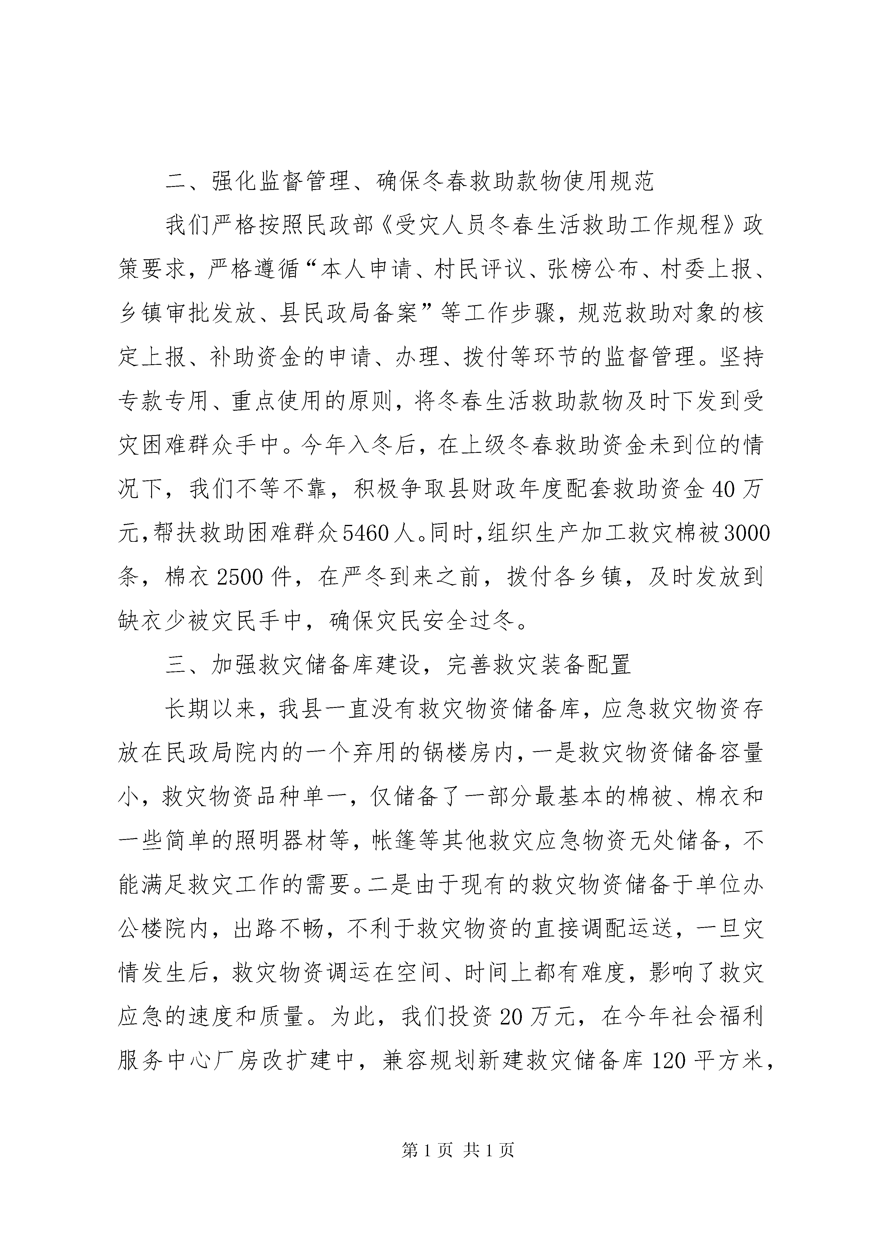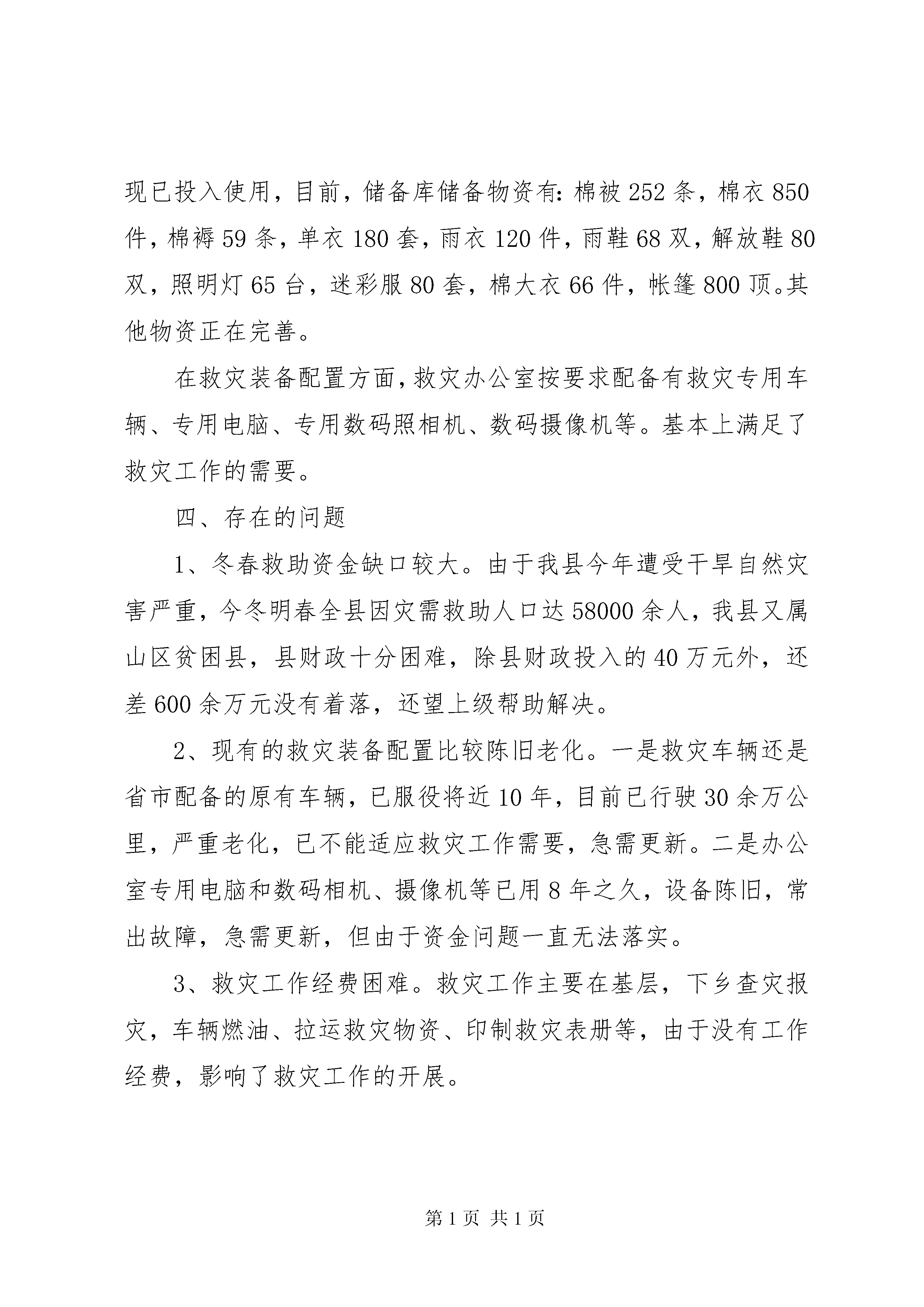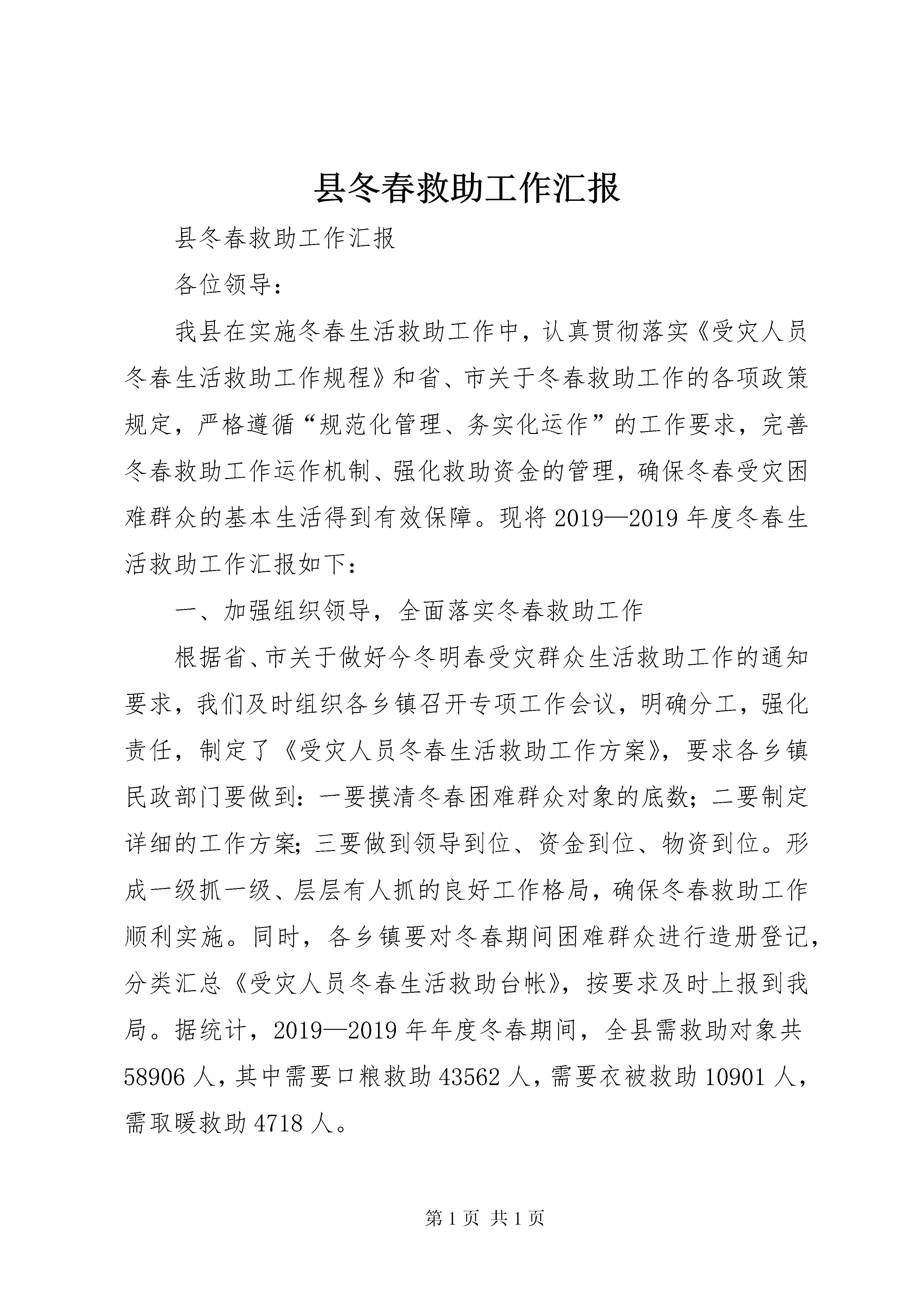 县冬春救助工作汇报县冬春救助工作汇报各位领导:我县在实施冬春生活救助工作中,认真贯彻落实《受灾人员冬春生活救助工作规程》和省、市关于冬春救助工作的各项政策规定,严格遵循“规范化管理、务实化运作”的工作要求,完善冬春救助工作运作机制、强化救助资金的管理,确保冬春受灾困难群众的基本生活得到有效保障。现将2019—2019年度冬春生活救助工作汇报如下:一、加强组织领导,全面落实冬春救助工作根据省、市关于做好今冬明春受灾群众生活救助工作的通知要求,我们及时组织各乡镇召开专项工作会议,明确分工,强化责任,制定了《受灾人员冬春生活救助工作方案》,要求各乡镇民政部门要做到:一要摸清冬春困难群众对象的底数;二要制定详细的工作方案;三要做到领导到位、资金到位、物资到位。形成一级抓一级、层层有人抓的良好工作格局,确保冬春救助工作顺利实施。同时,各乡镇要对冬春期间困难群众进行造册登记,分类汇总《受灾人员冬春生活救助台帐》,按要求及时上报到我局。据统计,2019—2019年年度冬春期间,全县需救助对象共58906人,其中需要口粮救助43562人,需要衣被救助10901人,需取暖救助4718人。二、强化监督管理、确保冬春救助款物使用规范我们严格按照民政部《受灾人员冬春生活救助工作规程》政策要求,严格遵循“本人申请、村民评议、张榜公布、村委上报、乡镇审批发放、县民政局备案”等工作步骤,规范救助对象的核定上报、补助资金的申请、办理、拨付等环节的监督管理。坚持专款专用、重点使用的原则,将冬春生活救助款物及时下发到受灾困难群众手中。今年入冬后,在上级冬春救助资金未到位的情况下,我们不等不靠,积极争取县财政年度配套救助资金40万元,帮扶救助困难群众5460人。同时,组织生产加工救灾棉被3000条,棉衣2500件,在严冬到来之前,拨付各乡镇,及时发放到缺衣少被灾民手中,确保灾民安全过冬。三、加强救灾储备库建设,完善救灾装备配置长期以来,我县一直没有救灾物资储备库,应急救灾物资存放在民政局院内的一个弃用的锅楼房内,一是救灾物资储备容量小,救灾物资品种单一,仅储备了一部分最基本的棉被、棉衣和一些简单的照明器材等,帐篷等其他救灾应急物资无处储备,不能满足救灾工作的需要。二是由于现有的救灾物资储备于单位办公楼院内,出路不畅,不利于救灾物资的直接调配运送,一旦灾情发生后,救灾物资调运在空间、时间上都有难度,影响了救灾应急的速度和质量。为此,我们投资20万元,在今年社会福利服务中心厂房改扩建中,兼容规划新建救灾储备库120平方米,现已投入使用,目前,储备库储备物资有:棉被252条,棉衣850件,棉褥59条,单衣180套,雨衣120件,雨鞋68双,解放鞋80双,照明灯65台,迷彩服80套,棉大衣66件,帐篷800顶。其他物资正在完善。在救灾装备配置方面,救灾办公室按要求配备有救灾专用车辆、专用电脑、专用数码照相机、数码摄像机等。基本上满足了救灾工作的需要。四、存在的问题1、冬春救助资金缺口较大。由于我县今年遭受干旱自然灾害严重,今冬明春全县因灾需救助人口达58000余人,我县又属山区贫困县,县财政十分困难,除县财政投入的40万元外,还差600余万元没有着落,还望上级帮助解决。2、现有的救灾装备配置比较陈旧老化。一是救灾车辆还是省市配备的原有车辆,已服役将近10年,目前已行驶30余万公里,严重老化,已不能适应救灾工作需要,急需更新。二是办公室专用电脑和数码相机、摄像机等已用8年之久,设备陈旧,常出故障,急需更新,但由于资金问题一直无法落实。3、救灾工作经费困难。救灾工作主要在基层,下乡查灾报灾,车辆燃油、拉运救灾物资、印制救灾表册等,由于没有工作经费,影响了救灾工作的开展。