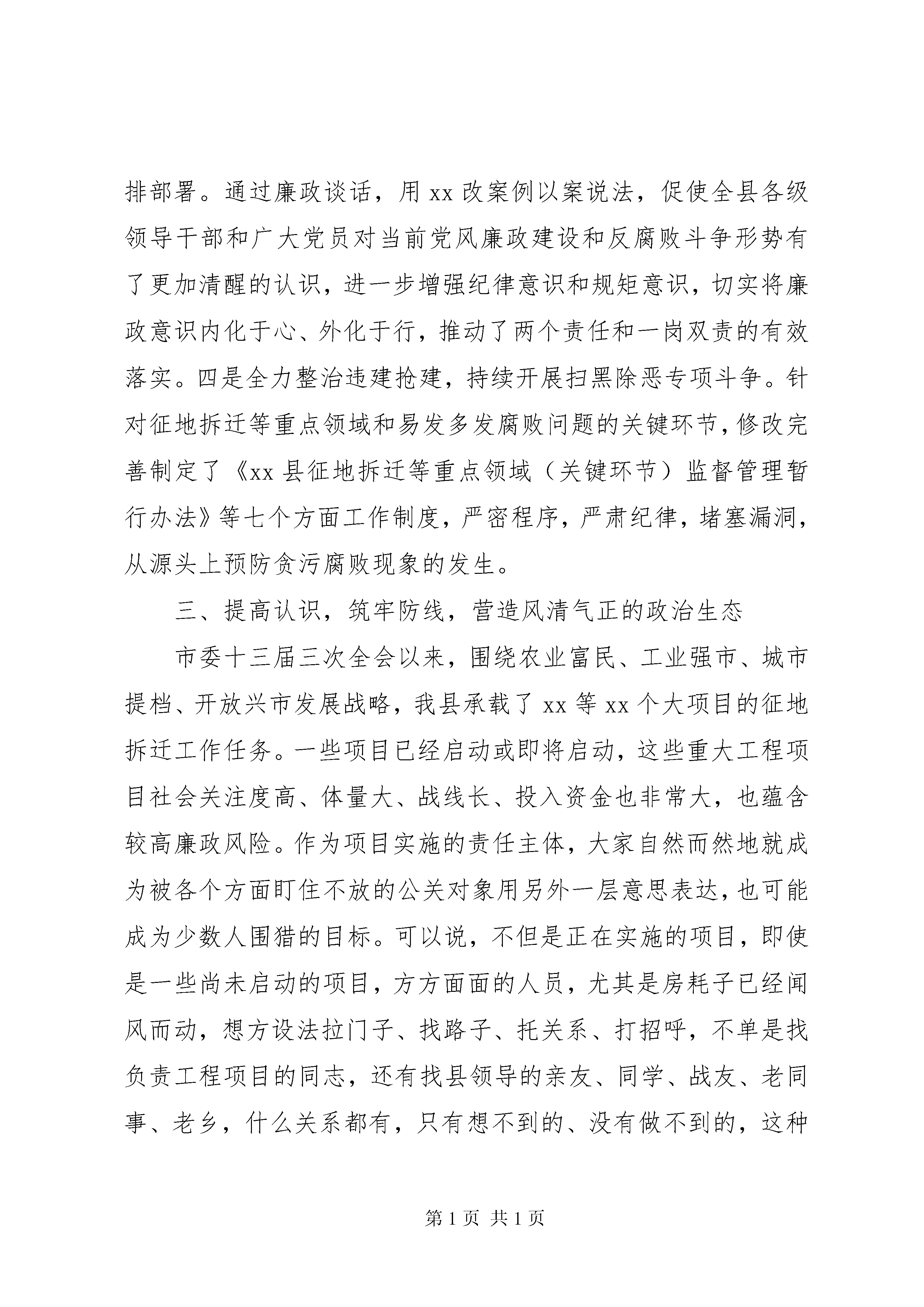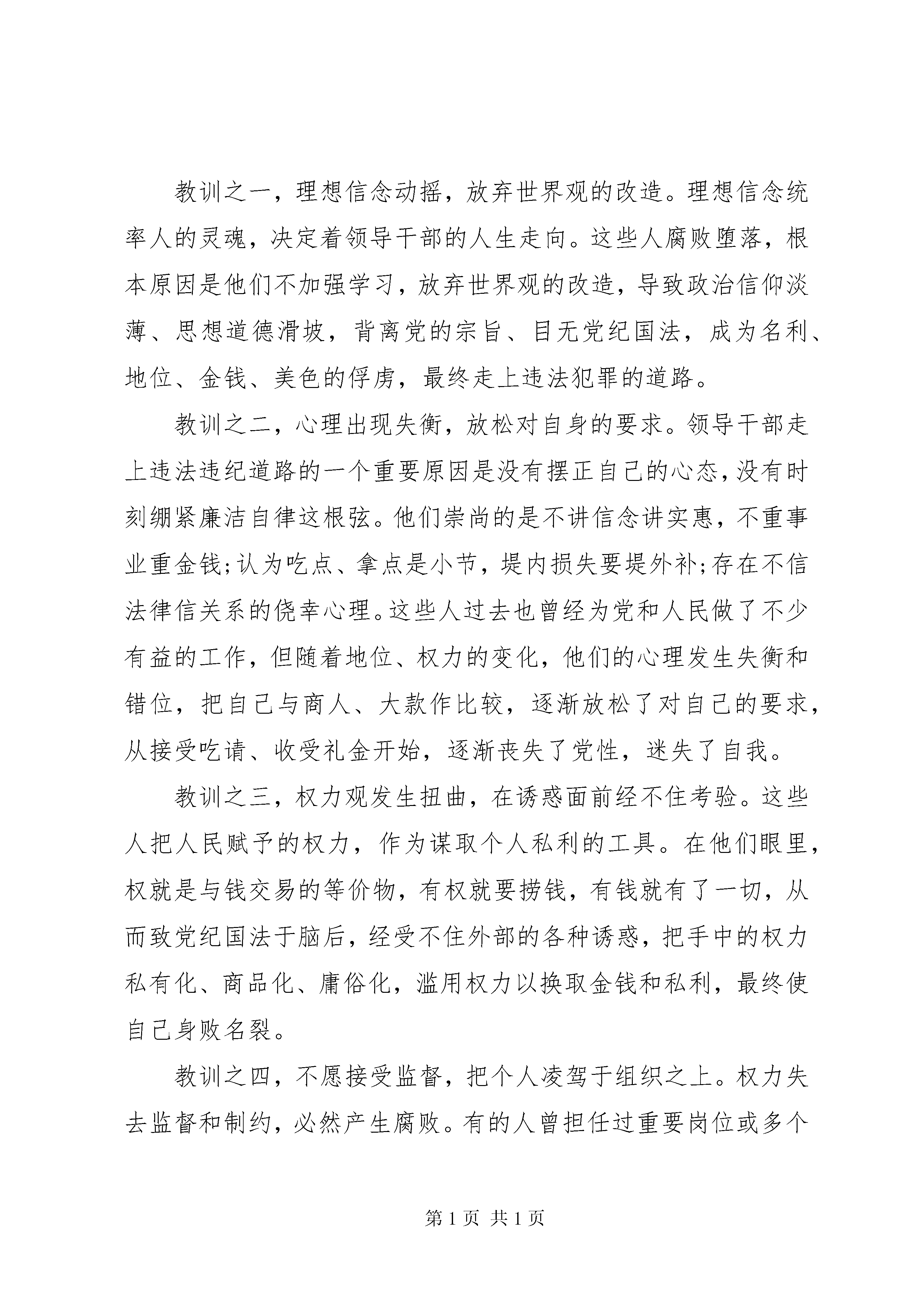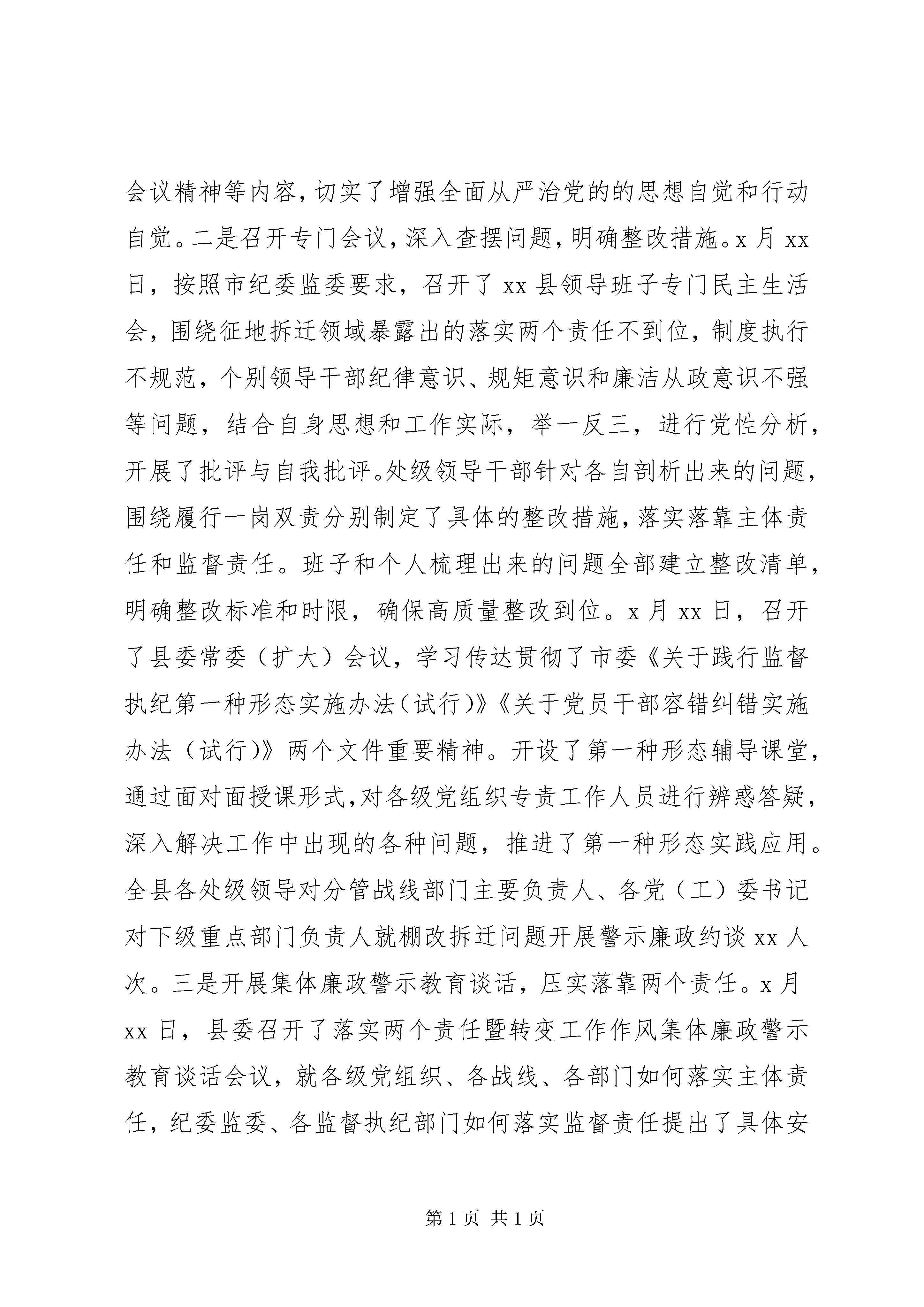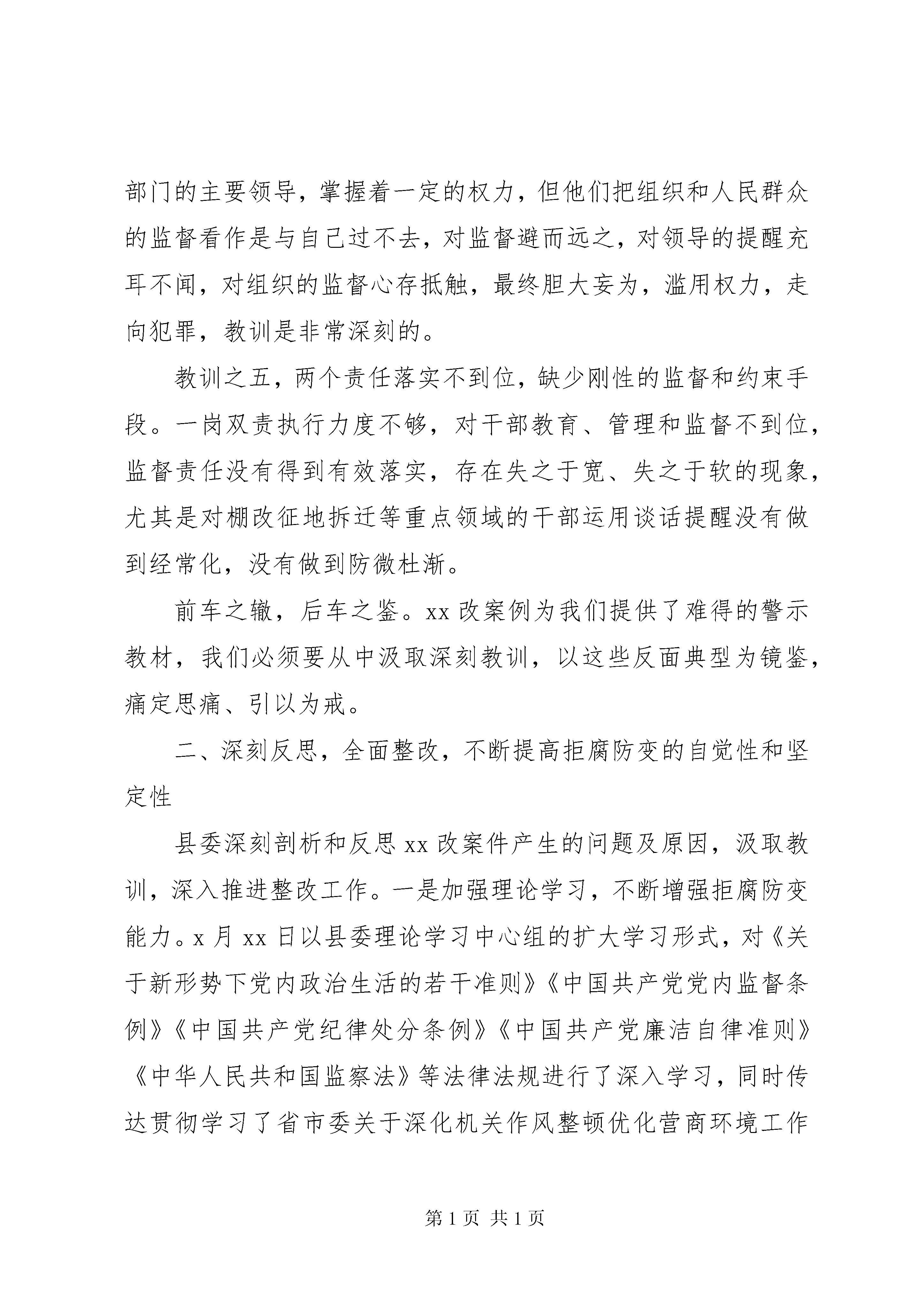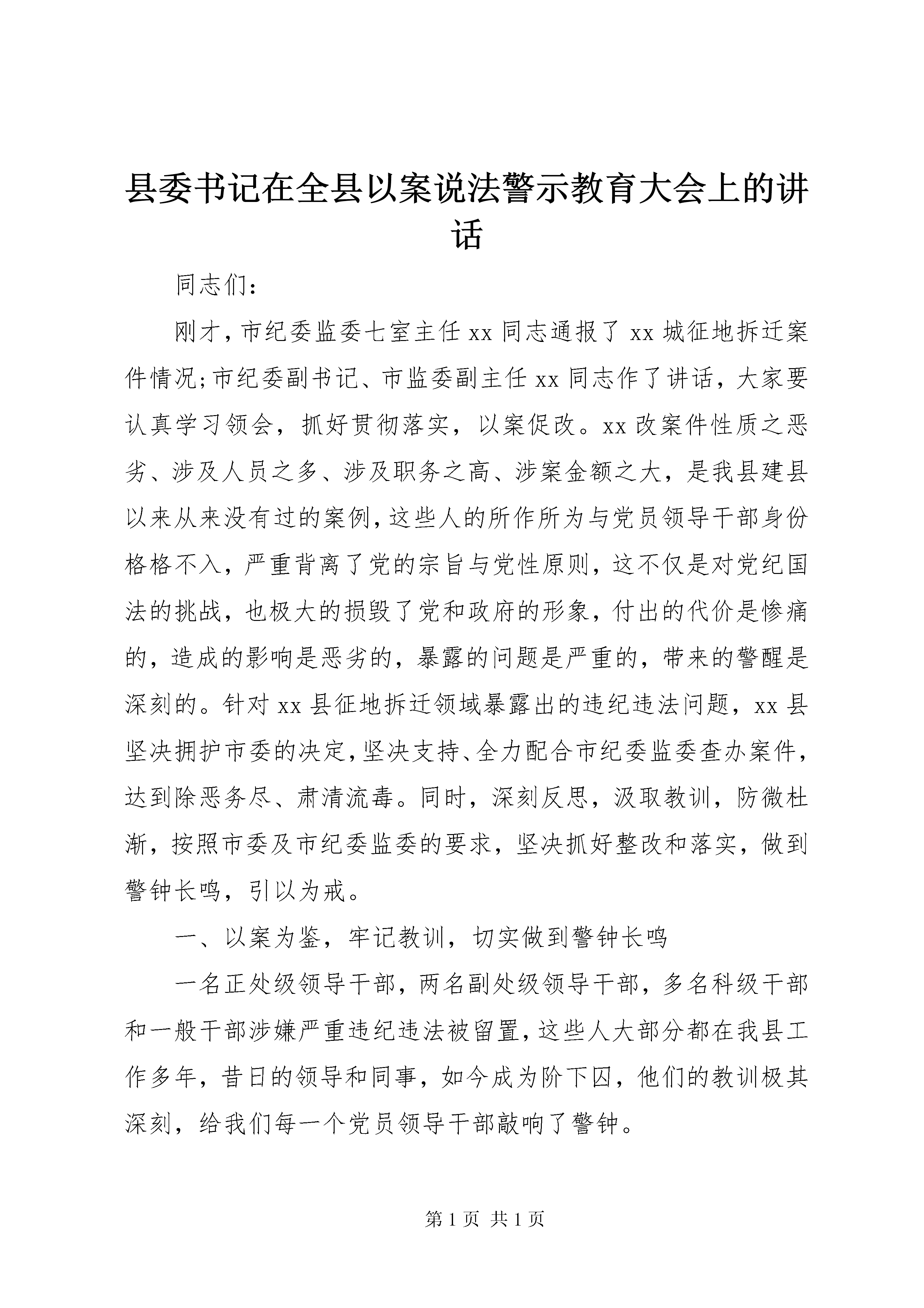 县委书记在全县以案说法警示教育大会上的讲话同志们:刚才,市纪委监委七室主任xx同志通报了xx城征地拆迁案件情况;市纪委副书记、市监委副主任xx同志作了讲话,大家要认真学习领会,抓好贯彻落实,以案促改。xx改案件性质之恶劣、涉及人员之多、涉及职务之高、涉案金额之大,是我县建县以来从来没有过的案例,这些人的所作所为与党员领导干部身份格格不入,严重背离了党的宗旨与党性原则,这不仅是对党纪国法的挑战,也极大的损毁了党和政府的形象,付出的代价是惨痛的,造成的影响是恶劣的,暴露的问题是严重的,带来的警醒是深刻的。针对xx县征地拆迁领域暴露出的违纪违法问题,xx县坚决拥护市委的决定,坚决支持、全力配合市纪委监委查办案件,达到除恶务尽、肃清流毒。同时,深刻反思,汲取教训,防微杜渐,按照市委及市纪委监委的要求,坚决抓好整改和落实,做到警钟长鸣,引以为戒。一、以案为鉴,牢记教训,切实做到警钟长鸣一名正处级领导干部,两名副处级领导干部,多名科级干部和一般干部涉嫌严重违纪违法被留置,这些人大部分都在我县工作多年,昔日的领导和同事,如今成为阶下囚,他们的教训极其深刻,给我们每一个党员领导干部敲响了警钟。教训之一,理想信念动摇,放弃世界观的改造。理想信念统率人的灵魂,决定着领导干部的人生走向。这些人腐败堕落,根本原因是他们不加强学习,放弃世界观的改造,导致政治信仰淡薄、思想道德滑坡,背离党的宗旨、目无党纪国法,成为名利、地位、金钱、美色的俘虏,最终走上违法犯罪的道路。教训之二,心理出现失衡,放松对自身的要求。领导干部走上违法违纪道路的一个重要原因是没有摆正自己的心态,没有时刻绷紧廉洁自律这根弦。他们崇尚的是不讲信念讲实惠,不重事业重金钱;认为吃点、拿点是小节,堤内损失要堤外补;存在不信法律信关系的侥幸心理。这些人过去也曾经为党和人民做了不少有益的工作,但随着地位、权力的变化,他们的心理发生失衡和错位,把自己与商人、大款作比较,逐渐放松了对自己的要求,从接受吃请、收受礼金开始,逐渐丧失了党性,迷失了自我。教训之三,权力观发生扭曲,在诱惑面前经不住考验。这些人把人民赋予的权力,作为谋取个人私利的工具。在他们眼里,权就是与钱交易的等价物,有权就要捞钱,有钱就有了一切,从而致党纪国法于脑后,经受不住外部的各种诱惑,把手中的权力私有化、商品化、庸俗化,滥用权力以换取金钱和私利,最终使自己身败名裂。教训之四,不愿接受监督,把个人凌驾于组织之上。权力失去监督和制约,必然产生腐败。有的人曾担任过重要岗位或多个部门的主要领导,掌握着一定的权力,但他们把组织和人民群众的监督看作是与自己过不去,对监督避而远之,对领导的提醒充耳不闻,对组织的监督心存抵触,最终胆大妄为,滥用权力,走向犯罪,教训是非常深刻的。教训之五,两个责任落实不到位,缺少刚性的监督和约束手段。一岗双责执行力度不够,对干部教育、管理和监督不到位,监督责任没有得到有效落实,存在失之于宽、失之于软的现象,尤其是对棚改征地拆迁等重点领域的干部运用谈话提醒没有做到经常化,没有做到防微杜渐。前车之辙,后车之鉴。xx改案例为我们提供了难得的警示教材,我们必须要从中汲取深刻教训,以这些反面典型为镜鉴,痛定思痛、引以为戒。二、深刻反思,全面整改,不断提高拒腐防变的自觉性和坚定性县委深刻剖析和反思xx改案件产生的问题及原因,汲取教训,深入推进整改工作。一是加强理论学习,不断增强拒腐防变能力。x月xx日以县委理论学习中心组的扩大学习形式,对《关于新形势下党内政治生活的若干准则》《中国共产党党内监督条例》《中国共产党纪律处分条例》《中国共产党廉洁自律准则》《中华人民共和国监察法》等法律法规进行了深入学习,同时传达贯彻学习了省市委关于深化机关作风整顿优化营商环境工作会议精神等内容,切实了增强全面从严治党的的思想自觉和行动自觉。二是召开专门会议,深入查摆问题,明确整改措施。x月xx日,按照市纪委监委要求,召开了xx县领导班子专门民主生活会,围绕征地拆迁领域暴露出的落实两个责任不到位,制度执行不规范,个别领导干部纪律意识、规矩意识和廉洁从政意识不强等问题,结合自身思想和工作实际,举一反三,进行党性分析,开展了批评与自我批评。处级领导干部针对各自剖析出来的问题,围绕履行一岗双责分别制定了具体的整改措施,落实落靠主体责任和监督责任。班子和个人梳理出来的问题全部建立整改清单,明确整改标准和时限,确保高质量整改到位。x月xx日,召开了县委常委(扩大)会议,学习传达贯彻了市委《关于践行监督执纪第一种形态实施办法(试行)》《关于党员干部容错纠错实施办法(试行)》两个文件重要精神。开设了第一种形态辅导课堂,通过面对面授课形式,对各级党组织专责工作人员进行辨惑答疑,深入解决工作中出现的各种问题,推进了第一种形态实践应用。全县各处