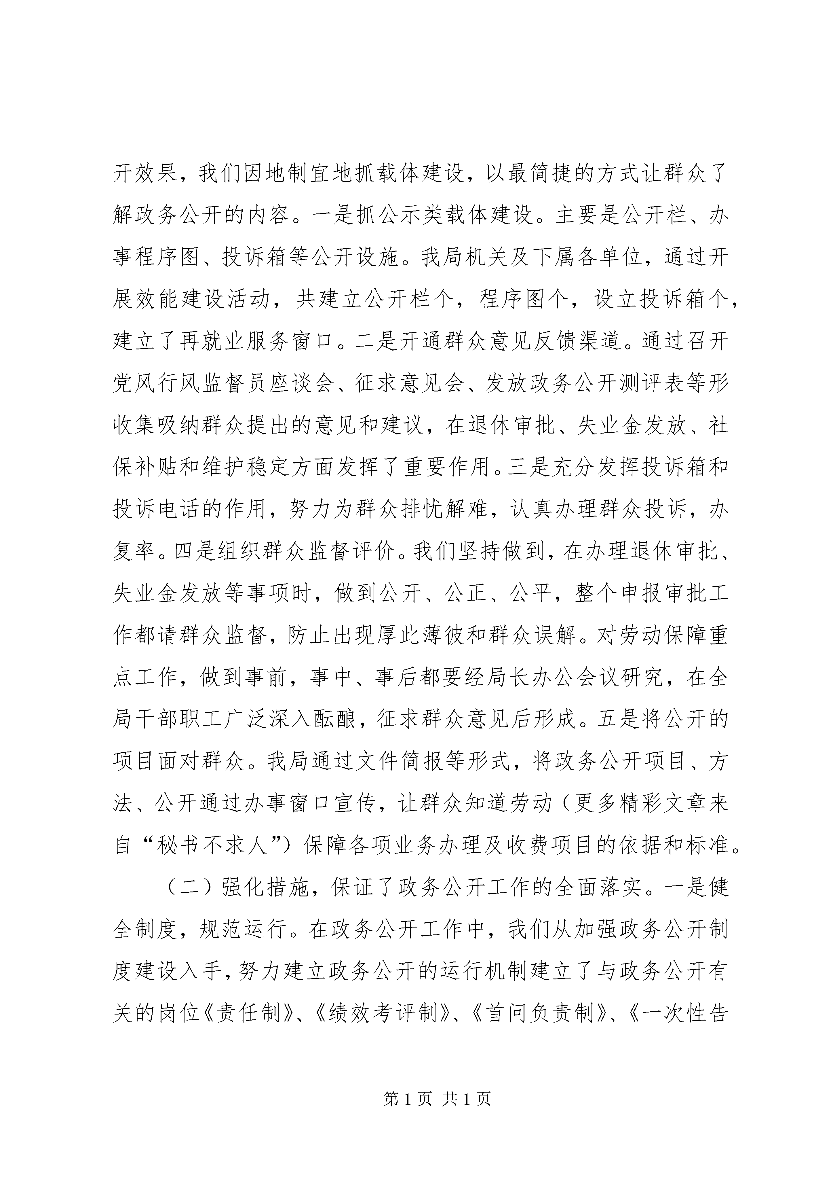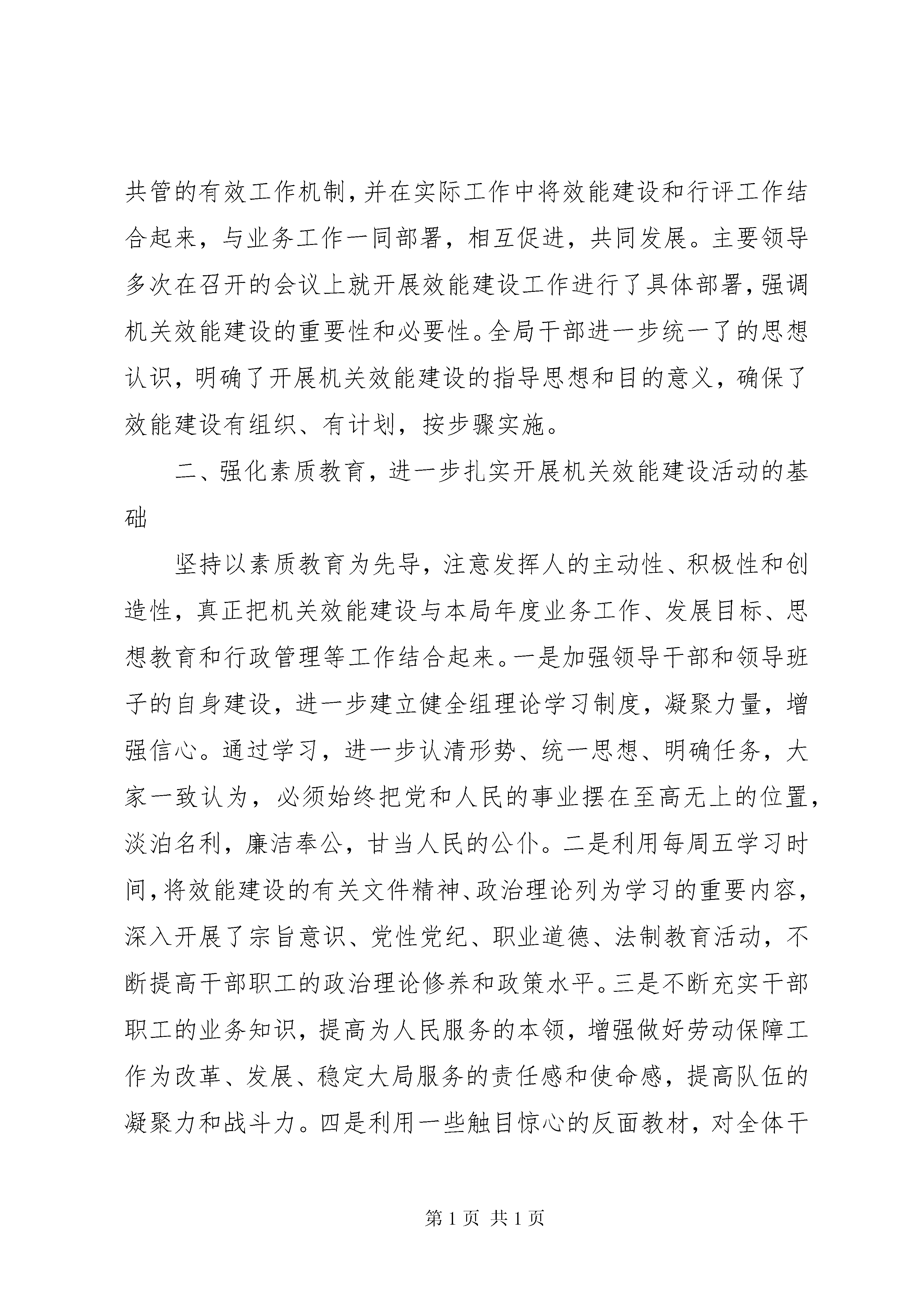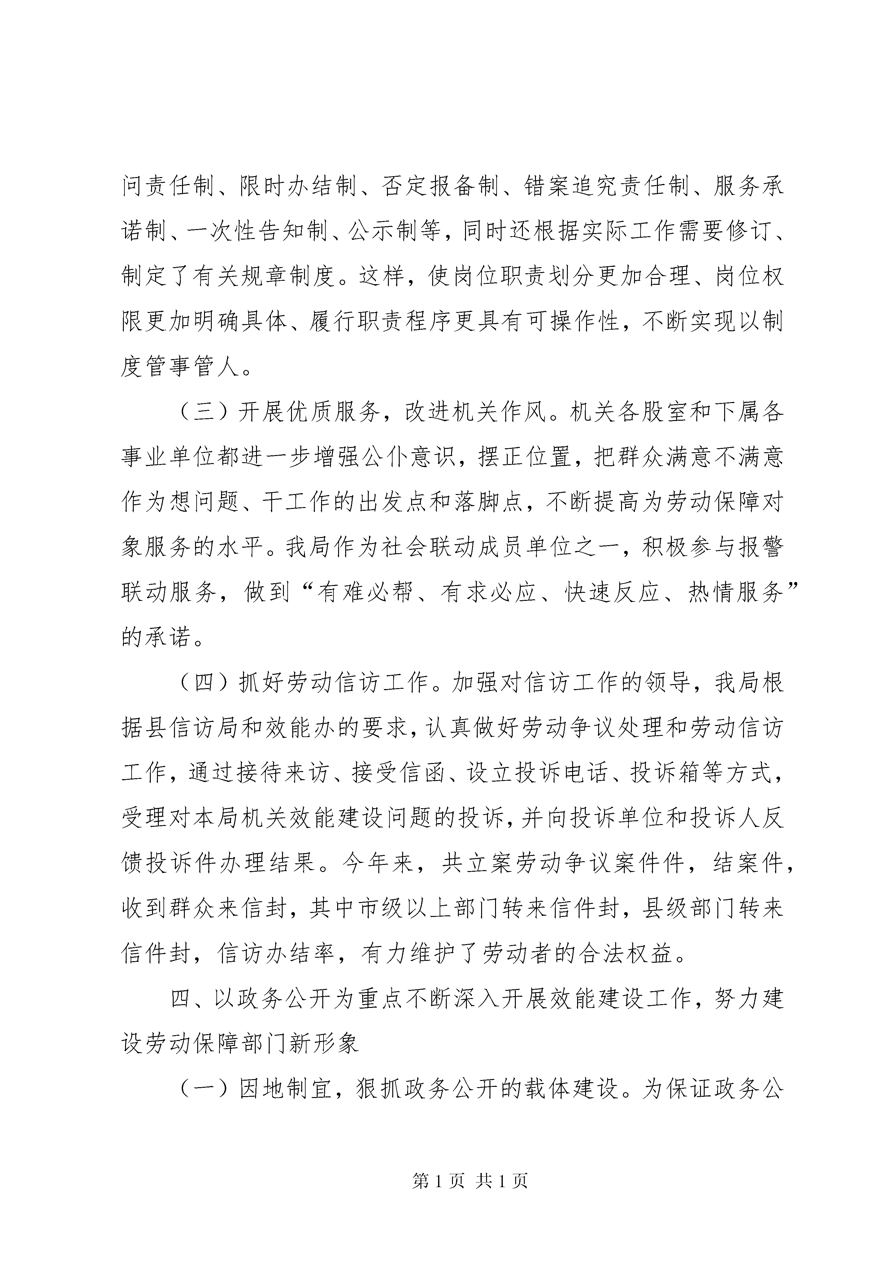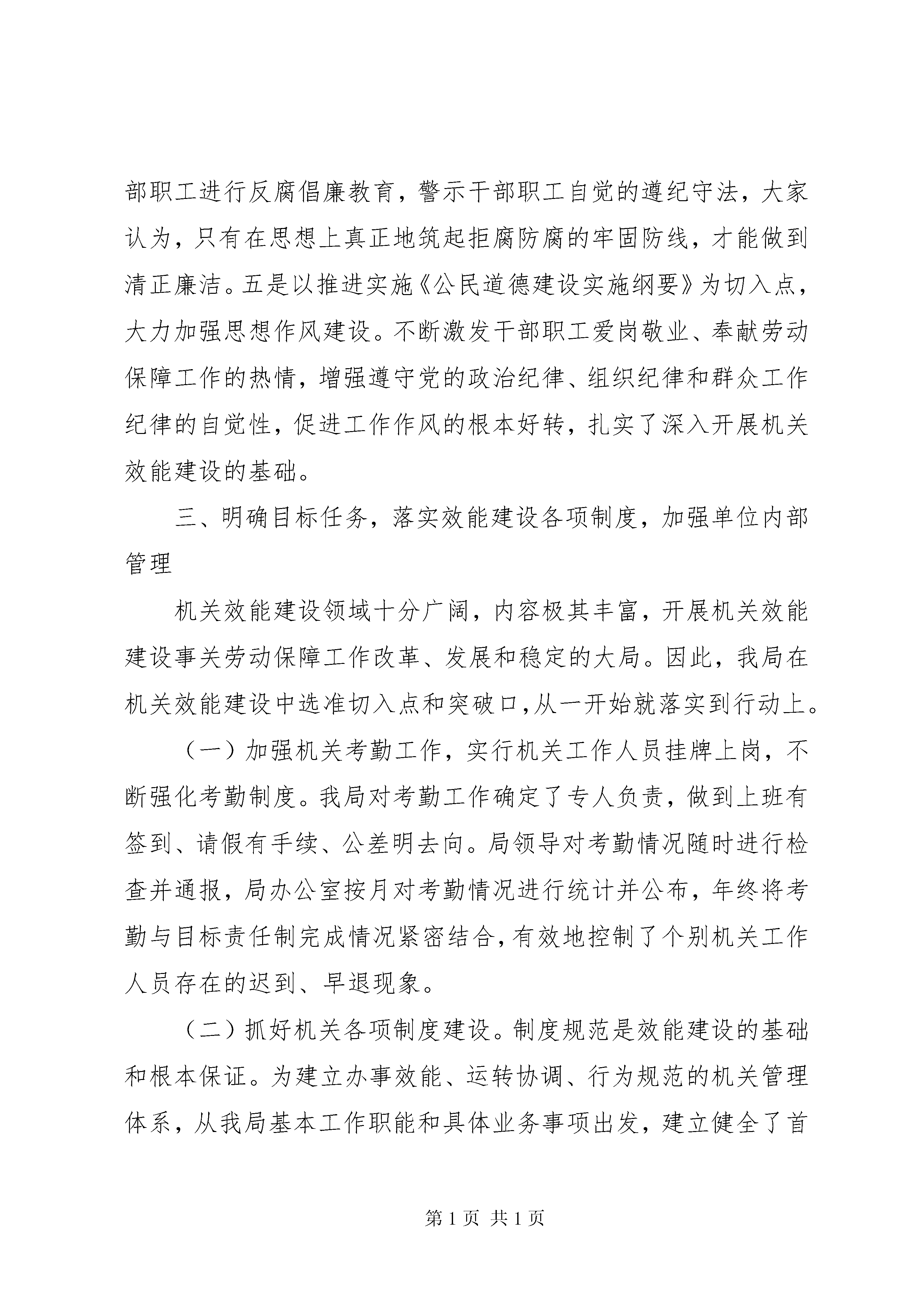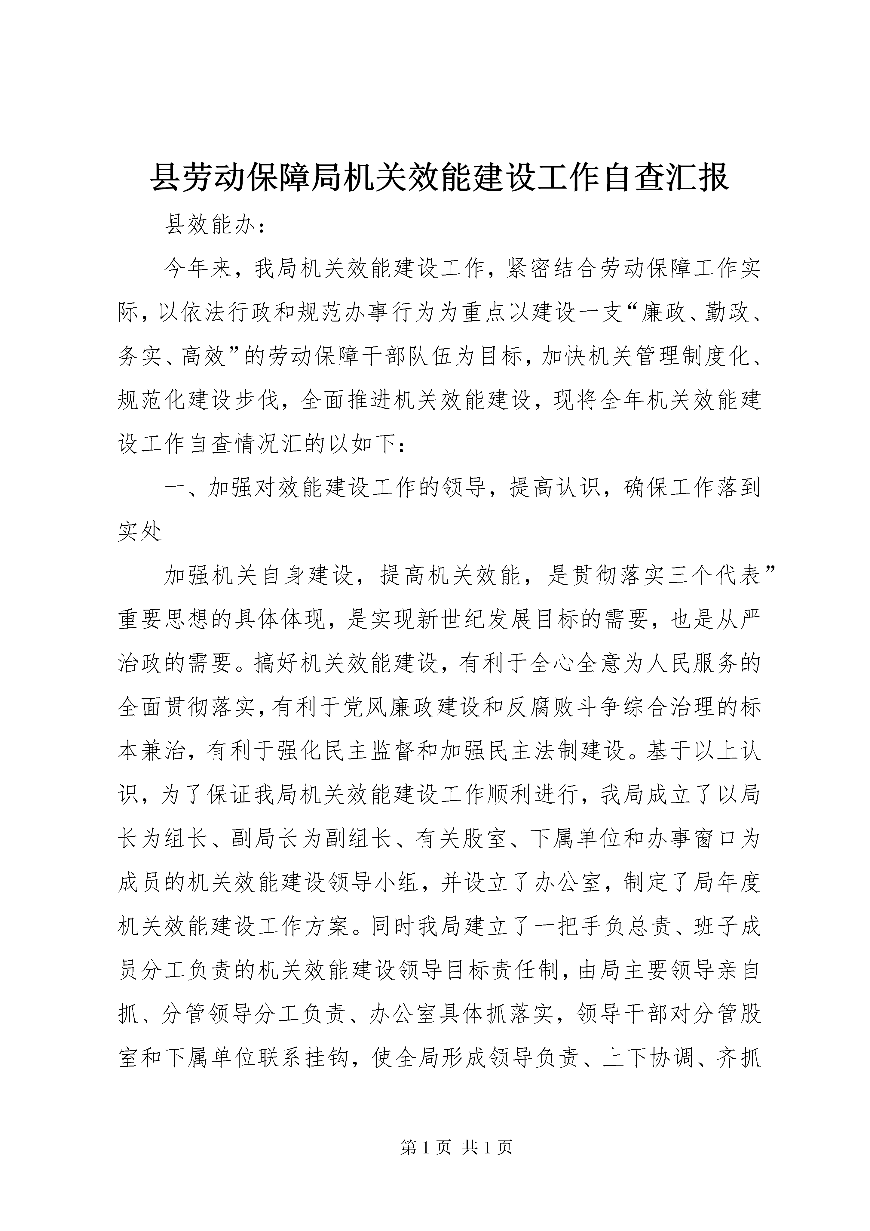 县劳动保障局机关效能建设工作自查汇报县效能办:今年来,我局机关效能建设工作,紧密结合劳动保障工作实际,以依法行政和规范办事行为为重点以建设一支“廉政、勤政、务实、高效”的劳动保障干部队伍为目标,加快机关管理制度化、规范化建设步伐,全面推进机关效能建设,现将全年机关效能建设工作自查情况汇的以如下:一、加强对效能建设工作的领导,提高认识,确保工作落到实处加强机关自身建设,提高机关效能,是贯彻落实三个代表”重要思想的具体体现,是实现新世纪发展目标的需要,也是从严治政的需要。搞好机关效能建设,有利于全心全意为人民服务的全面贯彻落实,有利于党风廉政建设和反腐败斗争综合治理的标本兼治,有利于强化民主监督和加强民主法制建设。基于以上认识,为了保证我局机关效能建设工作顺利进行,我局成立了以局长为组长、副局长为副组长、有关股室、下属单位和办事窗口为成员的机关效能建设领导小组,并设立了办公室,制定了局年度机关效能建设工作方案。同时我局建立了一把手负总责、班子成员分工负责的机关效能建设领导目标责任制,由局主要领导亲自抓、分管领导分工负责、办公室具体抓落实,领导干部对分管股室和下属单位联系挂钩,使全局形成领导负责、上下协调、齐抓共管的有效工作机制,并在实际工作中将效能建设和行评工作结合起来,与业务工作一同部署,相互促进,共同发展。主要领导多次在召开的会议上就开展效能建设工作进行了具体部署,强调机关效能建设的重要性和必要性。全局干部进一步统一了的思想认识,明确了开展机关效能建设的指导思想和目的意义,确保了效能建设有组织、有计划,按步骤实施。二、强化素质教育,进一步扎实开展机关效能建设活动的基础坚持以素质教育为先导,注意发挥人的主动性、积极性和创造性,真正把机关效能建设与本局年度业务工作、发展目标、思想教育和行政管理等工作结合起来。一是加强领导干部和领导班子的自身建设,进一步建立健全组理论学习制度,凝聚力量,增强信心。通过学习,进一步认清形势、统一思想、明确任务,大家一致认为,必须始终把党和人民的事业摆在至高无上的位置,淡泊名利,廉洁奉公,甘当人民的公仆。二是利用每周五学习时间,将效能建设的有关文件精神、政治理论列为学习的重要内容,深入开展了宗旨意识、党性党纪、职业道德、法制教育活动,不断提高干部职工的政治理论修养和政策水平。三是不断充实干部职工的业务知识,提高为人民服务的本领,增强做好劳动保障工作为改革、发展、稳定大局服务的责任感和使命感,提高队伍的凝聚力和战斗力。四是利用一些触目惊心的反面教材,对全体干部职工进行反腐倡廉教育,警示干部职工自觉的遵纪守法,大家认为,只有在思想上真正地筑起拒腐防腐的牢固防线,才能做到清正廉洁。五是以推进实施《公民道德建设实施纲要》为切入点,大力加强思想作风建设。不断激发干部职工爱岗敬业、奉献劳动保障工作的热情,增强遵守党的政治纪律、组织纪律和群众工作纪律的自觉性,促进工作作风的根本好转,扎实了深入开展机关效能建设的基础。三、明确目标任务,落实效能建设各项制度,加强单位内部管理机关效能建设领域十分广阔,内容极其丰富,开展机关效能建设事关劳动保障工作改革、发展和稳定的大局。因此,我局在机关效能建设中选准切入点和突破口,从一开始就落实到行动上。(一)加强机关考勤工作,实行机关工作人员挂牌上岗,不断强化考勤制度。我局对考勤工作确定了专人负责,做到上班有签到、请假有手续、公差明去向。局领导对考勤情况随时进行检查并通报,局办公室按月对考勤情况进行统计并公布,年终将考勤与目标责任制完成情况紧密结合,有效地控制了个别机关工作人员存在的迟到、早退现象。(二)抓好机关各项制度建设。制度规范是效能建设的基础和根本保证。为建立办事效能、运转协调、行为规范的机关管理体系,从我局基本工作职能和具体业务事项出发,建立健全了首问责任制、限时办结制、否定报备制、错案追究责任制、服务承诺制、一次性告知制、公示制等,同时还根据实际工作需要修订、制定了有关规章制度。这样,使岗位职责划分更加合理、岗位权限更加明确具体、履行职责程序更具有可操作性,不断实现以制度管事管人。(三)开展优质服务,改进机关作风。机关各股室和下属各事业单位都进一步增强公仆意识,摆正位置,把群众满意不满意作为想问题、干工作的出发点和落脚点,不断提高为劳动保障对象服务的水平。我局作为社会联动成员单位之一,积极参与报警联动服务,做到“有难必帮、有求必应、快速反应、热情服务”的承诺。(四)抓好劳动信访工作。加强对信访工作的领导,我局根据县信访局和效能办的要求,认真做好劳动争议处理和劳动信访工作,通过接待来访、接受信函、设立投诉电话、投诉箱等方式,受理对本局机关效能建设问题的投诉,并向投诉单位和投诉人反馈投诉件办理结果。今年来,共立案劳动争议案件件,结案件,收到群众来信封,