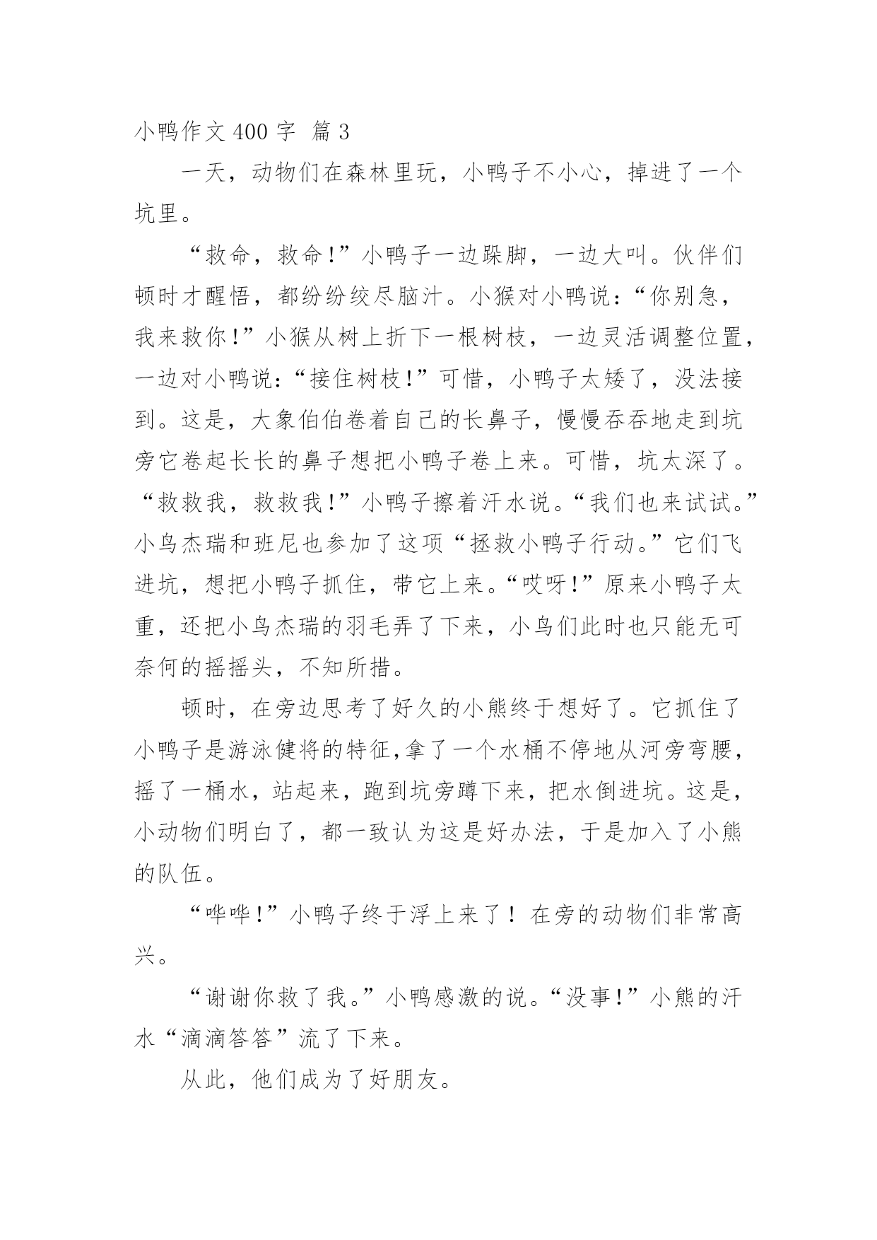 小鸭作文400字 小鸭作文400字3篇在学习、工作或生活中,大家都不可避免地要接触到作文吧,借助作文人们可以反映客观事物、表达思想感情、传递知识信息。你写作文时总是无从下笔?以下是小编帮大家整理的小鸭作文400字3篇,欢迎大家分享。小鸭作文400字篇1如果你有幸去到温哥华,你就会见到鸭妈妈带着六只憨态可掬的小鸭漫步在温哥华的街头。它们那惊险的经历一定会让你大吃一惊的。它们来自一个风景优美的农场,农场的主人则是温哥华最有名的屠夫。有一天,小鸭三仔在无意间看见主人在手提屠刀,一刀将一只鸭子给杀了。三仔大惊,赶忙去告诉妈妈,妈妈也非常吃惊,但是鸭妈妈很快镇定了下来。趁着夜色,鸭妈妈带领六只小鸭悄悄地逃离了农场,来到了温哥华。一天,鸭妈妈带着六只小鸭在温哥华的街头上觅食。突然,一只肥嘟嘟的大狗向鸭子们奔来,顿时,鸭子一家大乱,四仔和五仔失足掉进了下水道里。鸭妈妈赶紧跑过来搭救,可是下水道非常深、非常黑,鸭妈妈根本救不到它们。鸭妈妈心急如焚,四仔和五仔命悬一线,鸭妈妈一想到它们又心如刀绞。忽然,一名身着警装的巡警闪进了鸭妈妈的眼睛,鸭妈妈赶紧飞奔过去,咬着巡警的裤子不放,硬是把巡警拉到了“出事地点”。巡警一看下水道马上明白过来,找到一张大网,将四仔和五仔给捞了上来。怎么样?它们的故事是不是很有趣呀?小鸭作文400字篇2一天,小鸭在森林里散步,突然小鸭掉进了陷阱里,森林里传来了一阵“救命呀,救命呀,有没有人来救我呀?”的声音。这时小动物们陆续地来到了坑的旁边,对小鸭说:“小鸭,你怎么掉到坑里了呢?”“我也不知道怎么回事呀!无缘无故就掉进了坑里!”小猴子猛的爬到树上,把伟大紧紧的钩在了树上,对小鸭说:“小鸭,我拿根棍子放到坑里,你用嘴吧咬住棍子,然后我把棍子收上去。”说的简单,做起来难,小鸭的嘴巴根本咬不住棍子。小象对小猴说:“让我来试试吧!”小象用鼻子努力的把小鸭吸出来,它试了好几次,都没有能够把小鸭救出来。这时,小熊对小象说:“小象,我一定能把它救出来,相信我,但我要你帮我一个忙,行吗?”小象爽快的答应了。小熊与小象来到了河边,小熊用桶打水,小象用鼻子吸水,然后它们把水倒进了坑里,小鸭慢慢的`就浮了起来。小鸭对大家说:“谢谢你们把我救出来。”小鸭终于得救了,它们一起兴高采烈的向森林里走去。小鸭作文400字篇3一天,动物们在森林里玩,小鸭子不小心,掉进了一个坑里。“救命,救命!”小鸭子一边跺脚,一边大叫。伙伴们顿时才醒悟,都纷纷绞尽脑汁。小猴对小鸭说:“你别急,我来救你!”小猴从树上折下一根树枝,一边灵活调整位置,一边对小鸭说:“接住树枝!”可惜,小鸭子太矮了,没法接到。这是,大象伯伯卷着自己的长鼻子,慢慢吞吞地走到坑旁它卷起长长的鼻子想把小鸭子卷上来。可惜,坑太深了。“救救我,救救我!”小鸭子擦着汗水说。“我们也来试试。”小鸟杰瑞和班尼也参加了这项“拯救小鸭子行动。”它们飞进坑,想把小鸭子抓住,带它上来。“哎呀!”原来小鸭子太重,还把小鸟杰瑞的羽毛弄了下来,小鸟们此时也只能无可奈何的摇摇头,不知所措。顿时,在旁边思考了好久的小熊终于想好了。它抓住了小鸭子是游泳健将的特征,拿了一个水桶不停地从河旁弯腰,摇了一桶水,站起来,跑到坑旁蹲下来,把水倒进坑。这是,小动物们明白了,都一致认为这是好办法,于是加入了小熊的队伍。“哗哗!”小鸭子终于浮上来了!在旁的动物们非常高兴。“谢谢你救了我。”小鸭感激的说。“没事!”小熊的汗水“滴滴答答”流了下来。从此,他们成为了好朋友。