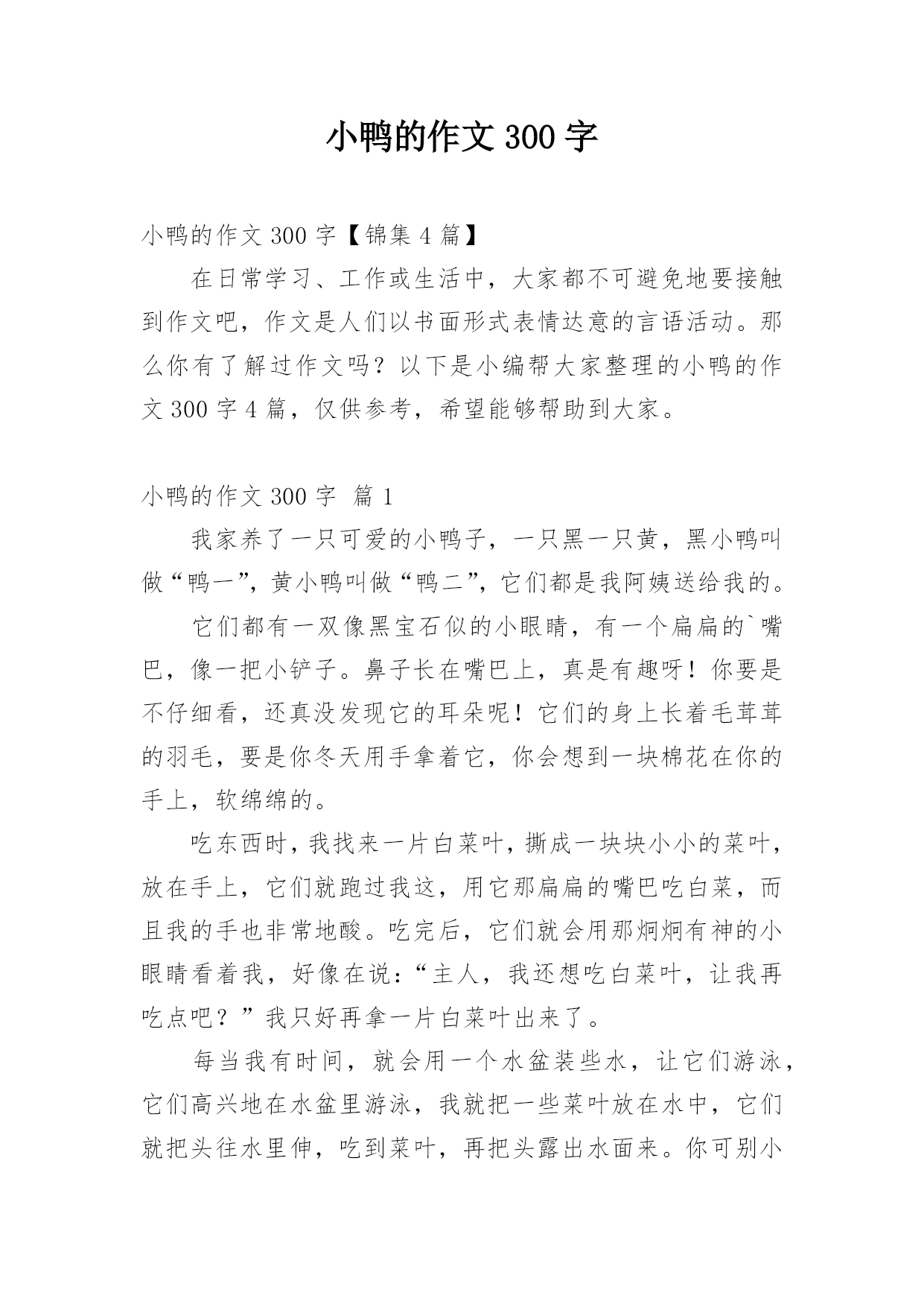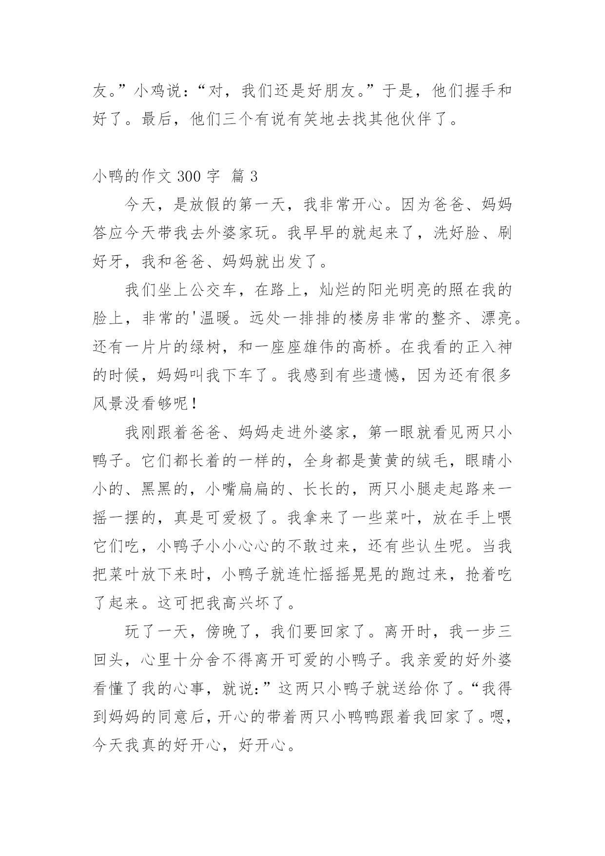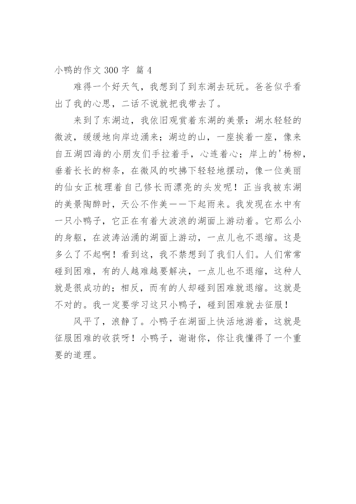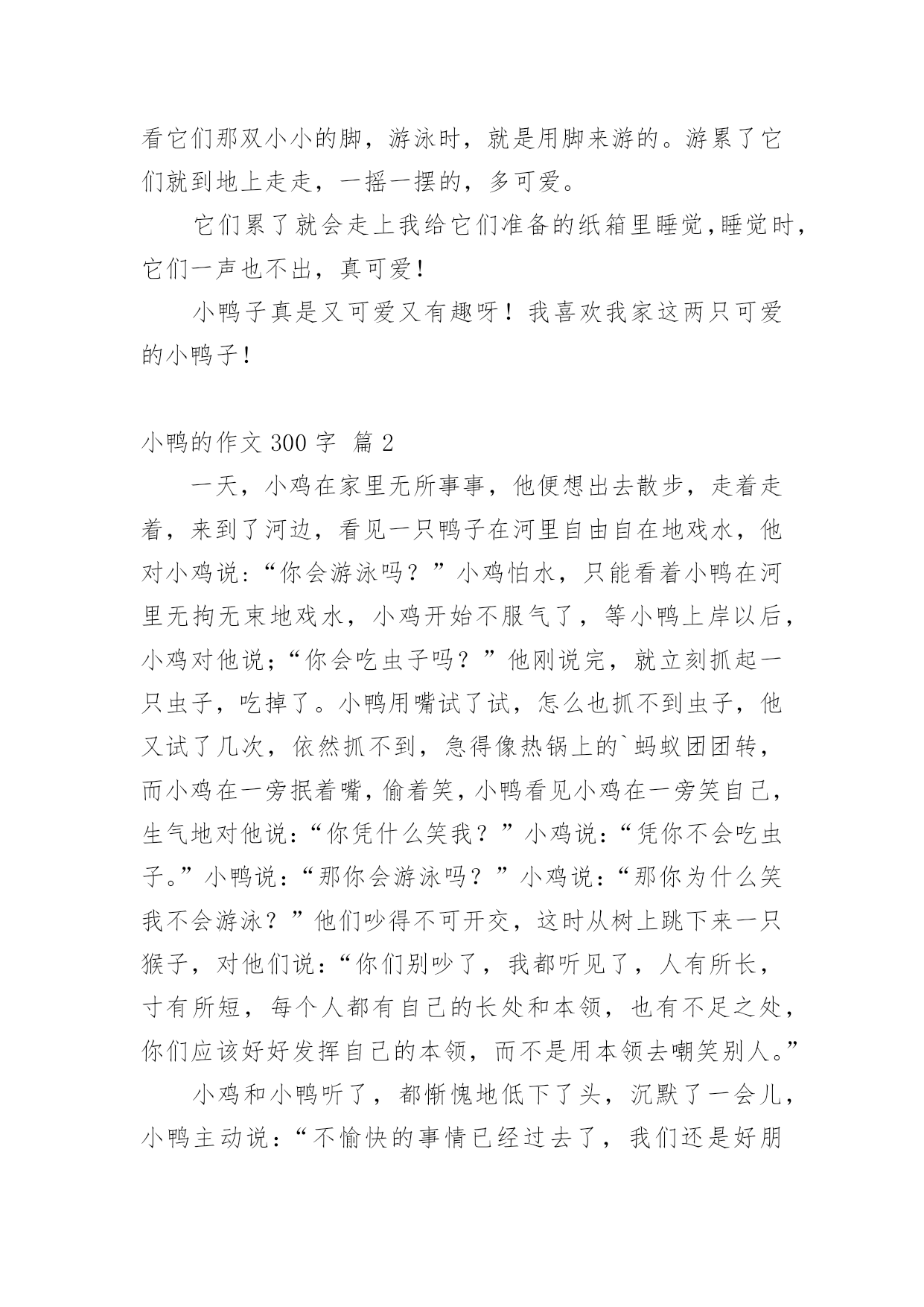 小鸭的作文300字 小鸭的作文300字【锦集4篇】在日常学习、工作或生活中,大家都不可避免地要接触到作文吧,作文是人们以书面形式表情达意的言语活动。那么你有了解过作文吗?以下是小编帮大家整理的小鸭的作文300字4篇,仅供参考,希望能够帮助到大家。小鸭的作文300字篇1我家养了一只可爱的小鸭子,一只黑一只黄,黑小鸭叫做“鸭一”,黄小鸭叫做“鸭二”,它们都是我阿姨送给我的。它们都有一双像黑宝石似的小眼睛,有一个扁扁的`嘴巴,像一把小铲子。鼻子长在嘴巴上,真是有趣呀!你要是不仔细看,还真没发现它的耳朵呢!它们的身上长着毛茸茸的羽毛,要是你冬天用手拿着它,你会想到一块棉花在你的手上,软绵绵的。吃东西时,我找来一片白菜叶,撕成一块块小小的菜叶,放在手上,它们就跑过我这,用它那扁扁的嘴巴吃白菜,而且我的手也非常地酸。吃完后,它们就会用那炯炯有神的小眼睛看着我,好像在说:“主人,我还想吃白菜叶,让我再吃点吧?”我只好再拿一片白菜叶出来了。每当我有时间,就会用一个水盆装些水,让它们游泳,它们高兴地在水盆里游泳,我就把一些菜叶放在水中,它们就把头往水里伸,吃到菜叶,再把头露出水面来。你可别小看它们那双小小的脚,游泳时,就是用脚来游的。游累了它们就到地上走走,一摇一摆的,多可爱。它们累了就会走上我给它们准备的纸箱里睡觉,睡觉时,它们一声也不出,真可爱!小鸭子真是又可爱又有趣呀!我喜欢我家这两只可爱的小鸭子!小鸭的作文300字篇2一天,小鸡在家里无所事事,他便想出去散步,走着走着,来到了河边,看见一只鸭子在河里自由自在地戏水,他对小鸡说:“你会游泳吗?”小鸡怕水,只能看着小鸭在河里无拘无束地戏水,小鸡开始不服气了,等小鸭上岸以后,小鸡对他说;“你会吃虫子吗?”他刚说完,就立刻抓起一只虫子,吃掉了。小鸭用嘴试了试,怎么也抓不到虫子,他又试了几次,依然抓不到,急得像热锅上的`蚂蚁团团转,而小鸡在一旁抿着嘴,偷着笑,小鸭看见小鸡在一旁笑自己,生气地对他说:“你凭什么笑我?”小鸡说:“凭你不会吃虫子。”小鸭说:“那你会游泳吗?”小鸡说:“那你为什么笑我不会游泳?”他们吵得不可开交,这时从树上跳下来一只猴子,对他们说:“你们别吵了,我都听见了,人有所长,寸有所短,每个人都有自己的长处和本领,也有不足之处,你们应该好好发挥自己的本领,而不是用本领去嘲笑别人。”小鸡和小鸭听了,都惭愧地低下了头,沉默了一会儿,小鸭主动说:“不愉快的事情已经过去了,我们还是好朋友。”小鸡说:“对,我们还是好朋友。”于是,他们握手和好了。最后,他们三个有说有笑地去找其他伙伴了。小鸭的作文300字篇3今天,是放假的第一天,我非常开心。因为爸爸、妈妈答应今天带我去外婆家玩。我早早的就起来了,洗好脸、刷好牙,我和爸爸、妈妈就出发了。我们坐上公交车,在路上,灿烂的阳光明亮的照在我的脸上,非常的'温暖。远处一排排的楼房非常的整齐、漂亮。还有一片片的绿树,和一座座雄伟的高桥。在我看的正入神的时候,妈妈叫我下车了。我感到有些遗憾,因为还有很多风景没看够呢!我刚跟着爸爸、妈妈走进外婆家,第一眼就看见两只小鸭子。它们都长着的一样的,全身都是黄黄的绒毛,眼睛小小的、黑黑的,小嘴扁扁的、长长的,两只小腿走起路来一摇一摆的,真是可爱极了。我拿来了一些菜叶,放在手上喂它们吃,小鸭子小小心心的不敢过来,还有些认生呢。当我把菜叶放下来时,小鸭子就连忙摇摇晃晃的跑过来,抢着吃了起来。这可把我高兴坏了。玩了一天,傍晚了,我们要回家了。离开时,我一步三回头,心里十分舍不得离开可爱的小鸭子。我亲爱的好外婆看懂了我的心事,就说:”这两只小鸭子就送给你了。“我得到妈妈的同意后,开心的带着两只小鸭鸭跟着我回家了。嗯,今天我真的好开心,好开心。小鸭的作文300字篇4难得一个好天气,我想到了到东湖去玩玩。爸爸似乎看出了我的心思,二话不说就把我带去了。来到了东湖边,我依旧观赏着东湖的美景:湖水轻轻的微波,缓缓地向岸边涌来;湖边的山,一座挨着一座,像来自五湖四海的小朋友们手拉着手,心连着心;岸上的'杨柳,垂着长长的柳条,在微风的吹拂下轻轻地摆动,像一位美丽的仙女正梳理着自己修长而漂亮的头发呢!正当我被东湖的美景陶醉时,天公不作美――下起雨来。我发现在水中有一只小鸭子,它正在有着大波浪的湖面上游动着。它那么小的身躯,在波涛汹涌的湖面上游动,一点儿也不退缩。这是多么了不起啊!看到这,我不禁想到了我们人们。人们常常碰到困难,有的人越难越要解决,一点儿也不退缩,这种人就是很成功的;相反,而有的人却碰到困难就退缩。这就是不对的。我一定要学习这只小鸭子,碰到困难就去征服!风平了,浪静了。小鸭子在湖面上快活地游着,这就是征服困难的收获呀!小鸭子,谢谢你,你让我懂得了一个重要的道理。
