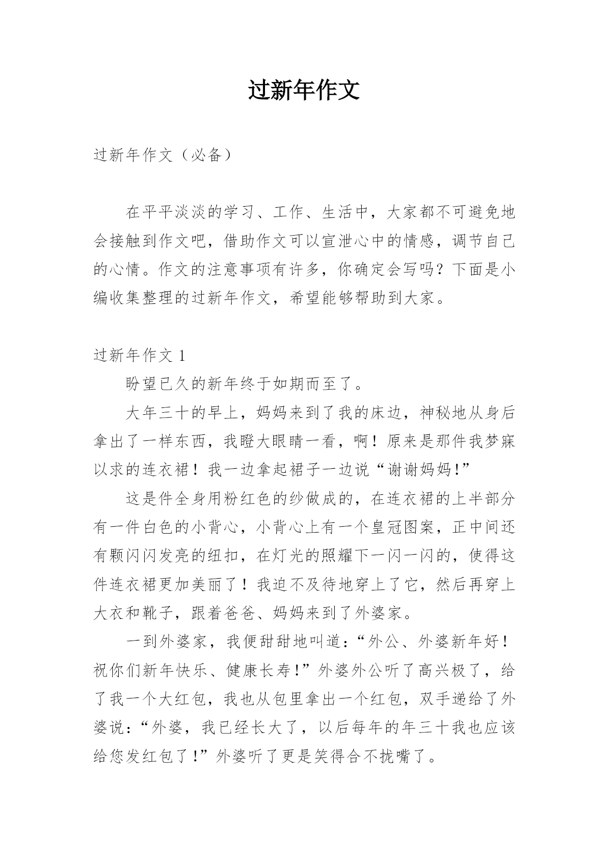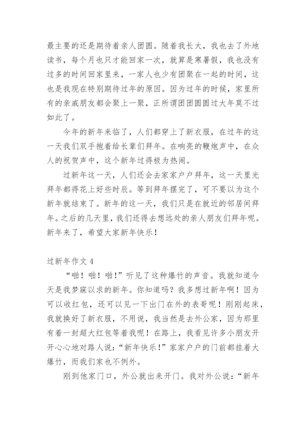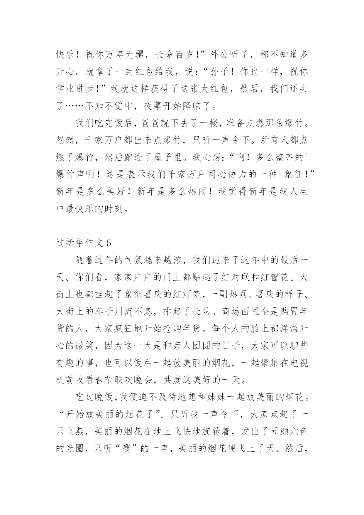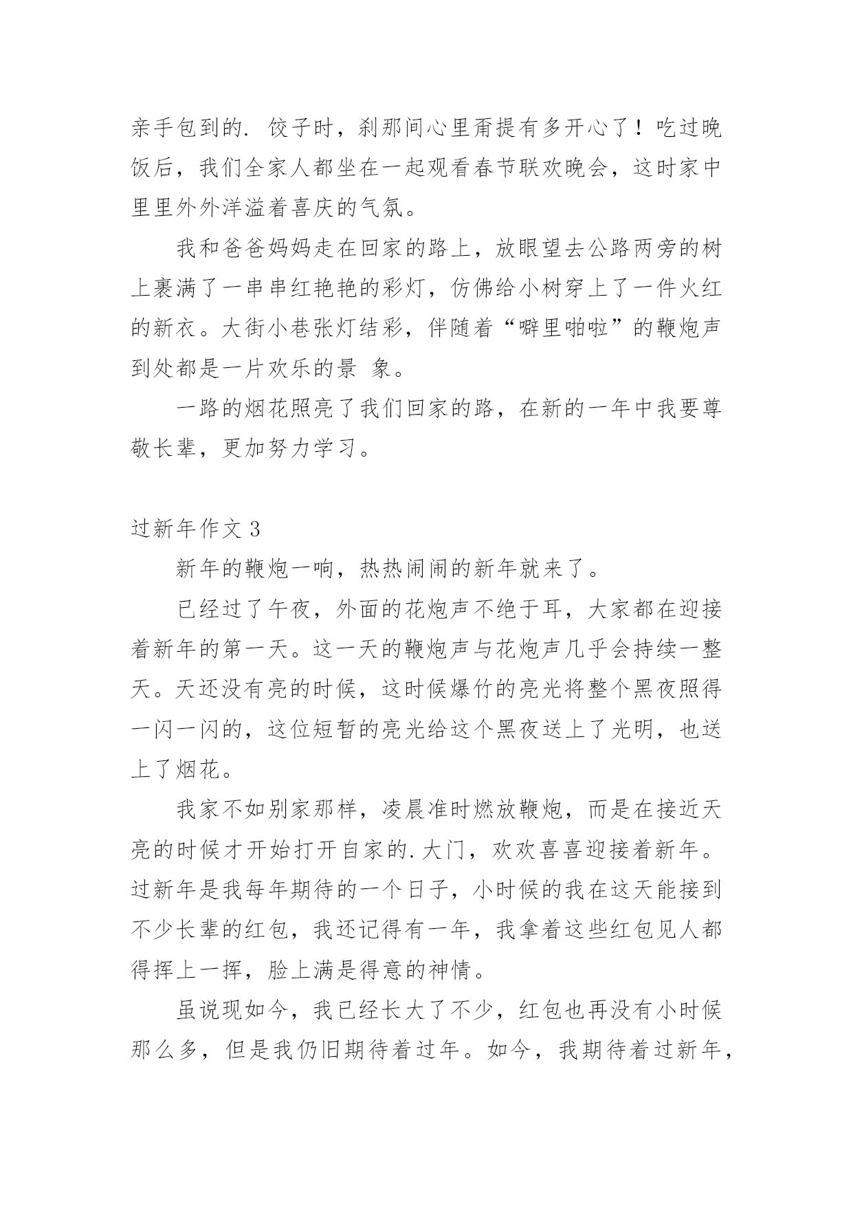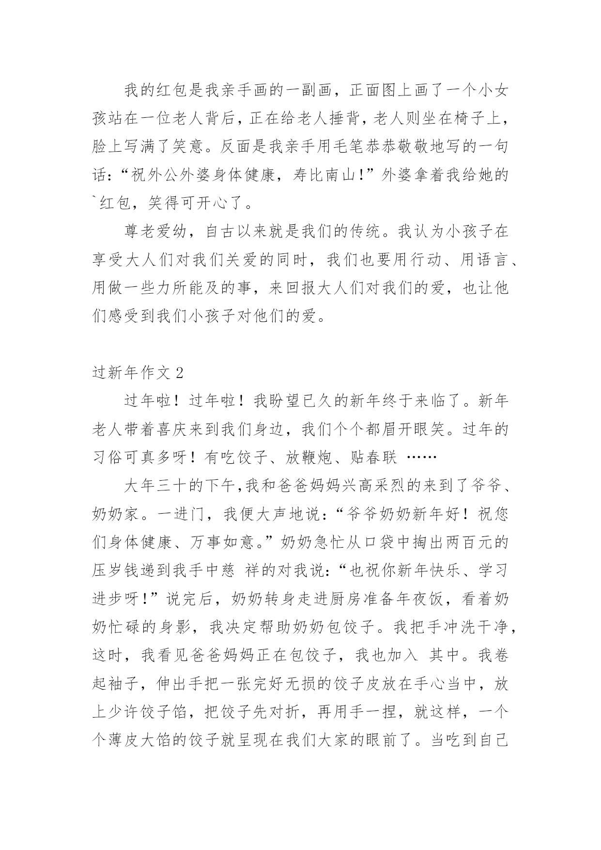 过新年作文 过新年作文(必备)在平平淡淡的学习、工作、生活中,大家都不可避免地会接触到作文吧,借助作文可以宣泄心中的情感,调节自己的心情。作文的注意事项有许多,你确定会写吗?下面是小编收集整理的过新年作文,希望能够帮助到大家。过新年作文1盼望已久的新年终于如期而至了。大年三十的早上,妈妈来到了我的床边,神秘地从身后拿出了一样东西,我瞪大眼睛一看,啊!原来是那件我梦寐以求的连衣裙!我一边拿起裙子一边说“谢谢妈妈!”这是件全身用粉红色的纱做成的,在连衣裙的上半部分有一件白色的小背心,小背心上有一个皇冠图案,正中间还有颗闪闪发亮的纽扣,在灯光的照耀下一闪一闪的,使得这件连衣裙更加美丽了!我迫不及待地穿上了它,然后再穿上大衣和靴子,跟着爸爸、妈妈来到了外婆家。一到外婆家,我便甜甜地叫道:“外公、外婆新年好!祝你们新年快乐、健康长寿!”外婆外公听了高兴极了,给了我一个大红包,我也从包里拿出一个红包,双手递给了外婆说:“外婆,我已经长大了,以后每年的年三十我也应该给您发红包了!”外婆听了更是笑得合不拢嘴了。我的红包是我亲手画的一副画,正面图上画了一个小女孩站在一位老人背后,正在给老人捶背,老人则坐在椅子上,脸上写满了笑意。反面是我亲手用毛笔恭恭敬敬地写的一句话:“祝外公外婆身体健康,寿比南山!”外婆拿着我给她的`红包,笑得可开心了。尊老爱幼,自古以来就是我们的传统。我认为小孩子在享受大人们对我们关爱的同时,我们也要用行动、用语言、用做一些力所能及的事,来回报大人们对我们的爱,也让他们感受到我们小孩子对他们的爱。过新年作文2过年啦!过年啦!我盼望已久的新年终于来临了。新年老人带着喜庆来到我们身边,我们个个都眉开眼笑。过年的习俗可真多呀!有吃饺子、放鞭炮、贴春联……大年三十的下午,我和爸爸妈妈兴高采烈的来到了爷爷、奶奶家。一进门,我便大声地说:“爷爷奶奶新年好!祝您们身体健康、万事如意。”奶奶急忙从口袋中掏出两百元的压岁钱递到我手中慈祥的对我说:“也祝你新年快乐、学习进步呀!”说完后,奶奶转身走进厨房准备年夜饭,看着奶奶忙碌的身影,我决定帮助奶奶包饺子。我把手冲洗干净,这时,我看见爸爸妈妈正在包饺子,我也加入其中。我卷起袖子,伸出手把一张完好无损的饺子皮放在手心当中,放上少许饺子馅,把饺子先对折,再用手一捏,就这样,一个个薄皮大馅的饺子就呈现在我们大家的眼前了。当吃到自己亲手包到的.饺子时,刹那间心里甭提有多开心了!吃过晚饭后,我们全家人都坐在一起观看春节联欢晚会,这时家中里里外外洋溢着喜庆的气氛。我和爸爸妈妈走在回家的路上,放眼望去公路两旁的树上裹满了一串串红艳艳的彩灯,仿佛给小树穿上了一件火红的新衣。大街小巷张灯结彩,伴随着“噼里啪啦”的鞭炮声到处都是一片欢乐的景象。一路的烟花照亮了我们回家的路,在新的一年中我要尊敬长辈,更加努力学习。过新年作文3新年的鞭炮一响,热热闹闹的新年就来了。已经过了午夜,外面的花炮声不绝于耳,大家都在迎接着新年的第一天。这一天的鞭炮声与花炮声几乎会持续一整天。天还没有亮的时候,这时候爆竹的亮光将整个黑夜照得一闪一闪的,这位短暂的亮光给这个黑夜送上了光明,也送上了烟花。我家不如别家那样,凌晨准时燃放鞭炮,而是在接近天亮的时候才开始打开自家的.大门,欢欢喜喜迎接着新年。过新年是我每年期待的一个日子,小时候的我在这天能接到不少长辈的红包,我还记得有一年,我拿着这些红包见人都得挥上一挥,脸上满是得意的神情。虽说现如今,我已经长大了不少,红包也再没有小时候那么多,但是我仍旧期待着过年。如今,我期待着过新年,最主要的还是期待着亲人团圆。随着我长大,我也去了外地读书,每个月也只才能回家一次,就算是寒暑假,我也没有过多的时间回家里来,一家人也少有团聚在一起的时间,这也是我现在特别期待过年的原因。因为过年的时候,家里所有的亲戚朋友都会聚上一聚,正所谓团团圆圆过大年莫不过如此了。今年的新年来临了,人们都穿上了新衣服,在过年的这一天我们双手抱着给长辈们拜年。在响亮的鞭炮声中,在众人的祝贺声中,这个新年过得极为热闹。过新年这一天,人们还会去家家户户拜年,这一天里光拜年都得花上好些时辰。等到拜年摆完了,可不要以为这个新年就结束了。新年的这一天,我们只是在就近的邻居间拜年。之后的几天里,我们还得去想远处的亲人朋友们拜年呢。新年来了,希望大家新年快乐!过新年作文4“啪!啪!啪!”听见了这种爆竹的声音。我就知道今天是我梦寐以求的新年。你知道吗?我多想过新年啊!因为可以收红包,还可以见一下出门在外的表哥呢!刚刚起床,我就换好了新衣服,不用说,我当然是去外公家,因为那里有着一封超大红包等着我呢!在路上,我看见许多小朋友开开心心地对路人说:“新年快乐!”家家户户的门前都挂着大爆竹,而我们家也不例外。刚到他家门口,外公就出来开门。我对外公说:“新年