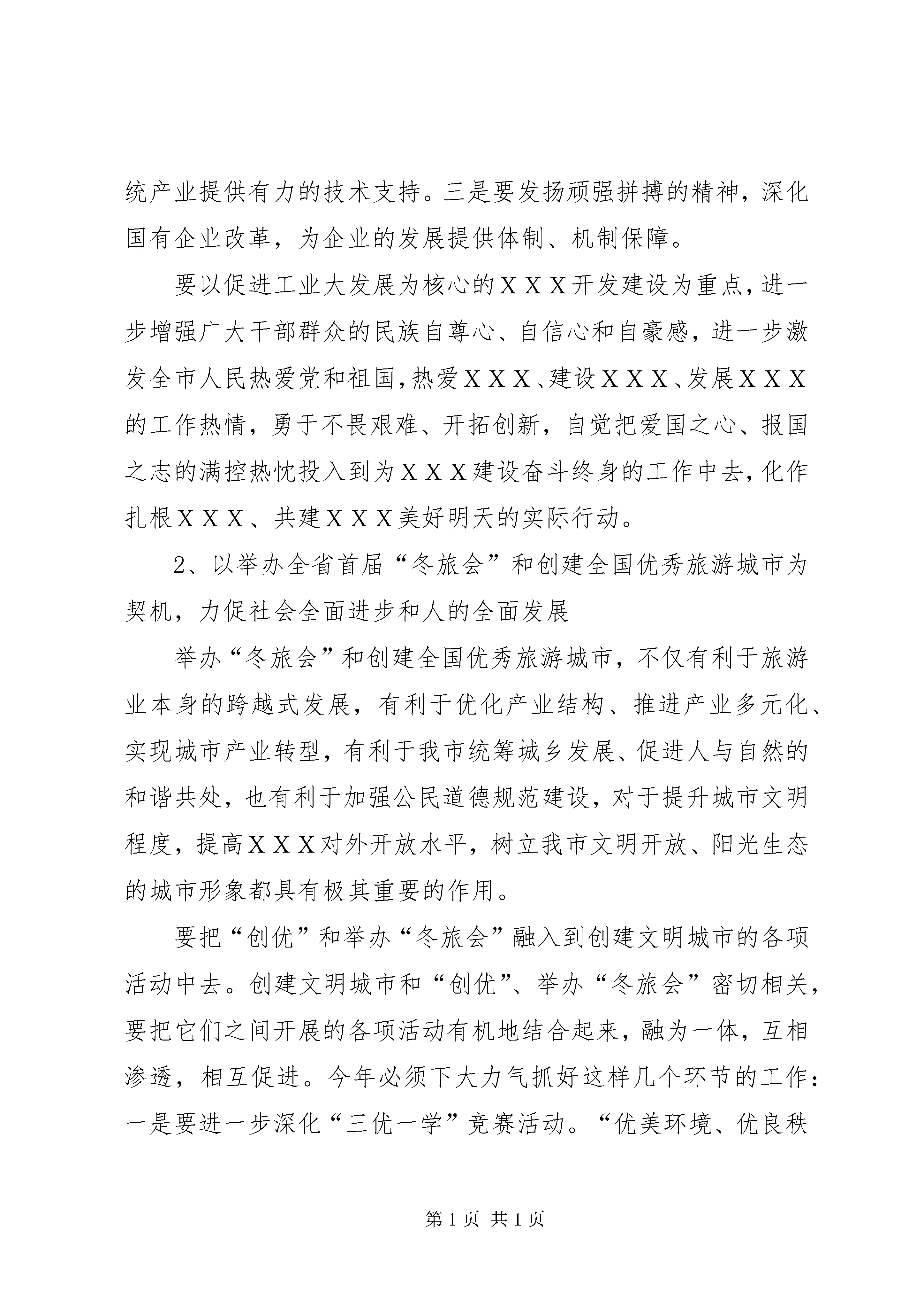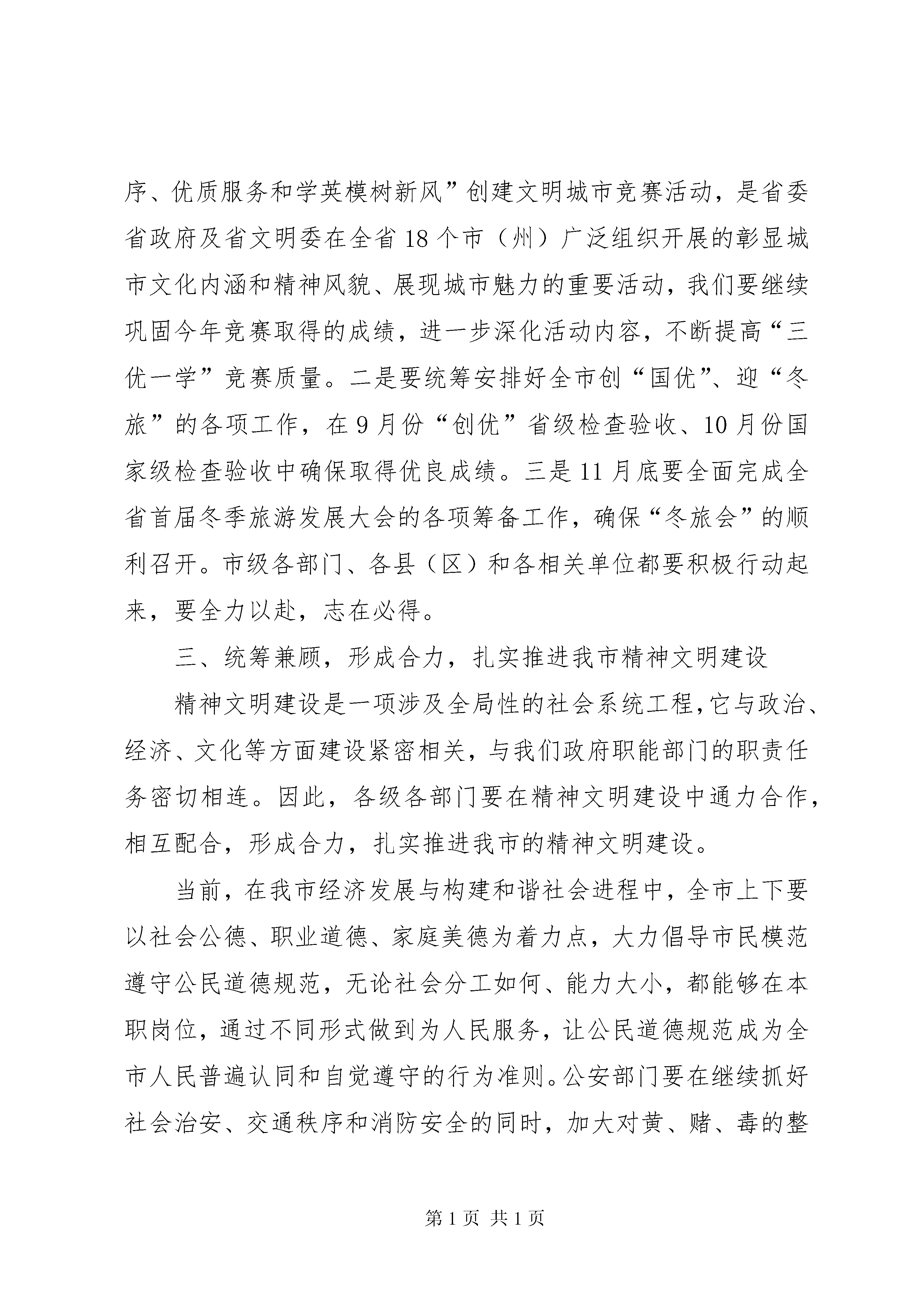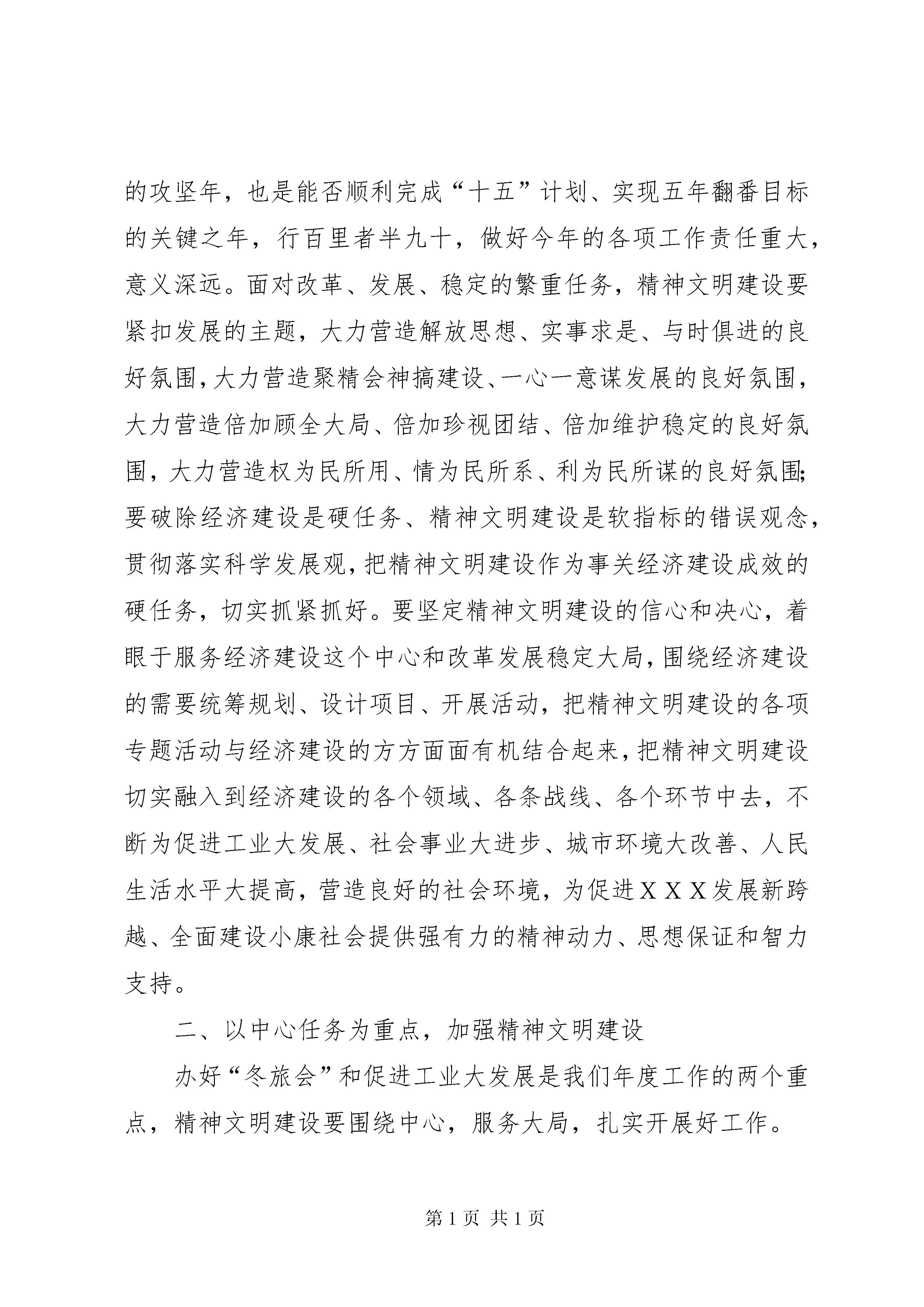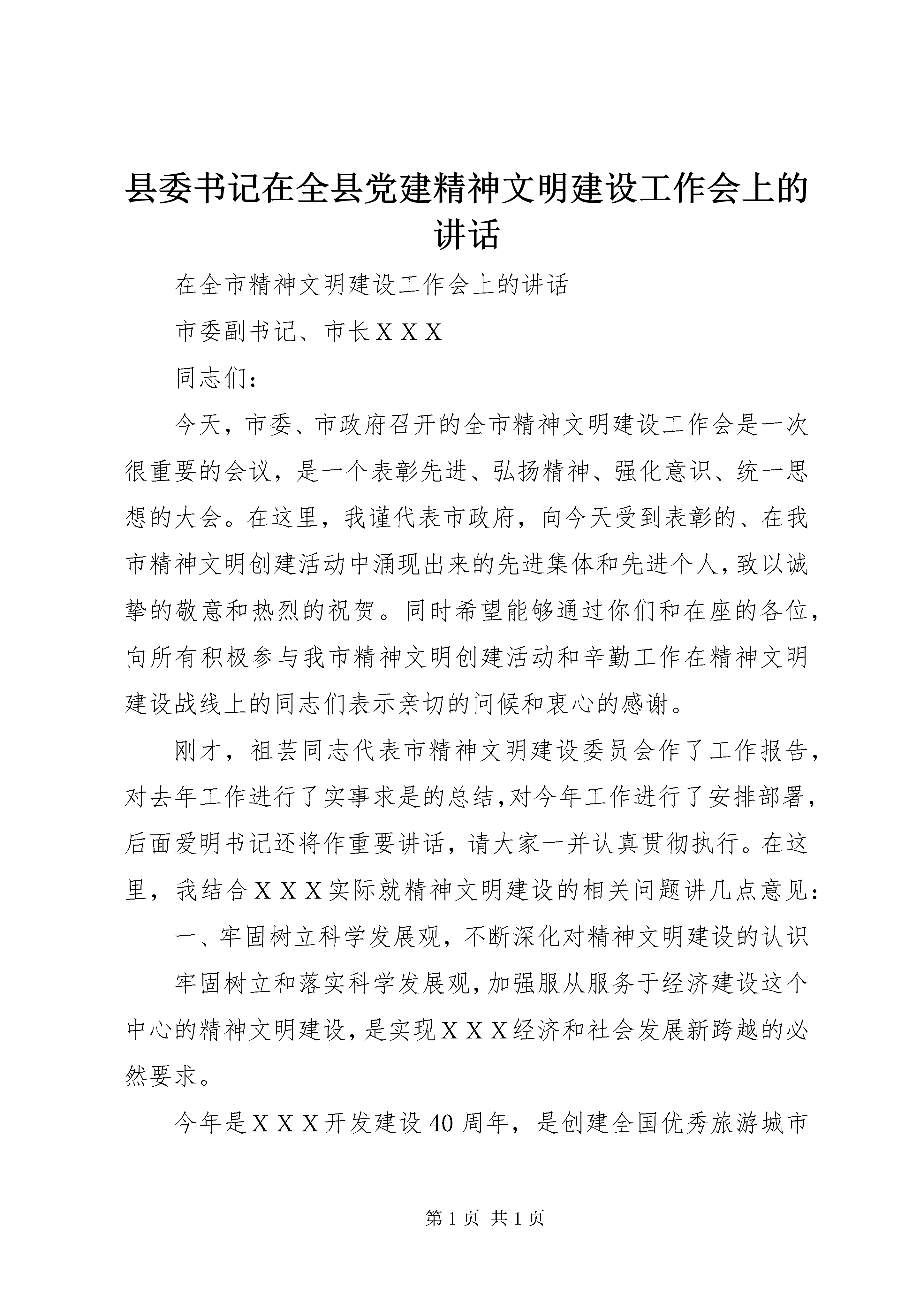 县委书记在全县党建精神文明建设工作会上的讲话在全市精神文明建设工作会上的讲话市委副书记、市长XXX同志们:今天,市委、市政府召开的全市精神文明建设工作会是一次很重要的会议,是一个表彰先进、弘扬精神、强化意识、统一思想的大会。在这里,我谨代表市政府,向今天受到表彰的、在我市精神文明创建活动中涌现出来的先进集体和先进个人,致以诚挚的敬意和热烈的祝贺。同时希望能够通过你们和在座的各位,向所有积极参与我市精神文明创建活动和辛勤工作在精神文明建设战线上的同志们表示亲切的问候和衷心的感谢。刚才,祖芸同志代表市精神文明建设委员会作了工作报告,对去年工作进行了实事求是的总结,对今年工作进行了安排部署,后面爱明书记还将作重要讲话,请大家一并认真贯彻执行。在这里,我结合XXX实际就精神文明建设的相关问题讲几点意见:一、牢固树立科学发展观,不断深化对精神文明建设的认识牢固树立和落实科学发展观,加强服从服务于经济建设这个中心的精神文明建设,是实现XXX经济和社会发展新跨越的必然要求。今年是XXX开发建设40周年,是创建全国优秀旅游城市的攻坚年,也是能否顺利完成“十五”计划、实现五年翻番目标的关键之年,行百里者半九十,做好今年的各项工作责任重大,意义深远。面对改革、发展、稳定的繁重任务,精神文明建设要紧扣发展的主题,大力营造解放思想、实事求是、与时俱进的良好氛围,大力营造聚精会神搞建设、一心一意谋发展的良好氛围,大力营造倍加顾全大局、倍加珍视团结、倍加维护稳定的良好氛围,大力营造权为民所用、情为民所系、利为民所谋的良好氛围;要破除经济建设是硬任务、精神文明建设是软指标的错误观念,贯彻落实科学发展观,把精神文明建设作为事关经济建设成效的硬任务,切实抓紧抓好。要坚定精神文明建设的信心和决心,着眼于服务经济建设这个中心和改革发展稳定大局,围绕经济建设的需要统筹规划、设计项目、开展活动,把精神文明建设的各项专题活动与经济建设的方方面面有机结合起来,把精神文明建设切实融入到经济建设的各个领域、各条战线、各个环节中去,不断为促进工业大发展、社会事业大进步、城市环境大改善、人民生活水平大提高,营造良好的社会环境,为促进XXX发展新跨越、全面建设小康社会提供强有力的精神动力、思想保证和智力支持。二、以中心任务为重点,加强精神文明建设办好“冬旅会”和促进工业大发展是我们年度工作的两个重点,精神文明建设要围绕中心,服务大局,扎实开展好工作。1、以促进工业大发展为中心,弘扬民族精神,发扬XXX精神经过40年的开发建设,XXX从一个不毛之地,发展成为中国西部地区重要的钢铁、钒钛、能源基地,实现了历史性的巨大跨越。纵观XXX开发建设史,是一部艰苦奋斗的创业史,是XXX人经受严峻考验取得胜利的英雄史,更是XXX人民在党的领导下,成功开发和合理利用自然资源的实践史。而XXX精神是对这一切的高度凝炼与概括,是弘扬民族精神的生动体现。在我市力促工业大发展的现阶段,面对决定我市工业能否延伸产业链做大做强、怎样通过以经济增长方式的根本性转变来推动现有经济结构改造等一系列困难与挑战,如产业结构存在严重的雷同性、在知识技术结构方面存在缺乏支撑产业突破性发展的自主知识产权和先进适用技术等,怎样直面挑战,克服一切,有没有强有力的精神动力作保障就显得尤为重要。要以促进工业大发展为核心的XXX开发建设作为精神文明建设的工作重点,大力弘扬和培育以爱国主义为核心的民族精神,大力弘扬和培育以改革创新为核心的时代精神,继承和发扬以艰苦创业为核心的XXX精神。一是要以创新的时代精神,敢于打破常规,勇于突破常态,积极研究工业大发展的新理念;二是要发扬艰苦奋斗的精神,勇于攀登科学的颠峰,敢于攻尖克难,努力为大力发展特色高新技术产业以及用高新技术改造提升传统产业提供有力的技术支持。三是要发扬顽强拼搏的精神,深化国有企业改革,为企业的发展提供体制、机制保障。要以促进工业大发展为核心的XXX开发建设为重点,进一步增强广大干部群众的民族自尊心、自信心和自豪感,进一步激发全市人民热爱党和祖国,热爱XXX、建设XXX、发展XXX的工作热情,勇于不畏艰难、开拓创新,自觉把爱国之心、报国之志的满控热忱投入到为XXX建设奋斗终身的工作中去,化作扎根XXX、共建XXX美好明天的实际行动。2、以举办全省首届“冬旅会”和创建全国优秀旅游城市为契机,力促社会全面进步和人的全面发展举办“冬旅会”和创建全国优秀旅游城市,不仅有利于旅游业本身的跨越式发展,有利于优化产业结构、推进产业多元化、实现城市产业转型,有利于我市统筹城乡发展、促进人与自然的和谐共处,也有利于加强公民道德规范建设,对于提升城市文明程度,提高XXX对外开放水平,树立我市文明开放、阳光生态的城市形象都具有极其重要的作用。要把“创优”和举办“冬旅会”融入到