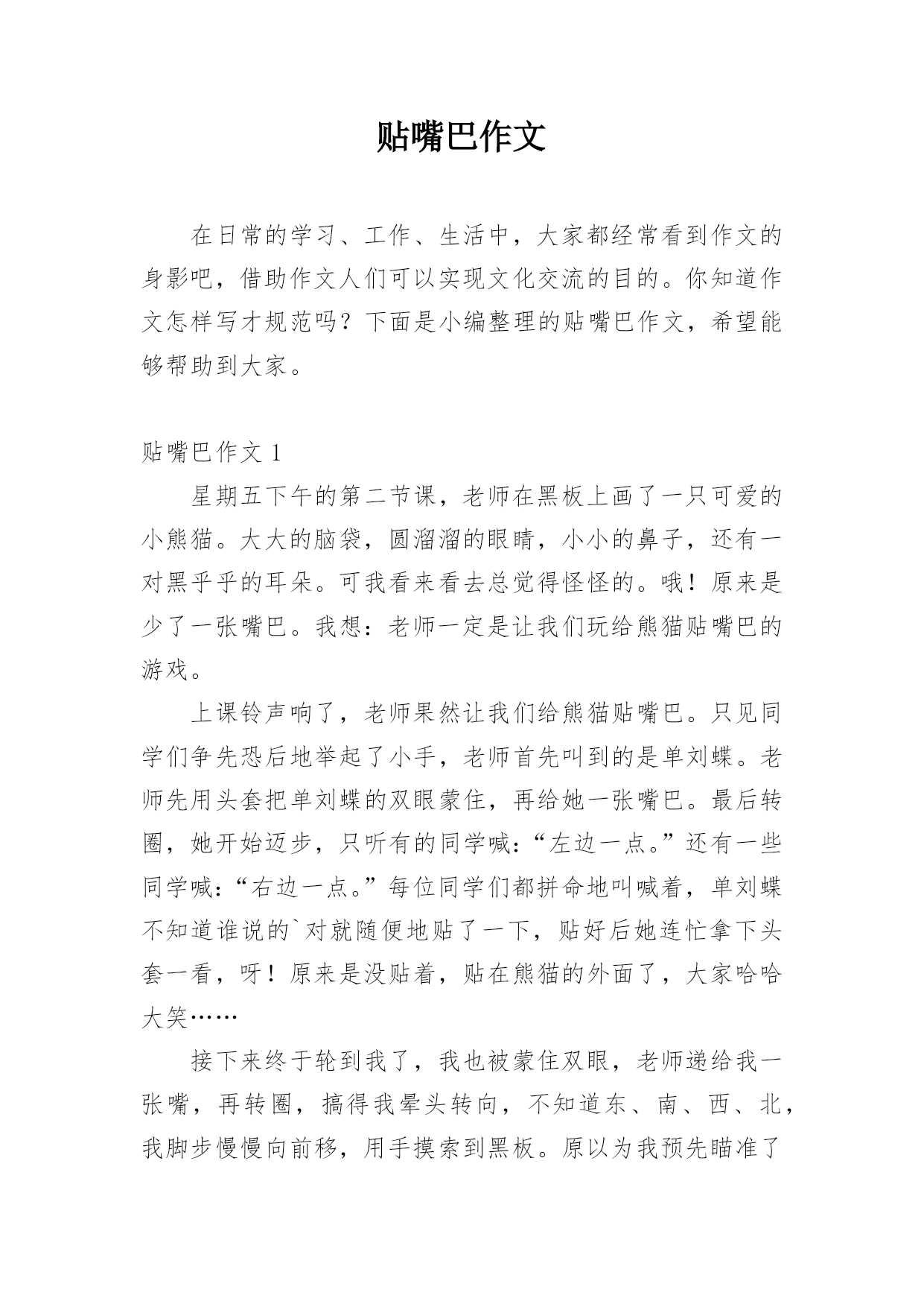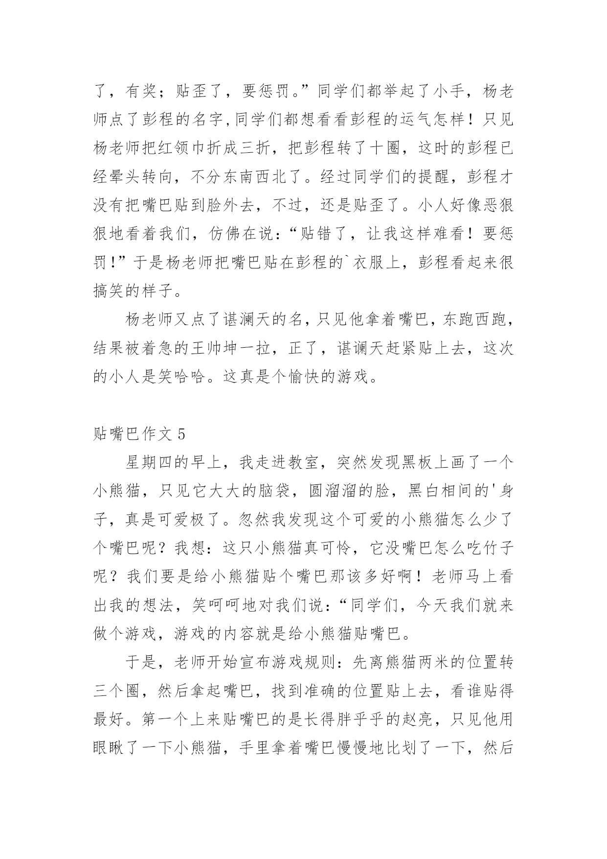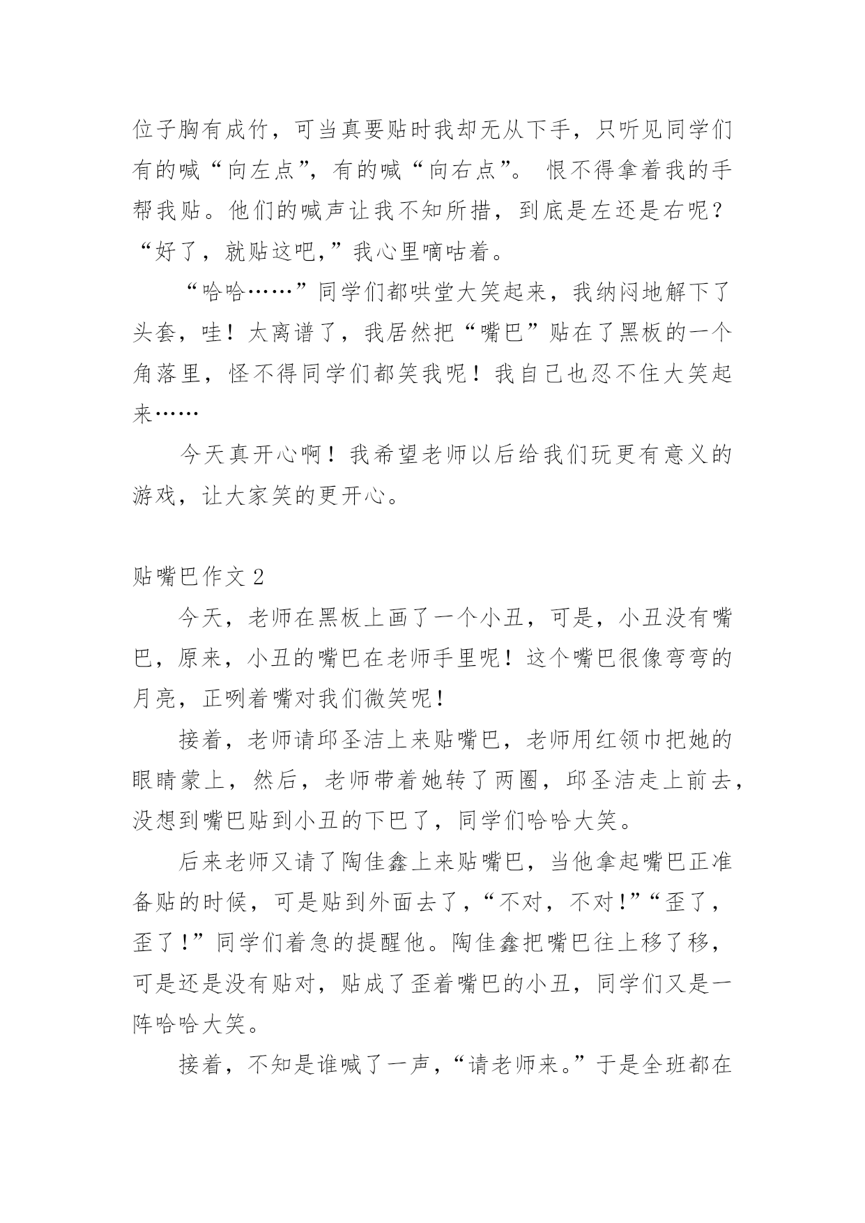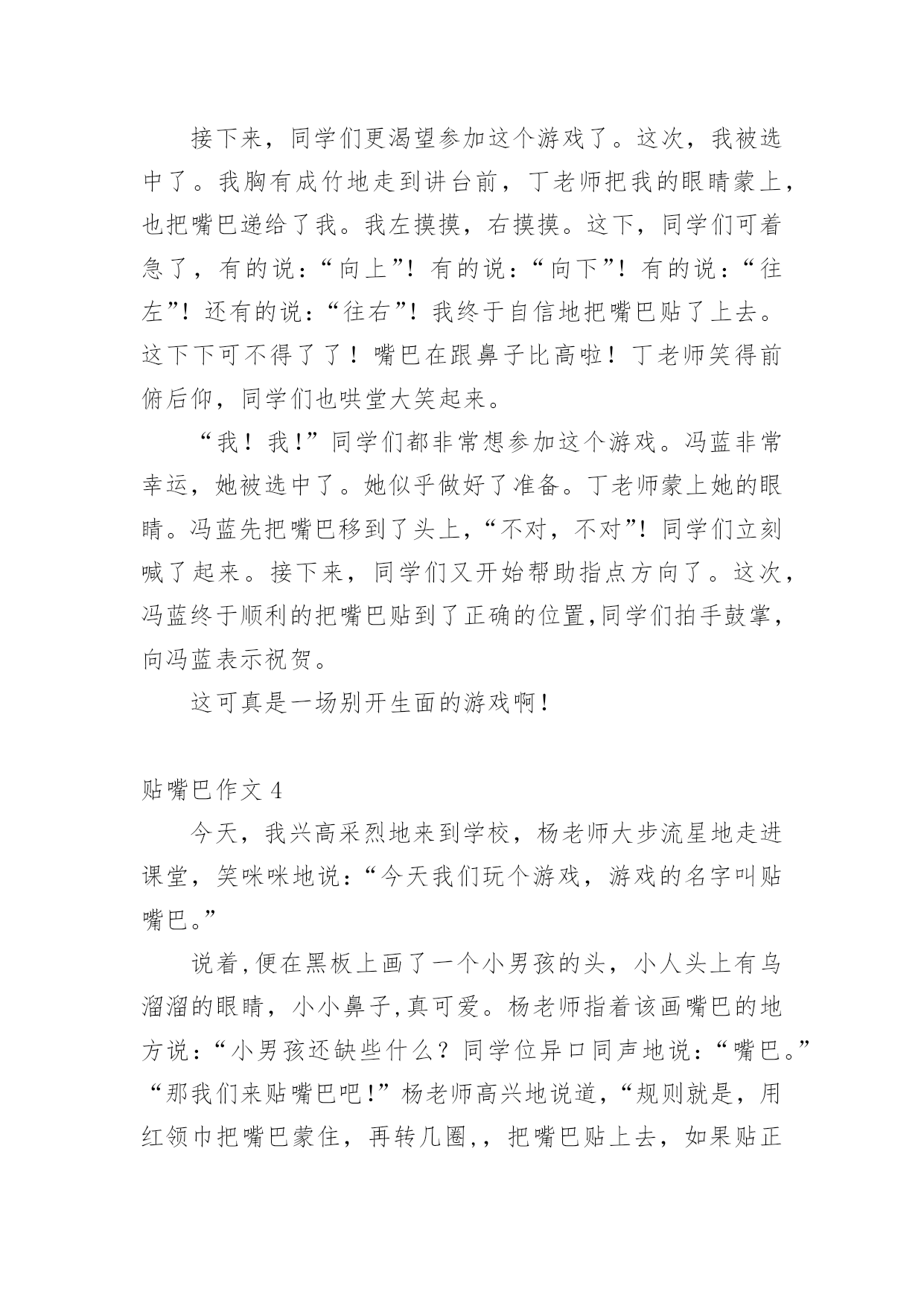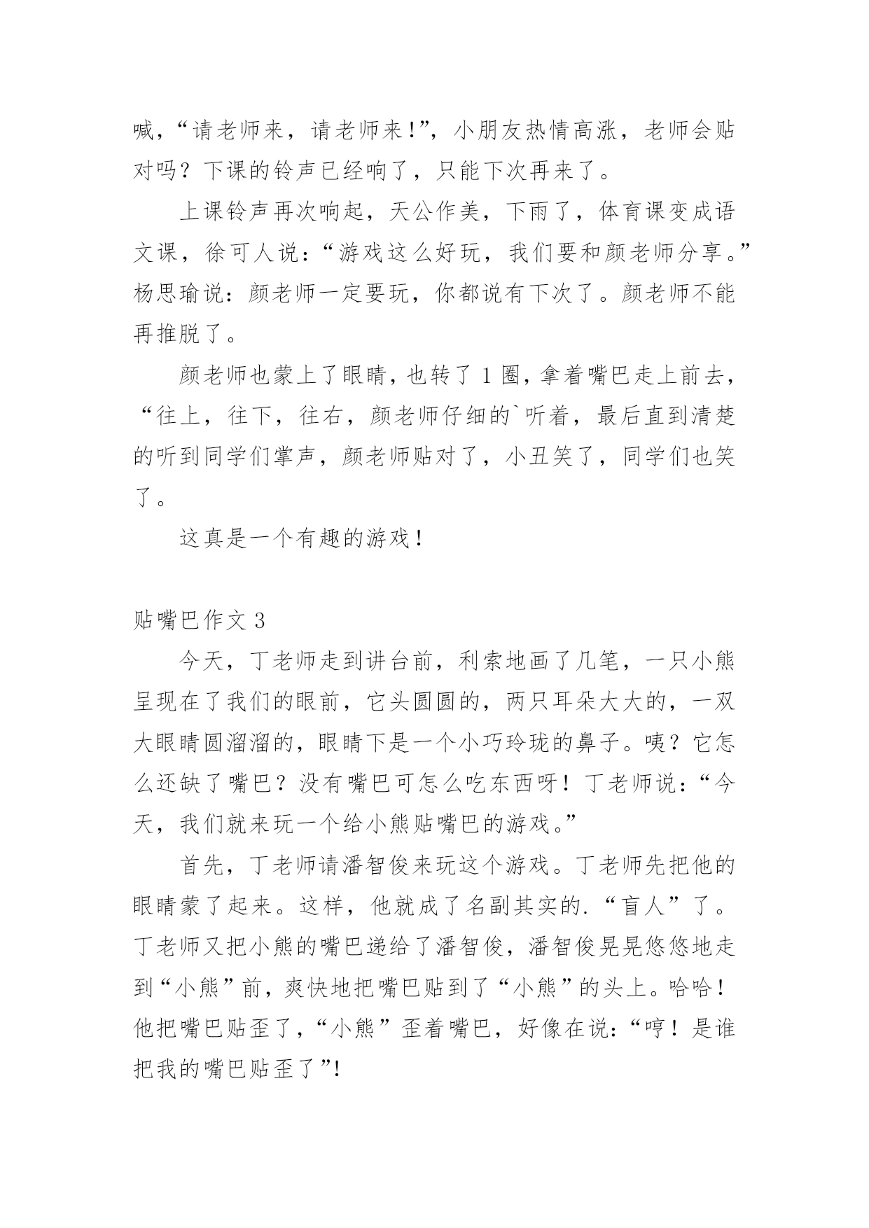 贴嘴巴作文 在日常的学习、工作、生活中,大家都经常看到作文的身影吧,借助作文人们可以实现文化交流的目的。你知道作文怎样写才规范吗?下面是小编整理的贴嘴巴作文,希望能够帮助到大家。贴嘴巴作文1星期五下午的第二节课,老师在黑板上画了一只可爱的小熊猫。大大的脑袋,圆溜溜的眼睛,小小的鼻子,还有一对黑乎乎的耳朵。可我看来看去总觉得怪怪的。哦!原来是少了一张嘴巴。我想:老师一定是让我们玩给熊猫贴嘴巴的游戏。上课铃声响了,老师果然让我们给熊猫贴嘴巴。只见同学们争先恐后地举起了小手,老师首先叫到的是单刘蝶。老师先用头套把单刘蝶的双眼蒙住,再给她一张嘴巴。最后转圈,她开始迈步,只听有的同学喊:“左边一点。”还有一些同学喊:“右边一点。”每位同学们都拼命地叫喊着,单刘蝶不知道谁说的`对就随便地贴了一下,贴好后她连忙拿下头套一看,呀!原来是没贴着,贴在熊猫的外面了,大家哈哈大笑……接下来终于轮到我了,我也被蒙住双眼,老师递给我一张嘴,再转圈,搞得我晕头转向,不知道东、南、西、北,我脚步慢慢向前移,用手摸索到黑板。原以为我预先瞄准了位子胸有成竹,可当真要贴时我却无从下手,只听见同学们有的喊“向左点”,有的喊“向右点”。恨不得拿着我的手帮我贴。他们的喊声让我不知所措,到底是左还是右呢?“好了,就贴这吧,”我心里嘀咕着。“哈哈……”同学们都哄堂大笑起来,我纳闷地解下了头套,哇!太离谱了,我居然把“嘴巴”贴在了黑板的一个角落里,怪不得同学们都笑我呢!我自己也忍不住大笑起来……今天真开心啊!我希望老师以后给我们玩更有意义的游戏,让大家笑的更开心。贴嘴巴作文2今天,老师在黑板上画了一个小丑,可是,小丑没有嘴巴,原来,小丑的嘴巴在老师手里呢!这个嘴巴很像弯弯的月亮,正咧着嘴对我们微笑呢!接着,老师请邱圣洁上来贴嘴巴,老师用红领巾把她的眼睛蒙上,然后,老师带着她转了两圈,邱圣洁走上前去,没想到嘴巴贴到小丑的下巴了,同学们哈哈大笑。后来老师又请了陶佳鑫上来贴嘴巴,当他拿起嘴巴正准备贴的时候,可是贴到外面去了,“不对,不对!”“歪了,歪了!”同学们着急的提醒他。陶佳鑫把嘴巴往上移了移,可是还是没有贴对,贴成了歪着嘴巴的小丑,同学们又是一阵哈哈大笑。接着,不知是谁喊了一声,“请老师来。”于是全班都在喊,“请老师来,请老师来!”,小朋友热情高涨,老师会贴对吗?下课的铃声已经响了,只能下次再来了。上课铃声再次响起,天公作美,下雨了,体育课变成语文课,徐可人说:“游戏这么好玩,我们要和颜老师分享。”杨思瑜说:颜老师一定要玩,你都说有下次了。颜老师不能再推脱了。颜老师也蒙上了眼睛,也转了1圈,拿着嘴巴走上前去,“往上,往下,往右,颜老师仔细的`听着,最后直到清楚的听到同学们掌声,颜老师贴对了,小丑笑了,同学们也笑了。这真是一个有趣的游戏!贴嘴巴作文3今天,丁老师走到讲台前,利索地画了几笔,一只小熊呈现在了我们的眼前,它头圆圆的,两只耳朵大大的,一双大眼睛圆溜溜的,眼睛下是一个小巧玲珑的鼻子。咦?它怎么还缺了嘴巴?没有嘴巴可怎么吃东西呀!丁老师说:“今天,我们就来玩一个给小熊贴嘴巴的游戏。”首先,丁老师请潘智俊来玩这个游戏。丁老师先把他的眼睛蒙了起来。这样,他就成了名副其实的.“盲人”了。丁老师又把小熊的嘴巴递给了潘智俊,潘智俊晃晃悠悠地走到“小熊”前,爽快地把嘴巴贴到了“小熊”的头上。哈哈!他把嘴巴贴歪了,“小熊”歪着嘴巴,好像在说:“哼!是谁把我的嘴巴贴歪了”!接下来,同学们更渴望参加这个游戏了。这次,我被选中了。我胸有成竹地走到讲台前,丁老师把我的眼睛蒙上,也把嘴巴递给了我。我左摸摸,右摸摸。这下,同学们可着急了,有的说:“向上”!有的说:“向下”!有的说:“往左”!还有的说:“往右”!我终于自信地把嘴巴贴了上去。这下下可不得了了!嘴巴在跟鼻子比高啦!丁老师笑得前俯后仰,同学们也哄堂大笑起来。“我!我!”同学们都非常想参加这个游戏。冯蓝非常幸运,她被选中了。她似乎做好了准备。丁老师蒙上她的眼睛。冯蓝先把嘴巴移到了头上,“不对,不对”!同学们立刻喊了起来。接下来,同学们又开始帮助指点方向了。这次,冯蓝终于顺利的把嘴巴贴到了正确的位置,同学们拍手鼓掌,向冯蓝表示祝贺。这可真是一场别开生面的游戏啊!贴嘴巴作文4今天,我兴高采烈地来到学校,杨老师大步流星地走进课堂,笑咪咪地说:“今天我们玩个游戏,游戏的名字叫贴嘴巴。”说着,便在黑板上画了一个小男孩的头,小人头上有乌溜溜的眼睛,小小鼻子,真可爱。杨老师指着该画嘴巴的地方说:“小男孩还缺些什么?同学位异口同声地说:“嘴巴。”“那我们来贴嘴巴吧!”杨老师高兴地说道,“规则就是,用红领巾把嘴巴蒙住,再转几圈,,把嘴巴贴上去,如果贴正了,有奖;贴歪了,要惩罚。”同学们都举起了小手,杨老师点了彭程的名字,同学们都想看看彭程的运气怎样!只见