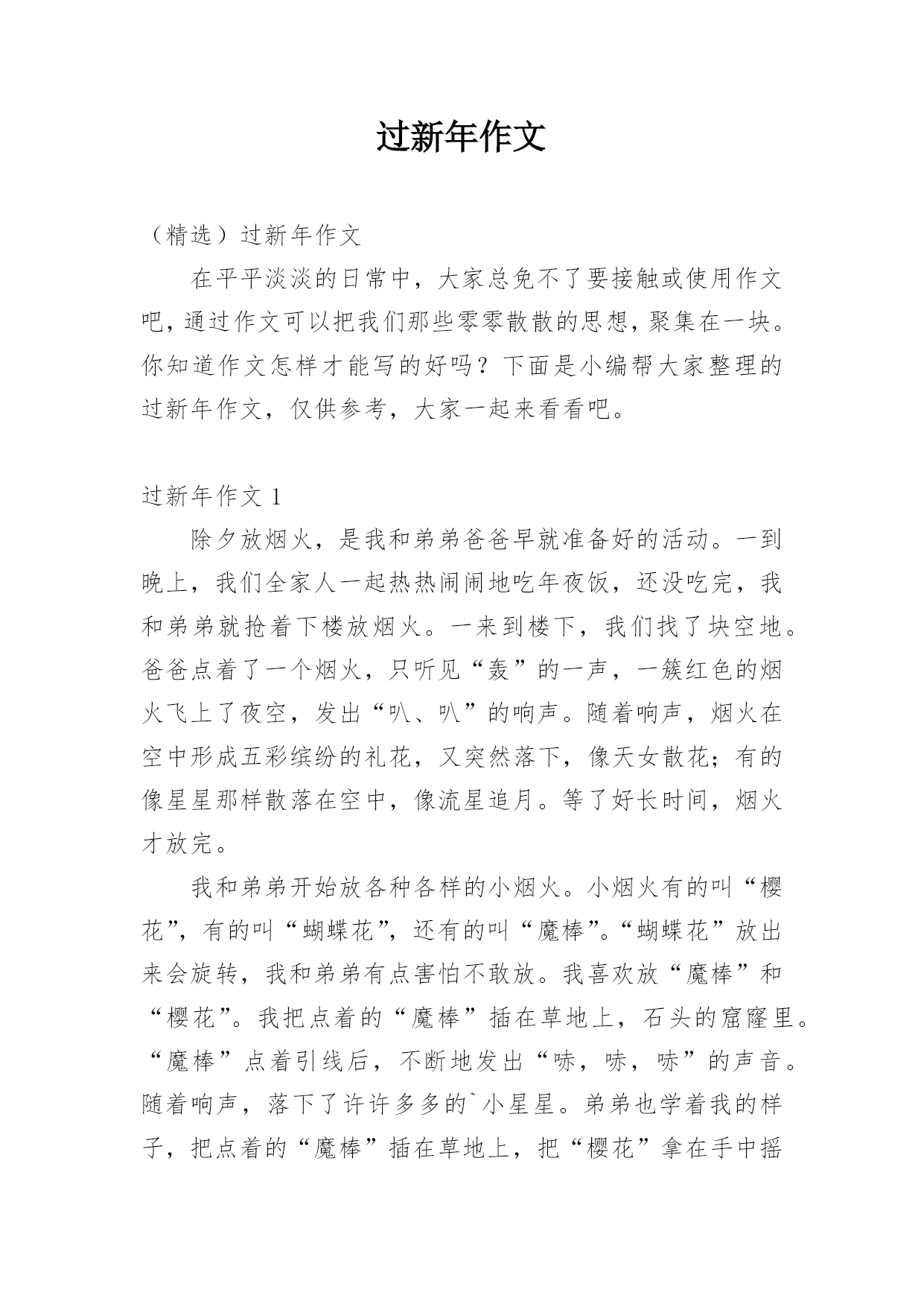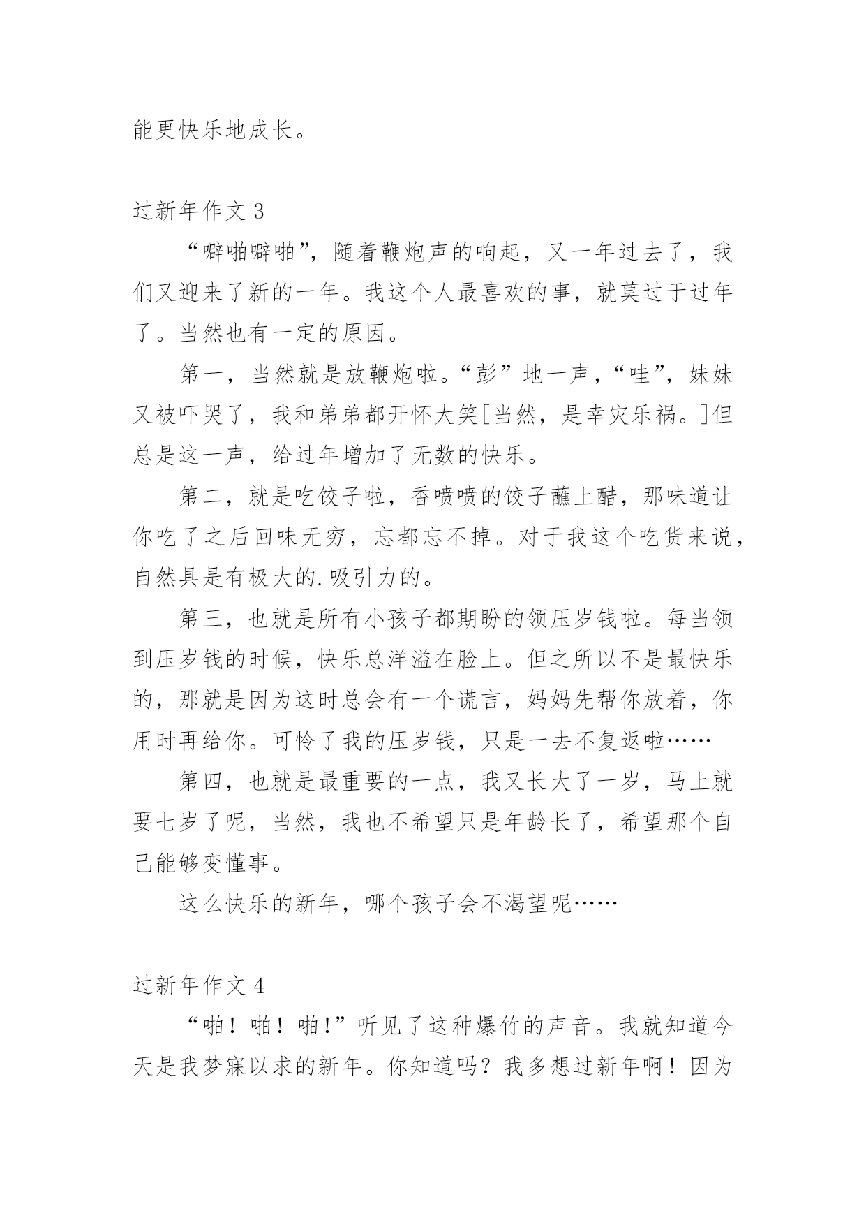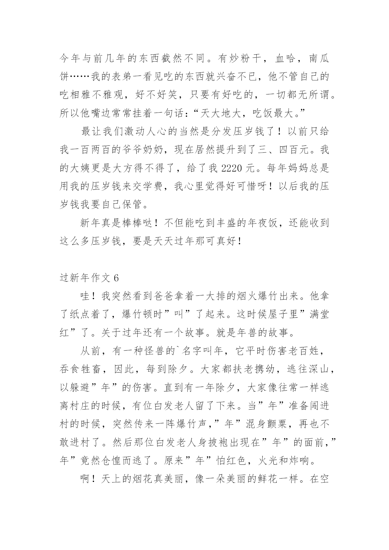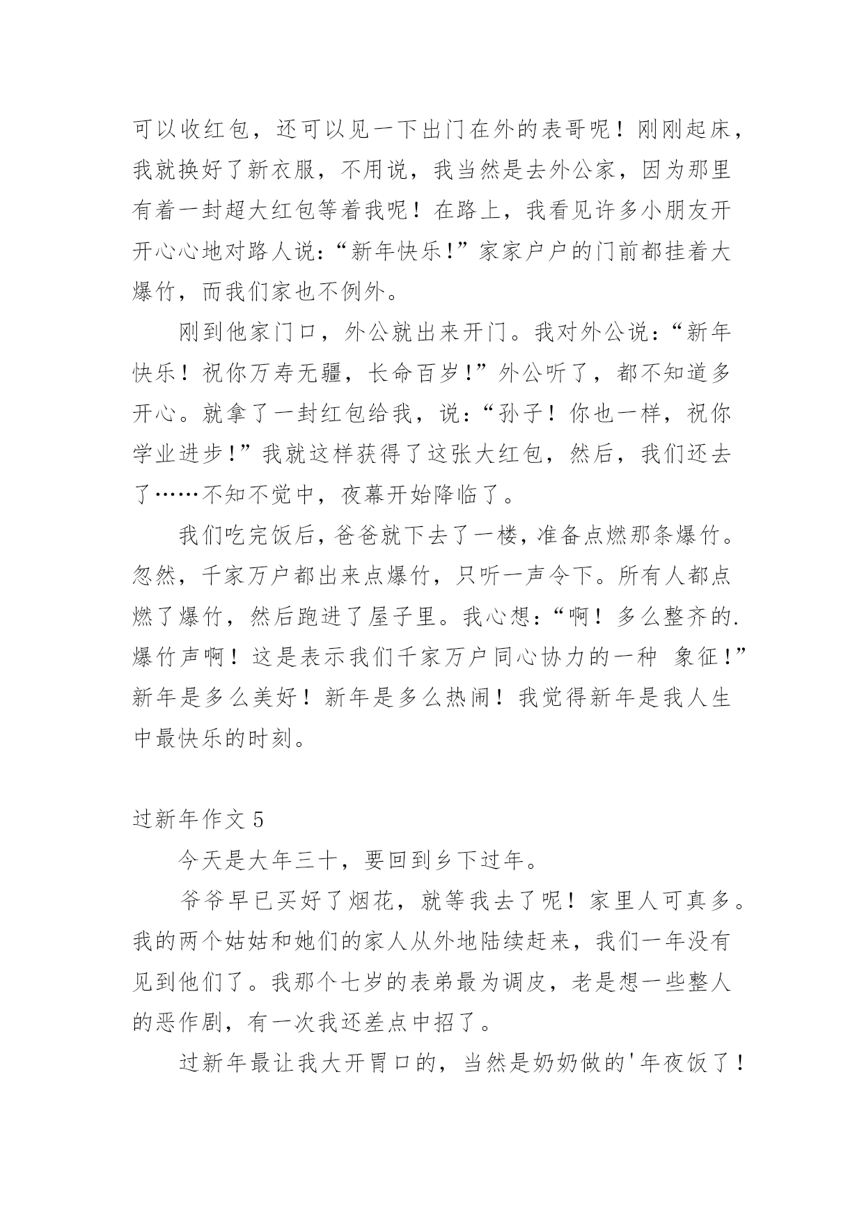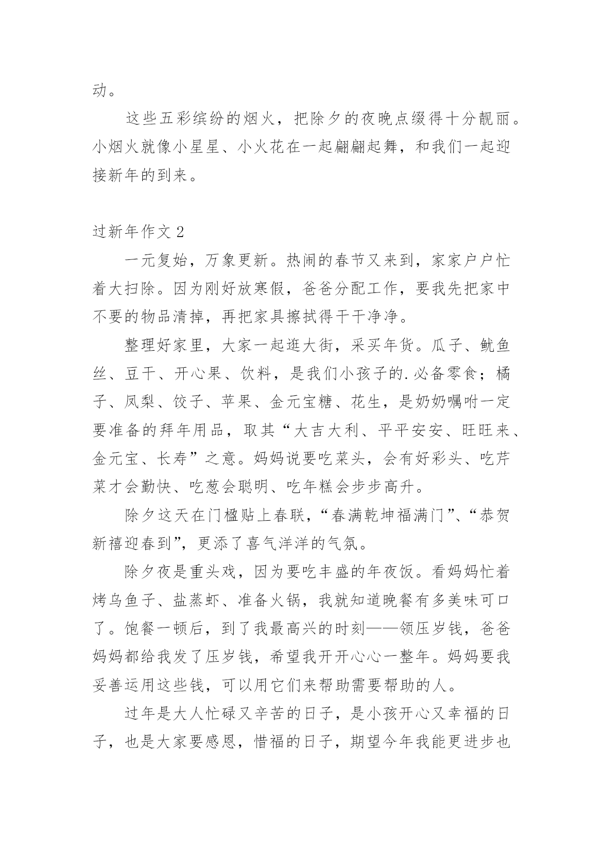 过新年作文 (精选)过新年作文在平平淡淡的日常中,大家总免不了要接触或使用作文吧,通过作文可以把我们那些零零散散的思想,聚集在一块。你知道作文怎样才能写的好吗?下面是小编帮大家整理的过新年作文,仅供参考,大家一起来看看吧。过新年作文1除夕放烟火,是我和弟弟爸爸早就准备好的活动。一到晚上,我们全家人一起热热闹闹地吃年夜饭,还没吃完,我和弟弟就抢着下楼放烟火。一来到楼下,我们找了块空地。爸爸点着了一个烟火,只听见“轰”的一声,一簇红色的烟火飞上了夜空,发出“叭、叭”的响声。随着响声,烟火在空中形成五彩缤纷的礼花,又突然落下,像天女散花;有的像星星那样散落在空中,像流星追月。等了好长时间,烟火才放完。我和弟弟开始放各种各样的小烟火。小烟火有的叫“樱花”,有的叫“蝴蝶花”,还有的叫“魔棒”。“蝴蝶花”放出来会旋转,我和弟弟有点害怕不敢放。我喜欢放“魔棒”和“樱花”。我把点着的“魔棒”插在草地上,石头的窟窿里。“魔棒”点着引线后,不断地发出“哧,哧,哧”的声音。随着响声,落下了许许多多的`小星星。弟弟也学着我的样子,把点着的“魔棒”插在草地上,把“樱花”拿在手中摇动。这些五彩缤纷的烟火,把除夕的夜晚点缀得十分靓丽。小烟火就像小星星、小火花在一起翩翩起舞,和我们一起迎接新年的到来。过新年作文2一元复始,万象更新。热闹的春节又来到,家家户户忙着大扫除。因为刚好放寒假,爸爸分配工作,要我先把家中不要的物品清掉,再把家具擦拭得干干净净。整理好家里,大家一起逛大街,采买年货。瓜子、鱿鱼丝、豆干、开心果、饮料,是我们小孩子的.必备零食;橘子、凤梨、饺子、苹果、金元宝糖、花生,是奶奶嘱咐一定要准备的拜年用品,取其“大吉大利、平平安安、旺旺来、金元宝、长寿”之意。妈妈说要吃菜头,会有好彩头、吃芹菜才会勤快、吃葱会聪明、吃年糕会步步高升。除夕这天在门楹贴上春联,“春满乾坤福满门”、“恭贺新禧迎春到”,更添了喜气洋洋的气氛。除夕夜是重头戏,因为要吃丰盛的年夜饭。看妈妈忙着烤乌鱼子、盐蒸虾、准备火锅,我就知道晚餐有多美味可口了。饱餐一顿后,到了我最高兴的时刻——领压岁钱,爸爸妈妈都给我发了压岁钱,希望我开开心心一整年。妈妈要我妥善运用这些钱,可以用它们来帮助需要帮助的人。过年是大人忙碌又辛苦的日子,是小孩开心又幸福的日子,也是大家要感恩,惜福的日子,期望今年我能更进步也能更快乐地成长。过新年作文3“噼啪噼啪”,随着鞭炮声的响起,又一年过去了,我们又迎来了新的一年。我这个人最喜欢的事,就莫过于过年了。当然也有一定的原因。第一,当然就是放鞭炮啦。“彭”地一声,“哇”,妹妹又被吓哭了,我和弟弟都开怀大笑[当然,是幸灾乐祸。]但总是这一声,给过年增加了无数的快乐。第二,就是吃饺子啦,香喷喷的饺子蘸上醋,那味道让你吃了之后回味无穷,忘都忘不掉。对于我这个吃货来说,自然具是有极大的.吸引力的。第三,也就是所有小孩子都期盼的领压岁钱啦。每当领到压岁钱的时候,快乐总洋溢在脸上。但之所以不是最快乐的,那就是因为这时总会有一个谎言,妈妈先帮你放着,你用时再给你。可怜了我的压岁钱,只是一去不复返啦……第四,也就是最重要的一点,我又长大了一岁,马上就要七岁了呢,当然,我也不希望只是年龄长了,希望那个自己能够变懂事。这么快乐的新年,哪个孩子会不渴望呢……过新年作文4“啪!啪!啪!”听见了这种爆竹的声音。我就知道今天是我梦寐以求的新年。你知道吗?我多想过新年啊!因为可以收红包,还可以见一下出门在外的表哥呢!刚刚起床,我就换好了新衣服,不用说,我当然是去外公家,因为那里有着一封超大红包等着我呢!在路上,我看见许多小朋友开开心心地对路人说:“新年快乐!”家家户户的门前都挂着大爆竹,而我们家也不例外。刚到他家门口,外公就出来开门。我对外公说:“新年快乐!祝你万寿无疆,长命百岁!”外公听了,都不知道多开心。就拿了一封红包给我,说:“孙子!你也一样,祝你学业进步!”我就这样获得了这张大红包,然后,我们还去了……不知不觉中,夜幕开始降临了。我们吃完饭后,爸爸就下去了一楼,准备点燃那条爆竹。忽然,千家万户都出来点爆竹,只听一声令下。所有人都点燃了爆竹,然后跑进了屋子里。我心想:“啊!多么整齐的.爆竹声啊!这是表示我们千家万户同心协力的一种象征!”新年是多么美好!新年是多么热闹!我觉得新年是我人生中最快乐的时刻。过新年作文5今天是大年三十,要回到乡下过年。爷爷早已买好了烟花,就等我去了呢!家里人可真多。我的两个姑姑和她们的家人从外地陆续赶来,我们一年没有见到他们了。我那个七岁的表弟最为调皮,老是想一些整人的恶作剧,有一次我还差点中招了。过新年最让我大开胃口的,当然是奶奶做的'年夜饭了!今年与前几年的东西截然不同。有炒粉干,血哈,南瓜饼……我的表弟一看见吃的东西就兴奋不已,他不管自己的吃相雅不雅观,好