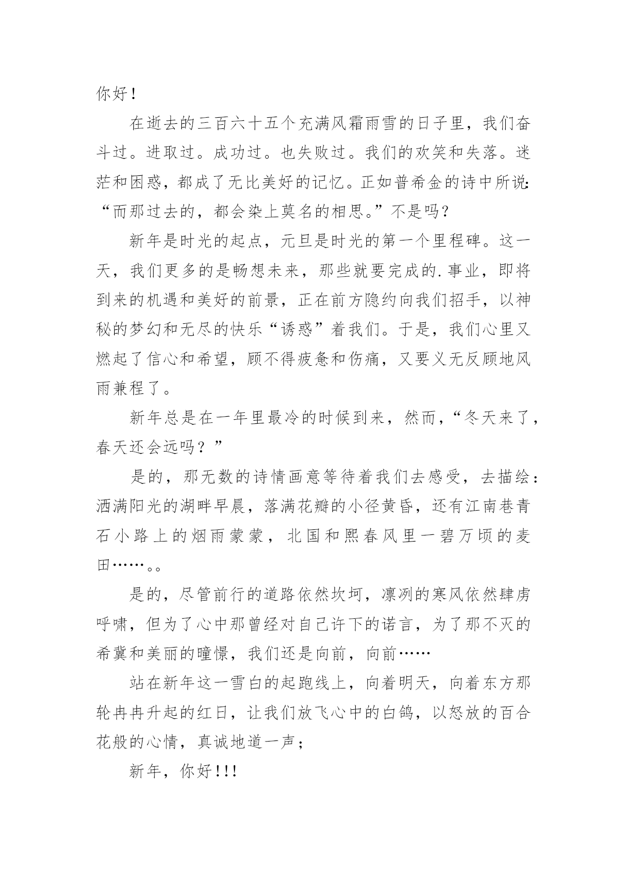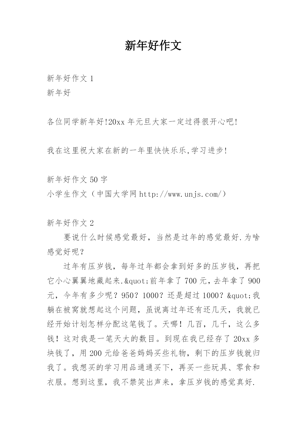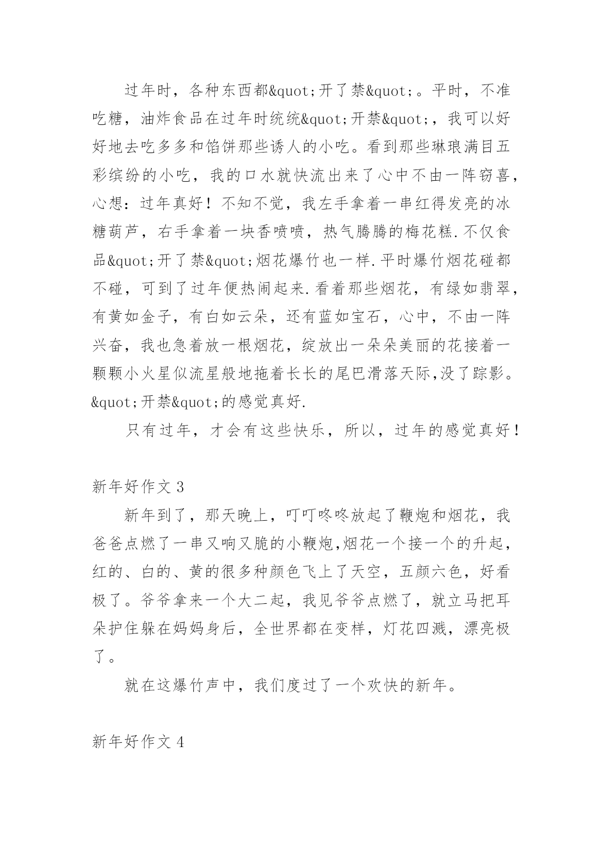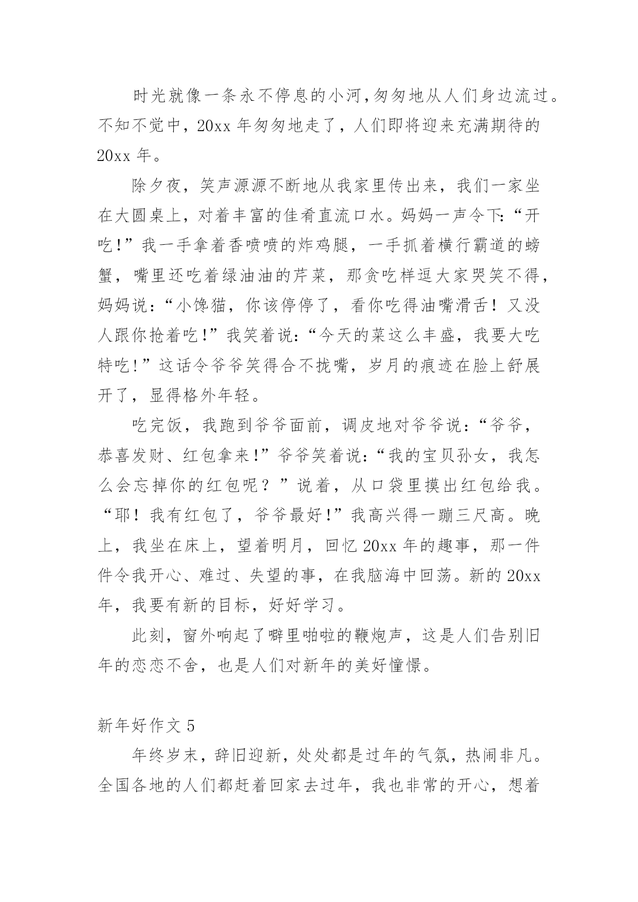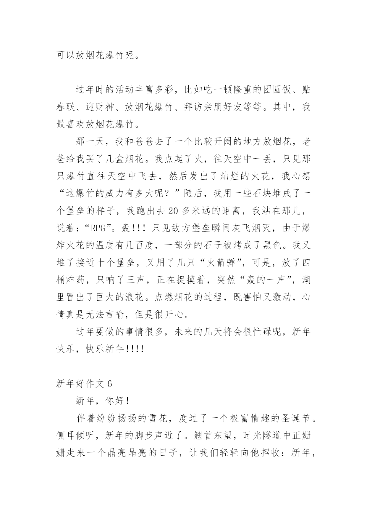 新年好作文 新年好作文1新年好各位同学新年好!20xx年元旦大家一定过得很开心吧!我在这里祝大家在新的一年里快快乐乐,学习进步!新年好作文50字小学生作文(中国大学网http://www.unjs.com/)新年好作文2要说什么时候感觉最好,当然是过年的感觉最好.为啥感觉好呢?过年有压岁钱,每年过年都会拿到好多的压岁钱,再把它小心翼翼地藏起来."前年拿了700元,去年拿了900元,今年有多少呢?950?1000?还是超过1000?"我躺在被窝就想起这个问题,虽说离过年还有还几天,我就已经开始计划怎样分配这笔钱了。天哪!几百,几千,这么多钱!这对我是一笔天大的数目。到现在我已经存了20xx多块钱了,用200元给爸爸妈妈买些礼物,剩下的压岁钱就归我了。我想买的学习用品通通买下,再买一些玩具、零食和衣服。想到这里,我不禁笑出声来,拿压岁钱的感觉真好.过年时,各种东西都"开了禁"。平时,不准吃糖,油炸食品在过年时统统"开禁",我可以好好地去吃多多和馅饼那些诱人的小吃。看到那些琳琅满目五彩缤纷的小吃,我的口水就快流出来了心中不由一阵窃喜,心想:过年真好!不知不觉,我左手拿着一串红得发亮的冰糖葫芦,右手拿着一块香喷喷,热气腾腾的梅花糕.不仅食品"开了禁"烟花爆竹也一样.平时爆竹烟花碰都不碰,可到了过年便热闹起来.看着那些烟花,有绿如翡翠,有黄如金子,有白如云朵,还有蓝如宝石,心中,不由一阵兴奋,我也急着放一根烟花,绽放出一朵朵美丽的花接着一颗颗小火星似流星般地拖着长长的尾巴滑落天际,没了踪影。"开禁"的感觉真好.只有过年,才会有这些快乐,所以,过年的感觉真好!新年好作文3新年到了,那天晚上,叮叮咚咚放起了鞭炮和烟花,我爸爸点燃了一串又响又脆的小鞭炮,烟花一个接一个的升起,红的、白的、黄的很多种颜色飞上了天空,五颜六色,好看极了。爷爷拿来一个大二起,我见爷爷点燃了,就立马把耳朵护住躲在妈妈身后,全世界都在变样,灯花四溅,漂亮极了。就在这爆竹声中,我们度过了一个欢快的新年。新年好作文4时光就像一条永不停息的小河,匆匆地从人们身边流过。不知不觉中,20xx年匆匆地走了,人们即将迎来充满期待的20xx年。除夕夜,笑声源源不断地从我家里传出来,我们一家坐在大圆桌上,对着丰富的佳肴直流口水。妈妈一声令下:“开吃!”我一手拿着香喷喷的炸鸡腿,一手抓着横行霸道的螃蟹,嘴里还吃着绿油油的芹菜,那贪吃样逗大家哭笑不得,妈妈说:“小馋猫,你该停停了,看你吃得油嘴滑舌!又没人跟你抢着吃!”我笑着说:“今天的菜这么丰盛,我要大吃特吃!”这话令爷爷笑得合不拢嘴,岁月的痕迹在脸上舒展开了,显得格外年轻。吃完饭,我跑到爷爷面前,调皮地对爷爷说:“爷爷,恭喜发财、红包拿来!”爷爷笑着说:“我的宝贝孙女,我怎么会忘掉你的红包呢?”说着,从口袋里摸出红包给我。“耶!我有红包了,爷爷最好!”我高兴得一蹦三尺高。晚上,我坐在床上,望着明月,回忆20xx年的趣事,那一件件令我开心、难过、失望的事,在我脑海中回荡。新的20xx年,我要有新的目标,好好学习。此刻,窗外响起了噼里啪啦的鞭炮声,这是人们告别旧年的恋恋不舍,也是人们对新年的美好憧憬。新年好作文5年终岁末,辞旧迎新,处处都是过年的气氛,热闹非凡。全国各地的人们都赶着回家去过年,我也非常的开心,想着可以放烟花爆竹呢。过年时的活动丰富多彩,比如吃一顿隆重的团圆饭、贴春联、迎财神、放烟花爆竹、拜访亲朋好友等等。其中,我最喜欢放烟花爆竹。那一天,我和爸爸去了一个比较开阔的地方放烟花,老爸给我买了几盒烟花。我点起了火,往天空中一丢,只见那只爆竹直往天空中飞去,然后发出了灿烂的火花,我心想“这爆竹的威力有多大呢?”随后,我用一些石块堆成了一个堡垒的样子,我跑出去20多米远的距离,我站在那儿,说着:“RPG”。轰!!!只见敌方堡垒瞬间灰飞烟灭,由于爆炸火花的温度有几百度,一部分的石子被烤成了黑色。我又堆了接近十个堡垒,又用了几只“火箭弹”,可是,放了四桶炸药,只响了三声,正在捉摸着,突然“轰的一声”,湖里冒出了巨大的浪花。点燃烟花的过程,既害怕又激动,心情真是无法言喻,但是很开心。过年要做的事情很多,未来的几天将会很忙碌呢,新年快乐,快乐新年!!!!新年好作文6新年,你好!伴着纷纷扬扬的雪花,度过了一个极富情趣的圣诞节。侧耳倾听,新年的脚步声近了。翘首东望,时光隧道中正姗姗走来一个晶亮晶亮的日子,让我们轻轻向他招收:新年,你好!在逝去的三百六十五个充满风霜雨雪的日子里,我们奋斗过。进取过。成功过。也失败过。我们的欢笑和失落。迷茫和困惑,都成了无比美好的记忆。正如普希金的诗中所说:“而那过去的,都会染上莫名的相思。”不是吗?新年是时光的起点,