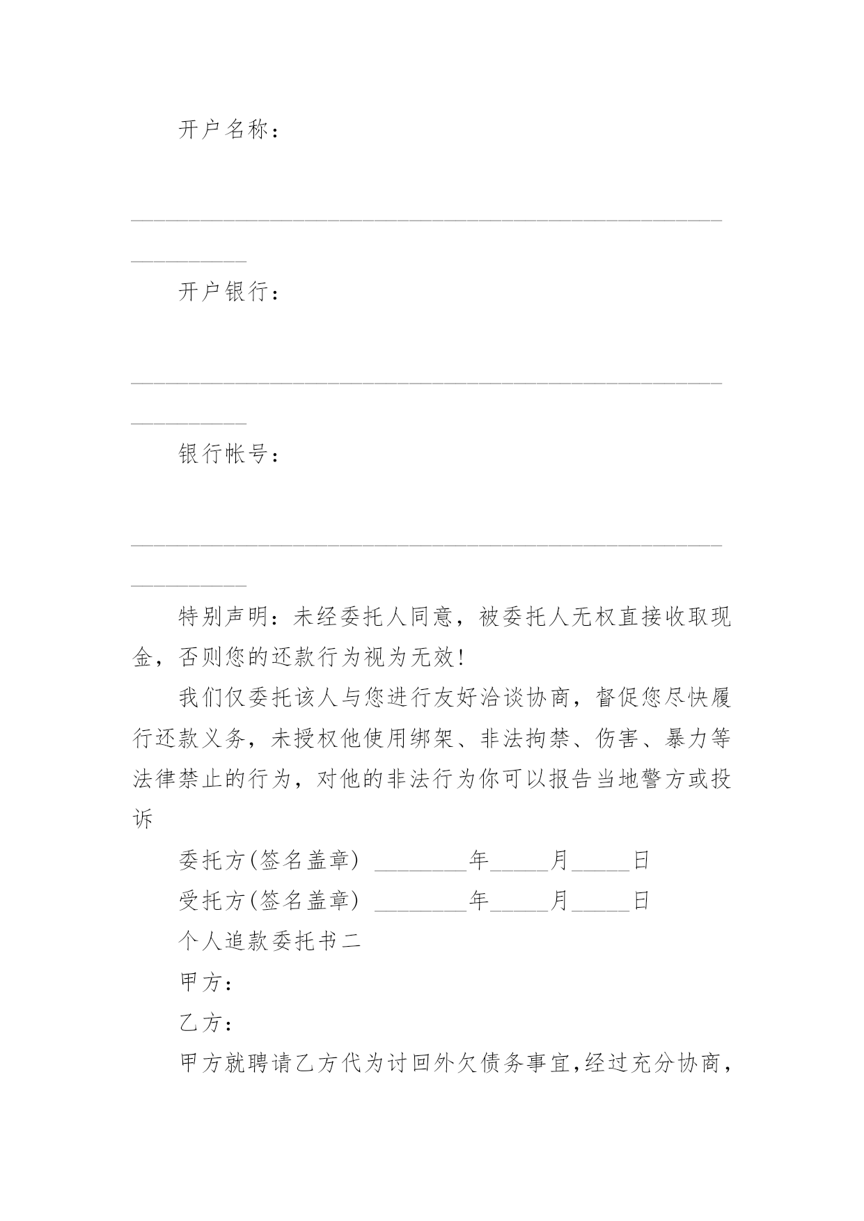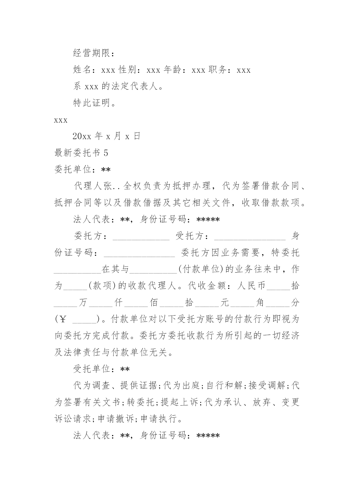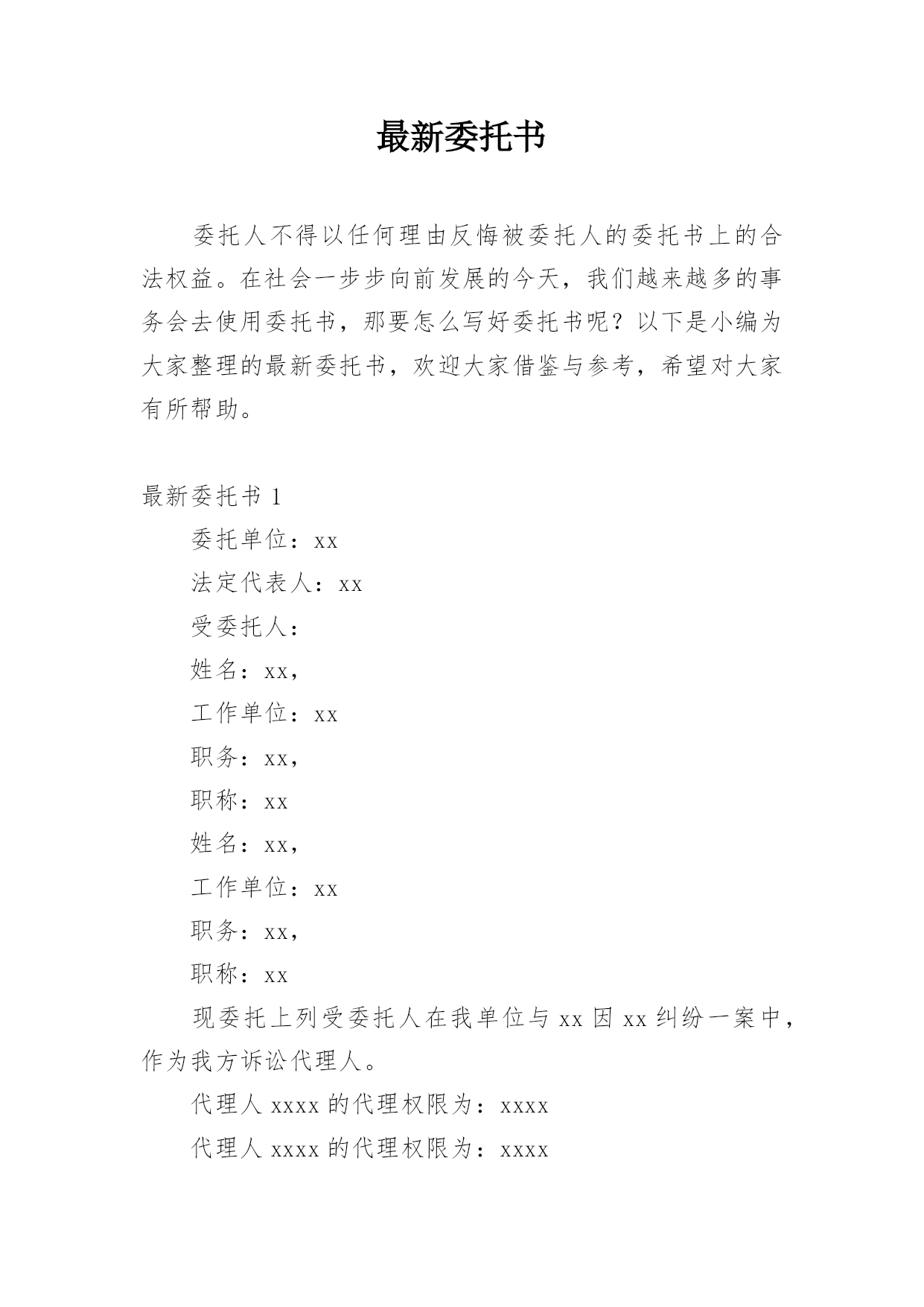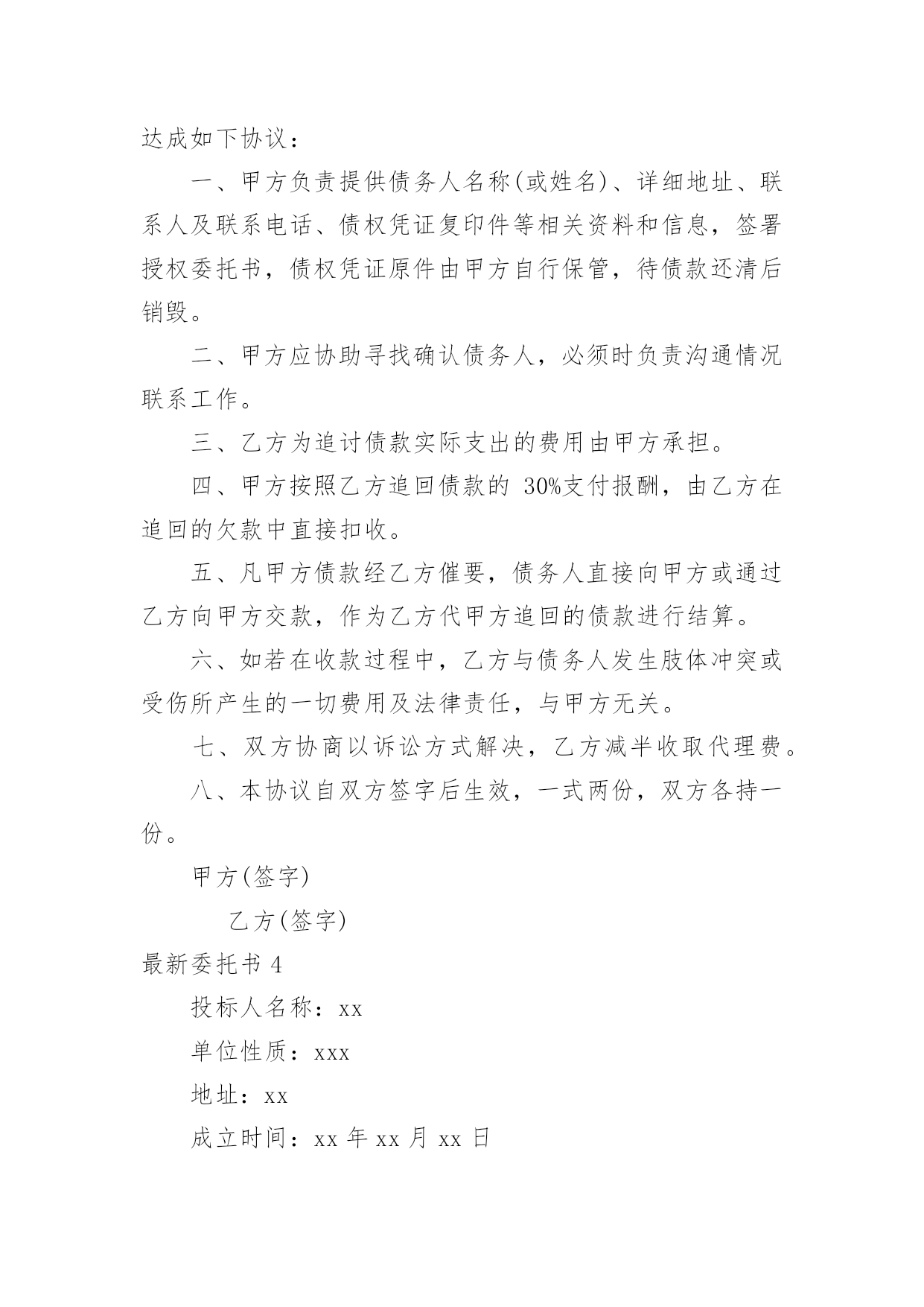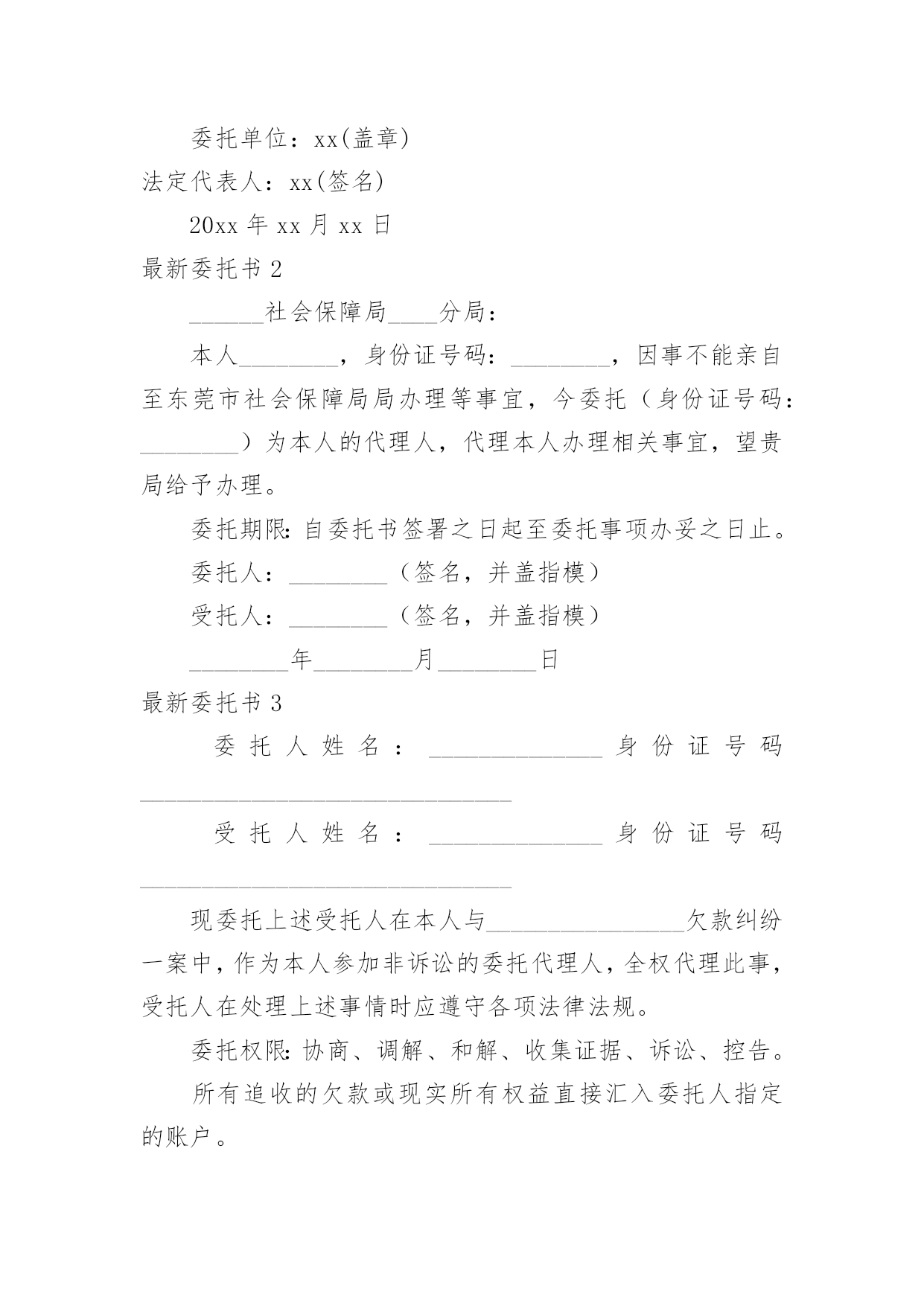 最新委托书 委托人不得以任何理由反悔被委托人的委托书上的合法权益。在社会一步步向前发展的今天,我们越来越多的事务会去使用委托书,那要怎么写好委托书呢?以下是小编为大家整理的最新委托书,欢迎大家借鉴与参考,希望对大家有所帮助。最新委托书1委托单位:xx法定代表人:xx受委托人:姓名:xx,工作单位:xx职务:xx,职称:xx姓名:xx,工作单位:xx职务:xx,职称:xx现委托上列受委托人在我单位与xx因xx纠纷一案中,作为我方诉讼代理人。代理人xxxx的代理权限为:xxxx代理人xxxx的代理权限为:xxxx委托单位:xx(盖章)法定代表人:xx(签名)20xx年xx月xx日最新委托书2______社会保障局____分局:本人________,身份证号码:________,因事不能亲自至东莞市社会保障局局办理等事宜,今委托(身份证号码:________)为本人的代理人,代理本人办理相关事宜,望贵局给予办理。委托期限:自委托书签署之日起至委托事项办妥之日止。委托人:________(签名,并盖指模)受托人:________(签名,并盖指模)________年________月________日最新委托书3委托人姓名:______________身份证号码______________________________受托人姓名:______________身份证号码______________________________现委托上述受托人在本人与________________欠款纠纷一案中,作为本人参加非诉讼的委托代理人,全权代理此事,受托人在处理上述事情时应遵守各项法律法规。委托权限:协商、调解、和解、收集证据、诉讼、控告。所有追收的欠款或现实所有权益直接汇入委托人指定的账户。开户名称:_____________________________________________________________开户银行:_____________________________________________________________银行帐号:_____________________________________________________________特别声明:未经委托人同意,被委托人无权直接收取现金,否则您的还款行为视为无效!我们仅委托该人与您进行友好洽谈协商,督促您尽快履行还款义务,未授权他使用绑架、非法拘禁、伤害、暴力等法律禁止的行为,对他的非法行为你可以报告当地警方或投诉委托方(签名盖章)________年_____月_____日受托方(签名盖章)________年_____月_____日个人追款委托书二甲方:乙方:甲方就聘请乙方代为讨回外欠债务事宜,经过充分协商,达成如下协议:一、甲方负责提供债务人名称(或姓名)、详细地址、联系人及联系电话、债权凭证复印件等相关资料和信息,签署授权委托书,债权凭证原件由甲方自行保管,待债款还清后销毁。二、甲方应协助寻找确认债务人,必须时负责沟通情况联系工作。三、乙方为追讨债款实际支出的费用由甲方承担。四、甲方按照乙方追回债款的30%支付报酬,由乙方在追回的欠款中直接扣收。五、凡甲方债款经乙方催要,债务人直接向甲方或通过乙方向甲方交款,作为乙方代甲方追回的债款进行结算。六、如若在收款过程中,乙方与债务人发生肢体冲突或受伤所产生的一切费用及法律责任,与甲方无关。七、双方协商以诉讼方式解决,乙方减半收取代理费。八、本协议自双方签字后生效,一式两份,双方各持一份。甲方(签字)乙方(签字)最新委托书4投标人名称:xx单位性质:xxx地址:xx成立时间:xx年xx月xx日经营期限:姓名:xxx性别:xxx年龄:xxx职务:xxx系xxx的法定代表人。特此证明。xxx20xx年x月x日最新委托书5委托单位:**代理人张..全权负责为抵押办理,代为签署借款合同、抵押合同等以及借款借据及其它相关文件,收取借款款项。法人代表:**,身份证号码:*****委托方:____________受托方:_______________身份证号码:_______________委托方因业务需要,特委托__________在其与__________(付款单位)的业务往来中,作为_____(款项)的收款代理人。代收金额:人民币_____拾_____万_____仟_____佰_____拾_____元_____角_____分(¥_____)。付款单位对以下受托方账号的付款行为即视为向委托方完成付款。委托方委托收款行为所引起的一切经济及法律责任与付款单位无关。受托单位:**代为调查、提供证据;代为出庭;自行和解;接受调解;代为签署有关文书;转委托;提起上诉;代为承认、放弃、变更诉讼请求;申请撤诉;申请执行。法人