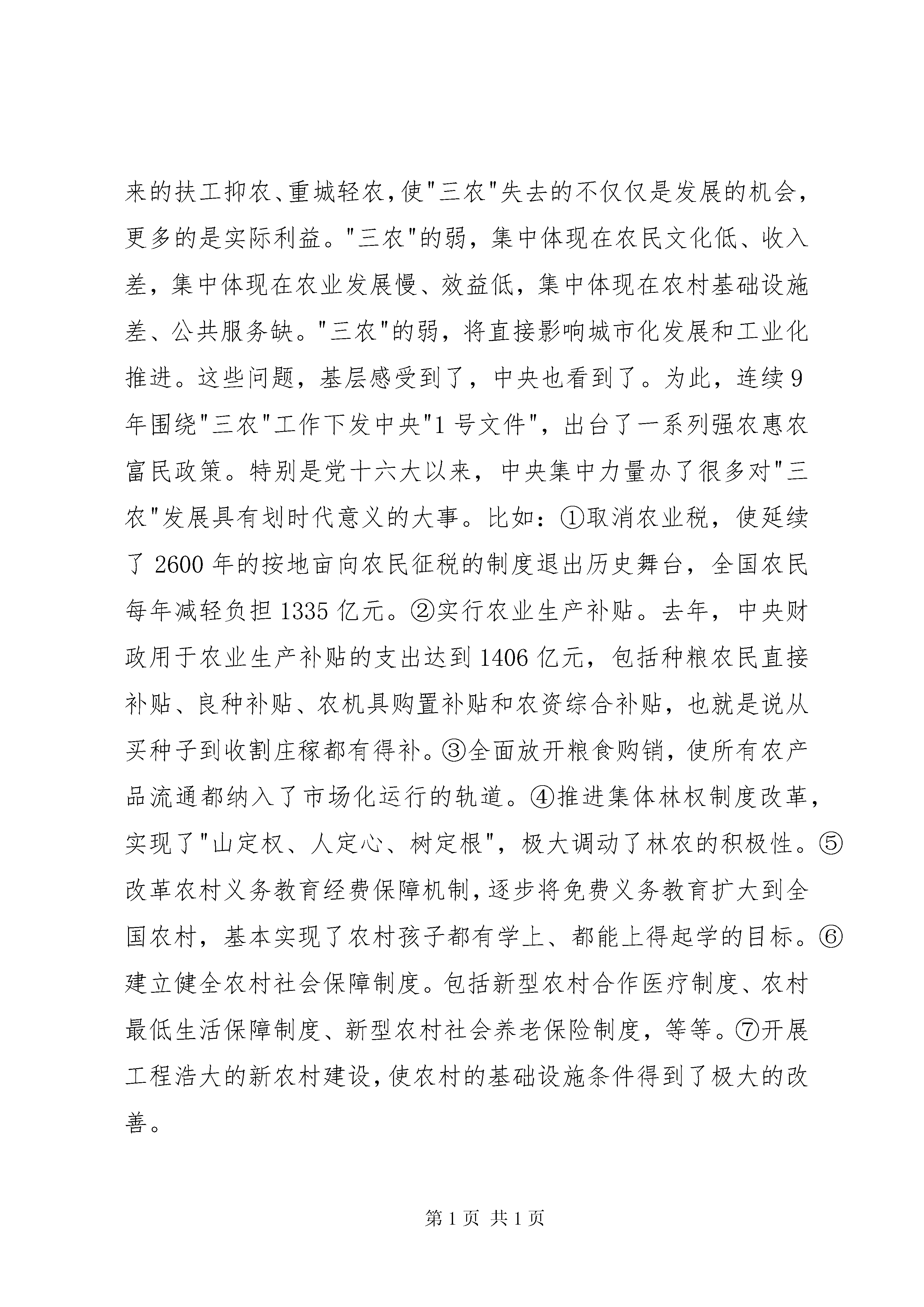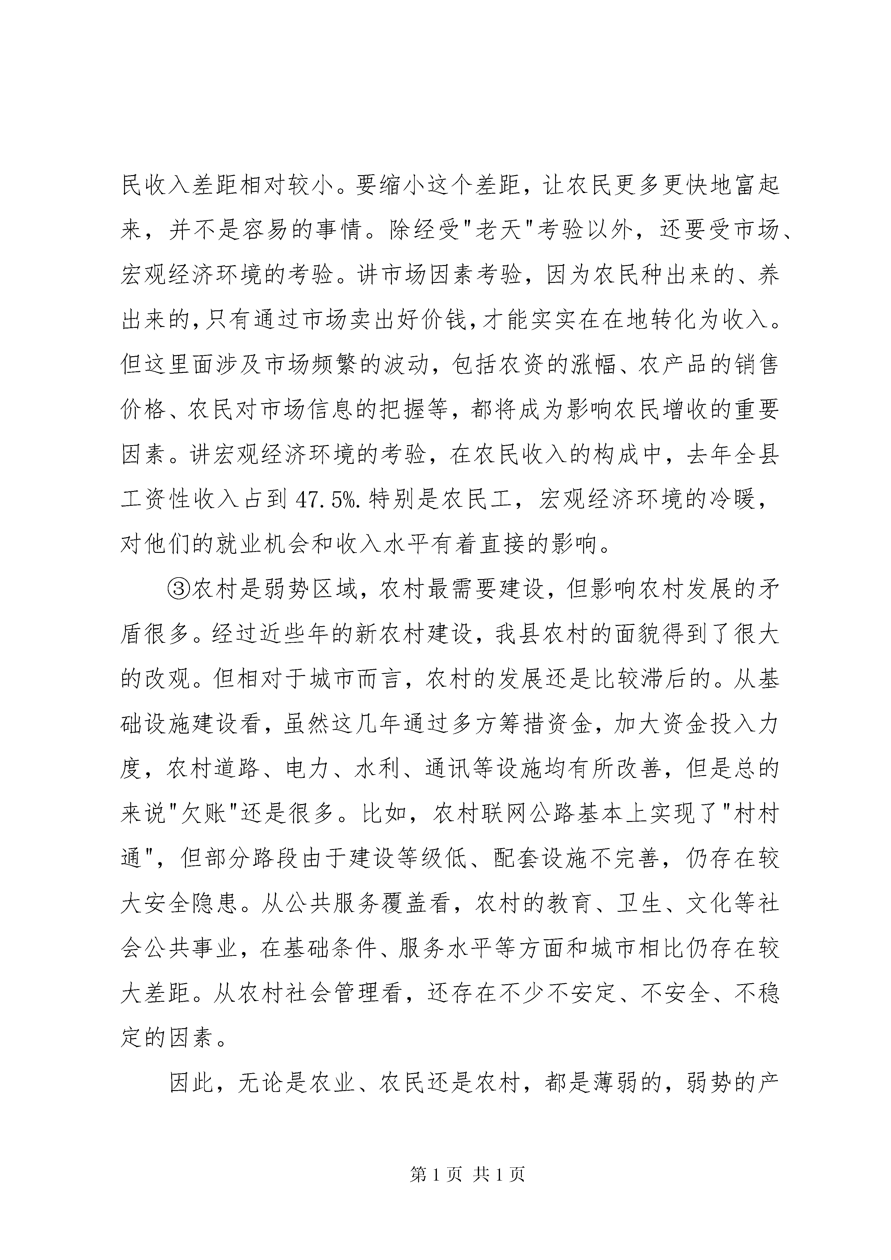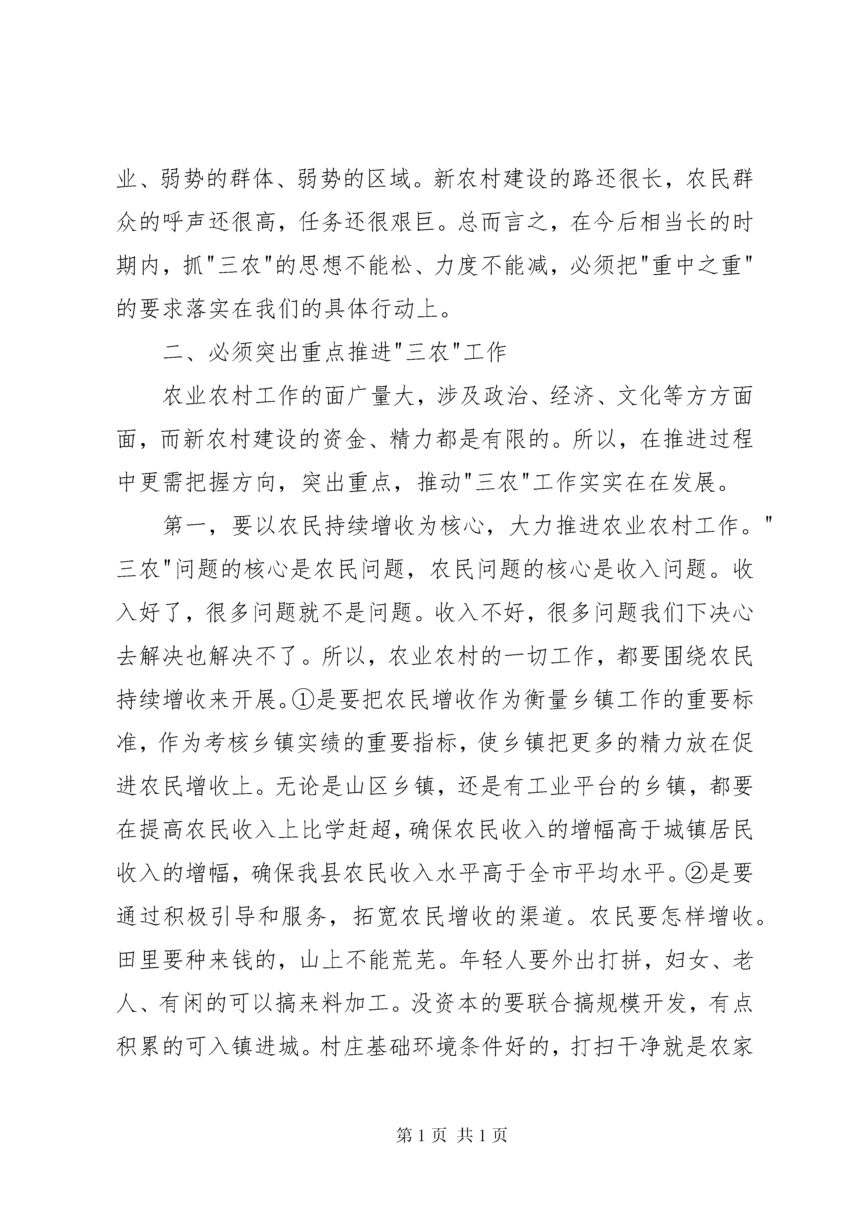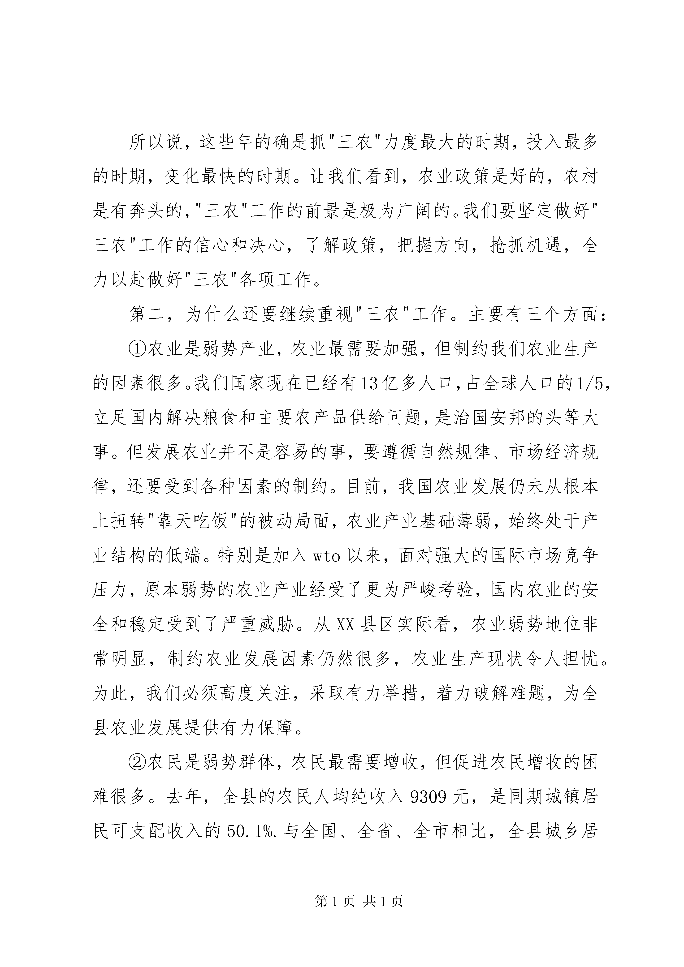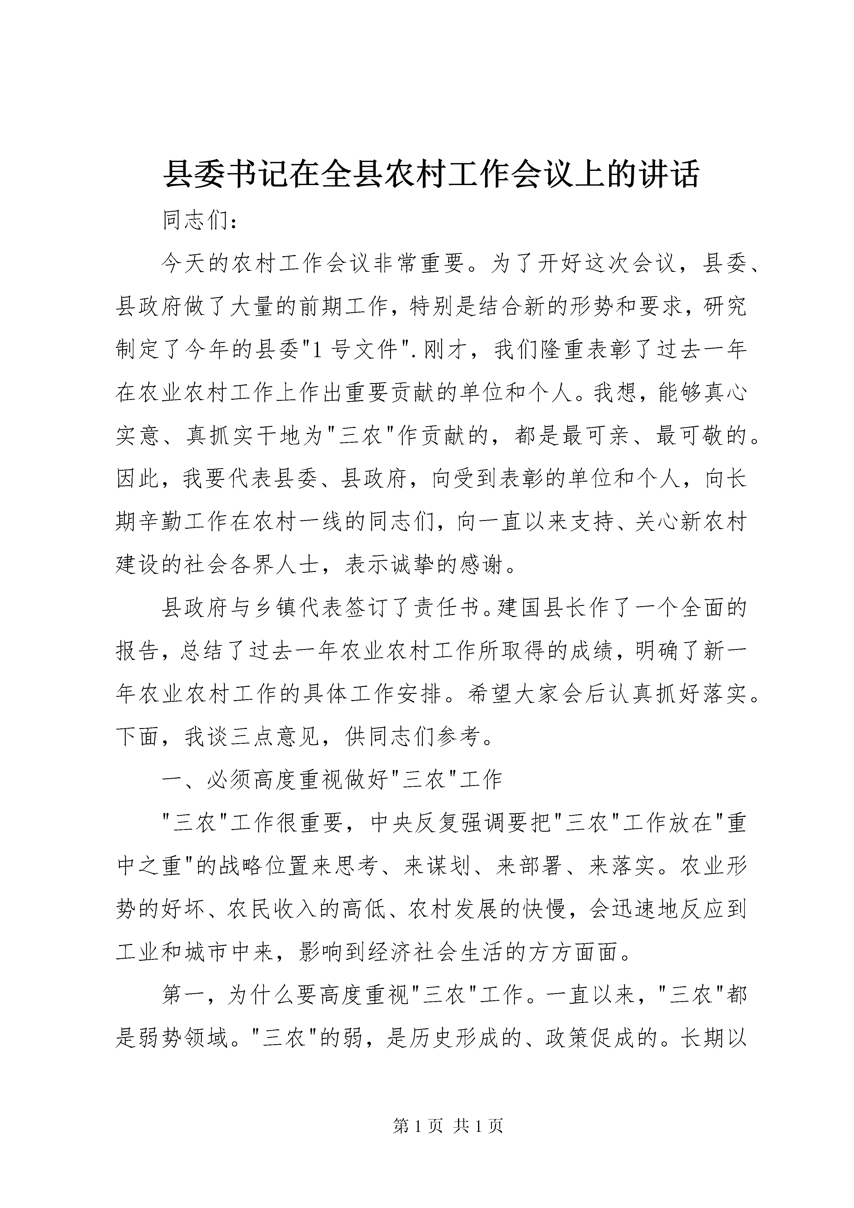 县委书记在全县农村工作会议上的讲话同志们:今天的农村工作会议非常重要。为了开好这次会议,县委、县政府做了大量的前期工作,特别是结合新的形势和要求,研究制定了今年的县委"1号文件".刚才,我们隆重表彰了过去一年在农业农村工作上作出重要贡献的单位和个人。我想,能够真心实意、真抓实干地为"三农"作贡献的,都是最可亲、最可敬的。因此,我要代表县委、县政府,向受到表彰的单位和个人,向长期辛勤工作在农村一线的同志们,向一直以来支持、关心新农村建设的社会各界人士,表示诚挚的感谢。县政府与乡镇代表签订了责任书。建国县长作了一个全面的报告,总结了过去一年农业农村工作所取得的成绩,明确了新一年农业农村工作的具体工作安排。希望大家会后认真抓好落实。下面,我谈三点意见,供同志们参考。一、必须高度重视做好"三农"工作"三农"工作很重要,中央反复强调要把"三农"工作放在"重中之重"的战略位置来思考、来谋划、来部署、来落实。农业形势的好坏、农民收入的高低、农村发展的快慢,会迅速地反应到工业和城市中来,影响到经济社会生活的方方面面。第一,为什么要高度重视"三农"工作。一直以来,"三农"都是弱势领域。"三农"的弱,是历史形成的、政策促成的。长期以来的扶工抑农、重城轻农,使"三农"失去的不仅仅是发展的机会,更多的是实际利益。"三农"的弱,集中体现在农民文化低、收入差,集中体现在农业发展慢、效益低,集中体现在农村基础设施差、公共服务缺。"三农"的弱,将直接影响城市化发展和工业化推进。这些问题,基层感受到了,中央也看到了。为此,连续9年围绕"三农"工作下发中央"1号文件",出台了一系列强农惠农富民政策。特别是党十六大以来,中央集中力量办了很多对"三农"发展具有划时代意义的大事。比如:①取消农业税,使延续了2600年的按地亩向农民征税的制度退出历史舞台,全国农民每年减轻负担1335亿元。②实行农业生产补贴。去年,中央财政用于农业生产补贴的支出达到1406亿元,包括种粮农民直接补贴、良种补贴、农机具购置补贴和农资综合补贴,也就是说从买种子到收割庄稼都有得补。③全面放开粮食购销,使所有农产品流通都纳入了市场化运行的轨道。④推进集体林权制度改革,实现了"山定权、人定心、树定根",极大调动了林农的积极性。⑤改革农村义务教育经费保障机制,逐步将免费义务教育扩大到全国农村,基本实现了农村孩子都有学上、都能上得起学的目标。⑥建立健全农村社会保障制度。包括新型农村合作医疗制度、农村最低生活保障制度、新型农村社会养老保险制度,等等。⑦开展工程浩大的新农村建设,使农村的基础设施条件得到了极大的改善。所以说,这些年的确是抓"三农"力度最大的时期,投入最多的时期,变化最快的时期。让我们看到,农业政策是好的,农村是有奔头的,"三农"工作的前景是极为广阔的。我们要坚定做好"三农"工作的信心和决心,了解政策,把握方向,抢抓机遇,全力以赴做好"三农"各项工作。第二,为什么还要继续重视"三农"工作。主要有三个方面:①农业是弱势产业,农业最需要加强,但制约我们农业生产的因素很多。我们国家现在已经有13亿多人口,占全球人口的1/5,立足国内解决粮食和主要农产品供给问题,是治国安邦的头等大事。但发展农业并不是容易的事,要遵循自然规律、市场经济规律,还要受到各种因素的制约。目前,我国农业发展仍未从根本上扭转"靠天吃饭"的被动局面,农业产业基础薄弱,始终处于产业结构的低端。特别是加入wto以来,面对强大的国际市场竞争压力,原本弱势的农业产业经受了更为严峻考验,国内农业的安全和稳定受到了严重威胁。从XX县区实际看,农业弱势地位非常明显,制约农业发展因素仍然很多,农业生产现状令人担忧。为此,我们必须高度关注,采取有力举措,着力破解难题,为全县农业发展提供有力保障。②农民是弱势群体,农民最需要增收,但促进农民增收的困难很多。去年,全县的农民人均纯收入9309元,是同期城镇居民可支配收入的50.1%.与全国、全省、全市相比,全县城乡居民收入差距相对较小。要缩小这个差距,让农民更多更快地富起来,并不是容易的事情。除经受"老天"考验以外,还要受市场、宏观经济环境的考验。讲市场因素考验,因为农民种出来的、养出来的,只有通过市场卖出好价钱,才能实实在在地转化为收入。但这里面涉及市场频繁的波动,包括农资的涨幅、农产品的销售价格、农民对市场信息的把握等,都将成为影响农民增收的重要因素。讲宏观经济环境的考验,在农民收入的构成中,去年全县工资性收入占到47.5%.特别是农民工,宏观经济环境的冷暖,对他们的就业机会和收入水平有着直接的影响。③农村是弱势区域,农村最需要建设,但影响农村发展的矛盾很多。经过近些年的新农村建设,我县农村的面貌得到了很大的改观。但相对于城市而言,农村的发展还是比较滞后的。从基础设施建设