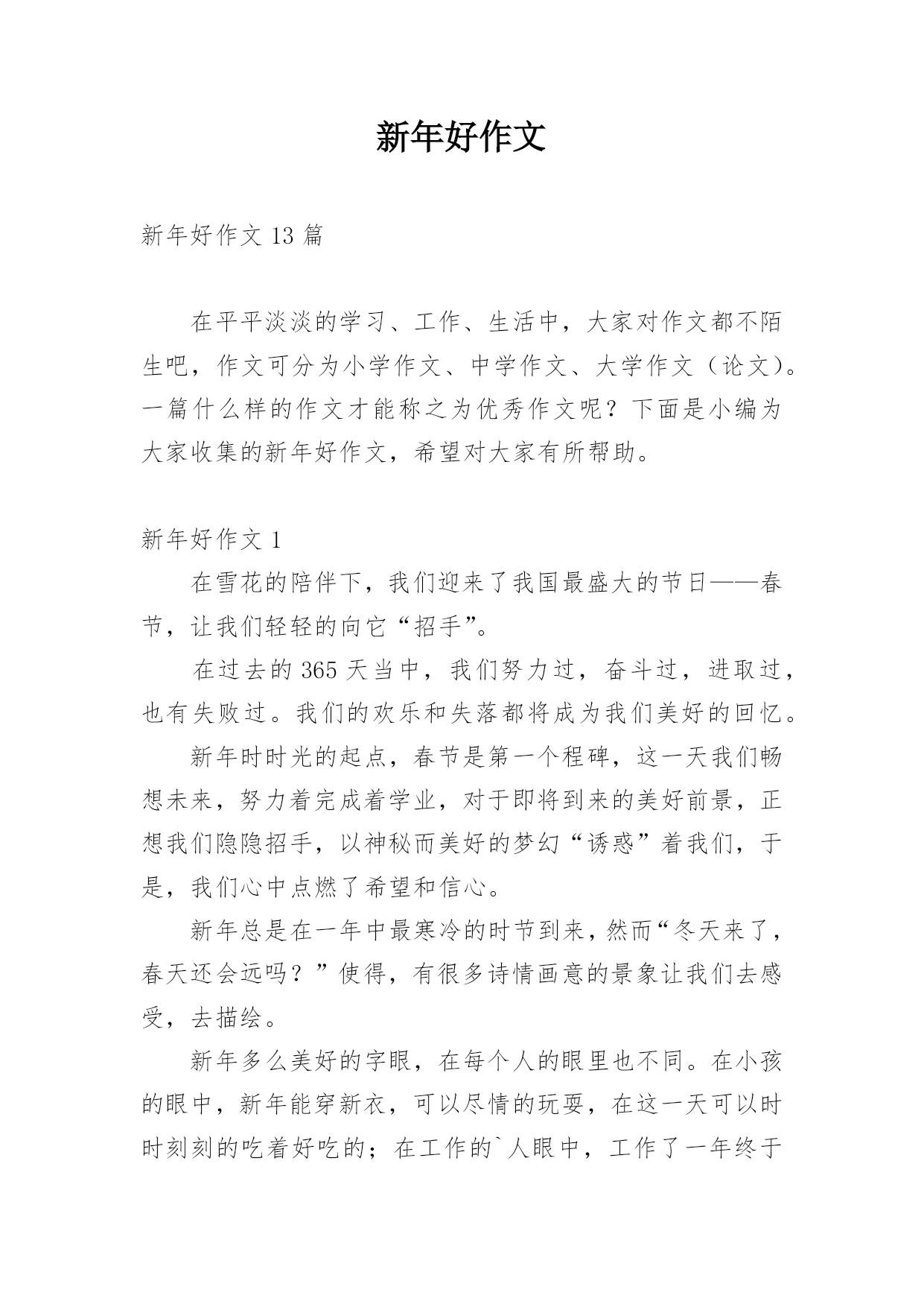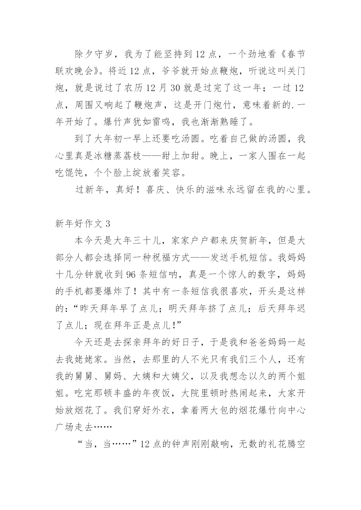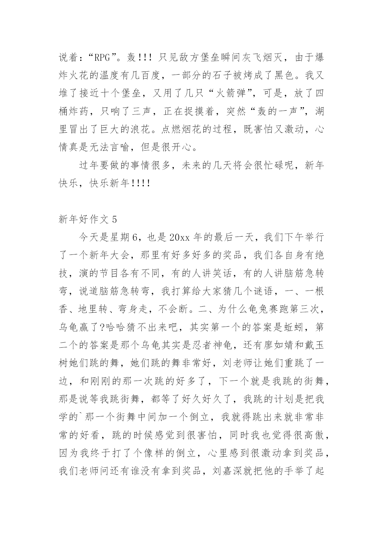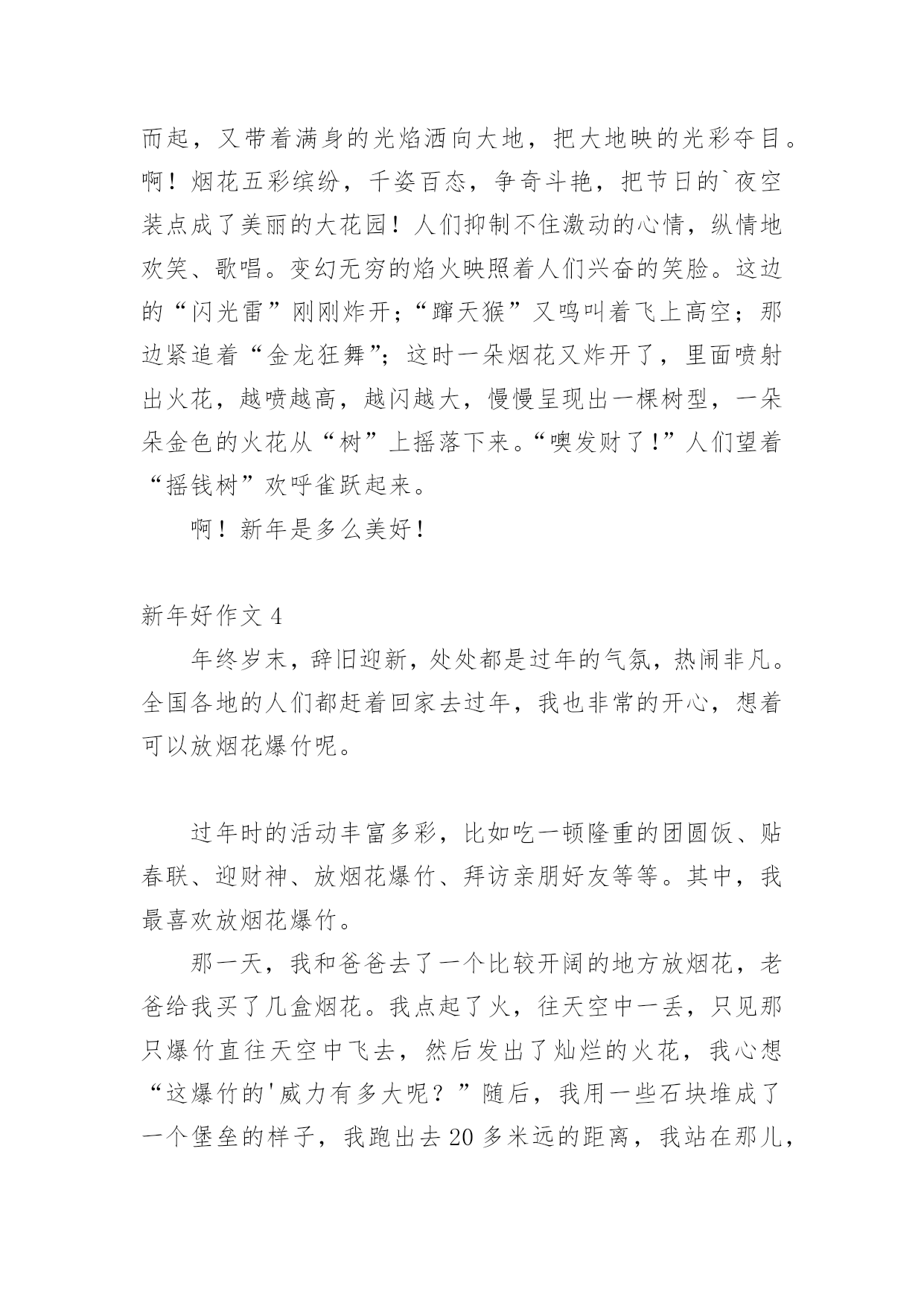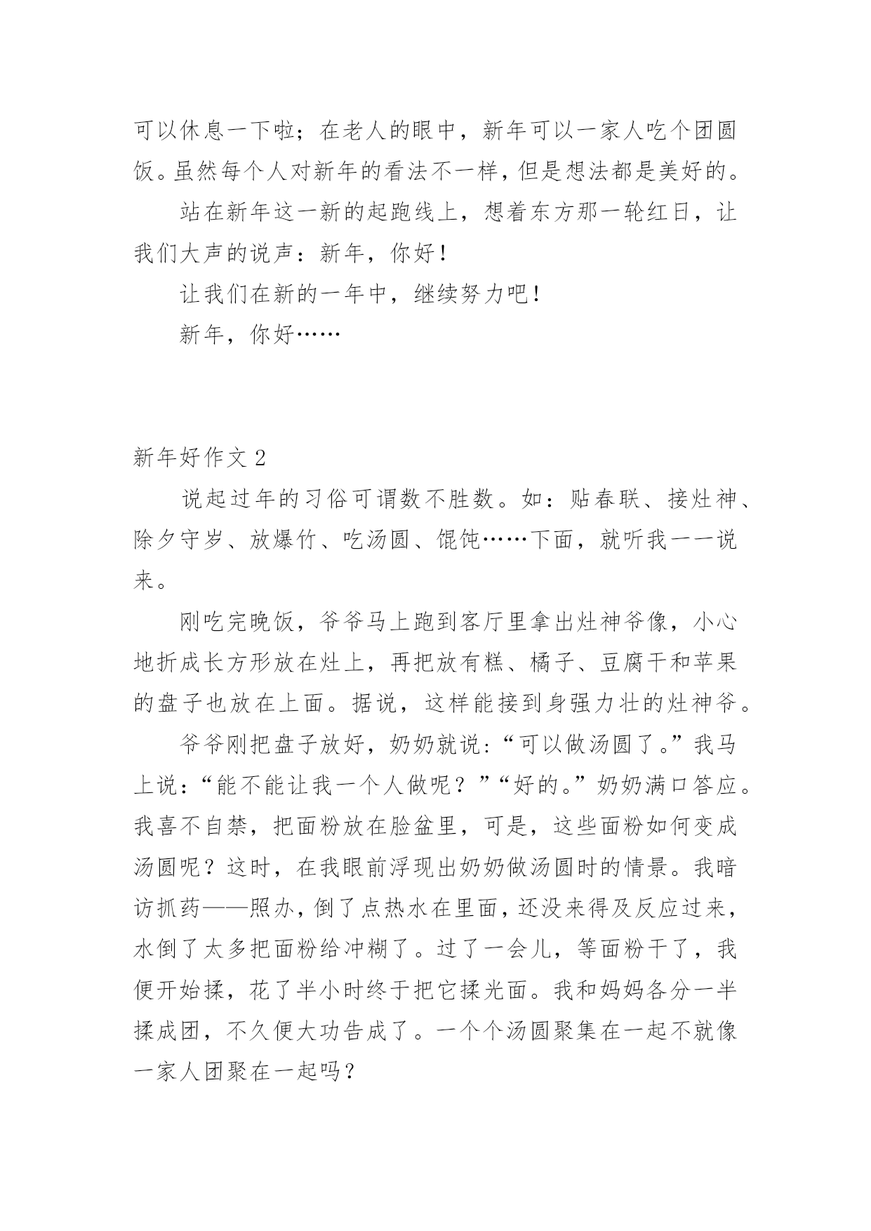 新年好作文 新年好作文13篇在平平淡淡的学习、工作、生活中,大家对作文都不陌生吧,作文可分为小学作文、中学作文、大学作文(论文)。一篇什么样的作文才能称之为优秀作文呢?下面是小编为大家收集的新年好作文,希望对大家有所帮助。新年好作文1在雪花的陪伴下,我们迎来了我国最盛大的节日——春节,让我们轻轻的向它“招手”。在过去的365天当中,我们努力过,奋斗过,进取过,也有失败过。我们的欢乐和失落都将成为我们美好的回忆。新年时时光的起点,春节是第一个程碑,这一天我们畅想未来,努力着完成着学业,对于即将到来的美好前景,正想我们隐隐招手,以神秘而美好的梦幻“诱惑”着我们,于是,我们心中点燃了希望和信心。新年总是在一年中最寒冷的时节到来,然而“冬天来了,春天还会远吗?”使得,有很多诗情画意的景象让我们去感受,去描绘。新年多么美好的字眼,在每个人的眼里也不同。在小孩的眼中,新年能穿新衣,可以尽情的玩耍,在这一天可以时时刻刻的吃着好吃的;在工作的`人眼中,工作了一年终于可以休息一下啦;在老人的眼中,新年可以一家人吃个团圆饭。虽然每个人对新年的看法不一样,但是想法都是美好的。站在新年这一新的起跑线上,想着东方那一轮红日,让我们大声的说声:新年,你好!让我们在新的一年中,继续努力吧!新年,你好……新年好作文2说起过年的习俗可谓数不胜数。如:贴春联、接灶神、除夕守岁、放爆竹、吃汤圆、馄饨……下面,就听我一一说来。刚吃完晚饭,爷爷马上跑到客厅里拿出灶神爷像,小心地折成长方形放在灶上,再把放有糕、橘子、豆腐干和苹果的盘子也放在上面。据说,这样能接到身强力壮的灶神爷。爷爷刚把盘子放好,奶奶就说:“可以做汤圆了。”我马上说:“能不能让我一个人做呢?”“好的。”奶奶满口答应。我喜不自禁,把面粉放在脸盆里,可是,这些面粉如何变成汤圆呢?这时,在我眼前浮现出奶奶做汤圆时的情景。我暗访抓药——照办,倒了点热水在里面,还没来得及反应过来,水倒了太多把面粉给冲糊了。过了一会儿,等面粉干了,我便开始揉,花了半小时终于把它揉光面。我和妈妈各分一半揉成团,不久便大功告成了。一个个汤圆聚集在一起不就像一家人团聚在一起吗?除夕守岁,我为了能坚持到12点,一个劲地看《春节联欢晚会》。将近12点,爷爷就开始点鞭炮,听说这叫关门炮,就是说过了农历12月30就是过完了这一年;一过12点,周围又响起了鞭炮声,这是开门炮竹,意味着新的.一年开始了。爆竹声犹如雷鸣,我也渐渐熟睡了。到了大年初一早上还要吃汤圆。吃着自己做的汤圆,我心里真是冰糖蒸荔枝——甜上加甜。晚上,一家人围在一起吃馄饨,个个脸上绽放着笑容。过新年,真好!喜庆、快乐的滋味永远留在我的心里。新年好作文3本今天是大年三十儿,家家户户都来庆贺新年,但是大部分人都会选择同一种祝福方式——发送手机短信。我妈妈十几分钟就收到96条短信呐,真是一个惊人的数字,妈妈的手机都要爆炸了!其中有一条短信我很喜欢,开头是这样的:“昨天拜年早了点儿;明天拜年挤了点儿;后天拜年迟了点儿;现在拜年正是点儿!”今天还是去探亲拜年的好日子,于是我和爸爸妈妈一起去我姥姥家。当然,去那里的人不光只有我们三个人,还有我的舅舅、舅妈、大姨和大姨父,以及我想念以久的两个姐姐。吃完那顿丰盛的年夜饭,大院里顿时热闹起来,大家开始放烟花了。我们穿好外衣,拿着两大包的烟花爆竹向中心广场走去……“当,当……”12点的钟声刚刚敲响,无数的礼花腾空而起,又带着满身的光焰洒向大地,把大地映的光彩夺目。啊!烟花五彩缤纷,千姿百态,争奇斗艳,把节日的`夜空装点成了美丽的大花园!人们抑制不住激动的心情,纵情地欢笑、歌唱。变幻无穷的焰火映照着人们兴奋的笑脸。这边的“闪光雷”刚刚炸开;“蹿天猴”又鸣叫着飞上高空;那边紧追着“金龙狂舞”;这时一朵烟花又炸开了,里面喷射出火花,越喷越高,越闪越大,慢慢呈现出一棵树型,一朵朵金色的火花从“树”上摇落下来。“噢发财了!”人们望着“摇钱树”欢呼雀跃起来。啊!新年是多么美好!新年好作文4年终岁末,辞旧迎新,处处都是过年的气氛,热闹非凡。全国各地的人们都赶着回家去过年,我也非常的开心,想着可以放烟花爆竹呢。过年时的活动丰富多彩,比如吃一顿隆重的团圆饭、贴春联、迎财神、放烟花爆竹、拜访亲朋好友等等。其中,我最喜欢放烟花爆竹。那一天,我和爸爸去了一个比较开阔的地方放烟花,老爸给我买了几盒烟花。我点起了火,往天空中一丢,只见那只爆竹直往天空中飞去,然后发出了灿烂的火花,我心想“这爆竹的'威力有多大呢?”随后,我用一些石块堆成了一个堡垒的样子,我跑出去20多米远的距离,我站在那儿,说着:“RPG”。轰!!!只见敌方堡垒瞬间灰飞烟灭,由于爆炸火花的温度有几百度,一部分的石子被烤成了黑色。我又堆了接近十个堡垒,又用了几只“火箭弹”,可是,放了四桶炸药,只响了三声,正在捉摸着