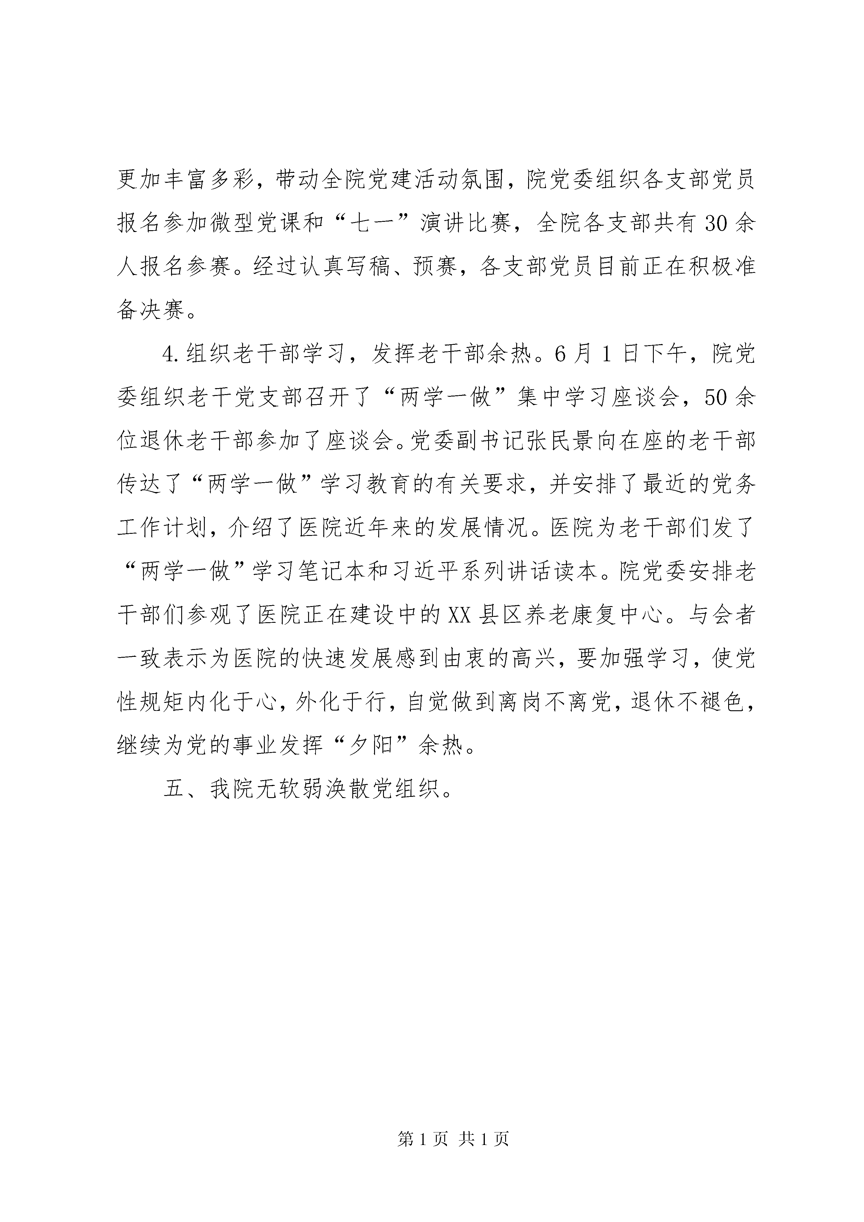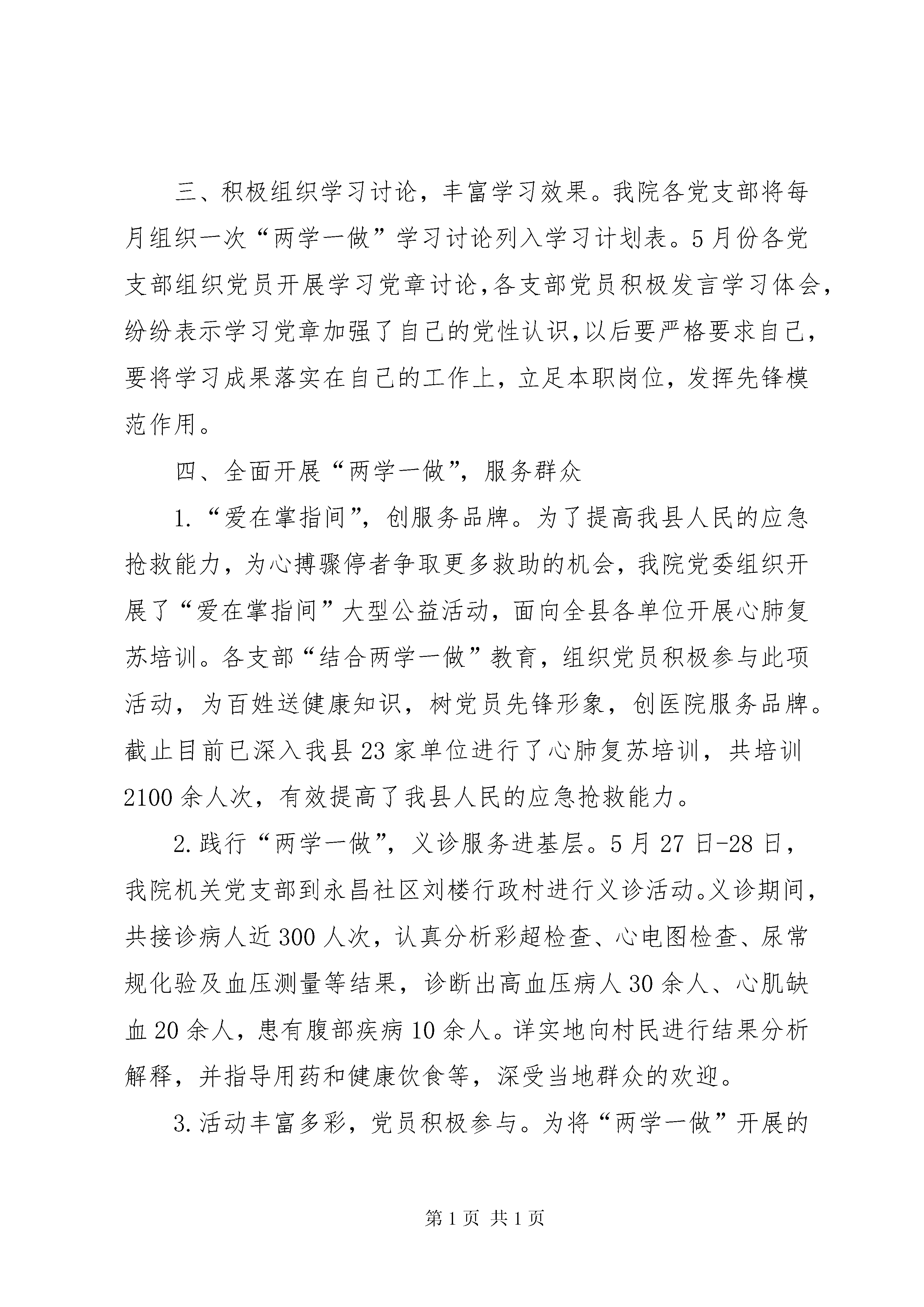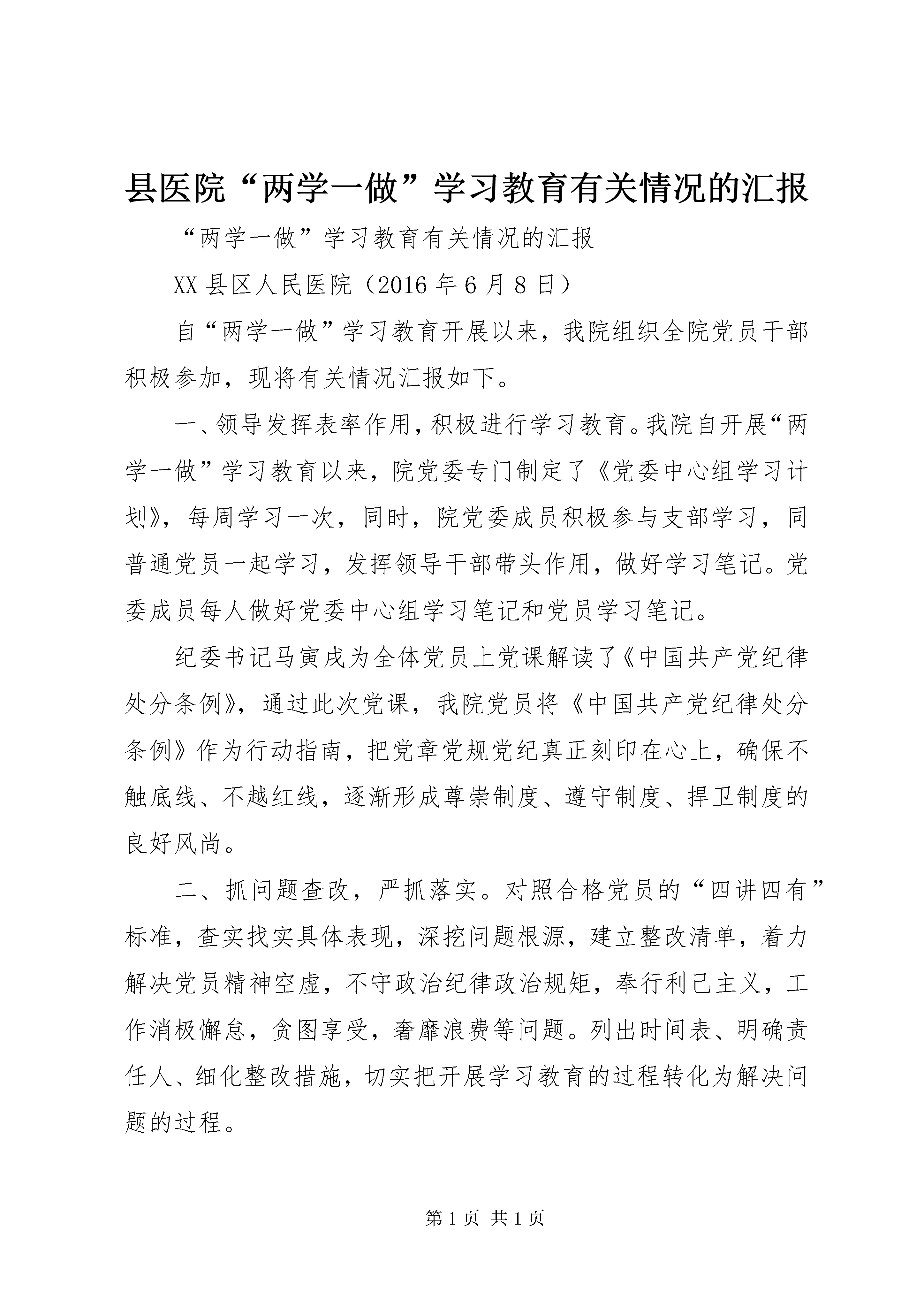 县医院“两学一做”学习教育有关情况的汇报“两学一做”学习教育有关情况的汇报XX县区人民医院(2016年6月8日)自“两学一做”学习教育开展以来,我院组织全院党员干部积极参加,现将有关情况汇报如下。一、领导发挥表率作用,积极进行学习教育。我院自开展“两学一做”学习教育以来,院党委专门制定了《党委中心组学习计划》,每周学习一次,同时,院党委成员积极参与支部学习,同普通党员一起学习,发挥领导干部带头作用,做好学习笔记。党委成员每人做好党委中心组学习笔记和党员学习笔记。纪委书记马寅戌为全体党员上党课解读了《中国共产党纪律处分条例》,通过此次党课,我院党员将《中国共产党纪律处分条例》作为行动指南,把党章党规党纪真正刻印在心上,确保不触底线、不越红线,逐渐形成尊崇制度、遵守制度、捍卫制度的良好风尚。二、抓问题查改,严抓落实。对照合格党员的“四讲四有”标准,查实找实具体表现,深挖问题根源,建立整改清单,着力解决党员精神空虚,不守政治纪律政治规矩,奉行利己主义,工作消极懈怠,贪图享受,奢靡浪费等问题。列出时间表、明确责任人、细化整改措施,切实把开展学习教育的过程转化为解决问题的过程。三、积极组织学习讨论,丰富学习效果。我院各党支部将每月组织一次“两学一做”学习讨论列入学习计划表。5月份各党支部组织党员开展学习党章讨论,各支部党员积极发言学习体会,纷纷表示学习党章加强了自己的党性认识,以后要严格要求自己,要将学习成果落实在自己的工作上,立足本职岗位,发挥先锋模范作用。四、全面开展“两学一做”,服务群众1.“爱在掌指间”,创服务品牌。为了提高我县人民的应急抢救能力,为心搏骤停者争取更多救助的机会,我院党委组织开展了“爱在掌指间”大型公益活动,面向全县各单位开展心肺复苏培训。各支部“结合两学一做”教育,组织党员积极参与此项活动,为百姓送健康知识,树党员先锋形象,创医院服务品牌。截止目前已深入我县23家单位进行了心肺复苏培训,共培训2100余人次,有效提高了我县人民的应急抢救能力。2.践行“两学一做”,义诊服务进基层。5月27日-28日,我院机关党支部到永昌社区刘楼行政村进行义诊活动。义诊期间,共接诊病人近300人次,认真分析彩超检查、心电图检查、尿常规化验及血压测量等结果,诊断出高血压病人30余人、心肌缺血20余人,患有腹部疾病10余人。详实地向村民进行结果分析解释,并指导用药和健康饮食等,深受当地群众的欢迎。3.活动丰富多彩,党员积极参与。为将“两学一做”开展的更加丰富多彩,带动全院党建活动氛围,院党委组织各支部党员报名参加微型党课和“七一”演讲比赛,全院各支部共有30余人报名参赛。经过认真写稿、预赛,各支部党员目前正在积极准备决赛。4.组织老干部学习,发挥老干部余热。6月1日下午,院党委组织老干党支部召开了“两学一做”集中学习座谈会,50余位退休老干部参加了座谈会。党委副书记张民景向在座的老干部传达了“两学一做”学习教育的有关要求,并安排了最近的党务工作计划,介绍了医院近年来的发展情况。医院为老干部们发了“两学一做”学习笔记本和习近平系列讲话读本。院党委安排老干部们参观了医院正在建设中的XX县区养老康复中心。与会者一致表示为医院的快速发展感到由衷的高兴,要加强学习,使党性规矩内化于心,外化于行,自觉做到离岗不离党,退休不褪色,继续为党的事业发挥“夕阳”余热。五、我院无软弱涣散党组织。