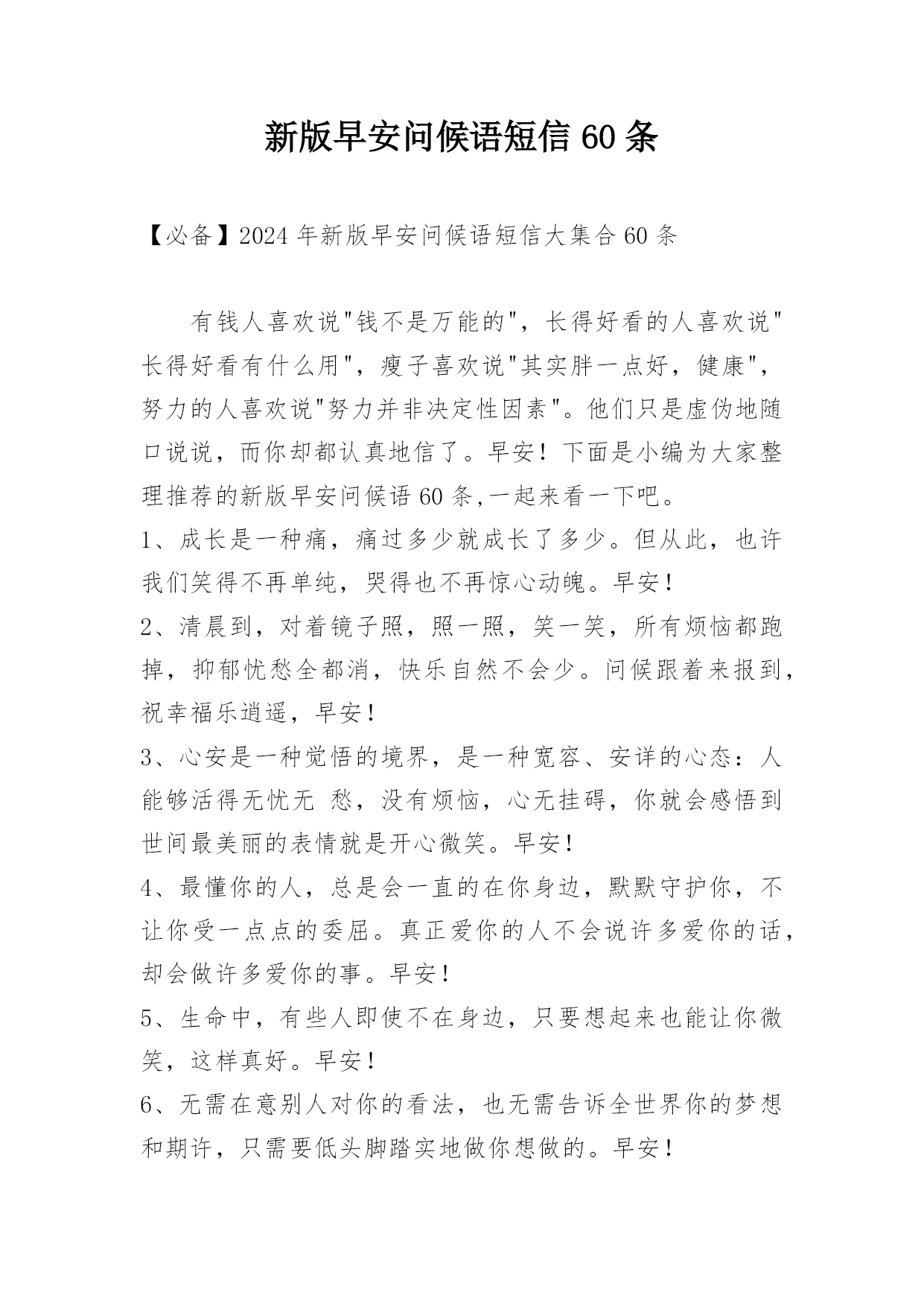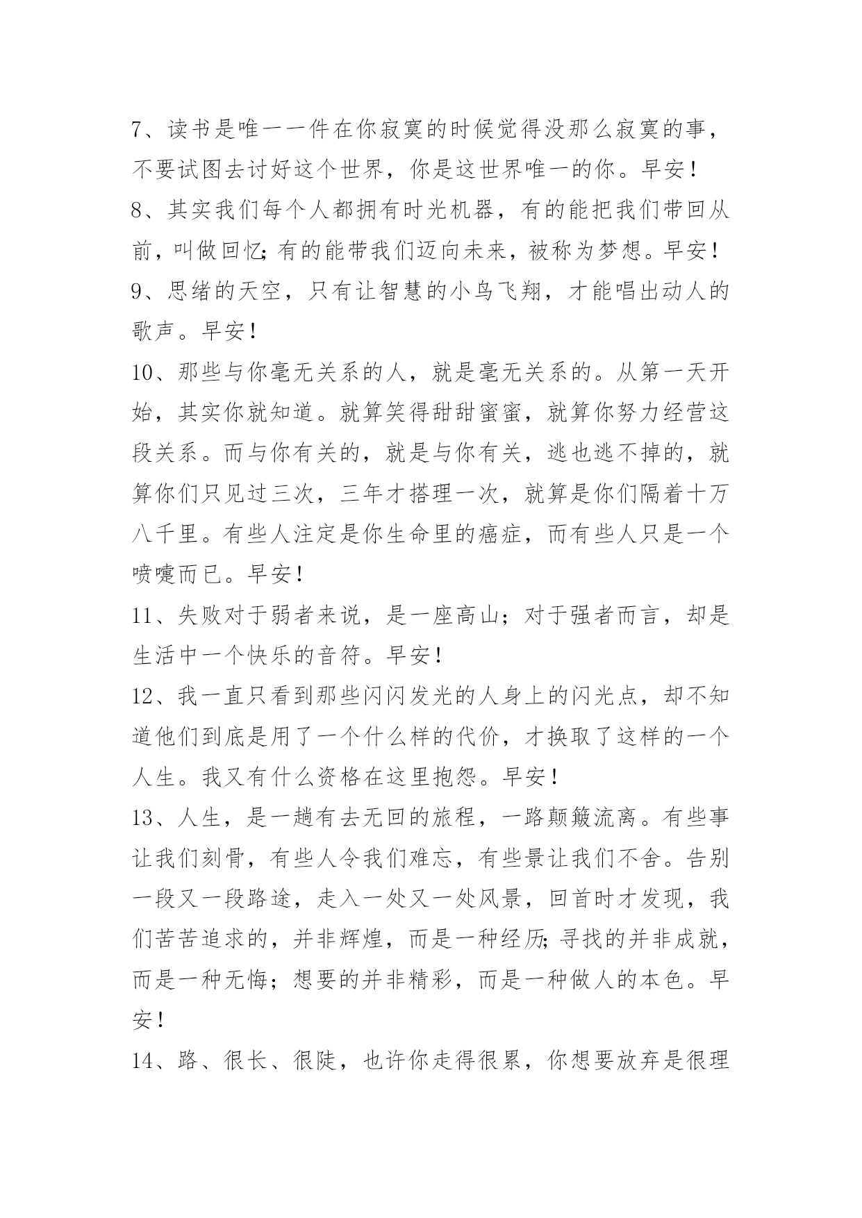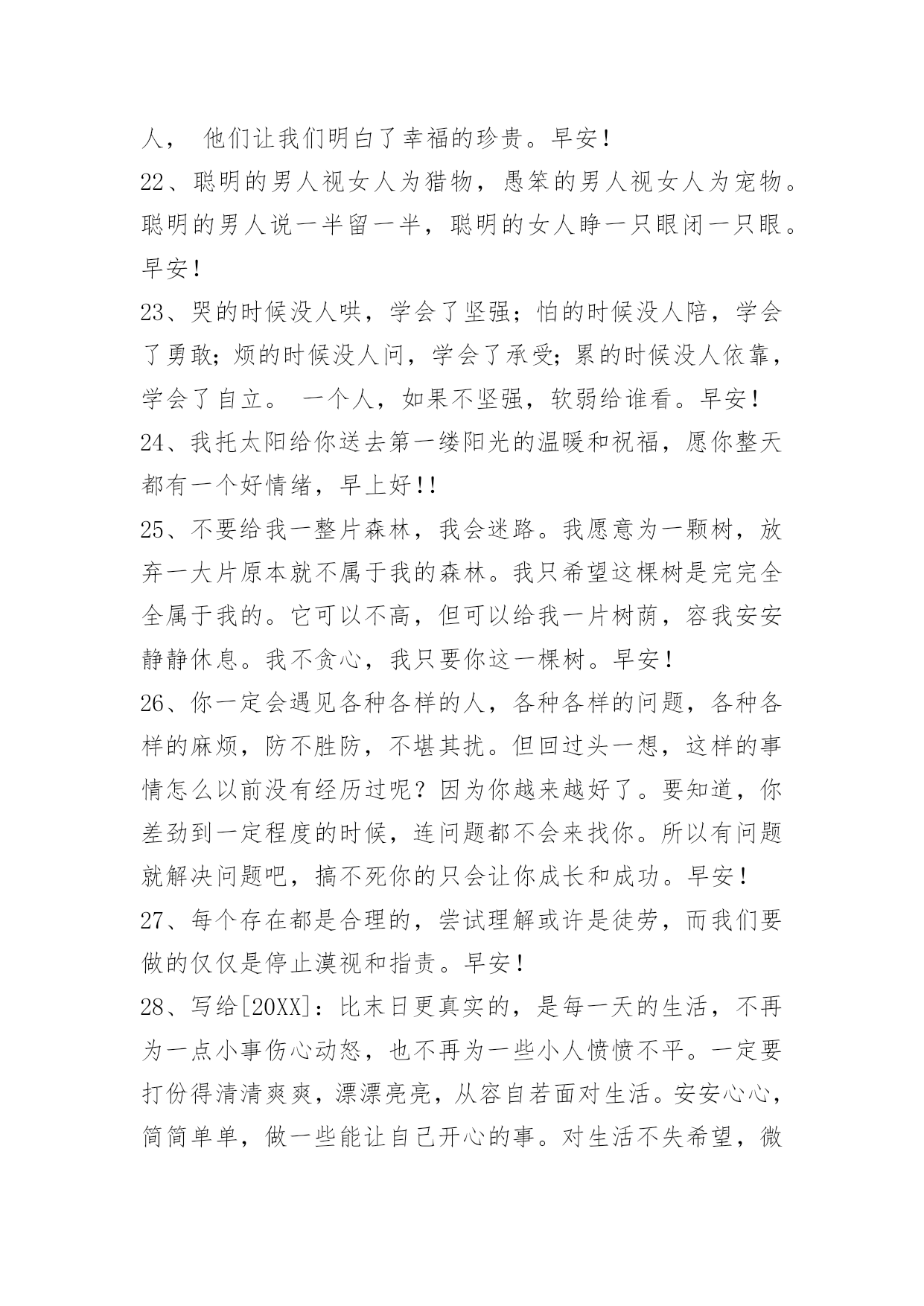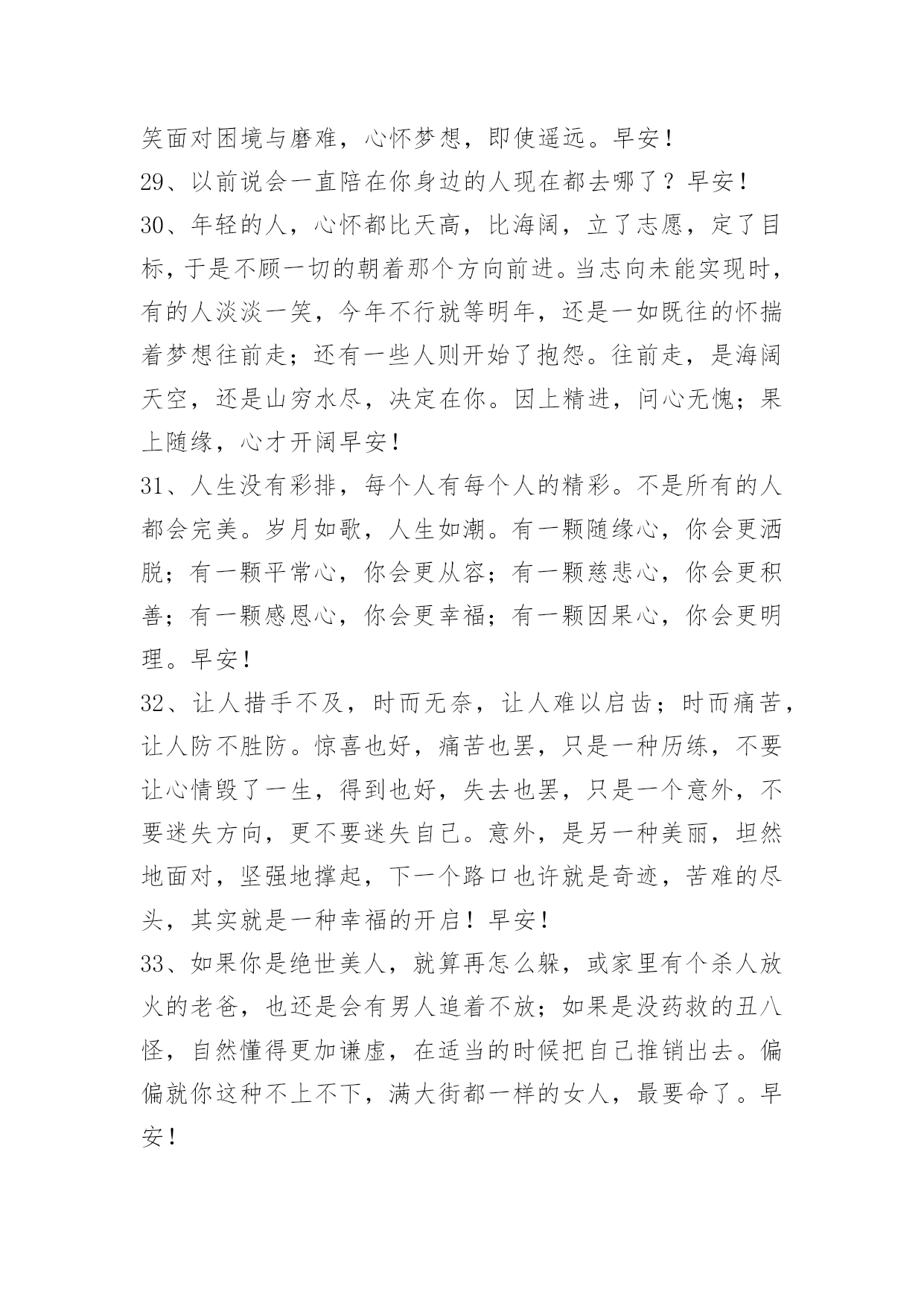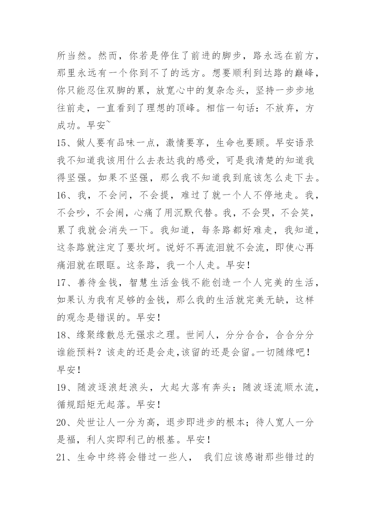 新版早安问候语短信60条 【必备】2024年新版早安问候语短信大集合60条有钱人喜欢说"钱不是万能的",长得好看的人喜欢说"长得好看有什么用",瘦子喜欢说"其实胖一点好,健康",努力的人喜欢说"努力并非决定性因素"。他们只是虚伪地随口说说,而你却都认真地信了。早安!下面是小编为大家整理推荐的新版早安问候语60条,一起来看一下吧。1、成长是一种痛,痛过多少就成长了多少。但从此,也许我们笑得不再单纯,哭得也不再惊心动魄。早安!2、清晨到,对着镜子照,照一照,笑一笑,所有烦恼都跑掉,抑郁忧愁全都消,快乐自然不会少。问候跟着来报到,祝幸福乐逍遥,早安!3、心安是一种觉悟的境界,是一种宽容、安详的心态:人能够活得无忧无愁,没有烦恼,心无挂碍,你就会感悟到世间最美丽的表情就是开心微笑。早安!4、最懂你的人,总是会一直的在你身边,默默守护你,不让你受一点点的委屈。真正爱你的人不会说许多爱你的话,却会做许多爱你的事。早安!5、生命中,有些人即使不在身边,只要想起来也能让你微笑,这样真好。早安!6、无需在意别人对你的看法,也无需告诉全世界你的梦想和期许,只需要低头脚踏实地做你想做的。早安!7、读书是唯一一件在你寂寞的时候觉得没那么寂寞的事,不要试图去讨好这个世界,你是这世界唯一的你。早安!8、其实我们每个人都拥有时光机器,有的能把我们带回从前,叫做回忆;有的能带我们迈向未来,被称为梦想。早安!9、思绪的天空,只有让智慧的小鸟飞翔,才能唱出动人的歌声。早安!10、那些与你毫无关系的人,就是毫无关系的。从第一天开始,其实你就知道。就算笑得甜甜蜜蜜,就算你努力经营这段关系。而与你有关的,就是与你有关,逃也逃不掉的,就算你们只见过三次,三年才搭理一次,就算是你们隔着十万八千里。有些人注定是你生命里的癌症,而有些人只是一个喷嚏而已。早安!11、失败对于弱者来说,是一座高山;对于强者而言,却是生活中一个快乐的音符。早安!12、我一直只看到那些闪闪发光的人身上的闪光点,却不知道他们到底是用了一个什么样的代价,才换取了这样的一个人生。我又有什么资格在这里抱怨。早安!13、人生,是一趟有去无回的旅程,一路颠簸流离。有些事让我们刻骨,有些人令我们难忘,有些景让我们不舍。告别一段又一段路途,走入一处又一处风景,回首时才发现,我们苦苦追求的,并非辉煌,而是一种经历;寻找的并非成就,而是一种无悔;想要的并非精彩,而是一种做人的本色。早安!14、路、很长、很陡,也许你走得很累,你想要放弃是很理所当然。然而,你若是停住了前进的脚步,路永远在前方,那里永远有一个你到不了的远方。想要顺利到达路的巅峰,你只能忍住双脚的累,放宽心中的复杂念头,坚持一步步地往前走,一直看到了理想的顶峰。相信一句话:不放弃,方成功。早安~15、做人要有品味一点,激情要享,生命也要顾。早安语录我不知道我该用什么去表达我的感受,可是我清楚的知道我得坚强。如果不坚强,那么我不知道我到底该怎么走下去。16、我,不会问,不会提,难过了就一个人不停地走。我,不会吵,不会闹,心痛了用沉默代替。我,不会哭,不会笑,累了我就会消失一下。我知道,每条路都好难走,我知道,这条路就注定了要坎坷。说好不再流泪就不会流,即使心再痛泪就在眼眶。这条路,我一个人走。早安!17、善待金钱,智慧生活金钱不能创造一个人完美的生活,如果认为我有足够的金钱,那么我的生活就完美无缺,这样的观念是错误的。早安!18、缘聚缘散总无强求之理。世间人,分分合合,合合分分谁能预料?该走的还是会走,该留的还是会留。一切随缘吧!早安!19、随波逐浪赶浪头,大起大落有奔头;随波逐流顺水流,循规蹈矩无起落。早安!20、处世让人一分为高,退步即进步的根本;待人宽人一分是福,利人实即利己的根基。早安!21、生命中终将会错过一些人,我们应该感谢那些错过的人,他们让我们明白了幸福的珍贵。早安!22、聪明的男人视女人为猎物,愚笨的男人视女人为宠物。聪明的男人说一半留一半,聪明的女人睁一只眼闭一只眼。早安!23、哭的时候没人哄,学会了坚强;怕的时候没人陪,学会了勇敢;烦的时候没人问,学会了承受;累的时候没人依靠,学会了自立。一个人,如果不坚强,软弱给谁看。早安!24、我托太阳给你送去第一缕阳光的温暖和祝福,愿你整天都有一个好情绪,早上好!!25、不要给我一整片森林,我会迷路。我愿意为一颗树,放弃一大片原本就不属于我的森林。我只希望这棵树是完完全全属于我的。它可以不高,但可以给我一片树荫,容我安安静静休息。我不贪心,我只要你这一棵树。早安!26、你一定会遇见各种各样的人,各种各样的问题,各种各样的麻烦,防不胜防,不堪其扰。但回过头一想,这样的事情怎么以前没有经历过呢?因为你越来越好了。要知道,你差劲到一定程度的时候,连问题都不会来找你。所以有问题就解决问题吧,搞不死你的只会