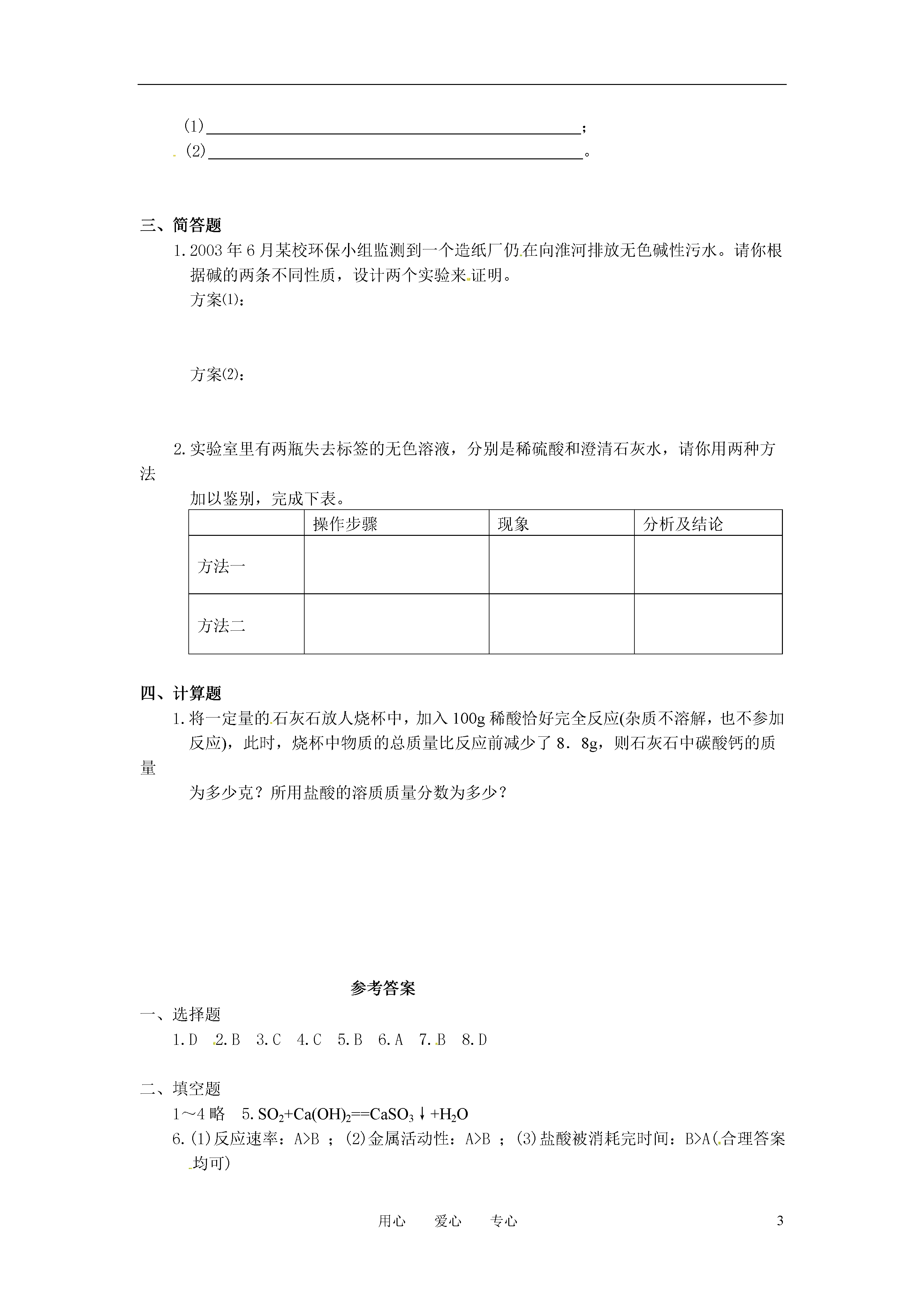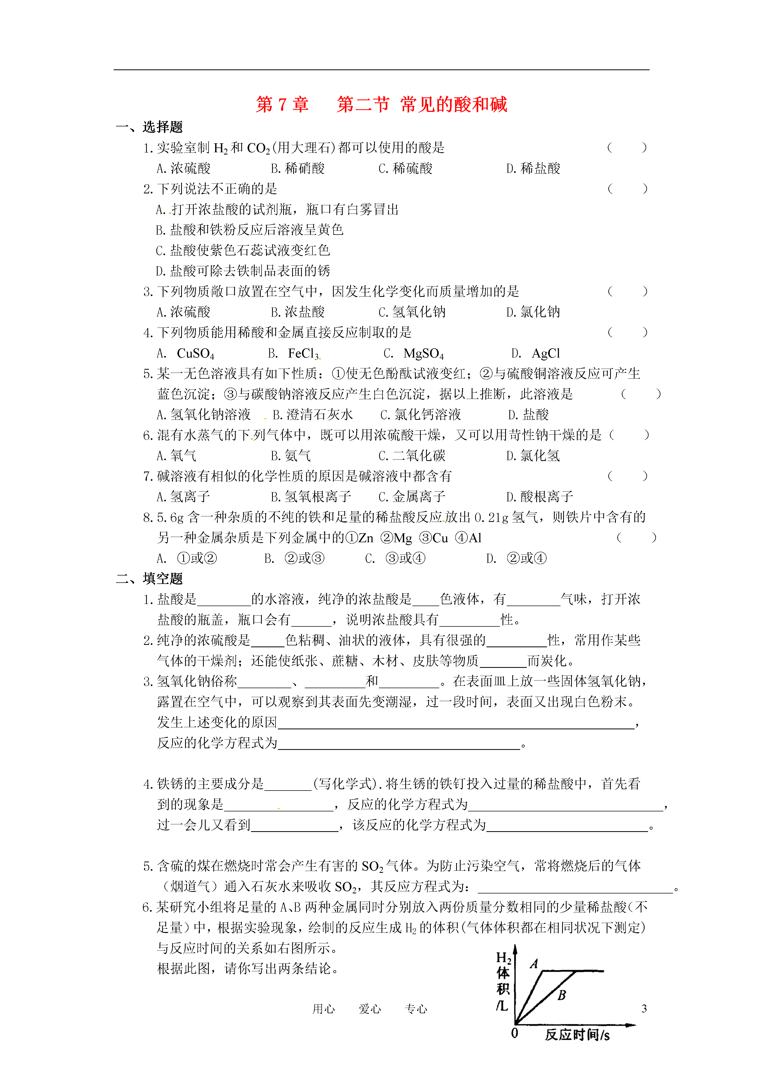 3用心爱心专心第7章第二节常见的酸和碱一、选择题1.实验室制H2和CO2(用大理石)都可以使用的酸是()A.浓硫酸B.稀硝酸C.稀硫酸D.稀盐酸2.下列说法不正确的是()A.打开浓盐酸的试剂瓶,瓶口有白雾冒出B.盐酸和铁粉反应后溶液呈黄色C.盐酸使紫色石蕊试液变红色D.盐酸可除去铁制品表面的锈3.下列物质敞口放置在空气中,因发生化学变化而质量增加的是()A.浓硫酸B.浓盐酸C.氢氧化钠D.氯化钠4.下列物质能用稀酸和金属直接反应制取的是()A.CuSO4B.FeCl3C.MgSO4D.AgCl5.某一无色溶液具有如下性质:①使无色酚酞试液变红;②与硫酸铜溶液反应可产生蓝色沉淀;③与碳酸钠溶液反应产生白色沉淀,据以上推断,此溶液是()A.氢氧化钠溶液B.澄清石灰水C.氯化钙溶液D.盐酸6.混有水蒸气的下列气体中,既可以用浓硫酸干燥,又可以用苛性钠干燥的是()A.氧气B.氨气C.二氧化碳D.氯化氢7.碱溶液有相似的化学性质的原因是碱溶液中都含有()A.氢离子B.氢氧根离子C.金属离子D.酸根离子8.5.6g含一种杂质的不纯的铁和足量的稀盐酸反应放出0.21g氢气,则铁片中含有的另一种金属杂质是下列金属中的①Zn②Mg③Cu④Al()A.①或②B.②或③C.③或④D.②或④二、填空题1.盐酸是的水溶液,纯净的浓盐酸是色液体,有气味,打开浓盐酸的瓶盖,瓶口会有,说明浓盐酸具有性。2.纯净的浓硫酸是色粘稠、油状的液体,具有很强的性,常用作某些气体的干燥剂;还能使纸张、蔗糖、木材、皮肤等物质而炭化。3.氢氧化钠俗称、和。在表面皿上放一些固体氢氧化钠,露置在空气中,可以观察到其表面先变潮湿,过一段时间,表面又出现白色粉末。发生上述变化的原因,反应的化学方程式为。4.铁锈的主要成分是(写化学式).将生锈的铁钉投入过量的稀盐酸中,首先看到的现象是,反应的化学方程式为,过一会儿又看到,该反应的化学方程式为。5.含硫的煤在燃烧时常会产生有害的SO2气体。为防止污染空气,常将燃烧后的气体(烟道气)通入石灰水来吸收SO2,其反应方程式为:。6.某研究小组将足量的A、B两种金属同时分别放入两份质量分数相同的少量稀盐酸(不足量)中,根据实验现象,绘制的反应生成H2的体积(气体体积都在相同状况下测定)与反应时间的关系如右图所示。根据此图,请你写出两条结论。(1);(2)。三、简答题1.2003年6月某校环保小组监测到一个造纸厂仍在向淮河排放无色碱性污水。请你根据碱的两条不同性质,设计两个实验来证明。方案⑴:方案⑵:2.实验室里有两瓶失去标签的无色溶液,分别是稀硫酸和澄清石灰水,请你用两种方法加以鉴别,完成下表。操作步骤现象分析及结论方法一方法二四、计算题1.将一定量的石灰石放人烧杯中,加入100g稀酸恰好完全反应(杂质不溶解,也不参加反应),此时,烧杯中物质的总质量比反应前减少了8.8g,则石灰石中碳酸钙的质量为多少克?所用盐酸的溶质质量分数为多少?参考答案一、选择题1.D2.B3.C4.C5.B6.A7.B8.D二、填空题1~4略5.SO2+Ca(OH)2==CaSO3↓+H2O6.(1)反应速率:A>B;(2)金属活动性:A>B;(3)盐酸被消耗完时间:B>A(合理答案均可)三、简答题1.⑴用试管取污水少许,滴入酚酞试液,试液变红;⑵用试管取污水少许,滴入硫酸铜溶液,有蓝色沉淀生成。2.略四、计算题1.20;14.6%