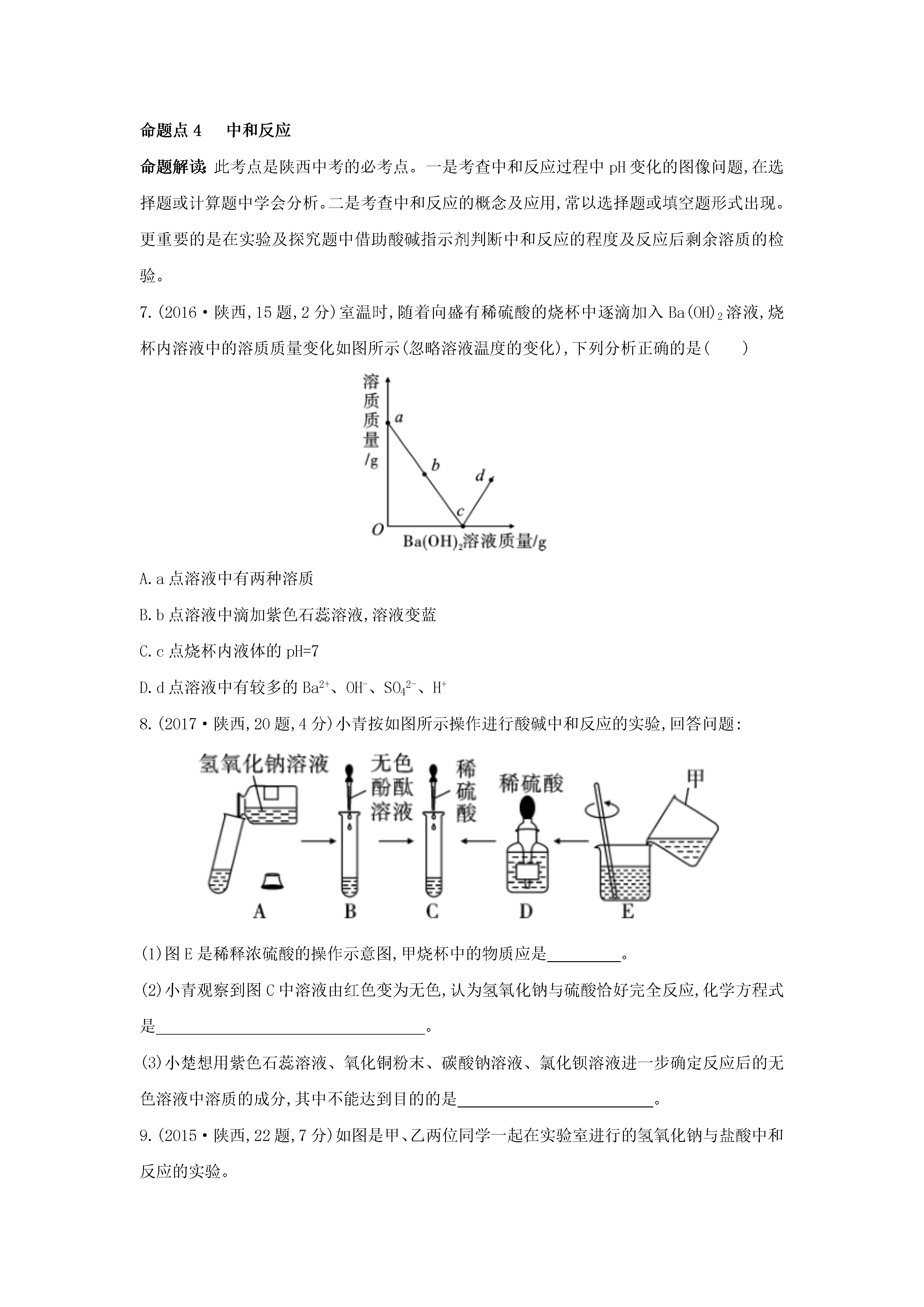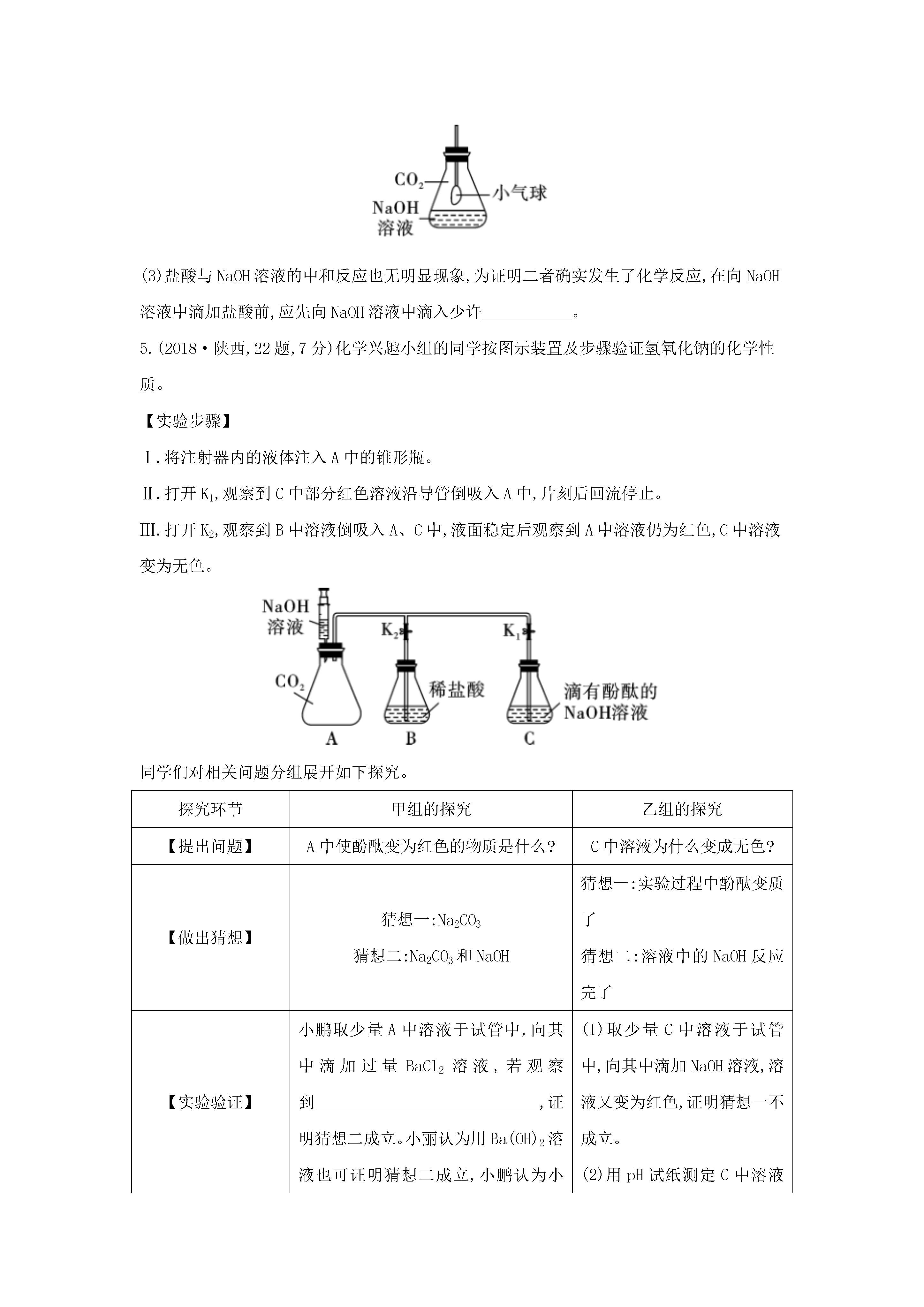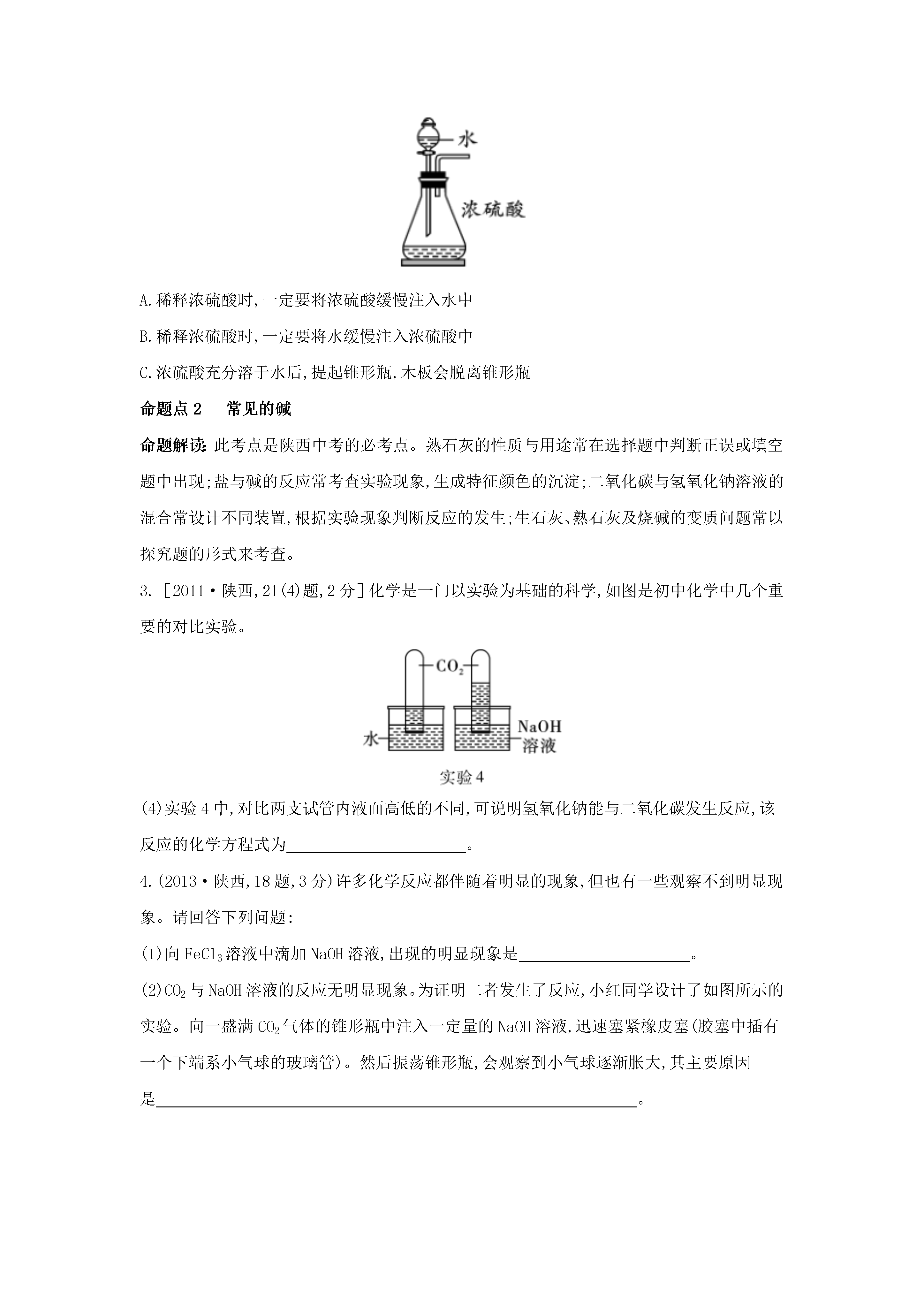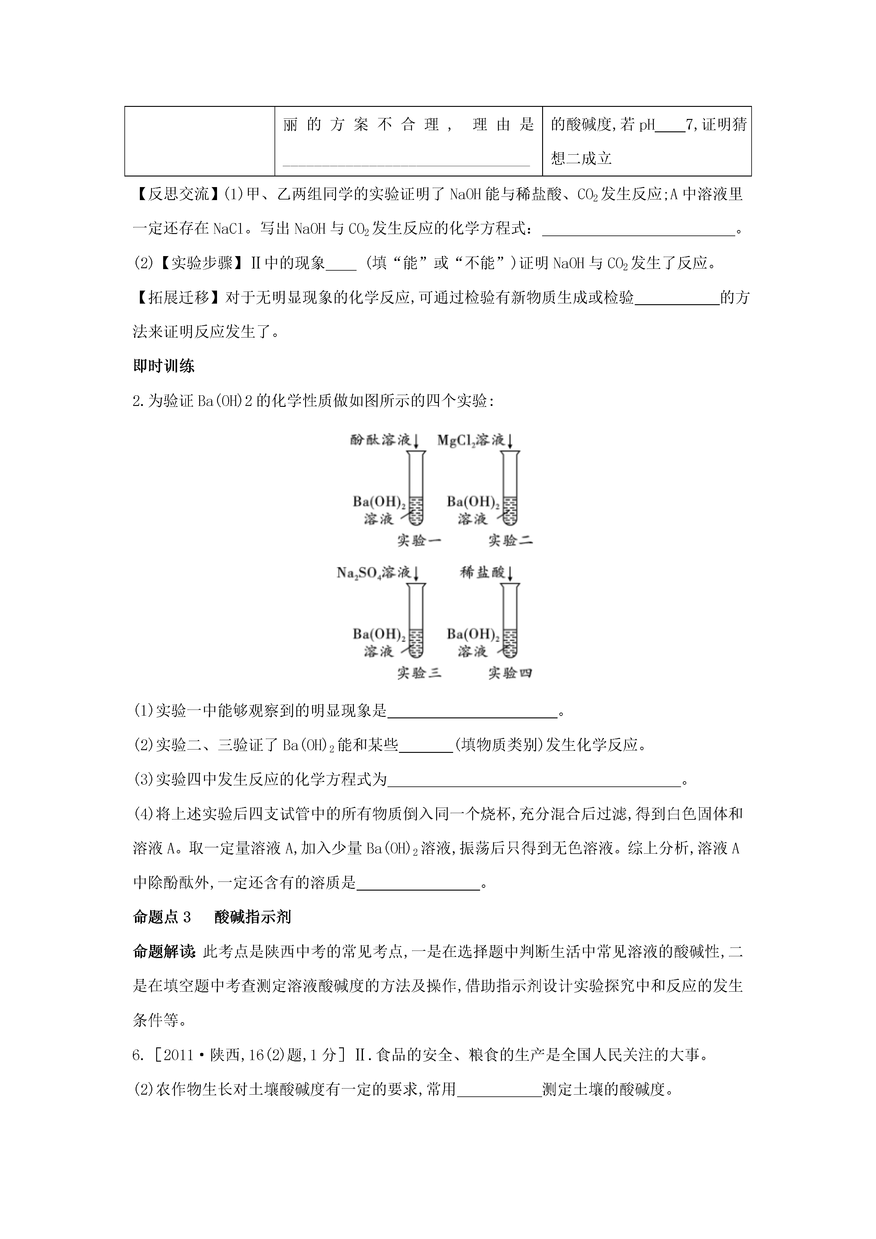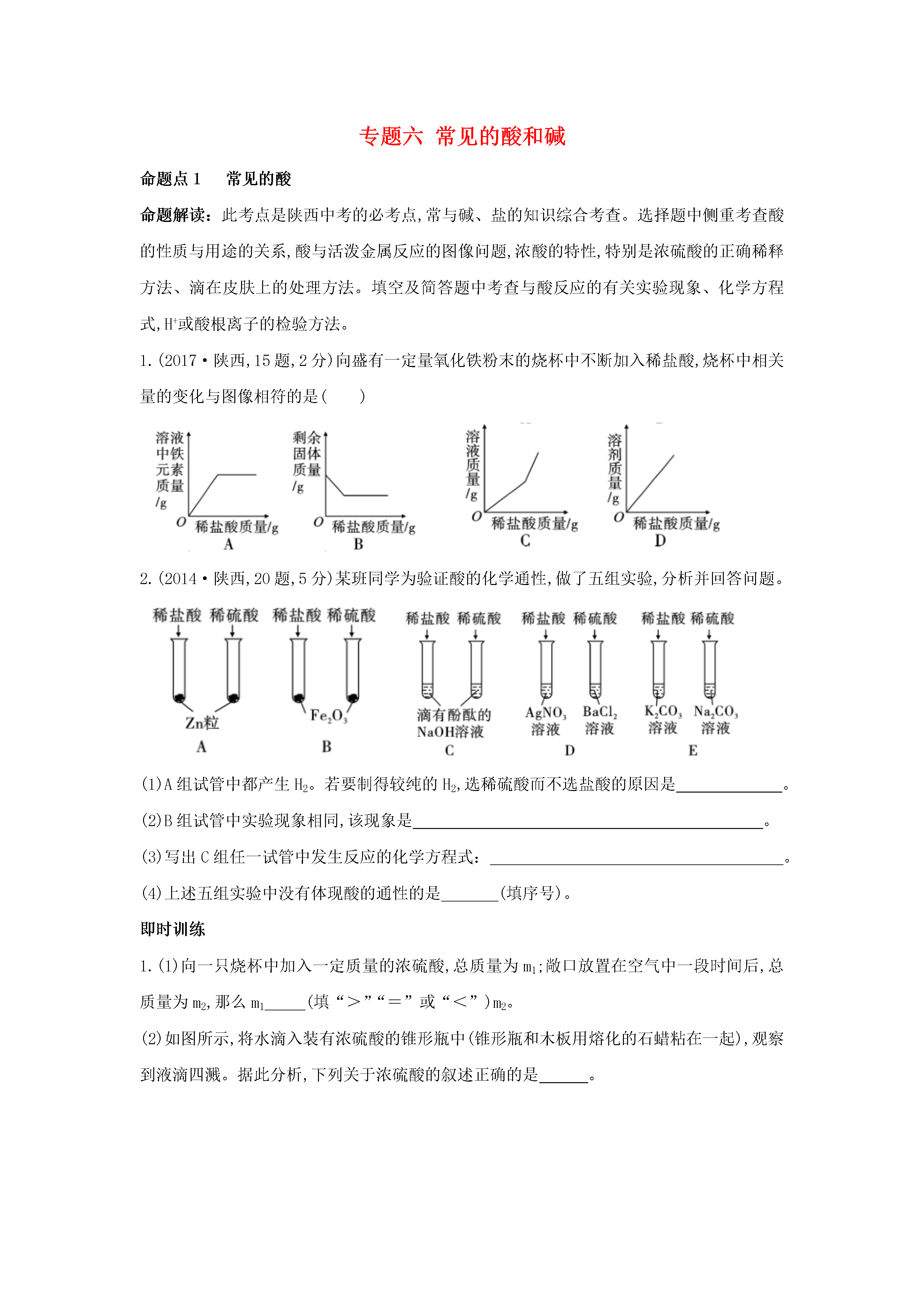 专题六常见的酸和碱命题点1常见的酸命题解读:此考点是陕西中考的必考点,常与碱、盐的知识综合考查。选择题中侧重考查酸的性质与用途的关系,酸与活泼金属反应的图像问题,浓酸的特性,特别是浓硫酸的正确稀释方法、滴在皮肤上的处理方法。填空及简答题中考查与酸反应的有关实验现象、化学方程式,H+或酸根离子的检验方法。1.(2017·陕西,15题,2分)向盛有一定量氧化铁粉末的烧杯中不断加入稀盐酸,烧杯中相关量的变化与图像相符的是()2.(2014·陕西,20题,5分)某班同学为验证酸的化学通性,做了五组实验,分析并回答问题。(1)A组试管中都产生H2。若要制得较纯的H2,选稀硫酸而不选盐酸的原因是。(2)B组试管中实验现象相同,该现象是。(3)写出C组任一试管中发生反应的化学方程式:。(4)上述五组实验中没有体现酸的通性的是(填序号)。即时训练1.(1)向一只烧杯中加入一定质量的浓硫酸,总质量为m1;敞口放置在空气中一段时间后,总质量为m2,那么m1(填“>”“=”或“<”)m2。(2)如图所示,将水滴入装有浓硫酸的锥形瓶中(锥形瓶和木板用熔化的石蜡粘在一起),观察到液滴四溅。据此分析,下列关于浓硫酸的叙述正确的是。A.稀释浓硫酸时,一定要将浓硫酸缓慢注入水中B.稀释浓硫酸时,一定要将水缓慢注入浓硫酸中C.浓硫酸充分溶于水后,提起锥形瓶,木板会脱离锥形瓶命题点2常见的碱命题解读:此考点是陕西中考的必考点。熟石灰的性质与用途常在选择题中判断正误或填空题中出现;盐与碱的反应常考查实验现象,生成特征颜色的沉淀;二氧化碳与氢氧化钠溶液的混合常设计不同装置,根据实验现象判断反应的发生;生石灰、熟石灰及烧碱的变质问题常以探究题的形式来考查。3.[2011·陕西,21(4)题,2分]化学是一门以实验为基础的科学,如图是初中化学中几个重要的对比实验。(4)实验4中,对比两支试管内液面高低的不同,可说明氢氧化钠能与二氧化碳发生反应,该反应的化学方程式为。4.(2013·陕西,18题,3分)许多化学反应都伴随着明显的现象,但也有一些观察不到明显现象。请回答下列问题:(1)向FeCl3溶液中滴加NaOH溶液,出现的明显现象是。(2)CO2与NaOH溶液的反应无明显现象。为证明二者发生了反应,小红同学设计了如图所示的实验。向一盛满CO2气体的锥形瓶中注入一定量的NaOH溶液,迅速塞紧橡皮塞(胶塞中插有一个下端系小气球的玻璃管)。然后振荡锥形瓶,会观察到小气球逐渐胀大,其主要原因是。(3)盐酸与NaOH溶液的中和反应也无明显现象,为证明二者确实发生了化学反应,在向NaOH溶液中滴加盐酸前,应先向NaOH溶液中滴入少许。5.(2018·陕西,22题,7分)化学兴趣小组的同学按图示装置及步骤验证氢氧化钠的化学性质。【实验步骤】Ⅰ.将注射器内的液体注入A中的锥形瓶。Ⅱ.打开K1,观察到C中部分红色溶液沿导管倒吸入A中,片刻后回流停止。Ⅲ.打开K2,观察到B中溶液倒吸入A、C中,液面稳定后观察到A中溶液仍为红色,C中溶液变为无色。同学们对相关问题分组展开如下探究。探究环节甲组的探究乙组的探究【提出问题】A中使酚酞变为红色的物质是什么?C中溶液为什么变成无色?【做出猜想】猜想一:Na2CO3猜想二:Na2CO3和NaOH猜想一:实验过程中酚酞变质了猜想二:溶液中的NaOH反应完了【实验验证】小鹏取少量A中溶液于试管中,向其中滴加过量BaCl2溶液,若观察到,证明猜想二成立。小丽认为用Ba(OH)2溶液也可证明猜想二成立,小鹏认为小丽的方案不合理,理由是________________________________(1)取少量C中溶液于试管中,向其中滴加NaOH溶液,溶液又变为红色,证明猜想一不成立。(2)用pH试纸测定C中溶液的酸碱度,若pH7,证明猜想二成立【反思交流】(1)甲、乙两组同学的实验证明了NaOH能与稀盐酸、CO2发生反应;A中溶液里一定还存在NaCl。写出NaOH与CO2发生反应的化学方程式:。(2)【实验步骤】Ⅱ中的现象(填“能”或“不能”)证明NaOH与CO2发生了反应。【拓展迁移】对于无明显现象的化学反应,可通过检验有新物质生成或检验的方法来证明反应发生了。即时训练2.为验证Ba(OH)2的化学性质做如图所示的四个实验:(1)实验一中能够观察到的明显现象是。(2)实验二、三验证了Ba(OH)2能和某些(填物质类别)发生化学反应。(3)实验四中发生反应的化学方程式为。(4)将上述实验后四支试管中的所有物质倒入同一个烧杯,充分混合后过滤,得到白色固体和溶液A。取一定量溶液A,加入少量Ba(OH)2溶液,振荡后只得到无色溶液。综上分析,溶液A中除酚酞外,一定还含有的