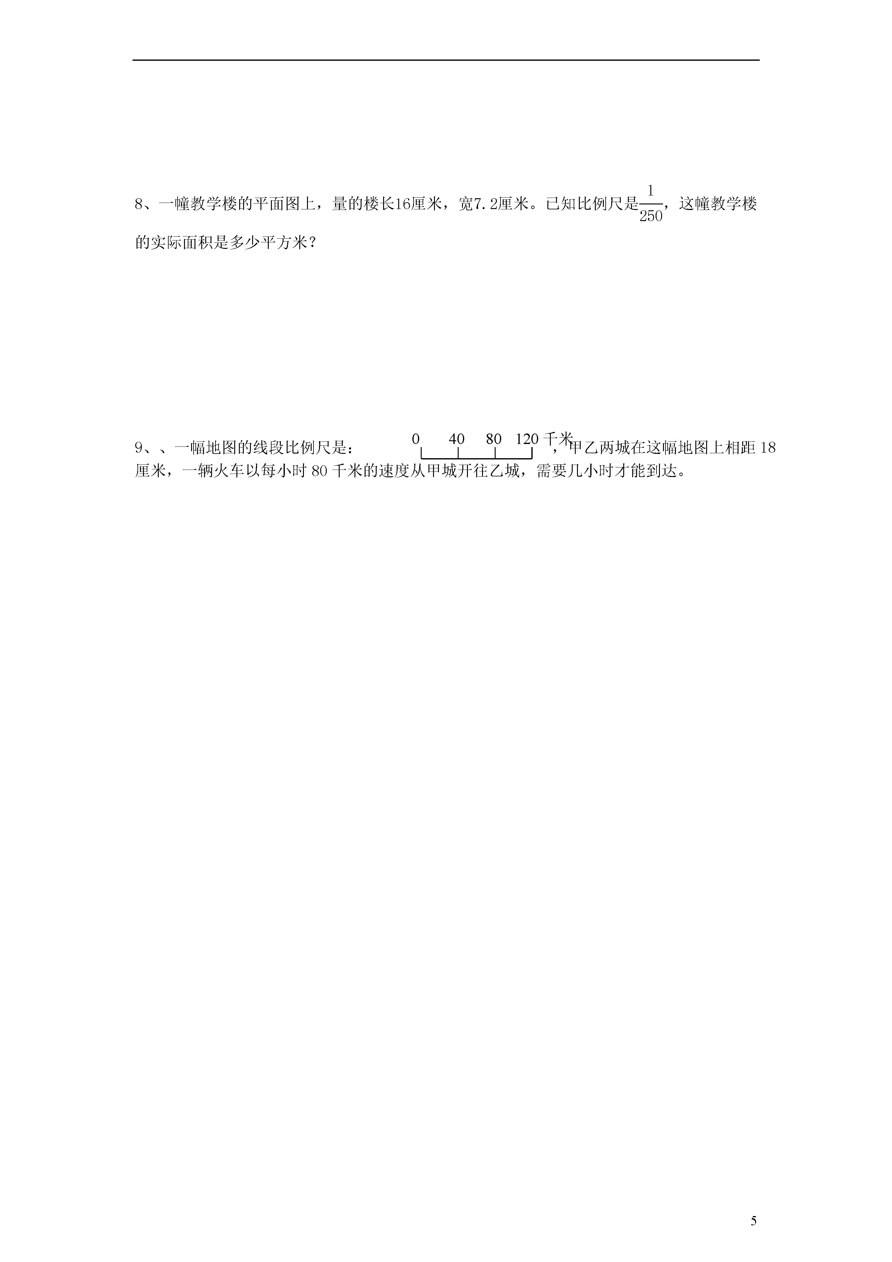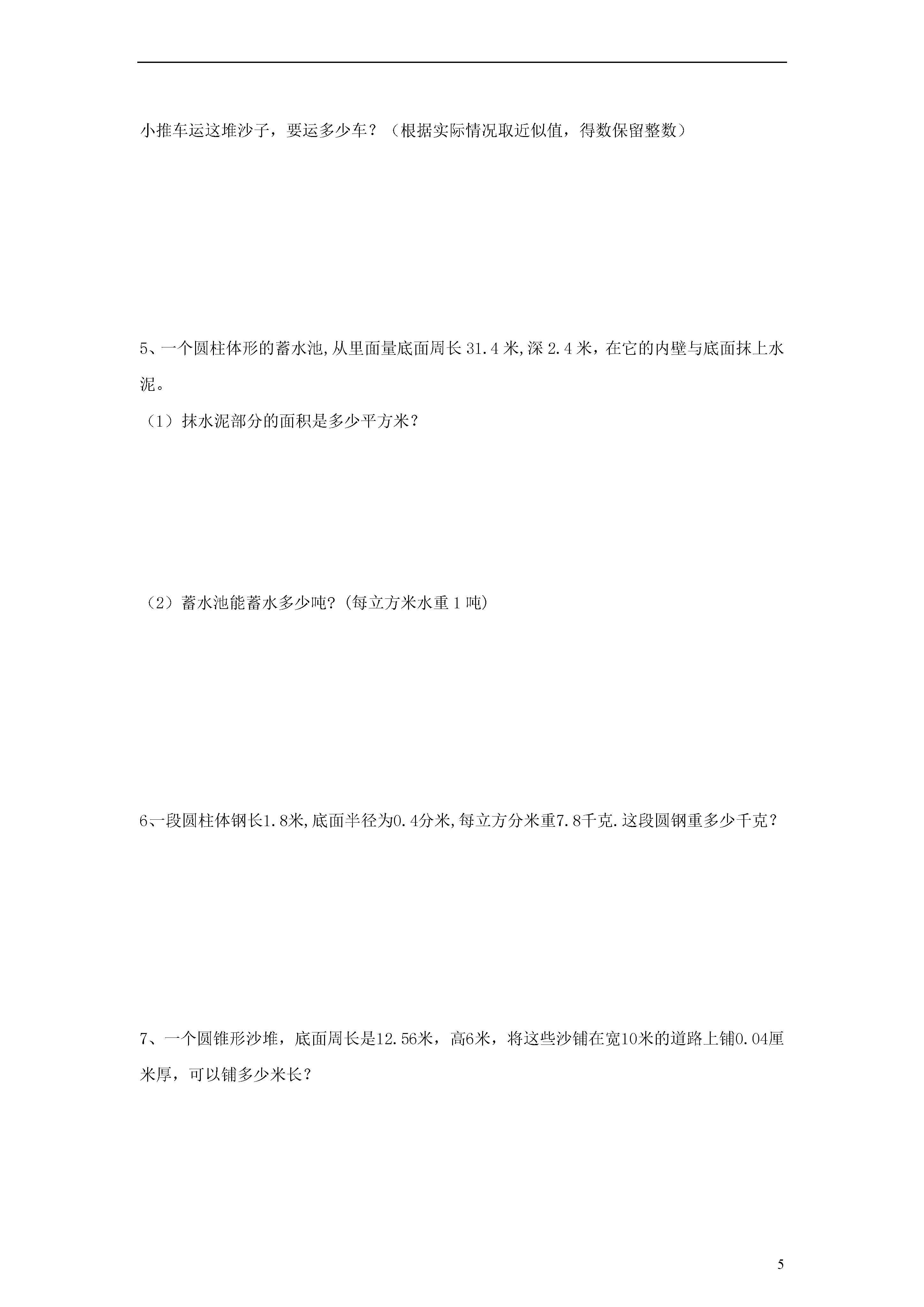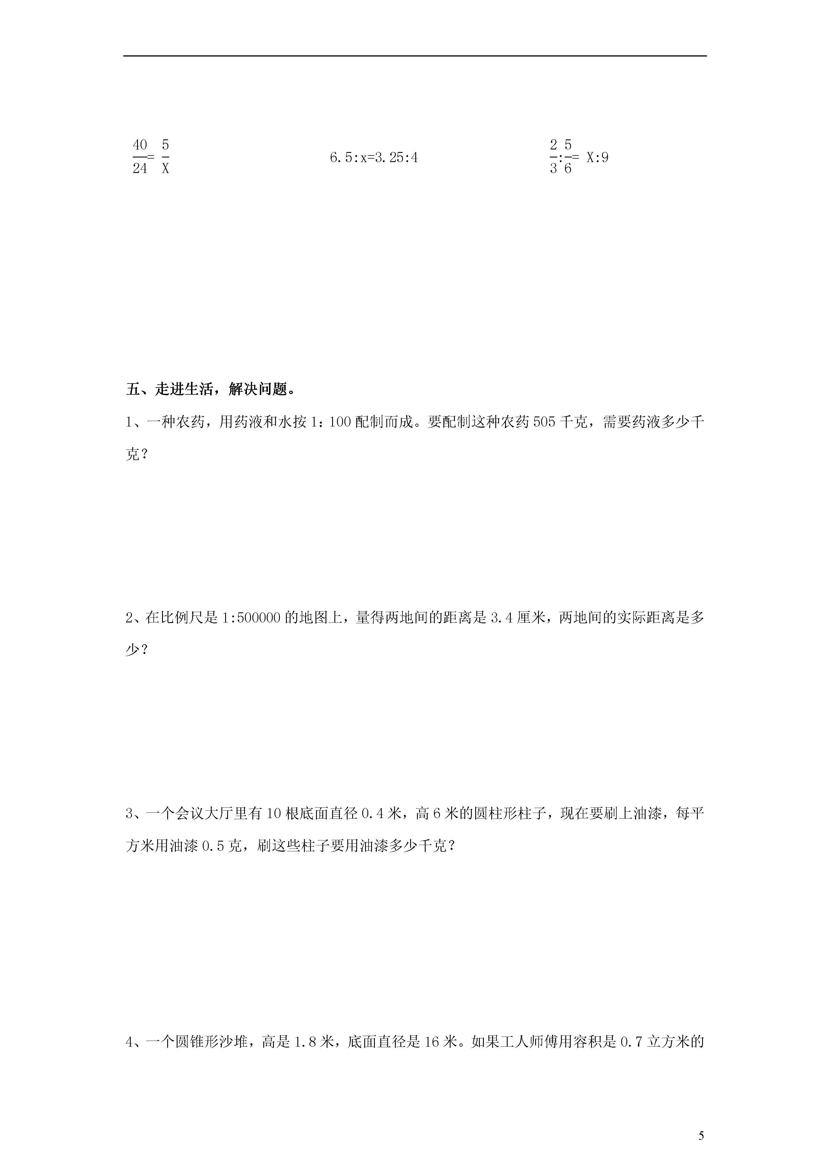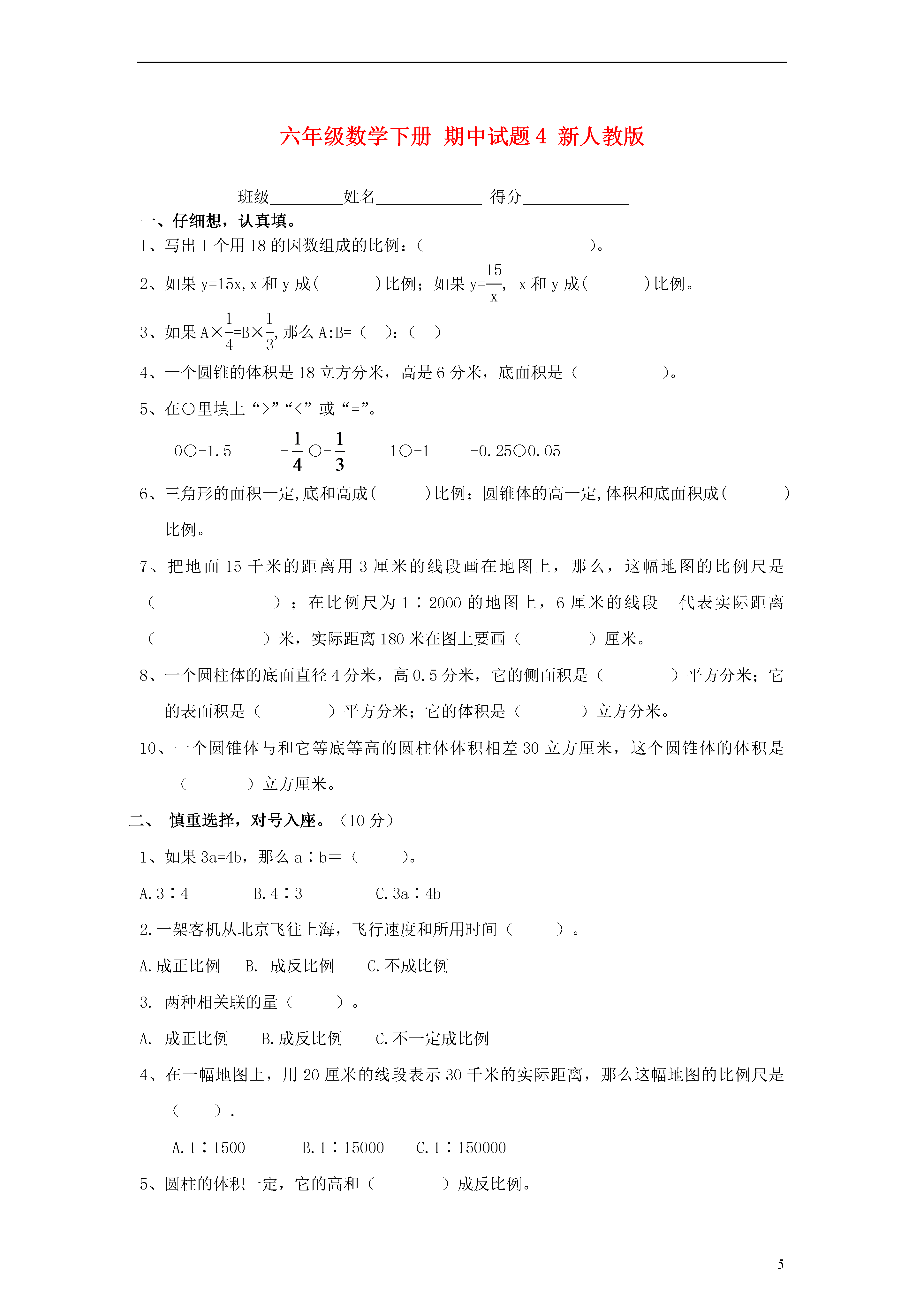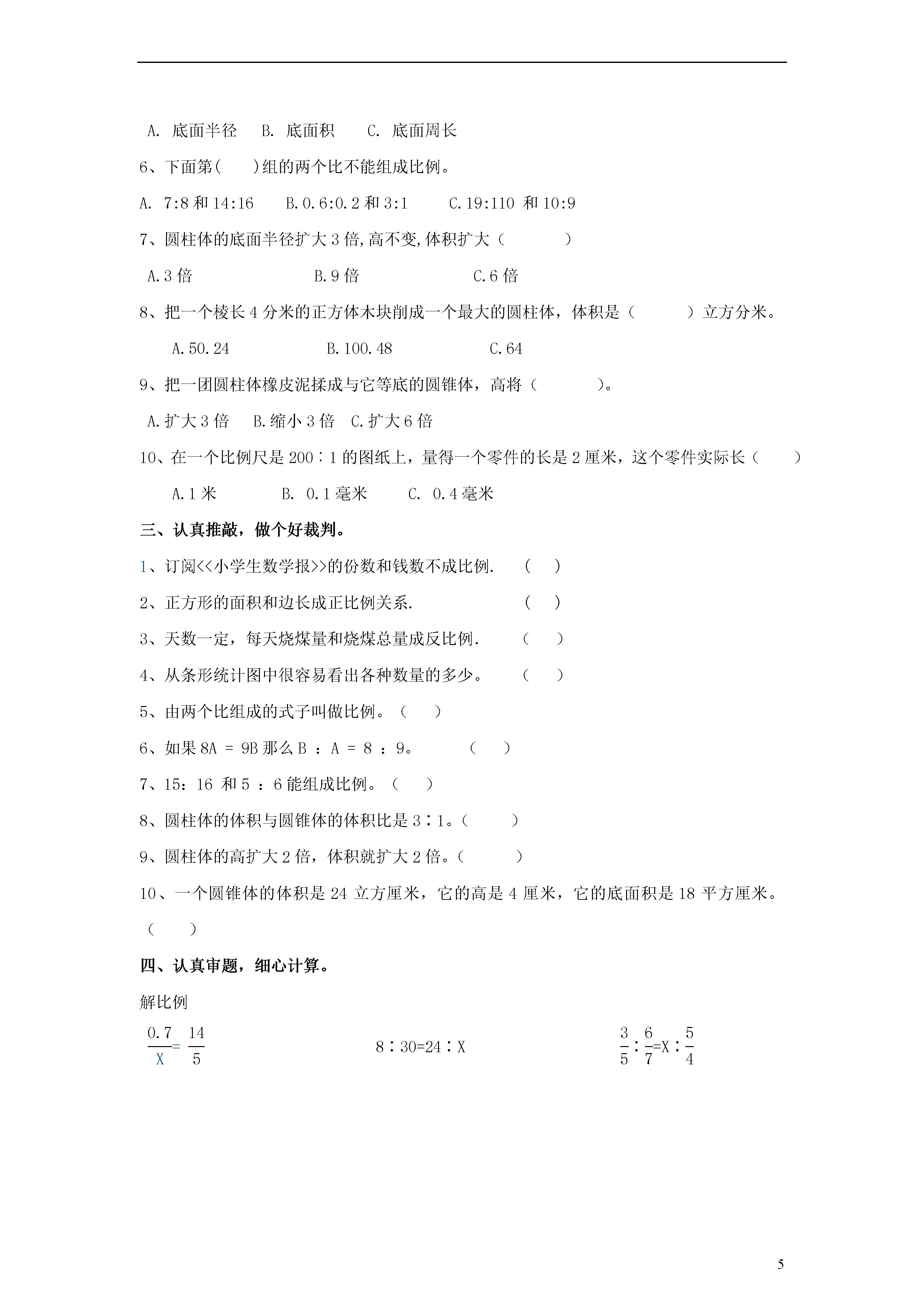5六年级数学下册期中试题4新人教版班级姓名得分一、仔细想,认真填。1、写出1个用18的因数组成的比例:()。2、如果y=15x,x和y成()比例;如果y=eq\f(15,x),x和y成()比例。3、如果A×EQ\F(1,4)=B×EQ\F(1,3),那么A:B=():()4、一个圆锥的体积是18立方分米,高是6分米,底面积是()。5、在○里填上“>”“<”或“=”。0○-1.5-○-1○-1-0.25○0.056、三角形的面积一定,底和高成()比例;圆锥体的高一定,体积和底面积成()比例。7、把地面15千米的距离用3厘米的线段画在地图上,那么,这幅地图的比例尺是();在比例尺为1∶2000的地图上,6厘米的线段代表实际距离()米,实际距离180米在图上要画()厘米。8、一个圆柱体的底面直径4分米,高0.5分米,它的侧面积是()平方分米;它的表面积是()平方分米;它的体积是()立方分米。10、一个圆锥体与和它等底等高的圆柱体体积相差30立方厘米,这个圆锥体的体积是()立方厘米。二、慎重选择,对号入座。(10分)1、如果3a=4b,那么a∶b=()。A.3∶4B.4∶3C.3a∶4b2.一架客机从北京飞往上海,飞行速度和所用时间()。A.成正比例B.成反比例C.不成比例3.两种相关联的量()。A.成正比例B.成反比例C.不一定成比例4、在一幅地图上,用20厘米的线段表示30千米的实际距离,那么这幅地图的比例尺是().A.1∶1500B.1∶15000C.1∶1500005、圆柱的体积一定,它的高和()成反比例。A.底面半径B.底面积C.底面周长6、下面第()组的两个比不能组成比例。A.7:8和14:16B.0.6:0.2和3:1C.19:110和10:97、圆柱体的底面半径扩大3倍,高不变,体积扩大()A.3倍B.9倍C.6倍8、把一个棱长4分米的正方体木块削成一个最大的圆柱体,体积是()立方分米。A.50.24B.100.48C.649、把一团圆柱体橡皮泥揉成与它等底的圆锥体,高将()。A.扩大3倍B.缩小3倍C.扩大6倍10、在一个比例尺是200︰1的图纸上,量得一个零件的长是2厘米,这个零件实际长()A.1米B.0.1毫米C.0.4毫米三、认真推敲,做个好裁判。1、订阅<<小学生数学报>>的份数和钱数不成比例.()2、正方形的面积和边长成正比例关系.()3、天数一定,每天烧煤量和烧煤总量成反比例.()4、从条形统计图中很容易看出各种数量的多少。()5、由两个比组成的式子叫做比例。()6、如果8A=9B那么B:A=8:9。()7、15:16和5:6能组成比例。()8、圆柱体的体积与圆锥体的体积比是3∶1。()9、圆柱体的高扩大2倍,体积就扩大2倍。()10、一个圆锥体的体积是24立方厘米,它的高是4厘米,它的底面积是18平方厘米。()四、认真审题,细心计算。解比例eq\f(0.7,X)=eq\f(14,5)8∶30=24∶Xeq\f(3,5)∶eq\f(6,7)=X∶eq\f(5,4)eq\f(40,24)=eq\f(5,X)6.5:x=3.25:4eq\f(2,3):eq\f(5,6)=X:9五、走进生活,解决问题。1、一种农药,用药液和水按1:100配制而成。要配制这种农药505千克,需要药液多少千克?2、在比例尺是1:500000的地图上,量得两地间的距离是3.4厘米,两地间的实际距离是多少?3、一个会议大厅里有10根底面直径0.4米,高6米的圆柱形柱子,现在要刷上油漆,每平方米用油漆0.5克,刷这些柱子要用油漆多少千克?4、一个圆锥形沙堆,高是1.8米,底面直径是16米。如果工人师傅用容积是0.7立方米的小推车运这堆沙子,要运多少车?(根据实际情况取近似值,得数保留整数)5、一个圆柱体形的蓄水池,从里面量底面周长31.4米,深2.4米,在它的内壁与底面抹上水泥。抹水泥部分的面积是多少平方米?(2)蓄水池能蓄水多少吨?(每立方米水重1吨)6、一段圆柱体钢长1.8米,底面半径为0.4分米,每立方分米重7.8千克.这段圆钢重多少千克?7、一个圆锥形沙堆,底面周长是12.56米,高6米,将这些沙铺在宽10米的道路上铺0.04厘米厚,可以铺多少米长?8、一幢教学楼的平面图上,量的楼长16厘米,宽7.2厘米。已知比例尺是EQ\F(1