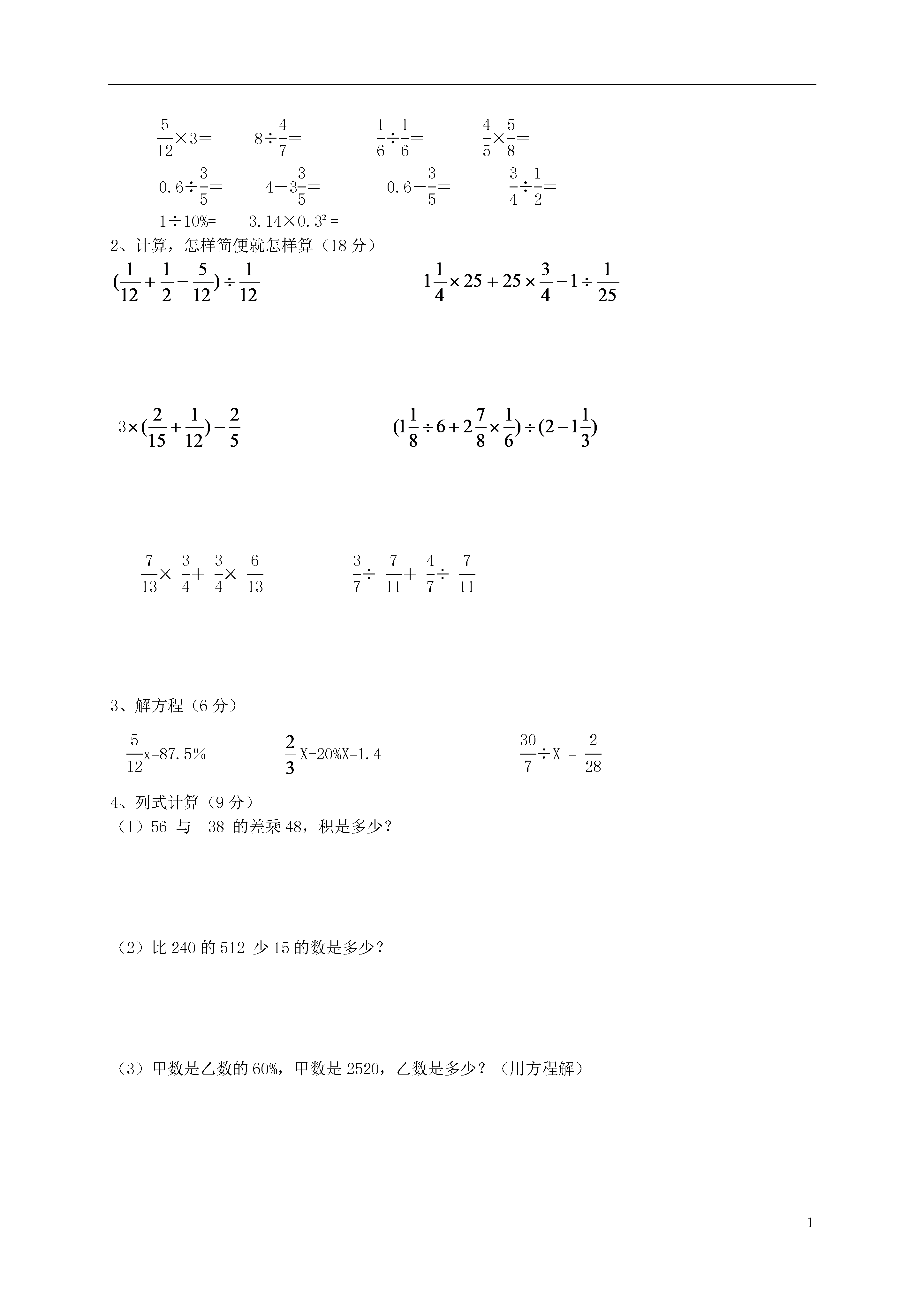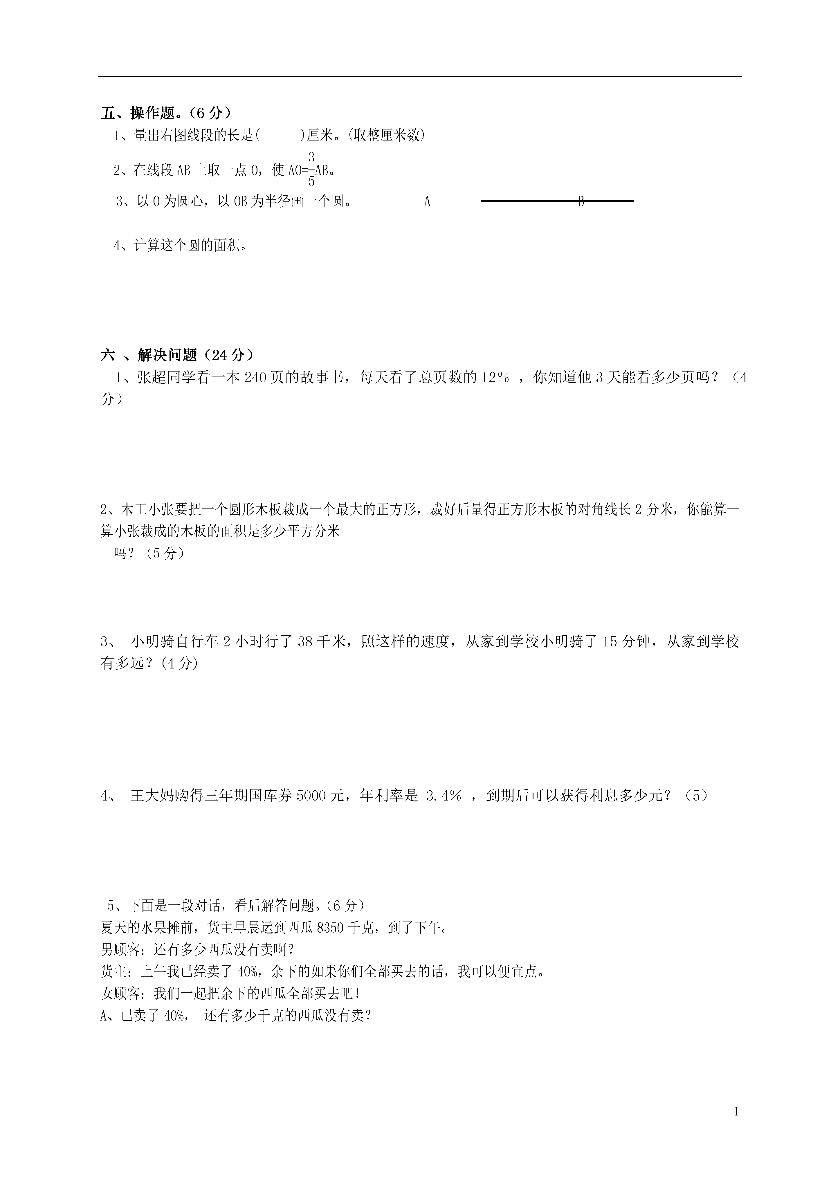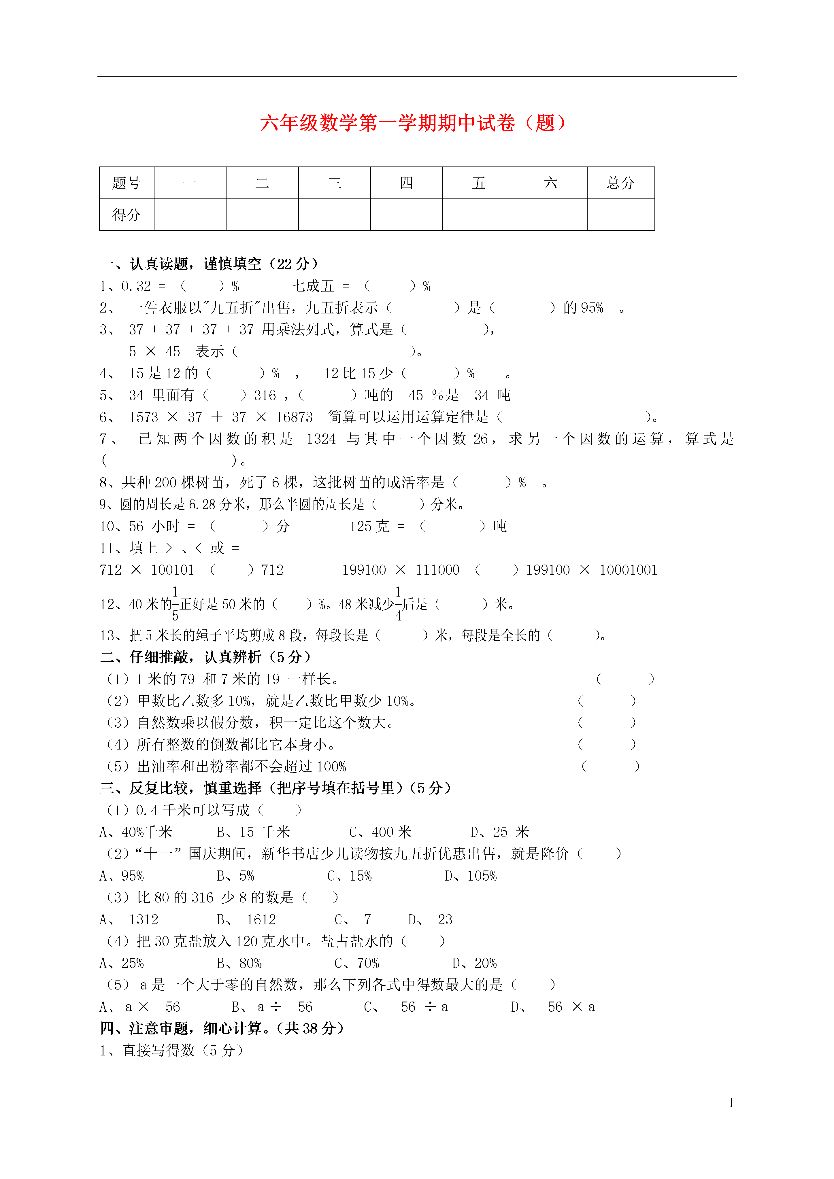 1六年级数学第一学期期中试卷(题)题号一二三四五六总分得分一、认真读题,谨慎填空(22分)1、0.32=()%七成五=()%2、一件衣服以"九五折"出售,九五折表示()是()的95%。3、37+37+37+37用乘法列式,算式是(),5×45表示()。4、15是12的()%,12比15少()%。5、34里面有()316,()吨的45%是34吨6、1573×37+37×16873简算可以运用运算定律是()。7、已知两个因数的积是1324与其中一个因数26,求另一个因数的运算,算式是()。8、共种200棵树苗,死了6棵,这批树苗的成活率是()%。9、圆的周长是6.28分米,那么半圆的周长是()分米。10、56小时=()分125克=()吨11、填上>、<或=712×100101()712199100×111000()199100×1000100112、40米的EQ\F(1,5)正好是50米的()%。48米减少EQ\F(1,4)后是()米。13、把5米长的绳子平均剪成8段,每段长是()米,每段是全长的()。二、仔细推敲,认真辨析(5分)(1)1米的79和7米的19一样长。()(2)甲数比乙数多10%,就是乙数比甲数少10%。()(3)自然数乘以假分数,积一定比这个数大。()(4)所有整数的倒数都比它本身小。()(5)出油率和出粉率都不会超过100%()三、反复比较,慎重选择(把序号填在括号里)(5分)(1)0.4千米可以写成()A、40%千米B、15千米C、400米D、25米(2)“十一”国庆期间,新华书店少儿读物按九五折优惠出售,就是降价()A、95%B、5%C、15%D、105%(3)比80的316少8的数是()A、1312B、1612C、7D、23(4)把30克盐放入120克水中。盐占盐水的()A、25%B、80%C、70%D、20%(5)a是一个大于零的自然数,那么下列各式中得数最大的是()A、a×56B、a÷56C、56÷aD、56×a四、注意审题,细心计算。(共38分)1、直接写得数(5分)EQ\F(5,12)×3=8÷EQ\F(4,7)=EQ\F(1,6)÷EQ\F(1,6)=EQ\F(4,5)×EQ\F(5,8)=0.6÷EQ\F(3,5)=4-3EQ\F(3,5)=0.6-EQ\F(3,5)=EQ\F(3,4)÷EQ\F(1,2)=1÷10%=3.14×0.3²=2、计算,怎样简便就怎样算(18分)3eq\f(7,13)×eq\f(3,4)+eq\f(3,4)×eq\f(6,13)eq\f(3,7)÷eq\f(7,11)+eq\f(4,7)÷eq\f(7,11)3、解方程(6分)EQ\F(5,12)x=87.5%X-20%X=1.4eq\f(30,7)÷X=eq\f(2,28)4、列式计算(9分)(1)56与38的差乘48,积是多少?(2)比240的512少15的数是多少?(3)甲数是乙数的60%,甲数是2520,乙数是多少?(用方程解)五、操作题。(6分)1、量出右图线段的长是()厘米。(取整厘米数)2、在线段AB上取一点O,使AO=EQ\F(3,5)AB。3、以O为圆心,以OB为半径画一个圆。AB4、计算这个圆的面积。六、解决问题(24分)1、张超同学看一本240页的故事书,每天看了总页数的12%,你知道他3天能看多少页吗?(4分)2、木工小张要把一个圆形木板裁成一个最大的正方形,裁好后量得正方形木板的对角线长2分米,你能算一算小张裁成的木板的面积是多少平方分米吗?(5分)3、小明骑自行车2小时行了38千米,照这样的速度,从家到学校小明骑了15分钟,从家到学校有多远?(4分)4、王大妈购得三年期国库券5000元,年利率是3.4%,到期后可以获得利息多少元?(5)5、下面是一段对话,看后解答问题。(6分)夏天的水果摊前,货主早晨运到西瓜8350千克,到了下午。男顾客:还有多少西瓜没有卖啊?货主:上午我已经卖了40%,余下的如果你们全部买去的话,我可以便宜点。女顾客:我们一起把余下的西瓜全部买去吧!A、已卖了40%,还有多少千克的西瓜没有卖?B、如果女顾客买的西瓜是男顾客的EQ\F(2,3),他们各买了多少千克?