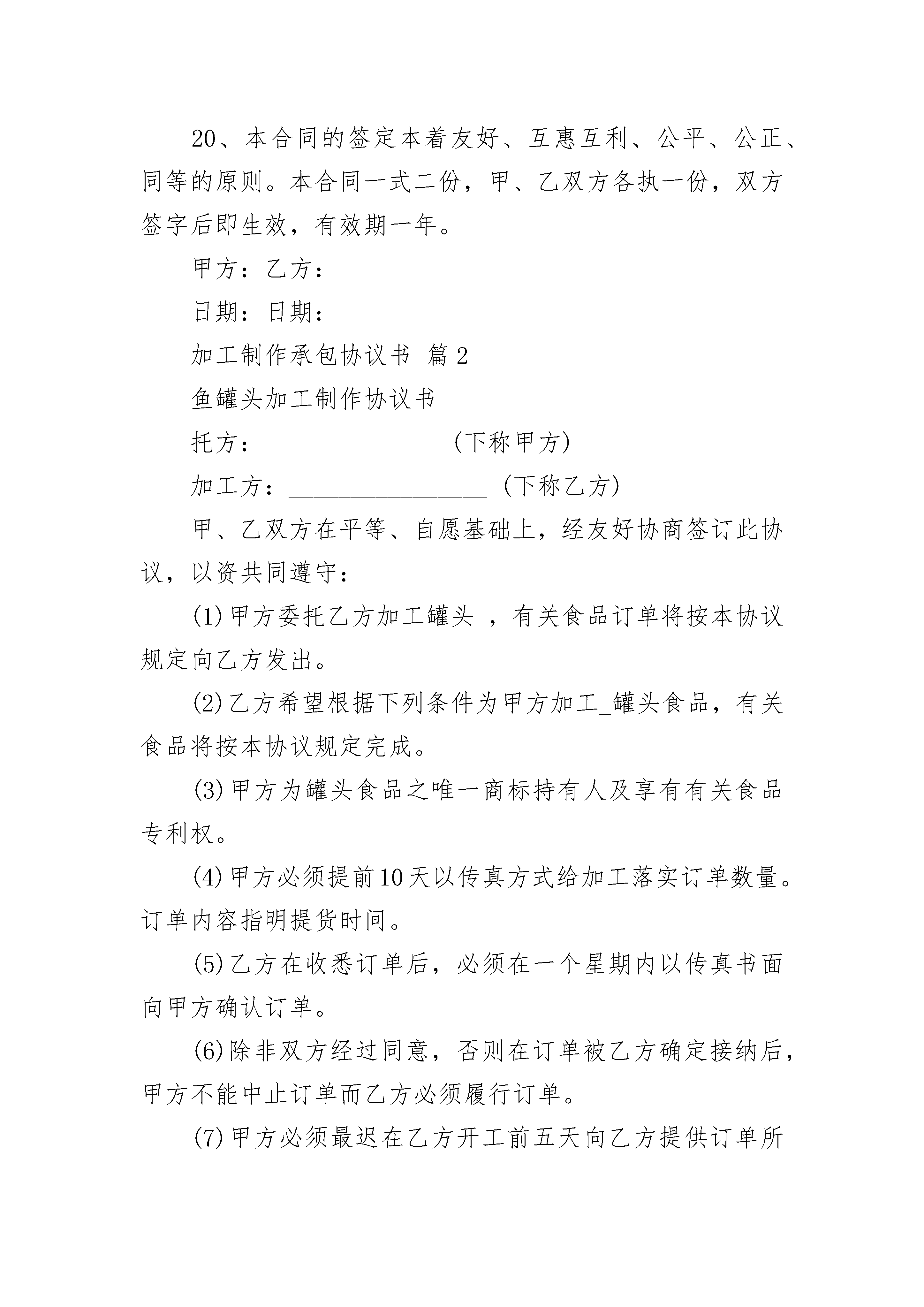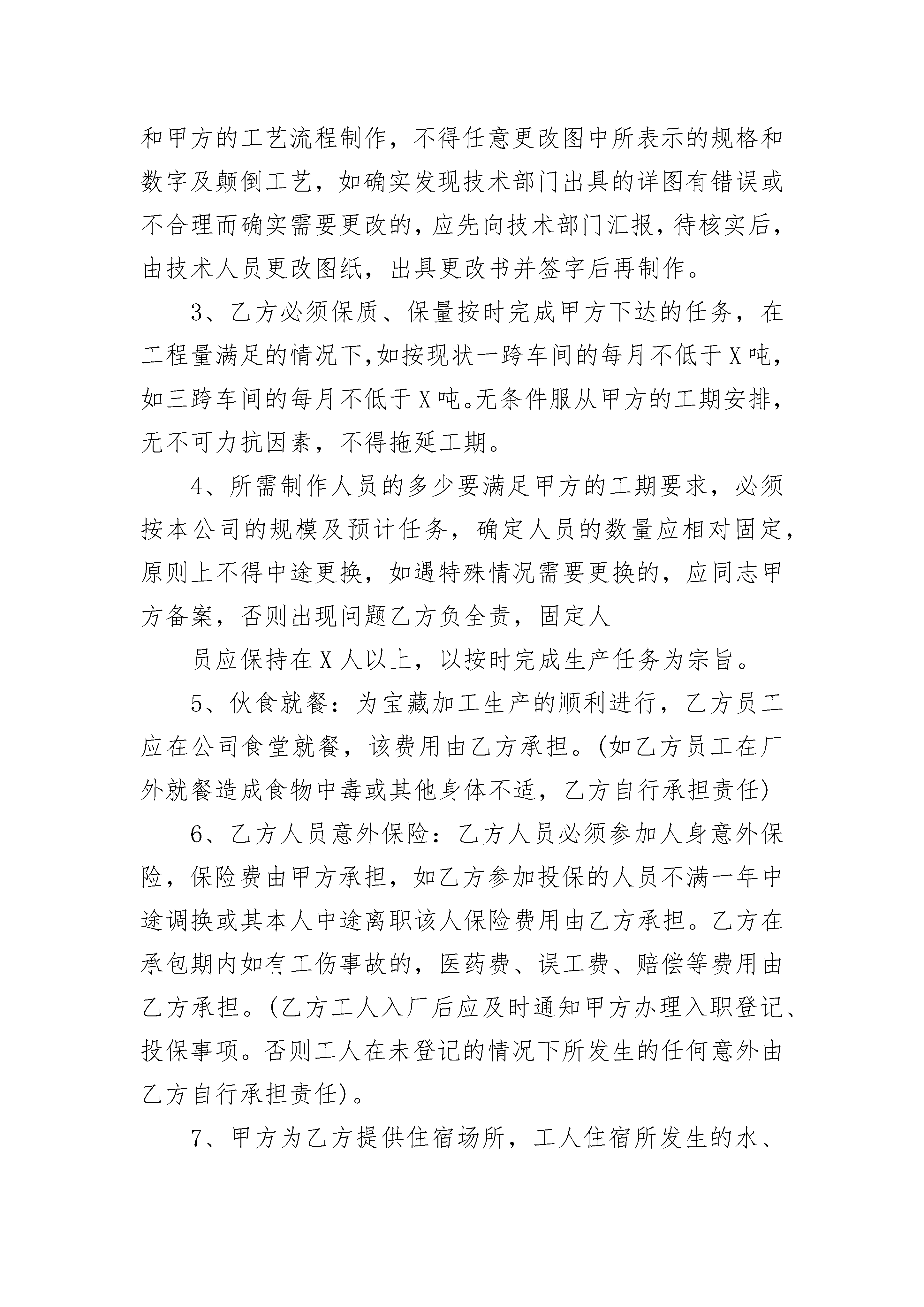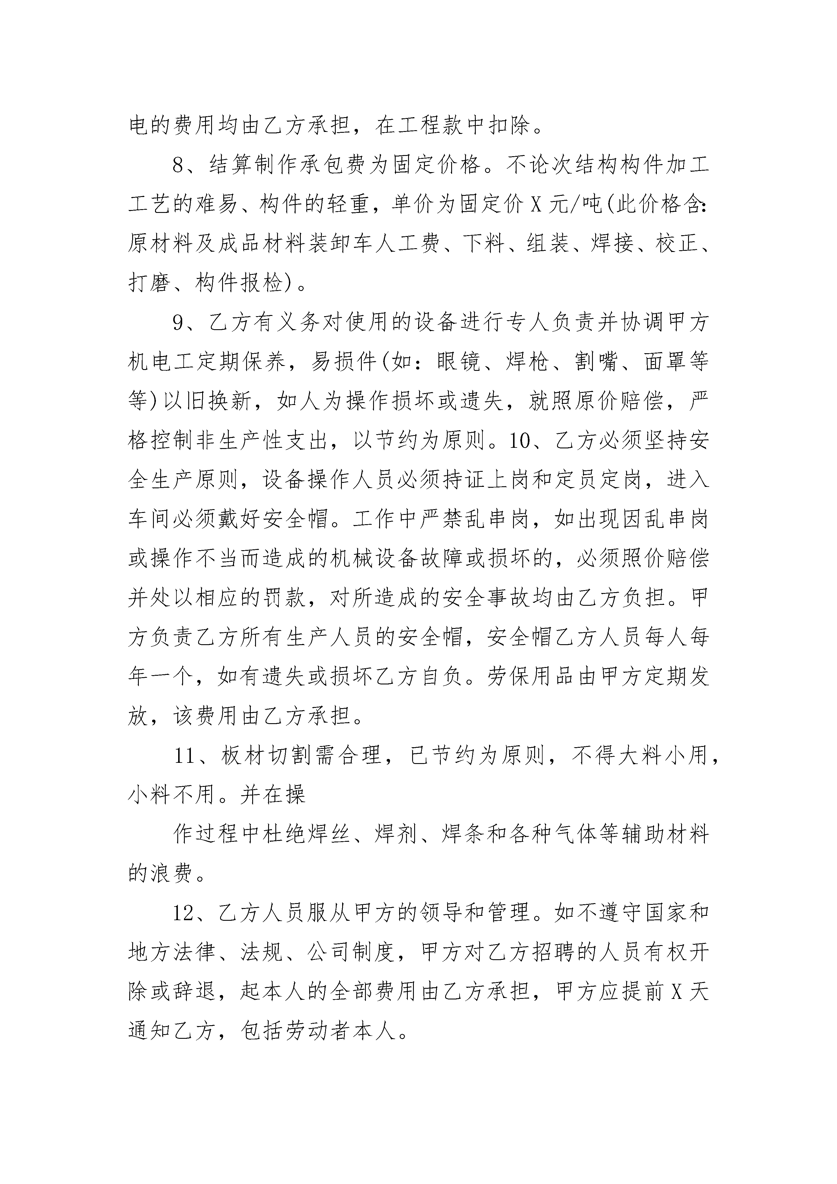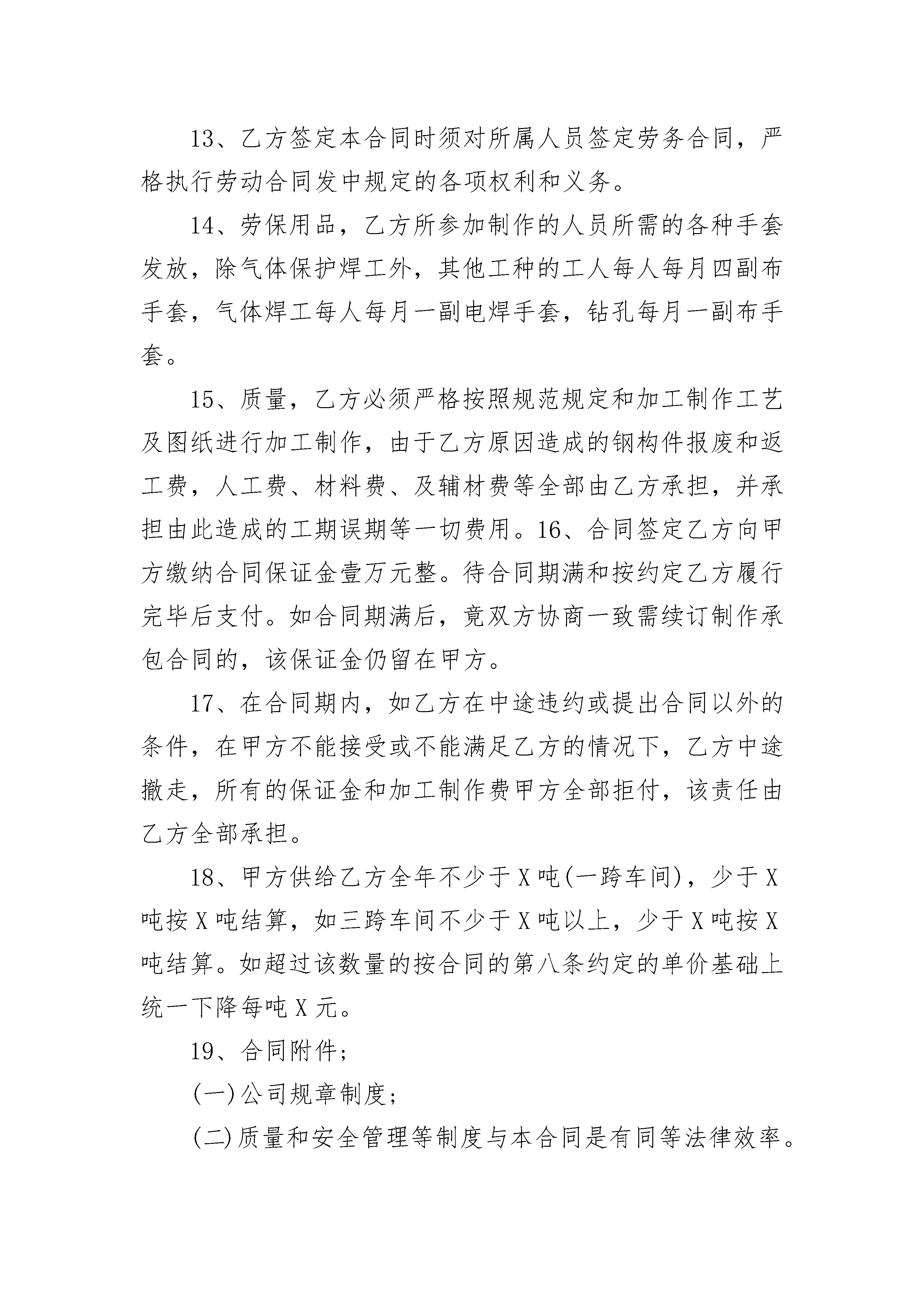 加工制作承包协议书加工制作承包协议书(通用21篇)加工制作承包协议书篇1甲方:乙方:身份证号:一、劳务名称:钢结构加工制作二、制作地点:三、工期:按公司的工期要求要成交付成品四、质量要求:执行公司的工艺文件要求甲方将钢结构车间的加工制作工作承包给乙方,为明确双方的责任、权利和义务特签定本合同,双方必须严格遵守。甲、乙双方必须认真贯彻执行国家的有关劳动合同和劳动保护条例,遵守公司的有关规章制度,严格执行安全生产的方针。具体合同条款如下:1、甲方将X年度X月份(以阳历年为准)的钢结构车间的钢构件制作承包给乙放,甲方负责提供制作钢结构所需要的机械设备、原材料、辅助材料、耗用材料。乙方提供完成钢构件所需的人员,招聘来的相关技术人员必须具有国家认可的资格证书和上岗证,乙方招聘的所有人员必须与劳动者本人签订好劳动合同交甲方公司备案。2、甲方负责每一批钢构件的细图详图,乙方必须按甲方的详图出材料单及下料。乙方必须严格按国家和行业标准和甲方的工艺流程制作,不得任意更改图中所表示的规格和数字及颠倒工艺,如确实发现技术部门出具的详图有错误或不合理而确实需要更改的,应先向技术部门汇报,待核实后,由技术人员更改图纸,出具更改书并签字后再制作。3、乙方必须保质、保量按时完成甲方下达的任务,在工程量满足的情况下,如按现状一跨车间的每月不低于X吨,如三跨车间的每月不低于X吨。无条件服从甲方的工期安排,无不可力抗因素,不得拖延工期。4、所需制作人员的多少要满足甲方的工期要求,必须按本公司的规模及预计任务,确定人员的数量应相对固定,原则上不得中途更换,如遇特殊情况需要更换的,应同志甲方备案,否则出现问题乙方负全责,固定人员应保持在X人以上,以按时完成生产任务为宗旨。5、伙食就餐:为宝藏加工生产的顺利进行,乙方员工应在公司食堂就餐,该费用由乙方承担。(如乙方员工在厂外就餐造成食物中毒或其他身体不适,乙方自行承担责任)6、乙方人员意外保险:乙方人员必须参加人身意外保险,保险费由甲方承担,如乙方参加投保的人员不满一年中途调换或其本人中途离职该人保险费用由乙方承担。乙方在承包期内如有工伤事故的,医药费、误工费、赔偿等费用由乙方承担。(乙方工人入厂后应及时通知甲方办理入职登记、投保事项。否则工人在未登记的情况下所发生的任何意外由乙方自行承担责任)。7、甲方为乙方提供住宿场所,工人住宿所发生的水、电的费用均由乙方承担,在工程款中扣除。8、结算制作承包费为固定价格。不论次结构构件加工工艺的难易、构件的轻重,单价为固定价X元/吨(此价格含:原材料及成品材料装卸车人工费、下料、组装、焊接、校正、打磨、构件报检)。9、乙方有义务对使用的设备进行专人负责并协调甲方机电工定期保养,易损件(如:眼镜、焊枪、割嘴、面罩等等)以旧换新,如人为操作损坏或遗失,就照原价赔偿,严格控制非生产性支出,以节约为原则。10、乙方必须坚持安全生产原则,设备操作人员必须持证上岗和定员定岗,进入车间必须戴好安全帽。工作中严禁乱串岗,如出现因乱串岗或操作不当而造成的机械设备故障或损坏的,必须照价赔偿并处以相应的罚款,对所造成的安全事故均由乙方负担。甲方负责乙方所有生产人员的安全帽,安全帽乙方人员每人每年一个,如有遗失或损坏乙方自负。劳保用品由甲方定期发放,该费用由乙方承担。11、板材切割需合理,已节约为原则,不得大料小用,小料不用。并在操作过程中杜绝焊丝、焊剂、焊条和各种气体等辅助材料的浪费。12、乙方人员服从甲方的领导和管理。如不遵守国家和地方法律、法规、公司制度,甲方对乙方招聘的人员有权开除或辞退,起本人的全部费用由乙方承担,甲方应提前X天通知乙方,包括劳动者本人。13、乙方签定本合同时须对所属人员签定劳务合同,严格执行劳动合同发中规定的各项权利和义务。14、劳保用品,乙方所参加制作的人员所需的各种手套发放,除气体保护焊工外,其他工种的工人每人每月四副布手套,气体焊工每人每月一副电焊手套,钻孔每月一副布手套。15、质量,乙方必须严格按照规范规定和加工制作工艺及图纸进行加工制作,由于乙方原因造成的钢构件报废和返工费,人工费、材料费、及辅材费等全部由乙方承担,并承担由此造成的工期误期等一切费用。16、合同签定乙方向甲方缴纳合同保证金壹万元整。待合同期满和按约定乙方履行完毕后支付。如合同期满后,竟双方协商一致需续订制作承包合同的,该保证金仍留在甲方。17、在合同期内,如乙方在中途违约或提出合同以外的条件,在甲方不能接受或不能满足乙方的情况下,乙方中途撤走,所有的保证金和加工制作费甲方全部拒付,该责任由乙方全部承担。18、甲方供给乙方全年不少于X吨(一跨车间),少于X吨按X吨结算,如三跨车间不少于X吨以上,少于X吨按X吨结算。如超过该数量的按合同的第八条约定的单价基础上统一下降每吨X元。19、合同附件;(一)
