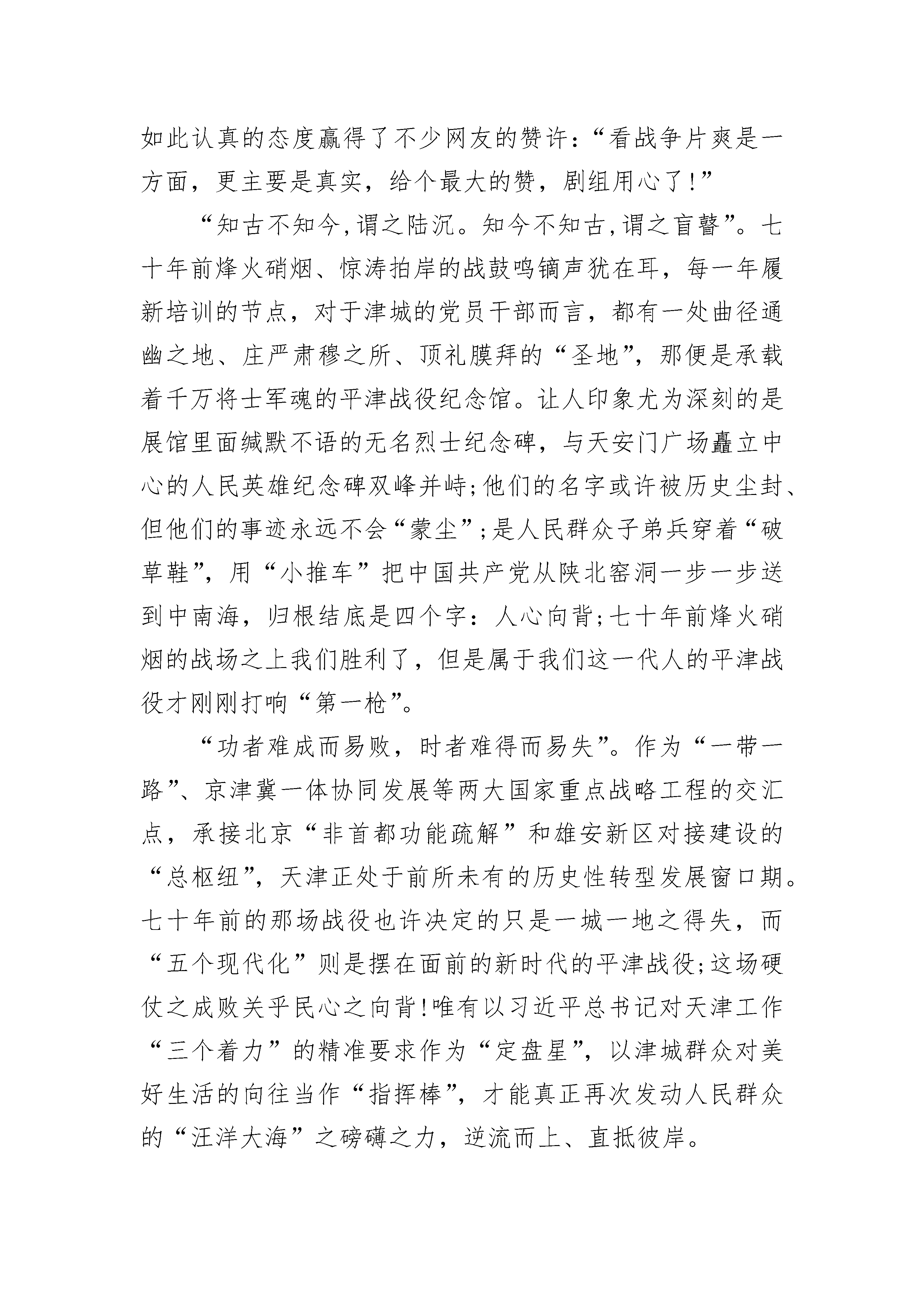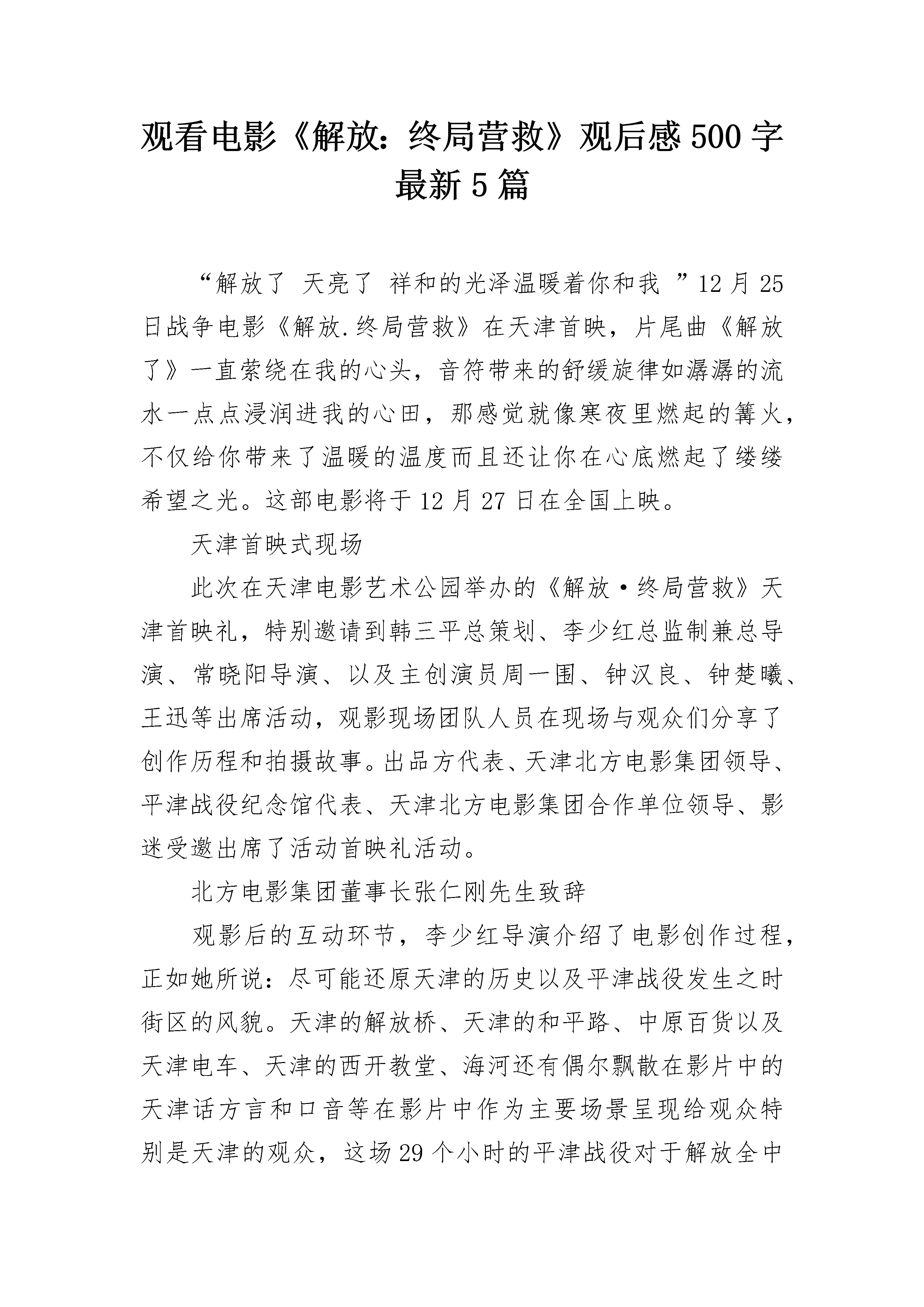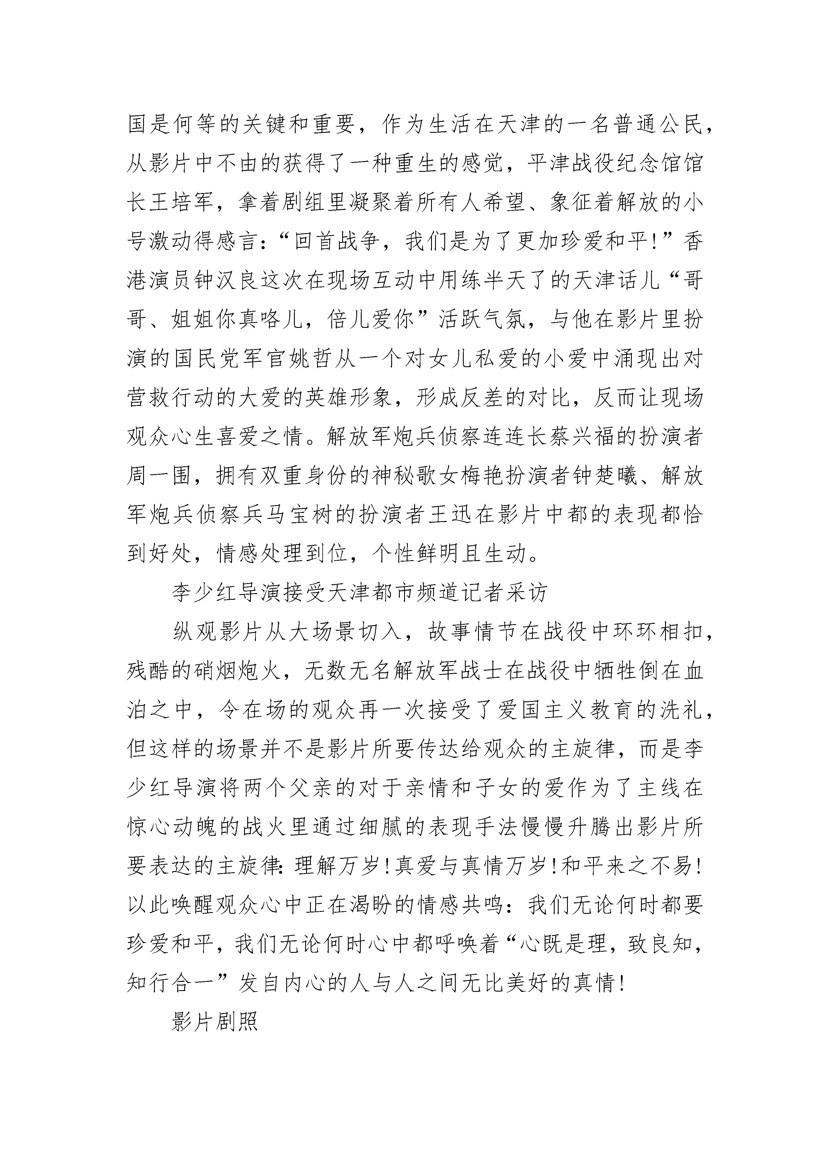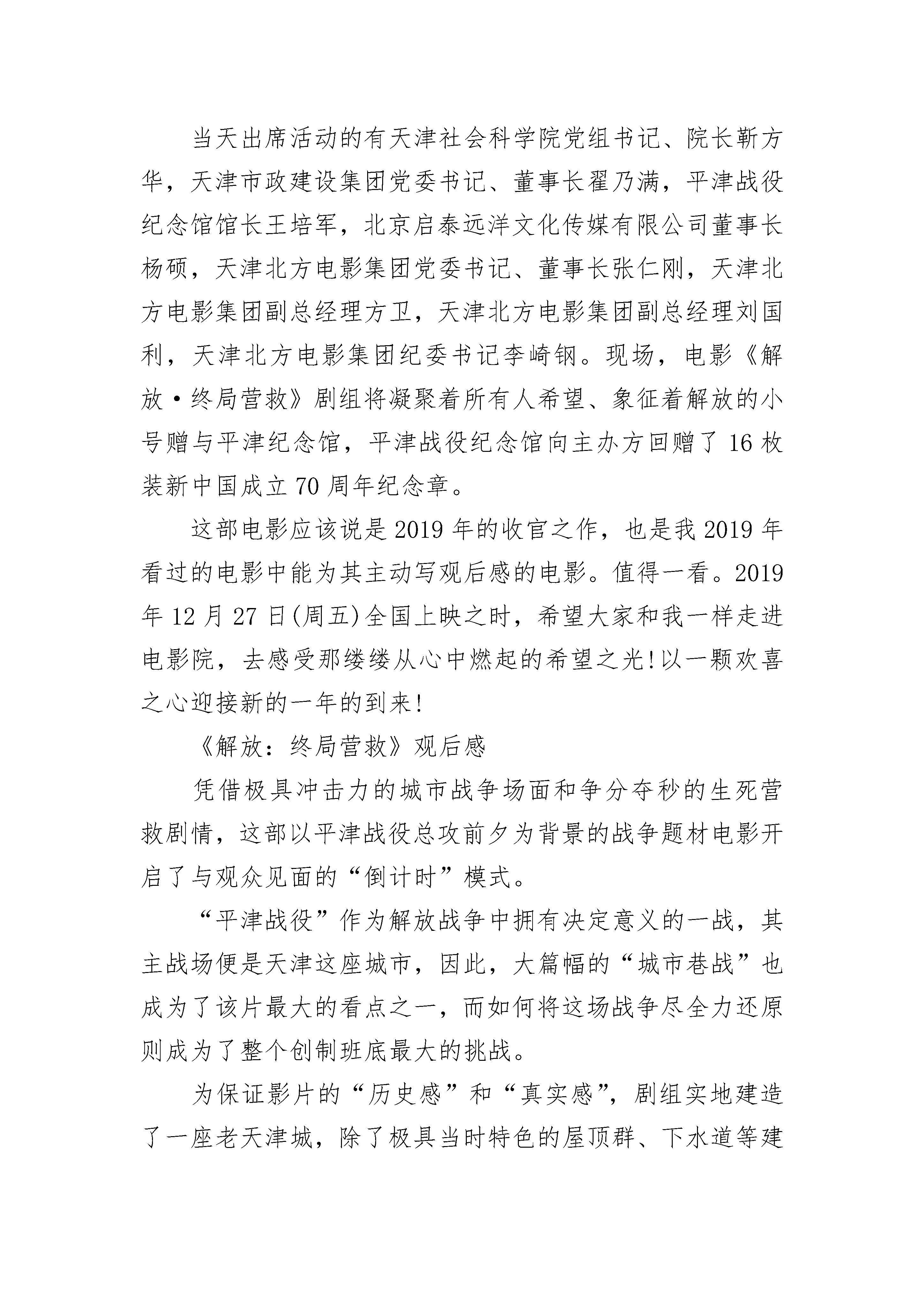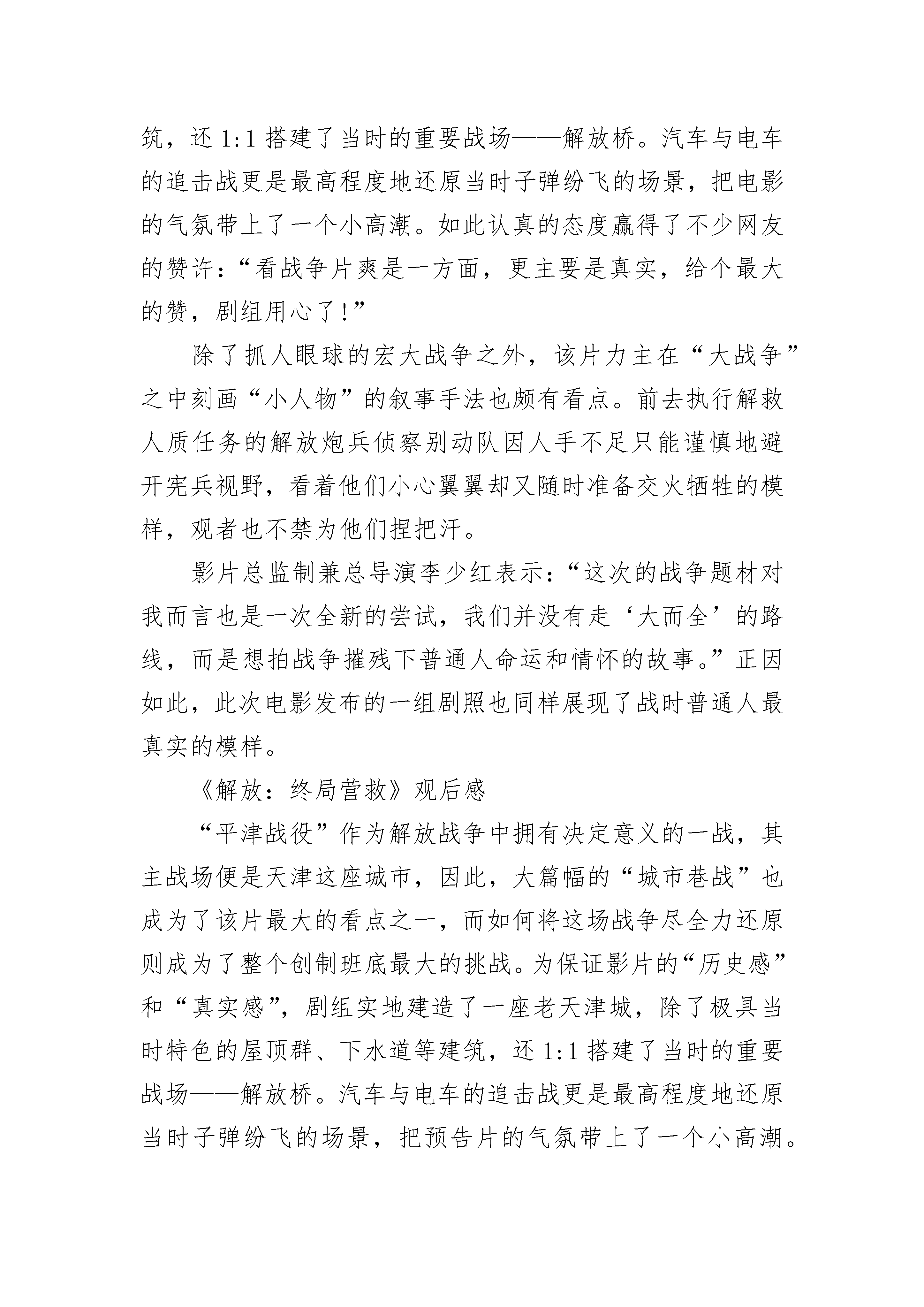 观看电影《解放:终局营救》观后感500字最新5篇“解放了天亮了祥和的光泽温暖着你和我”12月25日战争电影《解放.终局营救》在天津首映,片尾曲《解放了》一直萦绕在我的心头,音符带来的舒缓旋律如潺潺的流水一点点浸润进我的心田,那感觉就像寒夜里燃起的篝火,不仅给你带来了温暖的温度而且还让你在心底燃起了缕缕希望之光。这部电影将于12月27日在全国上映。天津首映式现场此次在天津电影艺术公园举办的《解放·终局营救》天津首映礼,特别邀请到韩三平总策划、李少红总监制兼总导演、常晓阳导演、以及主创演员周一围、钟汉良、钟楚曦、王迅等出席活动,观影现场团队人员在现场与观众们分享了创作历程和拍摄故事。出品方代表、天津北方电影集团领导、平津战役纪念馆代表、天津北方电影集团合作单位领导、影迷受邀出席了活动首映礼活动。北方电影集团董事长张仁刚先生致辞观影后的互动环节,李少红导演介绍了电影创作过程,正如她所说:尽可能还原天津的历史以及平津战役发生之时街区的风貌。天津的解放桥、天津的和平路、中原百货以及天津电车、天津的西开教堂、海河还有偶尔飘散在影片中的天津话方言和口音等在影片中作为主要场景呈现给观众特别是天津的观众,这场29个小时的平津战役对于解放全中国是何等的关键和重要,作为生活在天津的一名普通公民,从影片中不由的获得了一种重生的感觉,平津战役纪念馆馆长王培军,拿着剧组里凝聚着所有人希望、象征着解放的小号激动得感言:“回首战争,我们是为了更加珍爱和平!”香港演员钟汉良这次在现场互动中用练半天了的天津话儿“哥哥、姐姐你真咯儿,倍儿爱你”活跃气氛,与他在影片里扮演的国民党军官姚哲从一个对女儿私爱的小爱中涌现出对营救行动的大爱的英雄形象,形成反差的对比,反而让现场观众心生喜爱之情。解放军炮兵侦察连连长蔡兴福的扮演者周一围,拥有双重身份的神秘歌女梅艳扮演者钟楚曦、解放军炮兵侦察兵马宝树的扮演者王迅在影片中都的表现都恰到好处,情感处理到位,个性鲜明且生动。李少红导演接受天津都市频道记者采访纵观影片从大场景切入,故事情节在战役中环环相扣,残酷的硝烟炮火,无数无名解放军战士在战役中牺牲倒在血泊之中,令在场的观众再一次接受了爱国主义教育的洗礼,但这样的场景并不是影片所要传达给观众的主旋律,而是李少红导演将两个父亲的对于亲情和子女的爱作为了主线在惊心动魄的战火里通过细腻的表现手法慢慢升腾出影片所要表达的主旋律:理解万岁!真爱与真情万岁!和平来之不易!以此唤醒观众心中正在渴盼的情感共鸣:我们无论何时都要珍爱和平,我们无论何时心中都呼唤着“心既是理,致良知,知行合一”发自内心的人与人之间无比美好的真情!影片剧照当天出席活动的有天津社会科学院党组书记、院长靳方华,天津市政建设集团党委书记、董事长翟乃满,平津战役纪念馆馆长王培军,北京启泰远洋文化传媒有限公司董事长杨硕,天津北方电影集团党委书记、董事长张仁刚,天津北方电影集团副总经理方卫,天津北方电影集团副总经理刘国利,天津北方电影集团纪委书记李崎钢。现场,电影《解放·终局营救》剧组将凝聚着所有人希望、象征着解放的小号赠与平津纪念馆,平津战役纪念馆向主办方回赠了16枚装新中国成立70周年纪念章。这部电影应该说是2019年的收官之作,也是我2019年看过的电影中能为其主动写观后感的电影。值得一看。2019年12月27日(周五)全国上映之时,希望大家和我一样走进电影院,去感受那缕缕从心中燃起的希望之光!以一颗欢喜之心迎接新的一年的到来!《解放:终局营救》观后感凭借极具冲击力的城市战争场面和争分夺秒的生死营救剧情,这部以平津战役总攻前夕为背景的战争题材电影开启了与观众见面的“倒计时”模式。“平津战役”作为解放战争中拥有决定意义的一战,其主战场便是天津这座城市,因此,大篇幅的“城市巷战”也成为了该片最大的看点之一,而如何将这场战争尽全力还原则成为了整个创制班底最大的挑战。为保证影片的“历史感”和“真实感”,剧组实地建造了一座老天津城,除了极具当时特色的屋顶群、下水道等建筑,还1:1搭建了当时的重要战场——解放桥。汽车与电车的追击战更是最高程度地还原当时子弹纷飞的场景,把电影的气氛带上了一个小高潮。如此认真的态度赢得了不少网友的赞许:“看战争片爽是一方面,更主要是真实,给个最大的赞,剧组用心了!”除了抓人眼球的宏大战争之外,该片力主在“大战争”之中刻画“小人物”的叙事手法也颇有看点。前去执行解救人质任务的解放炮兵侦察别动队因人手不足只能谨慎地避开宪兵视野,看着他们小心翼翼却又随时准备交火牺牲的模样,观者也不禁为他们捏把汗。影片总监制兼总导演李少红表示:“这次的战争题材对我而言也是一次全新的尝试,我们并没有走‘大而全’的路线,而是想拍战争摧残下普通人命运和情怀的故事。”正因如此,此次电影发布的一组剧照也同样展现了战时普通人最真实的模样。《