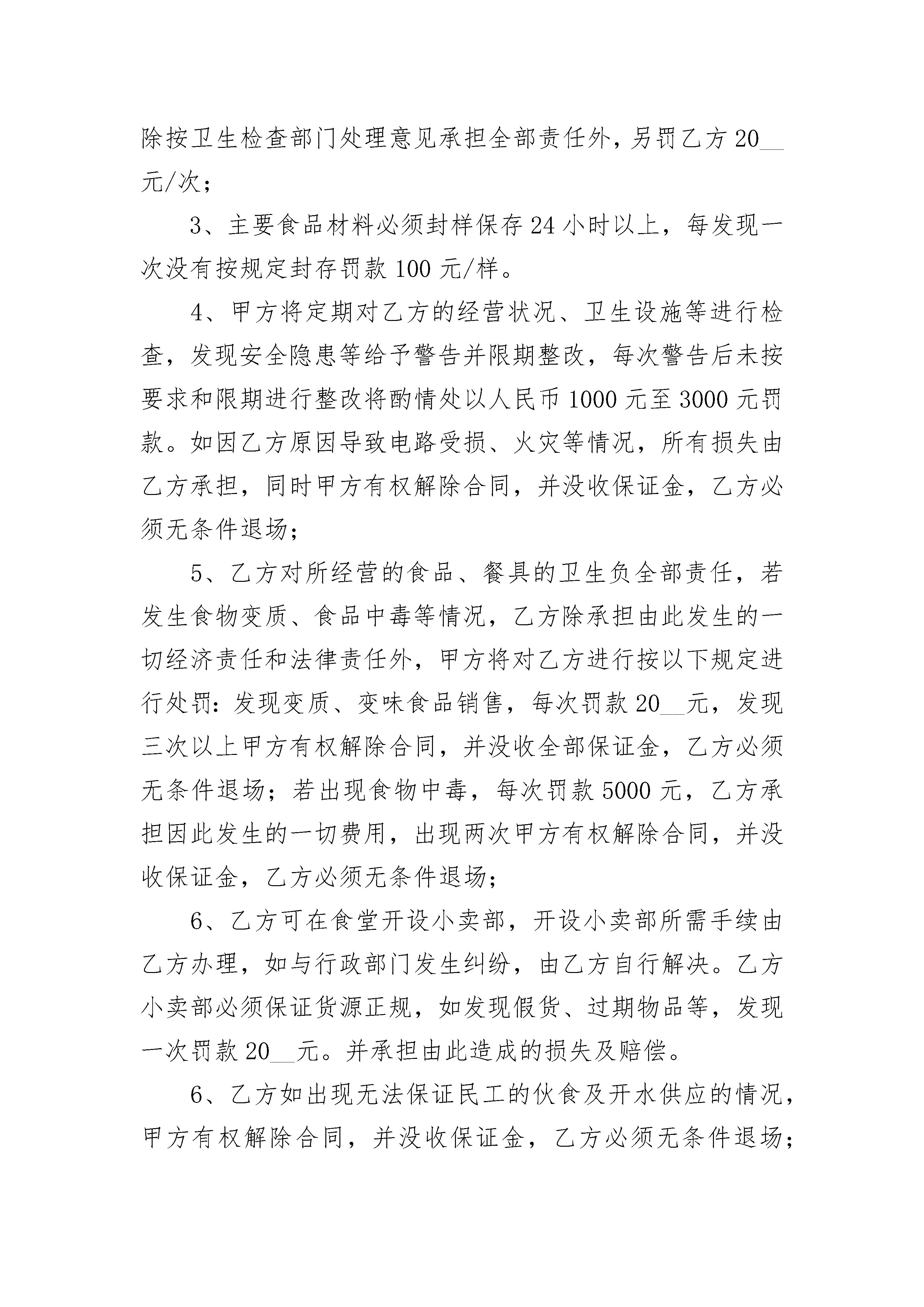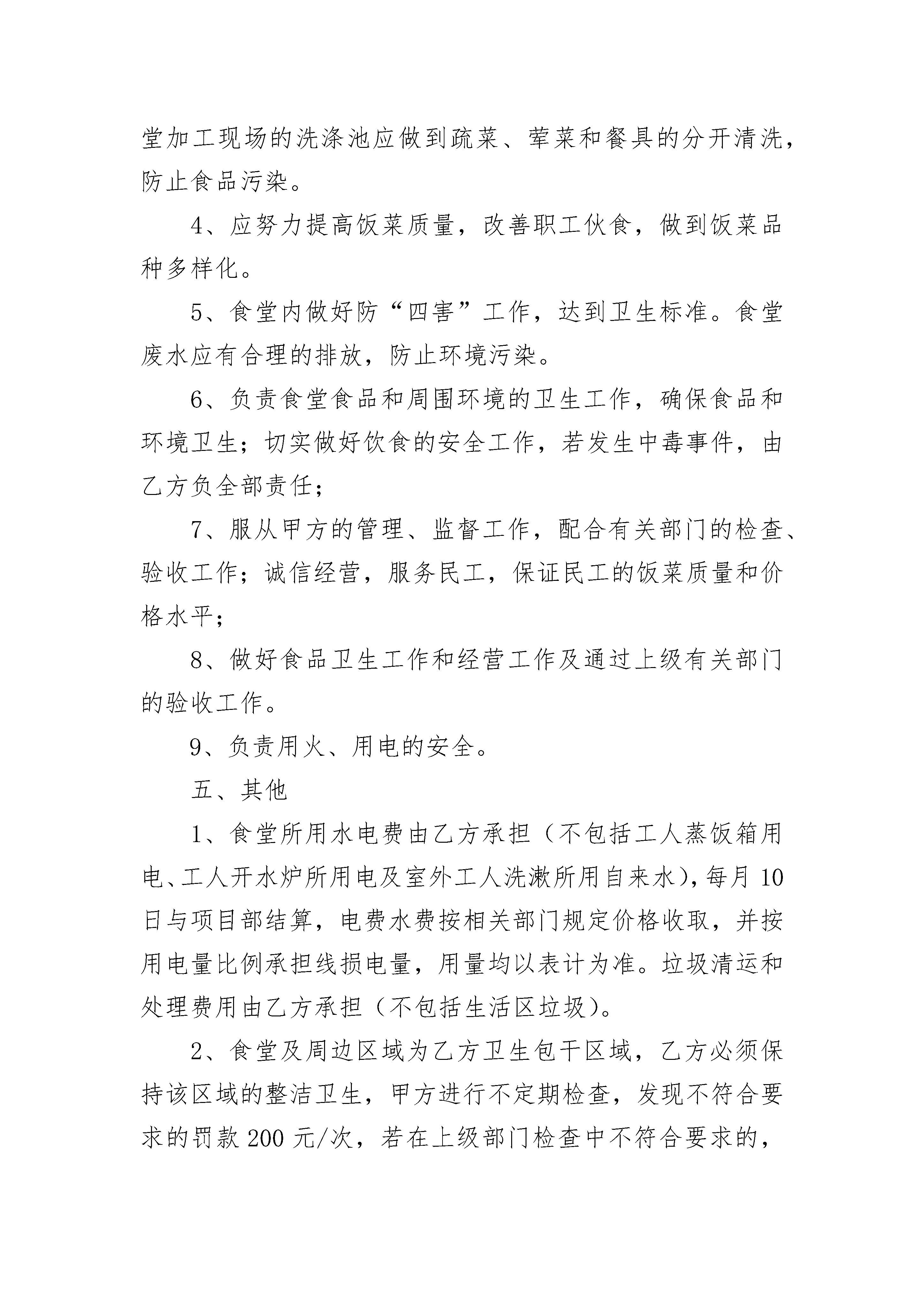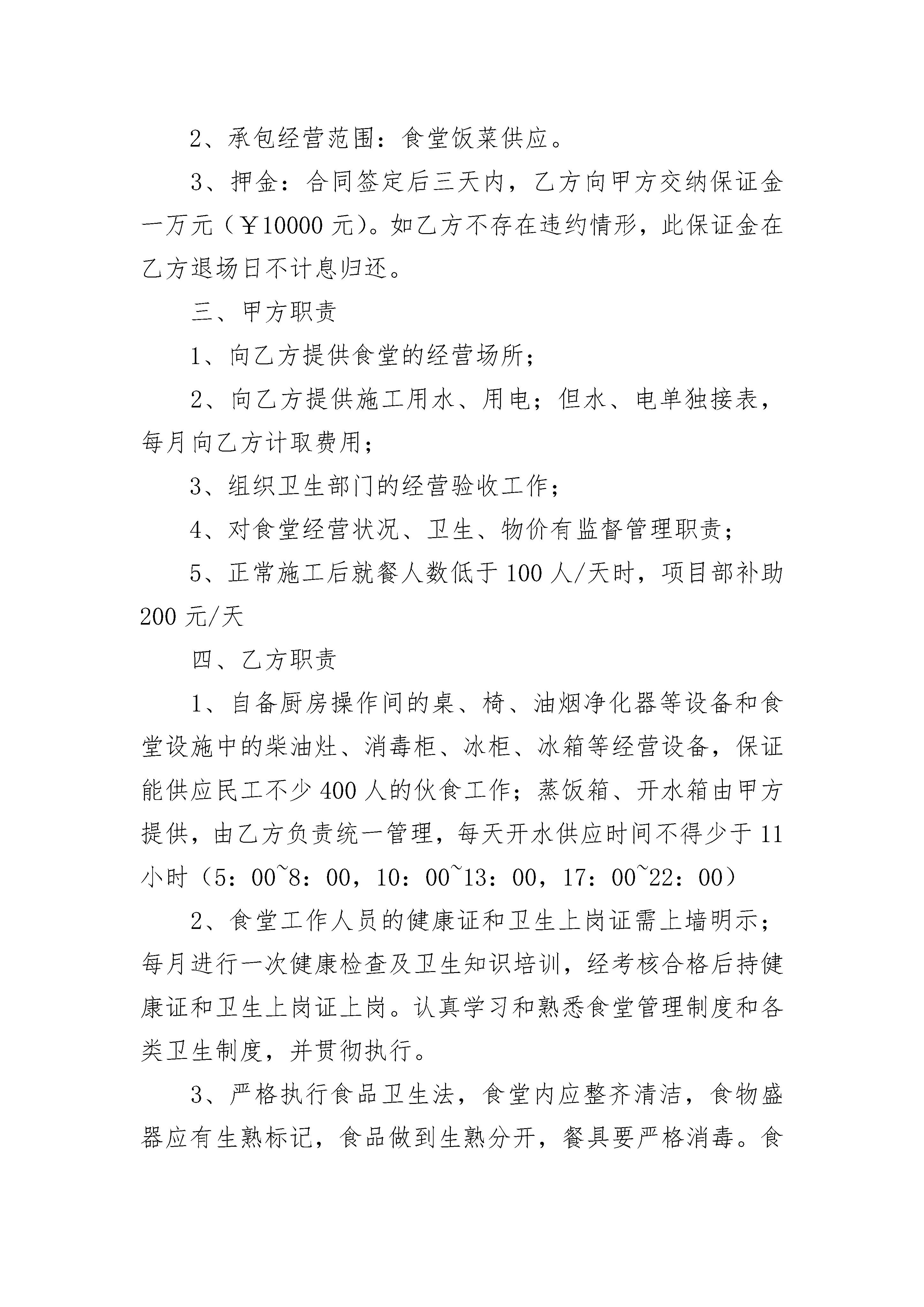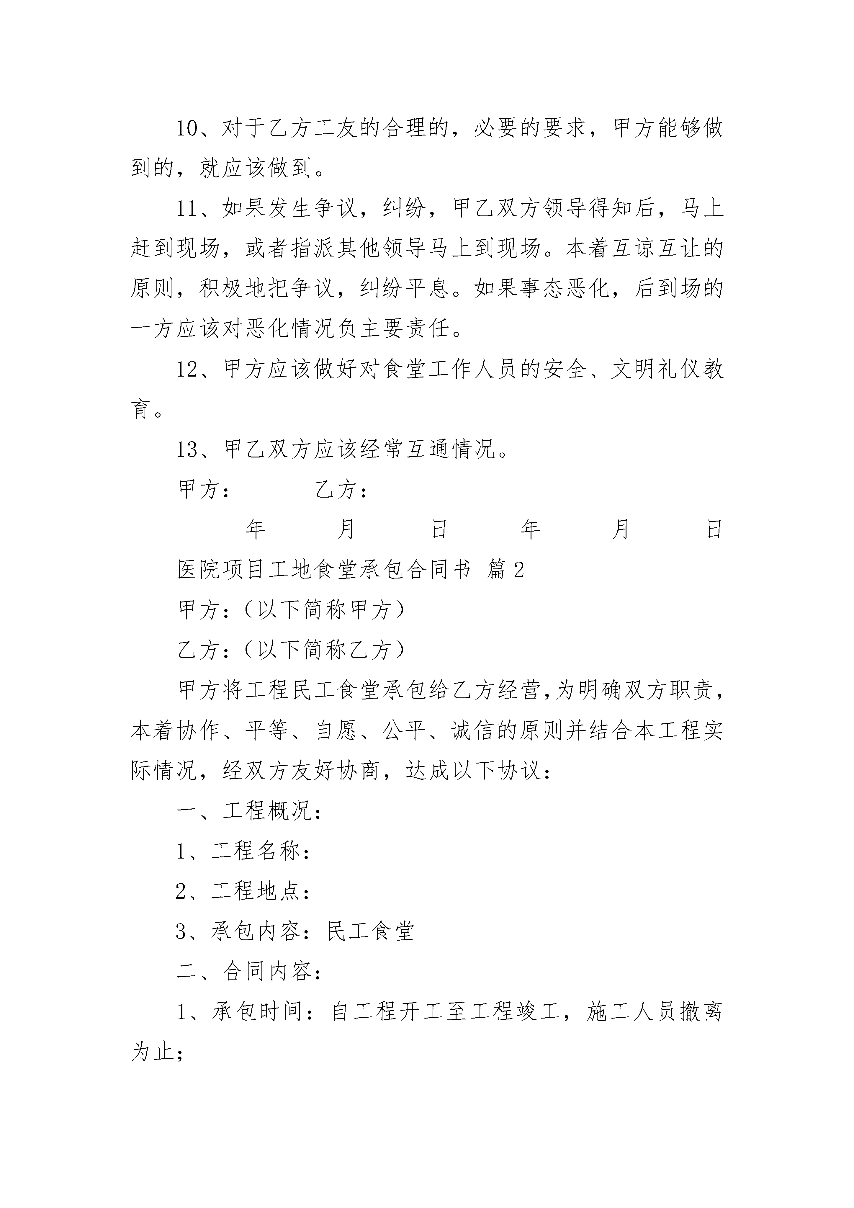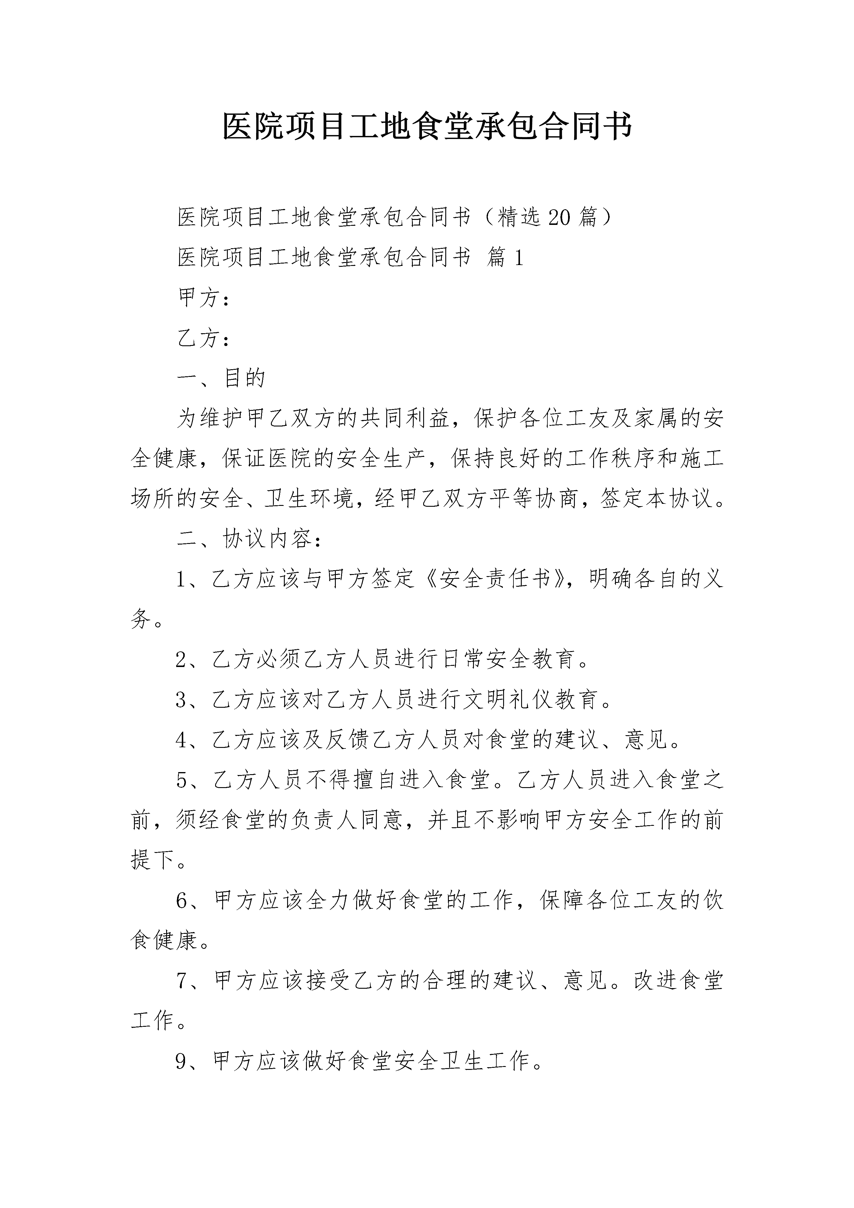 医院项目工地食堂承包合同书医院项目工地食堂承包合同书(精选20篇)医院项目工地食堂承包合同书篇1甲方:乙方:一、目的为维护甲乙双方的共同利益,保护各位工友及家属的安全健康,保证医院的安全生产,保持良好的工作秩序和施工场所的安全、卫生环境,经甲乙双方平等协商,签定本协议。二、协议内容:1、乙方应该与甲方签定《安全责任书》,明确各自的义务。2、乙方必须乙方人员进行日常安全教育。3、乙方应该对乙方人员进行文明礼仪教育。4、乙方应该及反馈乙方人员对食堂的建议、意见。5、乙方人员不得擅自进入食堂。乙方人员进入食堂之前,须经食堂的负责人同意,并且不影响甲方安全工作的前提下。6、甲方应该全力做好食堂的工作,保障各位工友的饮食健康。7、甲方应该接受乙方的合理的建议、意见。改进食堂工作。9、甲方应该做好食堂安全卫生工作。10、对于乙方工友的合理的,必要的要求,甲方能够做到的,就应该做到。11、如果发生争议,纠纷,甲乙双方领导得知后,马上赶到现场,或者指派其他领导马上到现场。本着互谅互让的原则,积极地把争议,纠纷平息。如果事态恶化,后到场的一方应该对恶化情况负主要责任。12、甲方应该做好对食堂工作人员的安全、文明礼仪教育。13、甲乙双方应该经常互通情况。甲方:______乙方:____________年______月______日______年______月______日医院项目工地食堂承包合同书篇2甲方:(以下简称甲方)乙方:(以下简称乙方)甲方将工程民工食堂承包给乙方经营,为明确双方职责,本着协作、平等、自愿、公平、诚信的原则并结合本工程实际情况,经双方友好协商,达成以下协议:一、工程概况:1、工程名称:2、工程地点:3、承包内容:民工食堂二、合同内容:1、承包时间:自工程开工至工程竣工,施工人员撤离为止;2、承包经营范围:食堂饭菜供应。3、押金:合同签定后三天内,乙方向甲方交纳保证金一万元(¥10000元)。如乙方不存在违约情形,此保证金在乙方退场日不计息归还。三、甲方职责1、向乙方提供食堂的经营场所;2、向乙方提供施工用水、用电;但水、电单独接表,每月向乙方计取费用;3、组织卫生部门的经营验收工作;4、对食堂经营状况、卫生、物价有监督管理职责;5、正常施工后就餐人数低于100人/天时,项目部补助200元/天四、乙方职责1、自备厨房操作间的桌、椅、油烟净化器等设备和食堂设施中的柴油灶、消毒柜、冰柜、冰箱等经营设备,保证能供应民工不少400人的伙食工作;蒸饭箱、开水箱由甲方提供,由乙方负责统一管理,每天开水供应时间不得少于11小时(5:00~8:00,10:00~13:00,17:00~22:00)2、食堂工作人员的健康证和卫生上岗证需上墙明示;每月进行一次健康检查及卫生知识培训,经考核合格后持健康证和卫生上岗证上岗。认真学习和熟悉食堂管理制度和各类卫生制度,并贯彻执行。3、严格执行食品卫生法,食堂内应整齐清洁,食物盛器应有生熟标记,食品做到生熟分开,餐具要严格消毒。食堂加工现场的洗涤池应做到疏菜、荤菜和餐具的分开清洗,防止食品污染。4、应努力提高饭菜质量,改善职工伙食,做到饭菜品种多样化。5、食堂内做好防“四害”工作,达到卫生标准。食堂废水应有合理的排放,防止环境污染。6、负责食堂食品和周围环境的卫生工作,确保食品和环境卫生;切实做好饮食的安全工作,若发生中毒事件,由乙方负全部责任;7、服从甲方的管理、监督工作,配合有关部门的检查、验收工作;诚信经营,服务民工,保证民工的饭菜质量和价格水平;8、做好食品卫生工作和经营工作及通过上级有关部门的验收工作。9、负责用火、用电的安全。五、其他1、食堂所用水电费由乙方承担(不包括工人蒸饭箱用电、工人开水炉所用电及室外工人洗漱所用自来水),每月10日与项目部结算,电费水费按相关部门规定价格收取,并按用电量比例承担线损电量,用量均以表计为准。垃圾清运和处理费用由乙方承担(不包括生活区垃圾)。2、食堂及周边区域为乙方卫生包干区域,乙方必须保持该区域的整洁卫生,甲方进行不定期检查,发现不符合要求的罚款200元/次,若在上级部门检查中不符合要求的,除按卫生检查部门处理意见承担全部责任外,另罚乙方20__元/次;3、主要食品材料必须封样保存24小时以上,每发现一次没有按规定封存罚款100元/样。4、甲方将定期对乙方的经营状况、卫生设施等进行检查,发现安全隐患等给予警告并限期整改,每次警告后未按要求和限期进行整改将酌情处以人民币1000元至3000元罚款。如因乙方原因导致电路受损、火灾等情况,所有损失由乙方承担,同时甲方有权解除合同,并没收保证金,乙方必须无条件退场;5、乙方对所经营的食品、餐具的卫生负全部责任,若发生食物变质、食品中毒等情况,乙方除承担由此发生的一切经济责任和法律责任外,甲方将对乙方进行按以下
