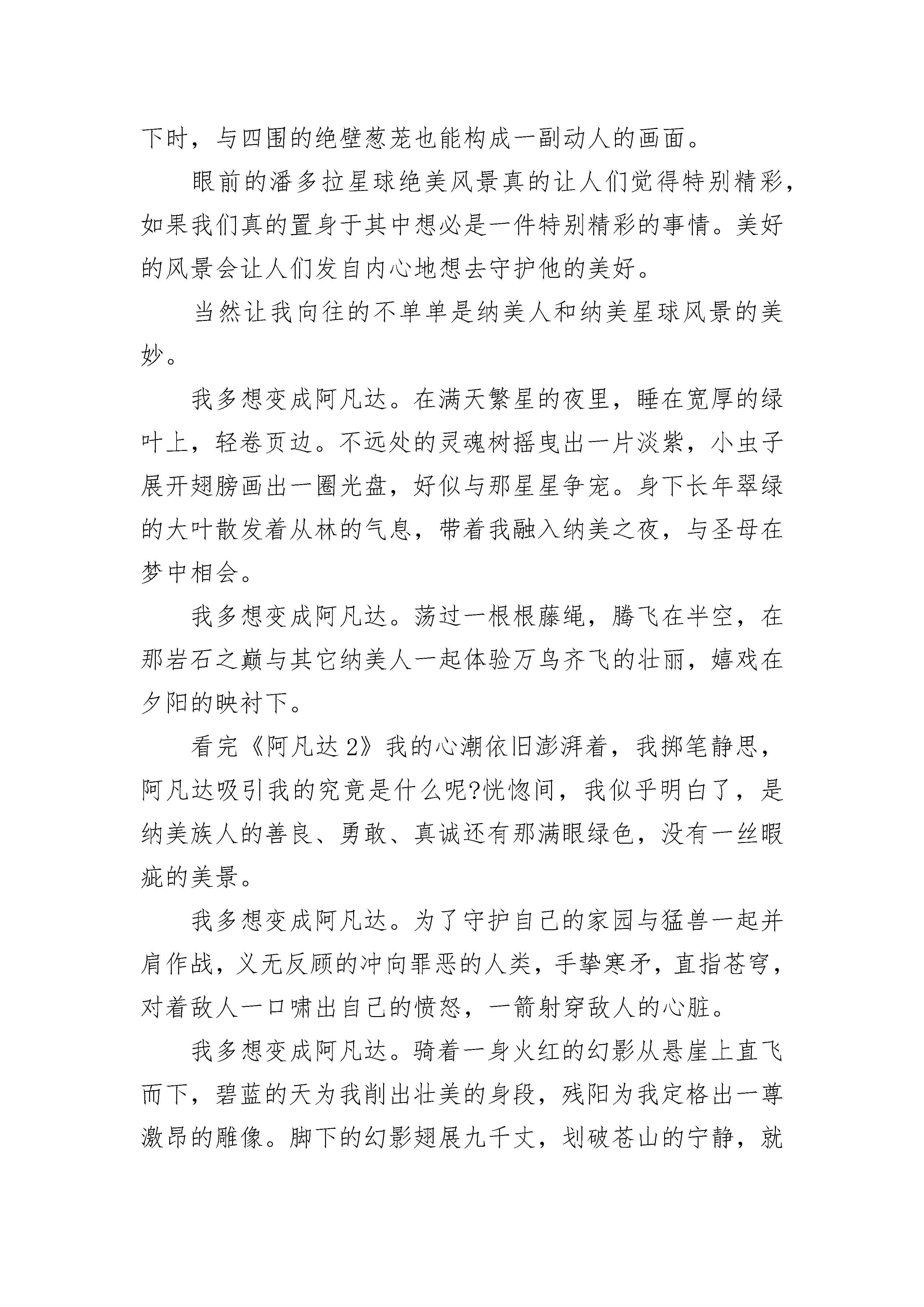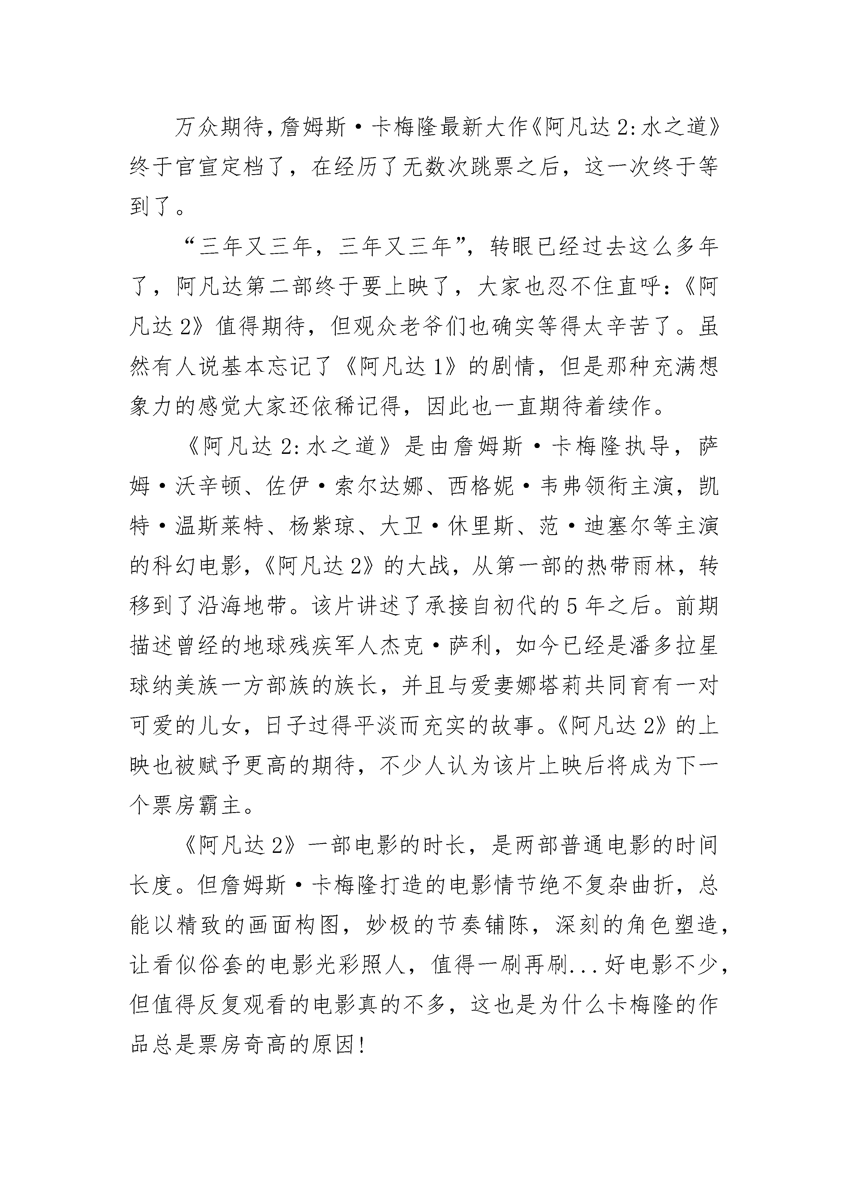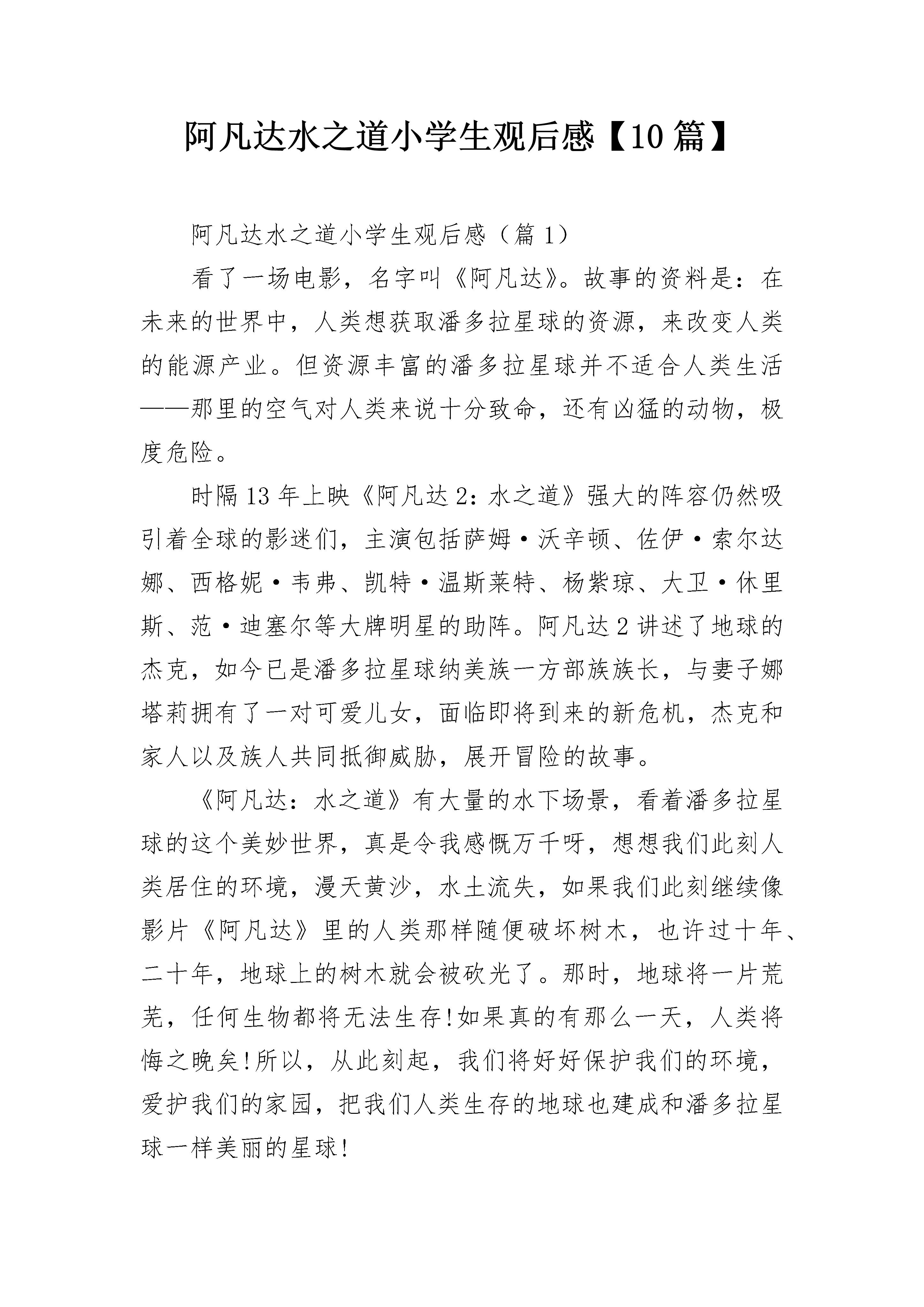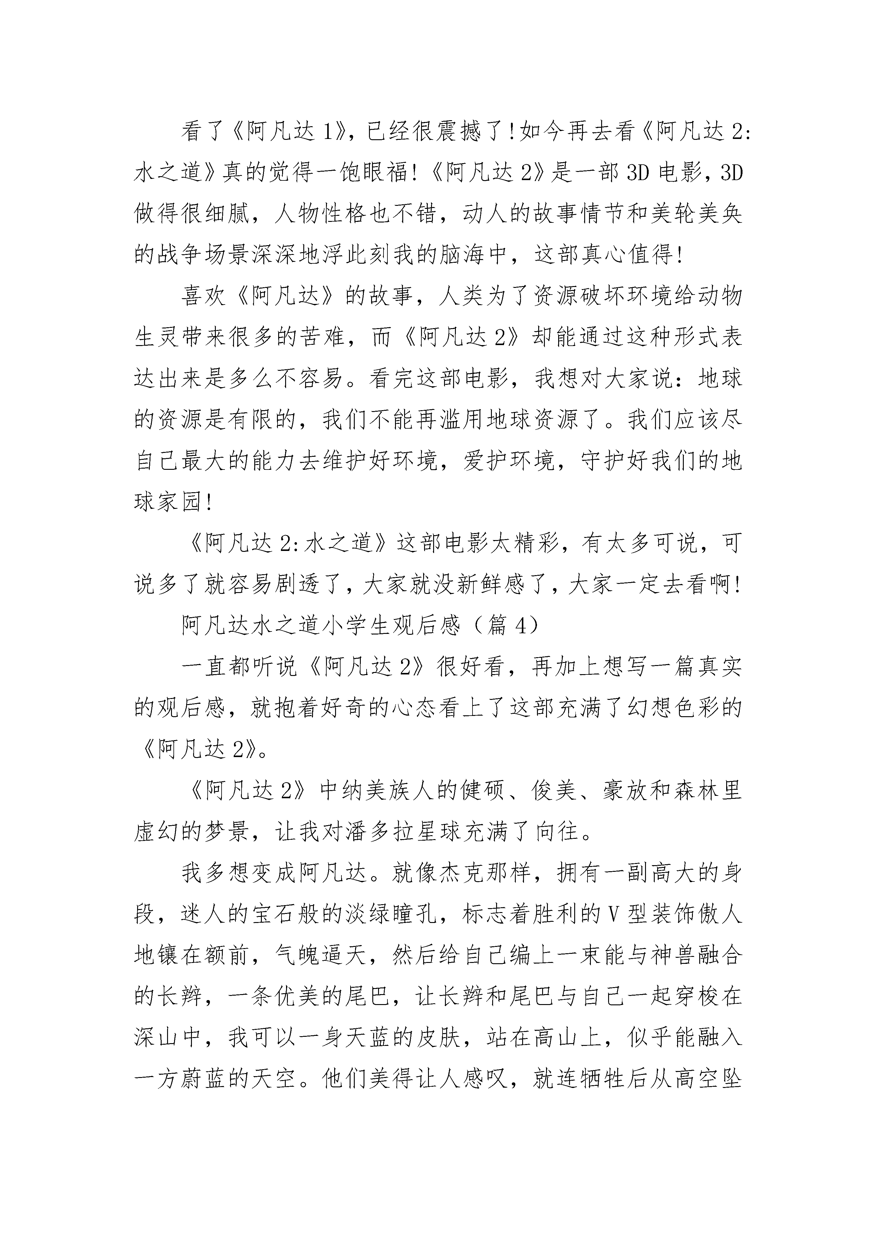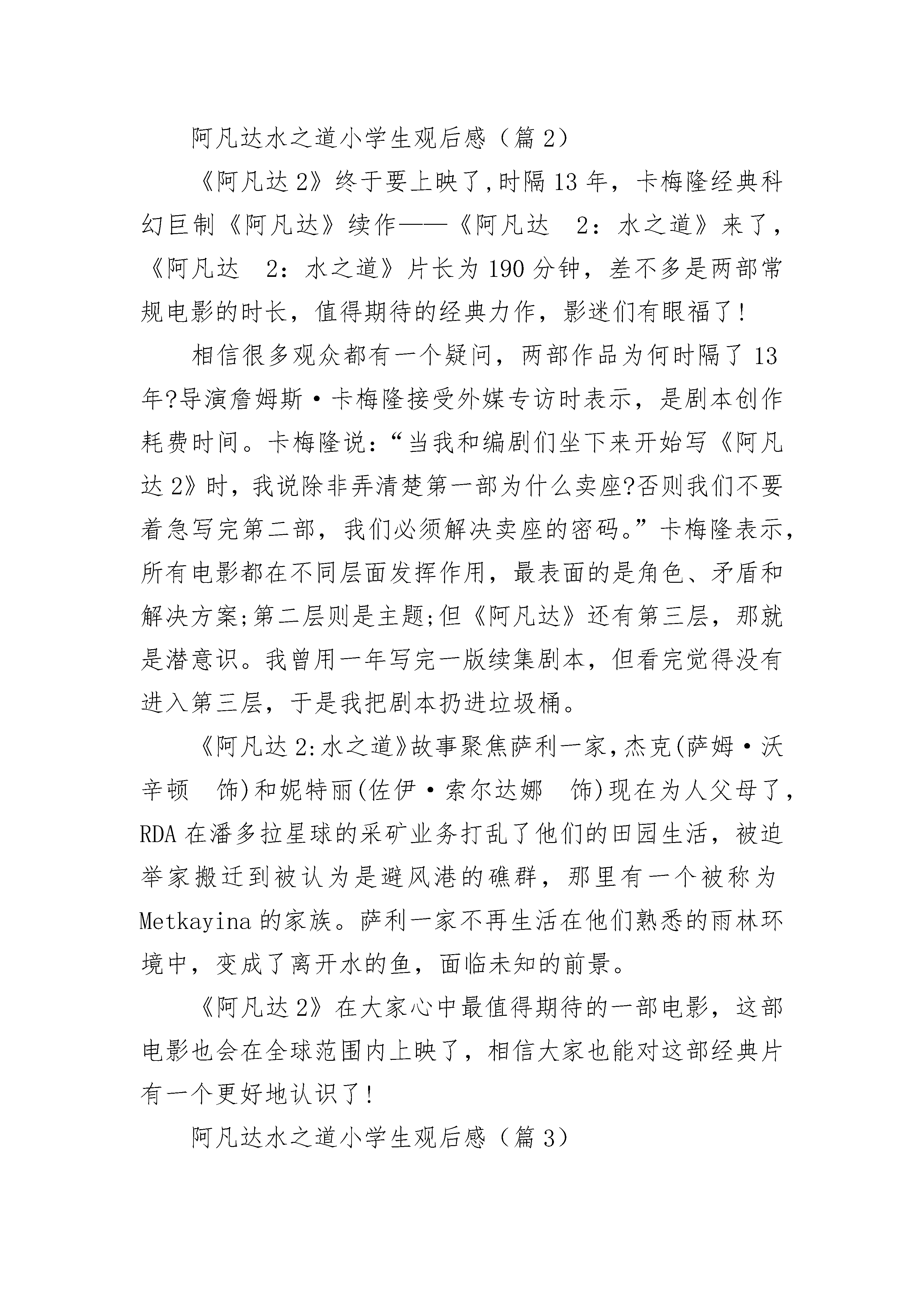 阿凡达水之道小学生观后感【10篇】阿凡达水之道小学生观后感(篇1)看了一场电影,名字叫《阿凡达》。故事的资料是:在未来的世界中,人类想获取潘多拉星球的资源,来改变人类的能源产业。但资源丰富的潘多拉星球并不适合人类生活——那里的空气对人类来说十分致命,还有凶猛的动物,极度危险。时隔13年上映《阿凡达2:水之道》强大的阵容仍然吸引着全球的影迷们,主演包括萨姆·沃辛顿、佐伊·索尔达娜、西格妮·韦弗、凯特·温斯莱特、杨紫琼、大卫·休里斯、范·迪塞尔等大牌明星的助阵。阿凡达2讲述了地球的杰克,如今已是潘多拉星球纳美族一方部族族长,与妻子娜塔莉拥有了一对可爱儿女,面临即将到来的新危机,杰克和家人以及族人共同抵御威胁,展开冒险的故事。《阿凡达:水之道》有大量的水下场景,看着潘多拉星球的这个美妙世界,真是令我感慨万千呀,想想我们此刻人类居住的环境,漫天黄沙,水土流失,如果我们此刻继续像影片《阿凡达》里的人类那样随便破坏树木,也许过十年、二十年,地球上的树木就会被砍光了。那时,地球将一片荒芜,任何生物都将无法生存!如果真的有那么一天,人类将悔之晚矣!所以,从此刻起,我们将好好保护我们的环境,爱护我们的家园,把我们人类生存的地球也建成和潘多拉星球一样美丽的星球!阿凡达水之道小学生观后感(篇2)《阿凡达2》终于要上映了,时隔13年,卡梅隆经典科幻巨制《阿凡达》续作——《阿凡达2:水之道》来了,《阿凡达2:水之道》片长为190分钟,差不多是两部常规电影的时长,值得期待的经典力作,影迷们有眼福了!相信很多观众都有一个疑问,两部作品为何时隔了13年?导演詹姆斯·卡梅隆接受外媒专访时表示,是剧本创作耗费时间。卡梅隆说:“当我和编剧们坐下来开始写《阿凡达2》时,我说除非弄清楚第一部为什么卖座?否则我们不要着急写完第二部,我们必须解决卖座的密码。”卡梅隆表示,所有电影都在不同层面发挥作用,最表面的是角色、矛盾和解决方案;第二层则是主题;但《阿凡达》还有第三层,那就是潜意识。我曾用一年写完一版续集剧本,但看完觉得没有进入第三层,于是我把剧本扔进垃圾桶。《阿凡达2:水之道》故事聚焦萨利一家,杰克(萨姆·沃辛顿饰)和妮特丽(佐伊·索尔达娜饰)现在为人父母了,RDA在潘多拉星球的采矿业务打乱了他们的田园生活,被迫举家搬迁到被认为是避风港的礁群,那里有一个被称为Metkayina的家族。萨利一家不再生活在他们熟悉的雨林环境中,变成了离开水的鱼,面临未知的前景。《阿凡达2》在大家心中最值得期待的一部电影,这部电影也会在全球范围内上映了,相信大家也能对这部经典片有一个更好地认识了!阿凡达水之道小学生观后感(篇3)万众期待,詹姆斯·卡梅隆最新大作《阿凡达2:水之道》终于官宣定档了,在经历了无数次跳票之后,这一次终于等到了。“三年又三年,三年又三年”,转眼已经过去这么多年了,阿凡达第二部终于要上映了,大家也忍不住直呼:《阿凡达2》值得期待,但观众老爷们也确实等得太辛苦了。虽然有人说基本忘记了《阿凡达1》的剧情,但是那种充满想象力的感觉大家还依稀记得,因此也一直期待着续作。《阿凡达2:水之道》是由詹姆斯·卡梅隆执导,萨姆·沃辛顿、佐伊·索尔达娜、西格妮·韦弗领衔主演,凯特·温斯莱特、杨紫琼、大卫·休里斯、范·迪塞尔等主演的科幻电影,《阿凡达2》的大战,从第一部的热带雨林,转移到了沿海地带。该片讲述了承接自初代的5年之后。前期描述曾经的地球残疾军人杰克·萨利,如今已经是潘多拉星球纳美族一方部族的族长,并且与爱妻娜塔莉共同育有一对可爱的儿女,日子过得平淡而充实的故事。《阿凡达2》的上映也被赋予更高的期待,不少人认为该片上映后将成为下一个票房霸主。《阿凡达2》一部电影的时长,是两部普通电影的时间长度。但詹姆斯·卡梅隆打造的电影情节绝不复杂曲折,总能以精致的画面构图,妙极的节奏铺陈,深刻的角色塑造,让看似俗套的电影光彩照人,值得一刷再刷...好电影不少,但值得反复观看的电影真的不多,这也是为什么卡梅隆的作品总是票房奇高的原因!看了《阿凡达1》,已经很震撼了!如今再去看《阿凡达2:水之道》真的觉得一饱眼福!《阿凡达2》是一部3D电影,3D做得很细腻,人物性格也不错,动人的故事情节和美轮美奂的战争场景深深地浮此刻我的脑海中,这部真心值得!喜欢《阿凡达》的故事,人类为了资源破坏环境给动物生灵带来很多的苦难,而《阿凡达2》却能通过这种形式表达出来是多么不容易。看完这部电影,我想对大家说:地球的资源是有限的,我们不能再滥用地球资源了。我们应该尽自己最大的能力去维护好环境,爱护环境,守护好我们的地球家园!《阿凡达2:水之道》这部电影太精彩,有太多可说,可说多了就容易剧透了,大家就没新鲜感了,大家一定去看啊!阿凡达水之道小学生观后感(篇4)一直都听说《阿凡达2》很好看,再加上想写一篇真实的