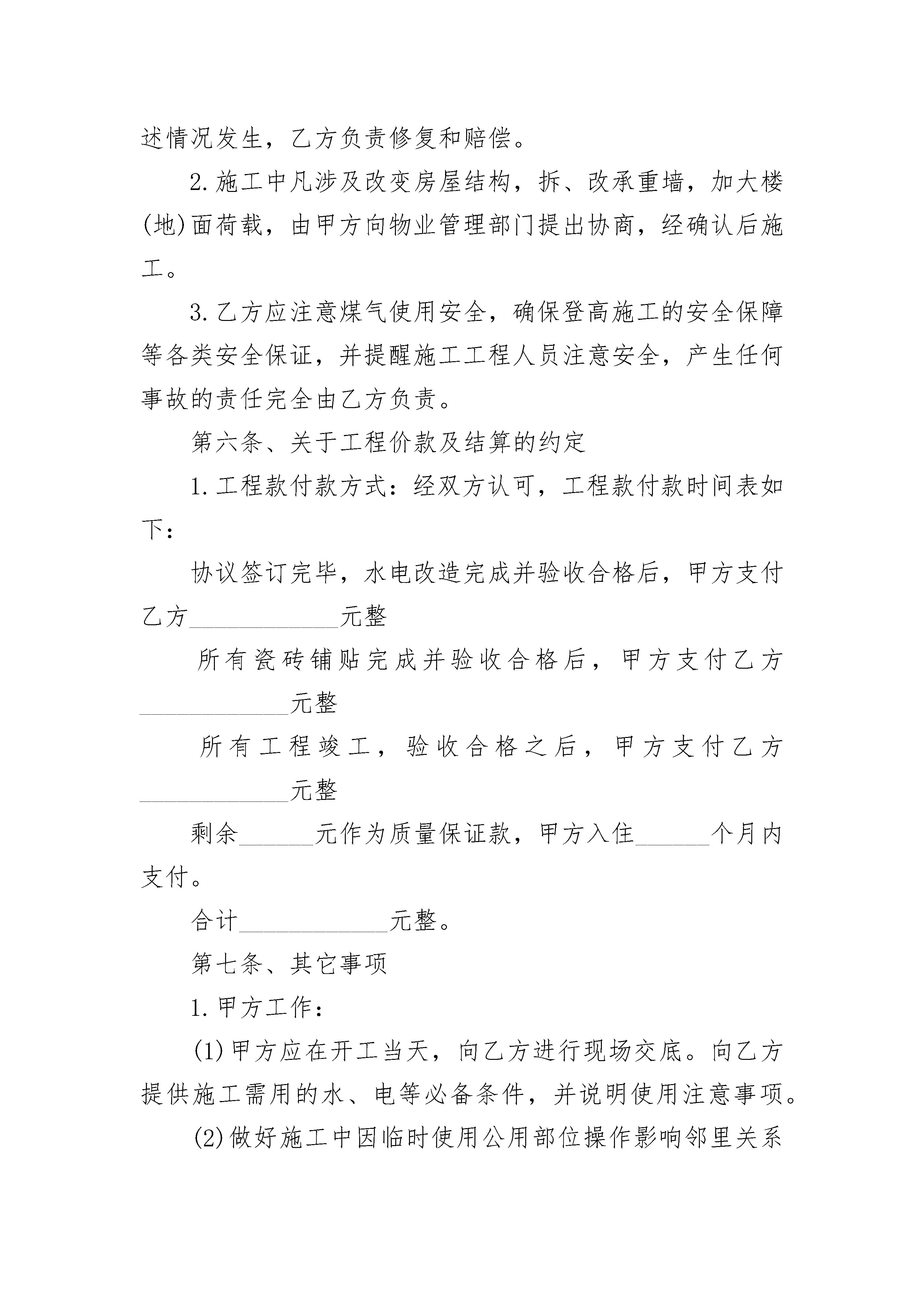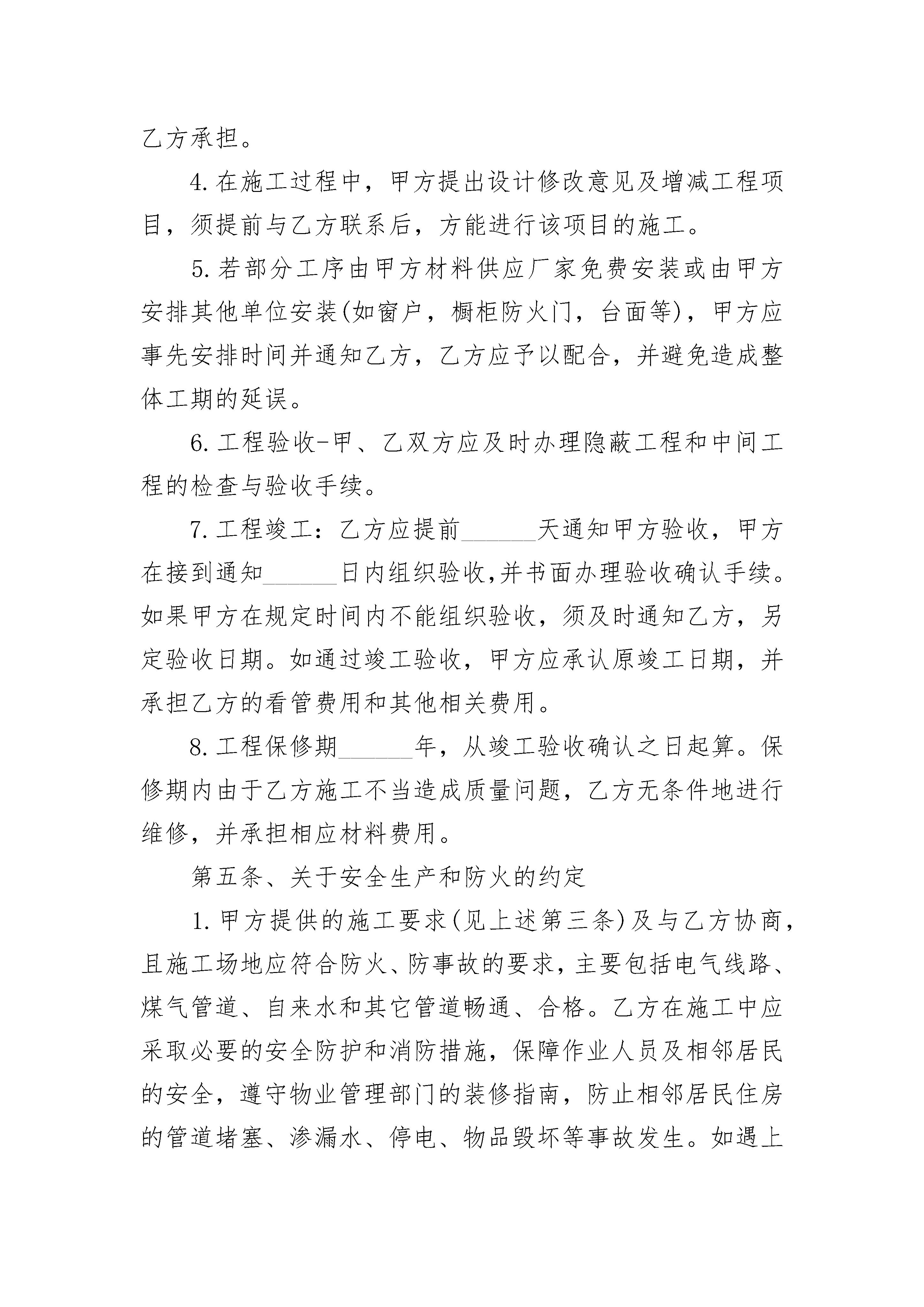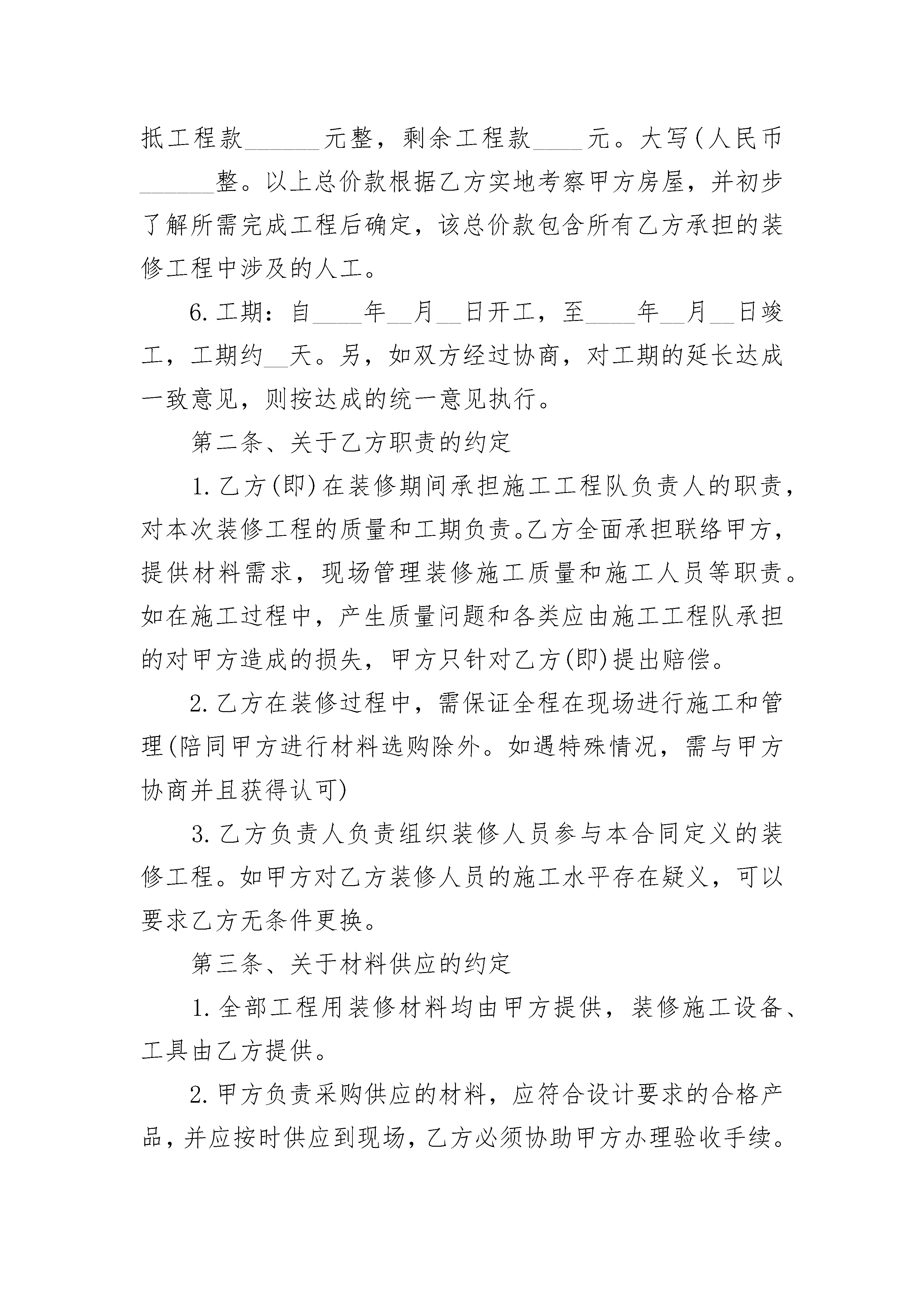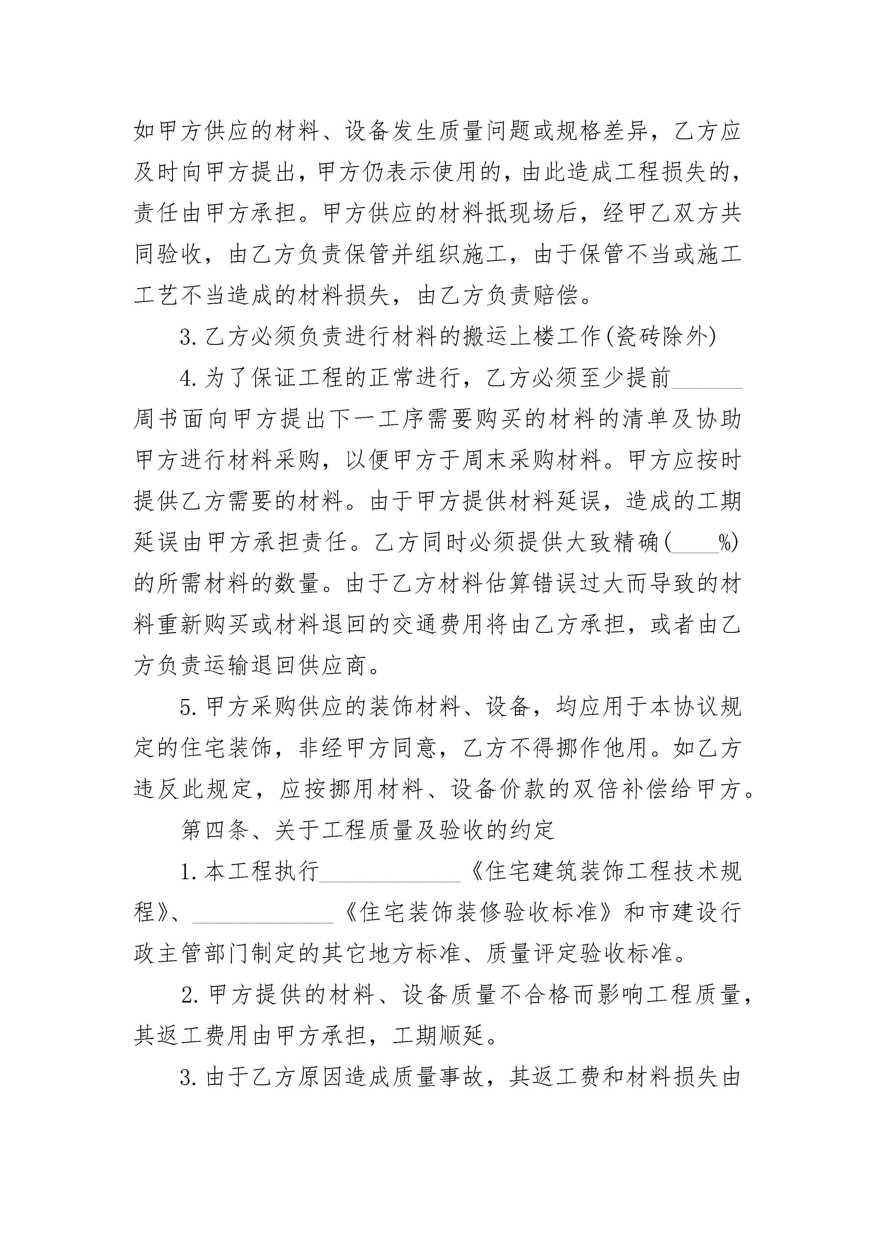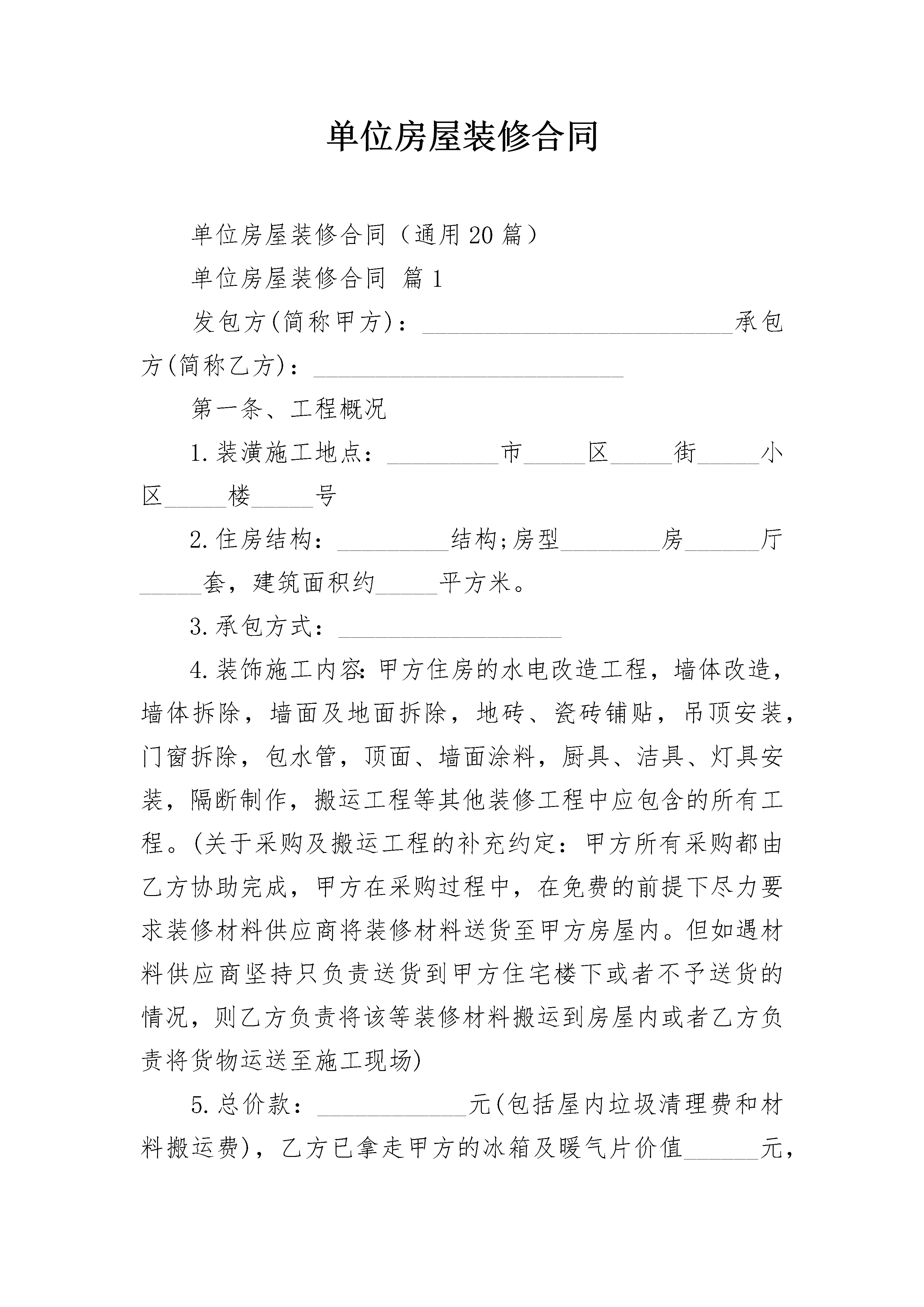 单位房屋装修合同单位房屋装修合同(通用20篇)单位房屋装修合同篇1发包方(简称甲方):_________________________承包方(简称乙方):_________________________第一条、工程概况1.装潢施工地点:_________市_____区_____街_____小区_____楼_____号2.住房结构:_________结构;房型________房______厅_____套,建筑面积约_____平方米。3.承包方式:__________________4.装饰施工内容:甲方住房的水电改造工程,墙体改造,墙体拆除,墙面及地面拆除,地砖、瓷砖铺贴,吊顶安装,门窗拆除,包水管,顶面、墙面涂料,厨具、洁具、灯具安装,隔断制作,搬运工程等其他装修工程中应包含的所有工程。(关于采购及搬运工程的补充约定:甲方所有采购都由乙方协助完成,甲方在采购过程中,在免费的前提下尽力要求装修材料供应商将装修材料送货至甲方房屋内。但如遇材料供应商坚持只负责送货到甲方住宅楼下或者不予送货的情况,则乙方负责将该等装修材料搬运到房屋内或者乙方负责将货物运送至施工现场)5.总价款:____________元(包括屋内垃圾清理费和材料搬运费),乙方已拿走甲方的冰箱及暖气片价值______元,抵工程款______元整,剩余工程款____元。大写(人民币______整。以上总价款根据乙方实地考察甲方房屋,并初步了解所需完成工程后确定,该总价款包含所有乙方承担的装修工程中涉及的人工。6.工期:自____年__月__日开工,至____年__月__日竣工,工期约__天。另,如双方经过协商,对工期的延长达成一致意见,则按达成的统一意见执行。第二条、关于乙方职责的约定1.乙方(即)在装修期间承担施工工程队负责人的职责,对本次装修工程的质量和工期负责。乙方全面承担联络甲方,提供材料需求,现场管理装修施工质量和施工人员等职责。如在施工过程中,产生质量问题和各类应由施工工程队承担的对甲方造成的损失,甲方只针对乙方(即)提出赔偿。2.乙方在装修过程中,需保证全程在现场进行施工和管理(陪同甲方进行材料选购除外。如遇特殊情况,需与甲方协商并且获得认可)3.乙方负责人负责组织装修人员参与本合同定义的装修工程。如甲方对乙方装修人员的施工水平存在疑义,可以要求乙方无条件更换。第三条、关于材料供应的约定1.全部工程用装修材料均由甲方提供,装修施工设备、工具由乙方提供。2.甲方负责采购供应的材料,应符合设计要求的合格产品,并应按时供应到现场,乙方必须协助甲方办理验收手续。如甲方供应的材料、设备发生质量问题或规格差异,乙方应及时向甲方提出,甲方仍表示使用的,由此造成工程损失的,责任由甲方承担。甲方供应的材料抵现场后,经甲乙双方共同验收,由乙方负责保管并组织施工,由于保管不当或施工工艺不当造成的材料损失,由乙方负责赔偿。3.乙方必须负责进行材料的搬运上楼工作(瓷砖除外)4.为了保证工程的正常进行,乙方必须至少提前______周书面向甲方提出下一工序需要购买的材料的清单及协助甲方进行材料采购,以便甲方于周末采购材料。甲方应按时提供乙方需要的材料。由于甲方提供材料延误,造成的工期延误由甲方承担责任。乙方同时必须提供大致精确(____%)的所需材料的数量。由于乙方材料估算错误过大而导致的材料重新购买或材料退回的交通费用将由乙方承担,或者由乙方负责运输退回供应商。5.甲方采购供应的装饰材料、设备,均应用于本协议规定的住宅装饰,非经甲方同意,乙方不得挪作他用。如乙方违反此规定,应按挪用材料、设备价款的双倍补偿给甲方。第四条、关于工程质量及验收的约定1.本工程执行____________《住宅建筑装饰工程技术规程》、____________《住宅装饰装修验收标准》和市建设行政主管部门制定的其它地方标准、质量评定验收标准。2.甲方提供的材料、设备质量不合格而影响工程质量,其返工费用由甲方承担,工期顺延。3.由于乙方原因造成质量事故,其返工费和材料损失由乙方承担。4.在施工过程中,甲方提出设计修改意见及增减工程项目,须提前与乙方联系后,方能进行该项目的施工。5.若部分工序由甲方材料供应厂家免费安装或由甲方安排其他单位安装(如窗户,橱柜防火门,台面等),甲方应事先安排时间并通知乙方,乙方应予以配合,并避免造成整体工期的延误。6.工程验收-甲、乙双方应及时办理隐蔽工程和中间工程的检查与验收手续。7.工程竣工:乙方应提前______天通知甲方验收,甲方在接到通知______日内组织验收,并书面办理验收确认手续。如果甲方在规定时间内不能组织验收,须及时通知乙方,另定验收日期。如通过竣工验收,甲方应承认原竣工日期,并承担乙方的看管费用和其他相关费用。8.工程保修期______年,从竣工验收确认之
