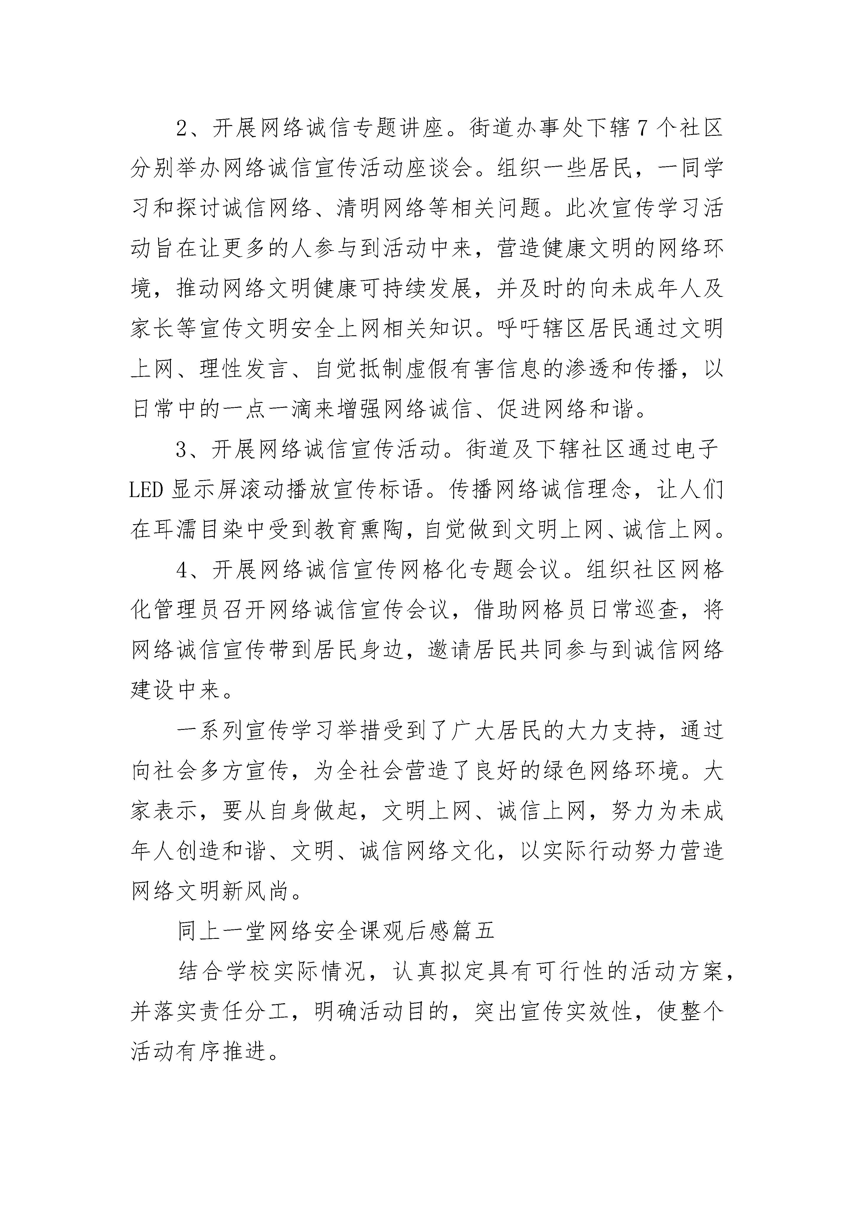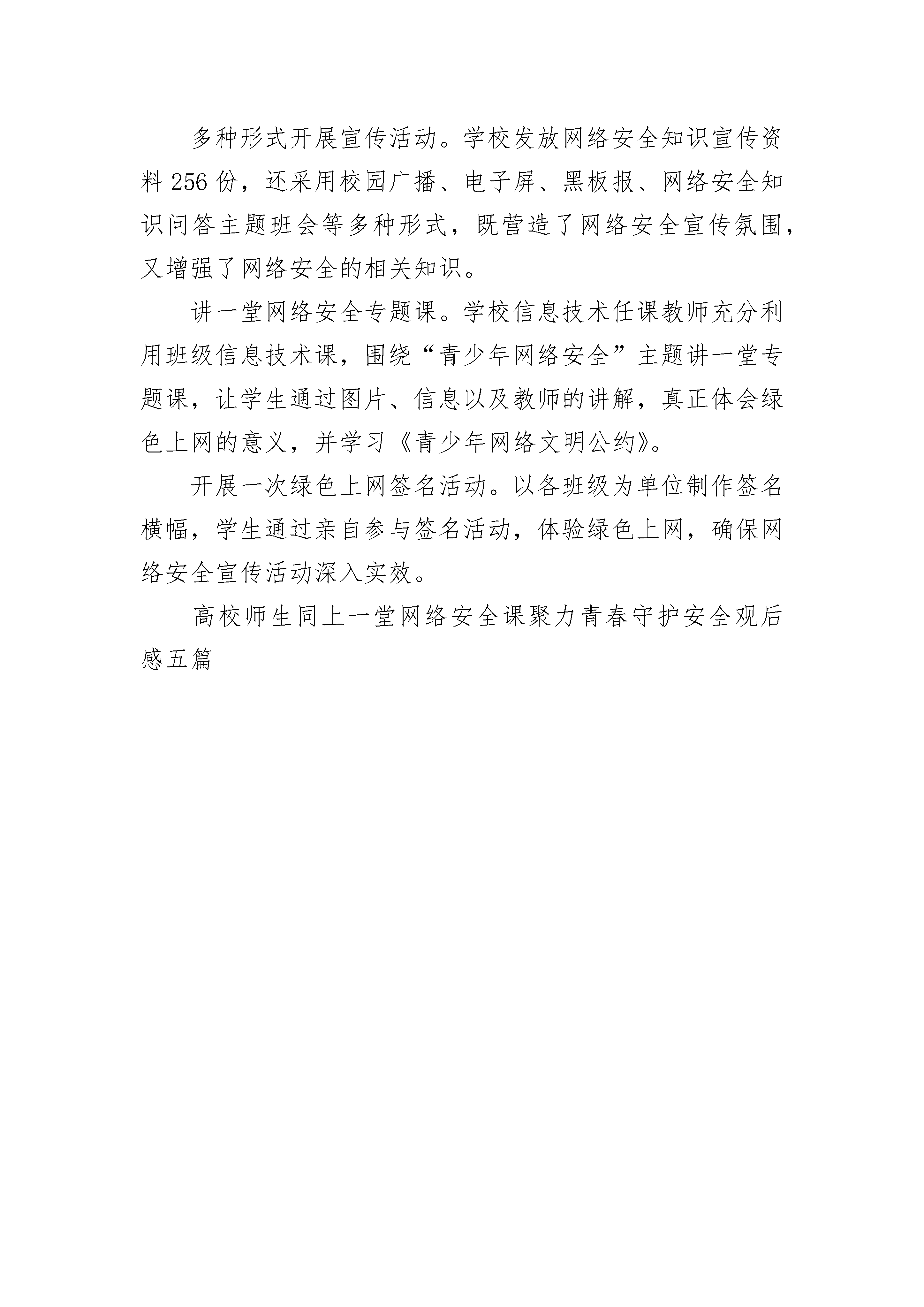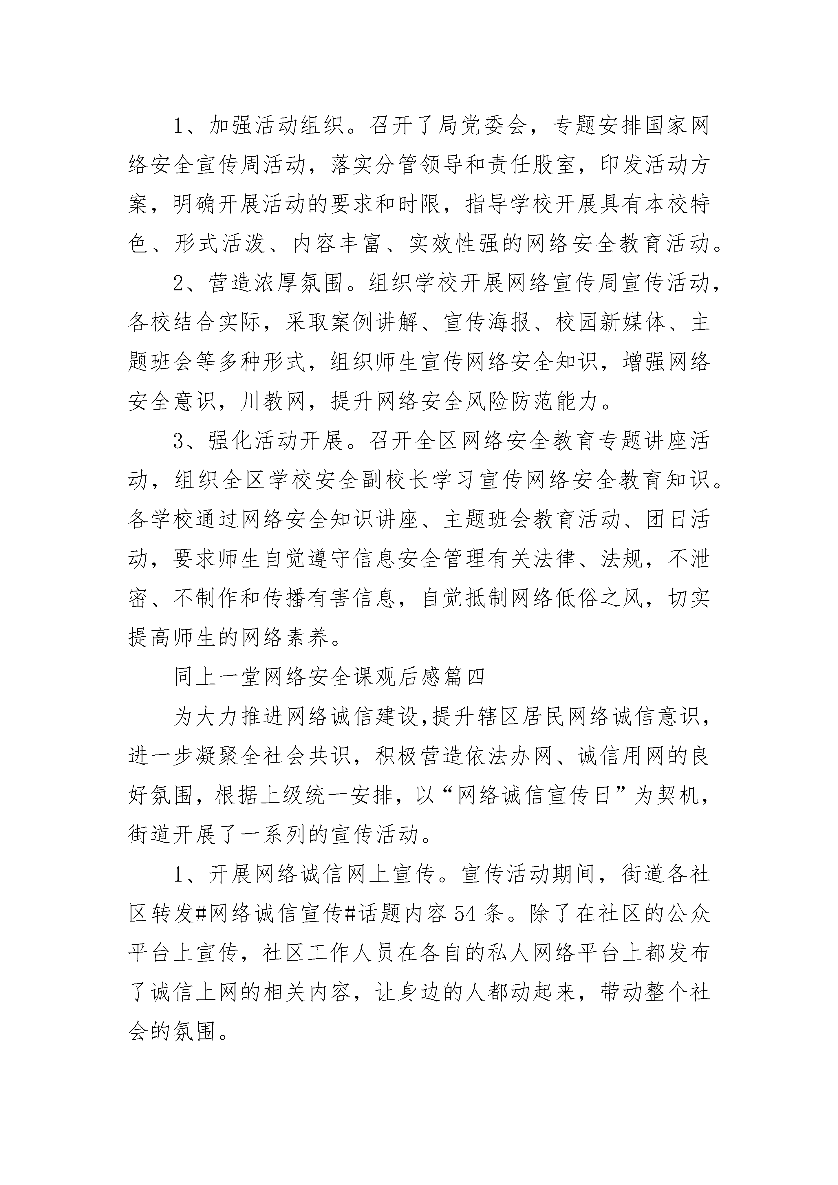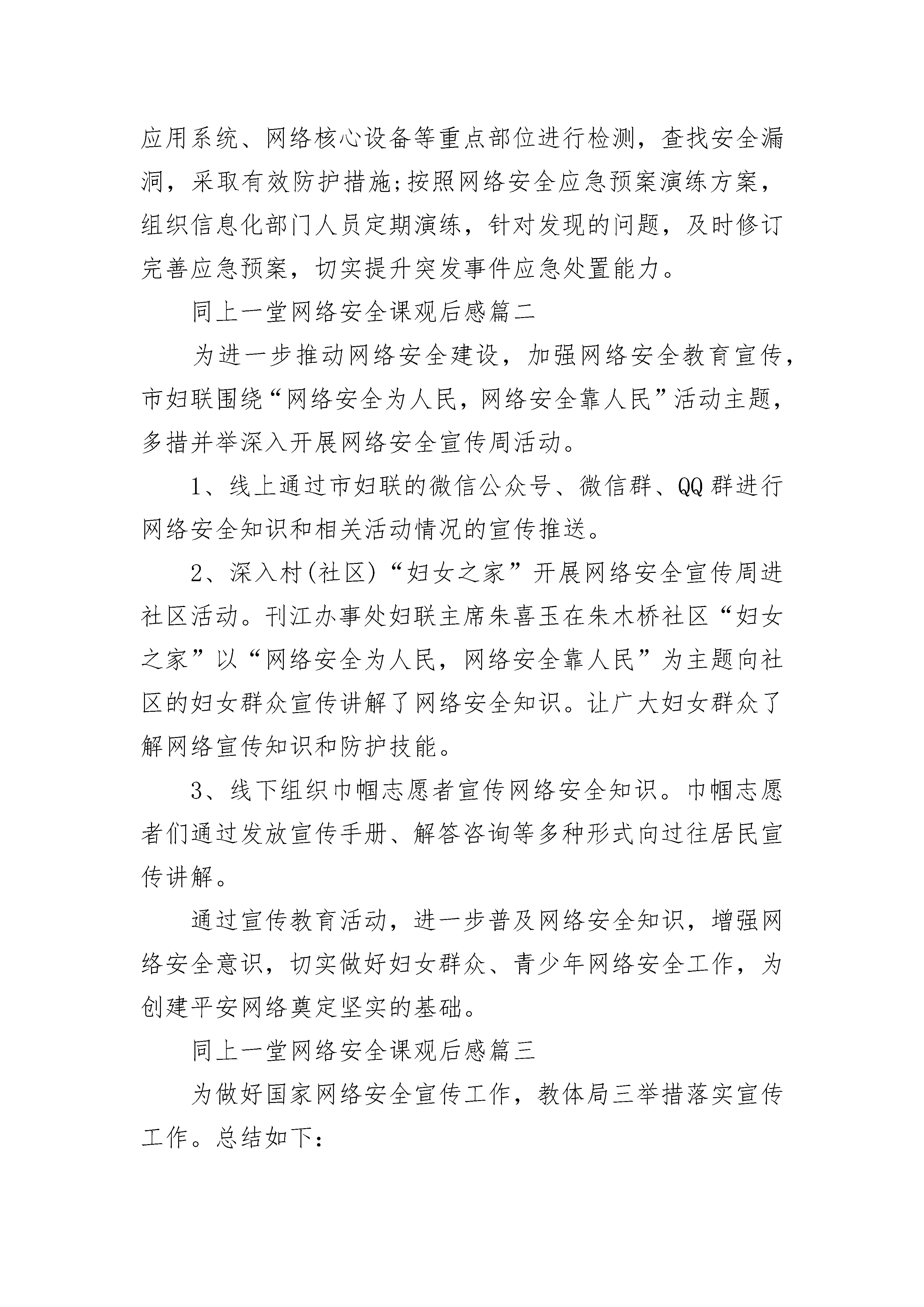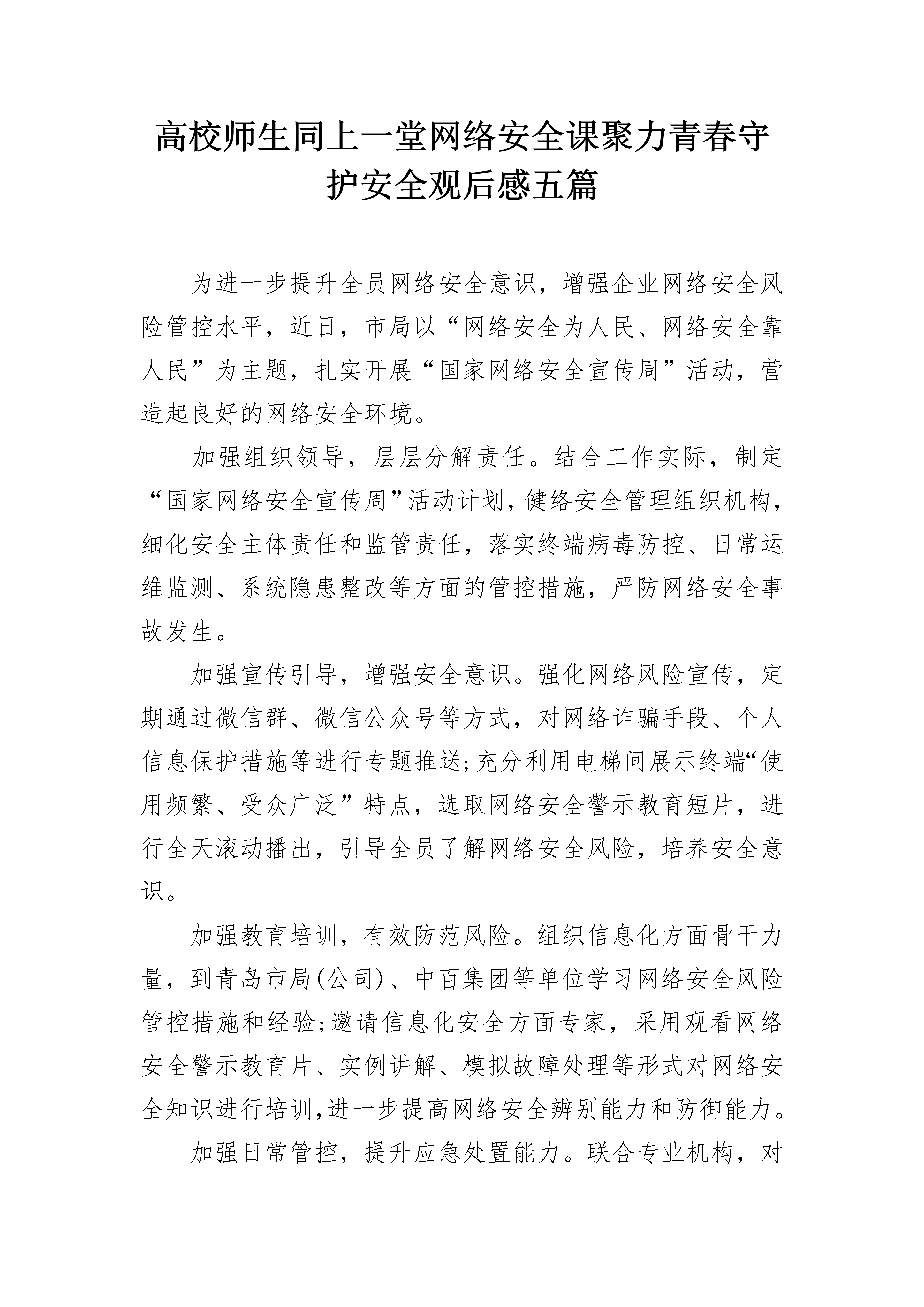 高校师生同上一堂网络安全课聚力青春守护安全观后感五篇为进一步提升全员网络安全意识,增强企业网络安全风险管控水平,近日,市局以“网络安全为人民、网络安全靠人民”为主题,扎实开展“国家网络安全宣传周”活动,营造起良好的网络安全环境。加强组织领导,层层分解责任。结合工作实际,制定“国家网络安全宣传周”活动计划,健络安全管理组织机构,细化安全主体责任和监管责任,落实终端病毒防控、日常运维监测、系统隐患整改等方面的管控措施,严防网络安全事故发生。加强宣传引导,增强安全意识。强化网络风险宣传,定期通过微信群、微信公众号等方式,对网络诈骗手段、个人信息保护措施等进行专题推送;充分利用电梯间展示终端“使用频繁、受众广泛”特点,选取网络安全警示教育短片,进行全天滚动播出,引导全员了解网络安全风险,培养安全意识。加强教育培训,有效防范风险。组织信息化方面骨干力量,到青岛市局(公司)、中百集团等单位学习网络安全风险管控措施和经验;邀请信息化安全方面专家,采用观看网络安全警示教育片、实例讲解、模拟故障处理等形式对网络安全知识进行培训,进一步提高网络安全辨别能力和防御能力。加强日常管控,提升应急处置能力。联合专业机构,对应用系统、网络核心设备等重点部位进行检测,查找安全漏洞,采取有效防护措施;按照网络安全应急预案演练方案,组织信息化部门人员定期演练,针对发现的问题,及时修订完善应急预案,切实提升突发事件应急处置能力。同上一堂网络安全课观后感篇二为进一步推动网络安全建设,加强网络安全教育宣传,市妇联围绕“网络安全为人民,网络安全靠人民”活动主题,多措并举深入开展网络安全宣传周活动。1、线上通过市妇联的微信公众号、微信群、QQ群进行网络安全知识和相关活动情况的宣传推送。2、深入村(社区)“妇女之家”开展网络安全宣传周进社区活动。刊江办事处妇联主席朱喜玉在朱木桥社区“妇女之家”以“网络安全为人民,网络安全靠人民”为主题向社区的妇女群众宣传讲解了网络安全知识。让广大妇女群众了解网络宣传知识和防护技能。3、线下组织巾帼志愿者宣传网络安全知识。巾帼志愿者们通过发放宣传手册、解答咨询等多种形式向过往居民宣传讲解。通过宣传教育活动,进一步普及网络安全知识,增强网络安全意识,切实做好妇女群众、青少年网络安全工作,为创建平安网络奠定坚实的基础。同上一堂网络安全课观后感篇三为做好国家网络安全宣传工作,教体局三举措落实宣传工作。总结如下:1、加强活动组织。召开了局党委会,专题安排国家网络安全宣传周活动,落实分管领导和责任股室,印发活动方案,明确开展活动的要求和时限,指导学校开展具有本校特色、形式活泼、内容丰富、实效性强的网络安全教育活动。2、营造浓厚氛围。组织学校开展网络宣传周宣传活动,各校结合实际,采取案例讲解、宣传海报、校园新媒体、主题班会等多种形式,组织师生宣传网络安全知识,增强网络安全意识,川教网,提升网络安全风险防范能力。3、强化活动开展。召开全区网络安全教育专题讲座活动,组织全区学校安全副校长学习宣传网络安全教育知识。各学校通过网络安全知识讲座、主题班会教育活动、团日活动,要求师生自觉遵守信息安全管理有关法律、法规,不泄密、不制作和传播有害信息,自觉抵制网络低俗之风,切实提高师生的网络素养。同上一堂网络安全课观后感篇四为大力推进网络诚信建设,提升辖区居民网络诚信意识,进一步凝聚全社会共识,积极营造依法办网、诚信用网的良好氛围,根据上级统一安排,以“网络诚信宣传日”为契机,街道开展了一系列的宣传活动。1、开展网络诚信网上宣传。宣传活动期间,街道各社区转发#网络诚信宣传#话题内容54条。除了在社区的公众平台上宣传,社区工作人员在各自的私人网络平台上都发布了诚信上网的相关内容,让身边的人都动起来,带动整个社会的氛围。2、开展网络诚信专题讲座。街道办事处下辖7个社区分别举办网络诚信宣传活动座谈会。组织一些居民,一同学习和探讨诚信网络、清明网络等相关问题。此次宣传学习活动旨在让更多的人参与到活动中来,营造健康文明的网络环境,推动网络文明健康可持续发展,并及时的向未成年人及家长等宣传文明安全上网相关知识。呼吁辖区居民通过文明上网、理性发言、自觉抵制虚假有害信息的渗透和传播,以日常中的一点一滴来增强网络诚信、促进网络和谐。3、开展网络诚信宣传活动。街道及下辖社区通过电子LED显示屏滚动播放宣传标语。传播网络诚信理念,让人们在耳濡目染中受到教育熏陶,自觉做到文明上网、诚信上网。4、开展网络诚信宣传网格化专题会议。组织社区网格化管理员召开网络诚信宣传会议,借助网格员日常巡查,将网络诚信宣传带到居民身边,邀请居民共同参与到诚信网络建设中来。一系列宣传学习举措受到了广大居民的大力支持,通过向社会多方宣传,为全社会营造了良好的绿色网络环境。大家表示,要从自身做起,文明上网、诚信上网,
