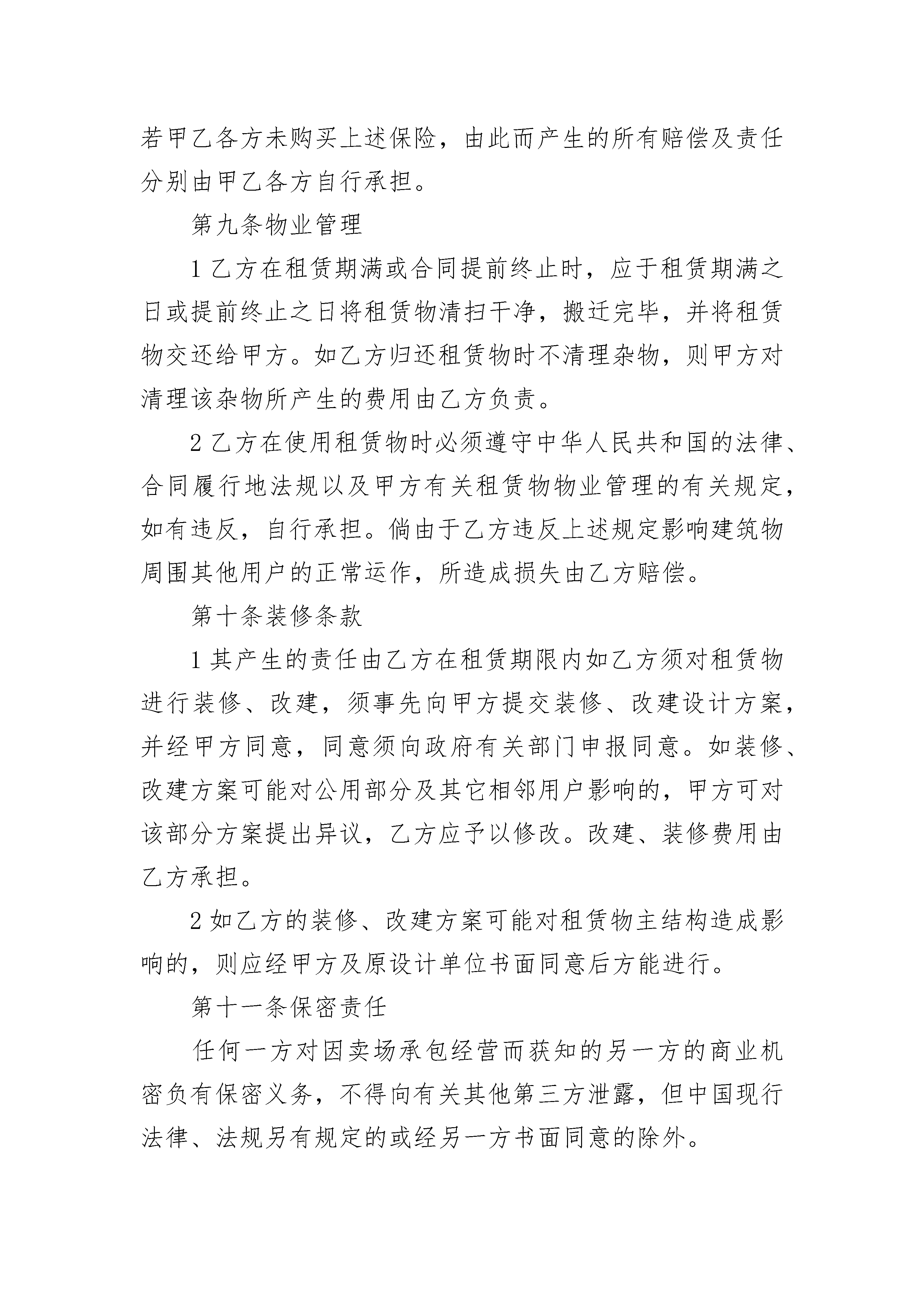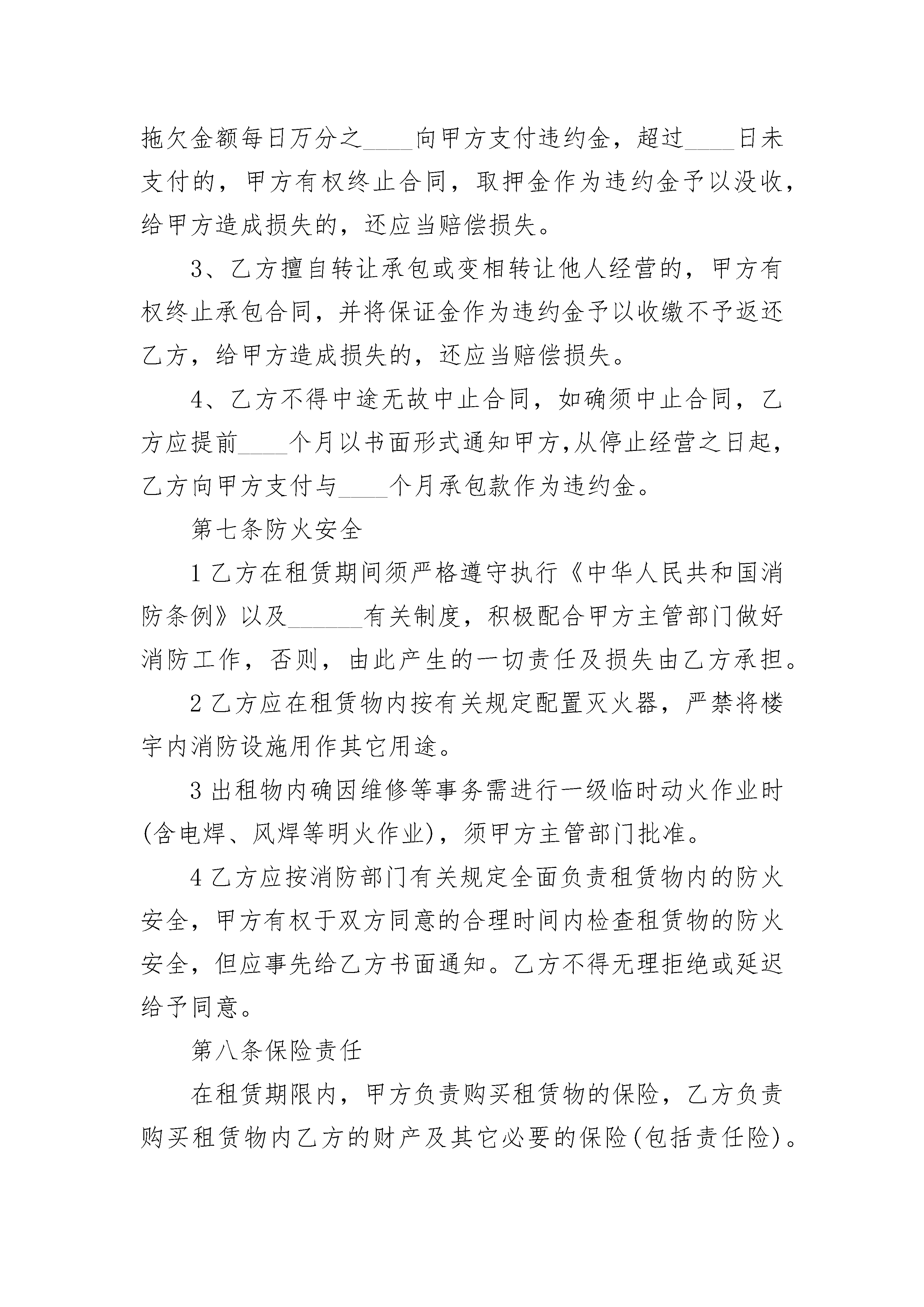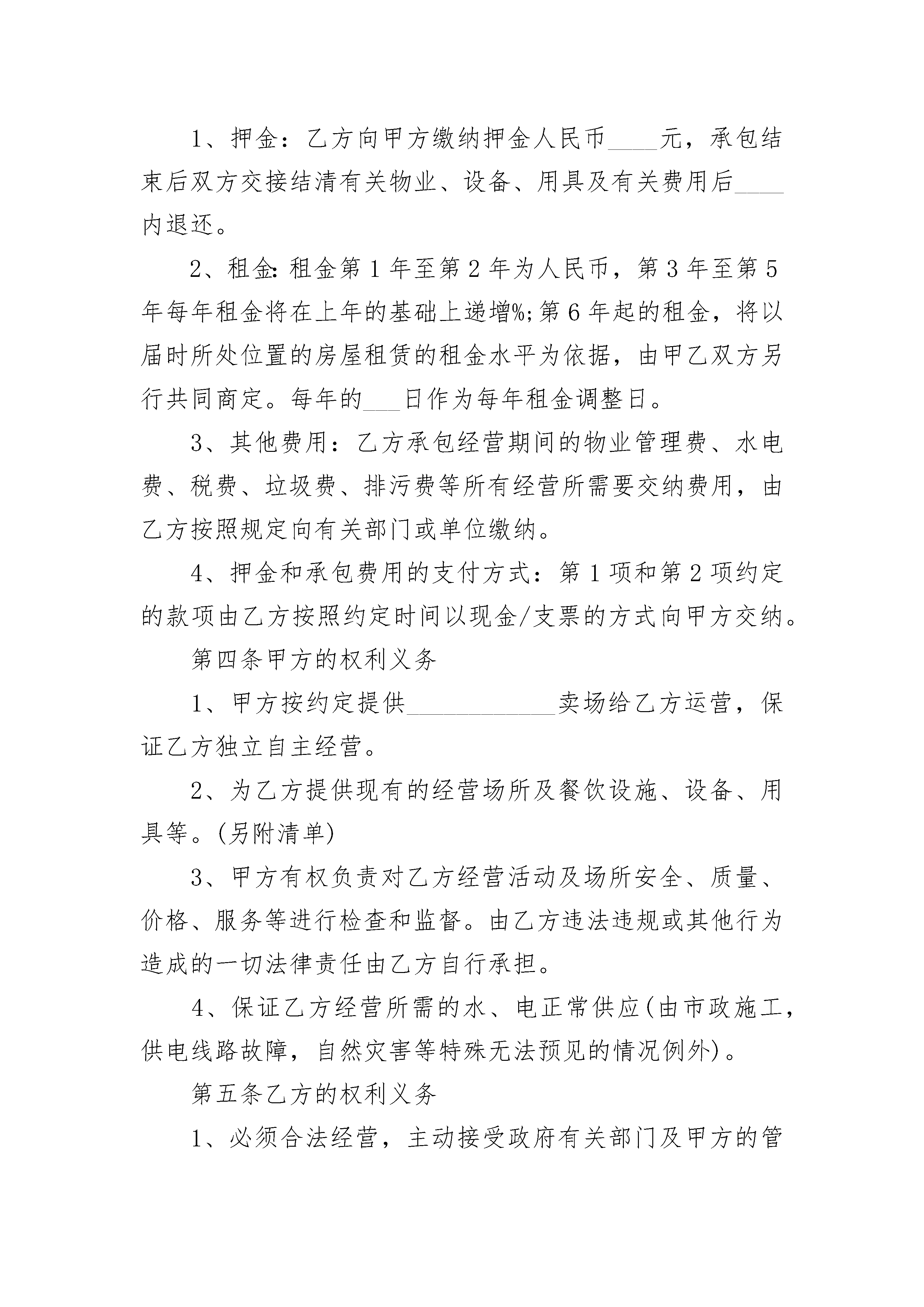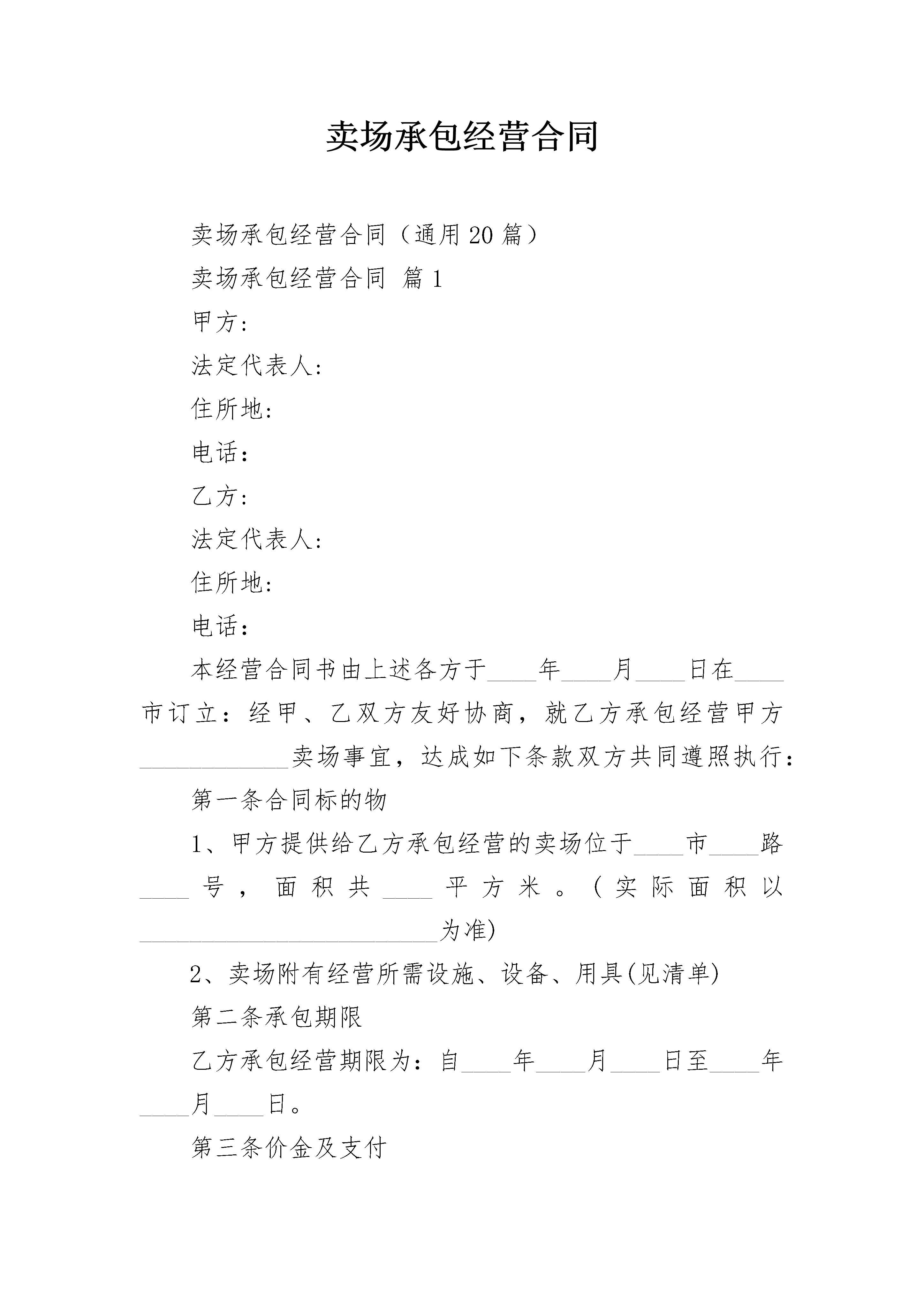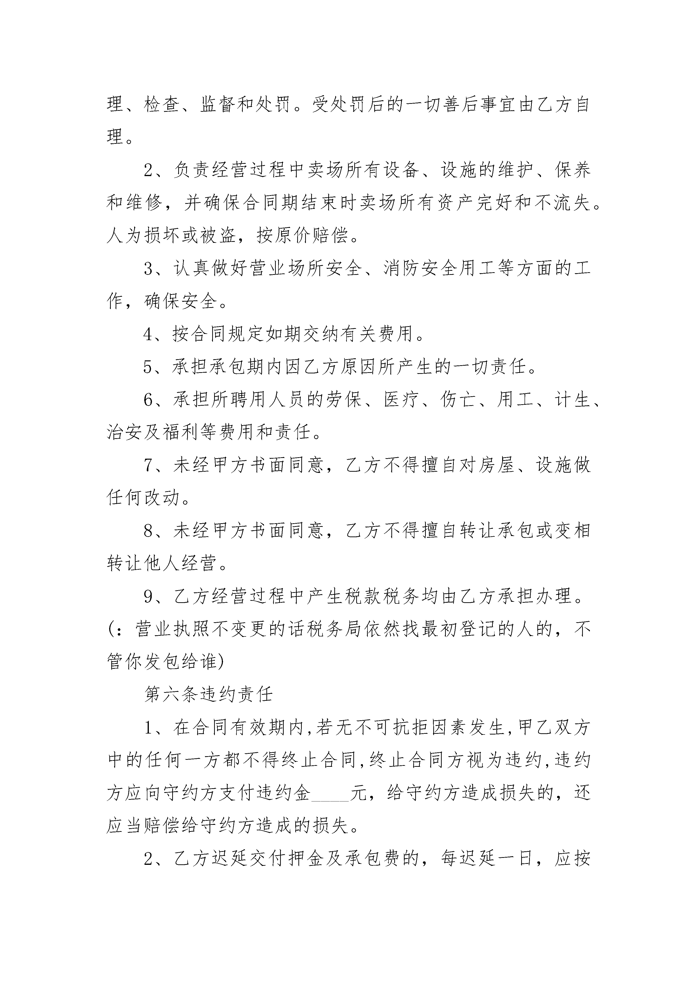 卖场承包经营合同卖场承包经营合同(通用20篇)卖场承包经营合同篇1甲方:法定代表人:住所地:电话:乙方:法定代表人:住所地:电话:本经营合同书由上述各方于____年____月____日在____市订立:经甲、乙双方友好协商,就乙方承包经营甲方____________卖场事宜,达成如下条款双方共同遵照执行:第一条合同标的物1、甲方提供给乙方承包经营的卖场位于____市____路____号,面积共____平方米。(实际面积以________________________为准)2、卖场附有经营所需设施、设备、用具(见清单)第二条承包期限乙方承包经营期限为:自____年____月____日至____年____月____日。第三条价金及支付1、押金:乙方向甲方缴纳押金人民币____元,承包结束后双方交接结清有关物业、设备、用具及有关费用后____内退还。2、租金:租金第1年至第2年为人民币,第3年至第5年每年租金将在上年的基础上递增%;第6年起的租金,将以届时所处位置的房屋租赁的租金水平为依据,由甲乙双方另行共同商定。每年的___日作为每年租金调整日。3、其他费用:乙方承包经营期间的物业管理费、水电费、税费、垃圾费、排污费等所有经营所需要交纳费用,由乙方按照规定向有关部门或单位缴纳。4、押金和承包费用的支付方式:第1项和第2项约定的款项由乙方按照约定时间以现金/支票的方式向甲方交纳。第四条甲方的权利义务1、甲方按约定提供____________卖场给乙方运营,保证乙方独立自主经营。2、为乙方提供现有的经营场所及餐饮设施、设备、用具等。(另附清单)3、甲方有权负责对乙方经营活动及场所安全、质量、价格、服务等进行检查和监督。由乙方违法违规或其他行为造成的一切法律责任由乙方自行承担。4、保证乙方经营所需的水、电正常供应(由市政施工,供电线路故障,自然灾害等特殊无法预见的情况例外)。第五条乙方的权利义务1、必须合法经营,主动接受政府有关部门及甲方的管理、检查、监督和处罚。受处罚后的一切善后事宜由乙方自理。2、负责经营过程中卖场所有设备、设施的维护、保养和维修,并确保合同期结束时卖场所有资产完好和不流失。人为损坏或被盗,按原价赔偿。3、认真做好营业场所安全、消防安全用工等方面的工作,确保安全。4、按合同规定如期交纳有关费用。5、承担承包期内因乙方原因所产生的一切责任。6、承担所聘用人员的劳保、医疗、伤亡、用工、计生、治安及福利等费用和责任。7、未经甲方书面同意,乙方不得擅自对房屋、设施做任何改动。8、未经甲方书面同意,乙方不得擅自转让承包或变相转让他人经营。9、乙方经营过程中产生税款税务均由乙方承担办理。(:营业执照不变更的话税务局依然找最初登记的人的,不管你发包给谁)第六条违约责任1、在合同有效期内,若无不可抗拒因素发生,甲乙双方中的任何一方都不得终止合同,终止合同方视为违约,违约方应向守约方支付违约金____元,给守约方造成损失的,还应当赔偿给守约方造成的损失。2、乙方迟延交付押金及承包费的,每迟延一日,应按拖欠金额每日万分之____向甲方支付违约金,超过____日未支付的,甲方有权终止合同,取押金作为违约金予以没收,给甲方造成损失的,还应当赔偿损失。3、乙方擅自转让承包或变相转让他人经营的,甲方有权终止承包合同,并将保证金作为违约金予以收缴不予返还乙方,给甲方造成损失的,还应当赔偿损失。4、乙方不得中途无故中止合同,如确须中止合同,乙方应提前____个月以书面形式通知甲方,从停止经营之日起,乙方向甲方支付与____个月承包款作为违约金。第七条防火安全1乙方在租赁期间须严格遵守执行《中华人民共和国消防条例》以及______有关制度,积极配合甲方主管部门做好消防工作,否则,由此产生的一切责任及损失由乙方承担。2乙方应在租赁物内按有关规定配置灭火器,严禁将楼宇内消防设施用作其它用途。3出租物内确因维修等事务需进行一级临时动火作业时(含电焊、风焊等明火作业),须甲方主管部门批准。4乙方应按消防部门有关规定全面负责租赁物内的防火安全,甲方有权于双方同意的合理时间内检查租赁物的防火安全,但应事先给乙方书面通知。乙方不得无理拒绝或延迟给予同意。第八条保险责任在租赁期限内,甲方负责购买租赁物的保险,乙方负责购买租赁物内乙方的财产及其它必要的保险(包括责任险)。若甲乙各方未购买上述保险,由此而产生的所有赔偿及责任分别由甲乙各方自行承担。第九条物业管理1乙方在租赁期满或合同提前终止时,应于租赁期满之日或提前终止之日将租赁物清扫干净,搬迁完毕,并将租赁物交还给甲方。如乙方归还租赁物时不清理杂物,则甲方对清理该杂物所产生的费用由乙方负责。2乙方在使用租赁物时必须遵守中华人民共和国的法律、合同履行地法规以及甲方有关租赁物物业管理的有关规定,如有违反,自行承担。