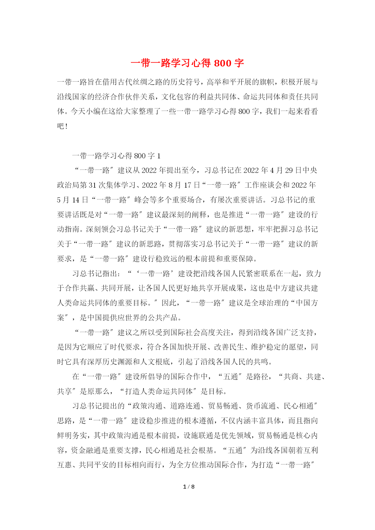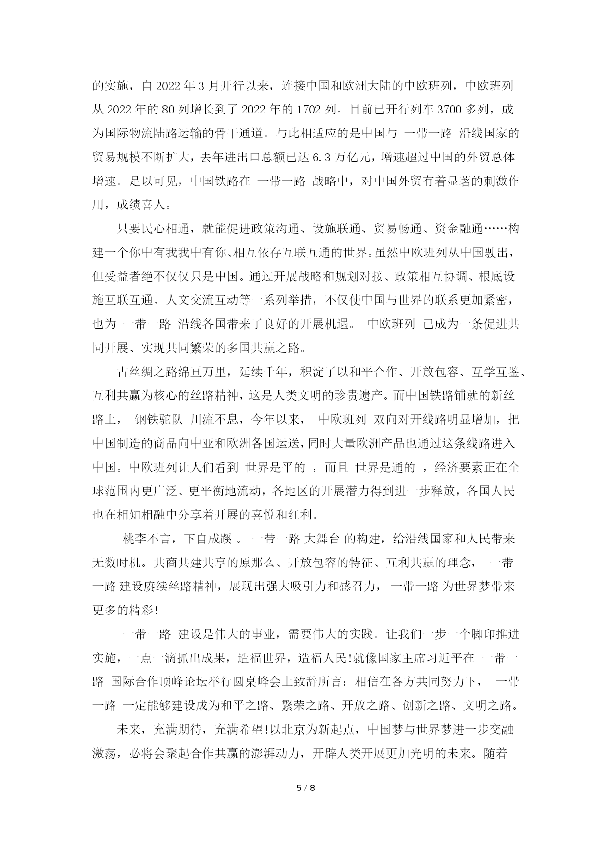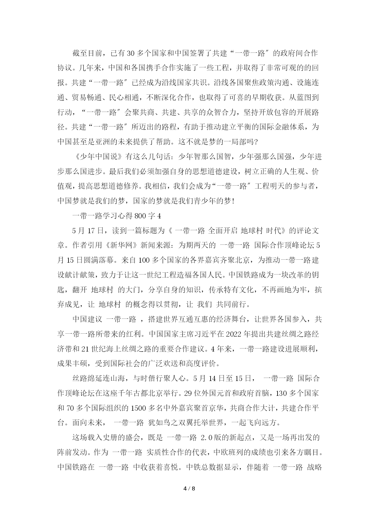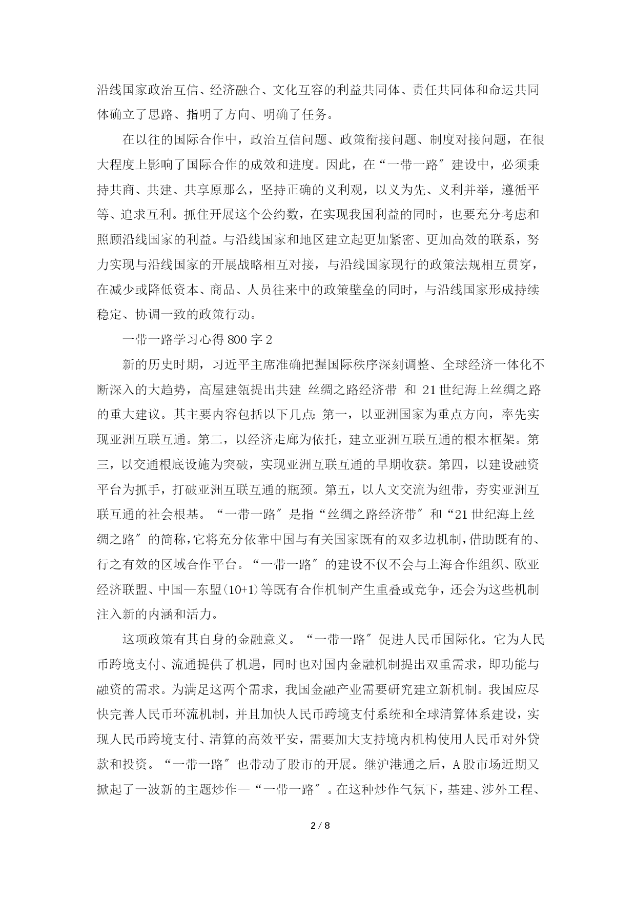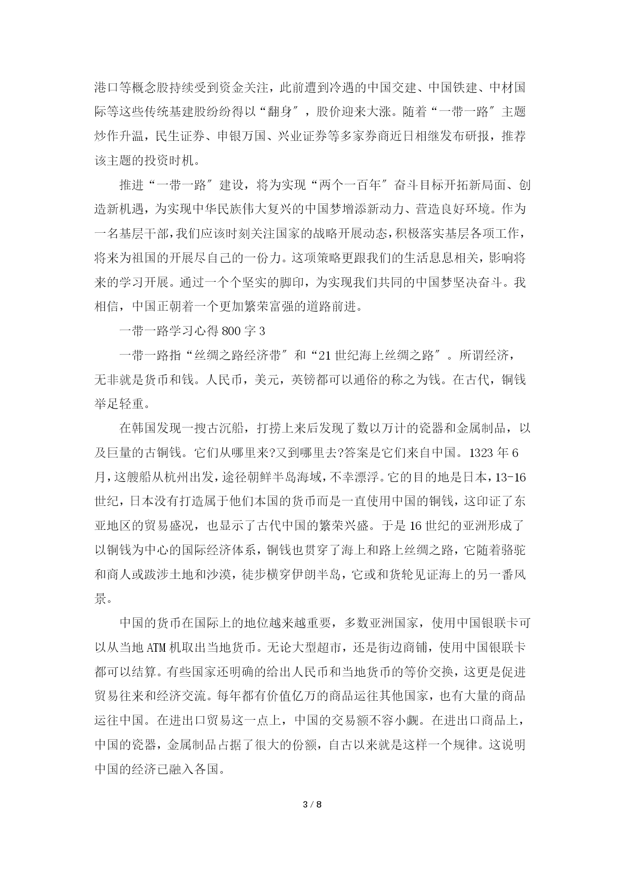 /NUMPAGES8 一带一路学习心得800字 一带一路旨在借用古代丝绸之路的历史符号,高举和平开展的旗帜,积极开展与沿线国家的经济合作伙伴关系,文化包容的利益共同体、命运共同体和责任共同体。今天小编在这给大家整理了一些一带一路学习心得800字,我们一起来看看吧! 一带一路学习心得800字1 “一带一路〞建议从2022年提出至今,习总书记在2022年4月29日中央政治局第31次集体学习、2022年8月17日“一带一路〞工作座谈会和2022年5月14日“一带一路〞峰会等多个重要场合,有屡次重要讲话。习总书记的重要讲话既是对“一带一路〞建议最深刻的阐释,也是推进“一带一路〞建设的行动指南。深刻领会习总书记关于“一带一路〞建议的新思想,牢牢把握习总书记关于“一带一路〞建议的新思路,贯彻落实习总书记关于“一带一路〞建议的新要求,是“一带一路〞建设行稳致远的根本前提和重要保障。 习总书记指出:“‘一带一路’建设把沿线各国人民紧密联系在一起,致力于合作共赢、共同开展,让各国人民更好地共享开展成果,这也是中方建议共建人类命运共同体的重要目标。〞因此,“一带一路〞建议是全球治理的“中国方案〞,是中国提供应世界的公共产品。 “一带一路〞建议之所以受到国际社会高度关注,得到沿线各国广泛支持,是因为它顺应了时代要求,符合各国加快开展、改善民生、维护稳定的愿望,同时它具有深厚历史渊源和人文根底,引起了沿线各国人民的共鸣。 在“一带一路〞建设所倡导的国际合作中,“五通〞是路径,“共商、共建、共享〞是原那么,“打造人类命运共同体〞是目标。 习总书记提出的“政策沟通、道路连通、贸易畅通、货币流通、民心相通〞思路,是“一带一路〞建设稳步推进的根本遵循,不仅内涵丰富具体,而且指向鲜明务实,其中政策沟通是根本前提,设施联通是优先领域,贸易畅通是核心内容,资金融通是重要支撑,民心相通是社会根基。“五通〞为沿线各国朝着互利互惠、共同平安的目标相向而行,为全方位推动国际合作,为打造“一带一路〞沿线国家政治互信、经济融合、文化互容的利益共同体、责任共同体和命运共同体确立了思路、指明了方向、明确了任务。 在以往的国际合作中,政治互信问题、政策衔接问题、制度对接问题,在很大程度上影响了国际合作的成效和进度。因此,在“一带一路〞建设中,必须秉持共商、共建、共享原那么,坚持正确的义利观,以义为先、义利并举,遵循平等、追求互利。抓住开展这个公约数,在实现我国利益的同时,也要充分考虑和照顾沿线国家的利益。与沿线国家和地区建立起更加紧密、更加高效的联系,努力实现与沿线国家的开展战略相互对接,与沿线国家现行的政策法规相互贯穿,在减少或降低资本、商品、人员往来中的政策壁垒的同时,与沿线国家形成持续稳定、协调一致的政策行动。 一带一路学习心得800字2 新的历史时期,习近平主席准确把握国际秩序深刻调整、全球经济一体化不断深入的大趋势,高屋建瓴提出共建丝绸之路经济带和21世纪海上丝绸之路的重大建议。其主要内容包括以下几点:第一,以亚洲国家为重点方向,率先实现亚洲互联互通。第二,以经济走廊为依托,建立亚洲互联互通的根本框架。第三,以交通根底设施为突破,实现亚洲互联互通的早期收获。第四,以建设融资平台为抓手,打破亚洲互联互通的瓶颈。第五,以人文交流为纽带,夯实亚洲互联互通的社会根基。“一带一路〞是指“丝绸之路经济带〞和“21世纪海上丝绸之路〞的简称,它将充分依靠中国与有关国家既有的双多边机制,借助既有的、行之有效的区域合作平台。“一带一路〞的建设不仅不会与上海合作组织、欧亚经济联盟、中国—东盟(10+1)等既有合作机制产生重叠或竞争,还会为这些机制注入新的内涵和活力。 这项政策有其自身的金融意义。“一带一路〞促进人民币国际化。它为人民币跨境支付、流通提供了机遇,同时也对国内金融机制提出双重需求,即功能与融资的需求。为满足这两个需求,我国金融产业需要研究建立新机制。我国应尽快完善人民币环流机制,并且加快人民币跨境支付系统和全球清算体系建设,实现人民币跨境支付、清算的高效平安,需要加大支持境内机构使用人民币对外贷款和投资。“一带一路〞也带动了股市的开展。继沪港通之后,A股市场近期又掀起了一波新的主题炒作—“一带一路〞。在这种炒作气氛下,基建、涉外工程、港口等概念股持续受到资金关注,此前遭到冷遇的中国交建、中国铁建、中材国际等这些传统基建股纷纷得以“翻身〞,股价迎来大涨。随着“一带一路〞主题炒作升温,民生证券、申银万国、兴业证券等多家券商近日相继发布研报,推荐该主题的投资时机。 推进“一带一路〞建设,将为实现“两个一百年〞奋斗目标开拓新局面、创造新机遇,为实现中华民族伟大复兴的中国梦增添新动力、营造良好环境。作为一名基层干部,我们应该时刻关注国家的战略开展动态,积极落实基层各项工作,将来为祖