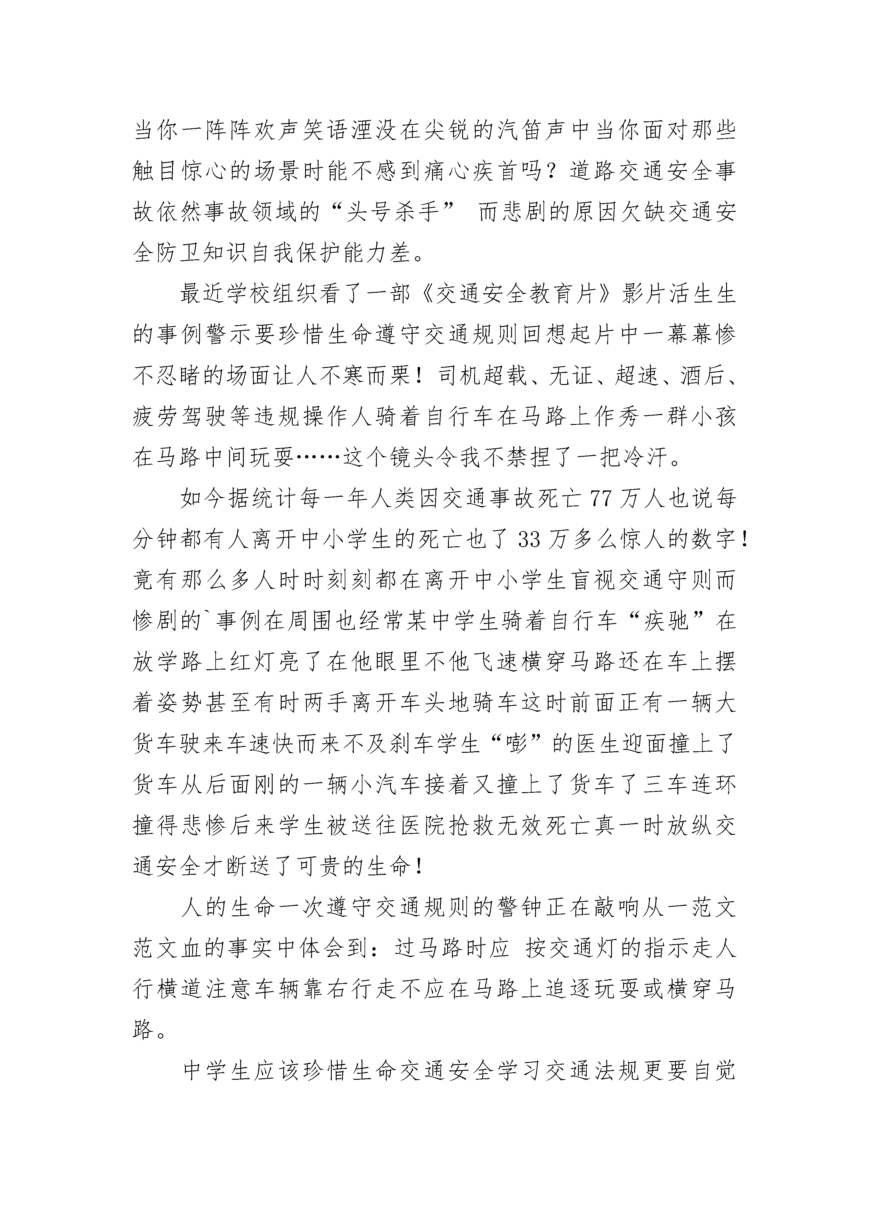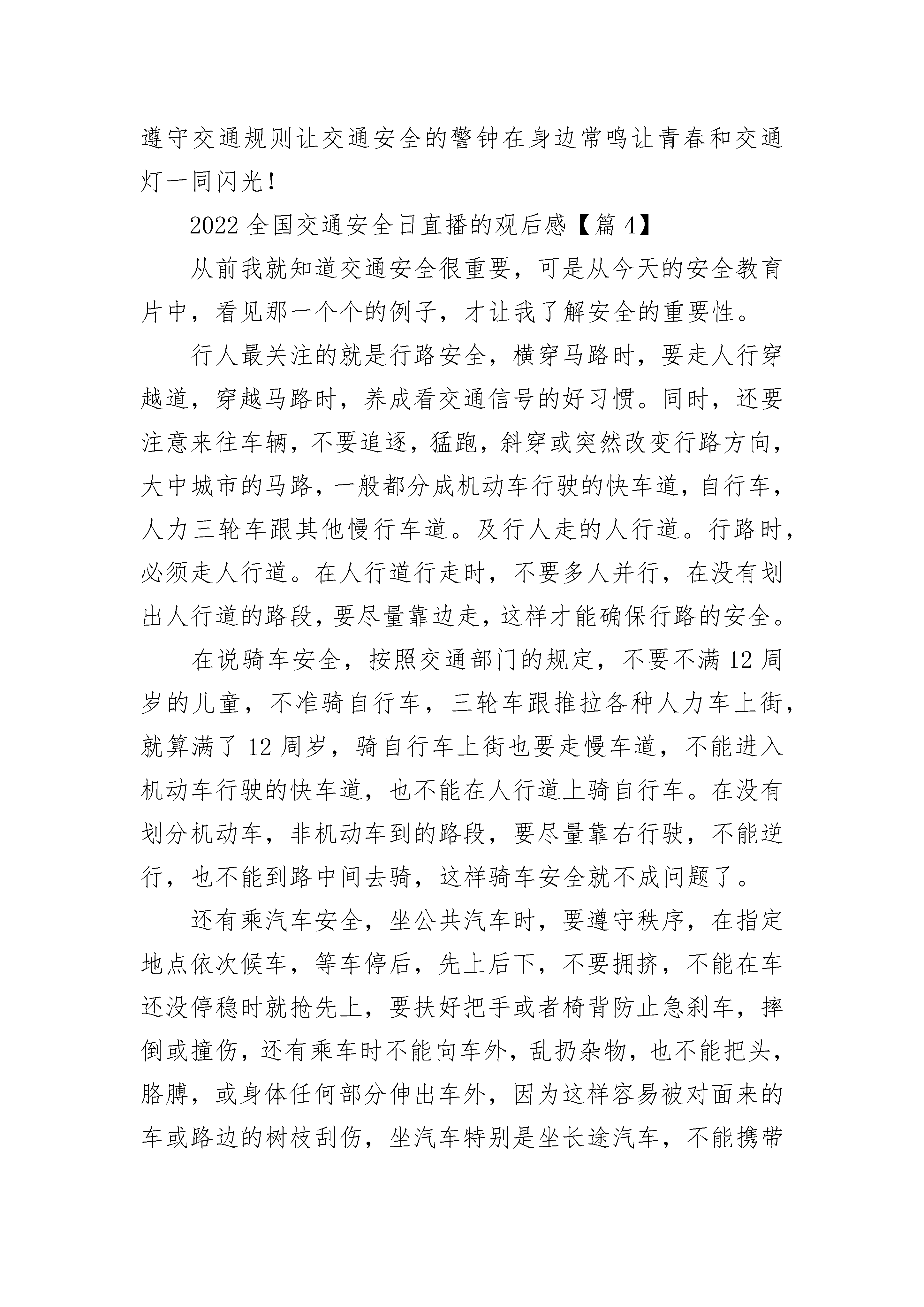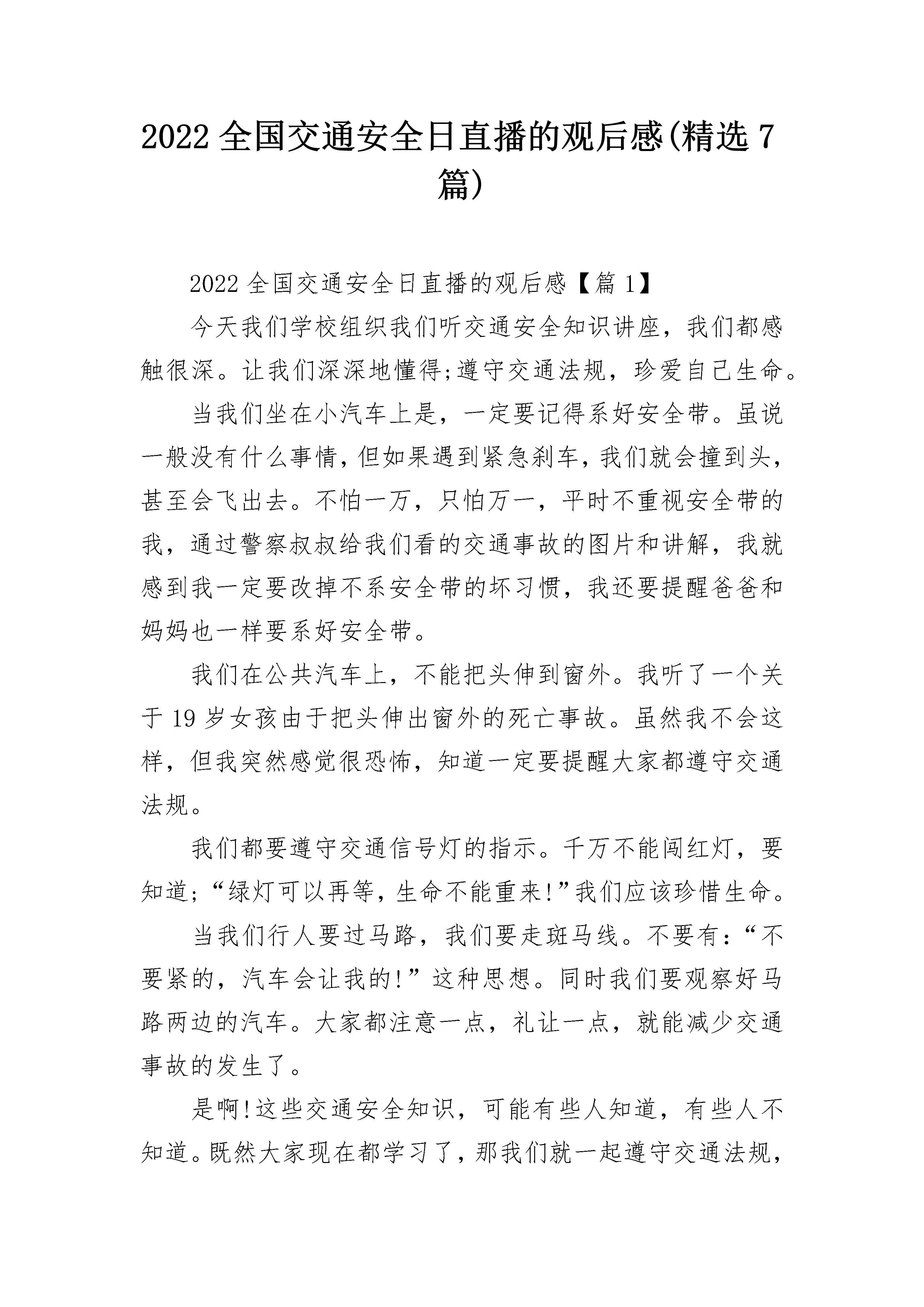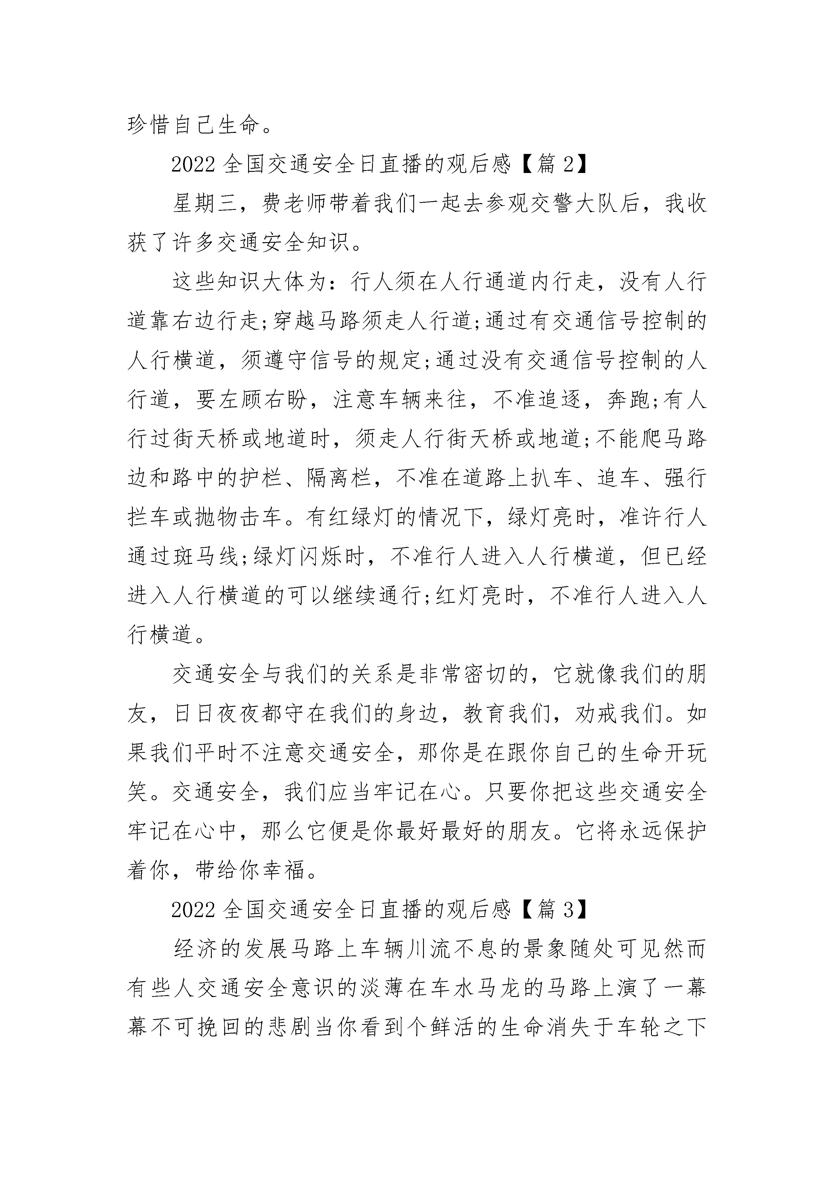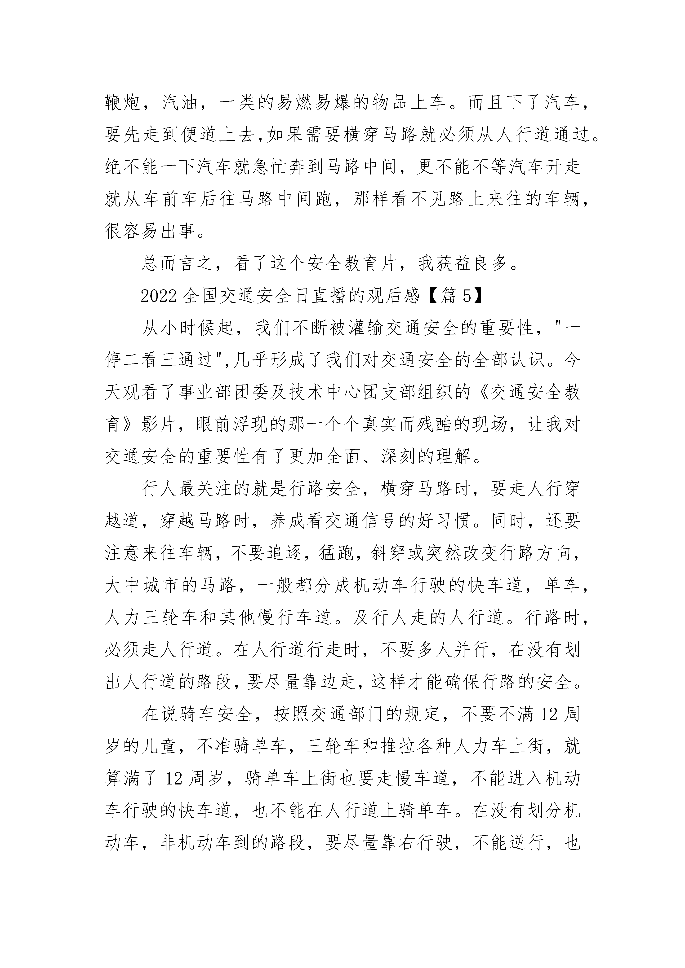 2022全国交通安全日直播的观后感(精选7篇)2022全国交通安全日直播的观后感【篇1】今天我们学校组织我们听交通安全知识讲座,我们都感触很深。让我们深深地懂得;遵守交通法规,珍爱自己生命。当我们坐在小汽车上是,一定要记得系好安全带。虽说一般没有什么事情,但如果遇到紧急刹车,我们就会撞到头,甚至会飞出去。不怕一万,只怕万一,平时不重视安全带的我,通过警察叔叔给我们看的交通事故的图片和讲解,我就感到我一定要改掉不系安全带的坏习惯,我还要提醒爸爸和妈妈也一样要系好安全带。我们在公共汽车上,不能把头伸到窗外。我听了一个关于19岁女孩由于把头伸出窗外的死亡事故。虽然我不会这样,但我突然感觉很恐怖,知道一定要提醒大家都遵守交通法规。我们都要遵守交通信号灯的指示。千万不能闯红灯,要知道;“绿灯可以再等,生命不能重来!”我们应该珍惜生命。当我们行人要过马路,我们要走斑马线。不要有:“不要紧的,汽车会让我的!”这种思想。同时我们要观察好马路两边的汽车。大家都注意一点,礼让一点,就能减少交通事故的发生了。是啊!这些交通安全知识,可能有些人知道,有些人不知道。既然大家现在都学习了,那我们就一起遵守交通法规,珍惜自己生命。2022全国交通安全日直播的观后感【篇2】星期三,费老师带着我们一起去参观交警大队后,我收获了许多交通安全知识。这些知识大体为:行人须在人行通道内行走,没有人行道靠右边行走;穿越马路须走人行道;通过有交通信号控制的人行横道,须遵守信号的规定;通过没有交通信号控制的人行道,要左顾右盼,注意车辆来往,不准追逐,奔跑;有人行过街天桥或地道时,须走人行街天桥或地道;不能爬马路边和路中的护栏、隔离栏,不准在道路上扒车、追车、强行拦车或抛物击车。有红绿灯的情况下,绿灯亮时,准许行人通过斑马线;绿灯闪烁时,不准行人进入人行横道,但已经进入人行横道的可以继续通行;红灯亮时,不准行人进入人行横道。交通安全与我们的关系是非常密切的,它就像我们的朋友,日日夜夜都守在我们的身边,教育我们,劝戒我们。如果我们平时不注意交通安全,那你是在跟你自己的生命开玩笑。交通安全,我们应当牢记在心。只要你把这些交通安全牢记在心中,那么它便是你最好最好的朋友。它将永远保护着你,带给你幸福。2022全国交通安全日直播的观后感【篇3】经济的发展马路上车辆川流不息的景象随处可见然而有些人交通安全意识的淡薄在车水马龙的马路上演了一幕幕不可挽回的悲剧当你看到个鲜活的生命消失于车轮之下当你一阵阵欢声笑语湮没在尖锐的汽笛声中当你面对那些触目惊心的场景时能不感到痛心疾首吗?道路交通安全事故依然事故领域的“头号杀手”而悲剧的原因欠缺交通安全防卫知识自我保护能力差。最近学校组织看了一部《交通安全教育片》影片活生生的事例警示要珍惜生命遵守交通规则回想起片中一幕幕惨不忍睹的场面让人不寒而栗!司机超载、无证、超速、酒后、疲劳驾驶等违规操作人骑着自行车在马路上作秀一群小孩在马路中间玩耍……这个镜头令我不禁捏了一把冷汗。如今据统计每一年人类因交通事故死亡77万人也说每分钟都有人离开中小学生的死亡也了33万多么惊人的数字!竟有那么多人时时刻刻都在离开中小学生盲视交通守则而惨剧的`事例在周围也经常某中学生骑着自行车“疾驰”在放学路上红灯亮了在他眼里不他飞速横穿马路还在车上摆着姿势甚至有时两手离开车头地骑车这时前面正有一辆大货车驶来车速快而来不及刹车学生“嘭”的医生迎面撞上了货车从后面刚的一辆小汽车接着又撞上了货车了三车连环撞得悲惨后来学生被送往医院抢救无效死亡真一时放纵交通安全才断送了可贵的生命!人的生命一次遵守交通规则的警钟正在敲响从一范文范文血的事实中体会到:过马路时应按交通灯的指示走人行横道注意车辆靠右行走不应在马路上追逐玩耍或横穿马路。中学生应该珍惜生命交通安全学习交通法规更要自觉遵守交通规则让交通安全的警钟在身边常鸣让青春和交通灯一同闪光!2022全国交通安全日直播的观后感【篇4】从前我就知道交通安全很重要,可是从今天的安全教育片中,看见那一个个的例子,才让我了解安全的重要性。行人最关注的就是行路安全,横穿马路时,要走人行穿越道,穿越马路时,养成看交通信号的好习惯。同时,还要注意来往车辆,不要追逐,猛跑,斜穿或突然改变行路方向,大中城市的马路,一般都分成机动车行驶的快车道,自行车,人力三轮车跟其他慢行车道。及行人走的人行道。行路时,必须走人行道。在人行道行走时,不要多人并行,在没有划出人行道的路段,要尽量靠边走,这样才能确保行路的安全。在说骑车安全,按照交通部门的规定,不要不满12周岁的儿童,不准骑自行车,三轮车跟推拉各种人力车上街,就算满了12周岁,骑自行车上街也要走慢车道,不能进入机动车行驶的快车道,也不能在人行道上骑自行车。在没有划分机动车,非机动车到的路段,要尽量靠右行驶,不能逆行,
