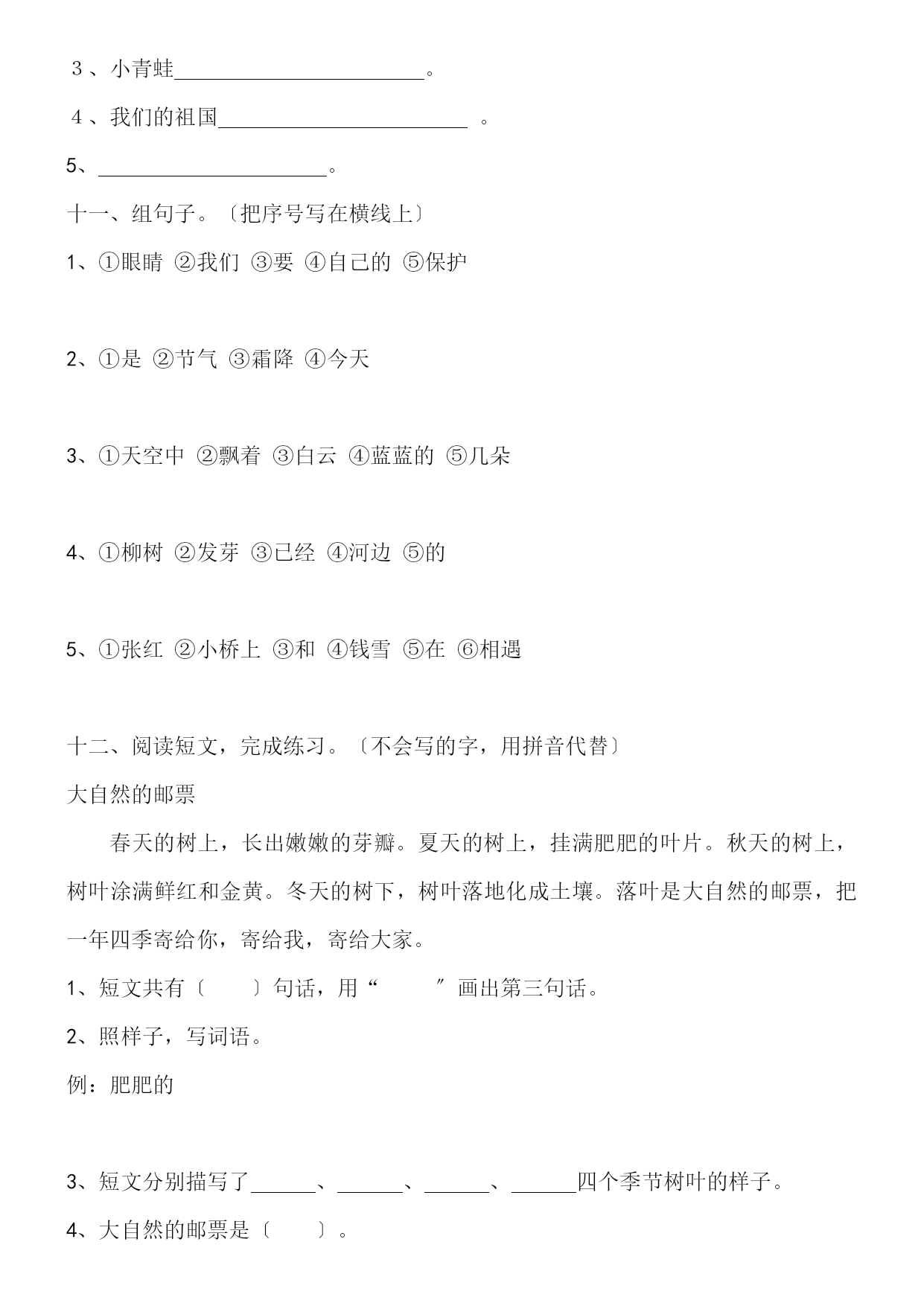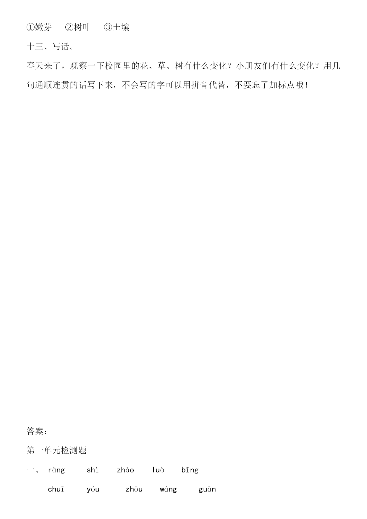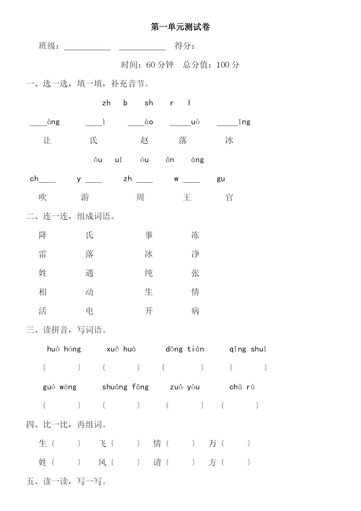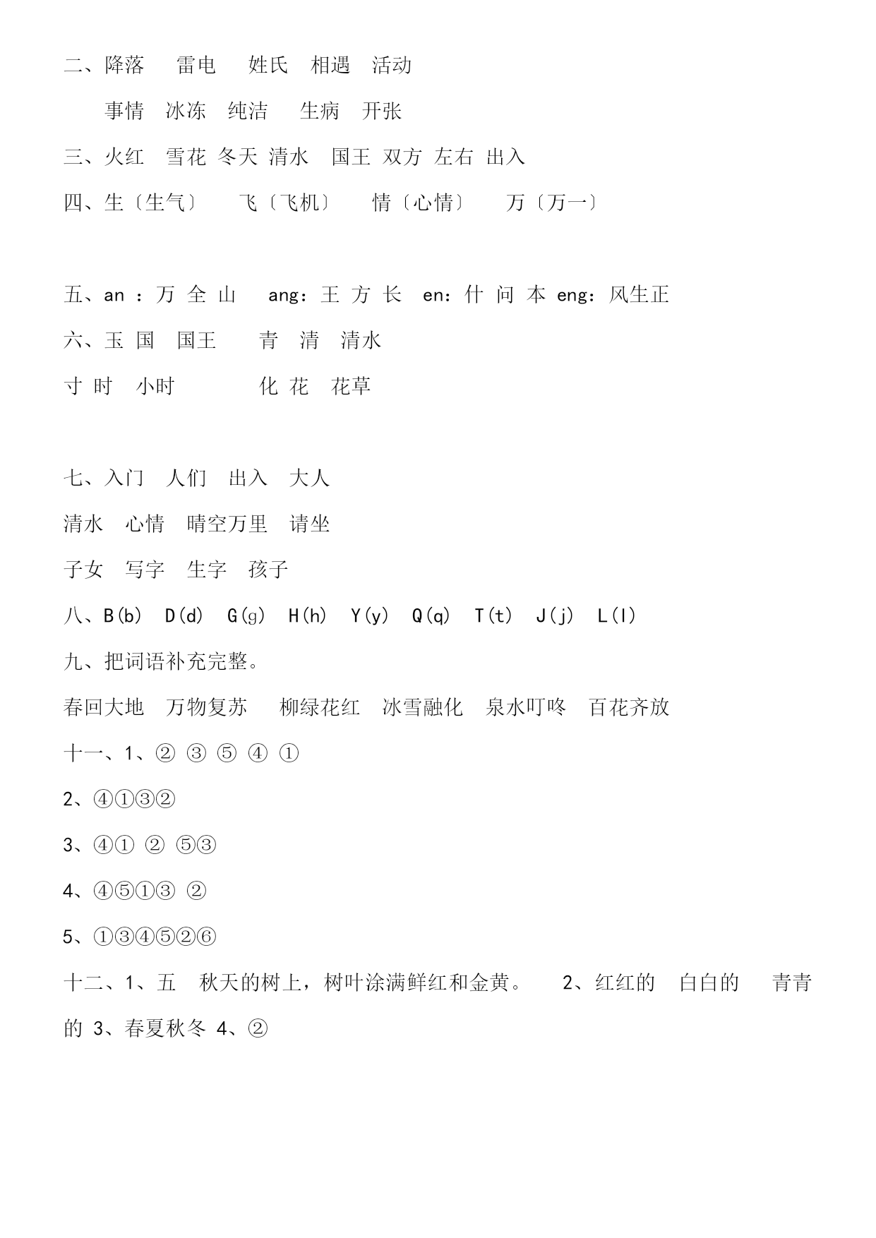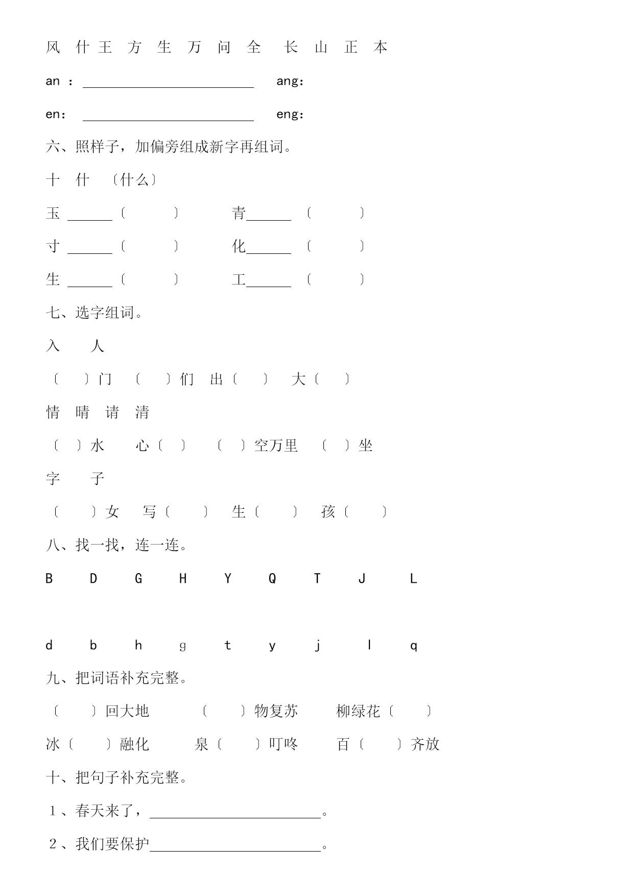 第一单元测试卷 班级:得分: 时间:60分钟总分值:100分 一、选一选,填一填,补充音节。 zhbshrl àngìàouòīng 让氏赵落冰 ōuuīóuānáng chyzhwgu 吹游周王官 二、连一连,组成词语。 降氏事冻 雷落冰净 姓遇纯张 相动生情 活电开病 三、读拼音,写词语。 huǒhóngxuěhuādōngtiānqīngshuǐ 〔〕〔〕〔〕〔〕 guówángshuāngfāngzuǒyòuchūrù 〔〕〔〕〔〕〔〕 四、比一比,再组词。 生〔〕飞〔〕情〔〕万〔〕 姓〔〕风〔〕请〔〕方〔〕 五、读一读,写一写。 风什王方生万问全长山正本 an:ang: en:eng: 六、照样子,加偏旁组成新字再组词。 十什〔什么〕 玉〔〕青〔〕 寸〔〕化〔〕 生〔〕工〔〕 七、选字组词。 入人 〔〕门〔〕们出〔〕大〔〕 情晴请清 〔〕水心〔〕〔〕空万里〔〕坐 字子 〔〕女写〔〕生〔〕孩〔〕 八、找一找,连一连。 BDGHYQTJL dbhɡtyjlq 九、把词语补充完整。 〔〕回大地〔〕物复苏柳绿花〔〕 冰〔〕融化泉〔〕叮咚百〔〕齐放 十、把句子补充完整。 1、春天来了,。 2、我们要保护。 3、小青蛙。 4、我们的祖国。 5、。 十一、组句子。〔把序号写在横线上〕 1、①眼睛②我们③要④自己的⑤保护 2、①是②节气③霜降④今天 3、①天空中②飘着③白云④蓝蓝的⑤几朵 4、①柳树②发芽③已经④河边⑤的 5、①张红②小桥上③和④钱雪⑤在⑥相遇 十二、阅读短文,完成练习。〔不会写的字,用拼音代替〕 大自然的邮票 春天的树上,长出嫩嫩的芽瓣。夏天的树上,挂满肥肥的叶片。秋天的树上,树叶涂满鲜红和金黄。冬天的树下,树叶落地化成土壤。落叶是大自然的邮票,把一年四季寄给你,寄给我,寄给大家。 1、短文共有〔〕句话,用“〞画出第三句话。 2、照样子,写词语。 例:肥肥的 3、短文分别描写了、、、四个季节树叶的样子。 4、大自然的邮票是〔〕。 ①嫩芽②树叶③土壤 十三、写话。 春天来了,观察一下校园里的花、草、树有什么变化?小朋友们有什么变化?用几句通顺连贯的话写下来,不会写的字可以用拼音代替,不要忘了加标点哦!21教育网 答案: 第一单元检测题 一、ràngshìzhàoluòbīng chuīyóuzhōuwángguān 二、降落雷电姓氏相遇活动 事情冰冻纯洁生病开张 三、火红雪花冬天清水国王双方左右出入 四、生〔生气〕飞〔飞机〕情〔心情〕万〔万一〕 五、an:万全山ang:王方长en:什问本eng:风生正 六、玉国国王青清清水 寸时小时化花花草 七、入门人们出入大人 清水心情晴空万里请坐 子女写字生字孩子 八、B(b)D(d)G(ɡ)H(h)Y(y)Q(q)T(t)J(j)L(l) 九、把词语补充完整。 春回大地万物复苏柳绿花红冰雪融化泉水叮咚百花齐放 十一、1、②③⑤④① 2、④①③② 3、④①②⑤③ 4、④⑤①③② 5、①③④⑤②⑥ 十二、1、五秋天的树上,树叶涂满鲜红和金黄。2、红红的白白的青青的3、春夏秋冬4、②21世纪教育网版权所有